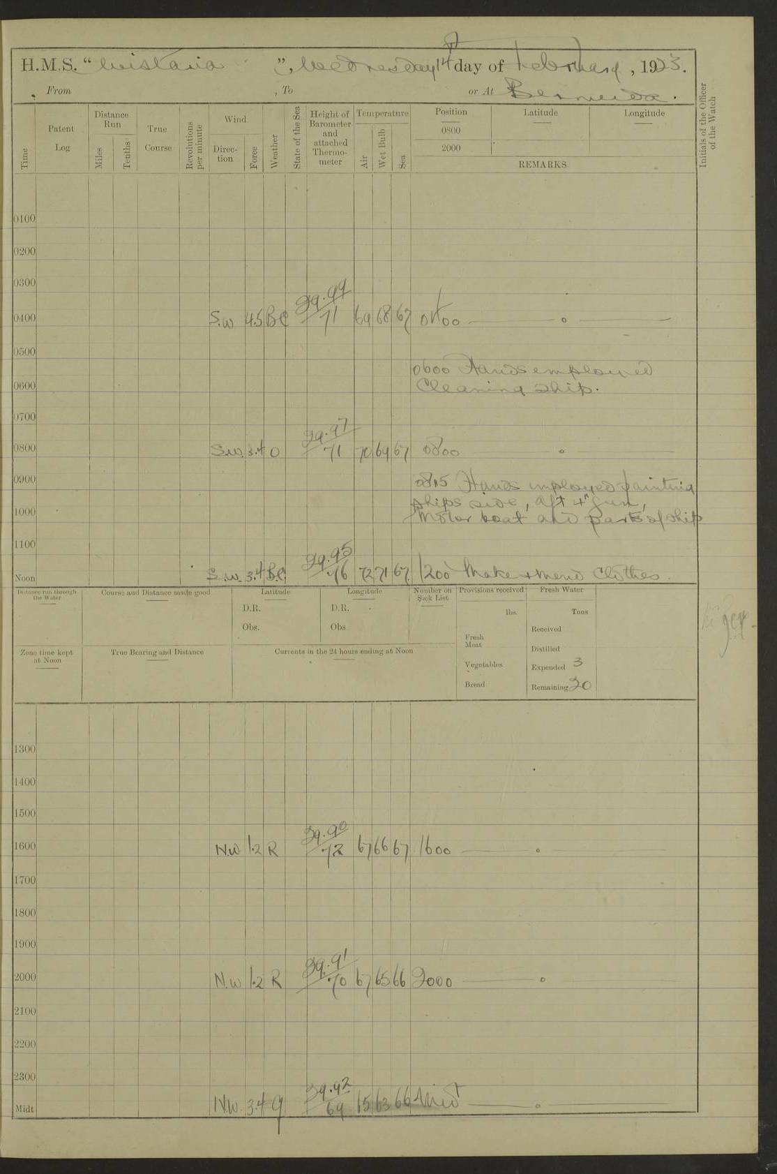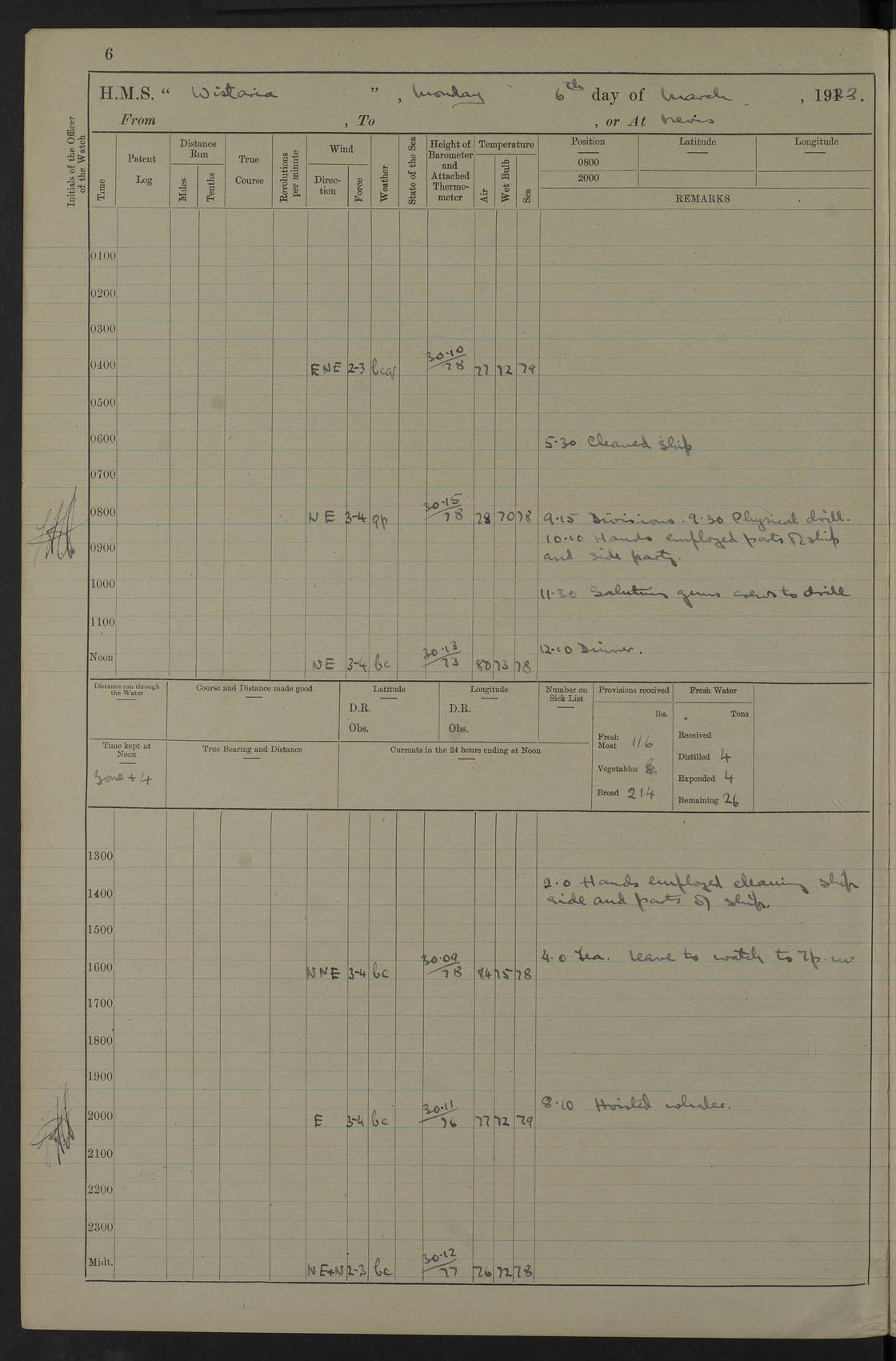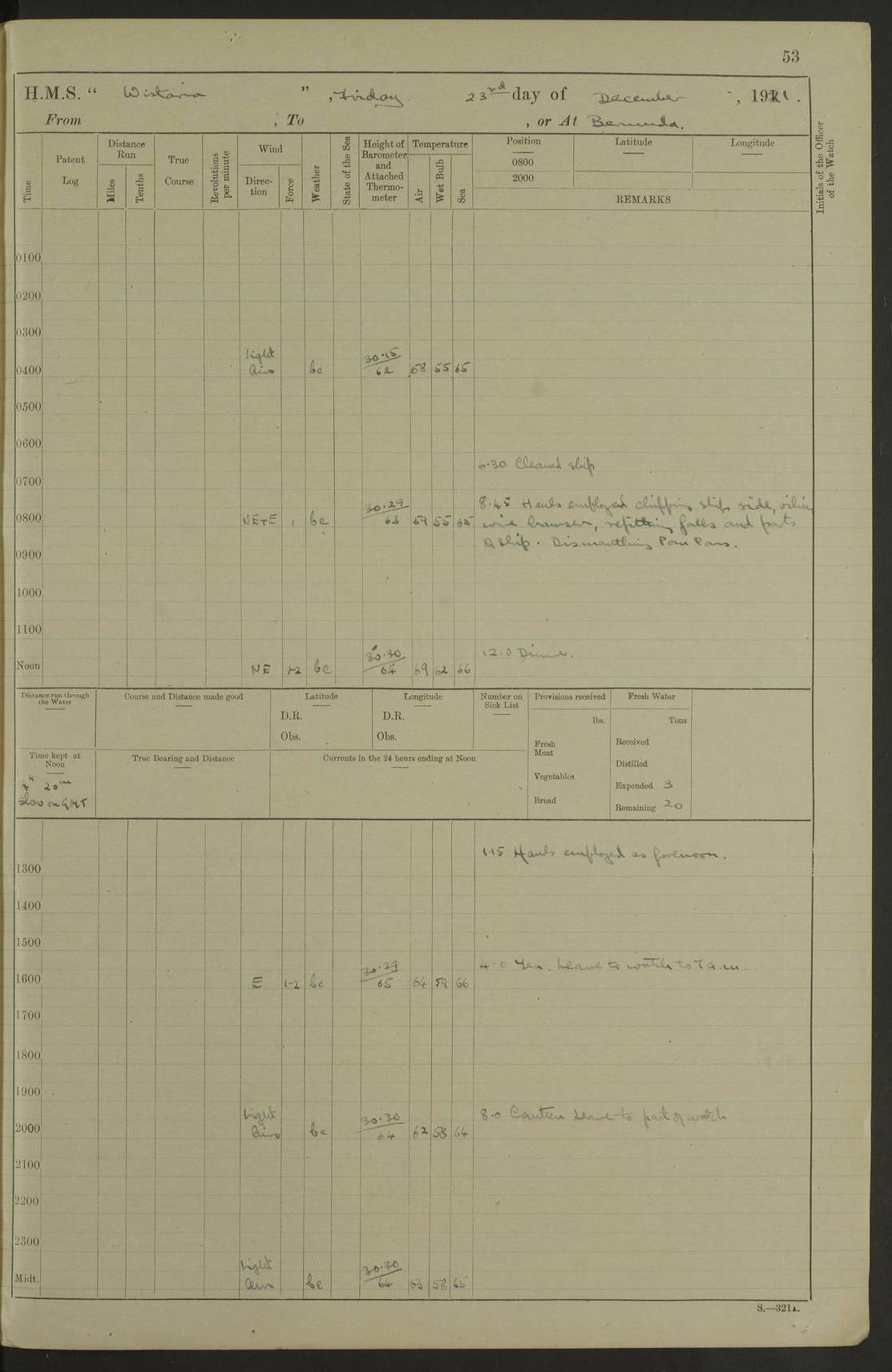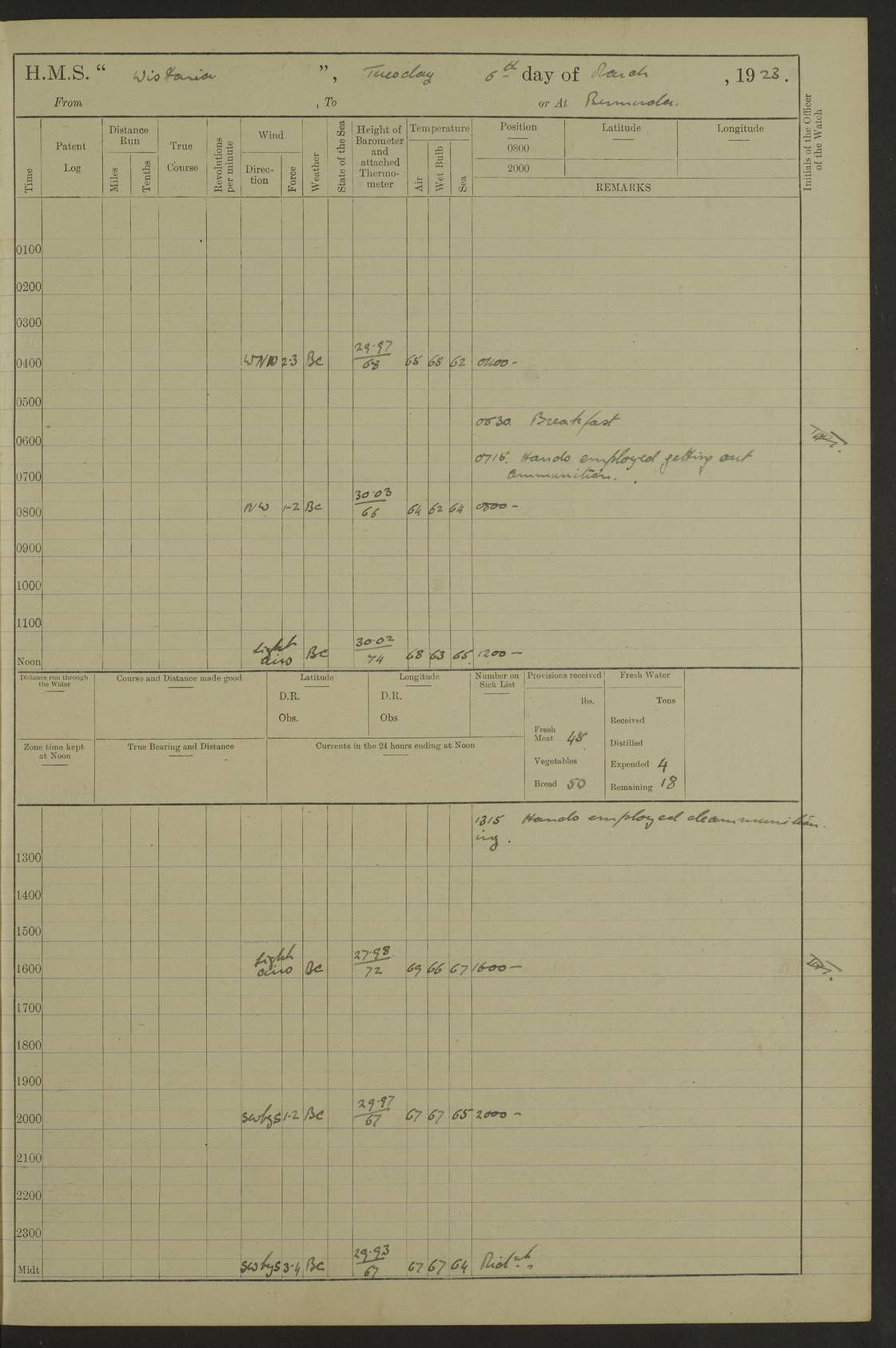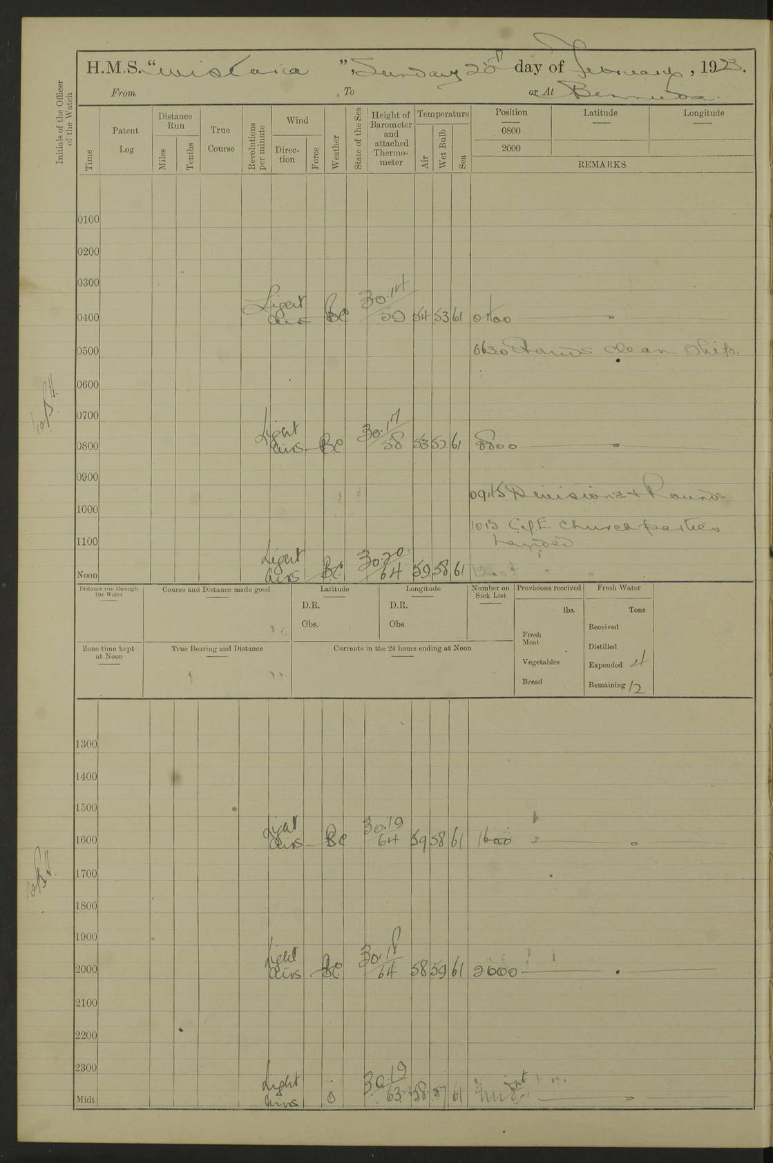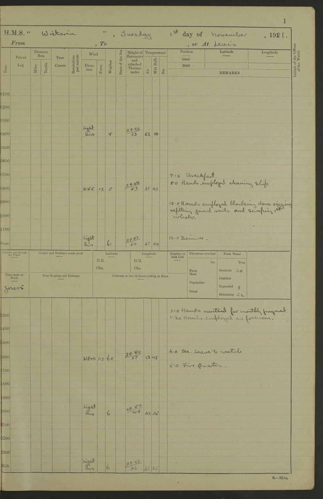 LOGS FOR DECEMBER 1920 4f73c9e6a2fc8ea903000965: (https://s3.amazonaws.com:443/oldweather/ADM53-93259/0003_1.jpg) 29 December 1920 At Devonport Lat 50.38, Long -4.19 9.0am: Commissioned with Chatham Crew 11.55am: Cooks to galley am: Sub Lt Jenks joined ship 1.10pm: Out pipes 1.15pm: Hands fall in. Employed in scrubbing and washing upper deck 3.30pm: Leave to 1st and 2nd watches 4 pm-7 am. Liberty men to clean 4.0pm: Liberty men fall in. Tea 4.15pm: Sunset 5.0pm: Liberty men fall in 6.0pm: Liberty men fall in 7.10pm: 1st Lieutenant returned from sick berth 7.15pm: Supper 8.0pm: Stand by hammocks 8.40pm: Clear off mess decks for rounds 9.0pm: Rounds 10.0pm: Pipe down 12.0pm: Rounds correct 4f73c9e7a2fc8ea903000966: (https://s3.amazonaws.com:443/oldweather/ADM53-93259/0004_0.jpg) 30 December 1920 At Devonport Lat 50.38, Long -4.19 6.0am: Called hands 6.30am: Hands fall in. Scrub & wash upper decks 7.20am: Quarters clean guns 7.50am: Secure 8.0am: Breakfast. Dress of day N°3 8.40am: Out pipes. Hands fall in am: Hands working main derrick. 4 hands & 1 Leading Seaman working with Chief Writer with stationery 10.20am: Stand easy 10.30am: Carry on with work 11.0am: Hands getting in provisions 11.30am: Afternoon watchmen to dinner noon: Dinner 1.15pm: Hands fall in. 1 Leading Seaman & hands with Chief Writer. 1 Leading Seaman & 2 AB Electr. Light. 3 AB with ship’s steward. 3 hands cleaning guns 3.40pm: Secure. Clear up decks 4.0pm: Evening Quarters. Sunset 4.24pm: Exercised collision stations 4.30pm: Secure. Tea. Leave to 2nd & 3rd watches 5 pm to 7 am 6.0pm: Liberty men fall in 7.15pm: Supper 8.0pm: Stand by hammocks 9.0pm: Rounds 10.0pm: Pipe down 4f73c9e7a2fc8ea903000967: (https://s3.amazonaws.com:443/oldweather/ADM53-93259/0004_1.jpg) 31 December 1920 At Devonport Lat 50.38, Long -4.19 6.30am: Hands scrubbing & washing upper decks 8.0am: Breakfast & clean Number 3 8.45am: Hands fall in. 6 hands unrigging fore derrick. 4 hands securing wood on upper deck. 3 hands stowing stanchions below decks 10.20am: Stand easy 10.30am: Carry on 10.45am: 4 hands getting in canteen gear 11.55am: Cooks noon: Dinner 1.15pm: Q.D. men unrigging awning stanchions, remainder securing derricks 3.40pm: Secure. Clear up decks 4.0pm: Evening Quarters 4.05pm: Tea 4.20pm: Sunset 7.10pm: Supper 8.0pm: Stand by hammocks LOGS FOR JANUARY 1921 4f73c9e7a2fc8ea903000968: (https://s3.amazonaws.com:443/oldweather/ADM53-93259/0005_0.jpg) 1 January 1921 At Devonport Lat 50.38, Long -4.19 6.0am: Called hands 6.30am: Hands fall in. Guard and steerage 7.30am: Store party to breakfast 7.45am: Breakfast 8.15am: Store party left ship 8.45am: Hands fall in. Stowing stanchions 10.20am: Stand easy 10.30am: Carry on with work noon: Dinner. Leave to Port watch 1 pm-7 am Monday. Leave to boys 1 pm to 6 pm pm: Hands make and mend clothes 4.0pm: Tea. Shift into night clothing 8.0pm: Stand by hammocks 4f73c9e8a2fc8ea903000969: (https://s3.amazonaws.com:443/oldweather/ADM53-93259/0005_1.jpg) 2 January 1921 At Devonport Lat 50.38, Long -4.19 7.0am: Hands fall in, scrub upper deck 8.0am: Breakfast and clean Number 2s 8.45am: Clear up decks for divisions 10.0am: Divisions 4.0pm: Tea. Shift into night clothing 8.0pm: Stand by hammocks 8.30pm: Clear up mess decks and flats for rounds 8.55pm: Clear off mess decks for rounds 9.0pm: Rounds 4f73c9e8a2fc8ea90300096a: (https://s3.amazonaws.com:443/oldweather/ADM53-93259/0006_0.jpg) 3 January 1921 At Devonport Lat 50.38, Long -4.19 6.15am: Hands fall in, scrub and wash upper deck 8.0am: Breakfast. Dress of day Number 3s 8.50am: Hands fall in. Stand fast cooks. Hands getting down stanchions and preparing 2nd whaler. Ship commenced basin trials 10.0am: Trial concluded 11.25am: Left dockyard for Number 5 buoy 12.05am: Hands to dinner & clean in refitting rig. Ammunition lighter alongside 1.15pm: Hands getting in ammunition 2.30pm: Lowered motor boat 3.30pm: Finished ammunitioning ship 5.0pm: Liberty men landed. Port watch store ammunition 8.40pm: Clear off mess deck for rounds 4f73c9e9a2fc8ea90300096b: (https://s3.amazonaws.com:443/oldweather/ADM53-93259/0006_1.jpg) 4 January 1921 At Devonport Lat 50.38, Long -4.19 6.30am: Hands fall in. Securing for sea 8.15am: Forecastle men muster on Forecastle, unshackle reeve ship wire 8.45am: Slipped and proceeded. Course and speed as required for full power trial 9.15am: Breakwater Lt Ho abeam 9.20am: Course S30E 10.30am: Altered course NE and as requisite for entering sound 10.55am: Secured to No 1 buoy (Sound) 11.30am: Made fast to buoy. Tug swung ship for compasses 1.0pm: Finished swinging for compasses. Forecastle men muster on forecastle 1.15pm: Entered harbour 2.15pm: Secured alongside wall 2.20pm: Coal lighter secured alongside 2.40pm: Hands to clear in coaling rig 3.0pm: Hands coal ship 4.55pm: Finished coaling 5.20pm: Hands fall in wash down decks 6.20pm: Hands paid 8.0pm: Stand by hammocks 8.20pm: Clear up mess decks for rounds 4f73c9e9a2fc8ea90300096c: (https://s3.amazonaws.com:443/oldweather/ADM53-93259/0007_0.jpg) 5 January 1921 At Devonport Lat 50.38, Long -4.19 6.30am: Hands fall in. Guard and steerage 8.0am: Carpenter & 4 hands employed in dockyard 8.10am: Ash lighter alongside 8.45am: Hands securing ship for sea 10.30am: Carry on. Hands to General Quarters 11.15am: Quarters clean guns 11.30am: Secure. Return rags 11.35am: Clear up decks noon: Store party returned. Hands to dinner 1.15pm: Hands fall in. 4 hands with carpenter, 2 with steward. Remainder securing ship for sea 4f73c9e9a2fc8ea90300096d: (https://s3.amazonaws.com:443/oldweather/ADM53-93259/0007_1.jpg) 6 January 1921 At Devonport Lat 50.38, Long -4.19 8.30am: Hands employed cleaning ship 10.50am: Chief of Staff inspected ship 11.33am: Chief of Staff left ship Ice sent. 12 cases received on board 1.15pm: Hands fall in. Getting in beef and replacing motor boats davit 2.0pm: 1 Leading Stoker discharged to hospital 4f73c9eaa2fc8ea90300096e: (https://s3.amazonaws.com:443/oldweather/ADM53-93259/00