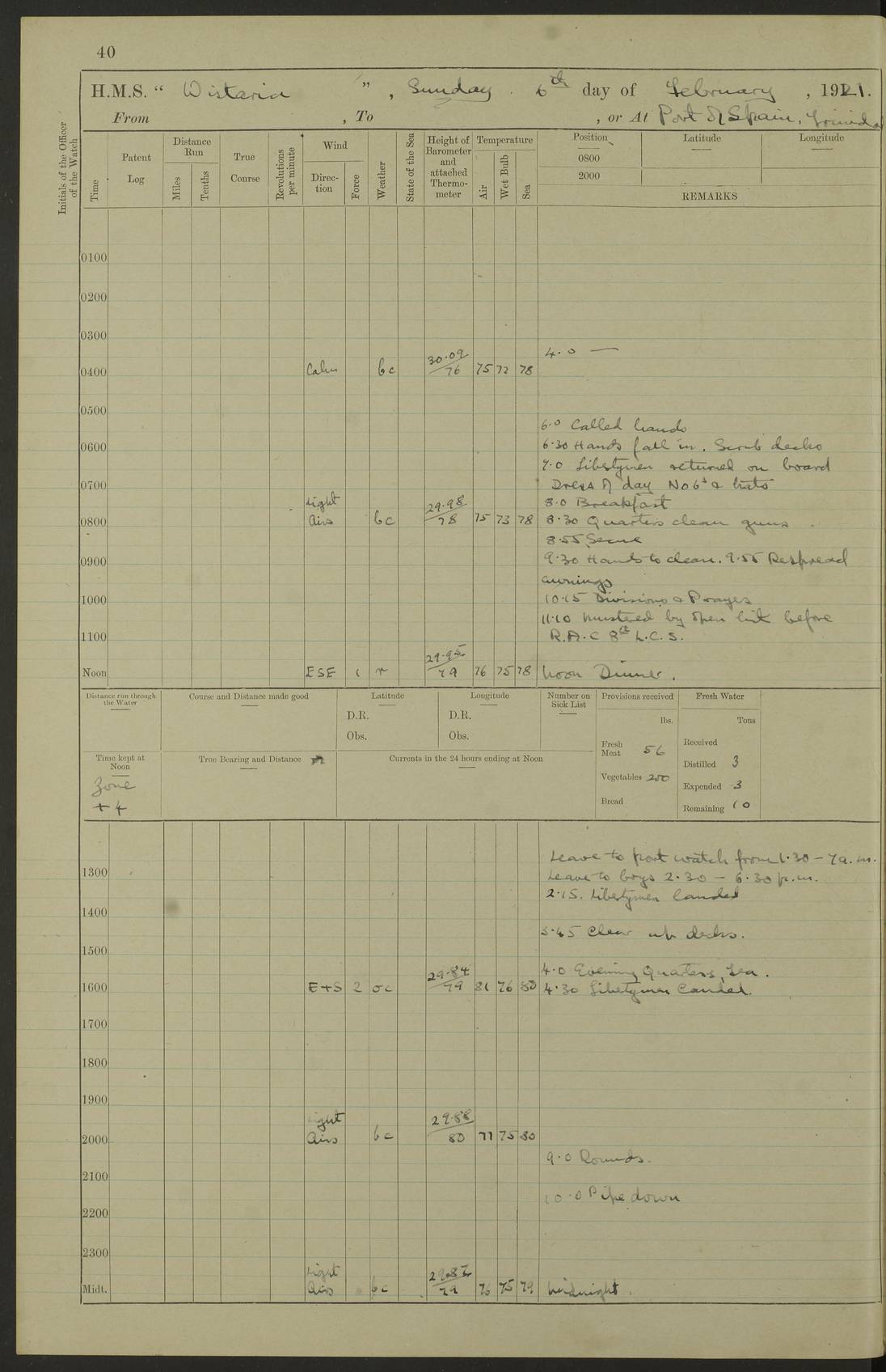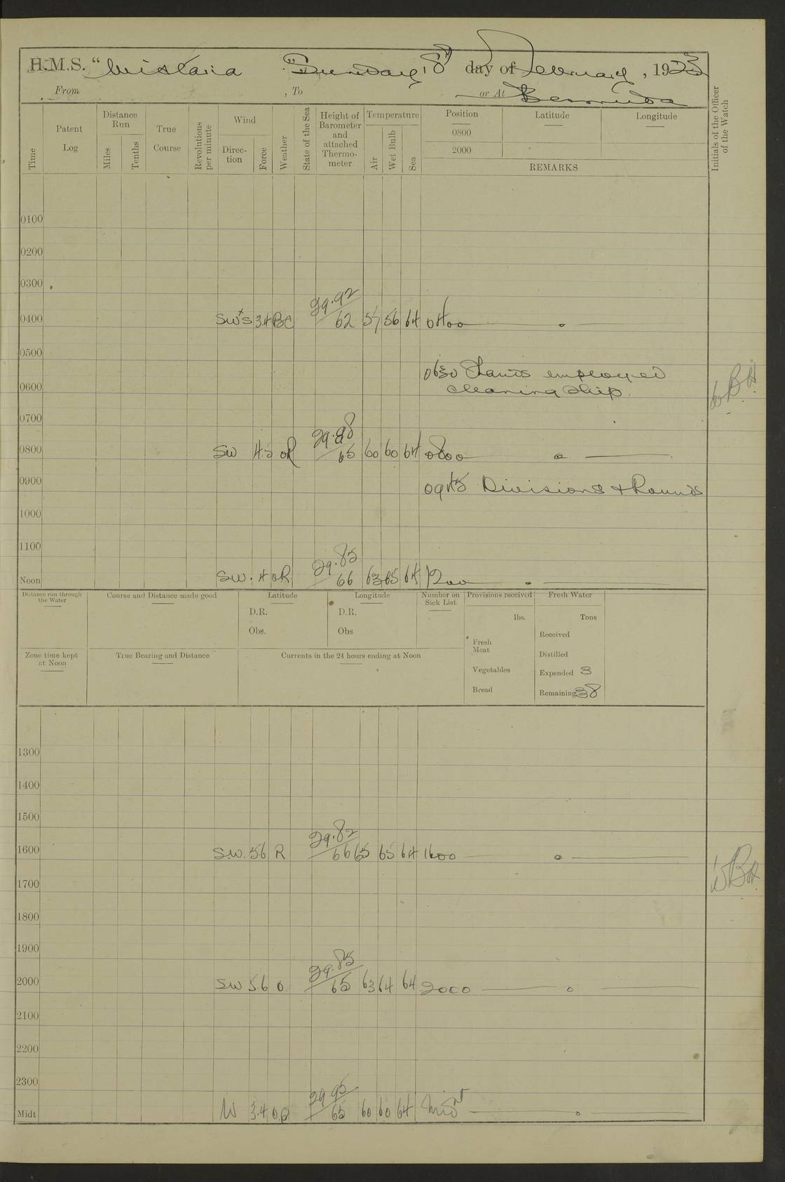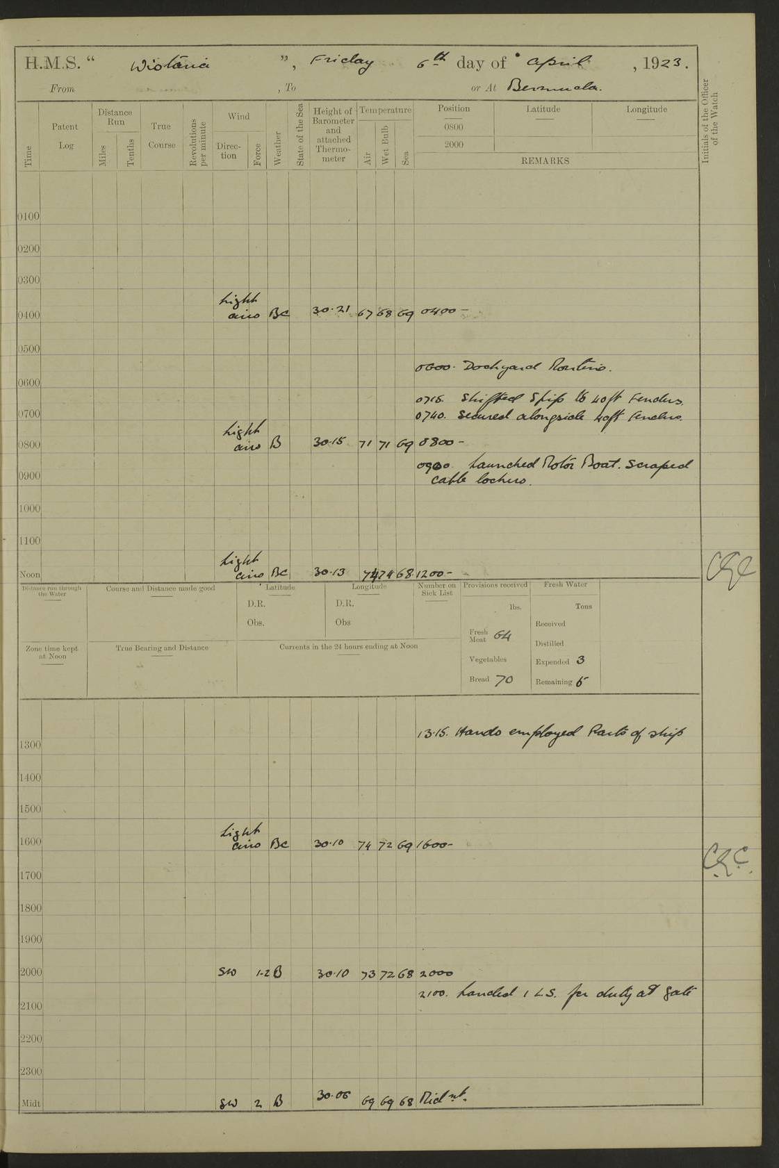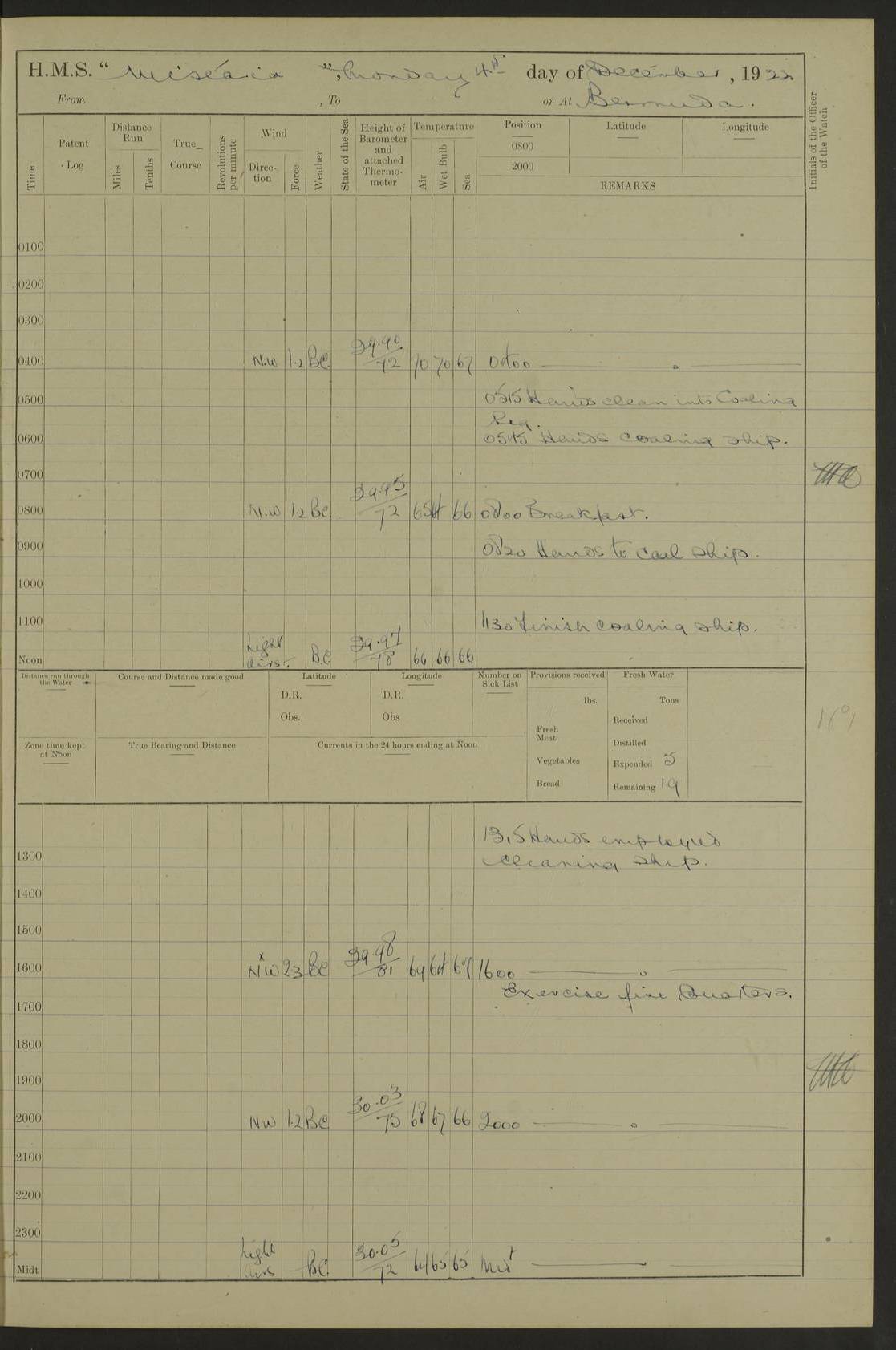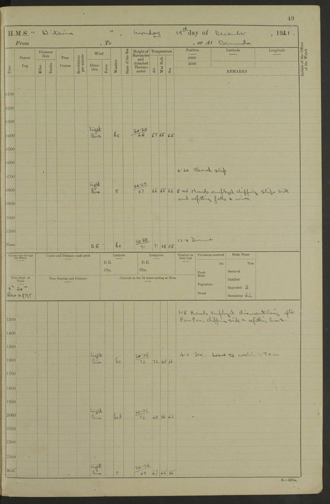 LOGS FOR DECEMBER 1920 4f73c9e6a2fc8ea903000965: (https://s3.amazonaws.com:443/oldweather/ADM53-93259/0003_1.jpg) 29 December 1920 At Devonport Lat 50.38, Long -4.19 9.0am: Commissioned with Chatham Crew 11.55am: Cooks to galley am: Sub Lt Jenks joined ship 1.10pm: Out pipes 1.15pm: Hands fall in. Employed in scrubbing and washing upper deck 3.30pm: Leave to 1st and 2nd watches 4 pm-7 am. Liberty men to clean 4.0pm: Liberty men fall in. Tea 4.15pm: Sunset 5.0pm: Liberty men fall in 6.0pm: Liberty men fall in 7.10pm: 1st Lieutenant returned from sick berth 7.15pm: Supper 8.0pm: Stand by hammocks 8.40pm: Clear off mess decks for rounds 9.0pm: Rounds 10.0pm: Pipe down 12.0pm: Rounds correct 4f73c9e7a2fc8ea903000966: (https://s3.amazonaws.com:443/oldweather/ADM53-93259/0004_0.jpg) 30 December 1920 At Devonport Lat 50.38, Long -4.19 6.0am: Called hands 6.30am: Hands fall in. Scrub & wash upper decks 7.20am: Quarters clean guns 7.50am: Secure 8.0am: Breakfast. Dress of day N°3 8.40am: Out pipes. Hands fall in am: Hands working main derrick. 4 hands & 1 Leading Seaman working with Chief Writer with stationery 10.20am: Stand easy 10.30am: Carry on with work 11.0am: Hands getting in provisions 11.30am: Afternoon watchmen to dinner noon: Dinner 1.15pm: Hands fall in. 1 Leading Seaman & hands with Chief Writer. 1 Leading Seaman & 2 AB Electr. Light. 3 AB with ship’s steward. 3 hands cleaning guns 3.40pm: Secure. Clear up decks 4.0pm: Evening Quarters. Sunset 4.24pm: Exercised collision stations 4.30pm: Secure. Tea. Leave to 2nd & 3rd watches 5 pm to 7 am 6.0pm: Liberty men fall in 7.15pm: Supper 8.0pm: Stand by hammocks 9.0pm: Rounds 10.0pm: Pipe down 4f73c9e7a2fc8ea903000967: (https://s3.amazonaws.com:443/oldweather/ADM53-93259/0004_1.jpg) 31 December 1920 At Devonport Lat 50.38, Long -4.19 6.30am: Hands scrubbing & washing upper decks 8.0am: Breakfast & clean Number 3 8.45am: Hands fall in. 6 hands unrigging fore derrick. 4 hands securing wood on upper deck. 3 hands stowing stanchions below decks 10.20am: Stand easy 10.30am: Carry on 10.45am: 4 hands getting in canteen gear 11.55am: Cooks noon: Dinner 1.15pm: Q.D. men unrigging awning stanchions, remainder securing derricks 3.40pm: Secure. Clear up decks 4.0pm: Evening Quarters 4.05pm: Tea 4.20pm: Sunset 7.10pm: Supper 8.0pm: Stand by hammocks LOGS FOR JANUARY 1921 4f73c9e7a2fc8ea903000968: (https://s3.amazonaws.com:443/oldweather/ADM53-93259/0005_0.jpg) 1 January 1921 At Devonport Lat 50.38, Long -4.19 6.0am: Called hands 6.30am: Hands fall in. Guard and steerage 7.30am: Store party to breakfast 7.45am: Breakfast 8.15am: Store party left ship 8.45am: Hands fall in. Stowing stanchions 10.20am: Stand easy 10.30am: Carry on with work noon: Dinner. Leave to Port watch 1 pm-7 am Monday. Leave to boys 1 pm to 6 pm pm: Hands make and mend clothes 4.0pm: Tea. Shift into night clothing 8.0pm: Stand by hammocks 4f73c9e8a2fc8ea903000969: (https://s3.amazonaws.com:443/oldweather/ADM53-93259/0005_1.jpg) 2 January 1921 At Devonport Lat 50.38, Long -4.19 7.0am: Hands fall in, scrub upper deck 8.0am: Breakfast and clean Number 2s 8.45am: Clear up decks for divisions 10.0am: Divisions 4.0pm: Tea. Shift into night clothing 8.0pm: Stand by hammocks 8.30pm: Clear up mess decks and flats for rounds 8.55pm: Clear off mess decks for rounds 9.0pm: Rounds 4f73c9e8a2fc8ea90300096a: (https://s3.amazonaws.com:443/oldweather/ADM53-93259/0006_0.jpg) 3 January 1921 At Devonport Lat 50.38, Long -4.19 6.15am: Hands fall in, scrub and wash upper deck 8.0am: Breakfast. Dress of day Number 3s 8.50am: Hands fall in. Stand fast cooks. Hands getting down stanchions and preparing 2nd whaler. Ship commenced basin trials 10.0am: Trial concluded 11.25am: Left dockyard for Number 5 buoy 12.05am: Hands to dinner & clean in refitting rig. Ammunition lighter alongside 1.15pm: Hands getting in ammunition 2.30pm: Lowered motor boat 3.30pm: Finished ammunitioning ship 5.0pm: Liberty men landed. Port watch store ammunition 8.40pm: Clear off mess deck for rounds 4f73c9e9a2fc8ea90300096b: (https://s3.amazonaws.com:443/oldweather/ADM53-93259/0006_1.jpg) 4 January 1921 At Devonport Lat 50.38, Long -4.19 6.30am: Hands fall in. Securing for sea 8.15am: Forecastle men muster on Forecastle, unshackle reeve ship wire 8.45am: Slipped and proceeded. Course and speed as required for full power trial 9.15am: Breakwater Lt Ho abeam 9.20am: Course S30E 10.30am: Altered course NE and as requisite for entering sound 10.55am: Secured to No 1 buoy (Sound) 11.30am: Made fast to buoy. Tug swung ship for compasses 1.0pm: Finished swinging for compasses. Forecastle men muster on forecastle 1.15pm: Entered harbour 2.15pm: Secured alongside wall 2.20pm: Coal lighter secured alongside 2.40pm: Hands to clear in coaling rig 3.0pm: Hands coal ship 4.55pm: Finished coaling 5.20pm: Hands fall in wash down decks 6.20pm: Hands paid 8.0pm: Stand by hammocks 8.20pm: Clear up mess decks for rounds 4f73c9e9a2fc8ea90300096c: (https://s3.amazonaws.com:443/oldweather/ADM53-93259/0007_0.jpg) 5 January 1921 At Devonport Lat 50.38, Long -4.19 6.30am: Hands fall in. Guard and steerage 8.0am: Carpenter & 4 hands employed in dockyard 8.10am: Ash lighter alongside 8.45am: Hands securing ship for sea 10.30am: Carry on. Hands to General Quarters 11.15am: Quarters clean guns 11.30am: Secure. Return rags 11.35am: Clear up decks noon: Store party returned. Hands to dinner 1.15pm: Hands fall in. 4 hands with carpenter, 2 with steward. Remainder securing ship for sea 4f73c9e9a2fc8ea90300096d: (https://s3.amazonaws.com:443/oldweather/ADM53-93259/0007_1.jpg) 6 January 1921 At Devonport Lat 50.38, Long -4.19 8.30am: Hands employed cleaning ship 10.50am: Chief of Staff inspected ship 11.33am: Chief of Staff left ship Ice sent. 12 cases received on board 1.15pm: Hands fall in. Getting in beef and replacing motor boats davit 2.0pm: 1 Leading Stoker discharged to hospital 4f73c9eaa2fc8ea90300096e: (https://s3.amazonaws.com:443/oldweather/ADM53-93259/00