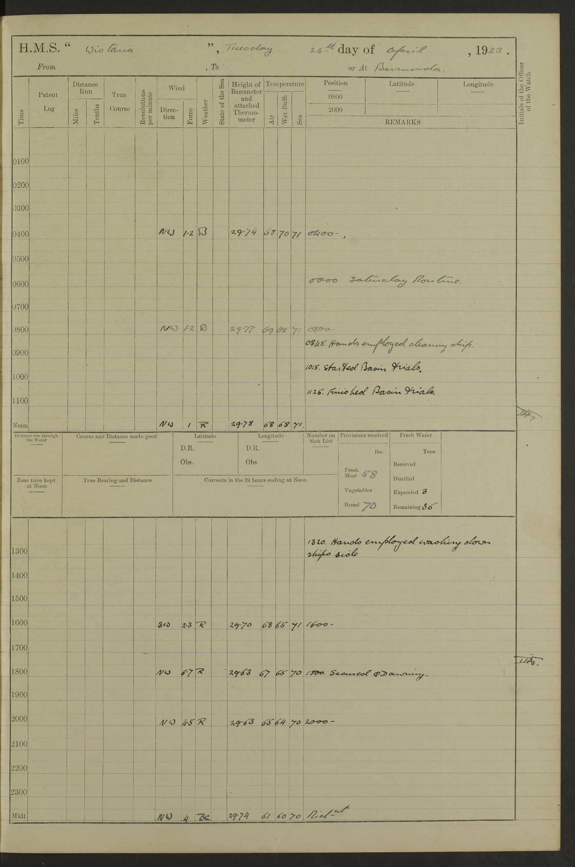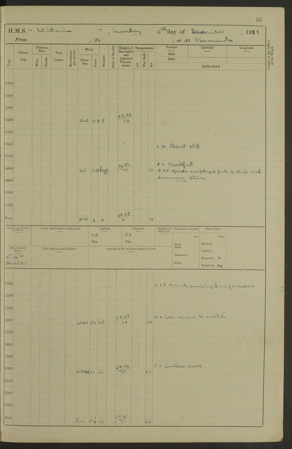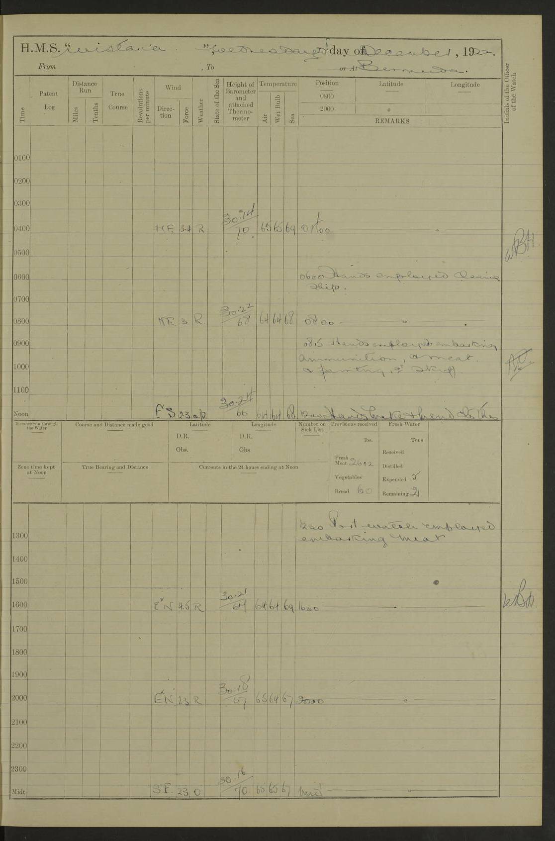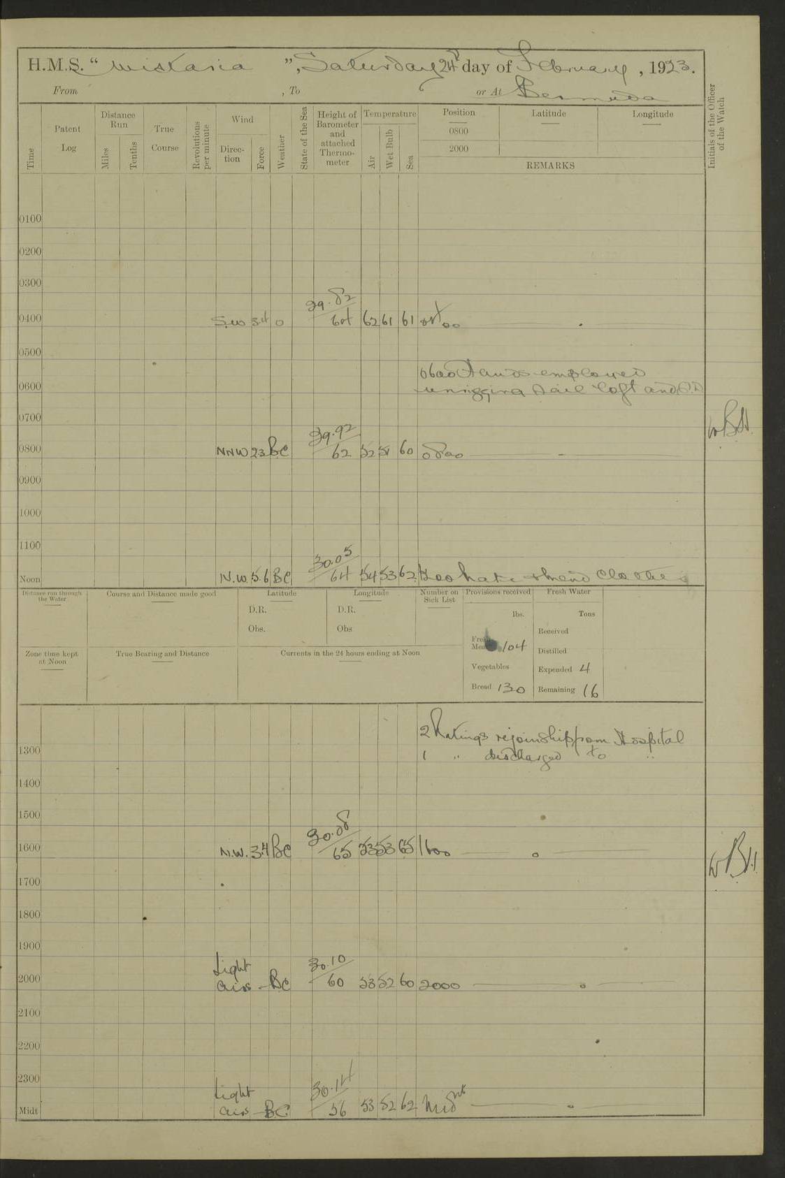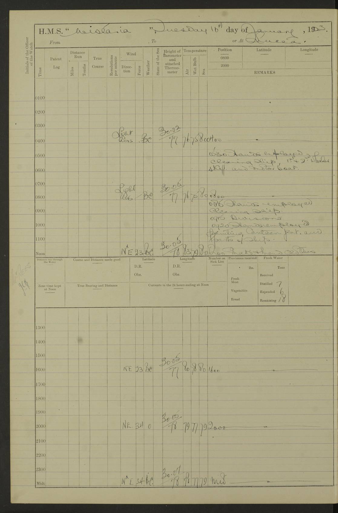 LOGS FOR DECEMBER 1920 4f73c9e6a2fc8ea903000965: (https://s3.amazonaws.com:443/oldweather/ADM53-93259/0003_1.jpg) 29 December 1920 At Devonport Lat 50.38, Long -4.19 9.0am: Commissioned with Chatham Crew 11.55am: Cooks to galley am: Sub Lt Jenks joined ship 1.10pm: Out pipes 1.15pm: Hands fall in. Employed in scrubbing and washing upper deck 3.30pm: Leave to 1st and 2nd watches 4 pm-7 am. Liberty men to clean 4.0pm: Liberty men fall in. Tea 4.15pm: Sunset 5.0pm: Liberty men fall in 6.0pm: Liberty men fall in 7.10pm: 1st Lieutenant returned from sick berth 7.15pm: Supper 8.0pm: Stand by hammocks 8.40pm: Clear off mess decks for rounds 9.0pm: Rounds 10.0pm: Pipe down 12.0pm: Rounds correct 4f73c9e7a2fc8ea903000966: (https://s3.amazonaws.com:443/oldweather/ADM53-93259/0004_0.jpg) 30 December 1920 At Devonport Lat 50.38, Long -4.19 6.0am: Called hands 6.30am: Hands fall in. Scrub & wash upper decks 7.20am: Quarters clean guns 7.50am: Secure 8.0am: Breakfast. Dress of day N°3 8.40am: Out pipes. Hands fall in am: Hands working main derrick. 4 hands & 1 Leading Seaman working with Chief Writer with stationery 10.20am: Stand easy 10.30am: Carry on with work 11.0am: Hands getting in provisions 11.30am: Afternoon watchmen to dinner noon: Dinner 1.15pm: Hands fall in. 1 Leading Seaman & hands with Chief Writer. 1 Leading Seaman & 2 AB Electr. Light. 3 AB with ship’s steward. 3 hands cleaning guns 3.40pm: Secure. Clear up decks 4.0pm: Evening Quarters. Sunset 4.24pm: Exercised collision stations 4.30pm: Secure. Tea. Leave to 2nd & 3rd watches 5 pm to 7 am 6.0pm: Liberty men fall in 7.15pm: Supper 8.0pm: Stand by hammocks 9.0pm: Rounds 10.0pm: Pipe down 4f73c9e7a2fc8ea903000967: (https://s3.amazonaws.com:443/oldweather/ADM53-93259/0004_1.jpg) 31 December 1920 At Devonport Lat 50.38, Long -4.19 6.30am: Hands scrubbing & washing upper decks 8.0am: Breakfast & clean Number 3 8.45am: Hands fall in. 6 hands unrigging fore derrick. 4 hands securing wood on upper deck. 3 hands stowing stanchions below decks 10.20am: Stand easy 10.30am: Carry on 10.45am: 4 hands getting in canteen gear 11.55am: Cooks noon: Dinner 1.15pm: Q.D. men unrigging awning stanchions, remainder securing derricks 3.40pm: Secure. Clear up decks 4.0pm: Evening Quarters 4.05pm: Tea 4.20pm: Sunset 7.10pm: Supper 8.0pm: Stand by hammocks LOGS FOR JANUARY 1921 4f73c9e7a2fc8ea903000968: (https://s3.amazonaws.com:443/oldweather/ADM53-93259/0005_0.jpg) 1 January 1921 At Devonport Lat 50.38, Long -4.19 6.0am: Called hands 6.30am: Hands fall in. Guard and steerage 7.30am: Store party to breakfast 7.45am: Breakfast 8.15am: Store party left ship 8.45am: Hands fall in. Stowing stanchions 10.20am: Stand easy 10.30am: Carry on with work noon: Dinner. Leave to Port watch 1 pm-7 am Monday. Leave to boys 1 pm to 6 pm pm: Hands make and mend clothes 4.0pm: Tea. Shift into night clothing 8.0pm: Stand by hammocks 4f73c9e8a2fc8ea903000969: (https://s3.amazonaws.com:443/oldweather/ADM53-93259/0005_1.jpg) 2 January 1921 At Devonport Lat 50.38, Long -4.19 7.0am: Hands fall in, scrub upper deck 8.0am: Breakfast and clean Number 2s 8.45am: Clear up decks for divisions 10.0am: Divisions 4.0pm: Tea. Shift into night clothing 8.0pm: Stand by hammocks 8.30pm: Clear up mess decks and flats for rounds 8.55pm: Clear off mess decks for rounds 9.0pm: Rounds 4f73c9e8a2fc8ea90300096a: (https://s3.amazonaws.com:443/oldweather/ADM53-93259/0006_0.jpg) 3 January 1921 At Devonport Lat 50.38, Long -4.19 6.15am: Hands fall in, scrub and wash upper deck 8.0am: Breakfast. Dress of day Number 3s 8.50am: Hands fall in. Stand fast cooks. Hands getting down stanchions and preparing 2nd whaler. Ship commenced basin trials 10.0am: Trial concluded 11.25am: Left dockyard for Number 5 buoy 12.05am: Hands to dinner & clean in refitting rig. Ammunition lighter alongside 1.15pm: Hands getting in ammunition 2.30pm: Lowered motor boat 3.30pm: Finished ammunitioning ship 5.0pm: Liberty men landed. Port watch store ammunition 8.40pm: Clear off mess deck for rounds 4f73c9e9a2fc8ea90300096b: (https://s3.amazonaws.com:443/oldweather/ADM53-93259/0006_1.jpg) 4 January 1921 At Devonport Lat 50.38, Long -4.19 6.30am: Hands fall in. Securing for sea 8.15am: Forecastle men muster on Forecastle, unshackle reeve ship wire 8.45am: Slipped and proceeded. Course and speed as required for full power trial 9.15am: Breakwater Lt Ho abeam 9.20am: Course S30E 10.30am: Altered course NE and as requisite for entering sound 10.55am: Secured to No 1 buoy (Sound) 11.30am: Made fast to buoy. Tug swung ship for compasses 1.0pm: Finished swinging for compasses. Forecastle men muster on forecastle 1.15pm: Entered harbour 2.15pm: Secured alongside wall 2.20pm: Coal lighter secured alongside 2.40pm: Hands to clear in coaling rig 3.0pm: Hands coal ship 4.55pm: Finished coaling 5.20pm: Hands fall in wash down decks 6.20pm: Hands paid 8.0pm: Stand by hammocks 8.20pm: Clear up mess decks for rounds 4f73c9e9a2fc8ea90300096c: (https://s3.amazonaws.com:443/oldweather/ADM53-93259/0007_0.jpg) 5 January 1921 At Devonport Lat 50.38, Long -4.19 6.30am: Hands fall in. Guard and steerage 8.0am: Carpenter & 4 hands employed in dockyard 8.10am: Ash lighter alongside 8.45am: Hands securing ship for sea 10.30am: Carry on. Hands to General Quarters 11.15am: Quarters clean guns 11.30am: Secure. Return rags 11.35am: Clear up decks noon: Store party returned. Hands to dinner 1.15pm: Hands fall in. 4 hands with carpenter, 2 with steward. Remainder securing ship for sea 4f73c9e9a2fc8ea90300096d: (https://s3.amazonaws.com:443/oldweather/ADM53-93259/0007_1.jpg) 6 January 1921 At Devonport Lat 50.38, Long -4.19 8.30am: Hands employed cleaning ship 10.50am: Chief of Staff inspected ship 11.33am: Chief of Staff left ship Ice sent. 12 cases received on board 1.15pm: Hands fall in. Getting in beef and replacing motor boats davit 2.0pm: 1 Leading Stoker discharged to hospital 4f73c9eaa2fc8ea90300096e: (https://s3.amazonaws.com:443/oldweather/ADM53-93259/00