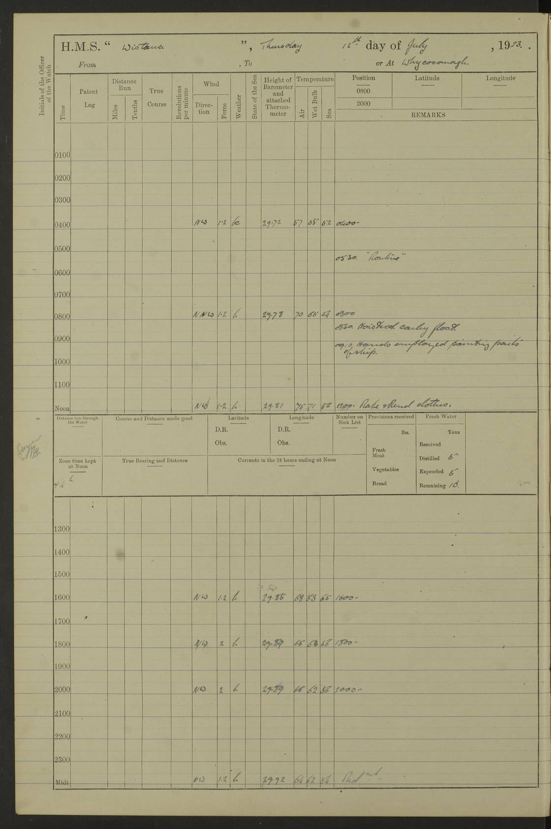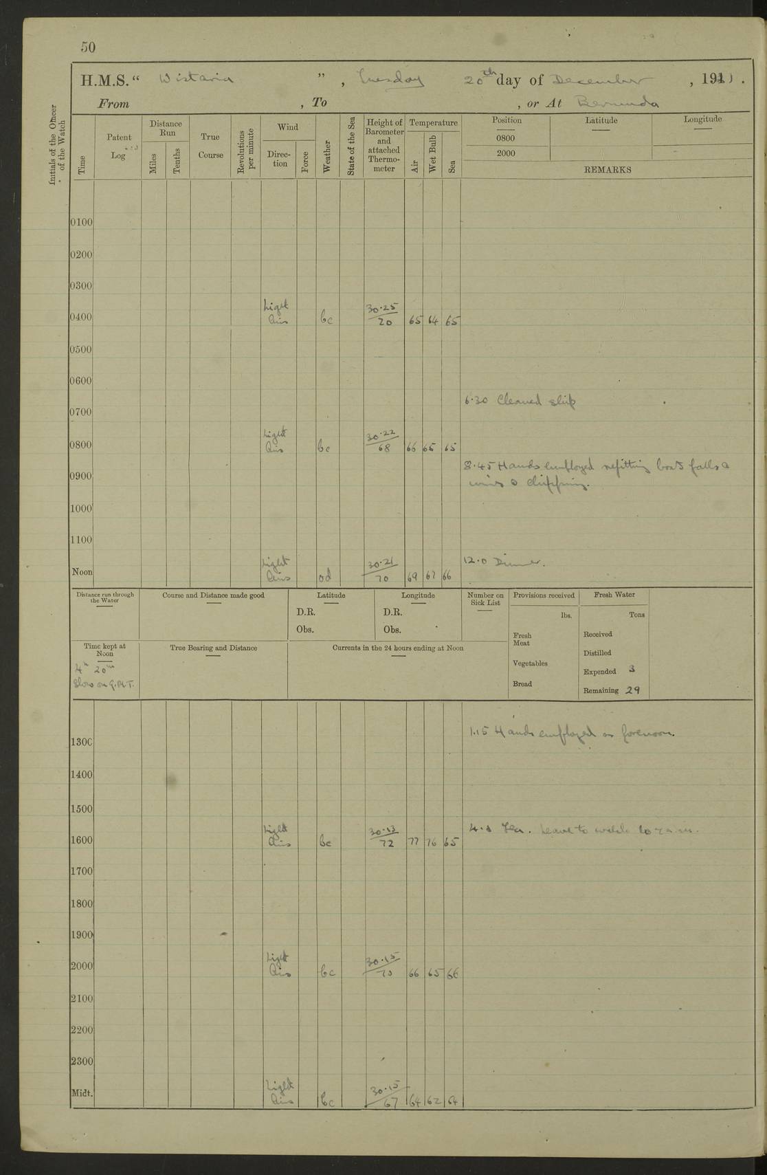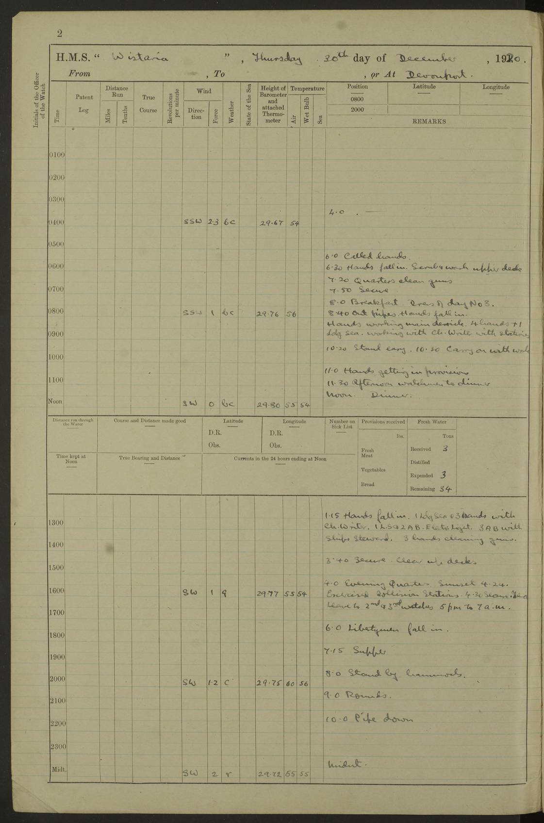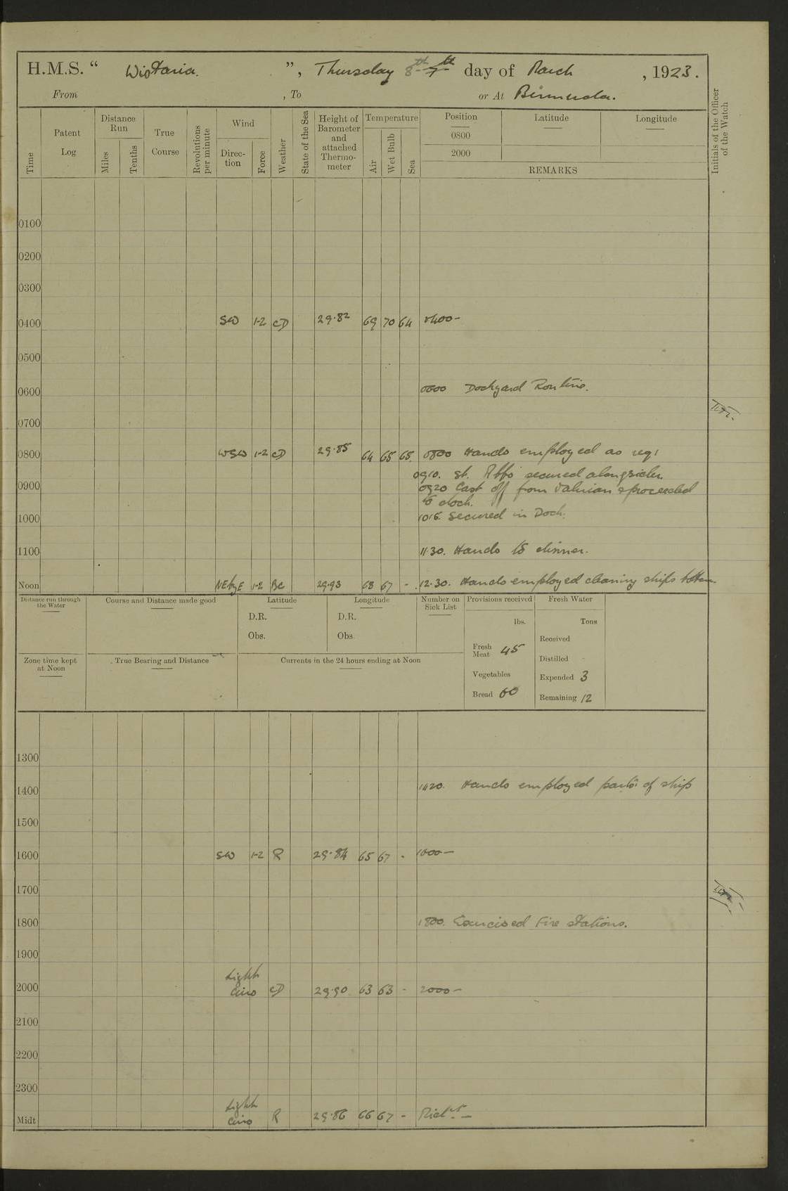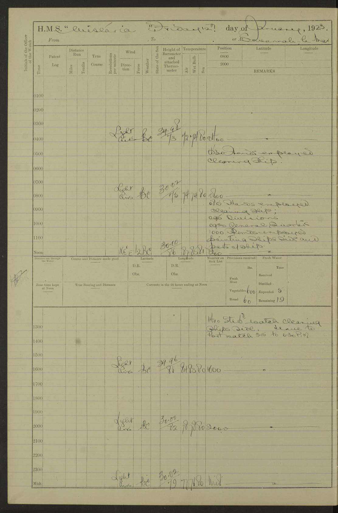 LOGS FOR DECEMBER 1920 4f73c9e6a2fc8ea903000965: (https://s3.amazonaws.com:443/oldweather/ADM53-93259/0003_1.jpg) 29 December 1920 At Devonport Lat 50.38, Long -4.19 9.0am: Commissioned with Chatham Crew 11.55am: Cooks to galley am: Sub Lt Jenks joined ship 1.10pm: Out pipes 1.15pm: Hands fall in. Employed in scrubbing and washing upper deck 3.30pm: Leave to 1st and 2nd watches 4 pm-7 am. Liberty men to clean 4.0pm: Liberty men fall in. Tea 4.15pm: Sunset 5.0pm: Liberty men fall in 6.0pm: Liberty men fall in 7.10pm: 1st Lieutenant returned from sick berth 7.15pm: Supper 8.0pm: Stand by hammocks 8.40pm: Clear off mess decks for rounds 9.0pm: Rounds 10.0pm: Pipe down 12.0pm: Rounds correct 4f73c9e7a2fc8ea903000966: (https://s3.amazonaws.com:443/oldweather/ADM53-93259/0004_0.jpg) 30 December 1920 At Devonport Lat 50.38, Long -4.19 6.0am: Called hands 6.30am: Hands fall in. Scrub & wash upper decks 7.20am: Quarters clean guns 7.50am: Secure 8.0am: Breakfast. Dress of day N°3 8.40am: Out pipes. Hands fall in am: Hands working main derrick. 4 hands & 1 Leading Seaman working with Chief Writer with stationery 10.20am: Stand easy 10.30am: Carry on with work 11.0am: Hands getting in provisions 11.30am: Afternoon watchmen to dinner noon: Dinner 1.15pm: Hands fall in. 1 Leading Seaman & hands with Chief Writer. 1 Leading Seaman & 2 AB Electr. Light. 3 AB with ship’s steward. 3 hands cleaning guns 3.40pm: Secure. Clear up decks 4.0pm: Evening Quarters. Sunset 4.24pm: Exercised collision stations 4.30pm: Secure. Tea. Leave to 2nd & 3rd watches 5 pm to 7 am 6.0pm: Liberty men fall in 7.15pm: Supper 8.0pm: Stand by hammocks 9.0pm: Rounds 10.0pm: Pipe down 4f73c9e7a2fc8ea903000967: (https://s3.amazonaws.com:443/oldweather/ADM53-93259/0004_1.jpg) 31 December 1920 At Devonport Lat 50.38, Long -4.19 6.30am: Hands scrubbing & washing upper decks 8.0am: Breakfast & clean Number 3 8.45am: Hands fall in. 6 hands unrigging fore derrick. 4 hands securing wood on upper deck. 3 hands stowing stanchions below decks 10.20am: Stand easy 10.30am: Carry on 10.45am: 4 hands getting in canteen gear 11.55am: Cooks noon: Dinner 1.15pm: Q.D. men unrigging awning stanchions, remainder securing derricks 3.40pm: Secure. Clear up decks 4.0pm: Evening Quarters 4.05pm: Tea 4.20pm: Sunset 7.10pm: Supper 8.0pm: Stand by hammocks LOGS FOR JANUARY 1921 4f73c9e7a2fc8ea903000968: (https://s3.amazonaws.com:443/oldweather/ADM53-93259/0005_0.jpg) 1 January 1921 At Devonport Lat 50.38, Long -4.19 6.0am: Called hands 6.30am: Hands fall in. Guard and steerage 7.30am: Store party to breakfast 7.45am: Breakfast 8.15am: Store party left ship 8.45am: Hands fall in. Stowing stanchions 10.20am: Stand easy 10.30am: Carry on with work noon: Dinner. Leave to Port watch 1 pm-7 am Monday. Leave to boys 1 pm to 6 pm pm: Hands make and mend clothes 4.0pm: Tea. Shift into night clothing 8.0pm: Stand by hammocks 4f73c9e8a2fc8ea903000969: (https://s3.amazonaws.com:443/oldweather/ADM53-93259/0005_1.jpg) 2 January 1921 At Devonport Lat 50.38, Long -4.19 7.0am: Hands fall in, scrub upper deck 8.0am: Breakfast and clean Number 2s 8.45am: Clear up decks for divisions 10.0am: Divisions 4.0pm: Tea. Shift into night clothing 8.0pm: Stand by hammocks 8.30pm: Clear up mess decks and flats for rounds 8.55pm: Clear off mess decks for rounds 9.0pm: Rounds 4f73c9e8a2fc8ea90300096a: (https://s3.amazonaws.com:443/oldweather/ADM53-93259/0006_0.jpg) 3 January 1921 At Devonport Lat 50.38, Long -4.19 6.15am: Hands fall in, scrub and wash upper deck 8.0am: Breakfast. Dress of day Number 3s 8.50am: Hands fall in. Stand fast cooks. Hands getting down stanchions and preparing 2nd whaler. Ship commenced basin trials 10.0am: Trial concluded 11.25am: Left dockyard for Number 5 buoy 12.05am: Hands to dinner & clean in refitting rig. Ammunition lighter alongside 1.15pm: Hands getting in ammunition 2.30pm: Lowered motor boat 3.30pm: Finished ammunitioning ship 5.0pm: Liberty men landed. Port watch store ammunition 8.40pm: Clear off mess deck for rounds 4f73c9e9a2fc8ea90300096b: (https://s3.amazonaws.com:443/oldweather/ADM53-93259/0006_1.jpg) 4 January 1921 At Devonport Lat 50.38, Long -4.19 6.30am: Hands fall in. Securing for sea 8.15am: Forecastle men muster on Forecastle, unshackle reeve ship wire 8.45am: Slipped and proceeded. Course and speed as required for full power trial 9.15am: Breakwater Lt Ho abeam 9.20am: Course S30E 10.30am: Altered course NE and as requisite for entering sound 10.55am: Secured to No 1 buoy (Sound) 11.30am: Made fast to buoy. Tug swung ship for compasses 1.0pm: Finished swinging for compasses. Forecastle men muster on forecastle 1.15pm: Entered harbour 2.15pm: Secured alongside wall 2.20pm: Coal lighter secured alongside 2.40pm: Hands to clear in coaling rig 3.0pm: Hands coal ship 4.55pm: Finished coaling 5.20pm: Hands fall in wash down decks 6.20pm: Hands paid 8.0pm: Stand by hammocks 8.20pm: Clear up mess decks for rounds 4f73c9e9a2fc8ea90300096c: (https://s3.amazonaws.com:443/oldweather/ADM53-93259/0007_0.jpg) 5 January 1921 At Devonport Lat 50.38, Long -4.19 6.30am: Hands fall in. Guard and steerage 8.0am: Carpenter & 4 hands employed in dockyard 8.10am: Ash lighter alongside 8.45am: Hands securing ship for sea 10.30am: Carry on. Hands to General Quarters 11.15am: Quarters clean guns 11.30am: Secure. Return rags 11.35am: Clear up decks noon: Store party returned. Hands to dinner 1.15pm: Hands fall in. 4 hands with carpenter, 2 with steward. Remainder securing ship for sea 4f73c9e9a2fc8ea90300096d: (https://s3.amazonaws.com:443/oldweather/ADM53-93259/0007_1.jpg) 6 January 1921 At Devonport Lat 50.38, Long -4.19 8.30am: Hands employed cleaning ship 10.50am: Chief of Staff inspected ship 11.33am: Chief of Staff left ship Ice sent. 12 cases received on board 1.15pm: Hands fall in. Getting in beef and replacing motor boats davit 2.0pm: 1 Leading Stoker discharged to hospital 4f73c9eaa2fc8ea90300096e: (https://s3.amazonaws.com:443/oldweather/ADM53-93259/00