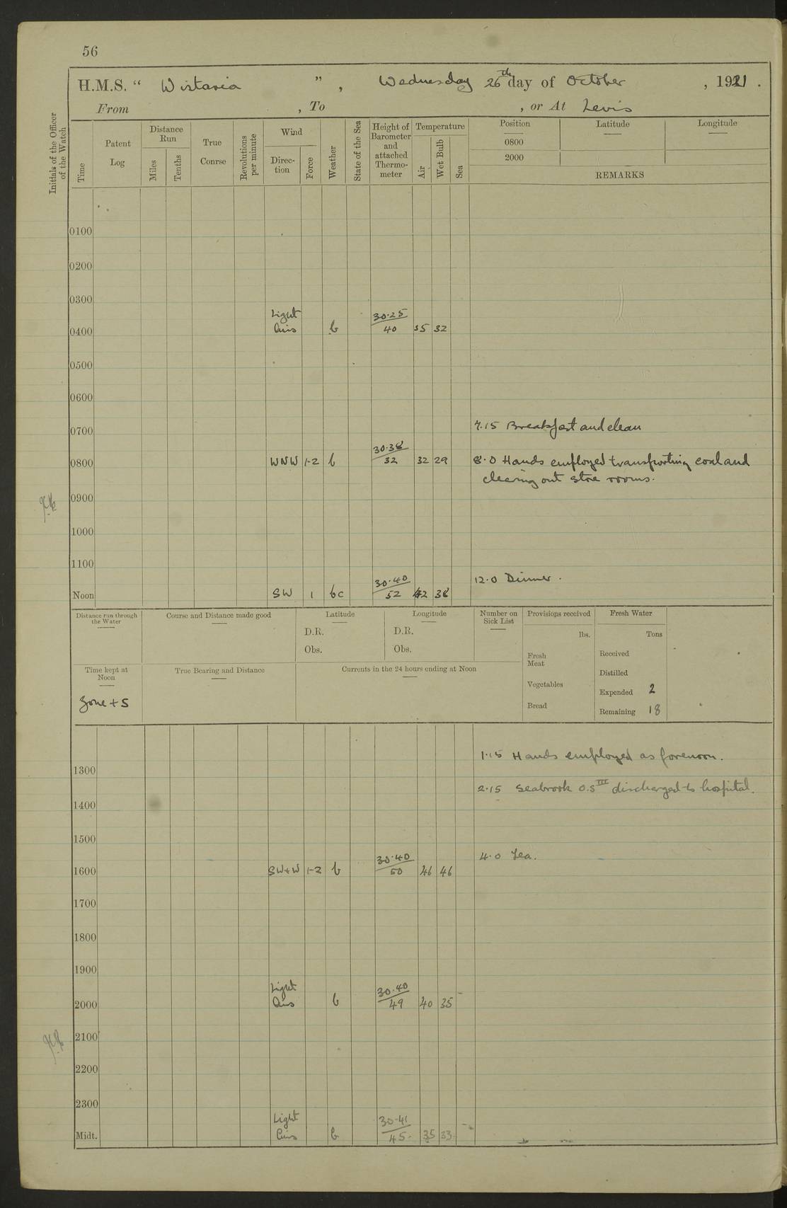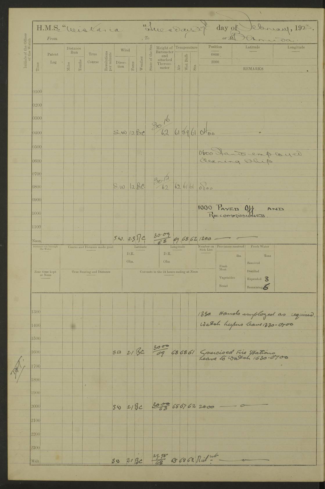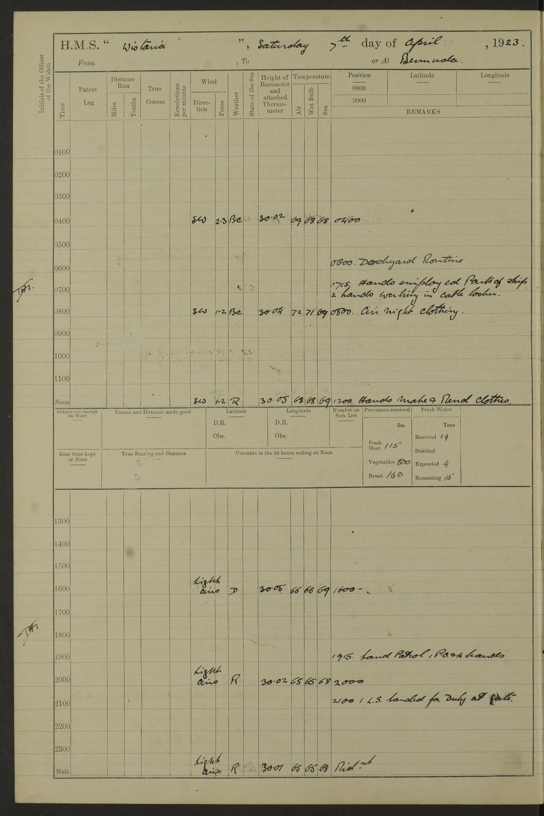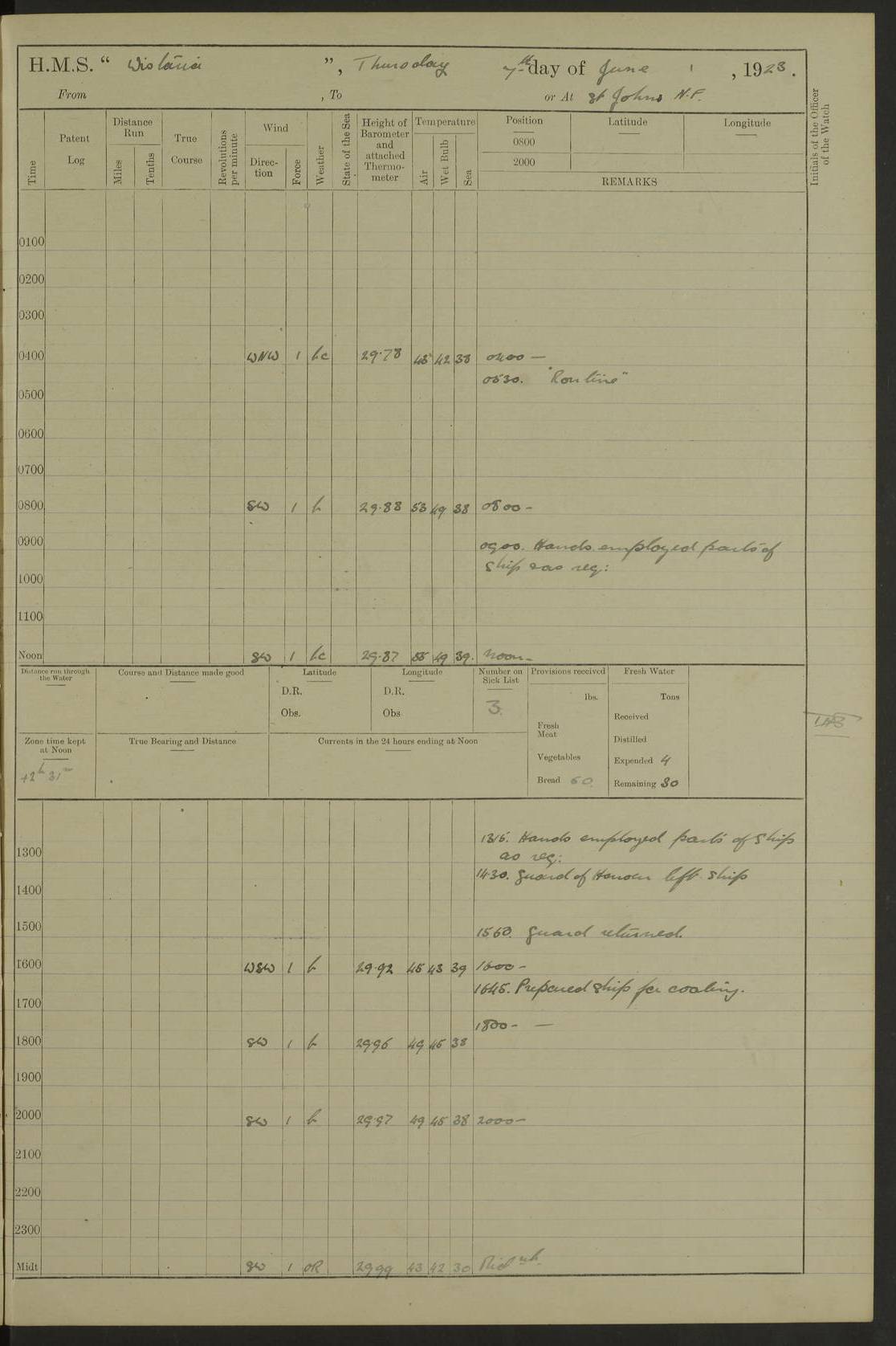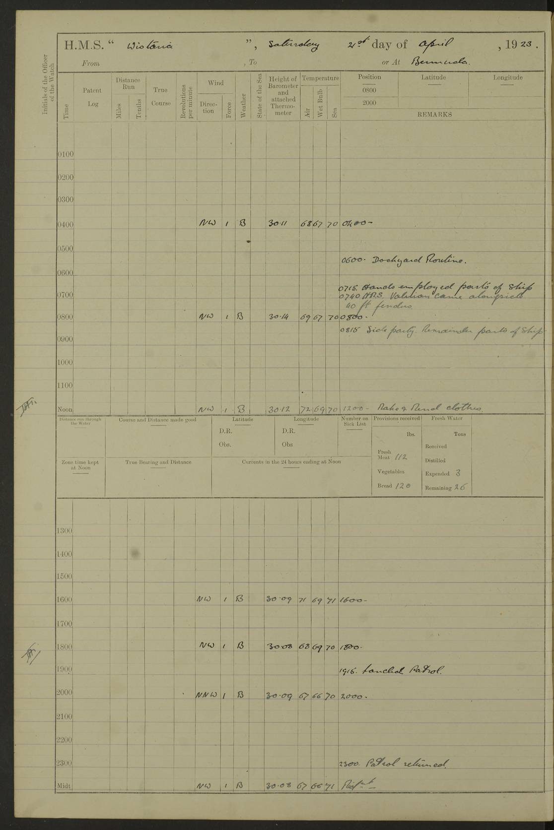 LOGS FOR DECEMBER 1920 4f73c9e6a2fc8ea903000965: (https://s3.amazonaws.com:443/oldweather/ADM53-93259/0003_1.jpg) 29 December 1920 At Devonport Lat 50.38, Long -4.19 9.0am: Commissioned with Chatham Crew 11.55am: Cooks to galley am: Sub Lt Jenks joined ship 1.10pm: Out pipes 1.15pm: Hands fall in. Employed in scrubbing and washing upper deck 3.30pm: Leave to 1st and 2nd watches 4 pm-7 am. Liberty men to clean 4.0pm: Liberty men fall in. Tea 4.15pm: Sunset 5.0pm: Liberty men fall in 6.0pm: Liberty men fall in 7.10pm: 1st Lieutenant returned from sick berth 7.15pm: Supper 8.0pm: Stand by hammocks 8.40pm: Clear off mess decks for rounds 9.0pm: Rounds 10.0pm: Pipe down 12.0pm: Rounds correct 4f73c9e7a2fc8ea903000966: (https://s3.amazonaws.com:443/oldweather/ADM53-93259/0004_0.jpg) 30 December 1920 At Devonport Lat 50.38, Long -4.19 6.0am: Called hands 6.30am: Hands fall in. Scrub & wash upper decks 7.20am: Quarters clean guns 7.50am: Secure 8.0am: Breakfast. Dress of day N°3 8.40am: Out pipes. Hands fall in am: Hands working main derrick. 4 hands & 1 Leading Seaman working with Chief Writer with stationery 10.20am: Stand easy 10.30am: Carry on with work 11.0am: Hands getting in provisions 11.30am: Afternoon watchmen to dinner noon: Dinner 1.15pm: Hands fall in. 1 Leading Seaman & hands with Chief Writer. 1 Leading Seaman & 2 AB Electr. Light. 3 AB with ship’s steward. 3 hands cleaning guns 3.40pm: Secure. Clear up decks 4.0pm: Evening Quarters. Sunset 4.24pm: Exercised collision stations 4.30pm: Secure. Tea. Leave to 2nd & 3rd watches 5 pm to 7 am 6.0pm: Liberty men fall in 7.15pm: Supper 8.0pm: Stand by hammocks 9.0pm: Rounds 10.0pm: Pipe down 4f73c9e7a2fc8ea903000967: (https://s3.amazonaws.com:443/oldweather/ADM53-93259/0004_1.jpg) 31 December 1920 At Devonport Lat 50.38, Long -4.19 6.30am: Hands scrubbing & washing upper decks 8.0am: Breakfast & clean Number 3 8.45am: Hands fall in. 6 hands unrigging fore derrick. 4 hands securing wood on upper deck. 3 hands stowing stanchions below decks 10.20am: Stand easy 10.30am: Carry on 10.45am: 4 hands getting in canteen gear 11.55am: Cooks noon: Dinner 1.15pm: Q.D. men unrigging awning stanchions, remainder securing derricks 3.40pm: Secure. Clear up decks 4.0pm: Evening Quarters 4.05pm: Tea 4.20pm: Sunset 7.10pm: Supper 8.0pm: Stand by hammocks LOGS FOR JANUARY 1921 4f73c9e7a2fc8ea903000968: (https://s3.amazonaws.com:443/oldweather/ADM53-93259/0005_0.jpg) 1 January 1921 At Devonport Lat 50.38, Long -4.19 6.0am: Called hands 6.30am: Hands fall in. Guard and steerage 7.30am: Store party to breakfast 7.45am: Breakfast 8.15am: Store party left ship 8.45am: Hands fall in. Stowing stanchions 10.20am: Stand easy 10.30am: Carry on with work noon: Dinner. Leave to Port watch 1 pm-7 am Monday. Leave to boys 1 pm to 6 pm pm: Hands make and mend clothes 4.0pm: Tea. Shift into night clothing 8.0pm: Stand by hammocks 4f73c9e8a2fc8ea903000969: (https://s3.amazonaws.com:443/oldweather/ADM53-93259/0005_1.jpg) 2 January 1921 At Devonport Lat 50.38, Long -4.19 7.0am: Hands fall in, scrub upper deck 8.0am: Breakfast and clean Number 2s 8.45am: Clear up decks for divisions 10.0am: Divisions 4.0pm: Tea. Shift into night clothing 8.0pm: Stand by hammocks 8.30pm: Clear up mess decks and flats for rounds 8.55pm: Clear off mess decks for rounds 9.0pm: Rounds 4f73c9e8a2fc8ea90300096a: (https://s3.amazonaws.com:443/oldweather/ADM53-93259/0006_0.jpg) 3 January 1921 At Devonport Lat 50.38, Long -4.19 6.15am: Hands fall in, scrub and wash upper deck 8.0am: Breakfast. Dress of day Number 3s 8.50am: Hands fall in. Stand fast cooks. Hands getting down stanchions and preparing 2nd whaler. Ship commenced basin trials 10.0am: Trial concluded 11.25am: Left dockyard for Number 5 buoy 12.05am: Hands to dinner & clean in refitting rig. Ammunition lighter alongside 1.15pm: Hands getting in ammunition 2.30pm: Lowered motor boat 3.30pm: Finished ammunitioning ship 5.0pm: Liberty men landed. Port watch store ammunition 8.40pm: Clear off mess deck for rounds 4f73c9e9a2fc8ea90300096b: (https://s3.amazonaws.com:443/oldweather/ADM53-93259/0006_1.jpg) 4 January 1921 At Devonport Lat 50.38, Long -4.19 6.30am: Hands fall in. Securing for sea 8.15am: Forecastle men muster on Forecastle, unshackle reeve ship wire 8.45am: Slipped and proceeded. Course and speed as required for full power trial 9.15am: Breakwater Lt Ho abeam 9.20am: Course S30E 10.30am: Altered course NE and as requisite for entering sound 10.55am: Secured to No 1 buoy (Sound) 11.30am: Made fast to buoy. Tug swung ship for compasses 1.0pm: Finished swinging for compasses. Forecastle men muster on forecastle 1.15pm: Entered harbour 2.15pm: Secured alongside wall 2.20pm: Coal lighter secured alongside 2.40pm: Hands to clear in coaling rig 3.0pm: Hands coal ship 4.55pm: Finished coaling 5.20pm: Hands fall in wash down decks 6.20pm: Hands paid 8.0pm: Stand by hammocks 8.20pm: Clear up mess decks for rounds 4f73c9e9a2fc8ea90300096c: (https://s3.amazonaws.com:443/oldweather/ADM53-93259/0007_0.jpg) 5 January 1921 At Devonport Lat 50.38, Long -4.19 6.30am: Hands fall in. Guard and steerage 8.0am: Carpenter & 4 hands employed in dockyard 8.10am: Ash lighter alongside 8.45am: Hands securing ship for sea 10.30am: Carry on. Hands to General Quarters 11.15am: Quarters clean guns 11.30am: Secure. Return rags 11.35am: Clear up decks noon: Store party returned. Hands to dinner 1.15pm: Hands fall in. 4 hands with carpenter, 2 with steward. Remainder securing ship for sea 4f73c9e9a2fc8ea90300096d: (https://s3.amazonaws.com:443/oldweather/ADM53-93259/0007_1.jpg) 6 January 1921 At Devonport Lat 50.38, Long -4.19 8.30am: Hands employed cleaning ship 10.50am: Chief of Staff inspected ship 11.33am: Chief of Staff left ship Ice sent. 12 cases received on board 1.15pm: Hands fall in. Getting in beef and replacing motor boats davit 2.0pm: 1 Leading Stoker discharged to hospital 4f73c9eaa2fc8ea90300096e: (https://s3.amazonaws.com:443/oldweather/ADM53-93259/00