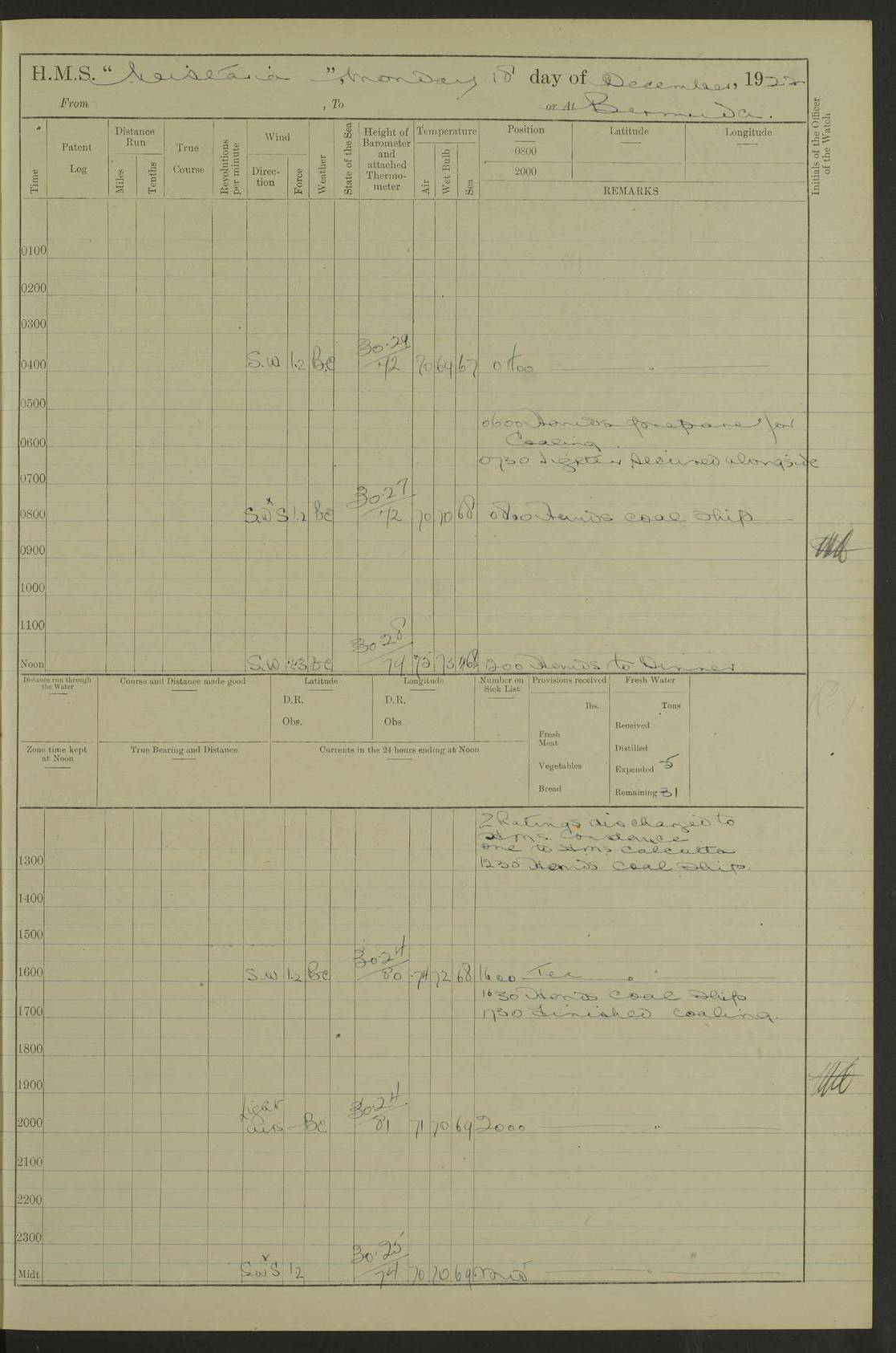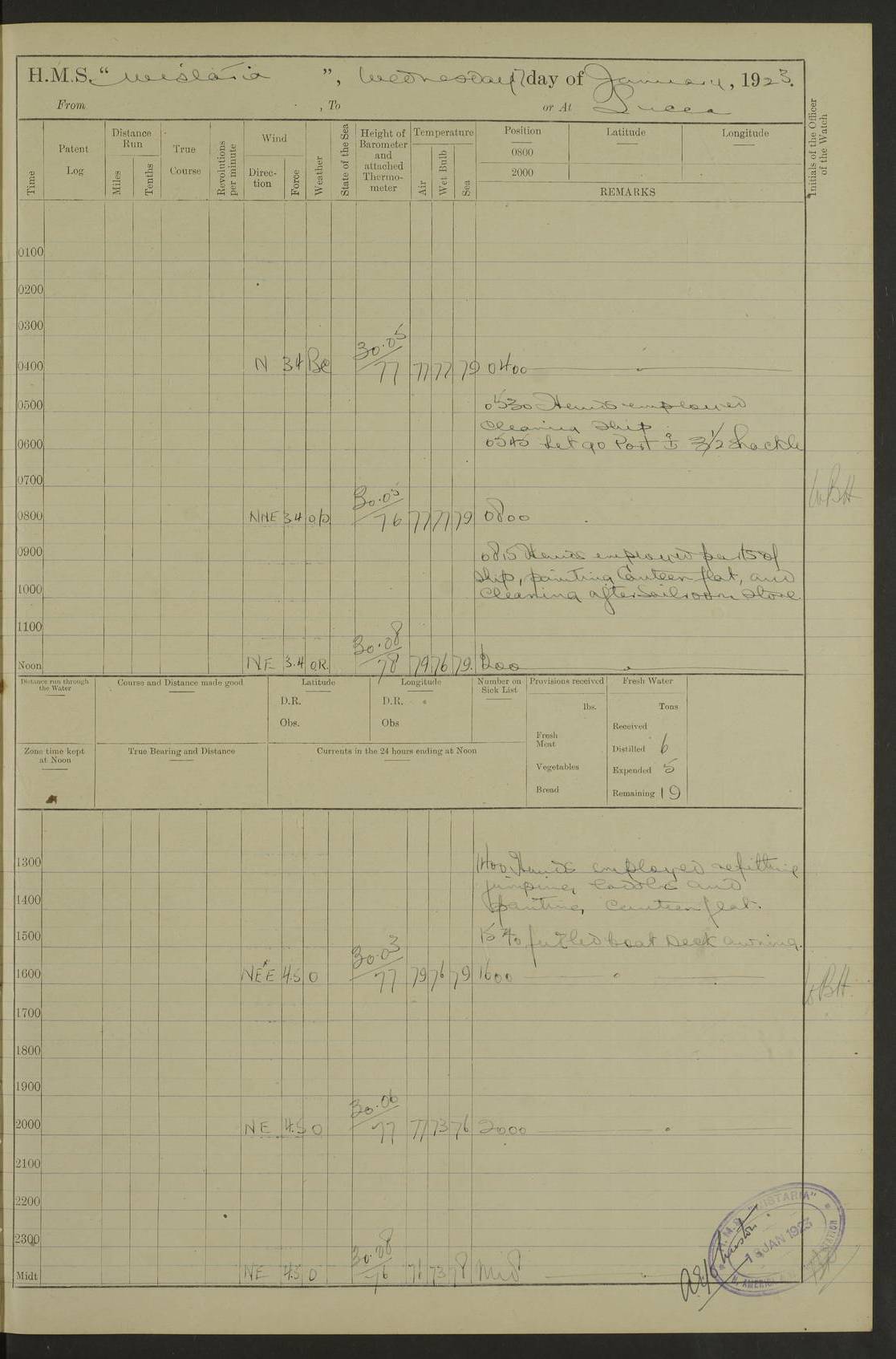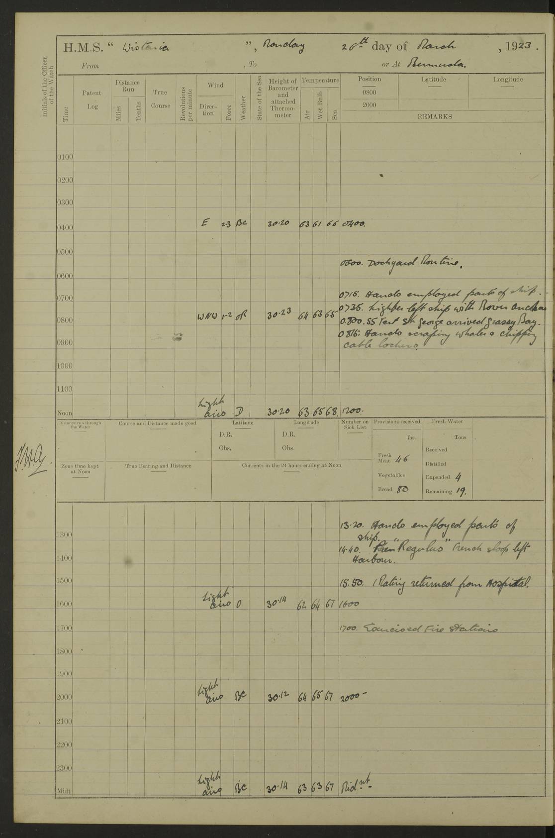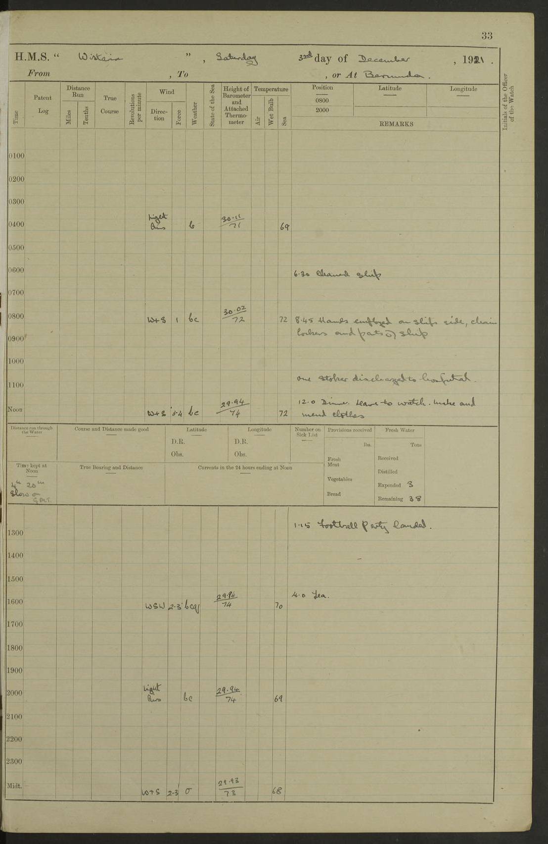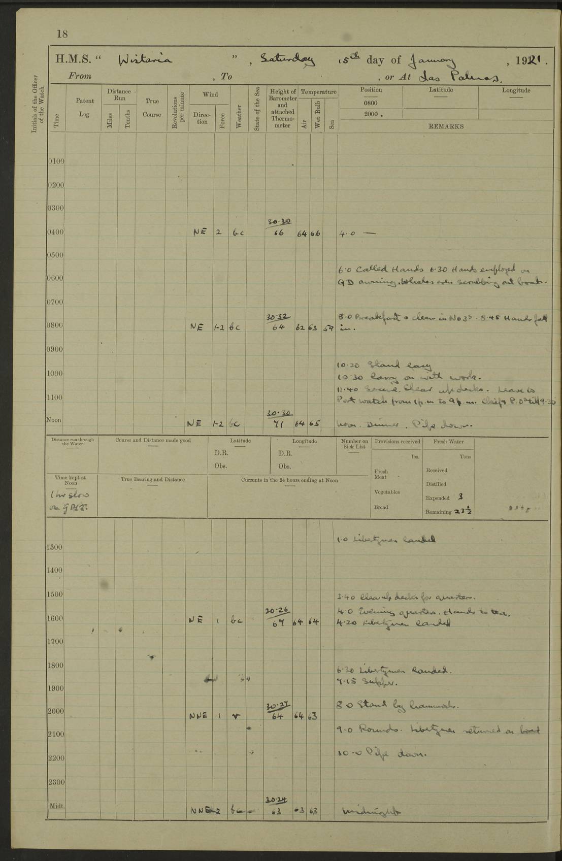 LOGS FOR DECEMBER 1920 4f73c9e6a2fc8ea903000965: (https://s3.amazonaws.com:443/oldweather/ADM53-93259/0003_1.jpg) 29 December 1920 At Devonport Lat 50.38, Long -4.19 9.0am: Commissioned with Chatham Crew 11.55am: Cooks to galley am: Sub Lt Jenks joined ship 1.10pm: Out pipes 1.15pm: Hands fall in. Employed in scrubbing and washing upper deck 3.30pm: Leave to 1st and 2nd watches 4 pm-7 am. Liberty men to clean 4.0pm: Liberty men fall in. Tea 4.15pm: Sunset 5.0pm: Liberty men fall in 6.0pm: Liberty men fall in 7.10pm: 1st Lieutenant returned from sick berth 7.15pm: Supper 8.0pm: Stand by hammocks 8.40pm: Clear off mess decks for rounds 9.0pm: Rounds 10.0pm: Pipe down 12.0pm: Rounds correct 4f73c9e7a2fc8ea903000966: (https://s3.amazonaws.com:443/oldweather/ADM53-93259/0004_0.jpg) 30 December 1920 At Devonport Lat 50.38, Long -4.19 6.0am: Called hands 6.30am: Hands fall in. Scrub & wash upper decks 7.20am: Quarters clean guns 7.50am: Secure 8.0am: Breakfast. Dress of day N°3 8.40am: Out pipes. Hands fall in am: Hands working main derrick. 4 hands & 1 Leading Seaman working with Chief Writer with stationery 10.20am: Stand easy 10.30am: Carry on with work 11.0am: Hands getting in provisions 11.30am: Afternoon watchmen to dinner noon: Dinner 1.15pm: Hands fall in. 1 Leading Seaman & hands with Chief Writer. 1 Leading Seaman & 2 AB Electr. Light. 3 AB with ship’s steward. 3 hands cleaning guns 3.40pm: Secure. Clear up decks 4.0pm: Evening Quarters. Sunset 4.24pm: Exercised collision stations 4.30pm: Secure. Tea. Leave to 2nd & 3rd watches 5 pm to 7 am 6.0pm: Liberty men fall in 7.15pm: Supper 8.0pm: Stand by hammocks 9.0pm: Rounds 10.0pm: Pipe down 4f73c9e7a2fc8ea903000967: (https://s3.amazonaws.com:443/oldweather/ADM53-93259/0004_1.jpg) 31 December 1920 At Devonport Lat 50.38, Long -4.19 6.30am: Hands scrubbing & washing upper decks 8.0am: Breakfast & clean Number 3 8.45am: Hands fall in. 6 hands unrigging fore derrick. 4 hands securing wood on upper deck. 3 hands stowing stanchions below decks 10.20am: Stand easy 10.30am: Carry on 10.45am: 4 hands getting in canteen gear 11.55am: Cooks noon: Dinner 1.15pm: Q.D. men unrigging awning stanchions, remainder securing derricks 3.40pm: Secure. Clear up decks 4.0pm: Evening Quarters 4.05pm: Tea 4.20pm: Sunset 7.10pm: Supper 8.0pm: Stand by hammocks LOGS FOR JANUARY 1921 4f73c9e7a2fc8ea903000968: (https://s3.amazonaws.com:443/oldweather/ADM53-93259/0005_0.jpg) 1 January 1921 At Devonport Lat 50.38, Long -4.19 6.0am: Called hands 6.30am: Hands fall in. Guard and steerage 7.30am: Store party to breakfast 7.45am: Breakfast 8.15am: Store party left ship 8.45am: Hands fall in. Stowing stanchions 10.20am: Stand easy 10.30am: Carry on with work noon: Dinner. Leave to Port watch 1 pm-7 am Monday. Leave to boys 1 pm to 6 pm pm: Hands make and mend clothes 4.0pm: Tea. Shift into night clothing 8.0pm: Stand by hammocks 4f73c9e8a2fc8ea903000969: (https://s3.amazonaws.com:443/oldweather/ADM53-93259/0005_1.jpg) 2 January 1921 At Devonport Lat 50.38, Long -4.19 7.0am: Hands fall in, scrub upper deck 8.0am: Breakfast and clean Number 2s 8.45am: Clear up decks for divisions 10.0am: Divisions 4.0pm: Tea. Shift into night clothing 8.0pm: Stand by hammocks 8.30pm: Clear up mess decks and flats for rounds 8.55pm: Clear off mess decks for rounds 9.0pm: Rounds 4f73c9e8a2fc8ea90300096a: (https://s3.amazonaws.com:443/oldweather/ADM53-93259/0006_0.jpg) 3 January 1921 At Devonport Lat 50.38, Long -4.19 6.15am: Hands fall in, scrub and wash upper deck 8.0am: Breakfast. Dress of day Number 3s 8.50am: Hands fall in. Stand fast cooks. Hands getting down stanchions and preparing 2nd whaler. Ship commenced basin trials 10.0am: Trial concluded 11.25am: Left dockyard for Number 5 buoy 12.05am: Hands to dinner & clean in refitting rig. Ammunition lighter alongside 1.15pm: Hands getting in ammunition 2.30pm: Lowered motor boat 3.30pm: Finished ammunitioning ship 5.0pm: Liberty men landed. Port watch store ammunition 8.40pm: Clear off mess deck for rounds 4f73c9e9a2fc8ea90300096b: (https://s3.amazonaws.com:443/oldweather/ADM53-93259/0006_1.jpg) 4 January 1921 At Devonport Lat 50.38, Long -4.19 6.30am: Hands fall in. Securing for sea 8.15am: Forecastle men muster on Forecastle, unshackle reeve ship wire 8.45am: Slipped and proceeded. Course and speed as required for full power trial 9.15am: Breakwater Lt Ho abeam 9.20am: Course S30E 10.30am: Altered course NE and as requisite for entering sound 10.55am: Secured to No 1 buoy (Sound) 11.30am: Made fast to buoy. Tug swung ship for compasses 1.0pm: Finished swinging for compasses. Forecastle men muster on forecastle 1.15pm: Entered harbour 2.15pm: Secured alongside wall 2.20pm: Coal lighter secured alongside 2.40pm: Hands to clear in coaling rig 3.0pm: Hands coal ship 4.55pm: Finished coaling 5.20pm: Hands fall in wash down decks 6.20pm: Hands paid 8.0pm: Stand by hammocks 8.20pm: Clear up mess decks for rounds 4f73c9e9a2fc8ea90300096c: (https://s3.amazonaws.com:443/oldweather/ADM53-93259/0007_0.jpg) 5 January 1921 At Devonport Lat 50.38, Long -4.19 6.30am: Hands fall in. Guard and steerage 8.0am: Carpenter & 4 hands employed in dockyard 8.10am: Ash lighter alongside 8.45am: Hands securing ship for sea 10.30am: Carry on. Hands to General Quarters 11.15am: Quarters clean guns 11.30am: Secure. Return rags 11.35am: Clear up decks noon: Store party returned. Hands to dinner 1.15pm: Hands fall in. 4 hands with carpenter, 2 with steward. Remainder securing ship for sea 4f73c9e9a2fc8ea90300096d: (https://s3.amazonaws.com:443/oldweather/ADM53-93259/0007_1.jpg) 6 January 1921 At Devonport Lat 50.38, Long -4.19 8.30am: Hands employed cleaning ship 10.50am: Chief of Staff inspected ship 11.33am: Chief of Staff left ship Ice sent. 12 cases received on board 1.15pm: Hands fall in. Getting in beef and replacing motor boats davit 2.0pm: 1 Leading Stoker discharged to hospital 4f73c9eaa2fc8ea90300096e: (https://s3.amazonaws.com:443/oldweather/ADM53-93259/00