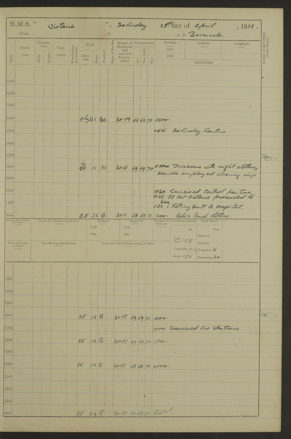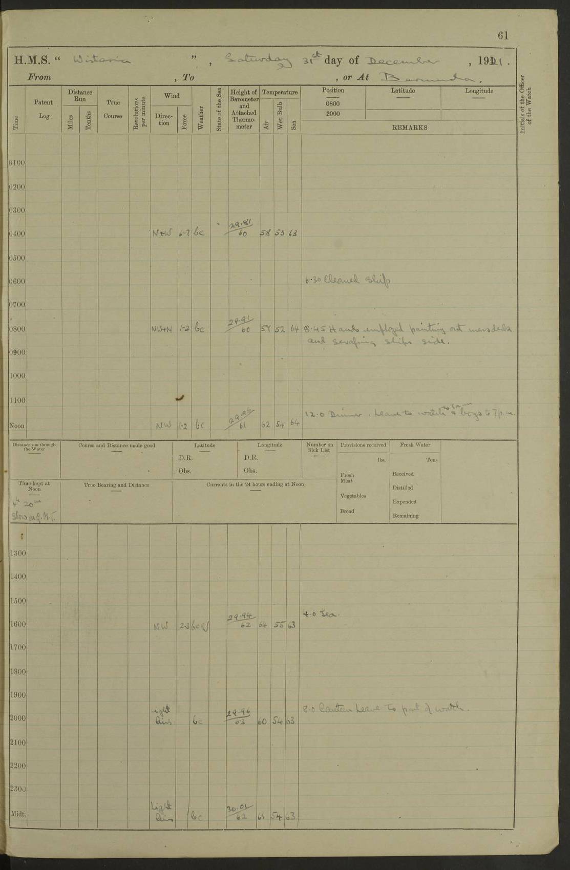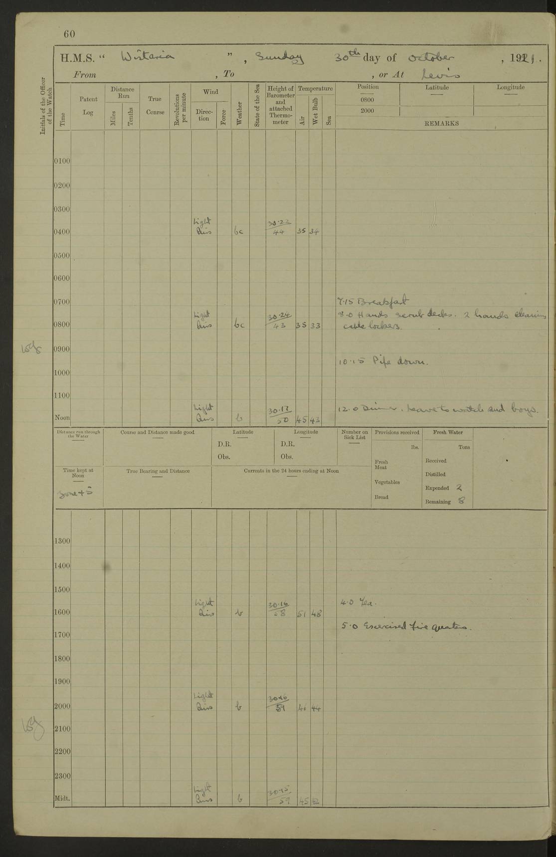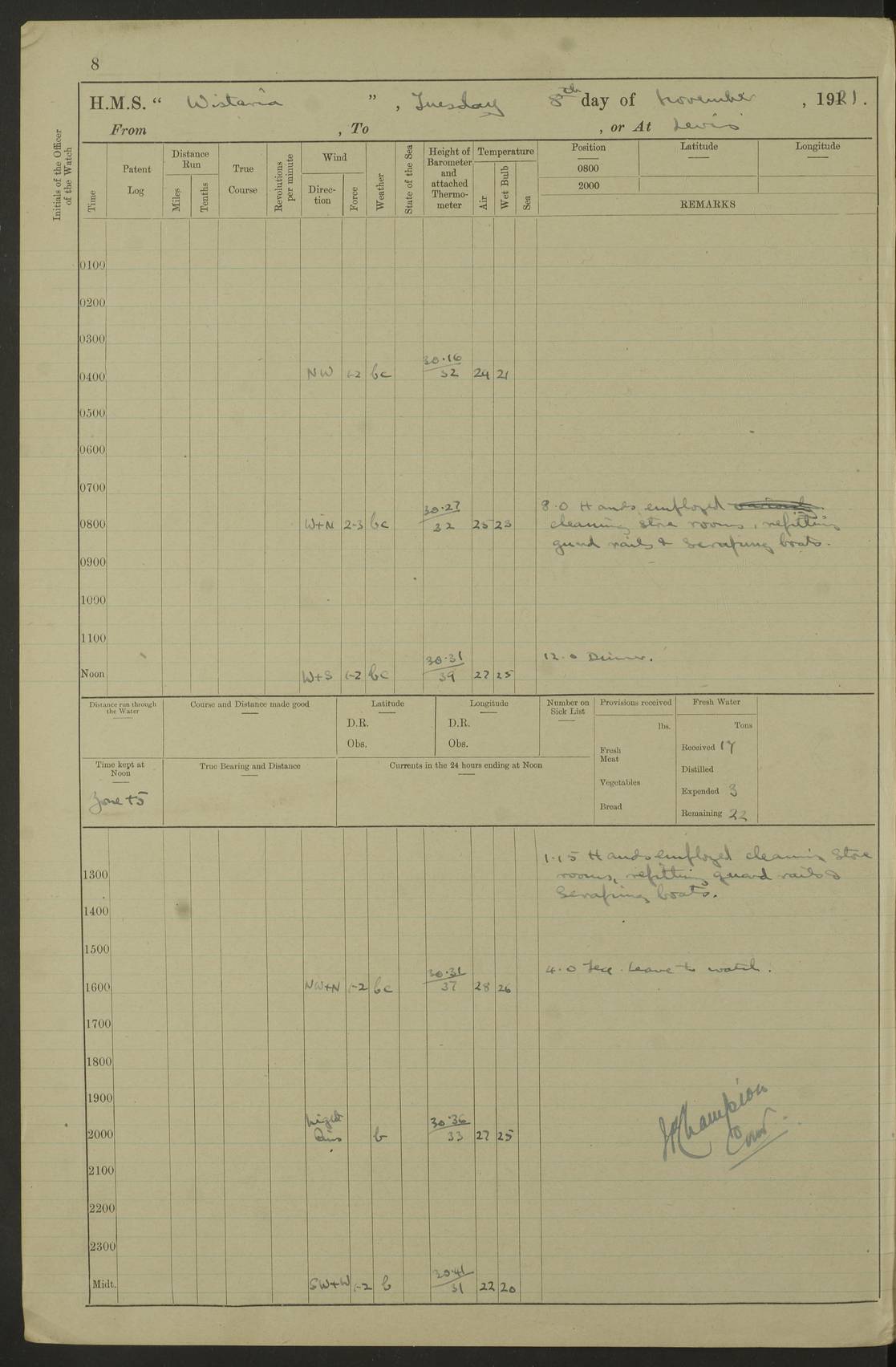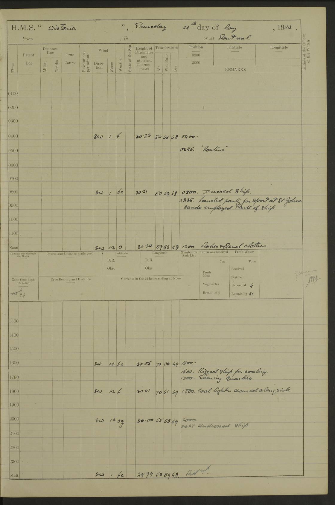 LOGS FOR DECEMBER 1920 4f73c9e6a2fc8ea903000965: (https://s3.amazonaws.com:443/oldweather/ADM53-93259/0003_1.jpg) 29 December 1920 At Devonport Lat 50.38, Long -4.19 9.0am: Commissioned with Chatham Crew 11.55am: Cooks to galley am: Sub Lt Jenks joined ship 1.10pm: Out pipes 1.15pm: Hands fall in. Employed in scrubbing and washing upper deck 3.30pm: Leave to 1st and 2nd watches 4 pm-7 am. Liberty men to clean 4.0pm: Liberty men fall in. Tea 4.15pm: Sunset 5.0pm: Liberty men fall in 6.0pm: Liberty men fall in 7.10pm: 1st Lieutenant returned from sick berth 7.15pm: Supper 8.0pm: Stand by hammocks 8.40pm: Clear off mess decks for rounds 9.0pm: Rounds 10.0pm: Pipe down 12.0pm: Rounds correct 4f73c9e7a2fc8ea903000966: (https://s3.amazonaws.com:443/oldweather/ADM53-93259/0004_0.jpg) 30 December 1920 At Devonport Lat 50.38, Long -4.19 6.0am: Called hands 6.30am: Hands fall in. Scrub & wash upper decks 7.20am: Quarters clean guns 7.50am: Secure 8.0am: Breakfast. Dress of day N°3 8.40am: Out pipes. Hands fall in am: Hands working main derrick. 4 hands & 1 Leading Seaman working with Chief Writer with stationery 10.20am: Stand easy 10.30am: Carry on with work 11.0am: Hands getting in provisions 11.30am: Afternoon watchmen to dinner noon: Dinner 1.15pm: Hands fall in. 1 Leading Seaman & hands with Chief Writer. 1 Leading Seaman & 2 AB Electr. Light. 3 AB with ship’s steward. 3 hands cleaning guns 3.40pm: Secure. Clear up decks 4.0pm: Evening Quarters. Sunset 4.24pm: Exercised collision stations 4.30pm: Secure. Tea. Leave to 2nd & 3rd watches 5 pm to 7 am 6.0pm: Liberty men fall in 7.15pm: Supper 8.0pm: Stand by hammocks 9.0pm: Rounds 10.0pm: Pipe down 4f73c9e7a2fc8ea903000967: (https://s3.amazonaws.com:443/oldweather/ADM53-93259/0004_1.jpg) 31 December 1920 At Devonport Lat 50.38, Long -4.19 6.30am: Hands scrubbing & washing upper decks 8.0am: Breakfast & clean Number 3 8.45am: Hands fall in. 6 hands unrigging fore derrick. 4 hands securing wood on upper deck. 3 hands stowing stanchions below decks 10.20am: Stand easy 10.30am: Carry on 10.45am: 4 hands getting in canteen gear 11.55am: Cooks noon: Dinner 1.15pm: Q.D. men unrigging awning stanchions, remainder securing derricks 3.40pm: Secure. Clear up decks 4.0pm: Evening Quarters 4.05pm: Tea 4.20pm: Sunset 7.10pm: Supper 8.0pm: Stand by hammocks LOGS FOR JANUARY 1921 4f73c9e7a2fc8ea903000968: (https://s3.amazonaws.com:443/oldweather/ADM53-93259/0005_0.jpg) 1 January 1921 At Devonport Lat 50.38, Long -4.19 6.0am: Called hands 6.30am: Hands fall in. Guard and steerage 7.30am: Store party to breakfast 7.45am: Breakfast 8.15am: Store party left ship 8.45am: Hands fall in. Stowing stanchions 10.20am: Stand easy 10.30am: Carry on with work noon: Dinner. Leave to Port watch 1 pm-7 am Monday. Leave to boys 1 pm to 6 pm pm: Hands make and mend clothes 4.0pm: Tea. Shift into night clothing 8.0pm: Stand by hammocks 4f73c9e8a2fc8ea903000969: (https://s3.amazonaws.com:443/oldweather/ADM53-93259/0005_1.jpg) 2 January 1921 At Devonport Lat 50.38, Long -4.19 7.0am: Hands fall in, scrub upper deck 8.0am: Breakfast and clean Number 2s 8.45am: Clear up decks for divisions 10.0am: Divisions 4.0pm: Tea. Shift into night clothing 8.0pm: Stand by hammocks 8.30pm: Clear up mess decks and flats for rounds 8.55pm: Clear off mess decks for rounds 9.0pm: Rounds 4f73c9e8a2fc8ea90300096a: (https://s3.amazonaws.com:443/oldweather/ADM53-93259/0006_0.jpg) 3 January 1921 At Devonport Lat 50.38, Long -4.19 6.15am: Hands fall in, scrub and wash upper deck 8.0am: Breakfast. Dress of day Number 3s 8.50am: Hands fall in. Stand fast cooks. Hands getting down stanchions and preparing 2nd whaler. Ship commenced basin trials 10.0am: Trial concluded 11.25am: Left dockyard for Number 5 buoy 12.05am: Hands to dinner & clean in refitting rig. Ammunition lighter alongside 1.15pm: Hands getting in ammunition 2.30pm: Lowered motor boat 3.30pm: Finished ammunitioning ship 5.0pm: Liberty men landed. Port watch store ammunition 8.40pm: Clear off mess deck for rounds 4f73c9e9a2fc8ea90300096b: (https://s3.amazonaws.com:443/oldweather/ADM53-93259/0006_1.jpg) 4 January 1921 At Devonport Lat 50.38, Long -4.19 6.30am: Hands fall in. Securing for sea 8.15am: Forecastle men muster on Forecastle, unshackle reeve ship wire 8.45am: Slipped and proceeded. Course and speed as required for full power trial 9.15am: Breakwater Lt Ho abeam 9.20am: Course S30E 10.30am: Altered course NE and as requisite for entering sound 10.55am: Secured to No 1 buoy (Sound) 11.30am: Made fast to buoy. Tug swung ship for compasses 1.0pm: Finished swinging for compasses. Forecastle men muster on forecastle 1.15pm: Entered harbour 2.15pm: Secured alongside wall 2.20pm: Coal lighter secured alongside 2.40pm: Hands to clear in coaling rig 3.0pm: Hands coal ship 4.55pm: Finished coaling 5.20pm: Hands fall in wash down decks 6.20pm: Hands paid 8.0pm: Stand by hammocks 8.20pm: Clear up mess decks for rounds 4f73c9e9a2fc8ea90300096c: (https://s3.amazonaws.com:443/oldweather/ADM53-93259/0007_0.jpg) 5 January 1921 At Devonport Lat 50.38, Long -4.19 6.30am: Hands fall in. Guard and steerage 8.0am: Carpenter & 4 hands employed in dockyard 8.10am: Ash lighter alongside 8.45am: Hands securing ship for sea 10.30am: Carry on. Hands to General Quarters 11.15am: Quarters clean guns 11.30am: Secure. Return rags 11.35am: Clear up decks noon: Store party returned. Hands to dinner 1.15pm: Hands fall in. 4 hands with carpenter, 2 with steward. Remainder securing ship for sea 4f73c9e9a2fc8ea90300096d: (https://s3.amazonaws.com:443/oldweather/ADM53-93259/0007_1.jpg) 6 January 1921 At Devonport Lat 50.38, Long -4.19 8.30am: Hands employed cleaning ship 10.50am: Chief of Staff inspected ship 11.33am: Chief of Staff left ship Ice sent. 12 cases received on board 1.15pm: Hands fall in. Getting in beef and replacing motor boats davit 2.0pm: 1 Leading Stoker discharged to hospital 4f73c9eaa2fc8ea90300096e: (https://s3.amazonaws.com:443/oldweather/ADM53-93259/00