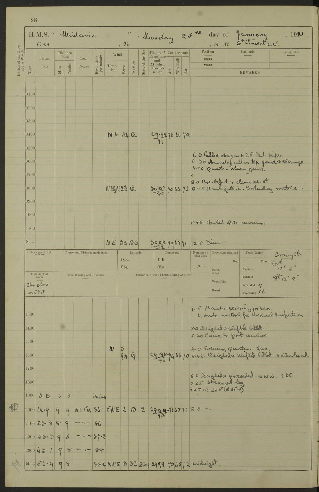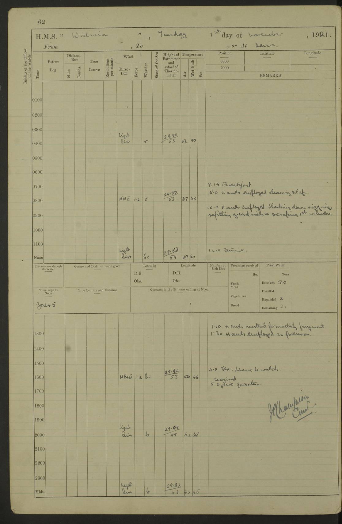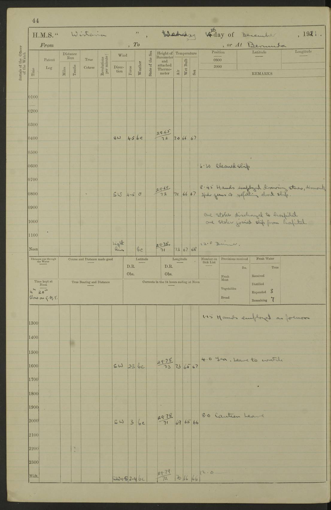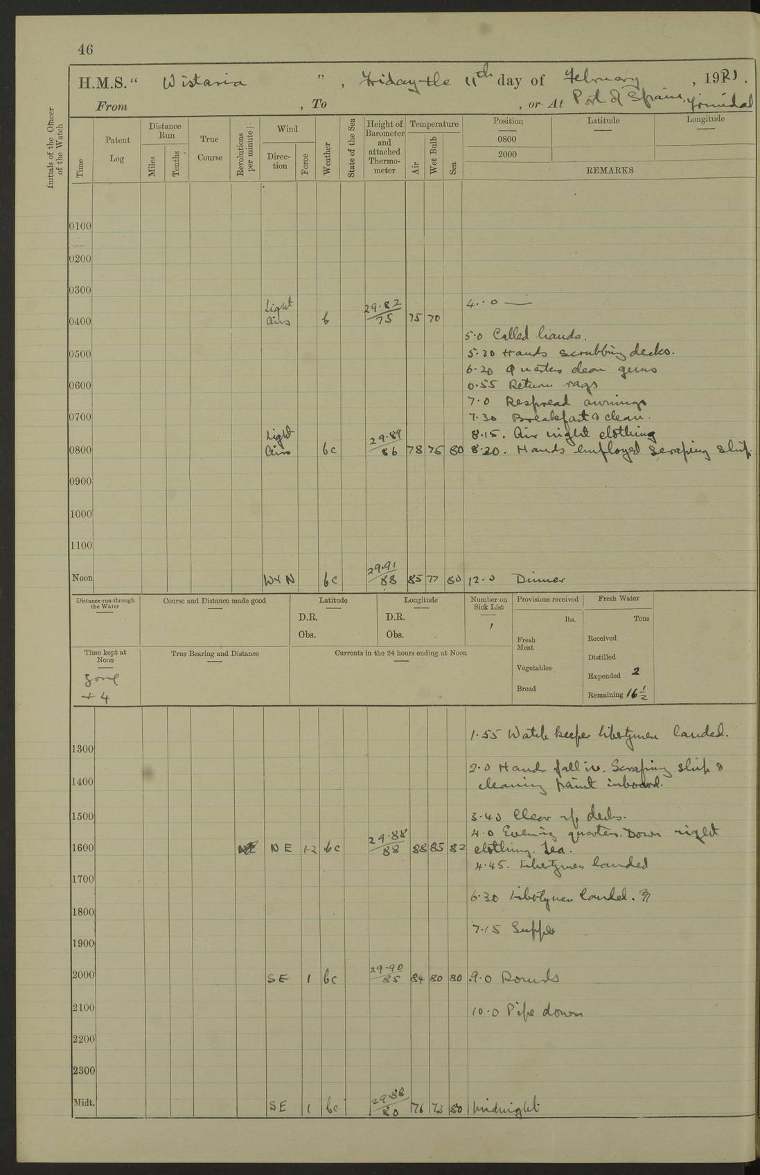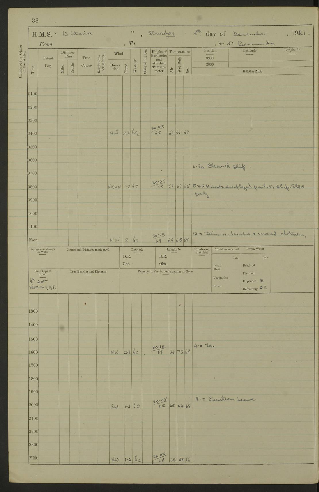 LOGS FOR DECEMBER 1920 4f73c9e6a2fc8ea903000965: (https://s3.amazonaws.com:443/oldweather/ADM53-93259/0003_1.jpg) 29 December 1920 At Devonport Lat 50.38, Long -4.19 9.0am: Commissioned with Chatham Crew 11.55am: Cooks to galley am: Sub Lt Jenks joined ship 1.10pm: Out pipes 1.15pm: Hands fall in. Employed in scrubbing and washing upper deck 3.30pm: Leave to 1st and 2nd watches 4 pm-7 am. Liberty men to clean 4.0pm: Liberty men fall in. Tea 4.15pm: Sunset 5.0pm: Liberty men fall in 6.0pm: Liberty men fall in 7.10pm: 1st Lieutenant returned from sick berth 7.15pm: Supper 8.0pm: Stand by hammocks 8.40pm: Clear off mess decks for rounds 9.0pm: Rounds 10.0pm: Pipe down 12.0pm: Rounds correct 4f73c9e7a2fc8ea903000966: (https://s3.amazonaws.com:443/oldweather/ADM53-93259/0004_0.jpg) 30 December 1920 At Devonport Lat 50.38, Long -4.19 6.0am: Called hands 6.30am: Hands fall in. Scrub & wash upper decks 7.20am: Quarters clean guns 7.50am: Secure 8.0am: Breakfast. Dress of day N°3 8.40am: Out pipes. Hands fall in am: Hands working main derrick. 4 hands & 1 Leading Seaman working with Chief Writer with stationery 10.20am: Stand easy 10.30am: Carry on with work 11.0am: Hands getting in provisions 11.30am: Afternoon watchmen to dinner noon: Dinner 1.15pm: Hands fall in. 1 Leading Seaman & hands with Chief Writer. 1 Leading Seaman & 2 AB Electr. Light. 3 AB with ship’s steward. 3 hands cleaning guns 3.40pm: Secure. Clear up decks 4.0pm: Evening Quarters. Sunset 4.24pm: Exercised collision stations 4.30pm: Secure. Tea. Leave to 2nd & 3rd watches 5 pm to 7 am 6.0pm: Liberty men fall in 7.15pm: Supper 8.0pm: Stand by hammocks 9.0pm: Rounds 10.0pm: Pipe down 4f73c9e7a2fc8ea903000967: (https://s3.amazonaws.com:443/oldweather/ADM53-93259/0004_1.jpg) 31 December 1920 At Devonport Lat 50.38, Long -4.19 6.30am: Hands scrubbing & washing upper decks 8.0am: Breakfast & clean Number 3 8.45am: Hands fall in. 6 hands unrigging fore derrick. 4 hands securing wood on upper deck. 3 hands stowing stanchions below decks 10.20am: Stand easy 10.30am: Carry on 10.45am: 4 hands getting in canteen gear 11.55am: Cooks noon: Dinner 1.15pm: Q.D. men unrigging awning stanchions, remainder securing derricks 3.40pm: Secure. Clear up decks 4.0pm: Evening Quarters 4.05pm: Tea 4.20pm: Sunset 7.10pm: Supper 8.0pm: Stand by hammocks LOGS FOR JANUARY 1921 4f73c9e7a2fc8ea903000968: (https://s3.amazonaws.com:443/oldweather/ADM53-93259/0005_0.jpg) 1 January 1921 At Devonport Lat 50.38, Long -4.19 6.0am: Called hands 6.30am: Hands fall in. Guard and steerage 7.30am: Store party to breakfast 7.45am: Breakfast 8.15am: Store party left ship 8.45am: Hands fall in. Stowing stanchions 10.20am: Stand easy 10.30am: Carry on with work noon: Dinner. Leave to Port watch 1 pm-7 am Monday. Leave to boys 1 pm to 6 pm pm: Hands make and mend clothes 4.0pm: Tea. Shift into night clothing 8.0pm: Stand by hammocks 4f73c9e8a2fc8ea903000969: (https://s3.amazonaws.com:443/oldweather/ADM53-93259/0005_1.jpg) 2 January 1921 At Devonport Lat 50.38, Long -4.19 7.0am: Hands fall in, scrub upper deck 8.0am: Breakfast and clean Number 2s 8.45am: Clear up decks for divisions 10.0am: Divisions 4.0pm: Tea. Shift into night clothing 8.0pm: Stand by hammocks 8.30pm: Clear up mess decks and flats for rounds 8.55pm: Clear off mess decks for rounds 9.0pm: Rounds 4f73c9e8a2fc8ea90300096a: (https://s3.amazonaws.com:443/oldweather/ADM53-93259/0006_0.jpg) 3 January 1921 At Devonport Lat 50.38, Long -4.19 6.15am: Hands fall in, scrub and wash upper deck 8.0am: Breakfast. Dress of day Number 3s 8.50am: Hands fall in. Stand fast cooks. Hands getting down stanchions and preparing 2nd whaler. Ship commenced basin trials 10.0am: Trial concluded 11.25am: Left dockyard for Number 5 buoy 12.05am: Hands to dinner & clean in refitting rig. Ammunition lighter alongside 1.15pm: Hands getting in ammunition 2.30pm: Lowered motor boat 3.30pm: Finished ammunitioning ship 5.0pm: Liberty men landed. Port watch store ammunition 8.40pm: Clear off mess deck for rounds 4f73c9e9a2fc8ea90300096b: (https://s3.amazonaws.com:443/oldweather/ADM53-93259/0006_1.jpg) 4 January 1921 At Devonport Lat 50.38, Long -4.19 6.30am: Hands fall in. Securing for sea 8.15am: Forecastle men muster on Forecastle, unshackle reeve ship wire 8.45am: Slipped and proceeded. Course and speed as required for full power trial 9.15am: Breakwater Lt Ho abeam 9.20am: Course S30E 10.30am: Altered course NE and as requisite for entering sound 10.55am: Secured to No 1 buoy (Sound) 11.30am: Made fast to buoy. Tug swung ship for compasses 1.0pm: Finished swinging for compasses. Forecastle men muster on forecastle 1.15pm: Entered harbour 2.15pm: Secured alongside wall 2.20pm: Coal lighter secured alongside 2.40pm: Hands to clear in coaling rig 3.0pm: Hands coal ship 4.55pm: Finished coaling 5.20pm: Hands fall in wash down decks 6.20pm: Hands paid 8.0pm: Stand by hammocks 8.20pm: Clear up mess decks for rounds 4f73c9e9a2fc8ea90300096c: (https://s3.amazonaws.com:443/oldweather/ADM53-93259/0007_0.jpg) 5 January 1921 At Devonport Lat 50.38, Long -4.19 6.30am: Hands fall in. Guard and steerage 8.0am: Carpenter & 4 hands employed in dockyard 8.10am: Ash lighter alongside 8.45am: Hands securing ship for sea 10.30am: Carry on. Hands to General Quarters 11.15am: Quarters clean guns 11.30am: Secure. Return rags 11.35am: Clear up decks noon: Store party returned. Hands to dinner 1.15pm: Hands fall in. 4 hands with carpenter, 2 with steward. Remainder securing ship for sea 4f73c9e9a2fc8ea90300096d: (https://s3.amazonaws.com:443/oldweather/ADM53-93259/0007_1.jpg) 6 January 1921 At Devonport Lat 50.38, Long -4.19 8.30am: Hands employed cleaning ship 10.50am: Chief of Staff inspected ship 11.33am: Chief of Staff left ship Ice sent. 12 cases received on board 1.15pm: Hands fall in. Getting in beef and replacing motor boats davit 2.0pm: 1 Leading Stoker discharged to hospital 4f73c9eaa2fc8ea90300096e: (https://s3.amazonaws.com:443/oldweather/ADM53-93259/00