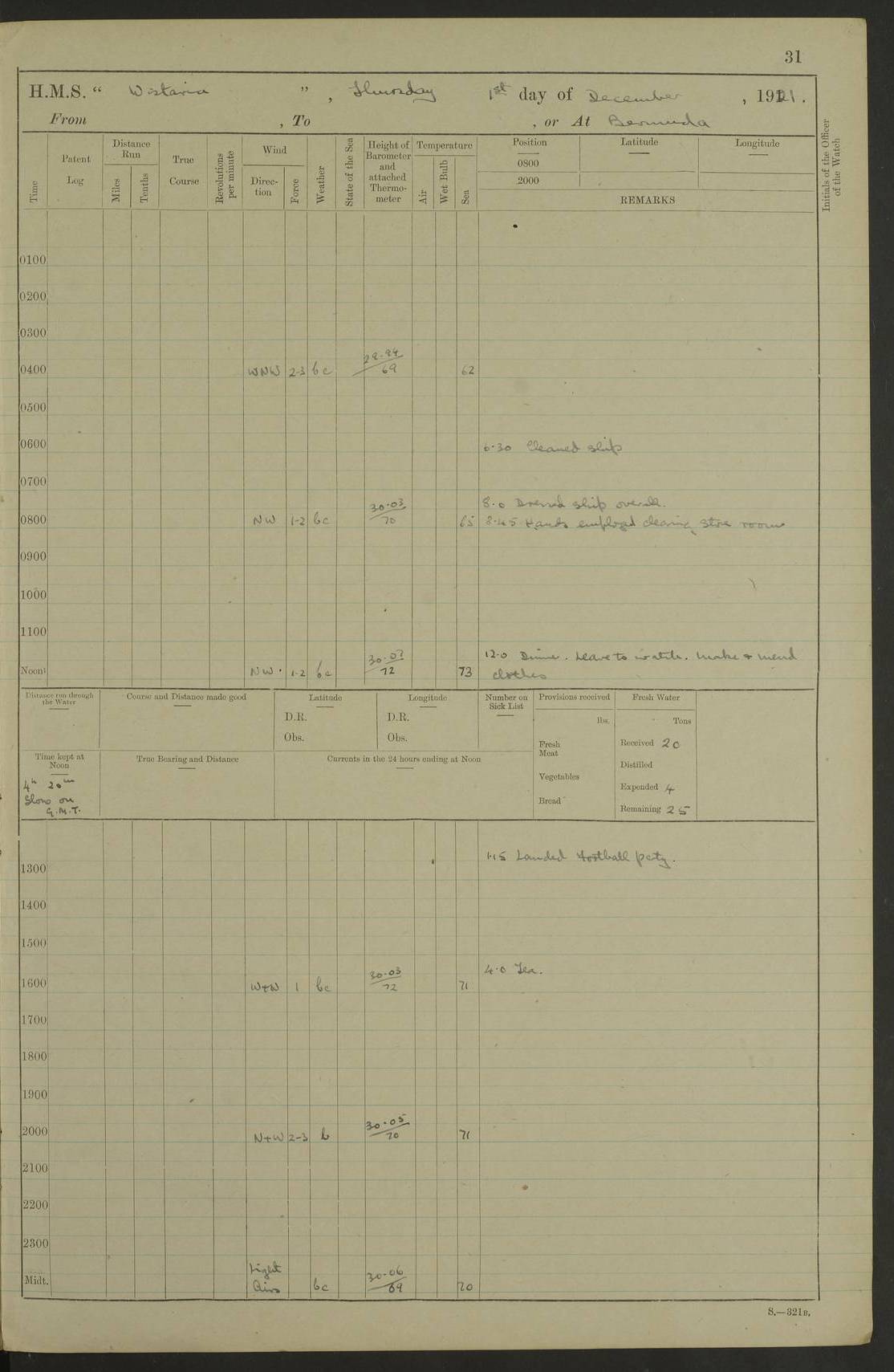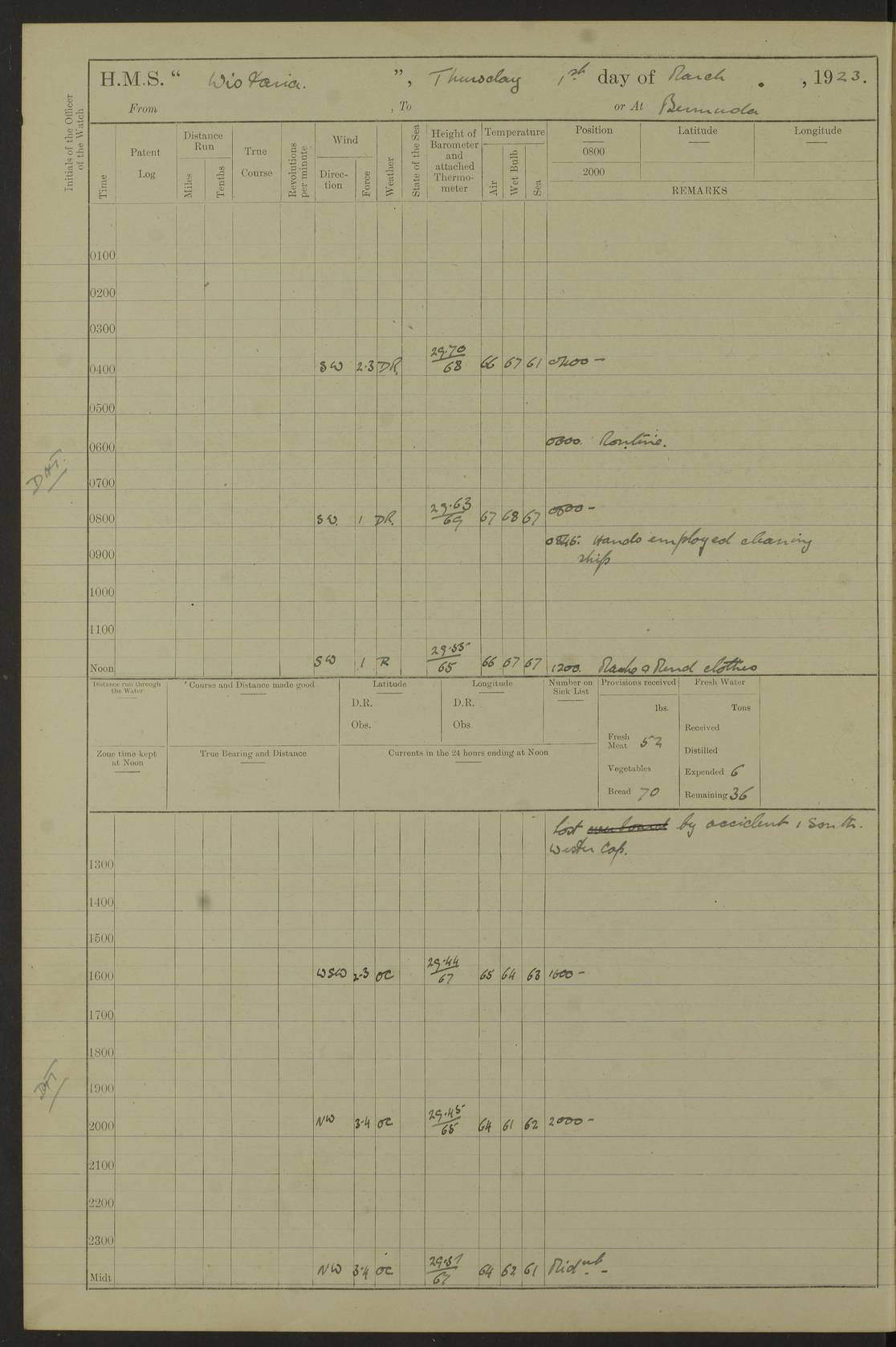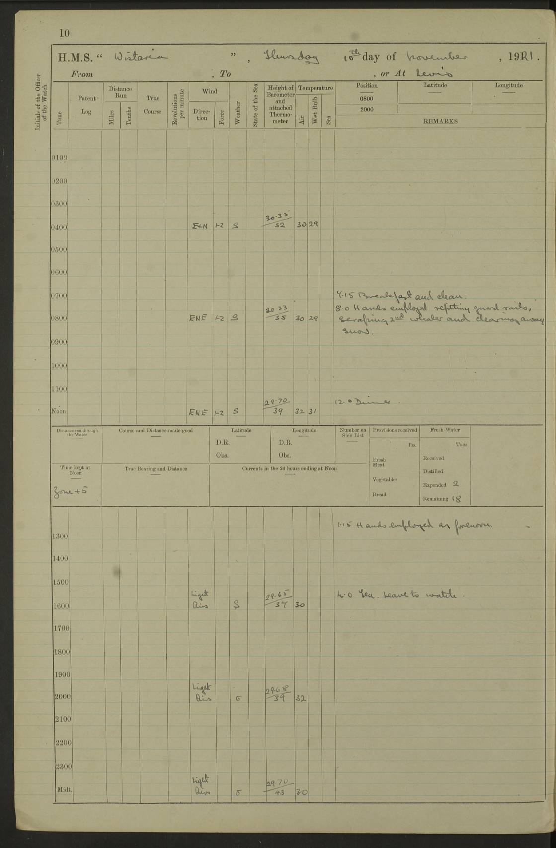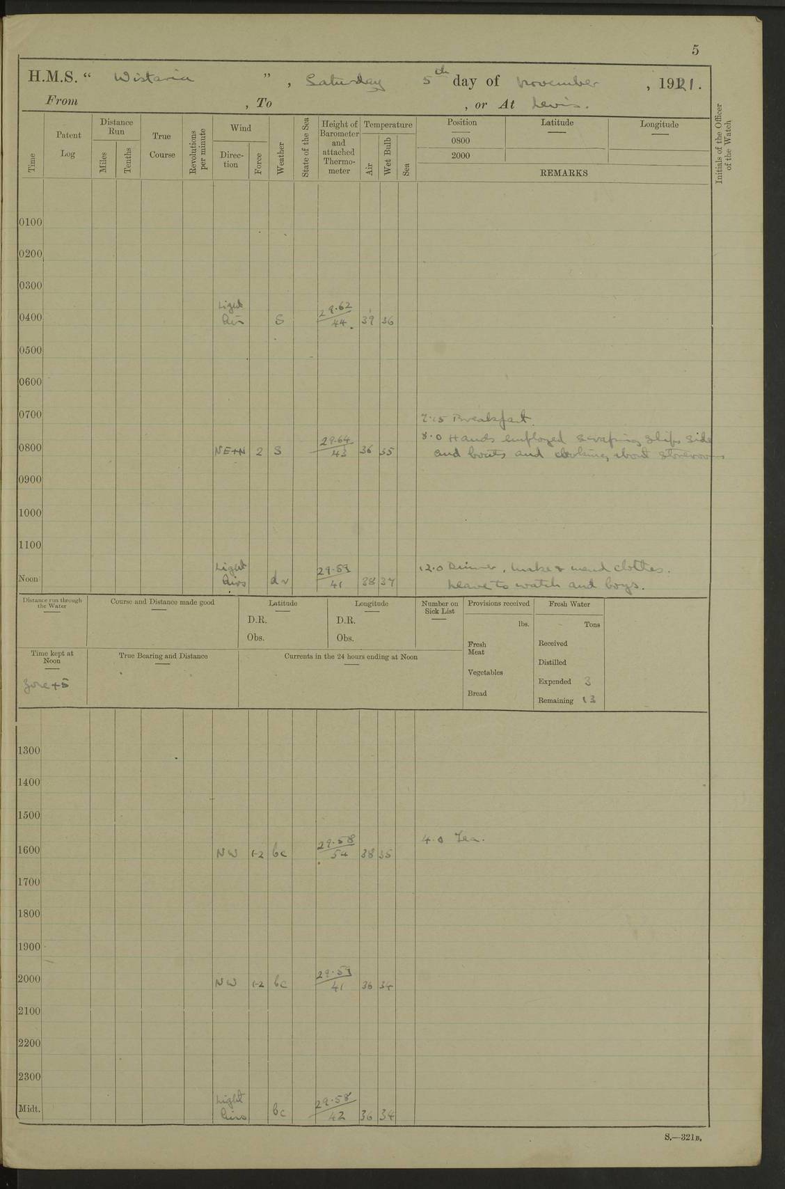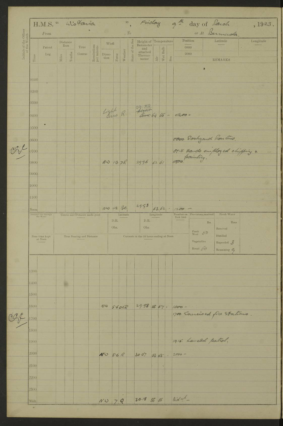 LOGS FOR DECEMBER 1920 4f73c9e6a2fc8ea903000965: (https://s3.amazonaws.com:443/oldweather/ADM53-93259/0003_1.jpg) 29 December 1920 At Devonport Lat 50.38, Long -4.19 9.0am: Commissioned with Chatham Crew 11.55am: Cooks to galley am: Sub Lt Jenks joined ship 1.10pm: Out pipes 1.15pm: Hands fall in. Employed in scrubbing and washing upper deck 3.30pm: Leave to 1st and 2nd watches 4 pm-7 am. Liberty men to clean 4.0pm: Liberty men fall in. Tea 4.15pm: Sunset 5.0pm: Liberty men fall in 6.0pm: Liberty men fall in 7.10pm: 1st Lieutenant returned from sick berth 7.15pm: Supper 8.0pm: Stand by hammocks 8.40pm: Clear off mess decks for rounds 9.0pm: Rounds 10.0pm: Pipe down 12.0pm: Rounds correct 4f73c9e7a2fc8ea903000966: (https://s3.amazonaws.com:443/oldweather/ADM53-93259/0004_0.jpg) 30 December 1920 At Devonport Lat 50.38, Long -4.19 6.0am: Called hands 6.30am: Hands fall in. Scrub & wash upper decks 7.20am: Quarters clean guns 7.50am: Secure 8.0am: Breakfast. Dress of day N°3 8.40am: Out pipes. Hands fall in am: Hands working main derrick. 4 hands & 1 Leading Seaman working with Chief Writer with stationery 10.20am: Stand easy 10.30am: Carry on with work 11.0am: Hands getting in provisions 11.30am: Afternoon watchmen to dinner noon: Dinner 1.15pm: Hands fall in. 1 Leading Seaman & hands with Chief Writer. 1 Leading Seaman & 2 AB Electr. Light. 3 AB with ship’s steward. 3 hands cleaning guns 3.40pm: Secure. Clear up decks 4.0pm: Evening Quarters. Sunset 4.24pm: Exercised collision stations 4.30pm: Secure. Tea. Leave to 2nd & 3rd watches 5 pm to 7 am 6.0pm: Liberty men fall in 7.15pm: Supper 8.0pm: Stand by hammocks 9.0pm: Rounds 10.0pm: Pipe down 4f73c9e7a2fc8ea903000967: (https://s3.amazonaws.com:443/oldweather/ADM53-93259/0004_1.jpg) 31 December 1920 At Devonport Lat 50.38, Long -4.19 6.30am: Hands scrubbing & washing upper decks 8.0am: Breakfast & clean Number 3 8.45am: Hands fall in. 6 hands unrigging fore derrick. 4 hands securing wood on upper deck. 3 hands stowing stanchions below decks 10.20am: Stand easy 10.30am: Carry on 10.45am: 4 hands getting in canteen gear 11.55am: Cooks noon: Dinner 1.15pm: Q.D. men unrigging awning stanchions, remainder securing derricks 3.40pm: Secure. Clear up decks 4.0pm: Evening Quarters 4.05pm: Tea 4.20pm: Sunset 7.10pm: Supper 8.0pm: Stand by hammocks LOGS FOR JANUARY 1921 4f73c9e7a2fc8ea903000968: (https://s3.amazonaws.com:443/oldweather/ADM53-93259/0005_0.jpg) 1 January 1921 At Devonport Lat 50.38, Long -4.19 6.0am: Called hands 6.30am: Hands fall in. Guard and steerage 7.30am: Store party to breakfast 7.45am: Breakfast 8.15am: Store party left ship 8.45am: Hands fall in. Stowing stanchions 10.20am: Stand easy 10.30am: Carry on with work noon: Dinner. Leave to Port watch 1 pm-7 am Monday. Leave to boys 1 pm to 6 pm pm: Hands make and mend clothes 4.0pm: Tea. Shift into night clothing 8.0pm: Stand by hammocks 4f73c9e8a2fc8ea903000969: (https://s3.amazonaws.com:443/oldweather/ADM53-93259/0005_1.jpg) 2 January 1921 At Devonport Lat 50.38, Long -4.19 7.0am: Hands fall in, scrub upper deck 8.0am: Breakfast and clean Number 2s 8.45am: Clear up decks for divisions 10.0am: Divisions 4.0pm: Tea. Shift into night clothing 8.0pm: Stand by hammocks 8.30pm: Clear up mess decks and flats for rounds 8.55pm: Clear off mess decks for rounds 9.0pm: Rounds 4f73c9e8a2fc8ea90300096a: (https://s3.amazonaws.com:443/oldweather/ADM53-93259/0006_0.jpg) 3 January 1921 At Devonport Lat 50.38, Long -4.19 6.15am: Hands fall in, scrub and wash upper deck 8.0am: Breakfast. Dress of day Number 3s 8.50am: Hands fall in. Stand fast cooks. Hands getting down stanchions and preparing 2nd whaler. Ship commenced basin trials 10.0am: Trial concluded 11.25am: Left dockyard for Number 5 buoy 12.05am: Hands to dinner & clean in refitting rig. Ammunition lighter alongside 1.15pm: Hands getting in ammunition 2.30pm: Lowered motor boat 3.30pm: Finished ammunitioning ship 5.0pm: Liberty men landed. Port watch store ammunition 8.40pm: Clear off mess deck for rounds 4f73c9e9a2fc8ea90300096b: (https://s3.amazonaws.com:443/oldweather/ADM53-93259/0006_1.jpg) 4 January 1921 At Devonport Lat 50.38, Long -4.19 6.30am: Hands fall in. Securing for sea 8.15am: Forecastle men muster on Forecastle, unshackle reeve ship wire 8.45am: Slipped and proceeded. Course and speed as required for full power trial 9.15am: Breakwater Lt Ho abeam 9.20am: Course S30E 10.30am: Altered course NE and as requisite for entering sound 10.55am: Secured to No 1 buoy (Sound) 11.30am: Made fast to buoy. Tug swung ship for compasses 1.0pm: Finished swinging for compasses. Forecastle men muster on forecastle 1.15pm: Entered harbour 2.15pm: Secured alongside wall 2.20pm: Coal lighter secured alongside 2.40pm: Hands to clear in coaling rig 3.0pm: Hands coal ship 4.55pm: Finished coaling 5.20pm: Hands fall in wash down decks 6.20pm: Hands paid 8.0pm: Stand by hammocks 8.20pm: Clear up mess decks for rounds 4f73c9e9a2fc8ea90300096c: (https://s3.amazonaws.com:443/oldweather/ADM53-93259/0007_0.jpg) 5 January 1921 At Devonport Lat 50.38, Long -4.19 6.30am: Hands fall in. Guard and steerage 8.0am: Carpenter & 4 hands employed in dockyard 8.10am: Ash lighter alongside 8.45am: Hands securing ship for sea 10.30am: Carry on. Hands to General Quarters 11.15am: Quarters clean guns 11.30am: Secure. Return rags 11.35am: Clear up decks noon: Store party returned. Hands to dinner 1.15pm: Hands fall in. 4 hands with carpenter, 2 with steward. Remainder securing ship for sea 4f73c9e9a2fc8ea90300096d: (https://s3.amazonaws.com:443/oldweather/ADM53-93259/0007_1.jpg) 6 January 1921 At Devonport Lat 50.38, Long -4.19 8.30am: Hands employed cleaning ship 10.50am: Chief of Staff inspected ship 11.33am: Chief of Staff left ship Ice sent. 12 cases received on board 1.15pm: Hands fall in. Getting in beef and replacing motor boats davit 2.0pm: 1 Leading Stoker discharged to hospital 4f73c9eaa2fc8ea90300096e: (https://s3.amazonaws.com:443/oldweather/ADM53-93259/00