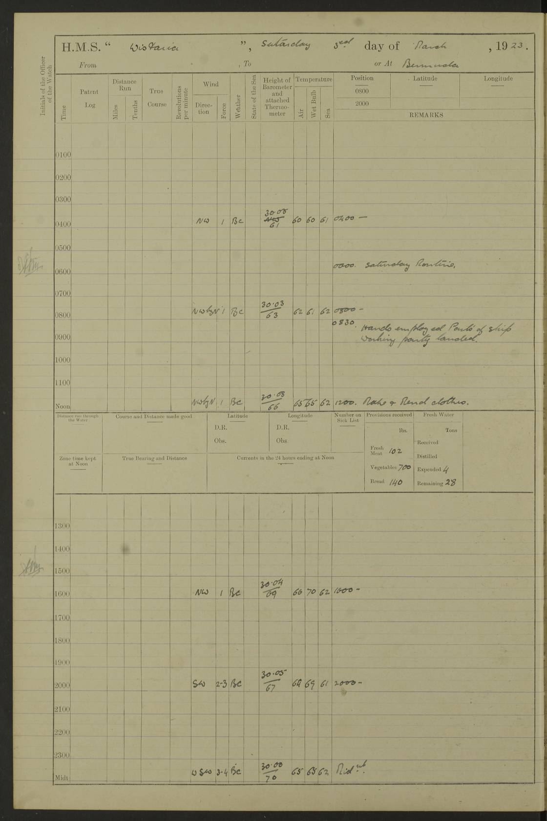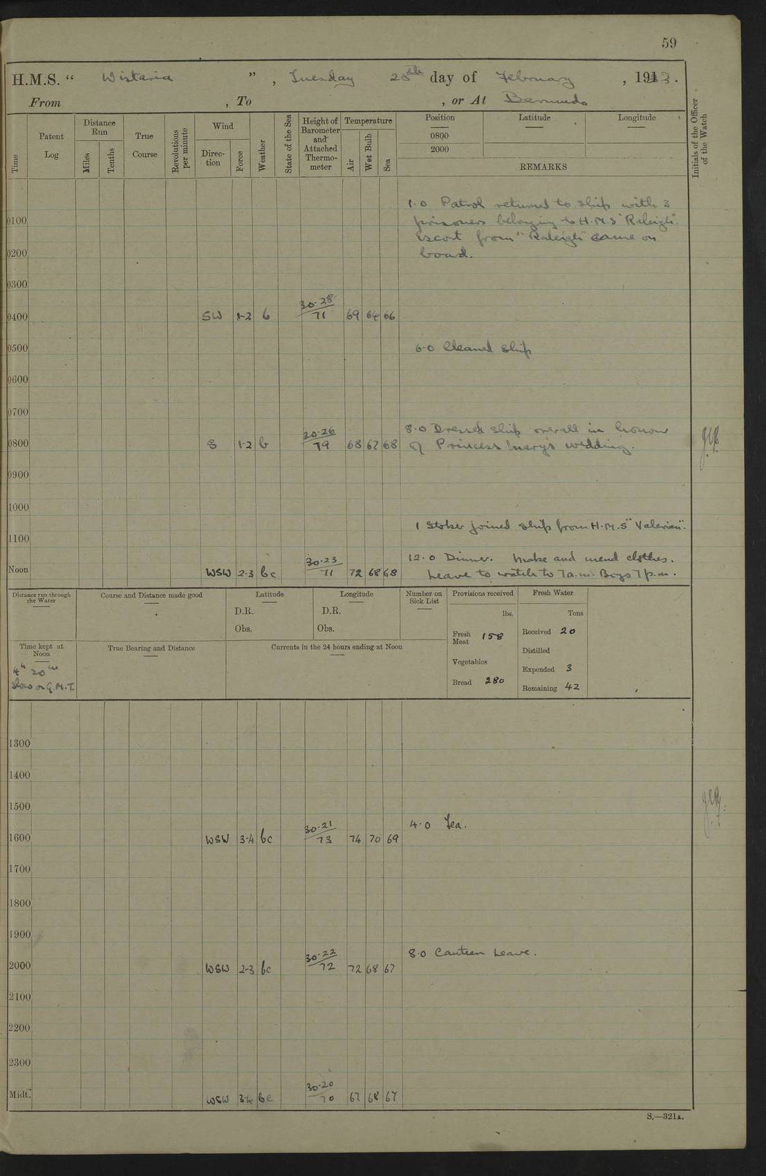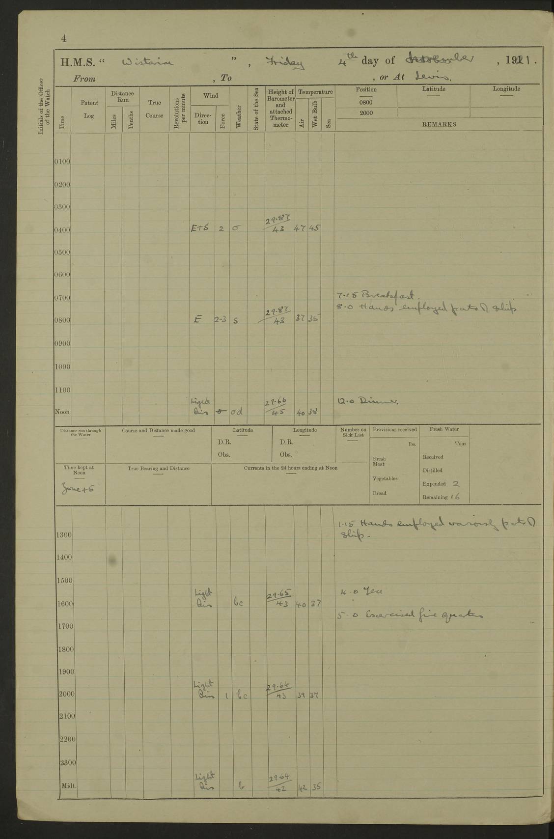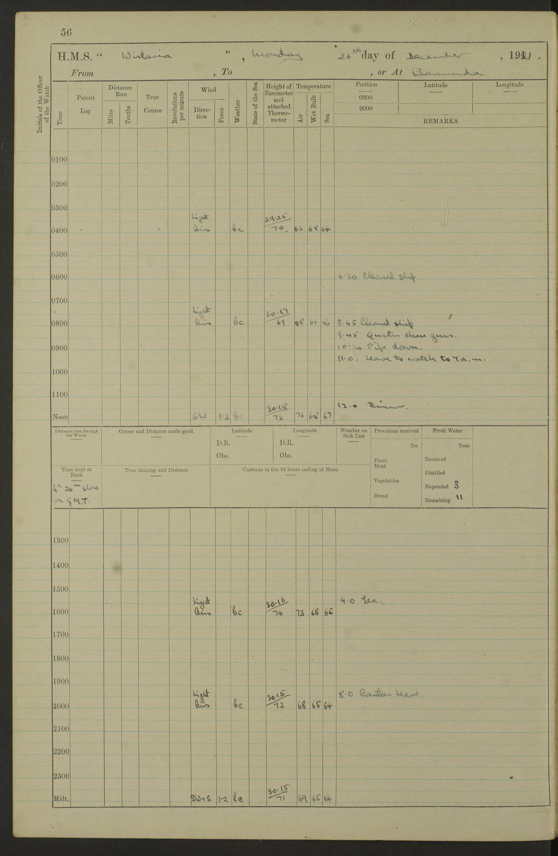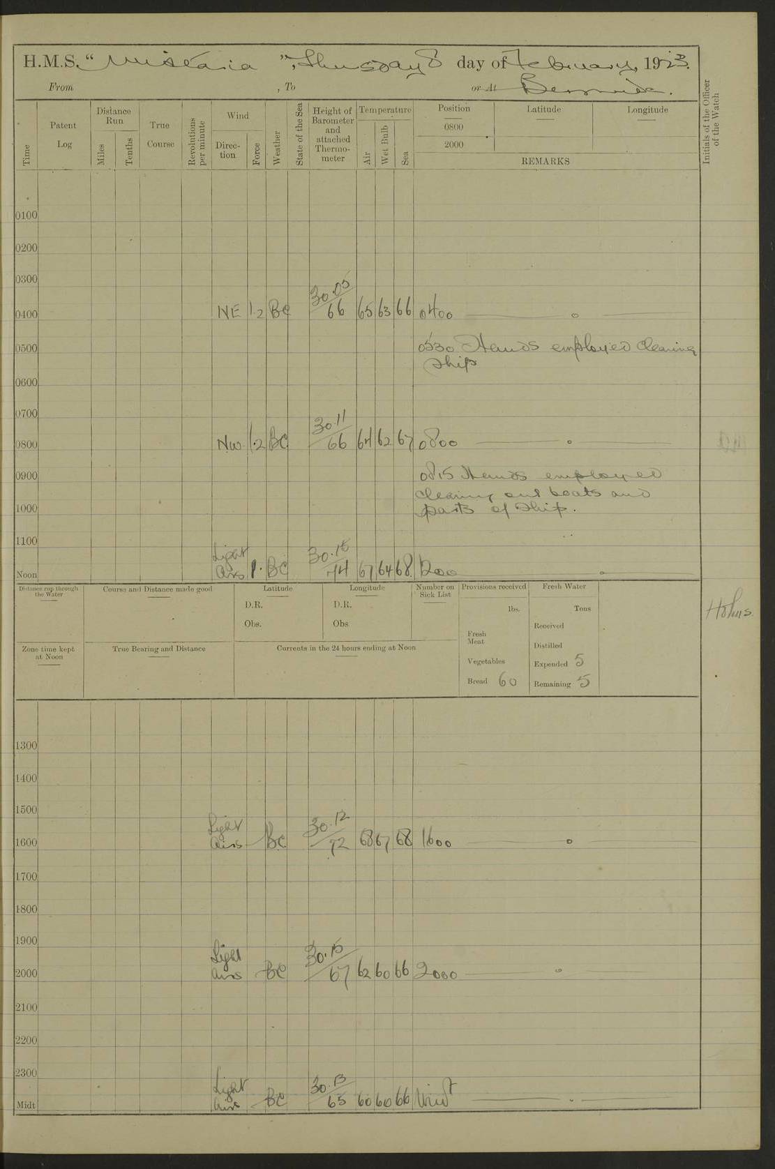 LOGS FOR DECEMBER 1920 4f73c9e6a2fc8ea903000965: (https://s3.amazonaws.com:443/oldweather/ADM53-93259/0003_1.jpg) 29 December 1920 At Devonport Lat 50.38, Long -4.19 9.0am: Commissioned with Chatham Crew 11.55am: Cooks to galley am: Sub Lt Jenks joined ship 1.10pm: Out pipes 1.15pm: Hands fall in. Employed in scrubbing and washing upper deck 3.30pm: Leave to 1st and 2nd watches 4 pm-7 am. Liberty men to clean 4.0pm: Liberty men fall in. Tea 4.15pm: Sunset 5.0pm: Liberty men fall in 6.0pm: Liberty men fall in 7.10pm: 1st Lieutenant returned from sick berth 7.15pm: Supper 8.0pm: Stand by hammocks 8.40pm: Clear off mess decks for rounds 9.0pm: Rounds 10.0pm: Pipe down 12.0pm: Rounds correct 4f73c9e7a2fc8ea903000966: (https://s3.amazonaws.com:443/oldweather/ADM53-93259/0004_0.jpg) 30 December 1920 At Devonport Lat 50.38, Long -4.19 6.0am: Called hands 6.30am: Hands fall in. Scrub & wash upper decks 7.20am: Quarters clean guns 7.50am: Secure 8.0am: Breakfast. Dress of day N°3 8.40am: Out pipes. Hands fall in am: Hands working main derrick. 4 hands & 1 Leading Seaman working with Chief Writer with stationery 10.20am: Stand easy 10.30am: Carry on with work 11.0am: Hands getting in provisions 11.30am: Afternoon watchmen to dinner noon: Dinner 1.15pm: Hands fall in. 1 Leading Seaman & hands with Chief Writer. 1 Leading Seaman & 2 AB Electr. Light. 3 AB with ship’s steward. 3 hands cleaning guns 3.40pm: Secure. Clear up decks 4.0pm: Evening Quarters. Sunset 4.24pm: Exercised collision stations 4.30pm: Secure. Tea. Leave to 2nd & 3rd watches 5 pm to 7 am 6.0pm: Liberty men fall in 7.15pm: Supper 8.0pm: Stand by hammocks 9.0pm: Rounds 10.0pm: Pipe down 4f73c9e7a2fc8ea903000967: (https://s3.amazonaws.com:443/oldweather/ADM53-93259/0004_1.jpg) 31 December 1920 At Devonport Lat 50.38, Long -4.19 6.30am: Hands scrubbing & washing upper decks 8.0am: Breakfast & clean Number 3 8.45am: Hands fall in. 6 hands unrigging fore derrick. 4 hands securing wood on upper deck. 3 hands stowing stanchions below decks 10.20am: Stand easy 10.30am: Carry on 10.45am: 4 hands getting in canteen gear 11.55am: Cooks noon: Dinner 1.15pm: Q.D. men unrigging awning stanchions, remainder securing derricks 3.40pm: Secure. Clear up decks 4.0pm: Evening Quarters 4.05pm: Tea 4.20pm: Sunset 7.10pm: Supper 8.0pm: Stand by hammocks LOGS FOR JANUARY 1921 4f73c9e7a2fc8ea903000968: (https://s3.amazonaws.com:443/oldweather/ADM53-93259/0005_0.jpg) 1 January 1921 At Devonport Lat 50.38, Long -4.19 6.0am: Called hands 6.30am: Hands fall in. Guard and steerage 7.30am: Store party to breakfast 7.45am: Breakfast 8.15am: Store party left ship 8.45am: Hands fall in. Stowing stanchions 10.20am: Stand easy 10.30am: Carry on with work noon: Dinner. Leave to Port watch 1 pm-7 am Monday. Leave to boys 1 pm to 6 pm pm: Hands make and mend clothes 4.0pm: Tea. Shift into night clothing 8.0pm: Stand by hammocks 4f73c9e8a2fc8ea903000969: (https://s3.amazonaws.com:443/oldweather/ADM53-93259/0005_1.jpg) 2 January 1921 At Devonport Lat 50.38, Long -4.19 7.0am: Hands fall in, scrub upper deck 8.0am: Breakfast and clean Number 2s 8.45am: Clear up decks for divisions 10.0am: Divisions 4.0pm: Tea. Shift into night clothing 8.0pm: Stand by hammocks 8.30pm: Clear up mess decks and flats for rounds 8.55pm: Clear off mess decks for rounds 9.0pm: Rounds 4f73c9e8a2fc8ea90300096a: (https://s3.amazonaws.com:443/oldweather/ADM53-93259/0006_0.jpg) 3 January 1921 At Devonport Lat 50.38, Long -4.19 6.15am: Hands fall in, scrub and wash upper deck 8.0am: Breakfast. Dress of day Number 3s 8.50am: Hands fall in. Stand fast cooks. Hands getting down stanchions and preparing 2nd whaler. Ship commenced basin trials 10.0am: Trial concluded 11.25am: Left dockyard for Number 5 buoy 12.05am: Hands to dinner & clean in refitting rig. Ammunition lighter alongside 1.15pm: Hands getting in ammunition 2.30pm: Lowered motor boat 3.30pm: Finished ammunitioning ship 5.0pm: Liberty men landed. Port watch store ammunition 8.40pm: Clear off mess deck for rounds 4f73c9e9a2fc8ea90300096b: (https://s3.amazonaws.com:443/oldweather/ADM53-93259/0006_1.jpg) 4 January 1921 At Devonport Lat 50.38, Long -4.19 6.30am: Hands fall in. Securing for sea 8.15am: Forecastle men muster on Forecastle, unshackle reeve ship wire 8.45am: Slipped and proceeded. Course and speed as required for full power trial 9.15am: Breakwater Lt Ho abeam 9.20am: Course S30E 10.30am: Altered course NE and as requisite for entering sound 10.55am: Secured to No 1 buoy (Sound) 11.30am: Made fast to buoy. Tug swung ship for compasses 1.0pm: Finished swinging for compasses. Forecastle men muster on forecastle 1.15pm: Entered harbour 2.15pm: Secured alongside wall 2.20pm: Coal lighter secured alongside 2.40pm: Hands to clear in coaling rig 3.0pm: Hands coal ship 4.55pm: Finished coaling 5.20pm: Hands fall in wash down decks 6.20pm: Hands paid 8.0pm: Stand by hammocks 8.20pm: Clear up mess decks for rounds 4f73c9e9a2fc8ea90300096c: (https://s3.amazonaws.com:443/oldweather/ADM53-93259/0007_0.jpg) 5 January 1921 At Devonport Lat 50.38, Long -4.19 6.30am: Hands fall in. Guard and steerage 8.0am: Carpenter & 4 hands employed in dockyard 8.10am: Ash lighter alongside 8.45am: Hands securing ship for sea 10.30am: Carry on. Hands to General Quarters 11.15am: Quarters clean guns 11.30am: Secure. Return rags 11.35am: Clear up decks noon: Store party returned. Hands to dinner 1.15pm: Hands fall in. 4 hands with carpenter, 2 with steward. Remainder securing ship for sea 4f73c9e9a2fc8ea90300096d: (https://s3.amazonaws.com:443/oldweather/ADM53-93259/0007_1.jpg) 6 January 1921 At Devonport Lat 50.38, Long -4.19 8.30am: Hands employed cleaning ship 10.50am: Chief of Staff inspected ship 11.33am: Chief of Staff left ship Ice sent. 12 cases received on board 1.15pm: Hands fall in. Getting in beef and replacing motor boats davit 2.0pm: 1 Leading Stoker discharged to hospital 4f73c9eaa2fc8ea90300096e: (https://s3.amazonaws.com:443/oldweather/ADM53-93259/00