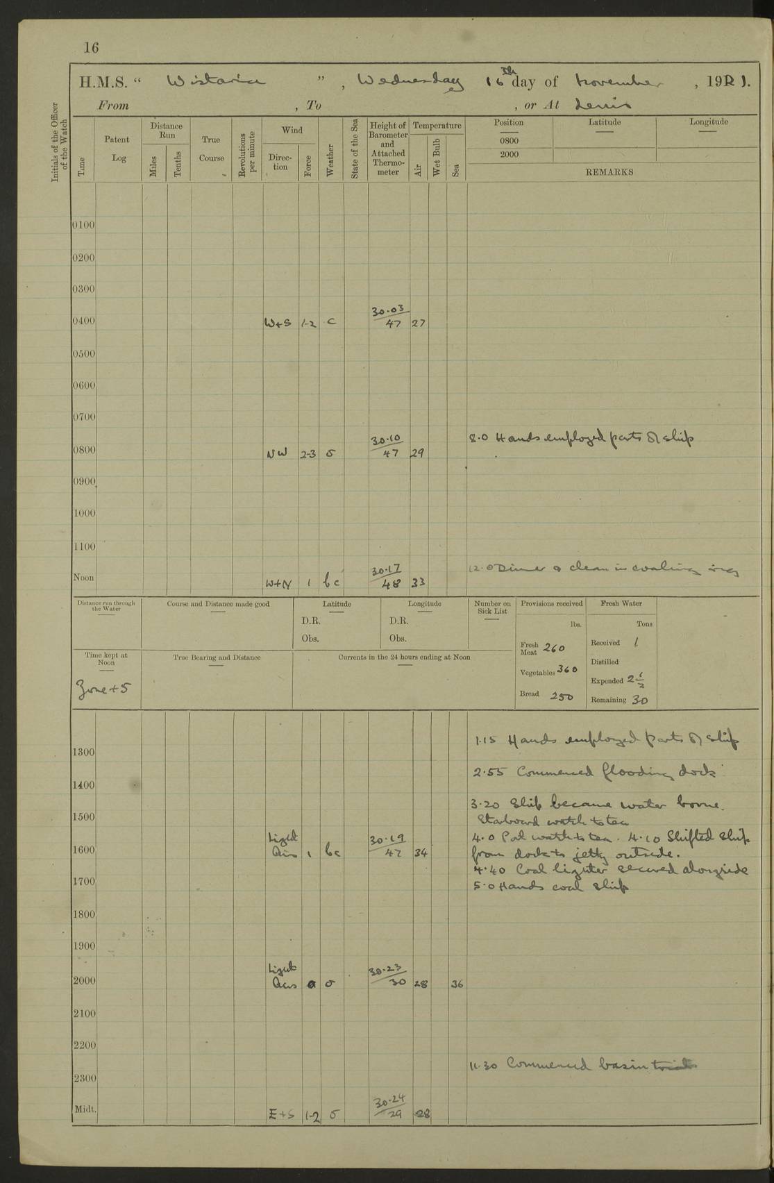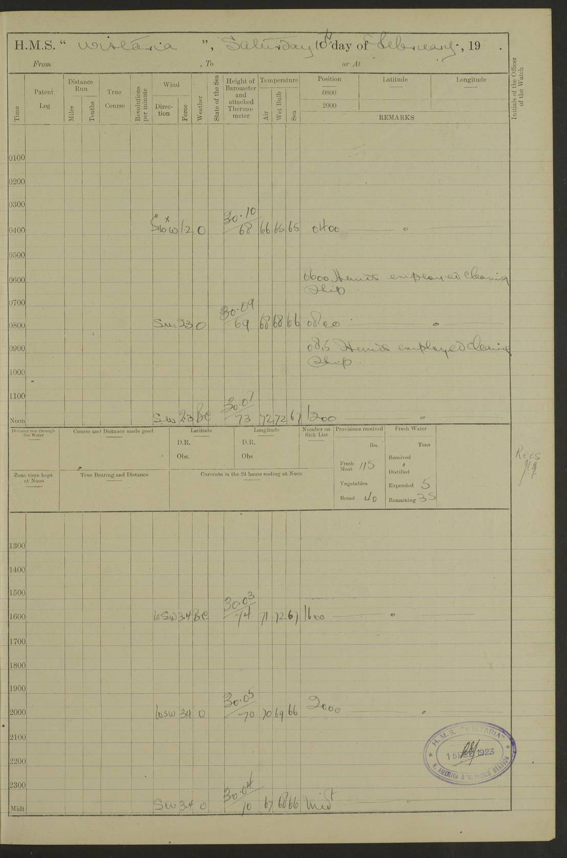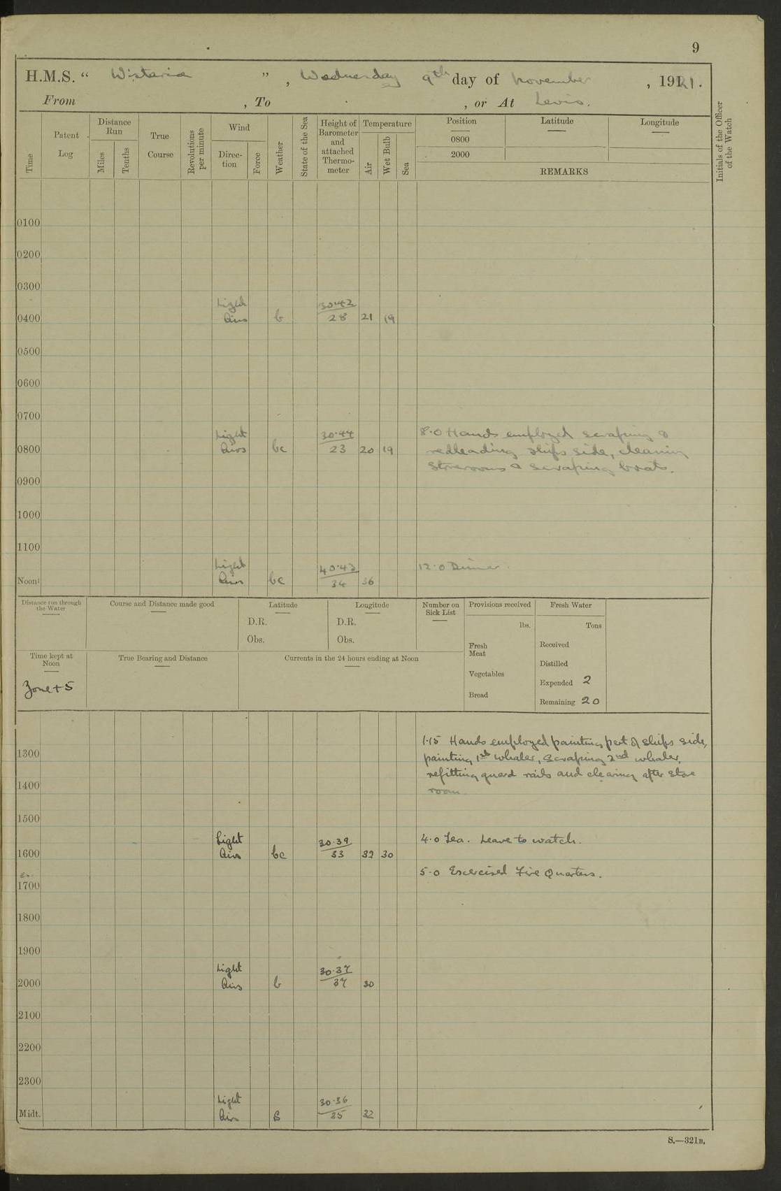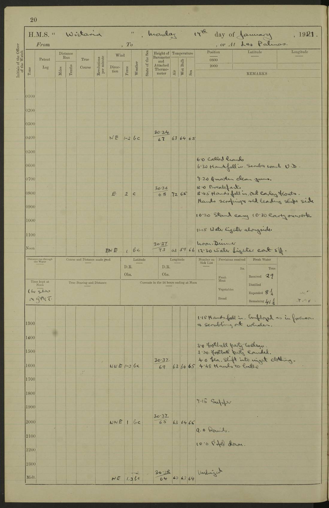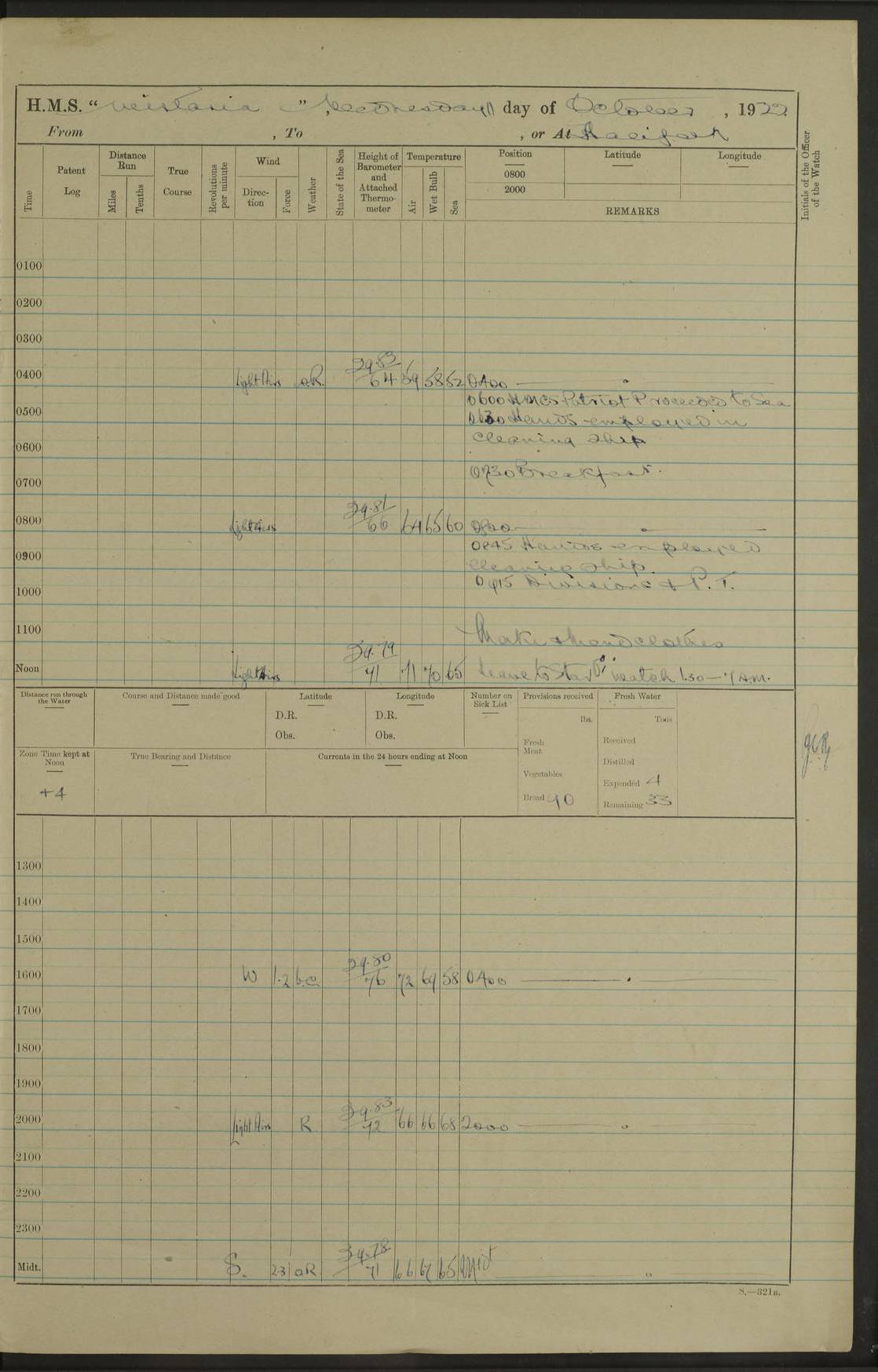 LOGS FOR DECEMBER 1920 4f73c9e6a2fc8ea903000965: (https://s3.amazonaws.com:443/oldweather/ADM53-93259/0003_1.jpg) 29 December 1920 At Devonport Lat 50.38, Long -4.19 9.0am: Commissioned with Chatham Crew 11.55am: Cooks to galley am: Sub Lt Jenks joined ship 1.10pm: Out pipes 1.15pm: Hands fall in. Employed in scrubbing and washing upper deck 3.30pm: Leave to 1st and 2nd watches 4 pm-7 am. Liberty men to clean 4.0pm: Liberty men fall in. Tea 4.15pm: Sunset 5.0pm: Liberty men fall in 6.0pm: Liberty men fall in 7.10pm: 1st Lieutenant returned from sick berth 7.15pm: Supper 8.0pm: Stand by hammocks 8.40pm: Clear off mess decks for rounds 9.0pm: Rounds 10.0pm: Pipe down 12.0pm: Rounds correct 4f73c9e7a2fc8ea903000966: (https://s3.amazonaws.com:443/oldweather/ADM53-93259/0004_0.jpg) 30 December 1920 At Devonport Lat 50.38, Long -4.19 6.0am: Called hands 6.30am: Hands fall in. Scrub & wash upper decks 7.20am: Quarters clean guns 7.50am: Secure 8.0am: Breakfast. Dress of day N°3 8.40am: Out pipes. Hands fall in am: Hands working main derrick. 4 hands & 1 Leading Seaman working with Chief Writer with stationery 10.20am: Stand easy 10.30am: Carry on with work 11.0am: Hands getting in provisions 11.30am: Afternoon watchmen to dinner noon: Dinner 1.15pm: Hands fall in. 1 Leading Seaman & hands with Chief Writer. 1 Leading Seaman & 2 AB Electr. Light. 3 AB with ship’s steward. 3 hands cleaning guns 3.40pm: Secure. Clear up decks 4.0pm: Evening Quarters. Sunset 4.24pm: Exercised collision stations 4.30pm: Secure. Tea. Leave to 2nd & 3rd watches 5 pm to 7 am 6.0pm: Liberty men fall in 7.15pm: Supper 8.0pm: Stand by hammocks 9.0pm: Rounds 10.0pm: Pipe down 4f73c9e7a2fc8ea903000967: (https://s3.amazonaws.com:443/oldweather/ADM53-93259/0004_1.jpg) 31 December 1920 At Devonport Lat 50.38, Long -4.19 6.30am: Hands scrubbing & washing upper decks 8.0am: Breakfast & clean Number 3 8.45am: Hands fall in. 6 hands unrigging fore derrick. 4 hands securing wood on upper deck. 3 hands stowing stanchions below decks 10.20am: Stand easy 10.30am: Carry on 10.45am: 4 hands getting in canteen gear 11.55am: Cooks noon: Dinner 1.15pm: Q.D. men unrigging awning stanchions, remainder securing derricks 3.40pm: Secure. Clear up decks 4.0pm: Evening Quarters 4.05pm: Tea 4.20pm: Sunset 7.10pm: Supper 8.0pm: Stand by hammocks LOGS FOR JANUARY 1921 4f73c9e7a2fc8ea903000968: (https://s3.amazonaws.com:443/oldweather/ADM53-93259/0005_0.jpg) 1 January 1921 At Devonport Lat 50.38, Long -4.19 6.0am: Called hands 6.30am: Hands fall in. Guard and steerage 7.30am: Store party to breakfast 7.45am: Breakfast 8.15am: Store party left ship 8.45am: Hands fall in. Stowing stanchions 10.20am: Stand easy 10.30am: Carry on with work noon: Dinner. Leave to Port watch 1 pm-7 am Monday. Leave to boys 1 pm to 6 pm pm: Hands make and mend clothes 4.0pm: Tea. Shift into night clothing 8.0pm: Stand by hammocks 4f73c9e8a2fc8ea903000969: (https://s3.amazonaws.com:443/oldweather/ADM53-93259/0005_1.jpg) 2 January 1921 At Devonport Lat 50.38, Long -4.19 7.0am: Hands fall in, scrub upper deck 8.0am: Breakfast and clean Number 2s 8.45am: Clear up decks for divisions 10.0am: Divisions 4.0pm: Tea. Shift into night clothing 8.0pm: Stand by hammocks 8.30pm: Clear up mess decks and flats for rounds 8.55pm: Clear off mess decks for rounds 9.0pm: Rounds 4f73c9e8a2fc8ea90300096a: (https://s3.amazonaws.com:443/oldweather/ADM53-93259/0006_0.jpg) 3 January 1921 At Devonport Lat 50.38, Long -4.19 6.15am: Hands fall in, scrub and wash upper deck 8.0am: Breakfast. Dress of day Number 3s 8.50am: Hands fall in. Stand fast cooks. Hands getting down stanchions and preparing 2nd whaler. Ship commenced basin trials 10.0am: Trial concluded 11.25am: Left dockyard for Number 5 buoy 12.05am: Hands to dinner & clean in refitting rig. Ammunition lighter alongside 1.15pm: Hands getting in ammunition 2.30pm: Lowered motor boat 3.30pm: Finished ammunitioning ship 5.0pm: Liberty men landed. Port watch store ammunition 8.40pm: Clear off mess deck for rounds 4f73c9e9a2fc8ea90300096b: (https://s3.amazonaws.com:443/oldweather/ADM53-93259/0006_1.jpg) 4 January 1921 At Devonport Lat 50.38, Long -4.19 6.30am: Hands fall in. Securing for sea 8.15am: Forecastle men muster on Forecastle, unshackle reeve ship wire 8.45am: Slipped and proceeded. Course and speed as required for full power trial 9.15am: Breakwater Lt Ho abeam 9.20am: Course S30E 10.30am: Altered course NE and as requisite for entering sound 10.55am: Secured to No 1 buoy (Sound) 11.30am: Made fast to buoy. Tug swung ship for compasses 1.0pm: Finished swinging for compasses. Forecastle men muster on forecastle 1.15pm: Entered harbour 2.15pm: Secured alongside wall 2.20pm: Coal lighter secured alongside 2.40pm: Hands to clear in coaling rig 3.0pm: Hands coal ship 4.55pm: Finished coaling 5.20pm: Hands fall in wash down decks 6.20pm: Hands paid 8.0pm: Stand by hammocks 8.20pm: Clear up mess decks for rounds 4f73c9e9a2fc8ea90300096c: (https://s3.amazonaws.com:443/oldweather/ADM53-93259/0007_0.jpg) 5 January 1921 At Devonport Lat 50.38, Long -4.19 6.30am: Hands fall in. Guard and steerage 8.0am: Carpenter & 4 hands employed in dockyard 8.10am: Ash lighter alongside 8.45am: Hands securing ship for sea 10.30am: Carry on. Hands to General Quarters 11.15am: Quarters clean guns 11.30am: Secure. Return rags 11.35am: Clear up decks noon: Store party returned. Hands to dinner 1.15pm: Hands fall in. 4 hands with carpenter, 2 with steward. Remainder securing ship for sea 4f73c9e9a2fc8ea90300096d: (https://s3.amazonaws.com:443/oldweather/ADM53-93259/0007_1.jpg) 6 January 1921 At Devonport Lat 50.38, Long -4.19 8.30am: Hands employed cleaning ship 10.50am: Chief of Staff inspected ship 11.33am: Chief of Staff left ship Ice sent. 12 cases received on board 1.15pm: Hands fall in. Getting in beef and replacing motor boats davit 2.0pm: 1 Leading Stoker discharged to hospital 4f73c9eaa2fc8ea90300096e: (https://s3.amazonaws.com:443/oldweather/ADM53-93259/00