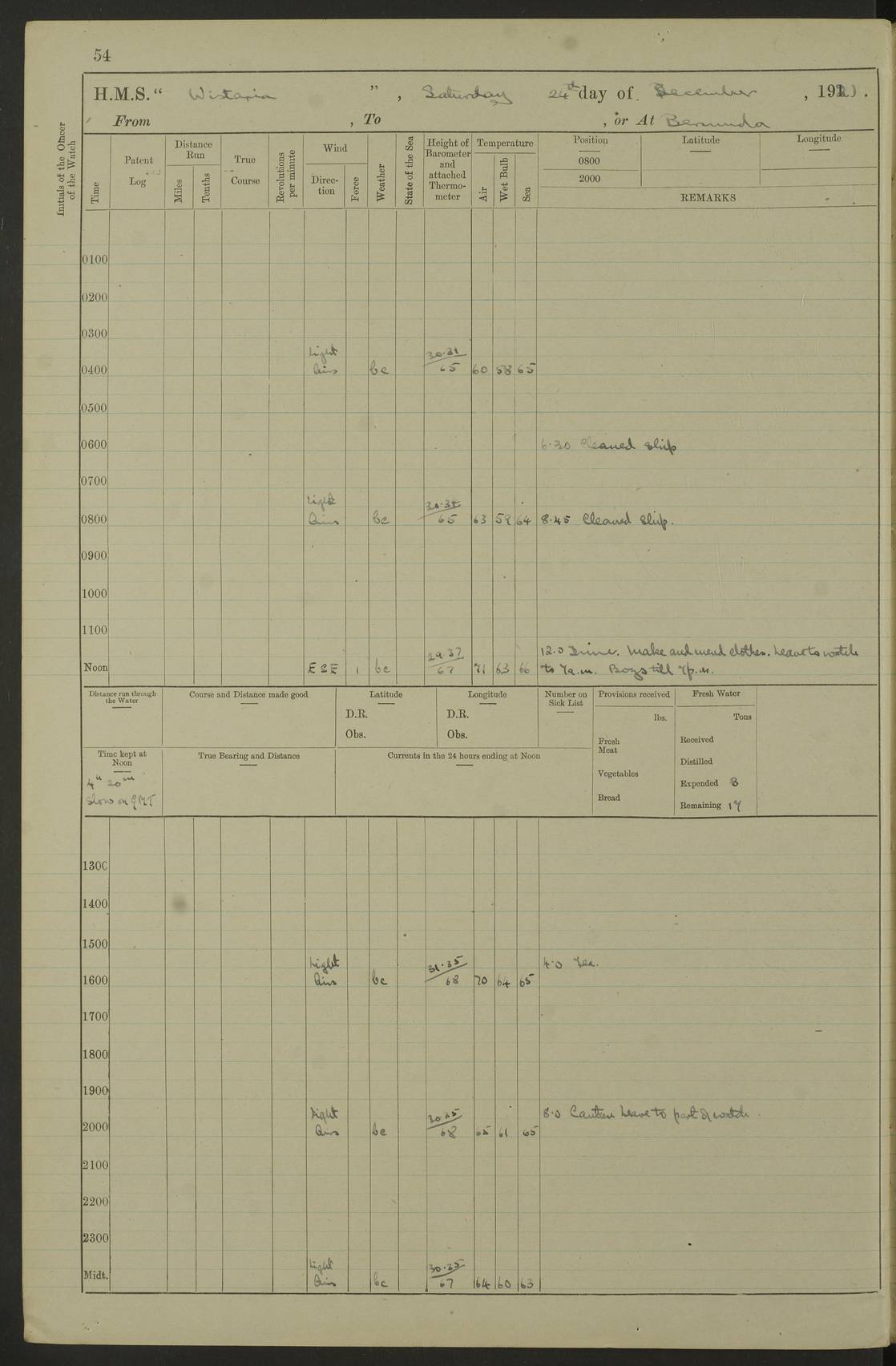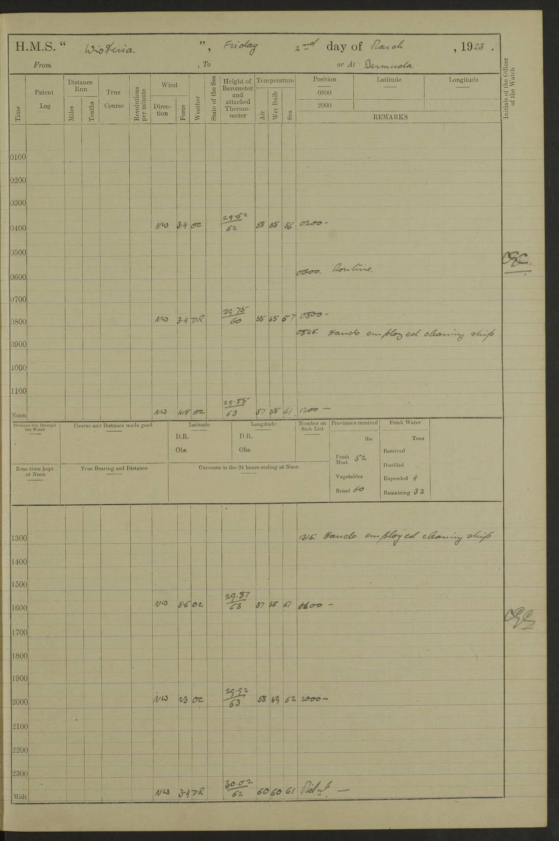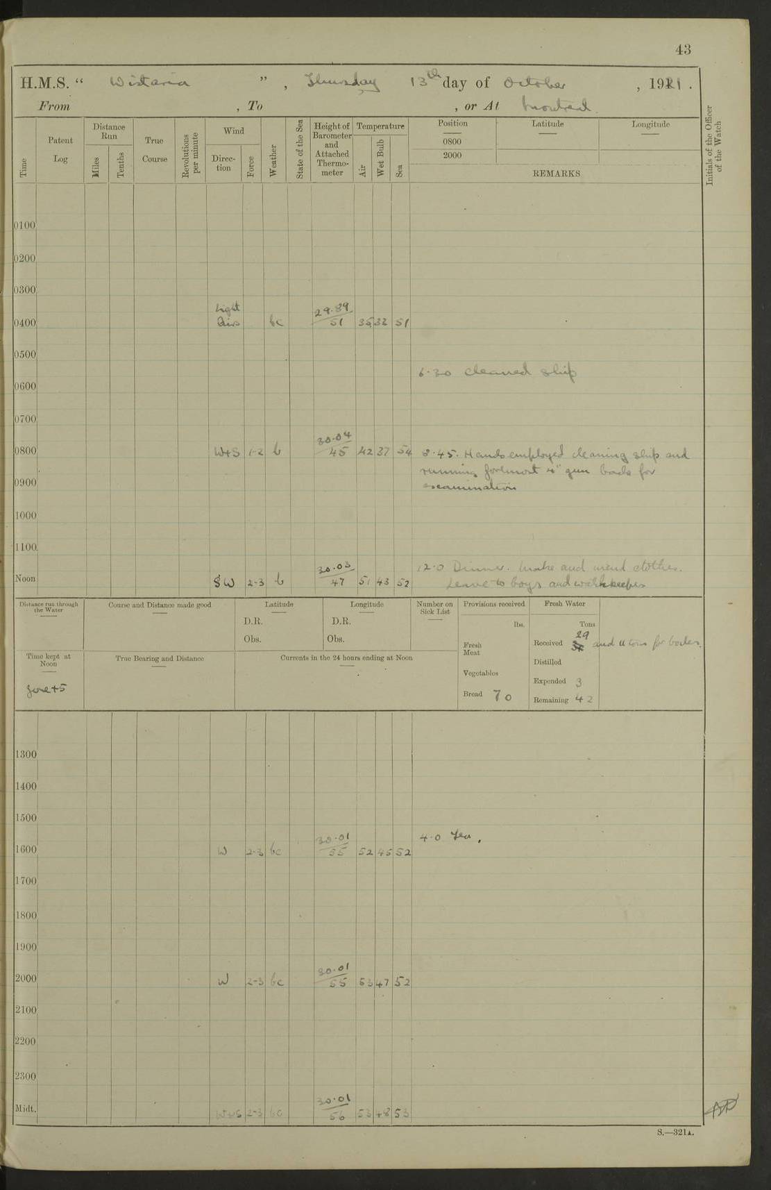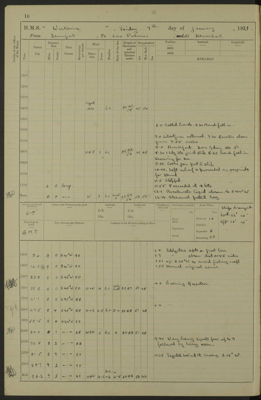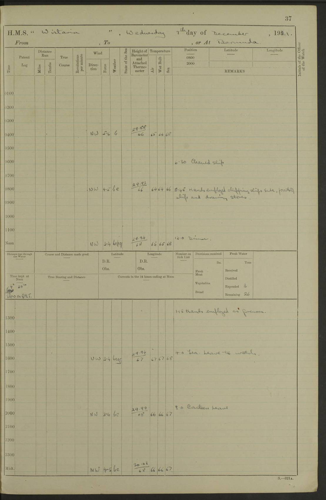 LOGS FOR DECEMBER 1920 4f73c9e6a2fc8ea903000965: (https://s3.amazonaws.com:443/oldweather/ADM53-93259/0003_1.jpg) 29 December 1920 At Devonport Lat 50.38, Long -4.19 9.0am: Commissioned with Chatham Crew 11.55am: Cooks to galley am: Sub Lt Jenks joined ship 1.10pm: Out pipes 1.15pm: Hands fall in. Employed in scrubbing and washing upper deck 3.30pm: Leave to 1st and 2nd watches 4 pm-7 am. Liberty men to clean 4.0pm: Liberty men fall in. Tea 4.15pm: Sunset 5.0pm: Liberty men fall in 6.0pm: Liberty men fall in 7.10pm: 1st Lieutenant returned from sick berth 7.15pm: Supper 8.0pm: Stand by hammocks 8.40pm: Clear off mess decks for rounds 9.0pm: Rounds 10.0pm: Pipe down 12.0pm: Rounds correct 4f73c9e7a2fc8ea903000966: (https://s3.amazonaws.com:443/oldweather/ADM53-93259/0004_0.jpg) 30 December 1920 At Devonport Lat 50.38, Long -4.19 6.0am: Called hands 6.30am: Hands fall in. Scrub & wash upper decks 7.20am: Quarters clean guns 7.50am: Secure 8.0am: Breakfast. Dress of day N°3 8.40am: Out pipes. Hands fall in am: Hands working main derrick. 4 hands & 1 Leading Seaman working with Chief Writer with stationery 10.20am: Stand easy 10.30am: Carry on with work 11.0am: Hands getting in provisions 11.30am: Afternoon watchmen to dinner noon: Dinner 1.15pm: Hands fall in. 1 Leading Seaman & hands with Chief Writer. 1 Leading Seaman & 2 AB Electr. Light. 3 AB with ship’s steward. 3 hands cleaning guns 3.40pm: Secure. Clear up decks 4.0pm: Evening Quarters. Sunset 4.24pm: Exercised collision stations 4.30pm: Secure. Tea. Leave to 2nd & 3rd watches 5 pm to 7 am 6.0pm: Liberty men fall in 7.15pm: Supper 8.0pm: Stand by hammocks 9.0pm: Rounds 10.0pm: Pipe down 4f73c9e7a2fc8ea903000967: (https://s3.amazonaws.com:443/oldweather/ADM53-93259/0004_1.jpg) 31 December 1920 At Devonport Lat 50.38, Long -4.19 6.30am: Hands scrubbing & washing upper decks 8.0am: Breakfast & clean Number 3 8.45am: Hands fall in. 6 hands unrigging fore derrick. 4 hands securing wood on upper deck. 3 hands stowing stanchions below decks 10.20am: Stand easy 10.30am: Carry on 10.45am: 4 hands getting in canteen gear 11.55am: Cooks noon: Dinner 1.15pm: Q.D. men unrigging awning stanchions, remainder securing derricks 3.40pm: Secure. Clear up decks 4.0pm: Evening Quarters 4.05pm: Tea 4.20pm: Sunset 7.10pm: Supper 8.0pm: Stand by hammocks LOGS FOR JANUARY 1921 4f73c9e7a2fc8ea903000968: (https://s3.amazonaws.com:443/oldweather/ADM53-93259/0005_0.jpg) 1 January 1921 At Devonport Lat 50.38, Long -4.19 6.0am: Called hands 6.30am: Hands fall in. Guard and steerage 7.30am: Store party to breakfast 7.45am: Breakfast 8.15am: Store party left ship 8.45am: Hands fall in. Stowing stanchions 10.20am: Stand easy 10.30am: Carry on with work noon: Dinner. Leave to Port watch 1 pm-7 am Monday. Leave to boys 1 pm to 6 pm pm: Hands make and mend clothes 4.0pm: Tea. Shift into night clothing 8.0pm: Stand by hammocks 4f73c9e8a2fc8ea903000969: (https://s3.amazonaws.com:443/oldweather/ADM53-93259/0005_1.jpg) 2 January 1921 At Devonport Lat 50.38, Long -4.19 7.0am: Hands fall in, scrub upper deck 8.0am: Breakfast and clean Number 2s 8.45am: Clear up decks for divisions 10.0am: Divisions 4.0pm: Tea. Shift into night clothing 8.0pm: Stand by hammocks 8.30pm: Clear up mess decks and flats for rounds 8.55pm: Clear off mess decks for rounds 9.0pm: Rounds 4f73c9e8a2fc8ea90300096a: (https://s3.amazonaws.com:443/oldweather/ADM53-93259/0006_0.jpg) 3 January 1921 At Devonport Lat 50.38, Long -4.19 6.15am: Hands fall in, scrub and wash upper deck 8.0am: Breakfast. Dress of day Number 3s 8.50am: Hands fall in. Stand fast cooks. Hands getting down stanchions and preparing 2nd whaler. Ship commenced basin trials 10.0am: Trial concluded 11.25am: Left dockyard for Number 5 buoy 12.05am: Hands to dinner & clean in refitting rig. Ammunition lighter alongside 1.15pm: Hands getting in ammunition 2.30pm: Lowered motor boat 3.30pm: Finished ammunitioning ship 5.0pm: Liberty men landed. Port watch store ammunition 8.40pm: Clear off mess deck for rounds 4f73c9e9a2fc8ea90300096b: (https://s3.amazonaws.com:443/oldweather/ADM53-93259/0006_1.jpg) 4 January 1921 At Devonport Lat 50.38, Long -4.19 6.30am: Hands fall in. Securing for sea 8.15am: Forecastle men muster on Forecastle, unshackle reeve ship wire 8.45am: Slipped and proceeded. Course and speed as required for full power trial 9.15am: Breakwater Lt Ho abeam 9.20am: Course S30E 10.30am: Altered course NE and as requisite for entering sound 10.55am: Secured to No 1 buoy (Sound) 11.30am: Made fast to buoy. Tug swung ship for compasses 1.0pm: Finished swinging for compasses. Forecastle men muster on forecastle 1.15pm: Entered harbour 2.15pm: Secured alongside wall 2.20pm: Coal lighter secured alongside 2.40pm: Hands to clear in coaling rig 3.0pm: Hands coal ship 4.55pm: Finished coaling 5.20pm: Hands fall in wash down decks 6.20pm: Hands paid 8.0pm: Stand by hammocks 8.20pm: Clear up mess decks for rounds 4f73c9e9a2fc8ea90300096c: (https://s3.amazonaws.com:443/oldweather/ADM53-93259/0007_0.jpg) 5 January 1921 At Devonport Lat 50.38, Long -4.19 6.30am: Hands fall in. Guard and steerage 8.0am: Carpenter & 4 hands employed in dockyard 8.10am: Ash lighter alongside 8.45am: Hands securing ship for sea 10.30am: Carry on. Hands to General Quarters 11.15am: Quarters clean guns 11.30am: Secure. Return rags 11.35am: Clear up decks noon: Store party returned. Hands to dinner 1.15pm: Hands fall in. 4 hands with carpenter, 2 with steward. Remainder securing ship for sea 4f73c9e9a2fc8ea90300096d: (https://s3.amazonaws.com:443/oldweather/ADM53-93259/0007_1.jpg) 6 January 1921 At Devonport Lat 50.38, Long -4.19 8.30am: Hands employed cleaning ship 10.50am: Chief of Staff inspected ship 11.33am: Chief of Staff left ship Ice sent. 12 cases received on board 1.15pm: Hands fall in. Getting in beef and replacing motor boats davit 2.0pm: 1 Leading Stoker discharged to hospital 4f73c9eaa2fc8ea90300096e: (https://s3.amazonaws.com:443/oldweather/ADM53-93259/00