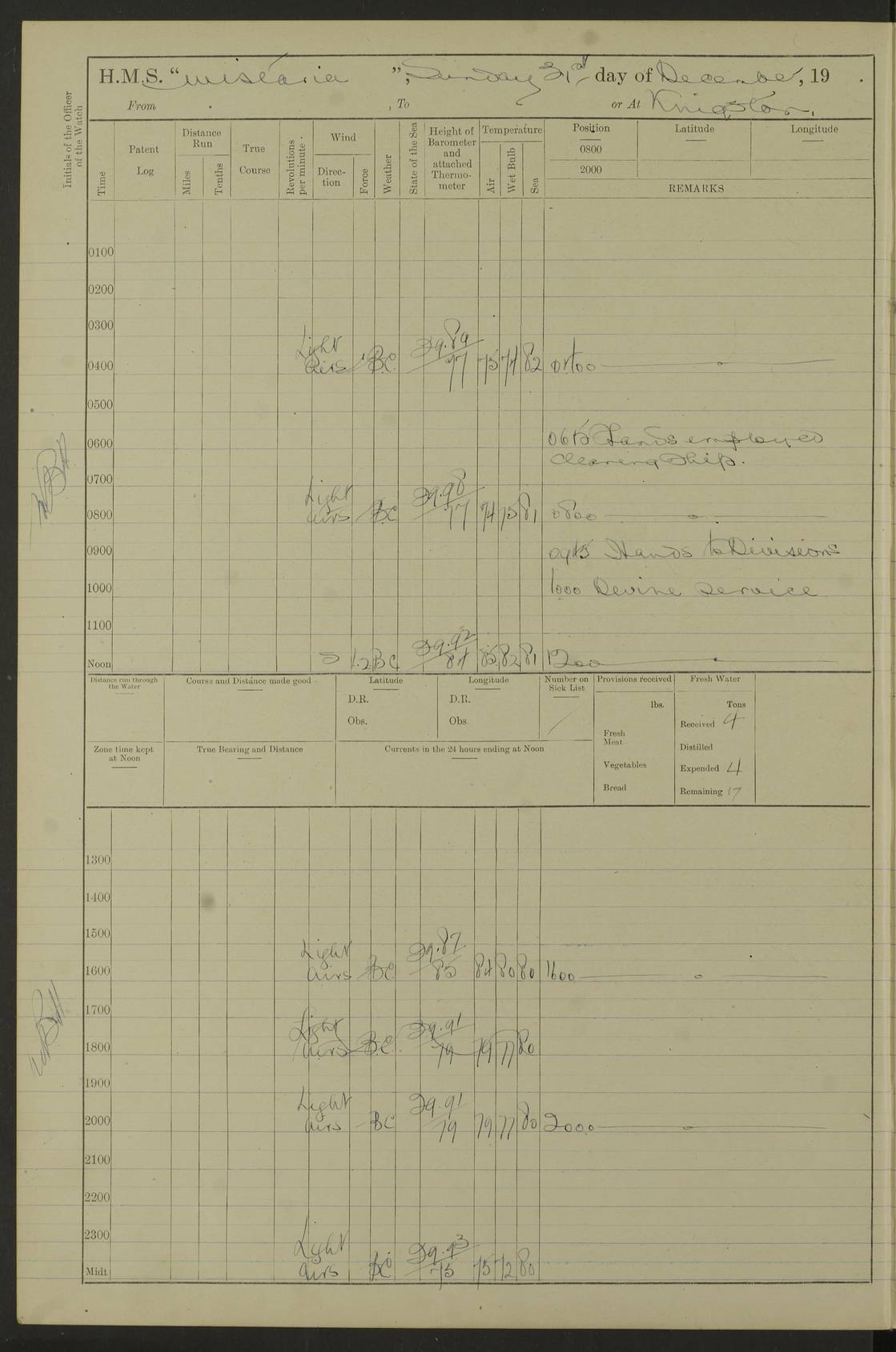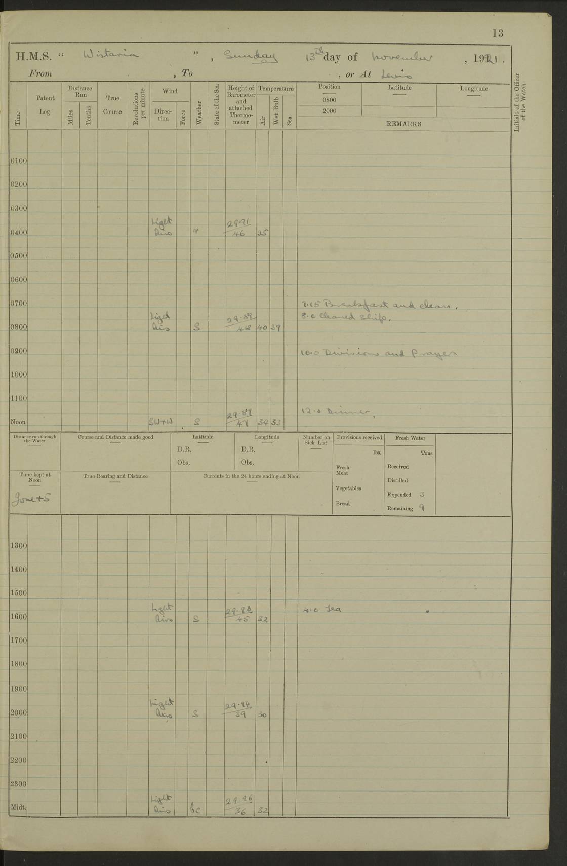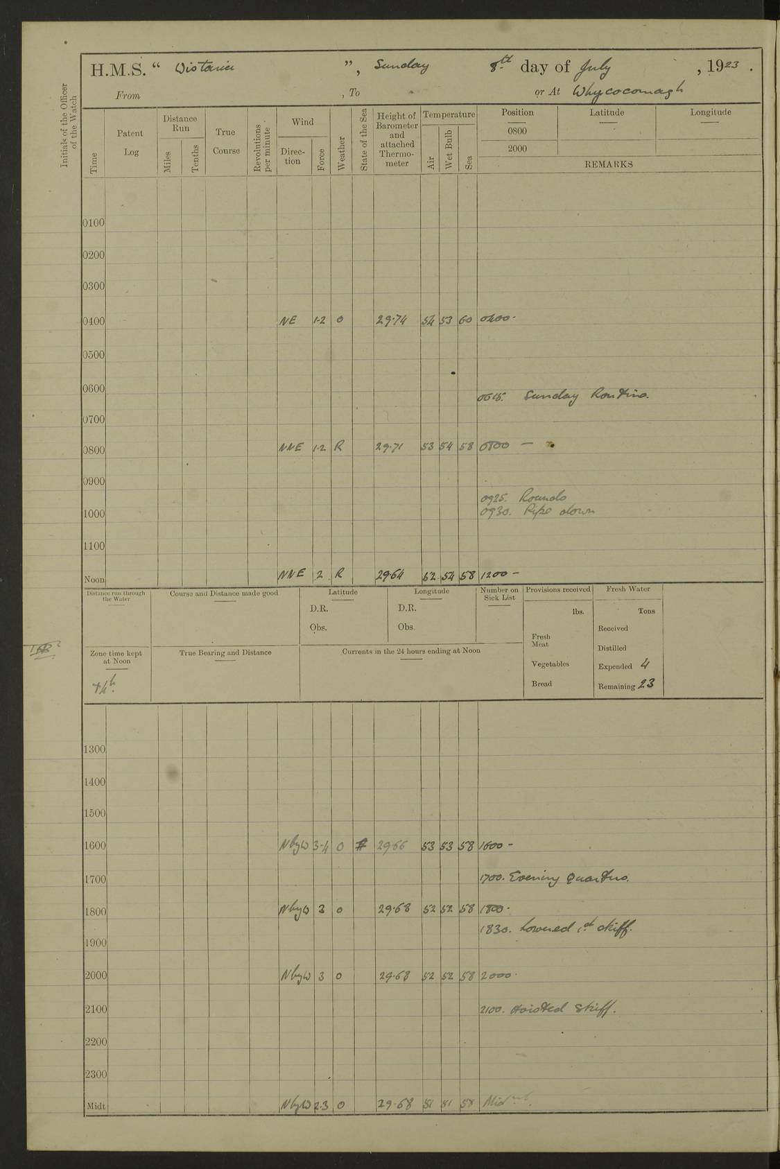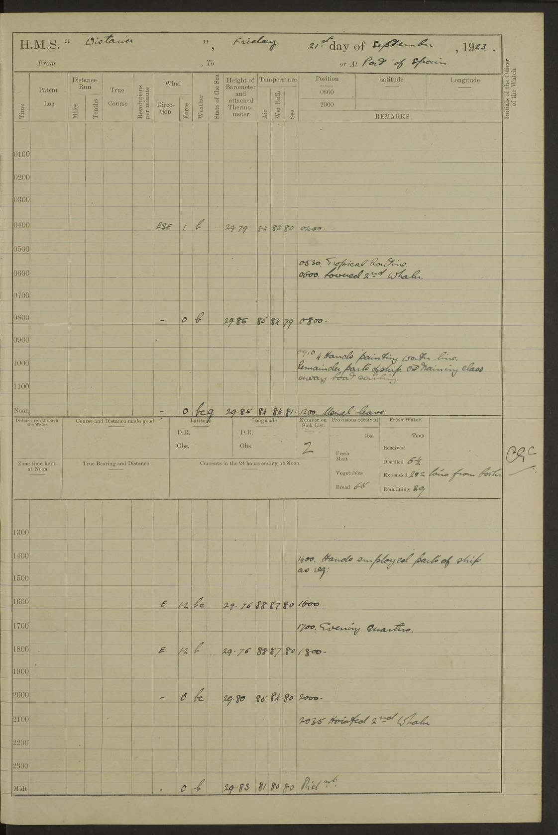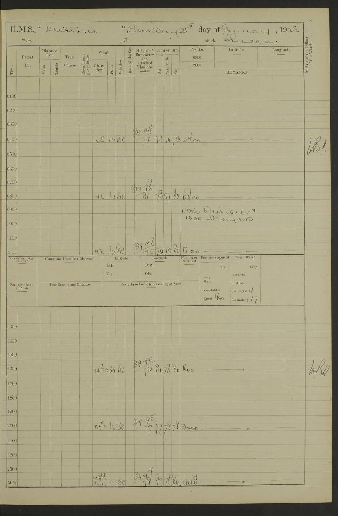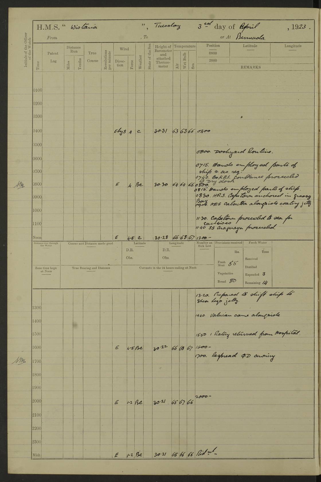 LOGS FOR DECEMBER 1920 4f73c9e6a2fc8ea903000965: (https://s3.amazonaws.com:443/oldweather/ADM53-93259/0003_1.jpg) 29 December 1920 At Devonport Lat 50.38, Long -4.19 9.0am: Commissioned with Chatham Crew 11.55am: Cooks to galley am: Sub Lt Jenks joined ship 1.10pm: Out pipes 1.15pm: Hands fall in. Employed in scrubbing and washing upper deck 3.30pm: Leave to 1st and 2nd watches 4 pm-7 am. Liberty men to clean 4.0pm: Liberty men fall in. Tea 4.15pm: Sunset 5.0pm: Liberty men fall in 6.0pm: Liberty men fall in 7.10pm: 1st Lieutenant returned from sick berth 7.15pm: Supper 8.0pm: Stand by hammocks 8.40pm: Clear off mess decks for rounds 9.0pm: Rounds 10.0pm: Pipe down 12.0pm: Rounds correct 4f73c9e7a2fc8ea903000966: (https://s3.amazonaws.com:443/oldweather/ADM53-93259/0004_0.jpg) 30 December 1920 At Devonport Lat 50.38, Long -4.19 6.0am: Called hands 6.30am: Hands fall in. Scrub & wash upper decks 7.20am: Quarters clean guns 7.50am: Secure 8.0am: Breakfast. Dress of day N°3 8.40am: Out pipes. Hands fall in am: Hands working main derrick. 4 hands & 1 Leading Seaman working with Chief Writer with stationery 10.20am: Stand easy 10.30am: Carry on with work 11.0am: Hands getting in provisions 11.30am: Afternoon watchmen to dinner noon: Dinner 1.15pm: Hands fall in. 1 Leading Seaman & hands with Chief Writer. 1 Leading Seaman & 2 AB Electr. Light. 3 AB with ship’s steward. 3 hands cleaning guns 3.40pm: Secure. Clear up decks 4.0pm: Evening Quarters. Sunset 4.24pm: Exercised collision stations 4.30pm: Secure. Tea. Leave to 2nd & 3rd watches 5 pm to 7 am 6.0pm: Liberty men fall in 7.15pm: Supper 8.0pm: Stand by hammocks 9.0pm: Rounds 10.0pm: Pipe down 4f73c9e7a2fc8ea903000967: (https://s3.amazonaws.com:443/oldweather/ADM53-93259/0004_1.jpg) 31 December 1920 At Devonport Lat 50.38, Long -4.19 6.30am: Hands scrubbing & washing upper decks 8.0am: Breakfast & clean Number 3 8.45am: Hands fall in. 6 hands unrigging fore derrick. 4 hands securing wood on upper deck. 3 hands stowing stanchions below decks 10.20am: Stand easy 10.30am: Carry on 10.45am: 4 hands getting in canteen gear 11.55am: Cooks noon: Dinner 1.15pm: Q.D. men unrigging awning stanchions, remainder securing derricks 3.40pm: Secure. Clear up decks 4.0pm: Evening Quarters 4.05pm: Tea 4.20pm: Sunset 7.10pm: Supper 8.0pm: Stand by hammocks LOGS FOR JANUARY 1921 4f73c9e7a2fc8ea903000968: (https://s3.amazonaws.com:443/oldweather/ADM53-93259/0005_0.jpg) 1 January 1921 At Devonport Lat 50.38, Long -4.19 6.0am: Called hands 6.30am: Hands fall in. Guard and steerage 7.30am: Store party to breakfast 7.45am: Breakfast 8.15am: Store party left ship 8.45am: Hands fall in. Stowing stanchions 10.20am: Stand easy 10.30am: Carry on with work noon: Dinner. Leave to Port watch 1 pm-7 am Monday. Leave to boys 1 pm to 6 pm pm: Hands make and mend clothes 4.0pm: Tea. Shift into night clothing 8.0pm: Stand by hammocks 4f73c9e8a2fc8ea903000969: (https://s3.amazonaws.com:443/oldweather/ADM53-93259/0005_1.jpg) 2 January 1921 At Devonport Lat 50.38, Long -4.19 7.0am: Hands fall in, scrub upper deck 8.0am: Breakfast and clean Number 2s 8.45am: Clear up decks for divisions 10.0am: Divisions 4.0pm: Tea. Shift into night clothing 8.0pm: Stand by hammocks 8.30pm: Clear up mess decks and flats for rounds 8.55pm: Clear off mess decks for rounds 9.0pm: Rounds 4f73c9e8a2fc8ea90300096a: (https://s3.amazonaws.com:443/oldweather/ADM53-93259/0006_0.jpg) 3 January 1921 At Devonport Lat 50.38, Long -4.19 6.15am: Hands fall in, scrub and wash upper deck 8.0am: Breakfast. Dress of day Number 3s 8.50am: Hands fall in. Stand fast cooks. Hands getting down stanchions and preparing 2nd whaler. Ship commenced basin trials 10.0am: Trial concluded 11.25am: Left dockyard for Number 5 buoy 12.05am: Hands to dinner & clean in refitting rig. Ammunition lighter alongside 1.15pm: Hands getting in ammunition 2.30pm: Lowered motor boat 3.30pm: Finished ammunitioning ship 5.0pm: Liberty men landed. Port watch store ammunition 8.40pm: Clear off mess deck for rounds 4f73c9e9a2fc8ea90300096b: (https://s3.amazonaws.com:443/oldweather/ADM53-93259/0006_1.jpg) 4 January 1921 At Devonport Lat 50.38, Long -4.19 6.30am: Hands fall in. Securing for sea 8.15am: Forecastle men muster on Forecastle, unshackle reeve ship wire 8.45am: Slipped and proceeded. Course and speed as required for full power trial 9.15am: Breakwater Lt Ho abeam 9.20am: Course S30E 10.30am: Altered course NE and as requisite for entering sound 10.55am: Secured to No 1 buoy (Sound) 11.30am: Made fast to buoy. Tug swung ship for compasses 1.0pm: Finished swinging for compasses. Forecastle men muster on forecastle 1.15pm: Entered harbour 2.15pm: Secured alongside wall 2.20pm: Coal lighter secured alongside 2.40pm: Hands to clear in coaling rig 3.0pm: Hands coal ship 4.55pm: Finished coaling 5.20pm: Hands fall in wash down decks 6.20pm: Hands paid 8.0pm: Stand by hammocks 8.20pm: Clear up mess decks for rounds 4f73c9e9a2fc8ea90300096c: (https://s3.amazonaws.com:443/oldweather/ADM53-93259/0007_0.jpg) 5 January 1921 At Devonport Lat 50.38, Long -4.19 6.30am: Hands fall in. Guard and steerage 8.0am: Carpenter & 4 hands employed in dockyard 8.10am: Ash lighter alongside 8.45am: Hands securing ship for sea 10.30am: Carry on. Hands to General Quarters 11.15am: Quarters clean guns 11.30am: Secure. Return rags 11.35am: Clear up decks noon: Store party returned. Hands to dinner 1.15pm: Hands fall in. 4 hands with carpenter, 2 with steward. Remainder securing ship for sea 4f73c9e9a2fc8ea90300096d: (https://s3.amazonaws.com:443/oldweather/ADM53-93259/0007_1.jpg) 6 January 1921 At Devonport Lat 50.38, Long -4.19 8.30am: Hands employed cleaning ship 10.50am: Chief of Staff inspected ship 11.33am: Chief of Staff left ship Ice sent. 12 cases received on board 1.15pm: Hands fall in. Getting in beef and replacing motor boats davit 2.0pm: 1 Leading Stoker discharged to hospital 4f73c9eaa2fc8ea90300096e: (https://s3.amazonaws.com:443/oldweather/ADM53-93259/00