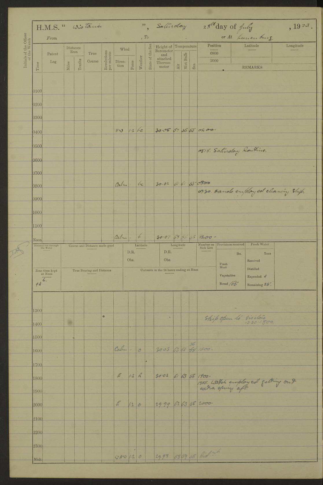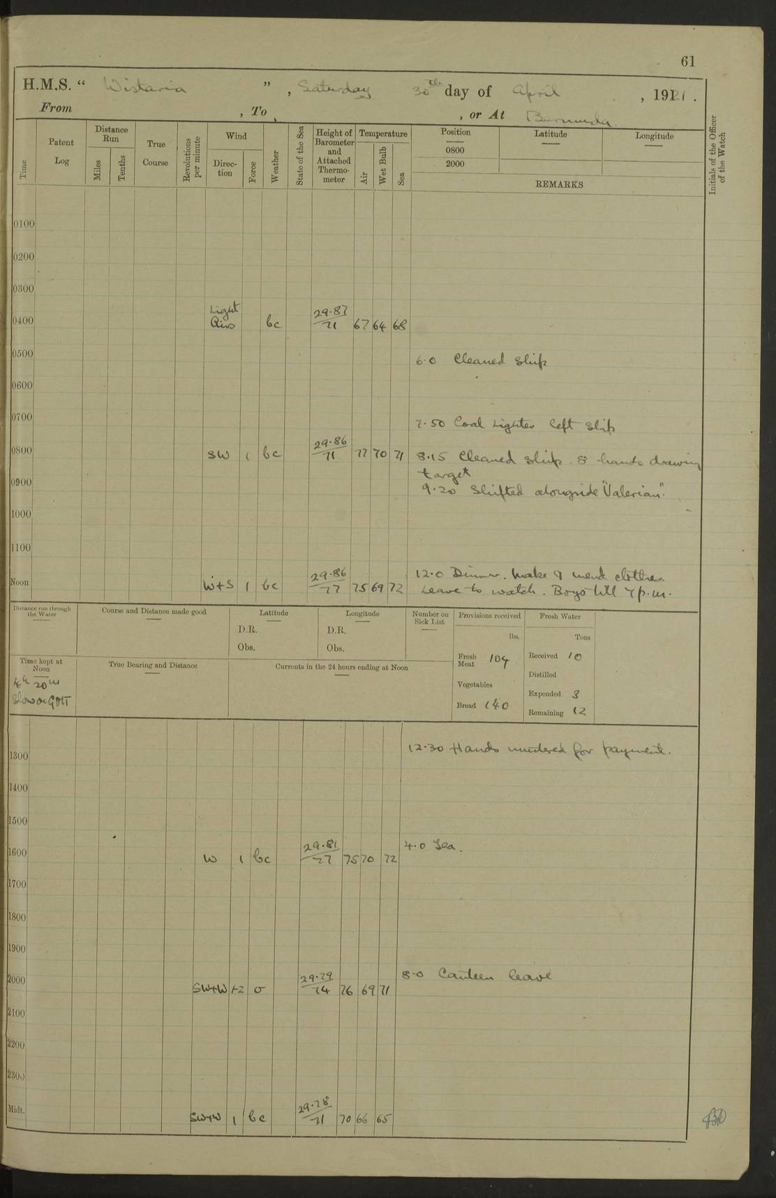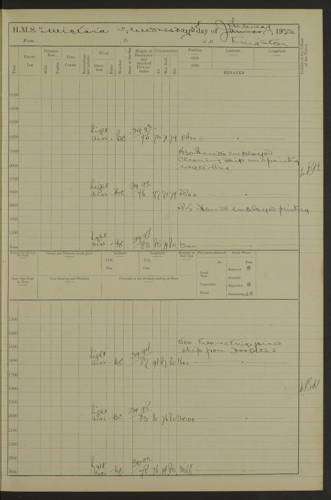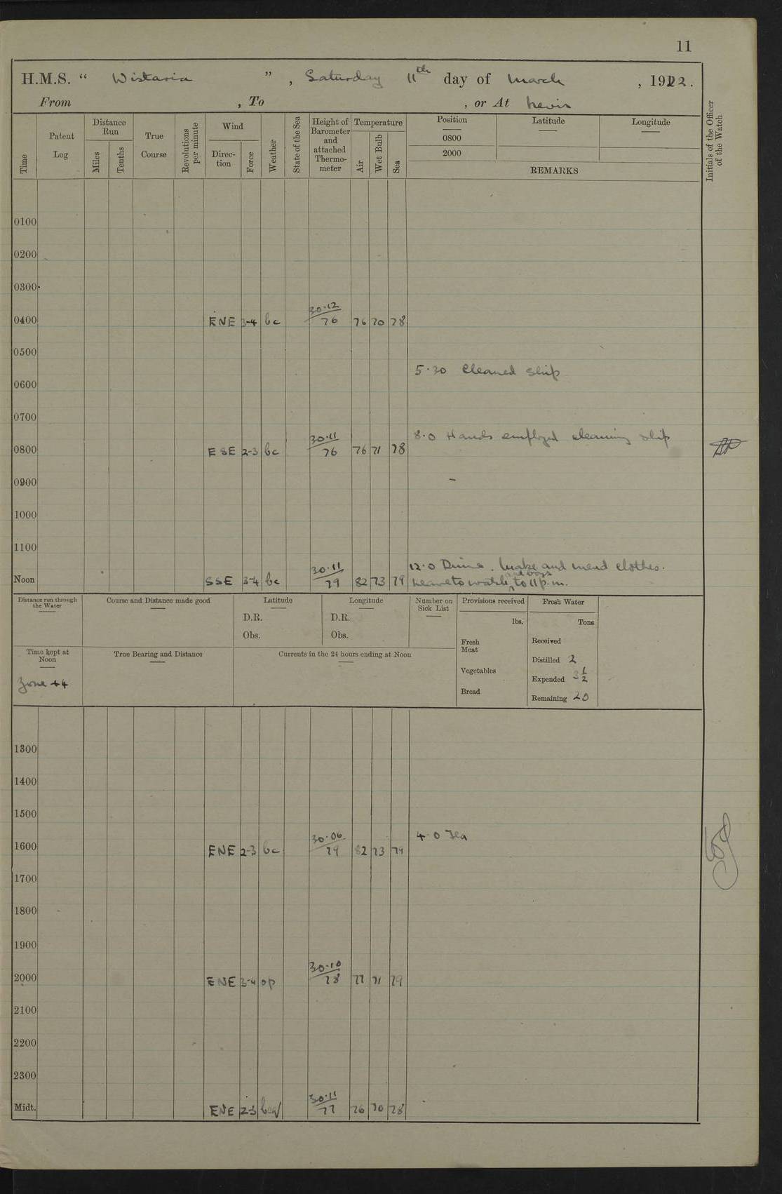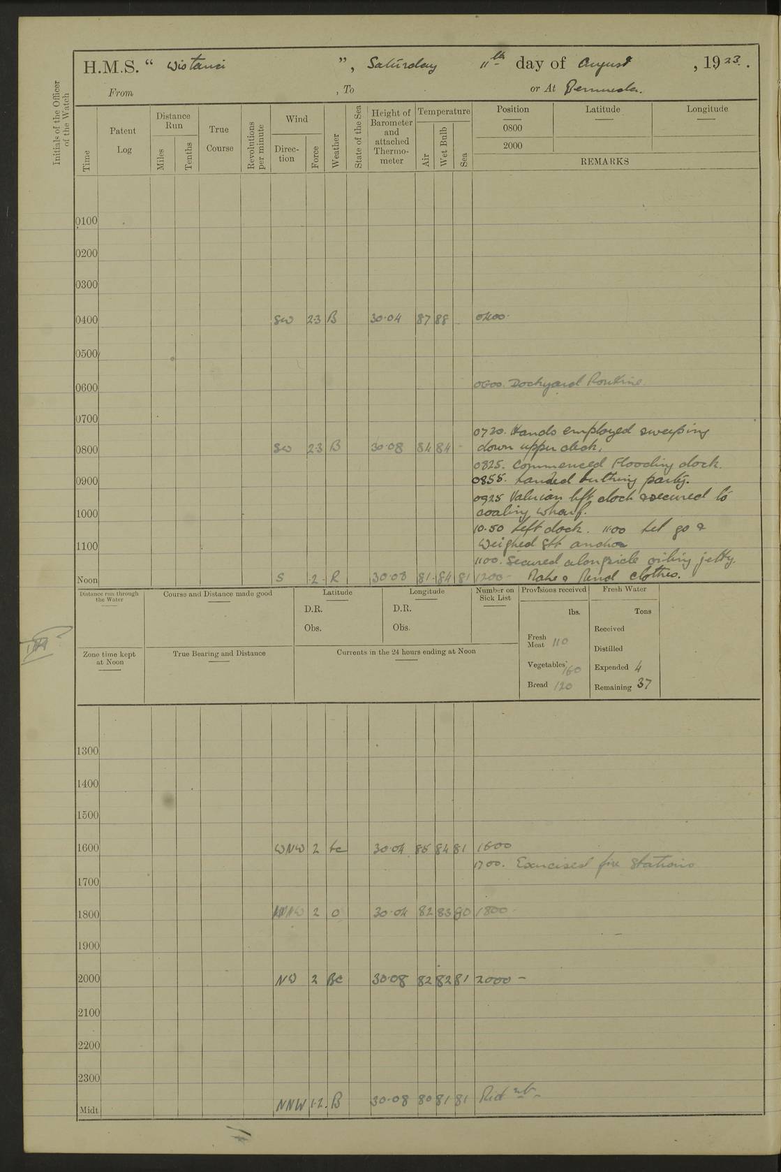 LOGS FOR DECEMBER 1920 4f73c9e6a2fc8ea903000965: (https://s3.amazonaws.com:443/oldweather/ADM53-93259/0003_1.jpg) 29 December 1920 At Devonport Lat 50.38, Long -4.19 9.0am: Commissioned with Chatham Crew 11.55am: Cooks to galley am: Sub Lt Jenks joined ship 1.10pm: Out pipes 1.15pm: Hands fall in. Employed in scrubbing and washing upper deck 3.30pm: Leave to 1st and 2nd watches 4 pm-7 am. Liberty men to clean 4.0pm: Liberty men fall in. Tea 4.15pm: Sunset 5.0pm: Liberty men fall in 6.0pm: Liberty men fall in 7.10pm: 1st Lieutenant returned from sick berth 7.15pm: Supper 8.0pm: Stand by hammocks 8.40pm: Clear off mess decks for rounds 9.0pm: Rounds 10.0pm: Pipe down 12.0pm: Rounds correct 4f73c9e7a2fc8ea903000966: (https://s3.amazonaws.com:443/oldweather/ADM53-93259/0004_0.jpg) 30 December 1920 At Devonport Lat 50.38, Long -4.19 6.0am: Called hands 6.30am: Hands fall in. Scrub & wash upper decks 7.20am: Quarters clean guns 7.50am: Secure 8.0am: Breakfast. Dress of day N°3 8.40am: Out pipes. Hands fall in am: Hands working main derrick. 4 hands & 1 Leading Seaman working with Chief Writer with stationery 10.20am: Stand easy 10.30am: Carry on with work 11.0am: Hands getting in provisions 11.30am: Afternoon watchmen to dinner noon: Dinner 1.15pm: Hands fall in. 1 Leading Seaman & hands with Chief Writer. 1 Leading Seaman & 2 AB Electr. Light. 3 AB with ship’s steward. 3 hands cleaning guns 3.40pm: Secure. Clear up decks 4.0pm: Evening Quarters. Sunset 4.24pm: Exercised collision stations 4.30pm: Secure. Tea. Leave to 2nd & 3rd watches 5 pm to 7 am 6.0pm: Liberty men fall in 7.15pm: Supper 8.0pm: Stand by hammocks 9.0pm: Rounds 10.0pm: Pipe down 4f73c9e7a2fc8ea903000967: (https://s3.amazonaws.com:443/oldweather/ADM53-93259/0004_1.jpg) 31 December 1920 At Devonport Lat 50.38, Long -4.19 6.30am: Hands scrubbing & washing upper decks 8.0am: Breakfast & clean Number 3 8.45am: Hands fall in. 6 hands unrigging fore derrick. 4 hands securing wood on upper deck. 3 hands stowing stanchions below decks 10.20am: Stand easy 10.30am: Carry on 10.45am: 4 hands getting in canteen gear 11.55am: Cooks noon: Dinner 1.15pm: Q.D. men unrigging awning stanchions, remainder securing derricks 3.40pm: Secure. Clear up decks 4.0pm: Evening Quarters 4.05pm: Tea 4.20pm: Sunset 7.10pm: Supper 8.0pm: Stand by hammocks LOGS FOR JANUARY 1921 4f73c9e7a2fc8ea903000968: (https://s3.amazonaws.com:443/oldweather/ADM53-93259/0005_0.jpg) 1 January 1921 At Devonport Lat 50.38, Long -4.19 6.0am: Called hands 6.30am: Hands fall in. Guard and steerage 7.30am: Store party to breakfast 7.45am: Breakfast 8.15am: Store party left ship 8.45am: Hands fall in. Stowing stanchions 10.20am: Stand easy 10.30am: Carry on with work noon: Dinner. Leave to Port watch 1 pm-7 am Monday. Leave to boys 1 pm to 6 pm pm: Hands make and mend clothes 4.0pm: Tea. Shift into night clothing 8.0pm: Stand by hammocks 4f73c9e8a2fc8ea903000969: (https://s3.amazonaws.com:443/oldweather/ADM53-93259/0005_1.jpg) 2 January 1921 At Devonport Lat 50.38, Long -4.19 7.0am: Hands fall in, scrub upper deck 8.0am: Breakfast and clean Number 2s 8.45am: Clear up decks for divisions 10.0am: Divisions 4.0pm: Tea. Shift into night clothing 8.0pm: Stand by hammocks 8.30pm: Clear up mess decks and flats for rounds 8.55pm: Clear off mess decks for rounds 9.0pm: Rounds 4f73c9e8a2fc8ea90300096a: (https://s3.amazonaws.com:443/oldweather/ADM53-93259/0006_0.jpg) 3 January 1921 At Devonport Lat 50.38, Long -4.19 6.15am: Hands fall in, scrub and wash upper deck 8.0am: Breakfast. Dress of day Number 3s 8.50am: Hands fall in. Stand fast cooks. Hands getting down stanchions and preparing 2nd whaler. Ship commenced basin trials 10.0am: Trial concluded 11.25am: Left dockyard for Number 5 buoy 12.05am: Hands to dinner & clean in refitting rig. Ammunition lighter alongside 1.15pm: Hands getting in ammunition 2.30pm: Lowered motor boat 3.30pm: Finished ammunitioning ship 5.0pm: Liberty men landed. Port watch store ammunition 8.40pm: Clear off mess deck for rounds 4f73c9e9a2fc8ea90300096b: (https://s3.amazonaws.com:443/oldweather/ADM53-93259/0006_1.jpg) 4 January 1921 At Devonport Lat 50.38, Long -4.19 6.30am: Hands fall in. Securing for sea 8.15am: Forecastle men muster on Forecastle, unshackle reeve ship wire 8.45am: Slipped and proceeded. Course and speed as required for full power trial 9.15am: Breakwater Lt Ho abeam 9.20am: Course S30E 10.30am: Altered course NE and as requisite for entering sound 10.55am: Secured to No 1 buoy (Sound) 11.30am: Made fast to buoy. Tug swung ship for compasses 1.0pm: Finished swinging for compasses. Forecastle men muster on forecastle 1.15pm: Entered harbour 2.15pm: Secured alongside wall 2.20pm: Coal lighter secured alongside 2.40pm: Hands to clear in coaling rig 3.0pm: Hands coal ship 4.55pm: Finished coaling 5.20pm: Hands fall in wash down decks 6.20pm: Hands paid 8.0pm: Stand by hammocks 8.20pm: Clear up mess decks for rounds 4f73c9e9a2fc8ea90300096c: (https://s3.amazonaws.com:443/oldweather/ADM53-93259/0007_0.jpg) 5 January 1921 At Devonport Lat 50.38, Long -4.19 6.30am: Hands fall in. Guard and steerage 8.0am: Carpenter & 4 hands employed in dockyard 8.10am: Ash lighter alongside 8.45am: Hands securing ship for sea 10.30am: Carry on. Hands to General Quarters 11.15am: Quarters clean guns 11.30am: Secure. Return rags 11.35am: Clear up decks noon: Store party returned. Hands to dinner 1.15pm: Hands fall in. 4 hands with carpenter, 2 with steward. Remainder securing ship for sea 4f73c9e9a2fc8ea90300096d: (https://s3.amazonaws.com:443/oldweather/ADM53-93259/0007_1.jpg) 6 January 1921 At Devonport Lat 50.38, Long -4.19 8.30am: Hands employed cleaning ship 10.50am: Chief of Staff inspected ship 11.33am: Chief of Staff left ship Ice sent. 12 cases received on board 1.15pm: Hands fall in. Getting in beef and replacing motor boats davit 2.0pm: 1 Leading Stoker discharged to hospital 4f73c9eaa2fc8ea90300096e: (https://s3.amazonaws.com:443/oldweather/ADM53-93259/00