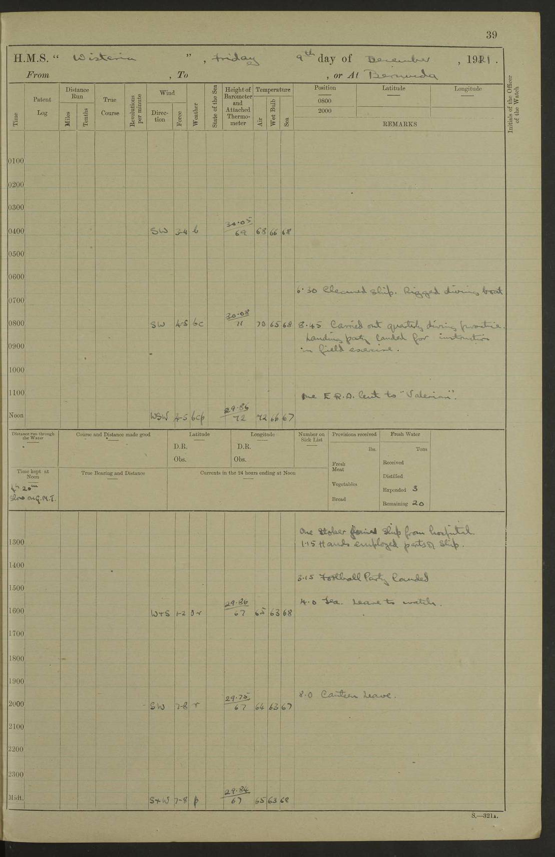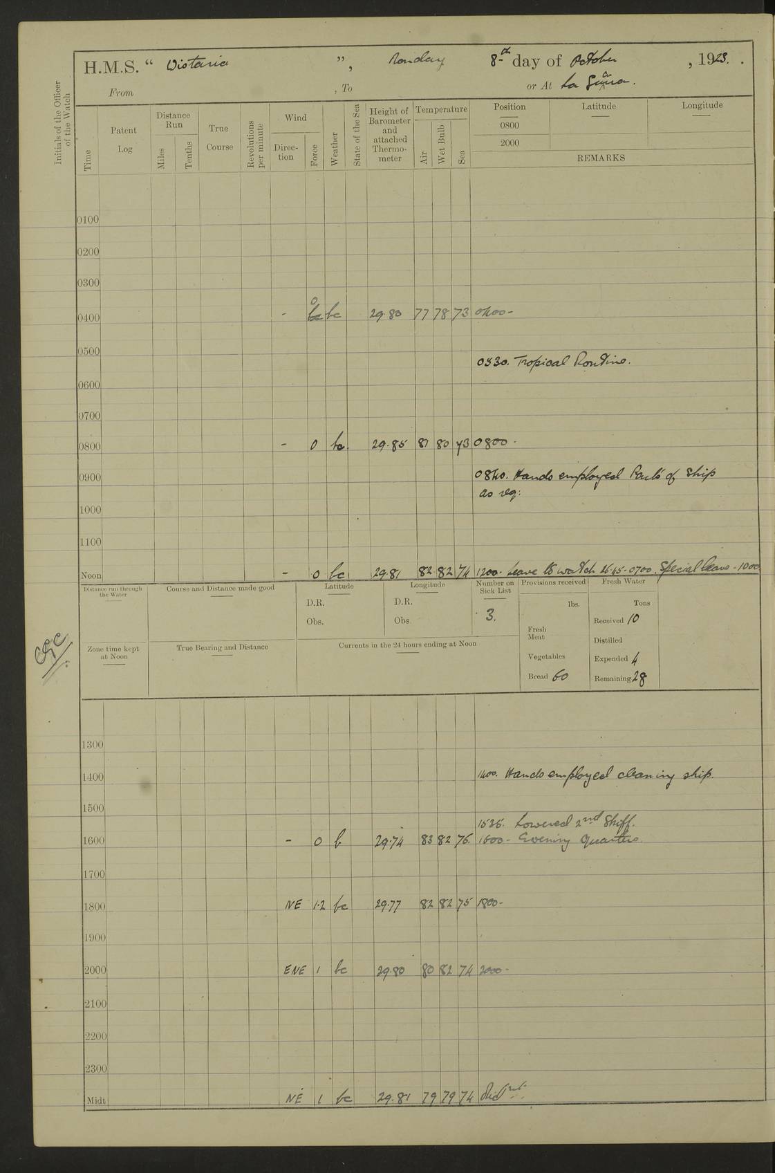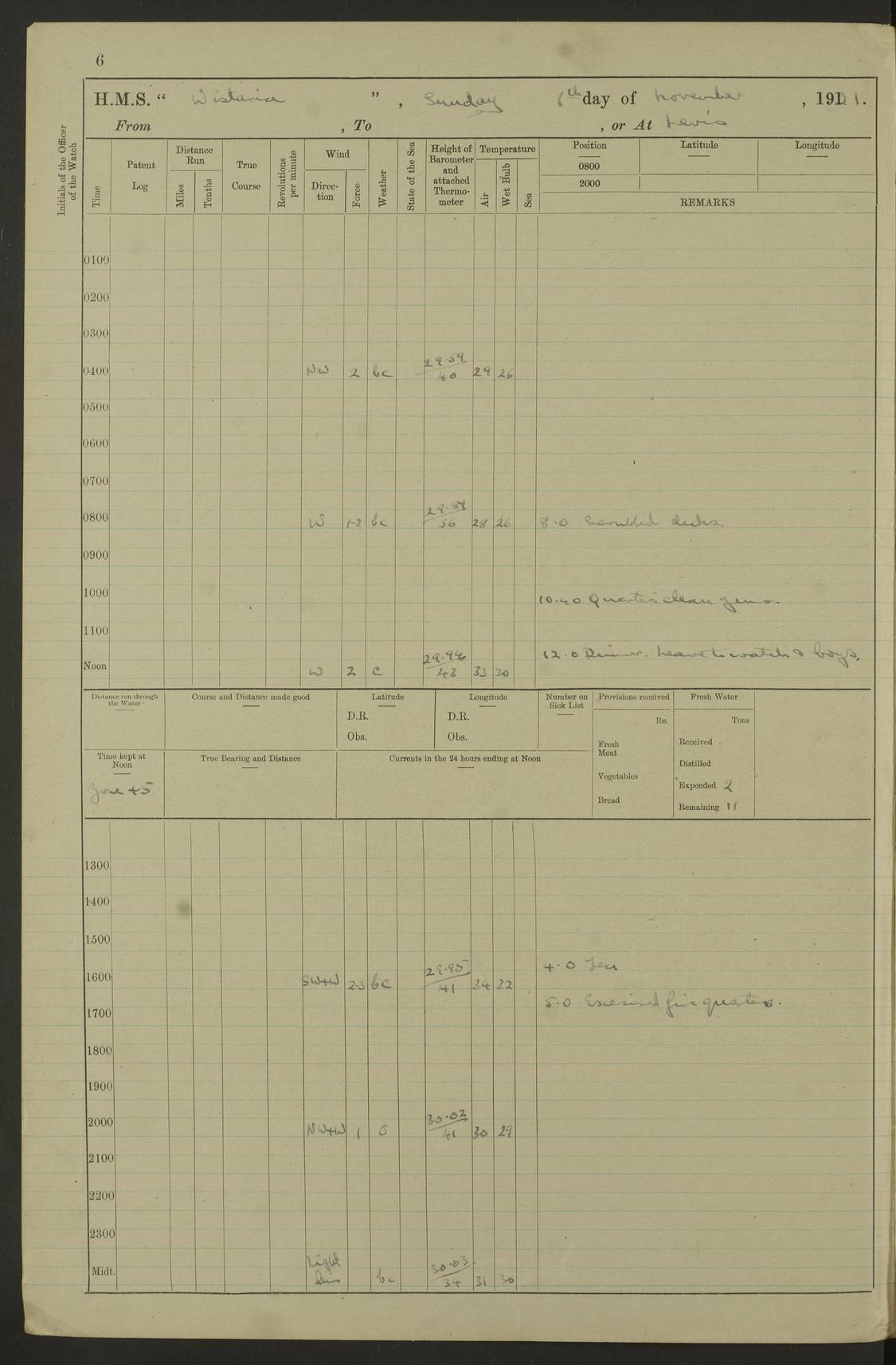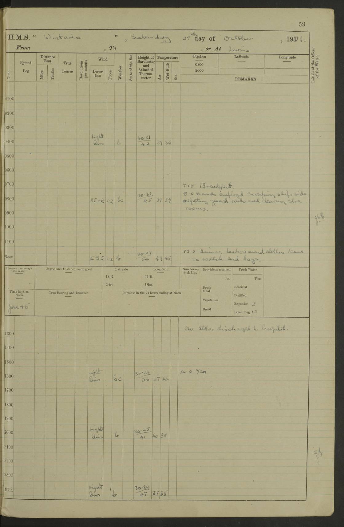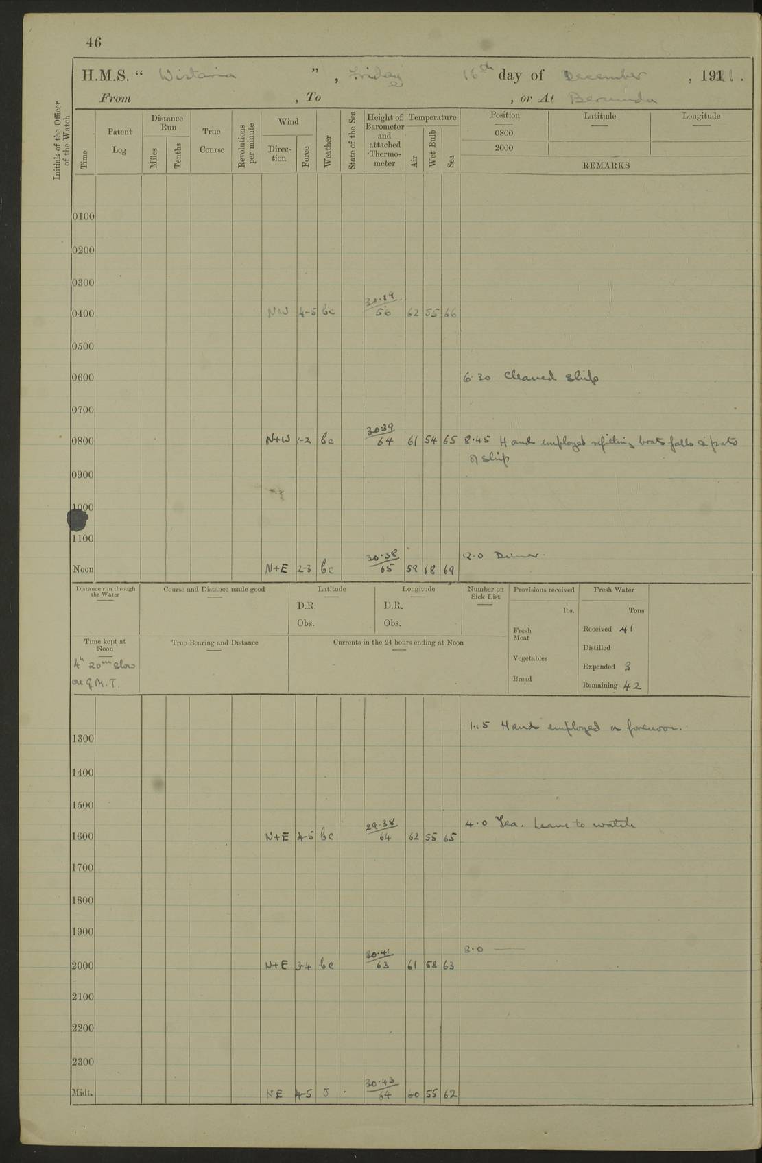 LOGS FOR DECEMBER 1920 4f73c9e6a2fc8ea903000965: (https://s3.amazonaws.com:443/oldweather/ADM53-93259/0003_1.jpg) 29 December 1920 At Devonport Lat 50.38, Long -4.19 9.0am: Commissioned with Chatham Crew 11.55am: Cooks to galley am: Sub Lt Jenks joined ship 1.10pm: Out pipes 1.15pm: Hands fall in. Employed in scrubbing and washing upper deck 3.30pm: Leave to 1st and 2nd watches 4 pm-7 am. Liberty men to clean 4.0pm: Liberty men fall in. Tea 4.15pm: Sunset 5.0pm: Liberty men fall in 6.0pm: Liberty men fall in 7.10pm: 1st Lieutenant returned from sick berth 7.15pm: Supper 8.0pm: Stand by hammocks 8.40pm: Clear off mess decks for rounds 9.0pm: Rounds 10.0pm: Pipe down 12.0pm: Rounds correct 4f73c9e7a2fc8ea903000966: (https://s3.amazonaws.com:443/oldweather/ADM53-93259/0004_0.jpg) 30 December 1920 At Devonport Lat 50.38, Long -4.19 6.0am: Called hands 6.30am: Hands fall in. Scrub & wash upper decks 7.20am: Quarters clean guns 7.50am: Secure 8.0am: Breakfast. Dress of day N°3 8.40am: Out pipes. Hands fall in am: Hands working main derrick. 4 hands & 1 Leading Seaman working with Chief Writer with stationery 10.20am: Stand easy 10.30am: Carry on with work 11.0am: Hands getting in provisions 11.30am: Afternoon watchmen to dinner noon: Dinner 1.15pm: Hands fall in. 1 Leading Seaman & hands with Chief Writer. 1 Leading Seaman & 2 AB Electr. Light. 3 AB with ship’s steward. 3 hands cleaning guns 3.40pm: Secure. Clear up decks 4.0pm: Evening Quarters. Sunset 4.24pm: Exercised collision stations 4.30pm: Secure. Tea. Leave to 2nd & 3rd watches 5 pm to 7 am 6.0pm: Liberty men fall in 7.15pm: Supper 8.0pm: Stand by hammocks 9.0pm: Rounds 10.0pm: Pipe down 4f73c9e7a2fc8ea903000967: (https://s3.amazonaws.com:443/oldweather/ADM53-93259/0004_1.jpg) 31 December 1920 At Devonport Lat 50.38, Long -4.19 6.30am: Hands scrubbing & washing upper decks 8.0am: Breakfast & clean Number 3 8.45am: Hands fall in. 6 hands unrigging fore derrick. 4 hands securing wood on upper deck. 3 hands stowing stanchions below decks 10.20am: Stand easy 10.30am: Carry on 10.45am: 4 hands getting in canteen gear 11.55am: Cooks noon: Dinner 1.15pm: Q.D. men unrigging awning stanchions, remainder securing derricks 3.40pm: Secure. Clear up decks 4.0pm: Evening Quarters 4.05pm: Tea 4.20pm: Sunset 7.10pm: Supper 8.0pm: Stand by hammocks LOGS FOR JANUARY 1921 4f73c9e7a2fc8ea903000968: (https://s3.amazonaws.com:443/oldweather/ADM53-93259/0005_0.jpg) 1 January 1921 At Devonport Lat 50.38, Long -4.19 6.0am: Called hands 6.30am: Hands fall in. Guard and steerage 7.30am: Store party to breakfast 7.45am: Breakfast 8.15am: Store party left ship 8.45am: Hands fall in. Stowing stanchions 10.20am: Stand easy 10.30am: Carry on with work noon: Dinner. Leave to Port watch 1 pm-7 am Monday. Leave to boys 1 pm to 6 pm pm: Hands make and mend clothes 4.0pm: Tea. Shift into night clothing 8.0pm: Stand by hammocks 4f73c9e8a2fc8ea903000969: (https://s3.amazonaws.com:443/oldweather/ADM53-93259/0005_1.jpg) 2 January 1921 At Devonport Lat 50.38, Long -4.19 7.0am: Hands fall in, scrub upper deck 8.0am: Breakfast and clean Number 2s 8.45am: Clear up decks for divisions 10.0am: Divisions 4.0pm: Tea. Shift into night clothing 8.0pm: Stand by hammocks 8.30pm: Clear up mess decks and flats for rounds 8.55pm: Clear off mess decks for rounds 9.0pm: Rounds 4f73c9e8a2fc8ea90300096a: (https://s3.amazonaws.com:443/oldweather/ADM53-93259/0006_0.jpg) 3 January 1921 At Devonport Lat 50.38, Long -4.19 6.15am: Hands fall in, scrub and wash upper deck 8.0am: Breakfast. Dress of day Number 3s 8.50am: Hands fall in. Stand fast cooks. Hands getting down stanchions and preparing 2nd whaler. Ship commenced basin trials 10.0am: Trial concluded 11.25am: Left dockyard for Number 5 buoy 12.05am: Hands to dinner & clean in refitting rig. Ammunition lighter alongside 1.15pm: Hands getting in ammunition 2.30pm: Lowered motor boat 3.30pm: Finished ammunitioning ship 5.0pm: Liberty men landed. Port watch store ammunition 8.40pm: Clear off mess deck for rounds 4f73c9e9a2fc8ea90300096b: (https://s3.amazonaws.com:443/oldweather/ADM53-93259/0006_1.jpg) 4 January 1921 At Devonport Lat 50.38, Long -4.19 6.30am: Hands fall in. Securing for sea 8.15am: Forecastle men muster on Forecastle, unshackle reeve ship wire 8.45am: Slipped and proceeded. Course and speed as required for full power trial 9.15am: Breakwater Lt Ho abeam 9.20am: Course S30E 10.30am: Altered course NE and as requisite for entering sound 10.55am: Secured to No 1 buoy (Sound) 11.30am: Made fast to buoy. Tug swung ship for compasses 1.0pm: Finished swinging for compasses. Forecastle men muster on forecastle 1.15pm: Entered harbour 2.15pm: Secured alongside wall 2.20pm: Coal lighter secured alongside 2.40pm: Hands to clear in coaling rig 3.0pm: Hands coal ship 4.55pm: Finished coaling 5.20pm: Hands fall in wash down decks 6.20pm: Hands paid 8.0pm: Stand by hammocks 8.20pm: Clear up mess decks for rounds 4f73c9e9a2fc8ea90300096c: (https://s3.amazonaws.com:443/oldweather/ADM53-93259/0007_0.jpg) 5 January 1921 At Devonport Lat 50.38, Long -4.19 6.30am: Hands fall in. Guard and steerage 8.0am: Carpenter & 4 hands employed in dockyard 8.10am: Ash lighter alongside 8.45am: Hands securing ship for sea 10.30am: Carry on. Hands to General Quarters 11.15am: Quarters clean guns 11.30am: Secure. Return rags 11.35am: Clear up decks noon: Store party returned. Hands to dinner 1.15pm: Hands fall in. 4 hands with carpenter, 2 with steward. Remainder securing ship for sea 4f73c9e9a2fc8ea90300096d: (https://s3.amazonaws.com:443/oldweather/ADM53-93259/0007_1.jpg) 6 January 1921 At Devonport Lat 50.38, Long -4.19 8.30am: Hands employed cleaning ship 10.50am: Chief of Staff inspected ship 11.33am: Chief of Staff left ship Ice sent. 12 cases received on board 1.15pm: Hands fall in. Getting in beef and replacing motor boats davit 2.0pm: 1 Leading Stoker discharged to hospital 4f73c9eaa2fc8ea90300096e: (https://s3.amazonaws.com:443/oldweather/ADM53-93259/00