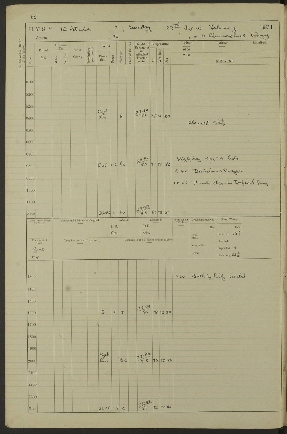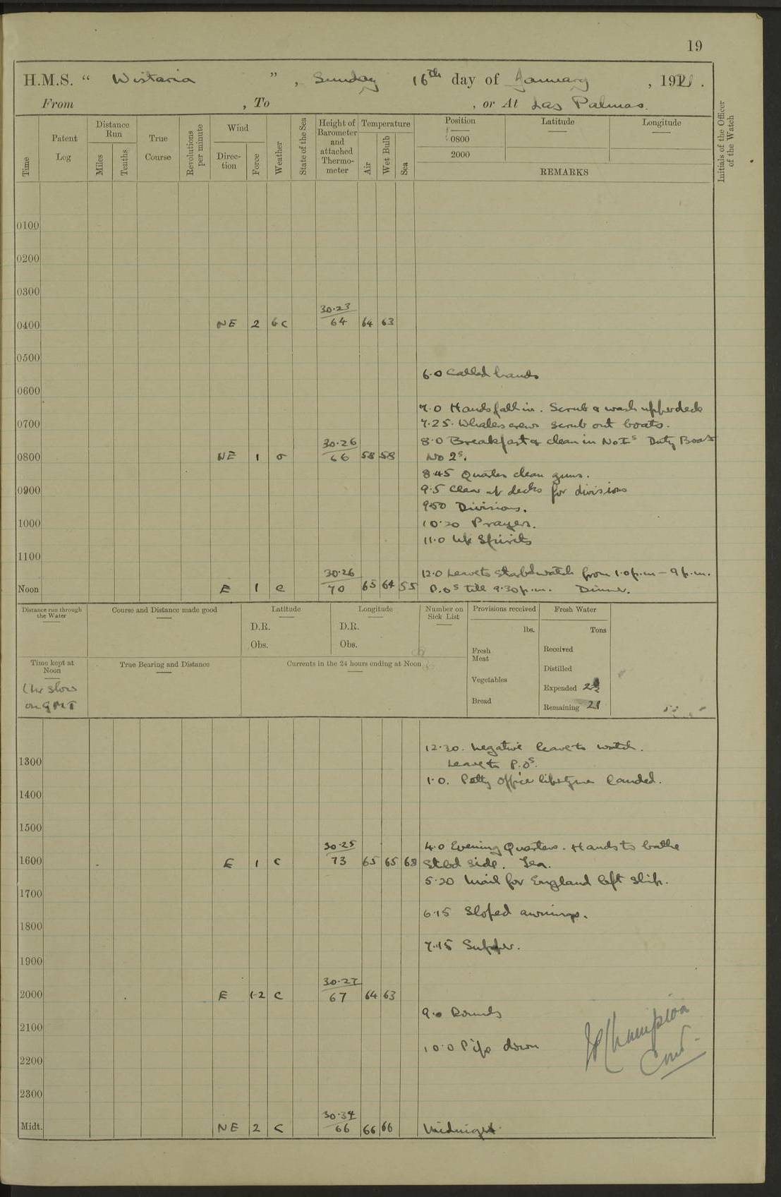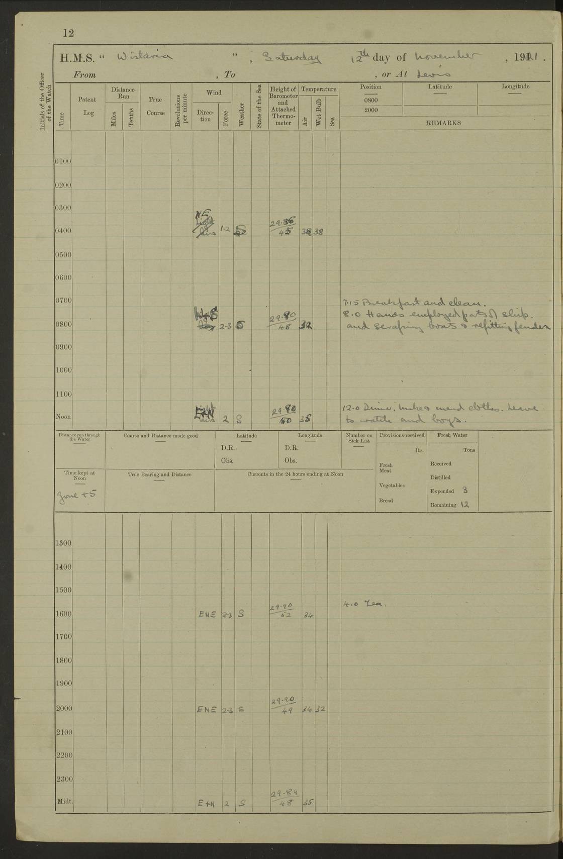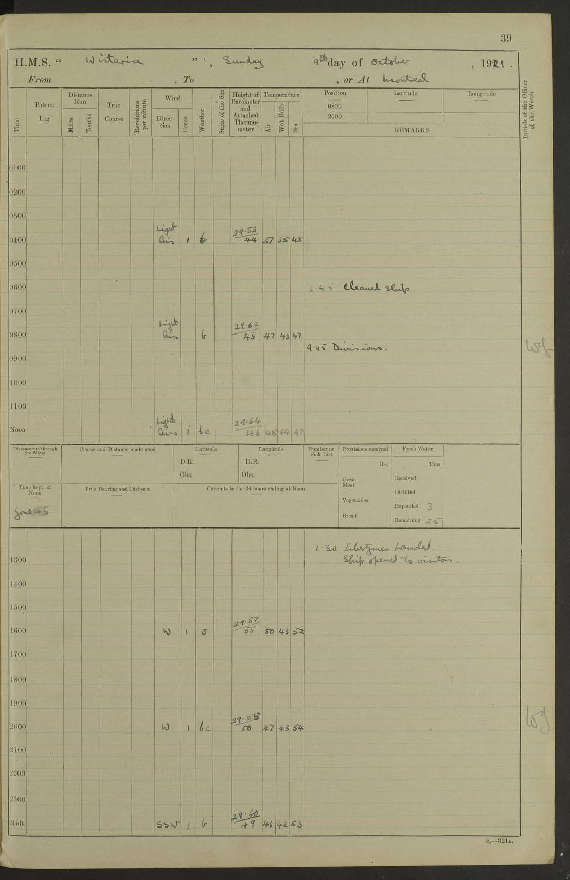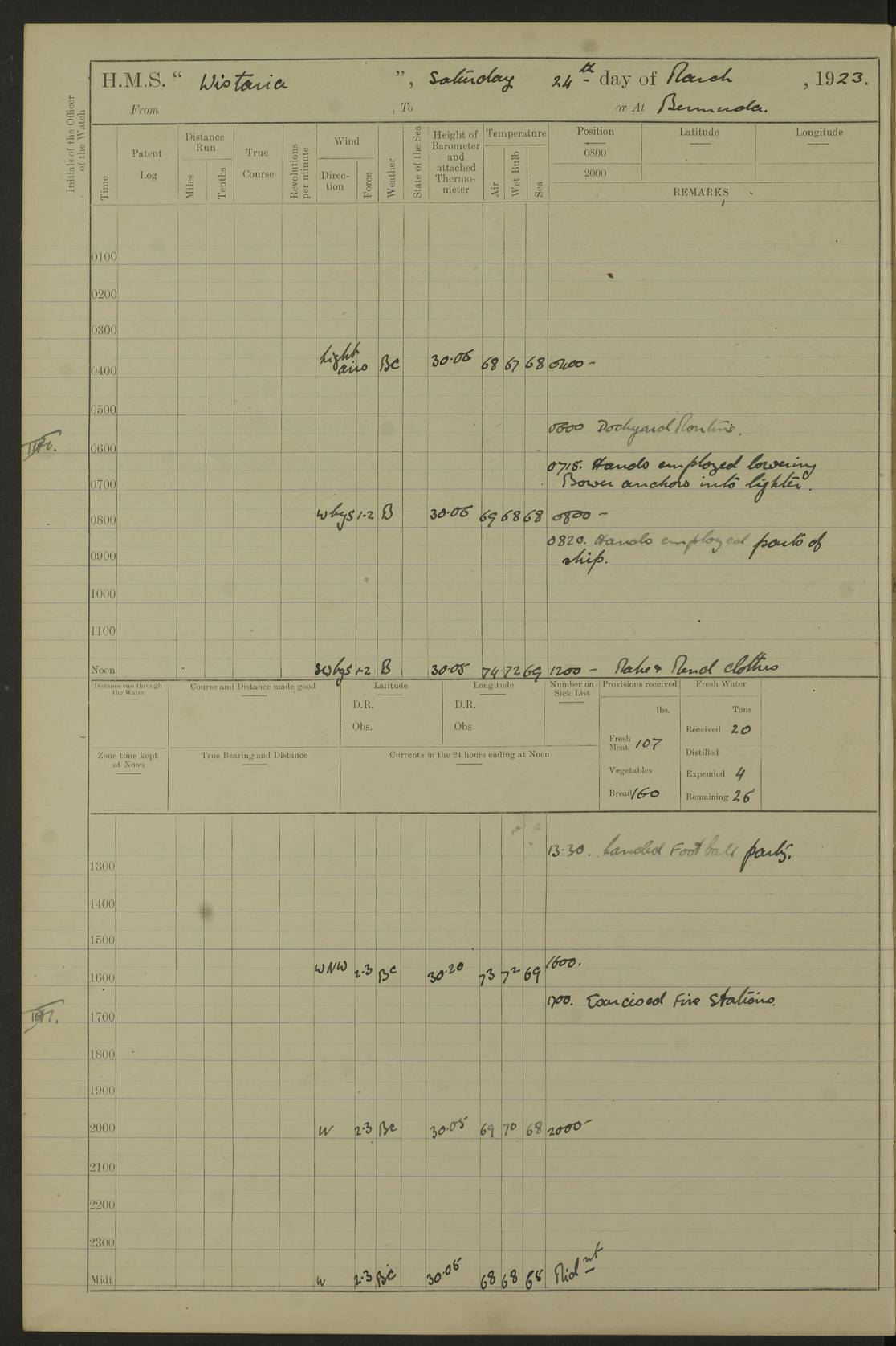 LOGS FOR DECEMBER 1920 4f73c9e6a2fc8ea903000965: (https://s3.amazonaws.com:443/oldweather/ADM53-93259/0003_1.jpg) 29 December 1920 At Devonport Lat 50.38, Long -4.19 9.0am: Commissioned with Chatham Crew 11.55am: Cooks to galley am: Sub Lt Jenks joined ship 1.10pm: Out pipes 1.15pm: Hands fall in. Employed in scrubbing and washing upper deck 3.30pm: Leave to 1st and 2nd watches 4 pm-7 am. Liberty men to clean 4.0pm: Liberty men fall in. Tea 4.15pm: Sunset 5.0pm: Liberty men fall in 6.0pm: Liberty men fall in 7.10pm: 1st Lieutenant returned from sick berth 7.15pm: Supper 8.0pm: Stand by hammocks 8.40pm: Clear off mess decks for rounds 9.0pm: Rounds 10.0pm: Pipe down 12.0pm: Rounds correct 4f73c9e7a2fc8ea903000966: (https://s3.amazonaws.com:443/oldweather/ADM53-93259/0004_0.jpg) 30 December 1920 At Devonport Lat 50.38, Long -4.19 6.0am: Called hands 6.30am: Hands fall in. Scrub & wash upper decks 7.20am: Quarters clean guns 7.50am: Secure 8.0am: Breakfast. Dress of day N°3 8.40am: Out pipes. Hands fall in am: Hands working main derrick. 4 hands & 1 Leading Seaman working with Chief Writer with stationery 10.20am: Stand easy 10.30am: Carry on with work 11.0am: Hands getting in provisions 11.30am: Afternoon watchmen to dinner noon: Dinner 1.15pm: Hands fall in. 1 Leading Seaman & hands with Chief Writer. 1 Leading Seaman & 2 AB Electr. Light. 3 AB with ship’s steward. 3 hands cleaning guns 3.40pm: Secure. Clear up decks 4.0pm: Evening Quarters. Sunset 4.24pm: Exercised collision stations 4.30pm: Secure. Tea. Leave to 2nd & 3rd watches 5 pm to 7 am 6.0pm: Liberty men fall in 7.15pm: Supper 8.0pm: Stand by hammocks 9.0pm: Rounds 10.0pm: Pipe down 4f73c9e7a2fc8ea903000967: (https://s3.amazonaws.com:443/oldweather/ADM53-93259/0004_1.jpg) 31 December 1920 At Devonport Lat 50.38, Long -4.19 6.30am: Hands scrubbing & washing upper decks 8.0am: Breakfast & clean Number 3 8.45am: Hands fall in. 6 hands unrigging fore derrick. 4 hands securing wood on upper deck. 3 hands stowing stanchions below decks 10.20am: Stand easy 10.30am: Carry on 10.45am: 4 hands getting in canteen gear 11.55am: Cooks noon: Dinner 1.15pm: Q.D. men unrigging awning stanchions, remainder securing derricks 3.40pm: Secure. Clear up decks 4.0pm: Evening Quarters 4.05pm: Tea 4.20pm: Sunset 7.10pm: Supper 8.0pm: Stand by hammocks LOGS FOR JANUARY 1921 4f73c9e7a2fc8ea903000968: (https://s3.amazonaws.com:443/oldweather/ADM53-93259/0005_0.jpg) 1 January 1921 At Devonport Lat 50.38, Long -4.19 6.0am: Called hands 6.30am: Hands fall in. Guard and steerage 7.30am: Store party to breakfast 7.45am: Breakfast 8.15am: Store party left ship 8.45am: Hands fall in. Stowing stanchions 10.20am: Stand easy 10.30am: Carry on with work noon: Dinner. Leave to Port watch 1 pm-7 am Monday. Leave to boys 1 pm to 6 pm pm: Hands make and mend clothes 4.0pm: Tea. Shift into night clothing 8.0pm: Stand by hammocks 4f73c9e8a2fc8ea903000969: (https://s3.amazonaws.com:443/oldweather/ADM53-93259/0005_1.jpg) 2 January 1921 At Devonport Lat 50.38, Long -4.19 7.0am: Hands fall in, scrub upper deck 8.0am: Breakfast and clean Number 2s 8.45am: Clear up decks for divisions 10.0am: Divisions 4.0pm: Tea. Shift into night clothing 8.0pm: Stand by hammocks 8.30pm: Clear up mess decks and flats for rounds 8.55pm: Clear off mess decks for rounds 9.0pm: Rounds 4f73c9e8a2fc8ea90300096a: (https://s3.amazonaws.com:443/oldweather/ADM53-93259/0006_0.jpg) 3 January 1921 At Devonport Lat 50.38, Long -4.19 6.15am: Hands fall in, scrub and wash upper deck 8.0am: Breakfast. Dress of day Number 3s 8.50am: Hands fall in. Stand fast cooks. Hands getting down stanchions and preparing 2nd whaler. Ship commenced basin trials 10.0am: Trial concluded 11.25am: Left dockyard for Number 5 buoy 12.05am: Hands to dinner & clean in refitting rig. Ammunition lighter alongside 1.15pm: Hands getting in ammunition 2.30pm: Lowered motor boat 3.30pm: Finished ammunitioning ship 5.0pm: Liberty men landed. Port watch store ammunition 8.40pm: Clear off mess deck for rounds 4f73c9e9a2fc8ea90300096b: (https://s3.amazonaws.com:443/oldweather/ADM53-93259/0006_1.jpg) 4 January 1921 At Devonport Lat 50.38, Long -4.19 6.30am: Hands fall in. Securing for sea 8.15am: Forecastle men muster on Forecastle, unshackle reeve ship wire 8.45am: Slipped and proceeded. Course and speed as required for full power trial 9.15am: Breakwater Lt Ho abeam 9.20am: Course S30E 10.30am: Altered course NE and as requisite for entering sound 10.55am: Secured to No 1 buoy (Sound) 11.30am: Made fast to buoy. Tug swung ship for compasses 1.0pm: Finished swinging for compasses. Forecastle men muster on forecastle 1.15pm: Entered harbour 2.15pm: Secured alongside wall 2.20pm: Coal lighter secured alongside 2.40pm: Hands to clear in coaling rig 3.0pm: Hands coal ship 4.55pm: Finished coaling 5.20pm: Hands fall in wash down decks 6.20pm: Hands paid 8.0pm: Stand by hammocks 8.20pm: Clear up mess decks for rounds 4f73c9e9a2fc8ea90300096c: (https://s3.amazonaws.com:443/oldweather/ADM53-93259/0007_0.jpg) 5 January 1921 At Devonport Lat 50.38, Long -4.19 6.30am: Hands fall in. Guard and steerage 8.0am: Carpenter & 4 hands employed in dockyard 8.10am: Ash lighter alongside 8.45am: Hands securing ship for sea 10.30am: Carry on. Hands to General Quarters 11.15am: Quarters clean guns 11.30am: Secure. Return rags 11.35am: Clear up decks noon: Store party returned. Hands to dinner 1.15pm: Hands fall in. 4 hands with carpenter, 2 with steward. Remainder securing ship for sea 4f73c9e9a2fc8ea90300096d: (https://s3.amazonaws.com:443/oldweather/ADM53-93259/0007_1.jpg) 6 January 1921 At Devonport Lat 50.38, Long -4.19 8.30am: Hands employed cleaning ship 10.50am: Chief of Staff inspected ship 11.33am: Chief of Staff left ship Ice sent. 12 cases received on board 1.15pm: Hands fall in. Getting in beef and replacing motor boats davit 2.0pm: 1 Leading Stoker discharged to hospital 4f73c9eaa2fc8ea90300096e: (https://s3.amazonaws.com:443/oldweather/ADM53-93259/00