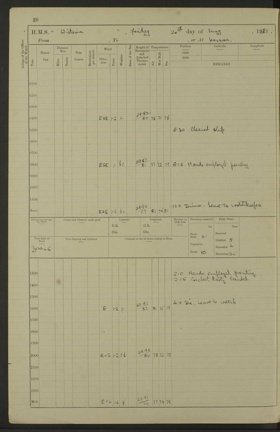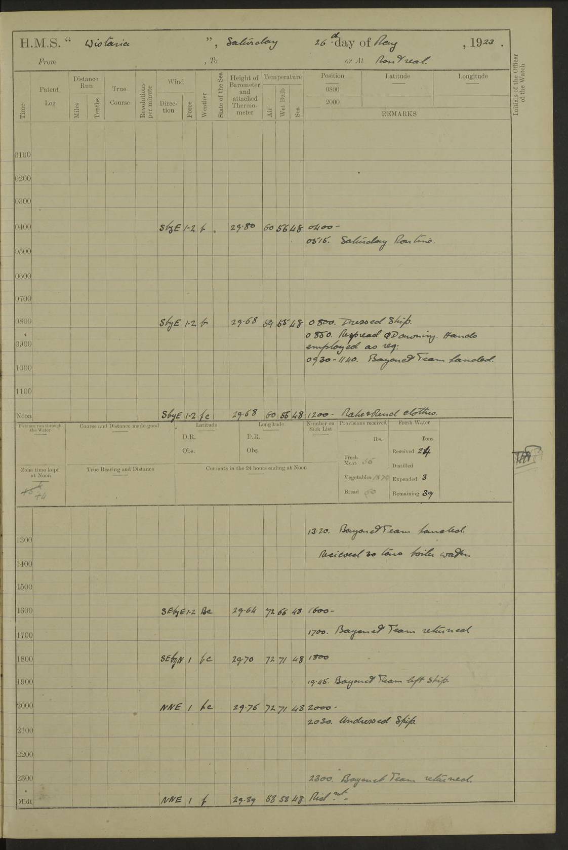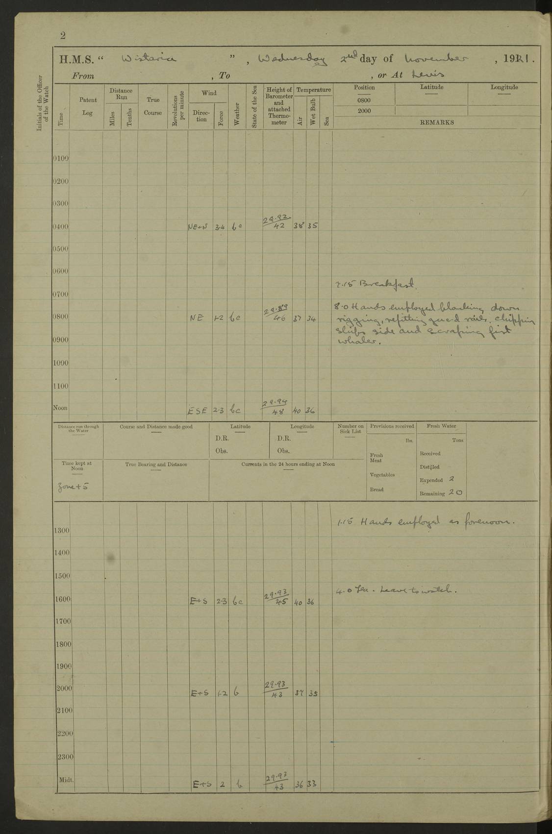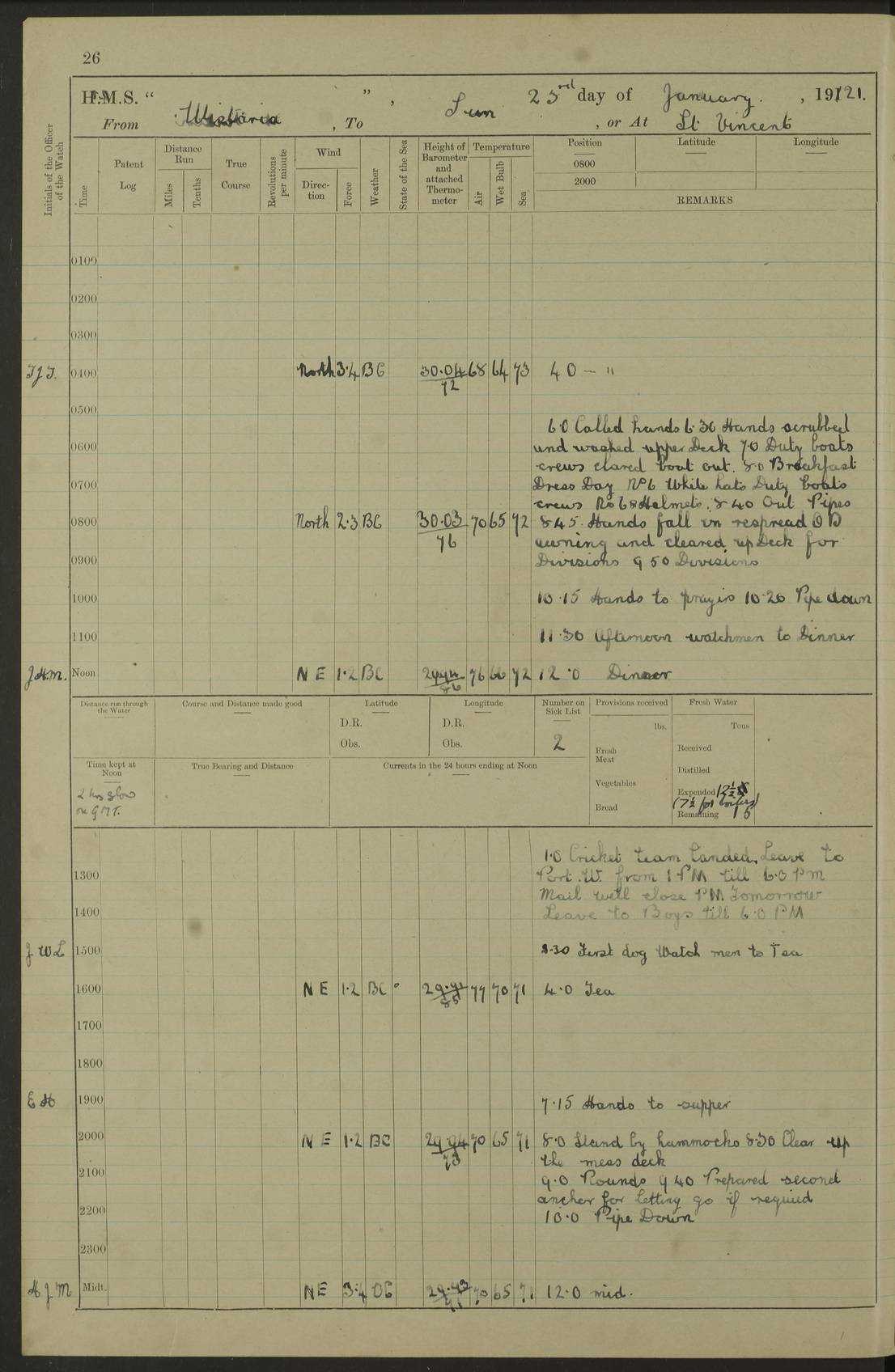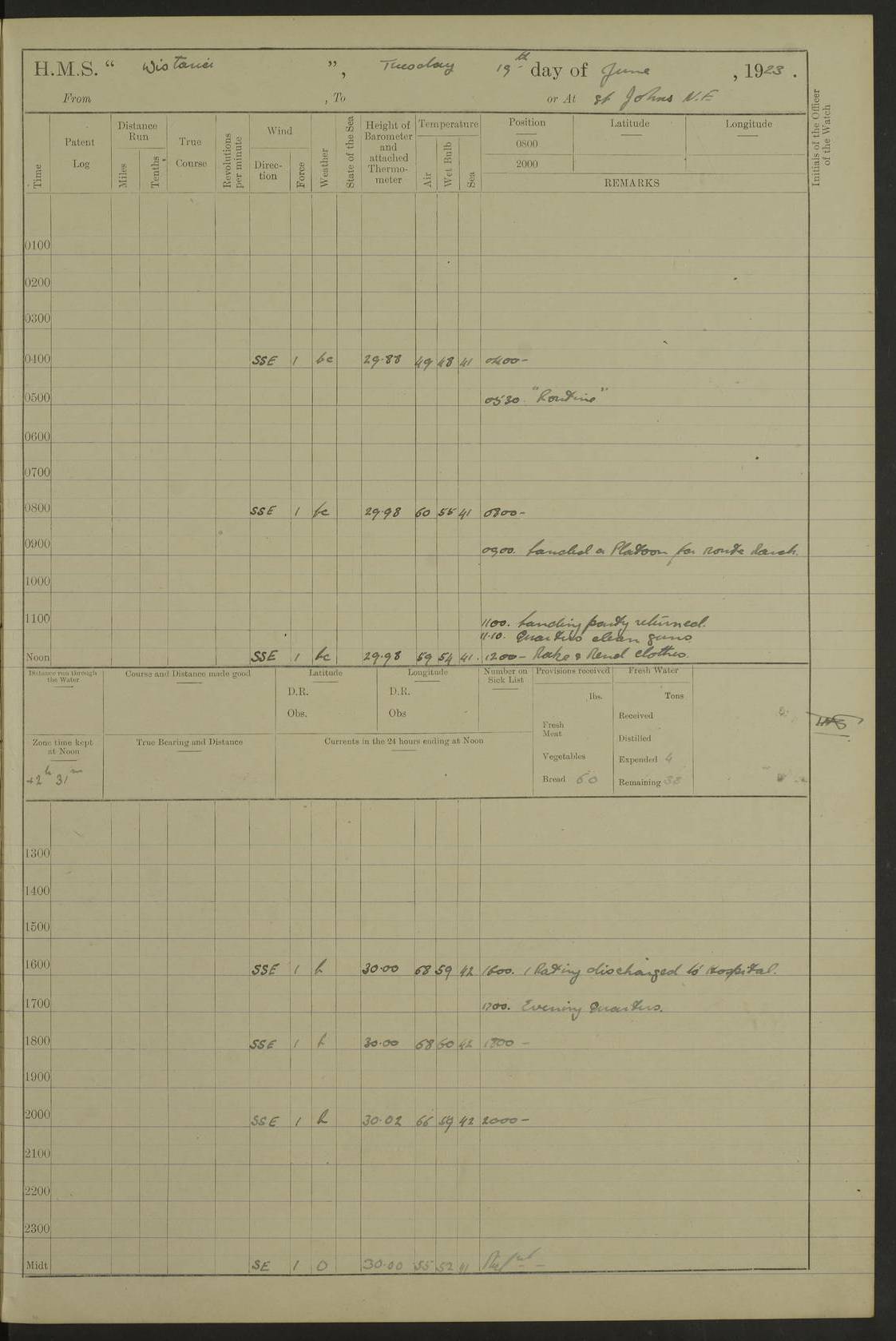 LOGS FOR DECEMBER 1920 4f73c9e6a2fc8ea903000965: (https://s3.amazonaws.com:443/oldweather/ADM53-93259/0003_1.jpg) 29 December 1920 At Devonport Lat 50.38, Long -4.19 9.0am: Commissioned with Chatham Crew 11.55am: Cooks to galley am: Sub Lt Jenks joined ship 1.10pm: Out pipes 1.15pm: Hands fall in. Employed in scrubbing and washing upper deck 3.30pm: Leave to 1st and 2nd watches 4 pm-7 am. Liberty men to clean 4.0pm: Liberty men fall in. Tea 4.15pm: Sunset 5.0pm: Liberty men fall in 6.0pm: Liberty men fall in 7.10pm: 1st Lieutenant returned from sick berth 7.15pm: Supper 8.0pm: Stand by hammocks 8.40pm: Clear off mess decks for rounds 9.0pm: Rounds 10.0pm: Pipe down 12.0pm: Rounds correct 4f73c9e7a2fc8ea903000966: (https://s3.amazonaws.com:443/oldweather/ADM53-93259/0004_0.jpg) 30 December 1920 At Devonport Lat 50.38, Long -4.19 6.0am: Called hands 6.30am: Hands fall in. Scrub & wash upper decks 7.20am: Quarters clean guns 7.50am: Secure 8.0am: Breakfast. Dress of day N°3 8.40am: Out pipes. Hands fall in am: Hands working main derrick. 4 hands & 1 Leading Seaman working with Chief Writer with stationery 10.20am: Stand easy 10.30am: Carry on with work 11.0am: Hands getting in provisions 11.30am: Afternoon watchmen to dinner noon: Dinner 1.15pm: Hands fall in. 1 Leading Seaman & hands with Chief Writer. 1 Leading Seaman & 2 AB Electr. Light. 3 AB with ship’s steward. 3 hands cleaning guns 3.40pm: Secure. Clear up decks 4.0pm: Evening Quarters. Sunset 4.24pm: Exercised collision stations 4.30pm: Secure. Tea. Leave to 2nd & 3rd watches 5 pm to 7 am 6.0pm: Liberty men fall in 7.15pm: Supper 8.0pm: Stand by hammocks 9.0pm: Rounds 10.0pm: Pipe down 4f73c9e7a2fc8ea903000967: (https://s3.amazonaws.com:443/oldweather/ADM53-93259/0004_1.jpg) 31 December 1920 At Devonport Lat 50.38, Long -4.19 6.30am: Hands scrubbing & washing upper decks 8.0am: Breakfast & clean Number 3 8.45am: Hands fall in. 6 hands unrigging fore derrick. 4 hands securing wood on upper deck. 3 hands stowing stanchions below decks 10.20am: Stand easy 10.30am: Carry on 10.45am: 4 hands getting in canteen gear 11.55am: Cooks noon: Dinner 1.15pm: Q.D. men unrigging awning stanchions, remainder securing derricks 3.40pm: Secure. Clear up decks 4.0pm: Evening Quarters 4.05pm: Tea 4.20pm: Sunset 7.10pm: Supper 8.0pm: Stand by hammocks LOGS FOR JANUARY 1921 4f73c9e7a2fc8ea903000968: (https://s3.amazonaws.com:443/oldweather/ADM53-93259/0005_0.jpg) 1 January 1921 At Devonport Lat 50.38, Long -4.19 6.0am: Called hands 6.30am: Hands fall in. Guard and steerage 7.30am: Store party to breakfast 7.45am: Breakfast 8.15am: Store party left ship 8.45am: Hands fall in. Stowing stanchions 10.20am: Stand easy 10.30am: Carry on with work noon: Dinner. Leave to Port watch 1 pm-7 am Monday. Leave to boys 1 pm to 6 pm pm: Hands make and mend clothes 4.0pm: Tea. Shift into night clothing 8.0pm: Stand by hammocks 4f73c9e8a2fc8ea903000969: (https://s3.amazonaws.com:443/oldweather/ADM53-93259/0005_1.jpg) 2 January 1921 At Devonport Lat 50.38, Long -4.19 7.0am: Hands fall in, scrub upper deck 8.0am: Breakfast and clean Number 2s 8.45am: Clear up decks for divisions 10.0am: Divisions 4.0pm: Tea. Shift into night clothing 8.0pm: Stand by hammocks 8.30pm: Clear up mess decks and flats for rounds 8.55pm: Clear off mess decks for rounds 9.0pm: Rounds 4f73c9e8a2fc8ea90300096a: (https://s3.amazonaws.com:443/oldweather/ADM53-93259/0006_0.jpg) 3 January 1921 At Devonport Lat 50.38, Long -4.19 6.15am: Hands fall in, scrub and wash upper deck 8.0am: Breakfast. Dress of day Number 3s 8.50am: Hands fall in. Stand fast cooks. Hands getting down stanchions and preparing 2nd whaler. Ship commenced basin trials 10.0am: Trial concluded 11.25am: Left dockyard for Number 5 buoy 12.05am: Hands to dinner & clean in refitting rig. Ammunition lighter alongside 1.15pm: Hands getting in ammunition 2.30pm: Lowered motor boat 3.30pm: Finished ammunitioning ship 5.0pm: Liberty men landed. Port watch store ammunition 8.40pm: Clear off mess deck for rounds 4f73c9e9a2fc8ea90300096b: (https://s3.amazonaws.com:443/oldweather/ADM53-93259/0006_1.jpg) 4 January 1921 At Devonport Lat 50.38, Long -4.19 6.30am: Hands fall in. Securing for sea 8.15am: Forecastle men muster on Forecastle, unshackle reeve ship wire 8.45am: Slipped and proceeded. Course and speed as required for full power trial 9.15am: Breakwater Lt Ho abeam 9.20am: Course S30E 10.30am: Altered course NE and as requisite for entering sound 10.55am: Secured to No 1 buoy (Sound) 11.30am: Made fast to buoy. Tug swung ship for compasses 1.0pm: Finished swinging for compasses. Forecastle men muster on forecastle 1.15pm: Entered harbour 2.15pm: Secured alongside wall 2.20pm: Coal lighter secured alongside 2.40pm: Hands to clear in coaling rig 3.0pm: Hands coal ship 4.55pm: Finished coaling 5.20pm: Hands fall in wash down decks 6.20pm: Hands paid 8.0pm: Stand by hammocks 8.20pm: Clear up mess decks for rounds 4f73c9e9a2fc8ea90300096c: (https://s3.amazonaws.com:443/oldweather/ADM53-93259/0007_0.jpg) 5 January 1921 At Devonport Lat 50.38, Long -4.19 6.30am: Hands fall in. Guard and steerage 8.0am: Carpenter & 4 hands employed in dockyard 8.10am: Ash lighter alongside 8.45am: Hands securing ship for sea 10.30am: Carry on. Hands to General Quarters 11.15am: Quarters clean guns 11.30am: Secure. Return rags 11.35am: Clear up decks noon: Store party returned. Hands to dinner 1.15pm: Hands fall in. 4 hands with carpenter, 2 with steward. Remainder securing ship for sea 4f73c9e9a2fc8ea90300096d: (https://s3.amazonaws.com:443/oldweather/ADM53-93259/0007_1.jpg) 6 January 1921 At Devonport Lat 50.38, Long -4.19 8.30am: Hands employed cleaning ship 10.50am: Chief of Staff inspected ship 11.33am: Chief of Staff left ship Ice sent. 12 cases received on board 1.15pm: Hands fall in. Getting in beef and replacing motor boats davit 2.0pm: 1 Leading Stoker discharged to hospital 4f73c9eaa2fc8ea90300096e: (https://s3.amazonaws.com:443/oldweather/ADM53-93259/00