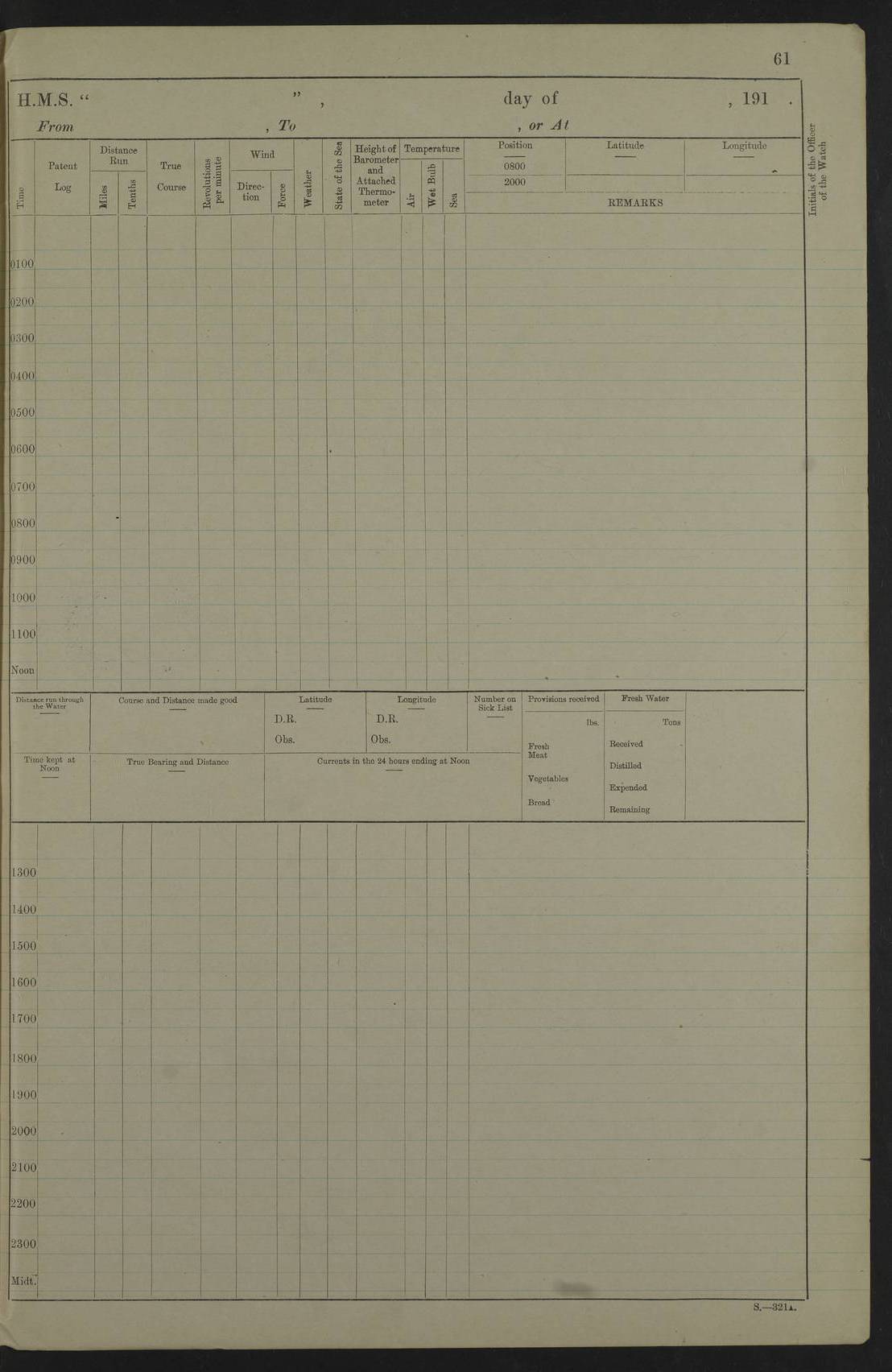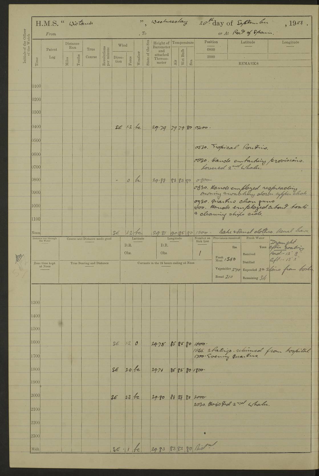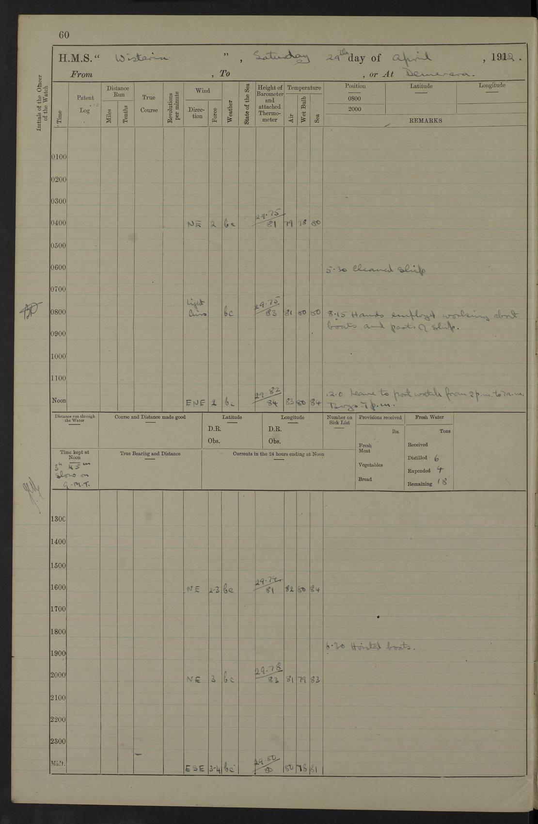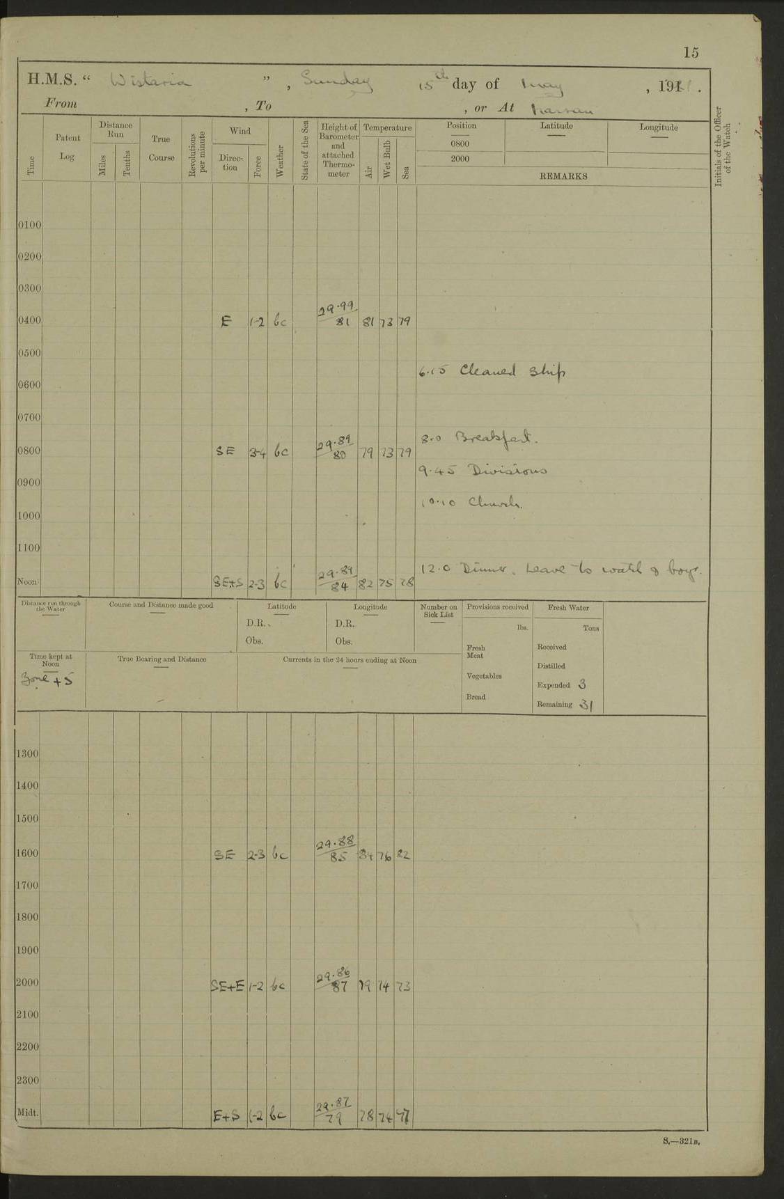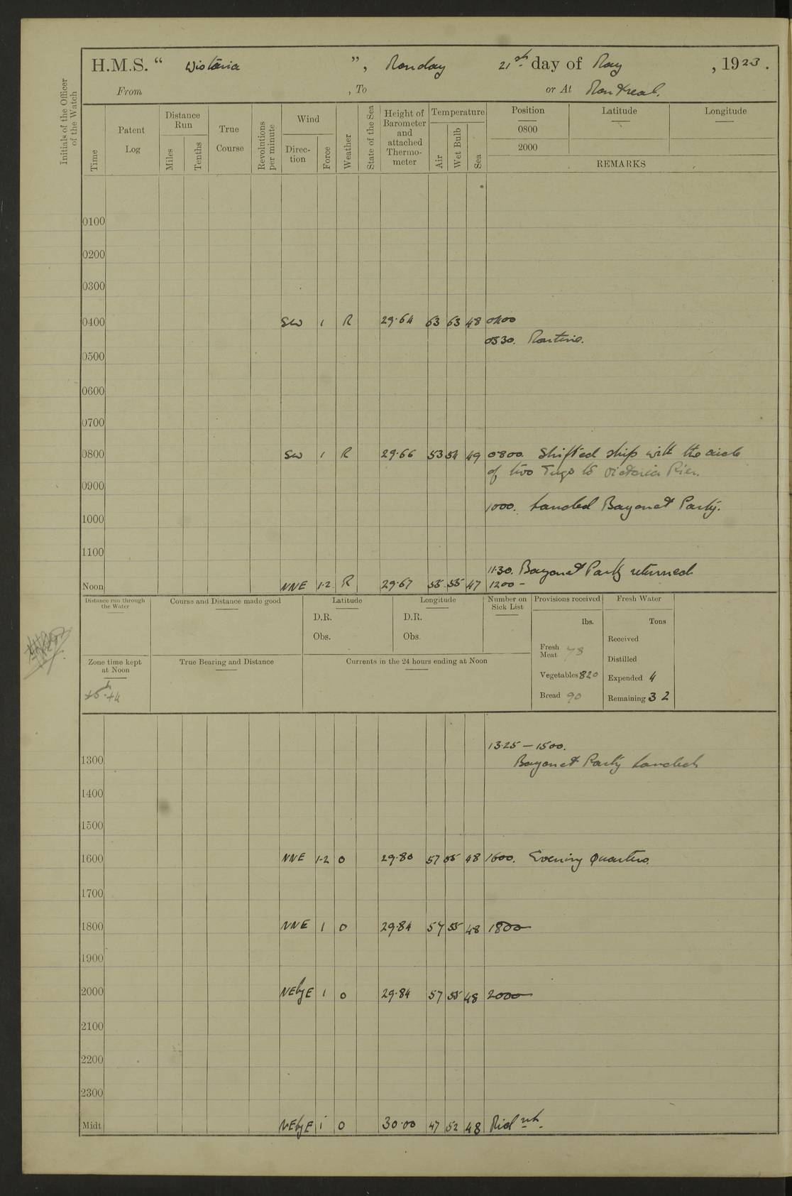 LOGS FOR DECEMBER 1920 4f73c9e6a2fc8ea903000965: (https://s3.amazonaws.com:443/oldweather/ADM53-93259/0003_1.jpg) 29 December 1920 At Devonport Lat 50.38, Long -4.19 9.0am: Commissioned with Chatham Crew 11.55am: Cooks to galley am: Sub Lt Jenks joined ship 1.10pm: Out pipes 1.15pm: Hands fall in. Employed in scrubbing and washing upper deck 3.30pm: Leave to 1st and 2nd watches 4 pm-7 am. Liberty men to clean 4.0pm: Liberty men fall in. Tea 4.15pm: Sunset 5.0pm: Liberty men fall in 6.0pm: Liberty men fall in 7.10pm: 1st Lieutenant returned from sick berth 7.15pm: Supper 8.0pm: Stand by hammocks 8.40pm: Clear off mess decks for rounds 9.0pm: Rounds 10.0pm: Pipe down 12.0pm: Rounds correct 4f73c9e7a2fc8ea903000966: (https://s3.amazonaws.com:443/oldweather/ADM53-93259/0004_0.jpg) 30 December 1920 At Devonport Lat 50.38, Long -4.19 6.0am: Called hands 6.30am: Hands fall in. Scrub & wash upper decks 7.20am: Quarters clean guns 7.50am: Secure 8.0am: Breakfast. Dress of day N°3 8.40am: Out pipes. Hands fall in am: Hands working main derrick. 4 hands & 1 Leading Seaman working with Chief Writer with stationery 10.20am: Stand easy 10.30am: Carry on with work 11.0am: Hands getting in provisions 11.30am: Afternoon watchmen to dinner noon: Dinner 1.15pm: Hands fall in. 1 Leading Seaman & hands with Chief Writer. 1 Leading Seaman & 2 AB Electr. Light. 3 AB with ship’s steward. 3 hands cleaning guns 3.40pm: Secure. Clear up decks 4.0pm: Evening Quarters. Sunset 4.24pm: Exercised collision stations 4.30pm: Secure. Tea. Leave to 2nd & 3rd watches 5 pm to 7 am 6.0pm: Liberty men fall in 7.15pm: Supper 8.0pm: Stand by hammocks 9.0pm: Rounds 10.0pm: Pipe down 4f73c9e7a2fc8ea903000967: (https://s3.amazonaws.com:443/oldweather/ADM53-93259/0004_1.jpg) 31 December 1920 At Devonport Lat 50.38, Long -4.19 6.30am: Hands scrubbing & washing upper decks 8.0am: Breakfast & clean Number 3 8.45am: Hands fall in. 6 hands unrigging fore derrick. 4 hands securing wood on upper deck. 3 hands stowing stanchions below decks 10.20am: Stand easy 10.30am: Carry on 10.45am: 4 hands getting in canteen gear 11.55am: Cooks noon: Dinner 1.15pm: Q.D. men unrigging awning stanchions, remainder securing derricks 3.40pm: Secure. Clear up decks 4.0pm: Evening Quarters 4.05pm: Tea 4.20pm: Sunset 7.10pm: Supper 8.0pm: Stand by hammocks LOGS FOR JANUARY 1921 4f73c9e7a2fc8ea903000968: (https://s3.amazonaws.com:443/oldweather/ADM53-93259/0005_0.jpg) 1 January 1921 At Devonport Lat 50.38, Long -4.19 6.0am: Called hands 6.30am: Hands fall in. Guard and steerage 7.30am: Store party to breakfast 7.45am: Breakfast 8.15am: Store party left ship 8.45am: Hands fall in. Stowing stanchions 10.20am: Stand easy 10.30am: Carry on with work noon: Dinner. Leave to Port watch 1 pm-7 am Monday. Leave to boys 1 pm to 6 pm pm: Hands make and mend clothes 4.0pm: Tea. Shift into night clothing 8.0pm: Stand by hammocks 4f73c9e8a2fc8ea903000969: (https://s3.amazonaws.com:443/oldweather/ADM53-93259/0005_1.jpg) 2 January 1921 At Devonport Lat 50.38, Long -4.19 7.0am: Hands fall in, scrub upper deck 8.0am: Breakfast and clean Number 2s 8.45am: Clear up decks for divisions 10.0am: Divisions 4.0pm: Tea. Shift into night clothing 8.0pm: Stand by hammocks 8.30pm: Clear up mess decks and flats for rounds 8.55pm: Clear off mess decks for rounds 9.0pm: Rounds 4f73c9e8a2fc8ea90300096a: (https://s3.amazonaws.com:443/oldweather/ADM53-93259/0006_0.jpg) 3 January 1921 At Devonport Lat 50.38, Long -4.19 6.15am: Hands fall in, scrub and wash upper deck 8.0am: Breakfast. Dress of day Number 3s 8.50am: Hands fall in. Stand fast cooks. Hands getting down stanchions and preparing 2nd whaler. Ship commenced basin trials 10.0am: Trial concluded 11.25am: Left dockyard for Number 5 buoy 12.05am: Hands to dinner & clean in refitting rig. Ammunition lighter alongside 1.15pm: Hands getting in ammunition 2.30pm: Lowered motor boat 3.30pm: Finished ammunitioning ship 5.0pm: Liberty men landed. Port watch store ammunition 8.40pm: Clear off mess deck for rounds 4f73c9e9a2fc8ea90300096b: (https://s3.amazonaws.com:443/oldweather/ADM53-93259/0006_1.jpg) 4 January 1921 At Devonport Lat 50.38, Long -4.19 6.30am: Hands fall in. Securing for sea 8.15am: Forecastle men muster on Forecastle, unshackle reeve ship wire 8.45am: Slipped and proceeded. Course and speed as required for full power trial 9.15am: Breakwater Lt Ho abeam 9.20am: Course S30E 10.30am: Altered course NE and as requisite for entering sound 10.55am: Secured to No 1 buoy (Sound) 11.30am: Made fast to buoy. Tug swung ship for compasses 1.0pm: Finished swinging for compasses. Forecastle men muster on forecastle 1.15pm: Entered harbour 2.15pm: Secured alongside wall 2.20pm: Coal lighter secured alongside 2.40pm: Hands to clear in coaling rig 3.0pm: Hands coal ship 4.55pm: Finished coaling 5.20pm: Hands fall in wash down decks 6.20pm: Hands paid 8.0pm: Stand by hammocks 8.20pm: Clear up mess decks for rounds 4f73c9e9a2fc8ea90300096c: (https://s3.amazonaws.com:443/oldweather/ADM53-93259/0007_0.jpg) 5 January 1921 At Devonport Lat 50.38, Long -4.19 6.30am: Hands fall in. Guard and steerage 8.0am: Carpenter & 4 hands employed in dockyard 8.10am: Ash lighter alongside 8.45am: Hands securing ship for sea 10.30am: Carry on. Hands to General Quarters 11.15am: Quarters clean guns 11.30am: Secure. Return rags 11.35am: Clear up decks noon: Store party returned. Hands to dinner 1.15pm: Hands fall in. 4 hands with carpenter, 2 with steward. Remainder securing ship for sea 4f73c9e9a2fc8ea90300096d: (https://s3.amazonaws.com:443/oldweather/ADM53-93259/0007_1.jpg) 6 January 1921 At Devonport Lat 50.38, Long -4.19 8.30am: Hands employed cleaning ship 10.50am: Chief of Staff inspected ship 11.33am: Chief of Staff left ship Ice sent. 12 cases received on board 1.15pm: Hands fall in. Getting in beef and replacing motor boats davit 2.0pm: 1 Leading Stoker discharged to hospital 4f73c9eaa2fc8ea90300096e: (https://s3.amazonaws.com:443/oldweather/ADM53-93259/00