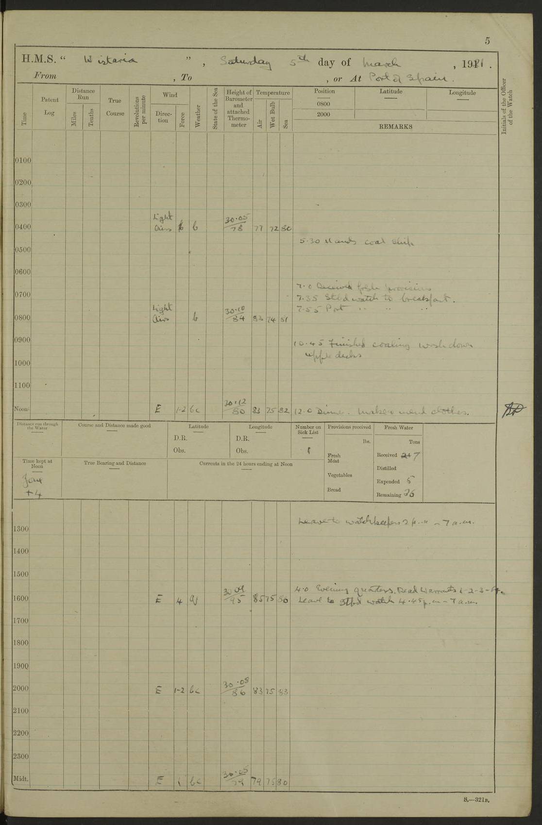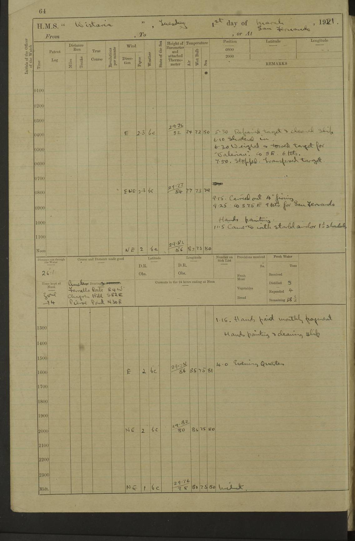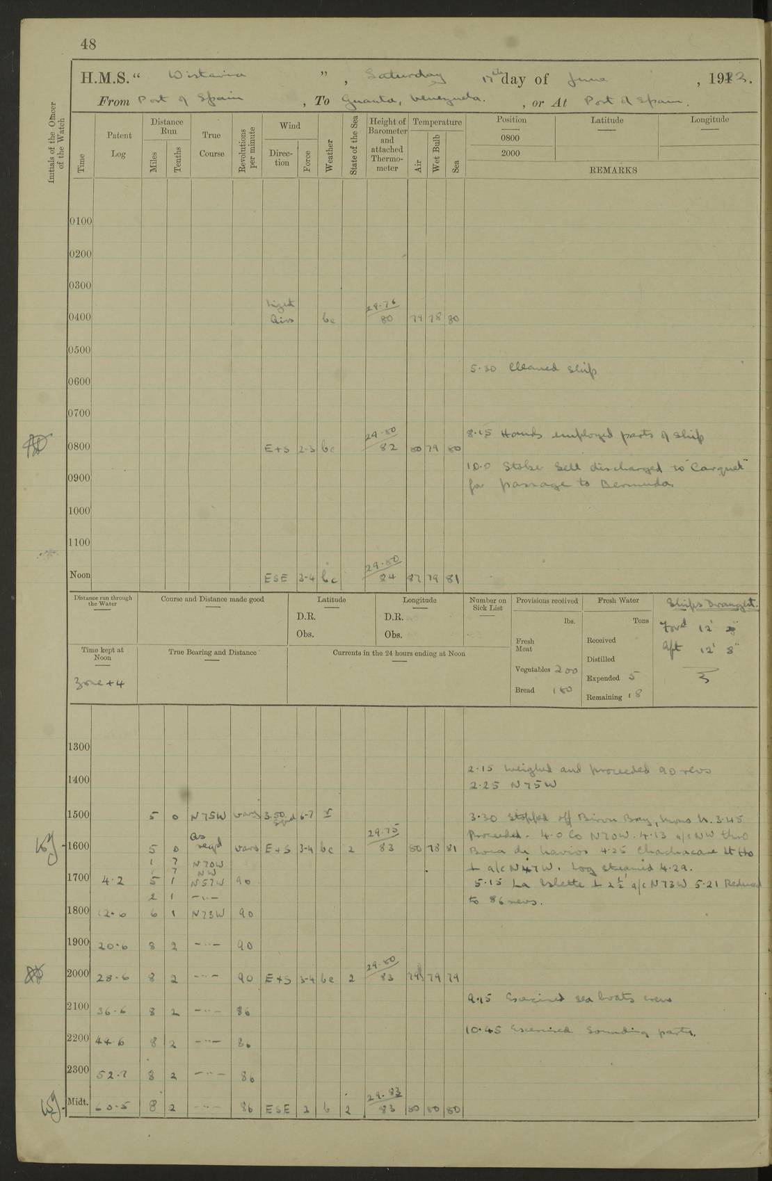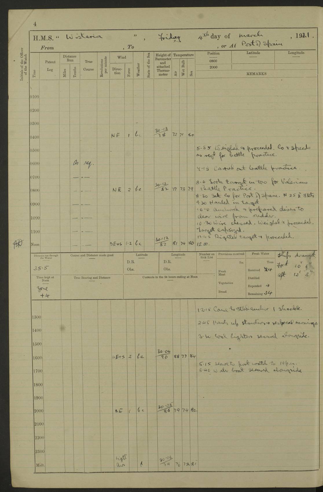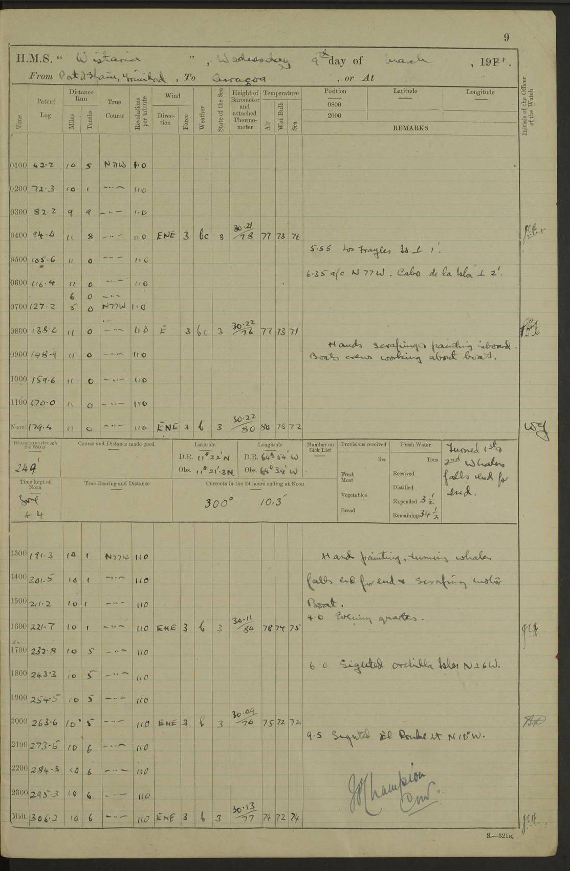 LOGS FOR MARCH 1921 4f73c9fea2fc8ea9030009a4: (https://s3.amazonaws.com:443/oldweather/ADM53-93259/0035_0.jpg) 4f73ca01a2fc8ea9030009ad: (https://s3.amazonaws.com:443/oldweather/ADM53-93260/0003_1.jpg) 1 March 1921 At Gulf of Paria [At San Fernando] Lat 10.38, Long -62.35 5.30am: Hands repairing target & cleaning ship [Repaired target & cleaned ship] [6.10am: Shortened in] [6.30am: Weighed & towed target for “Valerian”. Course SE, 6 knots] 6.53am: Weighed & proceeded. Course SE, 6 knots 7.50am: Stopped. Handed in target [Transferred target] 8.0am: Slipped target 9.15am: Carried out [4”] firing am: Hands painting inboard 11.05am: Came to with Starboard anchor 1½ shackles Anchor bearings: Farralla Rock S4W, Chagrin Hill S82E, Pierre Point N30E 1.15pm: Paid hands [monthly payment] 2.0pm: Hands painting & cleaning [ship] Number on sick list: - [Farralla Rock: perhaps misspelt Farrallon Rock] [Chagrin Hill: perhaps Mon Chagrin Hill] 4f73ca01a2fc8ea9030009ae: (https://s3.amazonaws.com:443/oldweather/ADM53-93260/0004_0.jpg) 2 March 1921 At Brighton Pier Lat 10.38, Long -62.35 8.30am: Weighed & proceeded to Brighton 9.40am: Let go Port anchor 2 shackles 10.30am: Sent provisions to “Valerian” Lost overboard by accident: Magazine Lewis Gun: One in number; Cartr. S.A. .303 belt: 47 in number 1.15pm: Landed liberty men 6.15pm: Liberty men returned. S. P. O. Edwards brought on board dead Number on sick list: 1.D.D. 4f73ca02a2fc8ea9030009af: (https://s3.amazonaws.com:443/oldweather/ADM53-93260/0004_1.jpg) H.M.S “Wistaria” at Trinidad. 3rd March 1921 Return of deaths on board H.M.S. “Wistaria” Date of death. 2nd March 1921. Name & Surname of Deceased. William Edwards. Sex. Male. Age. 27 years, 1 month. Rating. Stoker Petty Officer, Royal Navy. Nationality. English. Last place of Abode. H.M.S. “Wistaria”, lying off Brighton Pier, Trinidad. Cause of Death. Shock following rupture of spleen. 4f73ca02a2fc8ea9030009b0: (https://s3.amazonaws.com:443/oldweather/ADM53-93260/0005_0.jpg) 4f73ca03a2fc8ea9030009b1: (https://s3.amazonaws.com:443/oldweather/ADM53-93260/0005_1.jpg) 3 March 1921 At Port of Spain Lat 10.66, Long -61.55 5.30am: Weighed & proceeded to Port of Spain. Course N19E, 10 knots 8.0am: Came to with Starboard anchor, 1 shackles 9.55am: Discharged S.P.O. Edwards to Colonial Hospital, dead 3.30pm: Funeral Party & mourners landed 4.30pm: Half masted colours 5.30pm: Re-hoisted colours 6.30pm: Funeral parties returned 4f73ca03a2fc8ea9030009b2: (https://s3.amazonaws.com:443/oldweather/ADM53-93260/0006_0.jpg) 4 March 1921 At Port of Spain Lat 10.66, Long -61.55 5.55am: Weighed & proceeded. Course & speeds as required for battle practice 7.15am: Carried out battle practice 8.0am: Took target in tow for “Valerian” battle practice 8.30am: Set course for Port of Spain N25E, 8 knots 9.30am: Hauled in target 10.0am: Anchored & prepared divers to clear wire from rudder 10.30am: Wire cleaned. Weighed & proceeded. Target Capsized 11.45am: Righted target and proceeded 12.15pm: Came to Starboard anchor, 1 shackle 2.45pm: Hands up stanchions & respread awnings 3.30pm: Coal lighter secured alongside 5.40pm: Water boat secured alongside 4f73ca03a2fc8ea9030009b3: (https://s3.amazonaws.com:443/oldweather/ADM53-93260/0006_1.jpg) 5 March 1921 At Port of Spain Lat 10.66, Long -61.55 5.30am: Hands coal ship 7.0am: Received fresh provisions 10.45am: Finished coaling. Wash down upper decks 4.0pm: Evening Quarters. Read warrants 1-2-3-4 Number on sick list: 1 4f73ca04a2fc8ea9030009b4: (https://s3.amazonaws.com:443/oldweather/ADM53-93260/0007_0.jpg) 6 March 1921 At Port of Spain Lat 10.66, Long -61.55 9.45am: Divisions & prayers Number on sick list: 1 4f73ca04a2fc8ea9030009b5: (https://s3.amazonaws.com:443/oldweather/ADM53-93260/0007_1.jpg) 7 March 1921 At Port of Spain Lat 10.66, Long -61.55 6.30am: Hoisted boat 7.24am: Weighed & proceeded. S19W, 14 knots 9.30am: Anchored off Brighton Pier 10.0am: Held Court of Inquiry on death of S.P.O Edwards 1.0pm: Weighed & proceeded to Port of Spain. Course N19E, 14 knots 3.05pm: Anchored Number on sick list: 1 4f73ca04a2fc8ea9030009b6: (https://s3.amazonaws.com:443/oldweather/ADM53-93260/0008_0.jpg) 8 March 1921 At Port of Spain Lat 10.66, Long -61.55 7.50am: Shortened in 8.0am: Weighed & proceeded to Chaguaramas Bay at 12 knots 8.45am: Anchored 9.0am: All available seamen landed to haul up target. Sent provisions to “Valerian” 11.45am: Target party returned. Hoisted boats noon: Weighed & proceeded to Port of Spain at 12 knots 12.30pm: Anchored pm: Hands securing ship for sea 5.05pm: Colonel Glasgow arrived on board for passage to Jamaica 6.0pm: Weighed & proceeded at 11 knots. Course as required to pass through Bocas de Navios 7.0pm: Streamed Patent log 7.10pm: Chacachacare Lt abeam, 6 cables. Course N50W 7.47pm: Penas Point abeam [Boca de Navios: between Huevos and Chacachacare Islands. Also here] [Chacachacare Light: is exhibited from a white concrete tower, 30 feet high, on the northern end of the island] 4f73ca05a2fc8ea9030009b7: (https://s3.amazonaws.com:443/oldweather/ADM53-93260/0008_1.jpg) 9 March 1921 From Port of Spain, Trinidad, to Curaçoa Lat 11.36, Long -64.9 5.55am: Los Frayles Island abeam, 1 mile 6.35am: Altered course N77W. Cabo de la Isla abeam, 2 miles am: Hands scraping & painting inboard. Boats crews working about boats am: Turned 1st and 2nd whalers falls end for end pm: Hands painting, turning whaler falls end for end & scraping motor boat 6.0pm: Sighted Orchilla Isles N26W 9.05pm: Sighted El Rouke Lt N10W [Cabo de la Isla, also known as Cabo Negro] [El Rouke Lt: perhaps misspelt El Roque Light. A light was exhibited from a lighthouse on the northeast hill of El Roque] 4f73ca05a2fc8ea9030009b8: (https://s3.amazonaws.com:443/oldweather/ADM53-93260/0009_0.jpg) 10 March 1921 From Trinidad to Curaçoa and at Curaçoa Lat 10.66, Long -61.55 8.23am: Little Curaçoa Lt abeam 9.25am: Hauled in patent log 10.0am: Stopped for Port Health Off