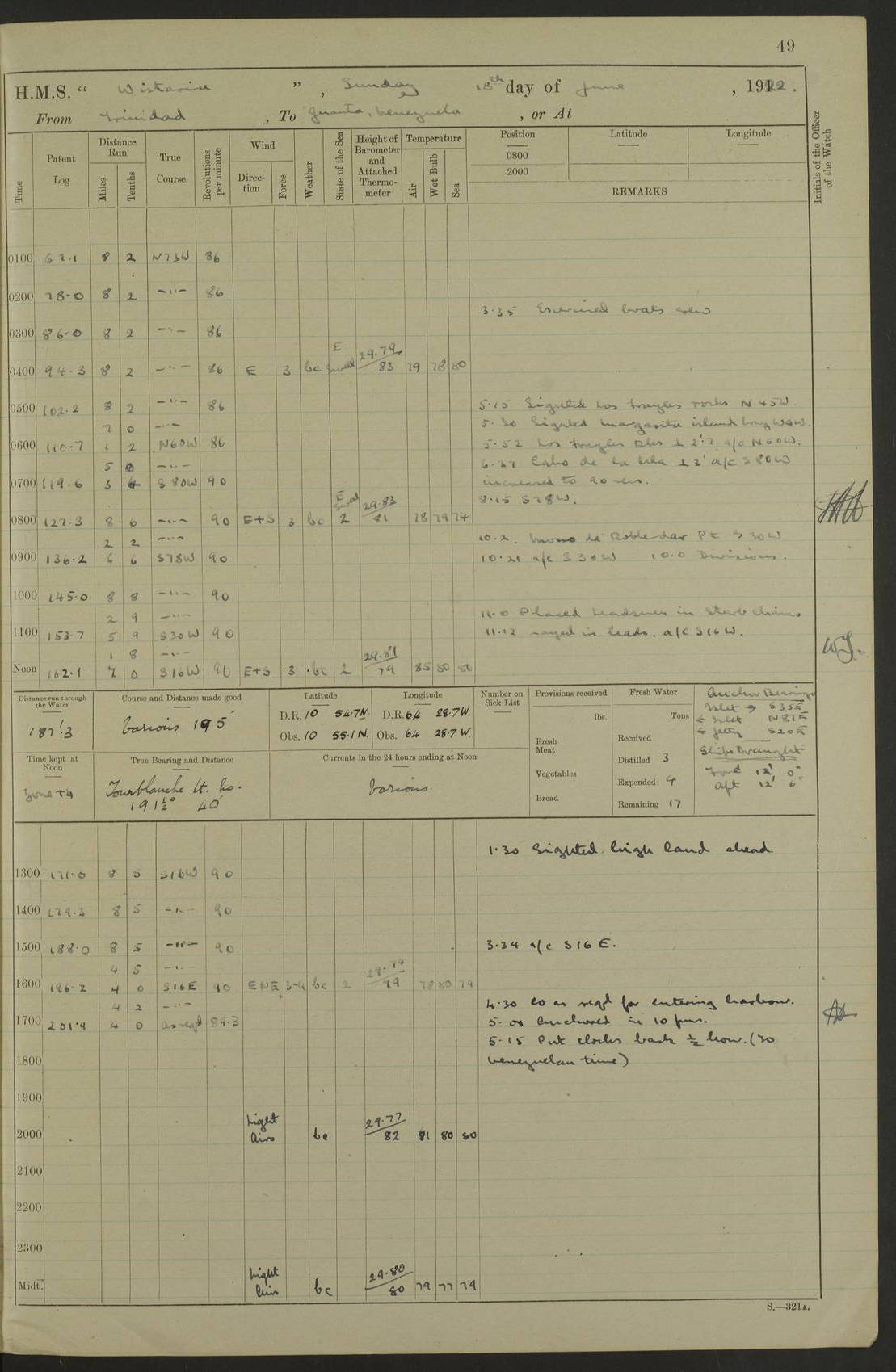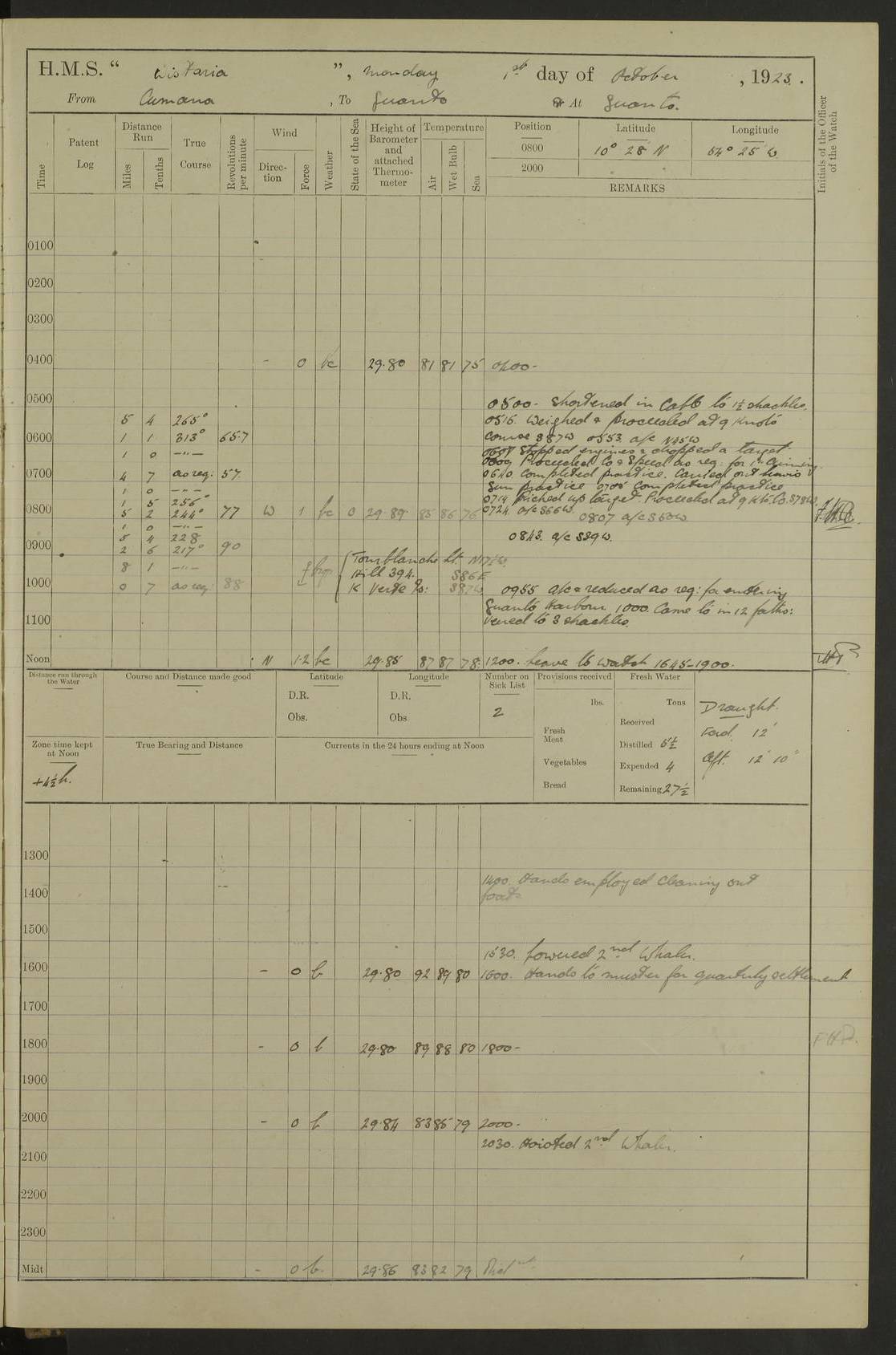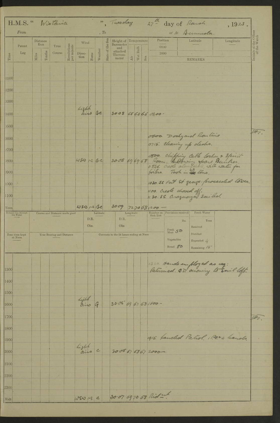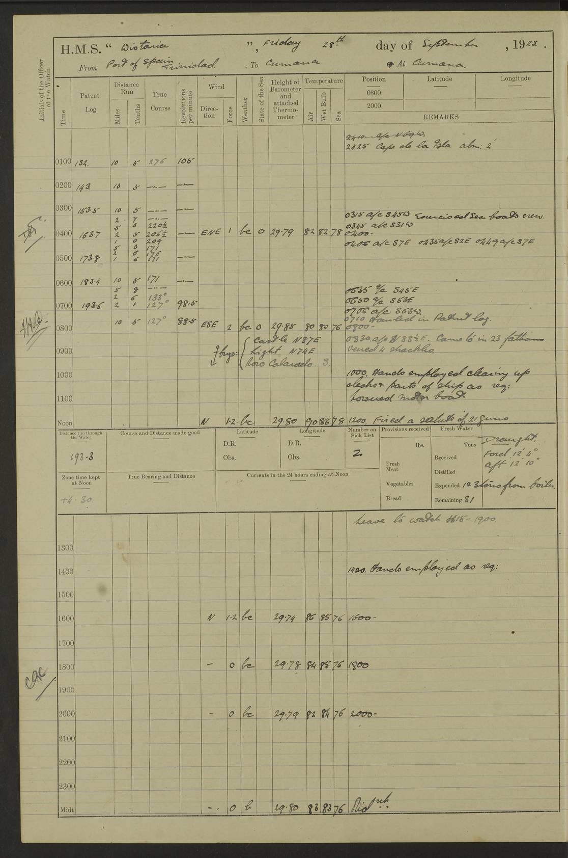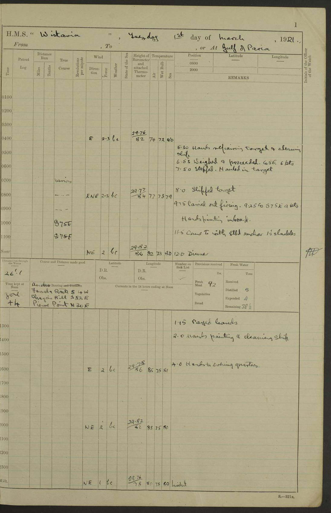 LOGS FOR MARCH 1921 4f73c9fea2fc8ea9030009a4: (https://s3.amazonaws.com:443/oldweather/ADM53-93259/0035_0.jpg) 4f73ca01a2fc8ea9030009ad: (https://s3.amazonaws.com:443/oldweather/ADM53-93260/0003_1.jpg) 1 March 1921 At Gulf of Paria [At San Fernando] Lat 10.38, Long -62.35 5.30am: Hands repairing target & cleaning ship [Repaired target & cleaned ship] [6.10am: Shortened in] [6.30am: Weighed & towed target for “Valerian”. Course SE, 6 knots] 6.53am: Weighed & proceeded. Course SE, 6 knots 7.50am: Stopped. Handed in target [Transferred target] 8.0am: Slipped target 9.15am: Carried out [4”] firing am: Hands painting inboard 11.05am: Came to with Starboard anchor 1½ shackles Anchor bearings: Farralla Rock S4W, Chagrin Hill S82E, Pierre Point N30E 1.15pm: Paid hands [monthly payment] 2.0pm: Hands painting & cleaning [ship] Number on sick list: - [Farralla Rock: perhaps misspelt Farrallon Rock] [Chagrin Hill: perhaps Mon Chagrin Hill] 4f73ca01a2fc8ea9030009ae: (https://s3.amazonaws.com:443/oldweather/ADM53-93260/0004_0.jpg) 2 March 1921 At Brighton Pier Lat 10.38, Long -62.35 8.30am: Weighed & proceeded to Brighton 9.40am: Let go Port anchor 2 shackles 10.30am: Sent provisions to “Valerian” Lost overboard by accident: Magazine Lewis Gun: One in number; Cartr. S.A. .303 belt: 47 in number 1.15pm: Landed liberty men 6.15pm: Liberty men returned. S. P. O. Edwards brought on board dead Number on sick list: 1.D.D. 4f73ca02a2fc8ea9030009af: (https://s3.amazonaws.com:443/oldweather/ADM53-93260/0004_1.jpg) H.M.S “Wistaria” at Trinidad. 3rd March 1921 Return of deaths on board H.M.S. “Wistaria” Date of death. 2nd March 1921. Name & Surname of Deceased. William Edwards. Sex. Male. Age. 27 years, 1 month. Rating. Stoker Petty Officer, Royal Navy. Nationality. English. Last place of Abode. H.M.S. “Wistaria”, lying off Brighton Pier, Trinidad. Cause of Death. Shock following rupture of spleen. 4f73ca02a2fc8ea9030009b0: (https://s3.amazonaws.com:443/oldweather/ADM53-93260/0005_0.jpg) 4f73ca03a2fc8ea9030009b1: (https://s3.amazonaws.com:443/oldweather/ADM53-93260/0005_1.jpg) 3 March 1921 At Port of Spain Lat 10.66, Long -61.55 5.30am: Weighed & proceeded to Port of Spain. Course N19E, 10 knots 8.0am: Came to with Starboard anchor, 1 shackles 9.55am: Discharged S.P.O. Edwards to Colonial Hospital, dead 3.30pm: Funeral Party & mourners landed 4.30pm: Half masted colours 5.30pm: Re-hoisted colours 6.30pm: Funeral parties returned 4f73ca03a2fc8ea9030009b2: (https://s3.amazonaws.com:443/oldweather/ADM53-93260/0006_0.jpg) 4 March 1921 At Port of Spain Lat 10.66, Long -61.55 5.55am: Weighed & proceeded. Course & speeds as required for battle practice 7.15am: Carried out battle practice 8.0am: Took target in tow for “Valerian” battle practice 8.30am: Set course for Port of Spain N25E, 8 knots 9.30am: Hauled in target 10.0am: Anchored & prepared divers to clear wire from rudder 10.30am: Wire cleaned. Weighed & proceeded. Target Capsized 11.45am: Righted target and proceeded 12.15pm: Came to Starboard anchor, 1 shackle 2.45pm: Hands up stanchions & respread awnings 3.30pm: Coal lighter secured alongside 5.40pm: Water boat secured alongside 4f73ca03a2fc8ea9030009b3: (https://s3.amazonaws.com:443/oldweather/ADM53-93260/0006_1.jpg) 5 March 1921 At Port of Spain Lat 10.66, Long -61.55 5.30am: Hands coal ship 7.0am: Received fresh provisions 10.45am: Finished coaling. Wash down upper decks 4.0pm: Evening Quarters. Read warrants 1-2-3-4 Number on sick list: 1 4f73ca04a2fc8ea9030009b4: (https://s3.amazonaws.com:443/oldweather/ADM53-93260/0007_0.jpg) 6 March 1921 At Port of Spain Lat 10.66, Long -61.55 9.45am: Divisions & prayers Number on sick list: 1 4f73ca04a2fc8ea9030009b5: (https://s3.amazonaws.com:443/oldweather/ADM53-93260/0007_1.jpg) 7 March 1921 At Port of Spain Lat 10.66, Long -61.55 6.30am: Hoisted boat 7.24am: Weighed & proceeded. S19W, 14 knots 9.30am: Anchored off Brighton Pier 10.0am: Held Court of Inquiry on death of S.P.O Edwards 1.0pm: Weighed & proceeded to Port of Spain. Course N19E, 14 knots 3.05pm: Anchored Number on sick list: 1 4f73ca04a2fc8ea9030009b6: (https://s3.amazonaws.com:443/oldweather/ADM53-93260/0008_0.jpg) 8 March 1921 At Port of Spain Lat 10.66, Long -61.55 7.50am: Shortened in 8.0am: Weighed & proceeded to Chaguaramas Bay at 12 knots 8.45am: Anchored 9.0am: All available seamen landed to haul up target. Sent provisions to “Valerian” 11.45am: Target party returned. Hoisted boats noon: Weighed & proceeded to Port of Spain at 12 knots 12.30pm: Anchored pm: Hands securing ship for sea 5.05pm: Colonel Glasgow arrived on board for passage to Jamaica 6.0pm: Weighed & proceeded at 11 knots. Course as required to pass through Bocas de Navios 7.0pm: Streamed Patent log 7.10pm: Chacachacare Lt abeam, 6 cables. Course N50W 7.47pm: Penas Point abeam [Boca de Navios: between Huevos and Chacachacare Islands. Also here] [Chacachacare Light: is exhibited from a white concrete tower, 30 feet high, on the northern end of the island] 4f73ca05a2fc8ea9030009b7: (https://s3.amazonaws.com:443/oldweather/ADM53-93260/0008_1.jpg) 9 March 1921 From Port of Spain, Trinidad, to Curaçoa Lat 11.36, Long -64.9 5.55am: Los Frayles Island abeam, 1 mile 6.35am: Altered course N77W. Cabo de la Isla abeam, 2 miles am: Hands scraping & painting inboard. Boats crews working about boats am: Turned 1st and 2nd whalers falls end for end pm: Hands painting, turning whaler falls end for end & scraping motor boat 6.0pm: Sighted Orchilla Isles N26W 9.05pm: Sighted El Rouke Lt N10W [Cabo de la Isla, also known as Cabo Negro] [El Rouke Lt: perhaps misspelt El Roque Light. A light was exhibited from a lighthouse on the northeast hill of El Roque] 4f73ca05a2fc8ea9030009b8: (https://s3.amazonaws.com:443/oldweather/ADM53-93260/0009_0.jpg) 10 March 1921 From Trinidad to Curaçoa and at Curaçoa Lat 10.66, Long -61.55 8.23am: Little Curaçoa Lt abeam 9.25am: Hauled in patent log 10.0am: Stopped for Port Health Off