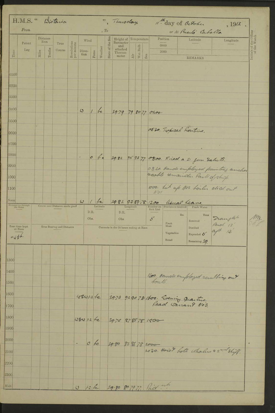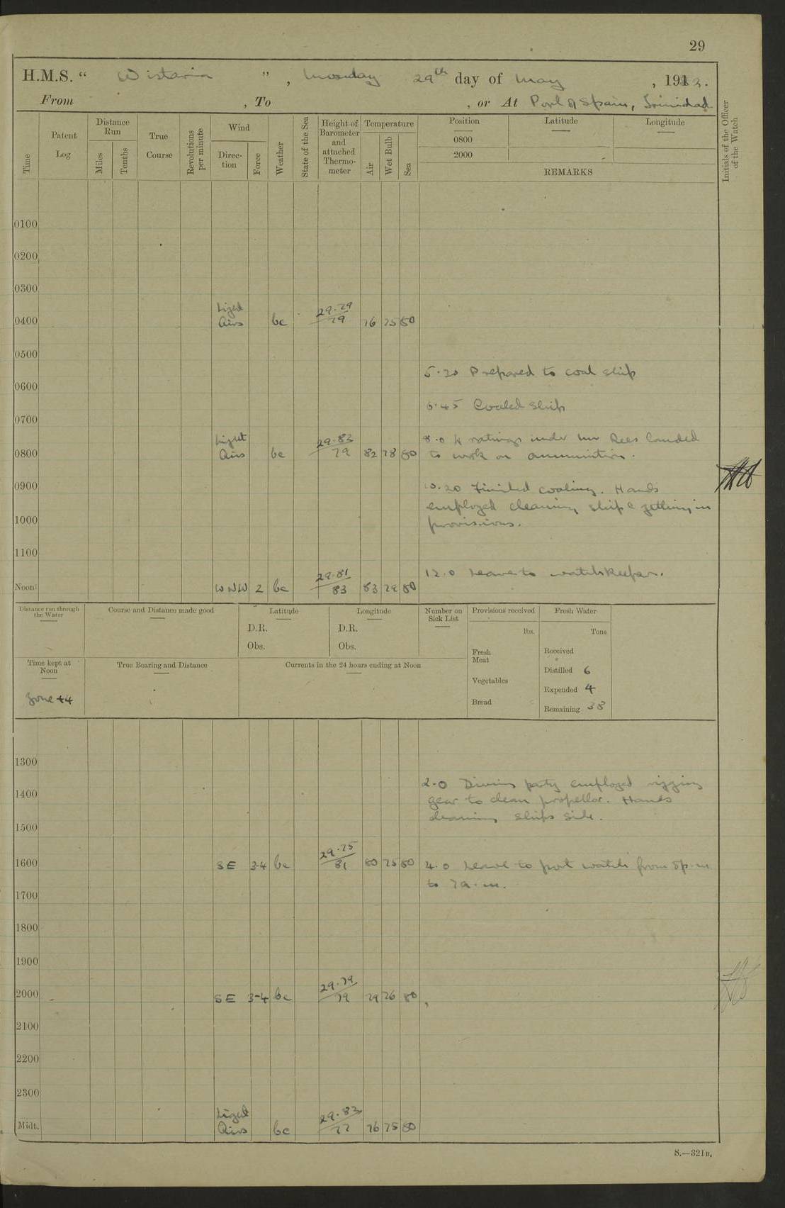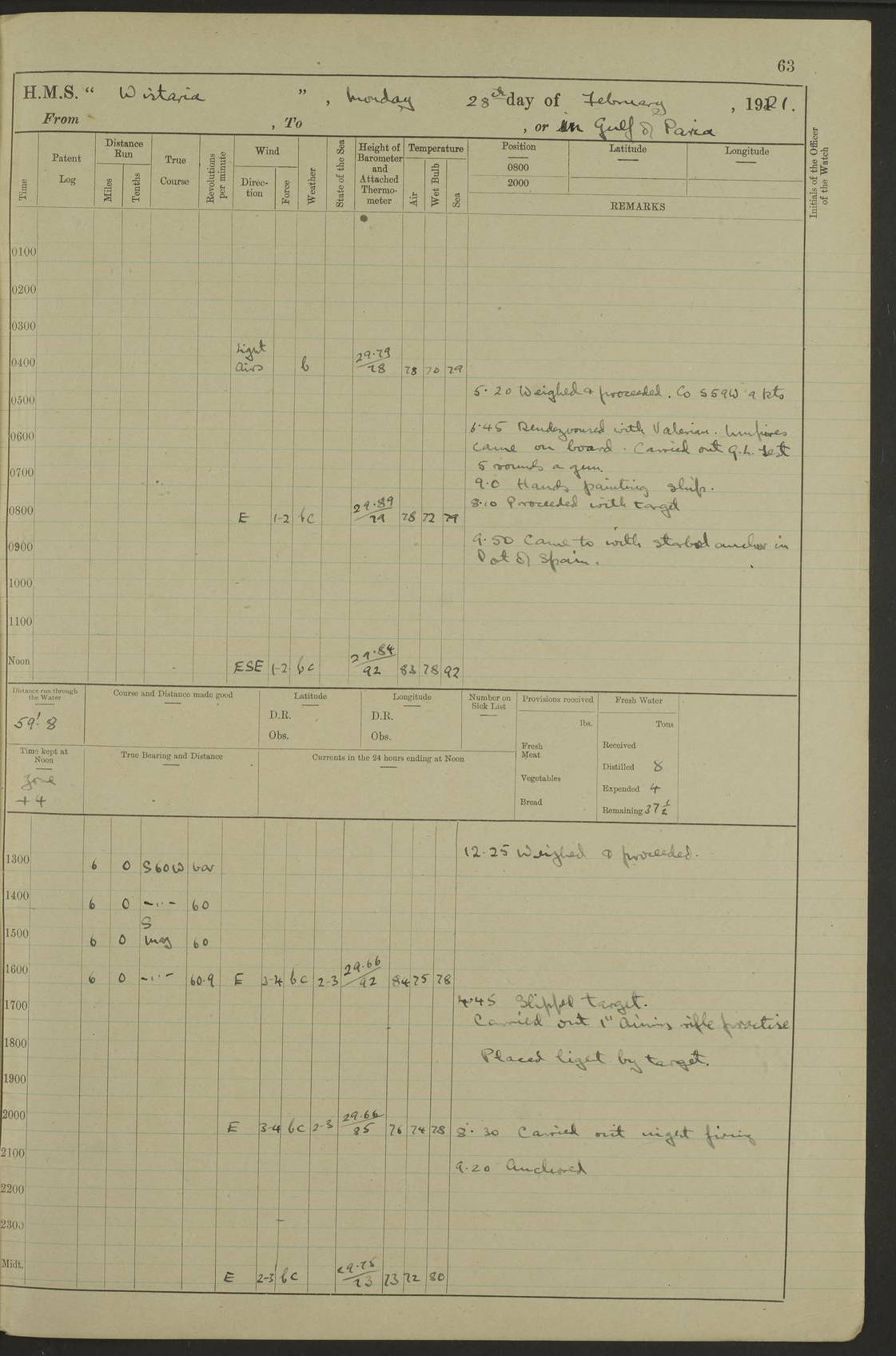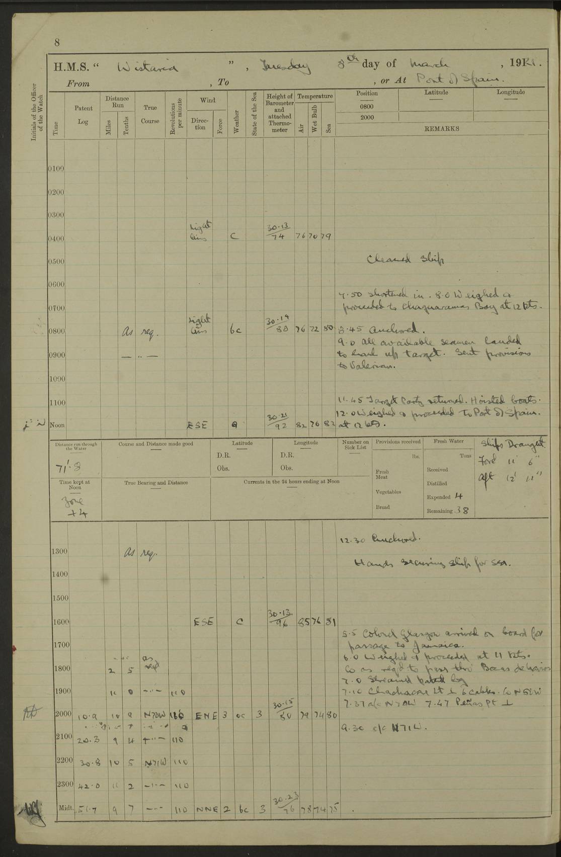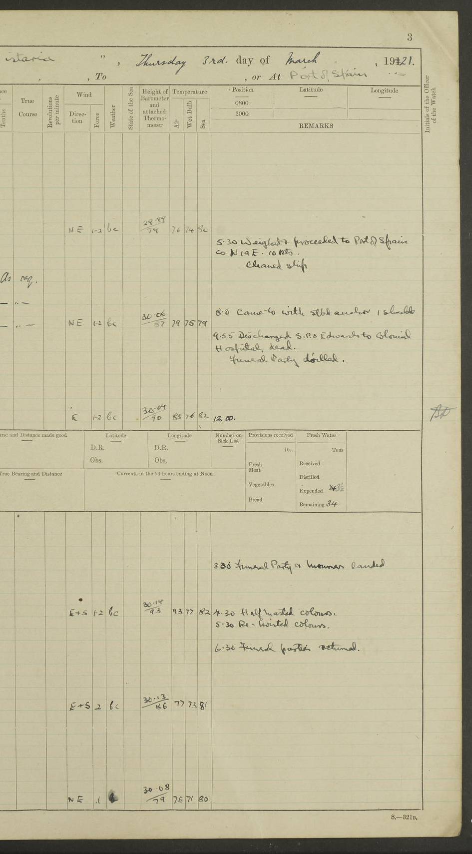 LOGS FOR MARCH 1921 4f73c9fea2fc8ea9030009a4: (https://s3.amazonaws.com:443/oldweather/ADM53-93259/0035_0.jpg) 4f73ca01a2fc8ea9030009ad: (https://s3.amazonaws.com:443/oldweather/ADM53-93260/0003_1.jpg) 1 March 1921 At Gulf of Paria [At San Fernando] Lat 10.38, Long -62.35 5.30am: Hands repairing target & cleaning ship [Repaired target & cleaned ship] [6.10am: Shortened in] [6.30am: Weighed & towed target for “Valerian”. Course SE, 6 knots] 6.53am: Weighed & proceeded. Course SE, 6 knots 7.50am: Stopped. Handed in target [Transferred target] 8.0am: Slipped target 9.15am: Carried out [4”] firing am: Hands painting inboard 11.05am: Came to with Starboard anchor 1½ shackles Anchor bearings: Farralla Rock S4W, Chagrin Hill S82E, Pierre Point N30E 1.15pm: Paid hands [monthly payment] 2.0pm: Hands painting & cleaning [ship] Number on sick list: - [Farralla Rock: perhaps misspelt Farrallon Rock] [Chagrin Hill: perhaps Mon Chagrin Hill] 4f73ca01a2fc8ea9030009ae: (https://s3.amazonaws.com:443/oldweather/ADM53-93260/0004_0.jpg) 2 March 1921 At Brighton Pier Lat 10.38, Long -62.35 8.30am: Weighed & proceeded to Brighton 9.40am: Let go Port anchor 2 shackles 10.30am: Sent provisions to “Valerian” Lost overboard by accident: Magazine Lewis Gun: One in number; Cartr. S.A. .303 belt: 47 in number 1.15pm: Landed liberty men 6.15pm: Liberty men returned. S. P. O. Edwards brought on board dead Number on sick list: 1.D.D. 4f73ca02a2fc8ea9030009af: (https://s3.amazonaws.com:443/oldweather/ADM53-93260/0004_1.jpg) H.M.S “Wistaria” at Trinidad. 3rd March 1921 Return of deaths on board H.M.S. “Wistaria” Date of death. 2nd March 1921. Name & Surname of Deceased. William Edwards. Sex. Male. Age. 27 years, 1 month. Rating. Stoker Petty Officer, Royal Navy. Nationality. English. Last place of Abode. H.M.S. “Wistaria”, lying off Brighton Pier, Trinidad. Cause of Death. Shock following rupture of spleen. 4f73ca02a2fc8ea9030009b0: (https://s3.amazonaws.com:443/oldweather/ADM53-93260/0005_0.jpg) 4f73ca03a2fc8ea9030009b1: (https://s3.amazonaws.com:443/oldweather/ADM53-93260/0005_1.jpg) 3 March 1921 At Port of Spain Lat 10.66, Long -61.55 5.30am: Weighed & proceeded to Port of Spain. Course N19E, 10 knots 8.0am: Came to with Starboard anchor, 1 shackles 9.55am: Discharged S.P.O. Edwards to Colonial Hospital, dead 3.30pm: Funeral Party & mourners landed 4.30pm: Half masted colours 5.30pm: Re-hoisted colours 6.30pm: Funeral parties returned 4f73ca03a2fc8ea9030009b2: (https://s3.amazonaws.com:443/oldweather/ADM53-93260/0006_0.jpg) 4 March 1921 At Port of Spain Lat 10.66, Long -61.55 5.55am: Weighed & proceeded. Course & speeds as required for battle practice 7.15am: Carried out battle practice 8.0am: Took target in tow for “Valerian” battle practice 8.30am: Set course for Port of Spain N25E, 8 knots 9.30am: Hauled in target 10.0am: Anchored & prepared divers to clear wire from rudder 10.30am: Wire cleaned. Weighed & proceeded. Target Capsized 11.45am: Righted target and proceeded 12.15pm: Came to Starboard anchor, 1 shackle 2.45pm: Hands up stanchions & respread awnings 3.30pm: Coal lighter secured alongside 5.40pm: Water boat secured alongside 4f73ca03a2fc8ea9030009b3: (https://s3.amazonaws.com:443/oldweather/ADM53-93260/0006_1.jpg) 5 March 1921 At Port of Spain Lat 10.66, Long -61.55 5.30am: Hands coal ship 7.0am: Received fresh provisions 10.45am: Finished coaling. Wash down upper decks 4.0pm: Evening Quarters. Read warrants 1-2-3-4 Number on sick list: 1 4f73ca04a2fc8ea9030009b4: (https://s3.amazonaws.com:443/oldweather/ADM53-93260/0007_0.jpg) 6 March 1921 At Port of Spain Lat 10.66, Long -61.55 9.45am: Divisions & prayers Number on sick list: 1 4f73ca04a2fc8ea9030009b5: (https://s3.amazonaws.com:443/oldweather/ADM53-93260/0007_1.jpg) 7 March 1921 At Port of Spain Lat 10.66, Long -61.55 6.30am: Hoisted boat 7.24am: Weighed & proceeded. S19W, 14 knots 9.30am: Anchored off Brighton Pier 10.0am: Held Court of Inquiry on death of S.P.O Edwards 1.0pm: Weighed & proceeded to Port of Spain. Course N19E, 14 knots 3.05pm: Anchored Number on sick list: 1 4f73ca04a2fc8ea9030009b6: (https://s3.amazonaws.com:443/oldweather/ADM53-93260/0008_0.jpg) 8 March 1921 At Port of Spain Lat 10.66, Long -61.55 7.50am: Shortened in 8.0am: Weighed & proceeded to Chaguaramas Bay at 12 knots 8.45am: Anchored 9.0am: All available seamen landed to haul up target. Sent provisions to “Valerian” 11.45am: Target party returned. Hoisted boats noon: Weighed & proceeded to Port of Spain at 12 knots 12.30pm: Anchored pm: Hands securing ship for sea 5.05pm: Colonel Glasgow arrived on board for passage to Jamaica 6.0pm: Weighed & proceeded at 11 knots. Course as required to pass through Bocas de Navios 7.0pm: Streamed Patent log 7.10pm: Chacachacare Lt abeam, 6 cables. Course N50W 7.47pm: Penas Point abeam [Boca de Navios: between Huevos and Chacachacare Islands. Also here] [Chacachacare Light: is exhibited from a white concrete tower, 30 feet high, on the northern end of the island] 4f73ca05a2fc8ea9030009b7: (https://s3.amazonaws.com:443/oldweather/ADM53-93260/0008_1.jpg) 9 March 1921 From Port of Spain, Trinidad, to Curaçoa Lat 11.36, Long -64.9 5.55am: Los Frayles Island abeam, 1 mile 6.35am: Altered course N77W. Cabo de la Isla abeam, 2 miles am: Hands scraping & painting inboard. Boats crews working about boats am: Turned 1st and 2nd whalers falls end for end pm: Hands painting, turning whaler falls end for end & scraping motor boat 6.0pm: Sighted Orchilla Isles N26W 9.05pm: Sighted El Rouke Lt N10W [Cabo de la Isla, also known as Cabo Negro] [El Rouke Lt: perhaps misspelt El Roque Light. A light was exhibited from a lighthouse on the northeast hill of El Roque] 4f73ca05a2fc8ea9030009b8: (https://s3.amazonaws.com:443/oldweather/ADM53-93260/0009_0.jpg) 10 March 1921 From Trinidad to Curaçoa and at Curaçoa Lat 10.66, Long -61.55 8.23am: Little Curaçoa Lt abeam 9.25am: Hauled in patent log 10.0am: Stopped for Port Health Off