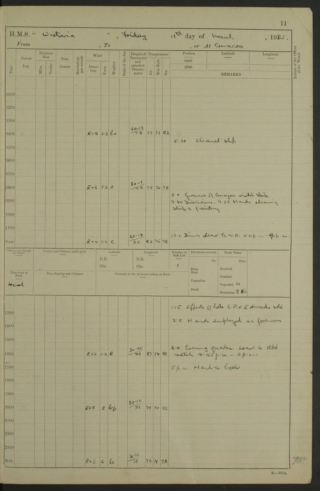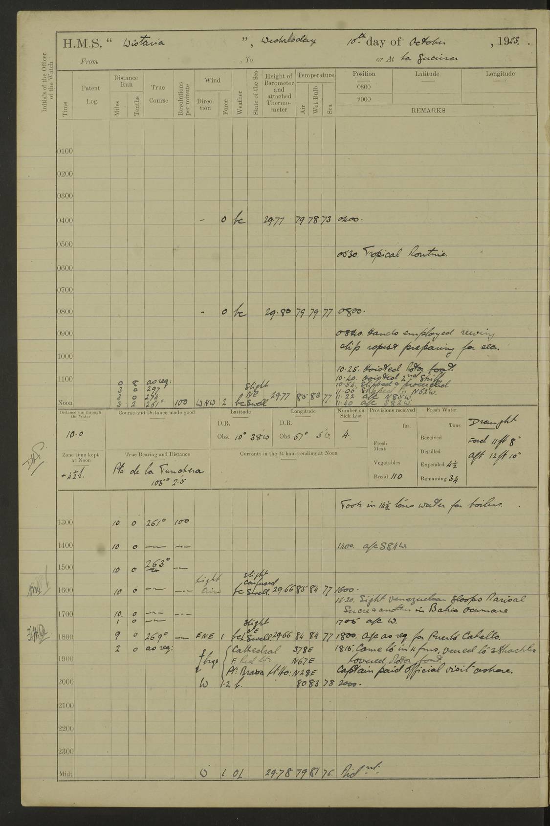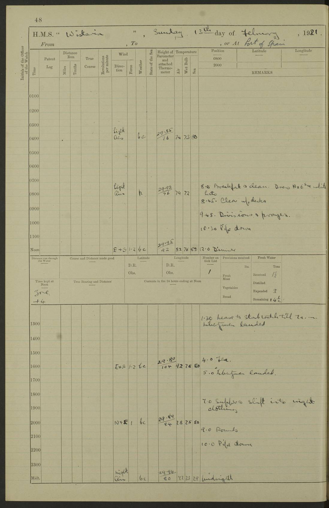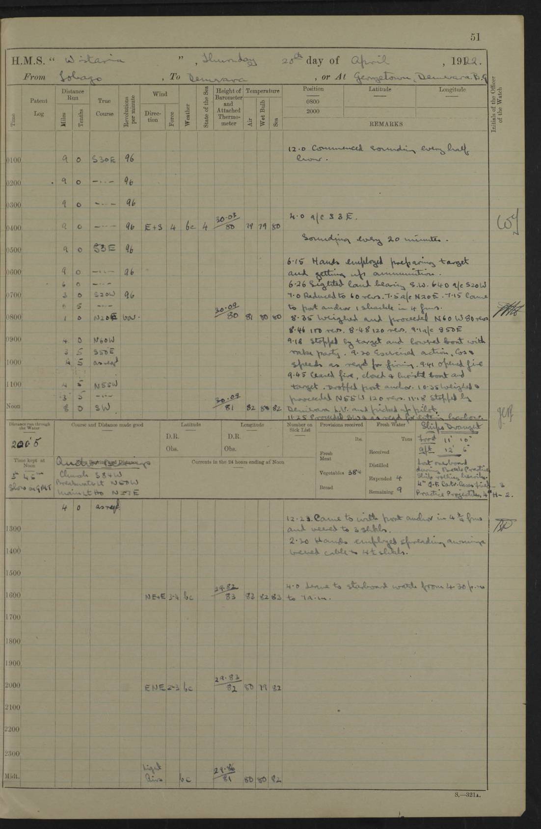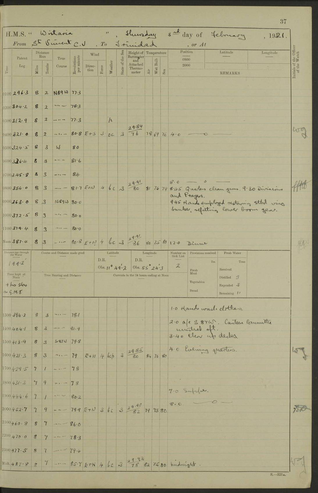 LOGS FOR MARCH 1921 4f73c9fea2fc8ea9030009a4: (https://s3.amazonaws.com:443/oldweather/ADM53-93259/0035_0.jpg) 4f73ca01a2fc8ea9030009ad: (https://s3.amazonaws.com:443/oldweather/ADM53-93260/0003_1.jpg) 1 March 1921 At Gulf of Paria [At San Fernando] Lat 10.38, Long -62.35 5.30am: Hands repairing target & cleaning ship [Repaired target & cleaned ship] [6.10am: Shortened in] [6.30am: Weighed & towed target for “Valerian”. Course SE, 6 knots] 6.53am: Weighed & proceeded. Course SE, 6 knots 7.50am: Stopped. Handed in target [Transferred target] 8.0am: Slipped target 9.15am: Carried out [4”] firing am: Hands painting inboard 11.05am: Came to with Starboard anchor 1½ shackles Anchor bearings: Farralla Rock S4W, Chagrin Hill S82E, Pierre Point N30E 1.15pm: Paid hands [monthly payment] 2.0pm: Hands painting & cleaning [ship] Number on sick list: - [Farralla Rock: perhaps misspelt Farrallon Rock] [Chagrin Hill: perhaps Mon Chagrin Hill] 4f73ca01a2fc8ea9030009ae: (https://s3.amazonaws.com:443/oldweather/ADM53-93260/0004_0.jpg) 2 March 1921 At Brighton Pier Lat 10.38, Long -62.35 8.30am: Weighed & proceeded to Brighton 9.40am: Let go Port anchor 2 shackles 10.30am: Sent provisions to “Valerian” Lost overboard by accident: Magazine Lewis Gun: One in number; Cartr. S.A. .303 belt: 47 in number 1.15pm: Landed liberty men 6.15pm: Liberty men returned. S. P. O. Edwards brought on board dead Number on sick list: 1.D.D. 4f73ca02a2fc8ea9030009af: (https://s3.amazonaws.com:443/oldweather/ADM53-93260/0004_1.jpg) H.M.S “Wistaria” at Trinidad. 3rd March 1921 Return of deaths on board H.M.S. “Wistaria” Date of death. 2nd March 1921. Name & Surname of Deceased. William Edwards. Sex. Male. Age. 27 years, 1 month. Rating. Stoker Petty Officer, Royal Navy. Nationality. English. Last place of Abode. H.M.S. “Wistaria”, lying off Brighton Pier, Trinidad. Cause of Death. Shock following rupture of spleen. 4f73ca02a2fc8ea9030009b0: (https://s3.amazonaws.com:443/oldweather/ADM53-93260/0005_0.jpg) 4f73ca03a2fc8ea9030009b1: (https://s3.amazonaws.com:443/oldweather/ADM53-93260/0005_1.jpg) 3 March 1921 At Port of Spain Lat 10.66, Long -61.55 5.30am: Weighed & proceeded to Port of Spain. Course N19E, 10 knots 8.0am: Came to with Starboard anchor, 1 shackles 9.55am: Discharged S.P.O. Edwards to Colonial Hospital, dead 3.30pm: Funeral Party & mourners landed 4.30pm: Half masted colours 5.30pm: Re-hoisted colours 6.30pm: Funeral parties returned 4f73ca03a2fc8ea9030009b2: (https://s3.amazonaws.com:443/oldweather/ADM53-93260/0006_0.jpg) 4 March 1921 At Port of Spain Lat 10.66, Long -61.55 5.55am: Weighed & proceeded. Course & speeds as required for battle practice 7.15am: Carried out battle practice 8.0am: Took target in tow for “Valerian” battle practice 8.30am: Set course for Port of Spain N25E, 8 knots 9.30am: Hauled in target 10.0am: Anchored & prepared divers to clear wire from rudder 10.30am: Wire cleaned. Weighed & proceeded. Target Capsized 11.45am: Righted target and proceeded 12.15pm: Came to Starboard anchor, 1 shackle 2.45pm: Hands up stanchions & respread awnings 3.30pm: Coal lighter secured alongside 5.40pm: Water boat secured alongside 4f73ca03a2fc8ea9030009b3: (https://s3.amazonaws.com:443/oldweather/ADM53-93260/0006_1.jpg) 5 March 1921 At Port of Spain Lat 10.66, Long -61.55 5.30am: Hands coal ship 7.0am: Received fresh provisions 10.45am: Finished coaling. Wash down upper decks 4.0pm: Evening Quarters. Read warrants 1-2-3-4 Number on sick list: 1 4f73ca04a2fc8ea9030009b4: (https://s3.amazonaws.com:443/oldweather/ADM53-93260/0007_0.jpg) 6 March 1921 At Port of Spain Lat 10.66, Long -61.55 9.45am: Divisions & prayers Number on sick list: 1 4f73ca04a2fc8ea9030009b5: (https://s3.amazonaws.com:443/oldweather/ADM53-93260/0007_1.jpg) 7 March 1921 At Port of Spain Lat 10.66, Long -61.55 6.30am: Hoisted boat 7.24am: Weighed & proceeded. S19W, 14 knots 9.30am: Anchored off Brighton Pier 10.0am: Held Court of Inquiry on death of S.P.O Edwards 1.0pm: Weighed & proceeded to Port of Spain. Course N19E, 14 knots 3.05pm: Anchored Number on sick list: 1 4f73ca04a2fc8ea9030009b6: (https://s3.amazonaws.com:443/oldweather/ADM53-93260/0008_0.jpg) 8 March 1921 At Port of Spain Lat 10.66, Long -61.55 7.50am: Shortened in 8.0am: Weighed & proceeded to Chaguaramas Bay at 12 knots 8.45am: Anchored 9.0am: All available seamen landed to haul up target. Sent provisions to “Valerian” 11.45am: Target party returned. Hoisted boats noon: Weighed & proceeded to Port of Spain at 12 knots 12.30pm: Anchored pm: Hands securing ship for sea 5.05pm: Colonel Glasgow arrived on board for passage to Jamaica 6.0pm: Weighed & proceeded at 11 knots. Course as required to pass through Bocas de Navios 7.0pm: Streamed Patent log 7.10pm: Chacachacare Lt abeam, 6 cables. Course N50W 7.47pm: Penas Point abeam [Boca de Navios: between Huevos and Chacachacare Islands. Also here] [Chacachacare Light: is exhibited from a white concrete tower, 30 feet high, on the northern end of the island] 4f73ca05a2fc8ea9030009b7: (https://s3.amazonaws.com:443/oldweather/ADM53-93260/0008_1.jpg) 9 March 1921 From Port of Spain, Trinidad, to Curaçoa Lat 11.36, Long -64.9 5.55am: Los Frayles Island abeam, 1 mile 6.35am: Altered course N77W. Cabo de la Isla abeam, 2 miles am: Hands scraping & painting inboard. Boats crews working about boats am: Turned 1st and 2nd whalers falls end for end pm: Hands painting, turning whaler falls end for end & scraping motor boat 6.0pm: Sighted Orchilla Isles N26W 9.05pm: Sighted El Rouke Lt N10W [Cabo de la Isla, also known as Cabo Negro] [El Rouke Lt: perhaps misspelt El Roque Light. A light was exhibited from a lighthouse on the northeast hill of El Roque] 4f73ca05a2fc8ea9030009b8: (https://s3.amazonaws.com:443/oldweather/ADM53-93260/0009_0.jpg) 10 March 1921 From Trinidad to Curaçoa and at Curaçoa Lat 10.66, Long -61.55 8.23am: Little Curaçoa Lt abeam 9.25am: Hauled in patent log 10.0am: Stopped for Port Health Off