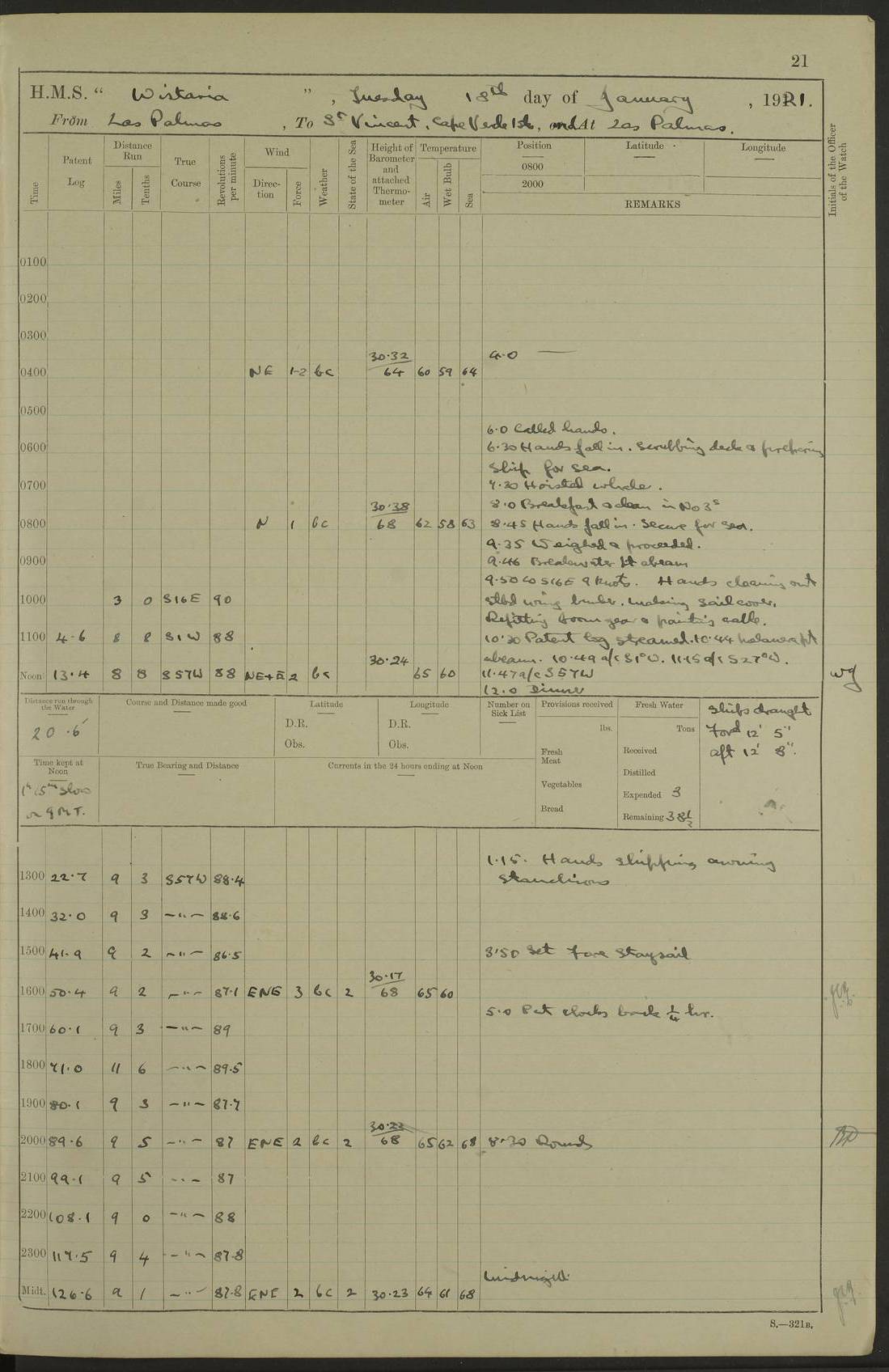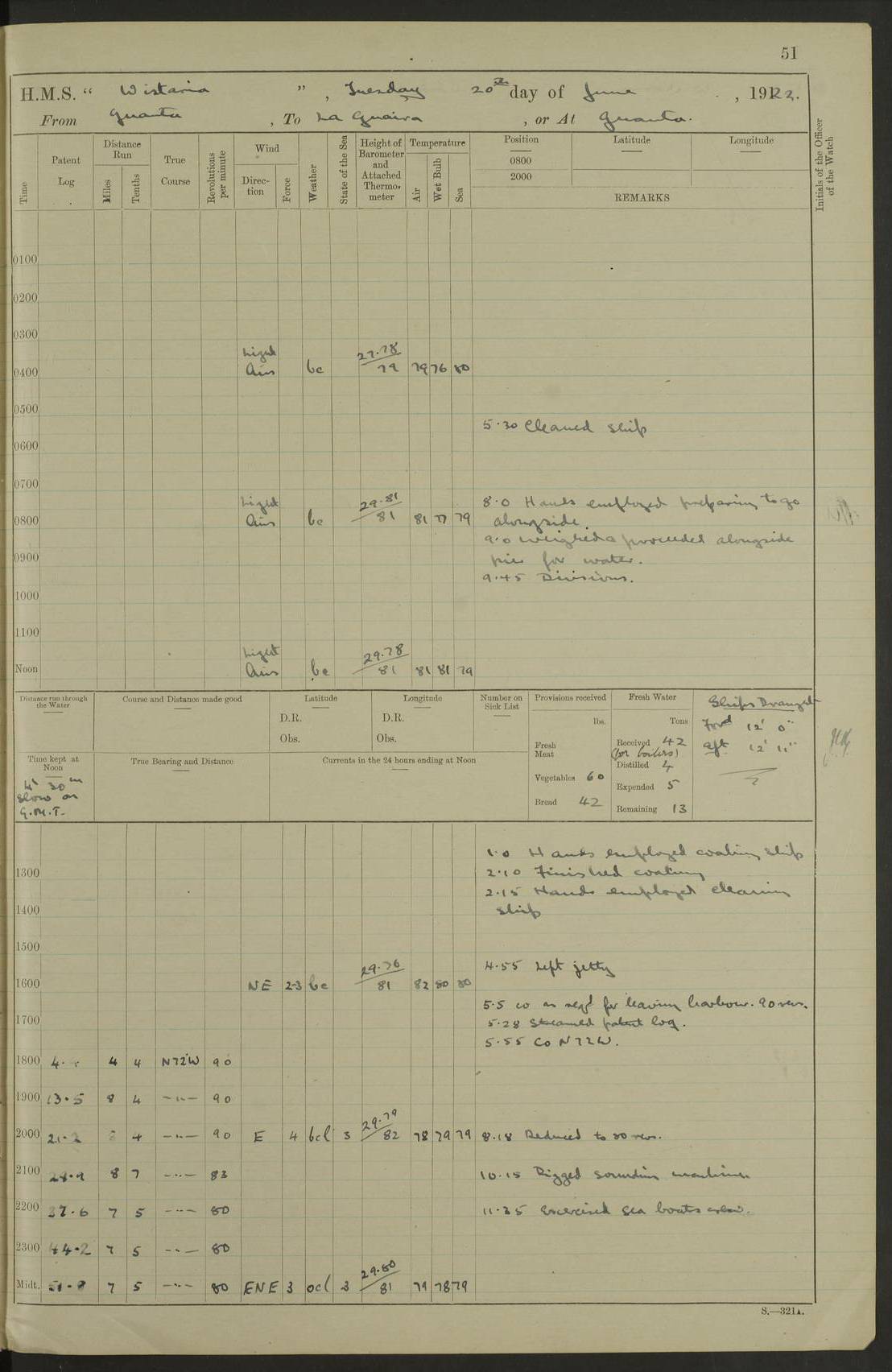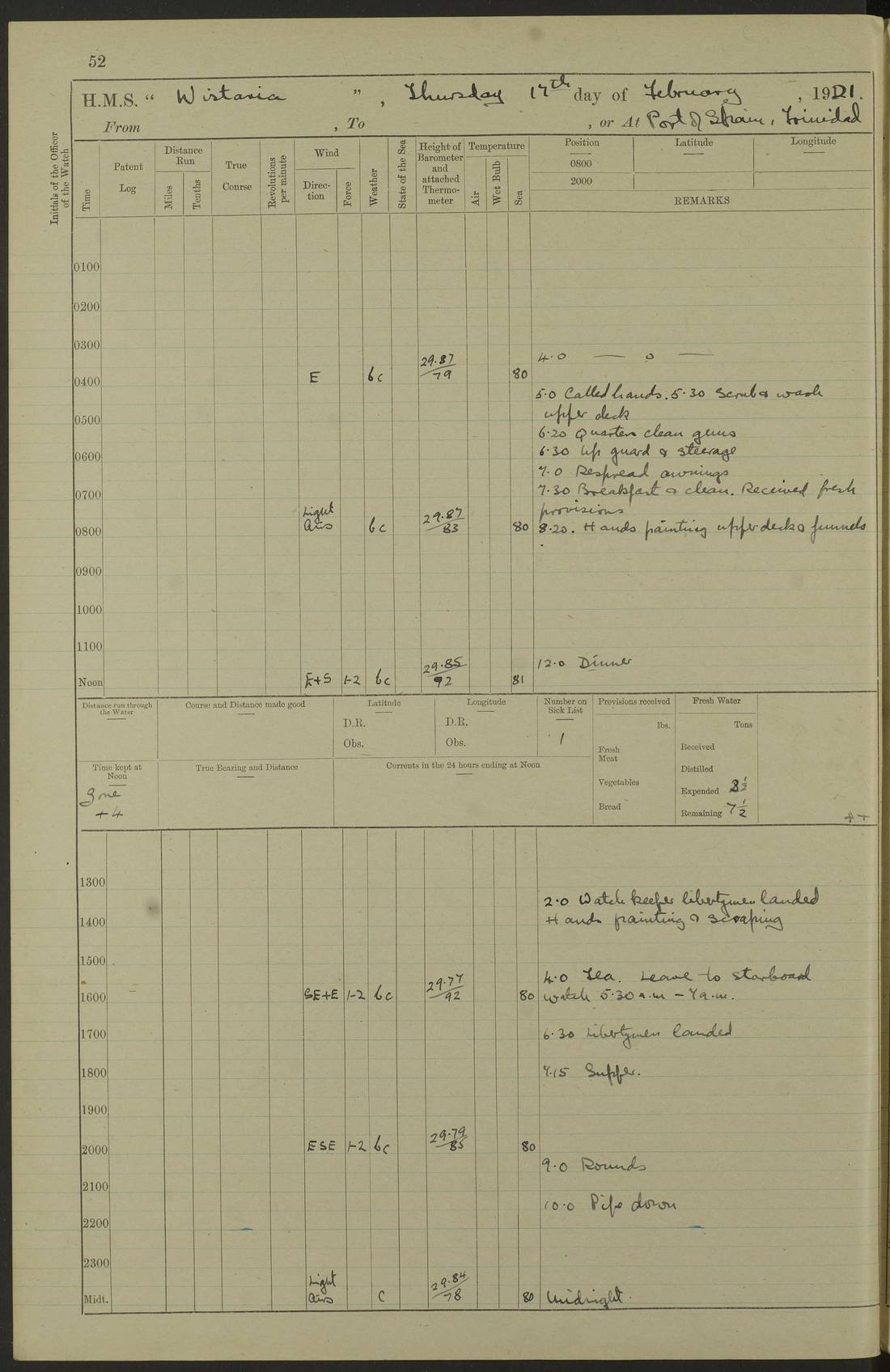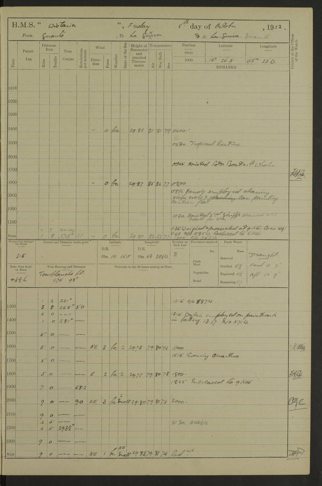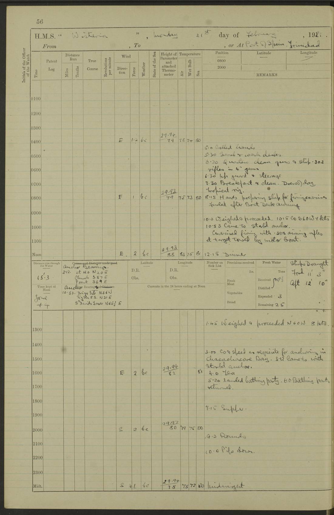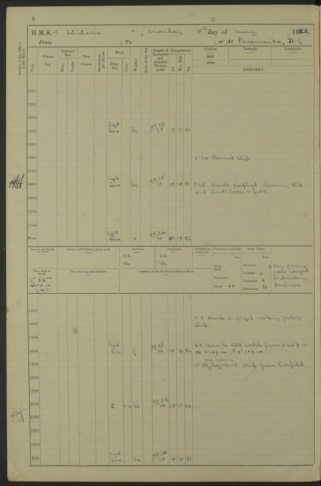 LOGS FOR MARCH 1921 4f73c9fea2fc8ea9030009a4: (https://s3.amazonaws.com:443/oldweather/ADM53-93259/0035_0.jpg) 4f73ca01a2fc8ea9030009ad: (https://s3.amazonaws.com:443/oldweather/ADM53-93260/0003_1.jpg) 1 March 1921 At Gulf of Paria [At San Fernando] Lat 10.38, Long -62.35 5.30am: Hands repairing target & cleaning ship [Repaired target & cleaned ship] [6.10am: Shortened in] [6.30am: Weighed & towed target for “Valerian”. Course SE, 6 knots] 6.53am: Weighed & proceeded. Course SE, 6 knots 7.50am: Stopped. Handed in target [Transferred target] 8.0am: Slipped target 9.15am: Carried out [4”] firing am: Hands painting inboard 11.05am: Came to with Starboard anchor 1½ shackles Anchor bearings: Farralla Rock S4W, Chagrin Hill S82E, Pierre Point N30E 1.15pm: Paid hands [monthly payment] 2.0pm: Hands painting & cleaning [ship] Number on sick list: - [Farralla Rock: perhaps misspelt Farrallon Rock] [Chagrin Hill: perhaps Mon Chagrin Hill] 4f73ca01a2fc8ea9030009ae: (https://s3.amazonaws.com:443/oldweather/ADM53-93260/0004_0.jpg) 2 March 1921 At Brighton Pier Lat 10.38, Long -62.35 8.30am: Weighed & proceeded to Brighton 9.40am: Let go Port anchor 2 shackles 10.30am: Sent provisions to “Valerian” Lost overboard by accident: Magazine Lewis Gun: One in number; Cartr. S.A. .303 belt: 47 in number 1.15pm: Landed liberty men 6.15pm: Liberty men returned. S. P. O. Edwards brought on board dead Number on sick list: 1.D.D. 4f73ca02a2fc8ea9030009af: (https://s3.amazonaws.com:443/oldweather/ADM53-93260/0004_1.jpg) H.M.S “Wistaria” at Trinidad. 3rd March 1921 Return of deaths on board H.M.S. “Wistaria” Date of death. 2nd March 1921. Name & Surname of Deceased. William Edwards. Sex. Male. Age. 27 years, 1 month. Rating. Stoker Petty Officer, Royal Navy. Nationality. English. Last place of Abode. H.M.S. “Wistaria”, lying off Brighton Pier, Trinidad. Cause of Death. Shock following rupture of spleen. 4f73ca02a2fc8ea9030009b0: (https://s3.amazonaws.com:443/oldweather/ADM53-93260/0005_0.jpg) 4f73ca03a2fc8ea9030009b1: (https://s3.amazonaws.com:443/oldweather/ADM53-93260/0005_1.jpg) 3 March 1921 At Port of Spain Lat 10.66, Long -61.55 5.30am: Weighed & proceeded to Port of Spain. Course N19E, 10 knots 8.0am: Came to with Starboard anchor, 1 shackles 9.55am: Discharged S.P.O. Edwards to Colonial Hospital, dead 3.30pm: Funeral Party & mourners landed 4.30pm: Half masted colours 5.30pm: Re-hoisted colours 6.30pm: Funeral parties returned 4f73ca03a2fc8ea9030009b2: (https://s3.amazonaws.com:443/oldweather/ADM53-93260/0006_0.jpg) 4 March 1921 At Port of Spain Lat 10.66, Long -61.55 5.55am: Weighed & proceeded. Course & speeds as required for battle practice 7.15am: Carried out battle practice 8.0am: Took target in tow for “Valerian” battle practice 8.30am: Set course for Port of Spain N25E, 8 knots 9.30am: Hauled in target 10.0am: Anchored & prepared divers to clear wire from rudder 10.30am: Wire cleaned. Weighed & proceeded. Target Capsized 11.45am: Righted target and proceeded 12.15pm: Came to Starboard anchor, 1 shackle 2.45pm: Hands up stanchions & respread awnings 3.30pm: Coal lighter secured alongside 5.40pm: Water boat secured alongside 4f73ca03a2fc8ea9030009b3: (https://s3.amazonaws.com:443/oldweather/ADM53-93260/0006_1.jpg) 5 March 1921 At Port of Spain Lat 10.66, Long -61.55 5.30am: Hands coal ship 7.0am: Received fresh provisions 10.45am: Finished coaling. Wash down upper decks 4.0pm: Evening Quarters. Read warrants 1-2-3-4 Number on sick list: 1 4f73ca04a2fc8ea9030009b4: (https://s3.amazonaws.com:443/oldweather/ADM53-93260/0007_0.jpg) 6 March 1921 At Port of Spain Lat 10.66, Long -61.55 9.45am: Divisions & prayers Number on sick list: 1 4f73ca04a2fc8ea9030009b5: (https://s3.amazonaws.com:443/oldweather/ADM53-93260/0007_1.jpg) 7 March 1921 At Port of Spain Lat 10.66, Long -61.55 6.30am: Hoisted boat 7.24am: Weighed & proceeded. S19W, 14 knots 9.30am: Anchored off Brighton Pier 10.0am: Held Court of Inquiry on death of S.P.O Edwards 1.0pm: Weighed & proceeded to Port of Spain. Course N19E, 14 knots 3.05pm: Anchored Number on sick list: 1 4f73ca04a2fc8ea9030009b6: (https://s3.amazonaws.com:443/oldweather/ADM53-93260/0008_0.jpg) 8 March 1921 At Port of Spain Lat 10.66, Long -61.55 7.50am: Shortened in 8.0am: Weighed & proceeded to Chaguaramas Bay at 12 knots 8.45am: Anchored 9.0am: All available seamen landed to haul up target. Sent provisions to “Valerian” 11.45am: Target party returned. Hoisted boats noon: Weighed & proceeded to Port of Spain at 12 knots 12.30pm: Anchored pm: Hands securing ship for sea 5.05pm: Colonel Glasgow arrived on board for passage to Jamaica 6.0pm: Weighed & proceeded at 11 knots. Course as required to pass through Bocas de Navios 7.0pm: Streamed Patent log 7.10pm: Chacachacare Lt abeam, 6 cables. Course N50W 7.47pm: Penas Point abeam [Boca de Navios: between Huevos and Chacachacare Islands. Also here] [Chacachacare Light: is exhibited from a white concrete tower, 30 feet high, on the northern end of the island] 4f73ca05a2fc8ea9030009b7: (https://s3.amazonaws.com:443/oldweather/ADM53-93260/0008_1.jpg) 9 March 1921 From Port of Spain, Trinidad, to Curaçoa Lat 11.36, Long -64.9 5.55am: Los Frayles Island abeam, 1 mile 6.35am: Altered course N77W. Cabo de la Isla abeam, 2 miles am: Hands scraping & painting inboard. Boats crews working about boats am: Turned 1st and 2nd whalers falls end for end pm: Hands painting, turning whaler falls end for end & scraping motor boat 6.0pm: Sighted Orchilla Isles N26W 9.05pm: Sighted El Rouke Lt N10W [Cabo de la Isla, also known as Cabo Negro] [El Rouke Lt: perhaps misspelt El Roque Light. A light was exhibited from a lighthouse on the northeast hill of El Roque] 4f73ca05a2fc8ea9030009b8: (https://s3.amazonaws.com:443/oldweather/ADM53-93260/0009_0.jpg) 10 March 1921 From Trinidad to Curaçoa and at Curaçoa Lat 10.66, Long -61.55 8.23am: Little Curaçoa Lt abeam 9.25am: Hauled in patent log 10.0am: Stopped for Port Health Off