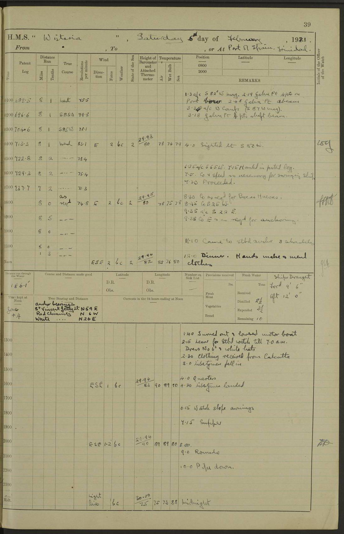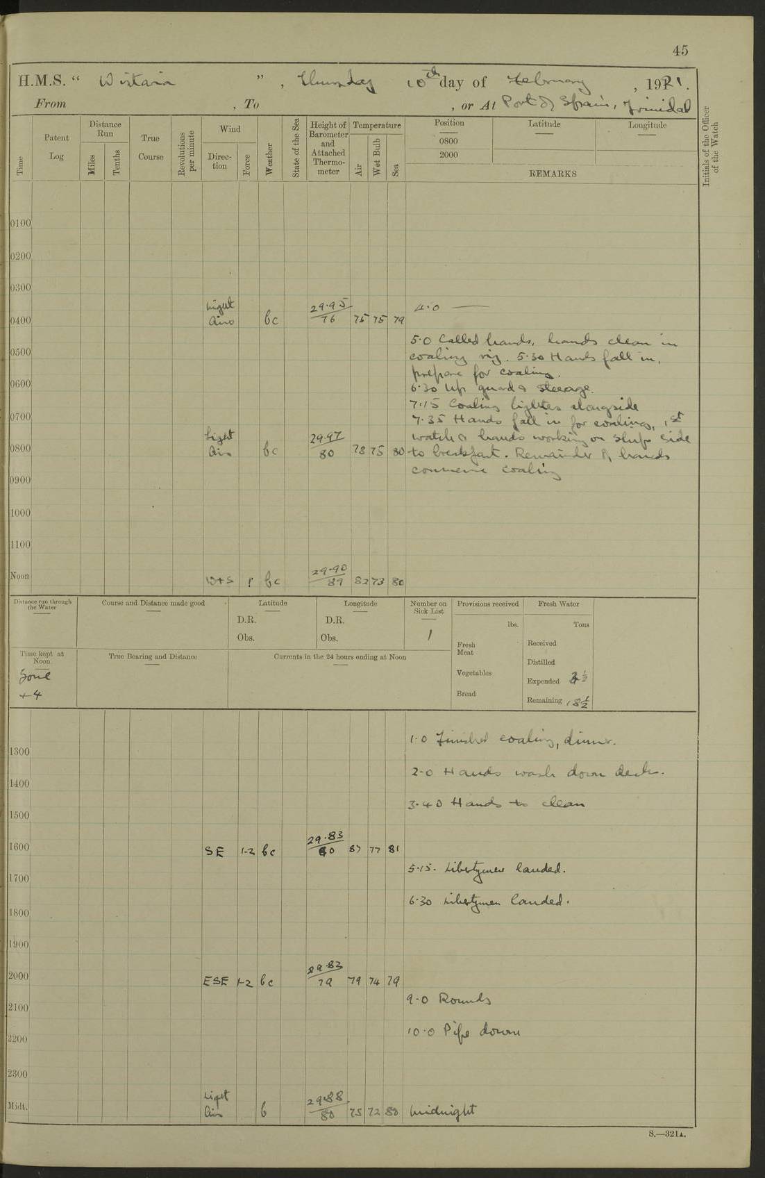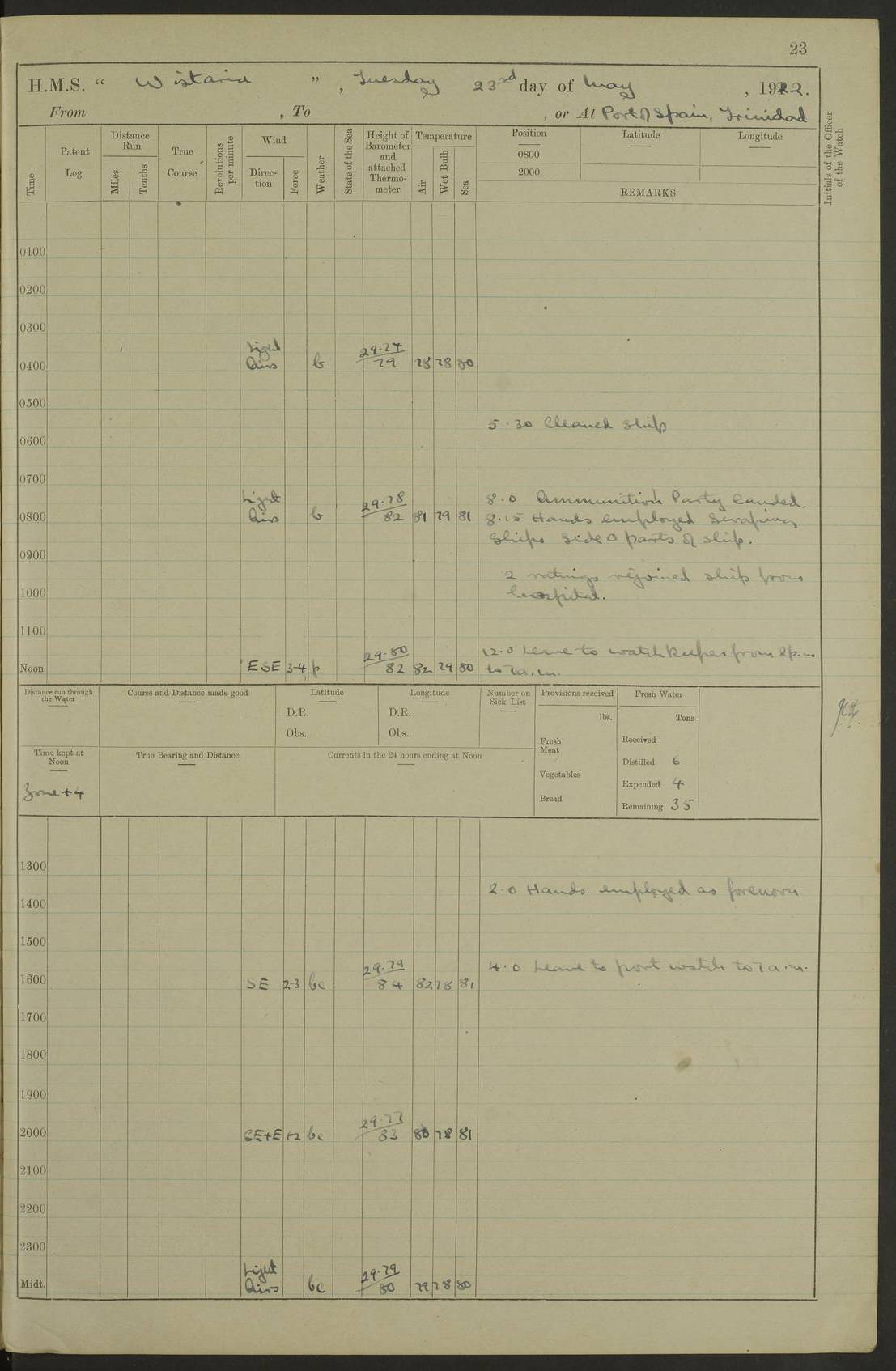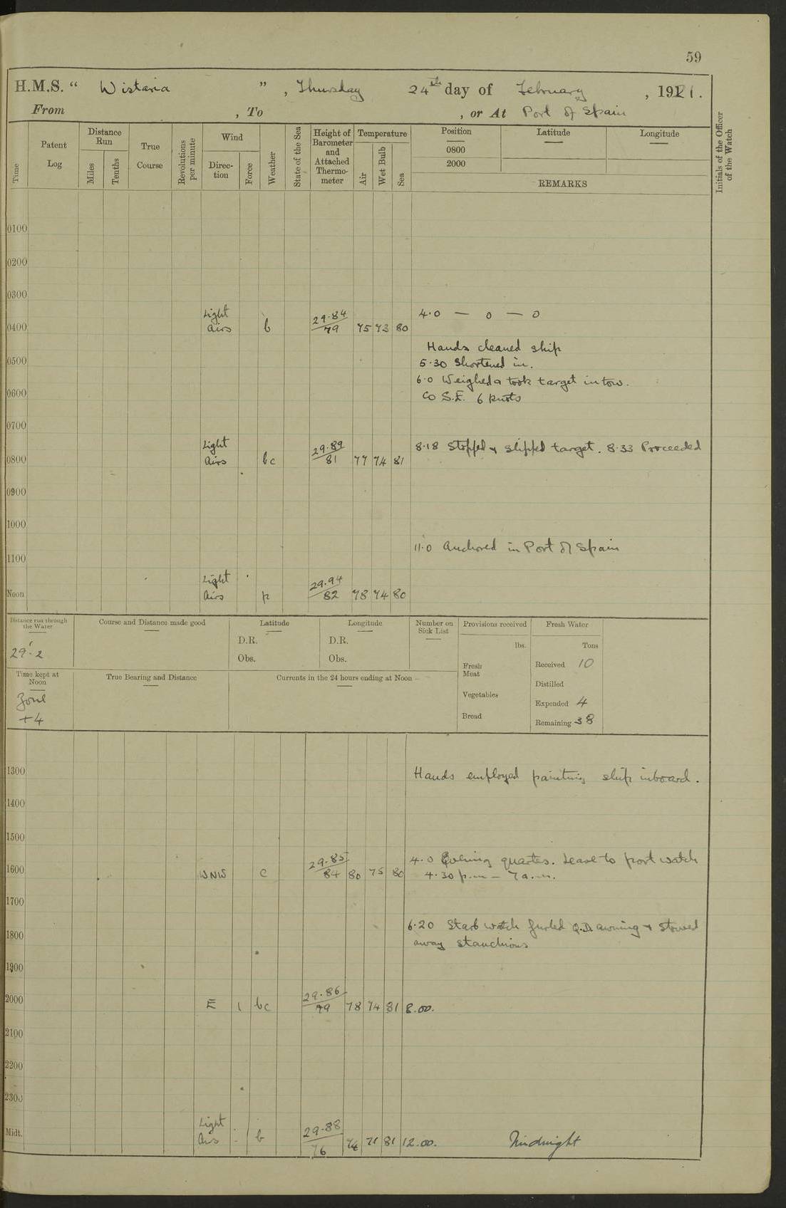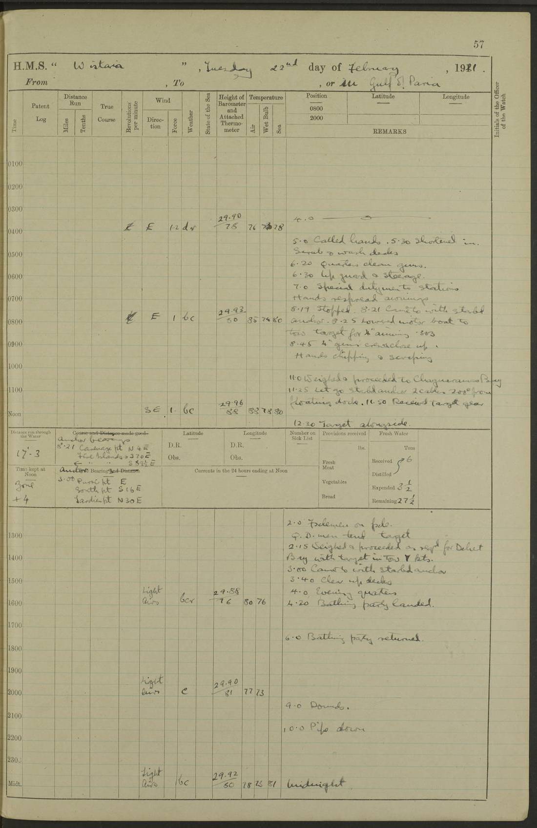 LOGS FOR MARCH 1921 4f73c9fea2fc8ea9030009a4: (https://s3.amazonaws.com:443/oldweather/ADM53-93259/0035_0.jpg) 4f73ca01a2fc8ea9030009ad: (https://s3.amazonaws.com:443/oldweather/ADM53-93260/0003_1.jpg) 1 March 1921 At Gulf of Paria [At San Fernando] Lat 10.38, Long -62.35 5.30am: Hands repairing target & cleaning ship [Repaired target & cleaned ship] [6.10am: Shortened in] [6.30am: Weighed & towed target for “Valerian”. Course SE, 6 knots] 6.53am: Weighed & proceeded. Course SE, 6 knots 7.50am: Stopped. Handed in target [Transferred target] 8.0am: Slipped target 9.15am: Carried out [4”] firing am: Hands painting inboard 11.05am: Came to with Starboard anchor 1½ shackles Anchor bearings: Farralla Rock S4W, Chagrin Hill S82E, Pierre Point N30E 1.15pm: Paid hands [monthly payment] 2.0pm: Hands painting & cleaning [ship] Number on sick list: - [Farralla Rock: perhaps misspelt Farrallon Rock] [Chagrin Hill: perhaps Mon Chagrin Hill] 4f73ca01a2fc8ea9030009ae: (https://s3.amazonaws.com:443/oldweather/ADM53-93260/0004_0.jpg) 2 March 1921 At Brighton Pier Lat 10.38, Long -62.35 8.30am: Weighed & proceeded to Brighton 9.40am: Let go Port anchor 2 shackles 10.30am: Sent provisions to “Valerian” Lost overboard by accident: Magazine Lewis Gun: One in number; Cartr. S.A. .303 belt: 47 in number 1.15pm: Landed liberty men 6.15pm: Liberty men returned. S. P. O. Edwards brought on board dead Number on sick list: 1.D.D. 4f73ca02a2fc8ea9030009af: (https://s3.amazonaws.com:443/oldweather/ADM53-93260/0004_1.jpg) H.M.S “Wistaria” at Trinidad. 3rd March 1921 Return of deaths on board H.M.S. “Wistaria” Date of death. 2nd March 1921. Name & Surname of Deceased. William Edwards. Sex. Male. Age. 27 years, 1 month. Rating. Stoker Petty Officer, Royal Navy. Nationality. English. Last place of Abode. H.M.S. “Wistaria”, lying off Brighton Pier, Trinidad. Cause of Death. Shock following rupture of spleen. 4f73ca02a2fc8ea9030009b0: (https://s3.amazonaws.com:443/oldweather/ADM53-93260/0005_0.jpg) 4f73ca03a2fc8ea9030009b1: (https://s3.amazonaws.com:443/oldweather/ADM53-93260/0005_1.jpg) 3 March 1921 At Port of Spain Lat 10.66, Long -61.55 5.30am: Weighed & proceeded to Port of Spain. Course N19E, 10 knots 8.0am: Came to with Starboard anchor, 1 shackles 9.55am: Discharged S.P.O. Edwards to Colonial Hospital, dead 3.30pm: Funeral Party & mourners landed 4.30pm: Half masted colours 5.30pm: Re-hoisted colours 6.30pm: Funeral parties returned 4f73ca03a2fc8ea9030009b2: (https://s3.amazonaws.com:443/oldweather/ADM53-93260/0006_0.jpg) 4 March 1921 At Port of Spain Lat 10.66, Long -61.55 5.55am: Weighed & proceeded. Course & speeds as required for battle practice 7.15am: Carried out battle practice 8.0am: Took target in tow for “Valerian” battle practice 8.30am: Set course for Port of Spain N25E, 8 knots 9.30am: Hauled in target 10.0am: Anchored & prepared divers to clear wire from rudder 10.30am: Wire cleaned. Weighed & proceeded. Target Capsized 11.45am: Righted target and proceeded 12.15pm: Came to Starboard anchor, 1 shackle 2.45pm: Hands up stanchions & respread awnings 3.30pm: Coal lighter secured alongside 5.40pm: Water boat secured alongside 4f73ca03a2fc8ea9030009b3: (https://s3.amazonaws.com:443/oldweather/ADM53-93260/0006_1.jpg) 5 March 1921 At Port of Spain Lat 10.66, Long -61.55 5.30am: Hands coal ship 7.0am: Received fresh provisions 10.45am: Finished coaling. Wash down upper decks 4.0pm: Evening Quarters. Read warrants 1-2-3-4 Number on sick list: 1 4f73ca04a2fc8ea9030009b4: (https://s3.amazonaws.com:443/oldweather/ADM53-93260/0007_0.jpg) 6 March 1921 At Port of Spain Lat 10.66, Long -61.55 9.45am: Divisions & prayers Number on sick list: 1 4f73ca04a2fc8ea9030009b5: (https://s3.amazonaws.com:443/oldweather/ADM53-93260/0007_1.jpg) 7 March 1921 At Port of Spain Lat 10.66, Long -61.55 6.30am: Hoisted boat 7.24am: Weighed & proceeded. S19W, 14 knots 9.30am: Anchored off Brighton Pier 10.0am: Held Court of Inquiry on death of S.P.O Edwards 1.0pm: Weighed & proceeded to Port of Spain. Course N19E, 14 knots 3.05pm: Anchored Number on sick list: 1 4f73ca04a2fc8ea9030009b6: (https://s3.amazonaws.com:443/oldweather/ADM53-93260/0008_0.jpg) 8 March 1921 At Port of Spain Lat 10.66, Long -61.55 7.50am: Shortened in 8.0am: Weighed & proceeded to Chaguaramas Bay at 12 knots 8.45am: Anchored 9.0am: All available seamen landed to haul up target. Sent provisions to “Valerian” 11.45am: Target party returned. Hoisted boats noon: Weighed & proceeded to Port of Spain at 12 knots 12.30pm: Anchored pm: Hands securing ship for sea 5.05pm: Colonel Glasgow arrived on board for passage to Jamaica 6.0pm: Weighed & proceeded at 11 knots. Course as required to pass through Bocas de Navios 7.0pm: Streamed Patent log 7.10pm: Chacachacare Lt abeam, 6 cables. Course N50W 7.47pm: Penas Point abeam [Boca de Navios: between Huevos and Chacachacare Islands. Also here] [Chacachacare Light: is exhibited from a white concrete tower, 30 feet high, on the northern end of the island] 4f73ca05a2fc8ea9030009b7: (https://s3.amazonaws.com:443/oldweather/ADM53-93260/0008_1.jpg) 9 March 1921 From Port of Spain, Trinidad, to Curaçoa Lat 11.36, Long -64.9 5.55am: Los Frayles Island abeam, 1 mile 6.35am: Altered course N77W. Cabo de la Isla abeam, 2 miles am: Hands scraping & painting inboard. Boats crews working about boats am: Turned 1st and 2nd whalers falls end for end pm: Hands painting, turning whaler falls end for end & scraping motor boat 6.0pm: Sighted Orchilla Isles N26W 9.05pm: Sighted El Rouke Lt N10W [Cabo de la Isla, also known as Cabo Negro] [El Rouke Lt: perhaps misspelt El Roque Light. A light was exhibited from a lighthouse on the northeast hill of El Roque] 4f73ca05a2fc8ea9030009b8: (https://s3.amazonaws.com:443/oldweather/ADM53-93260/0009_0.jpg) 10 March 1921 From Trinidad to Curaçoa and at Curaçoa Lat 10.66, Long -61.55 8.23am: Little Curaçoa Lt abeam 9.25am: Hauled in patent log 10.0am: Stopped for Port Health Off