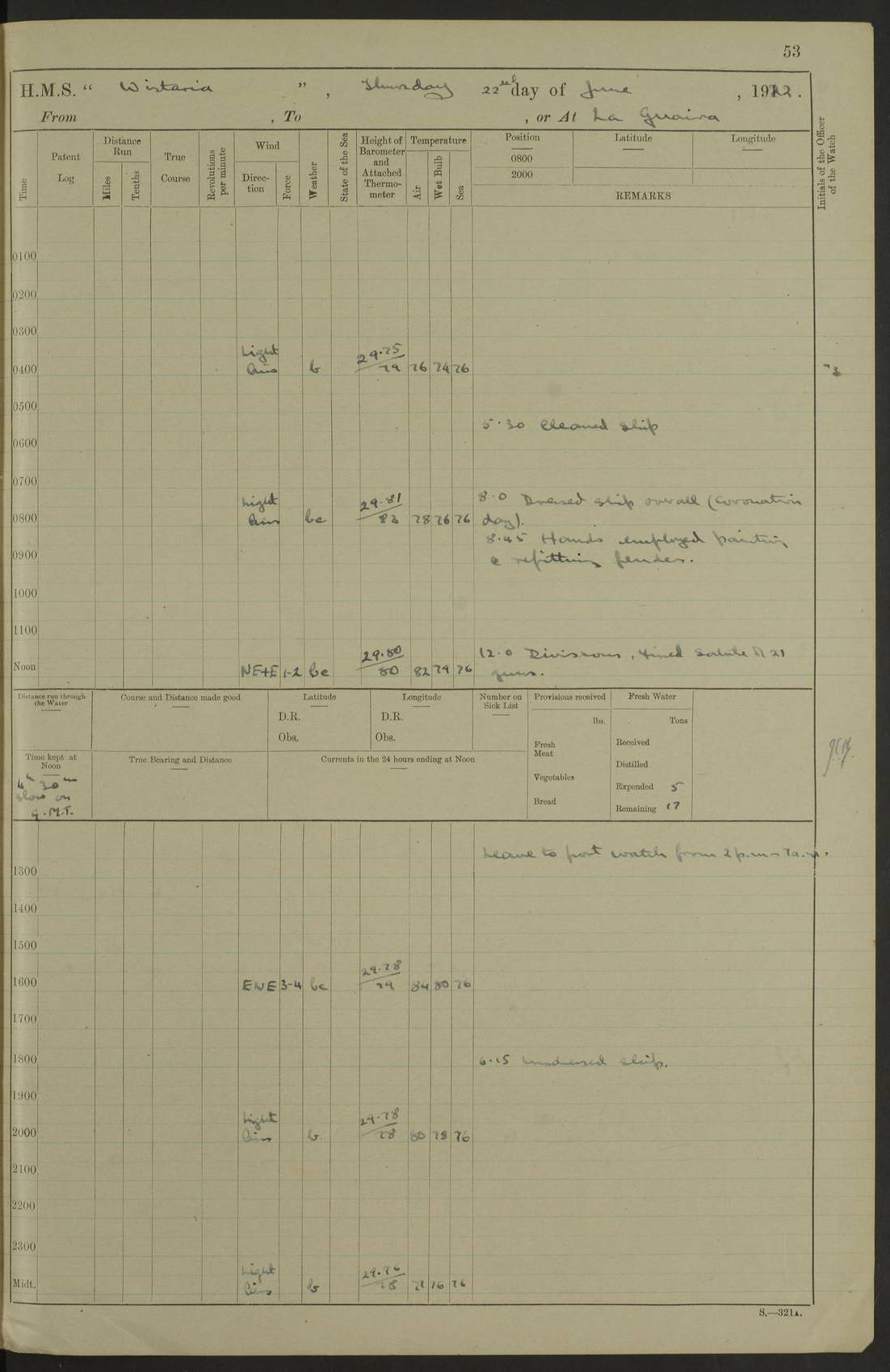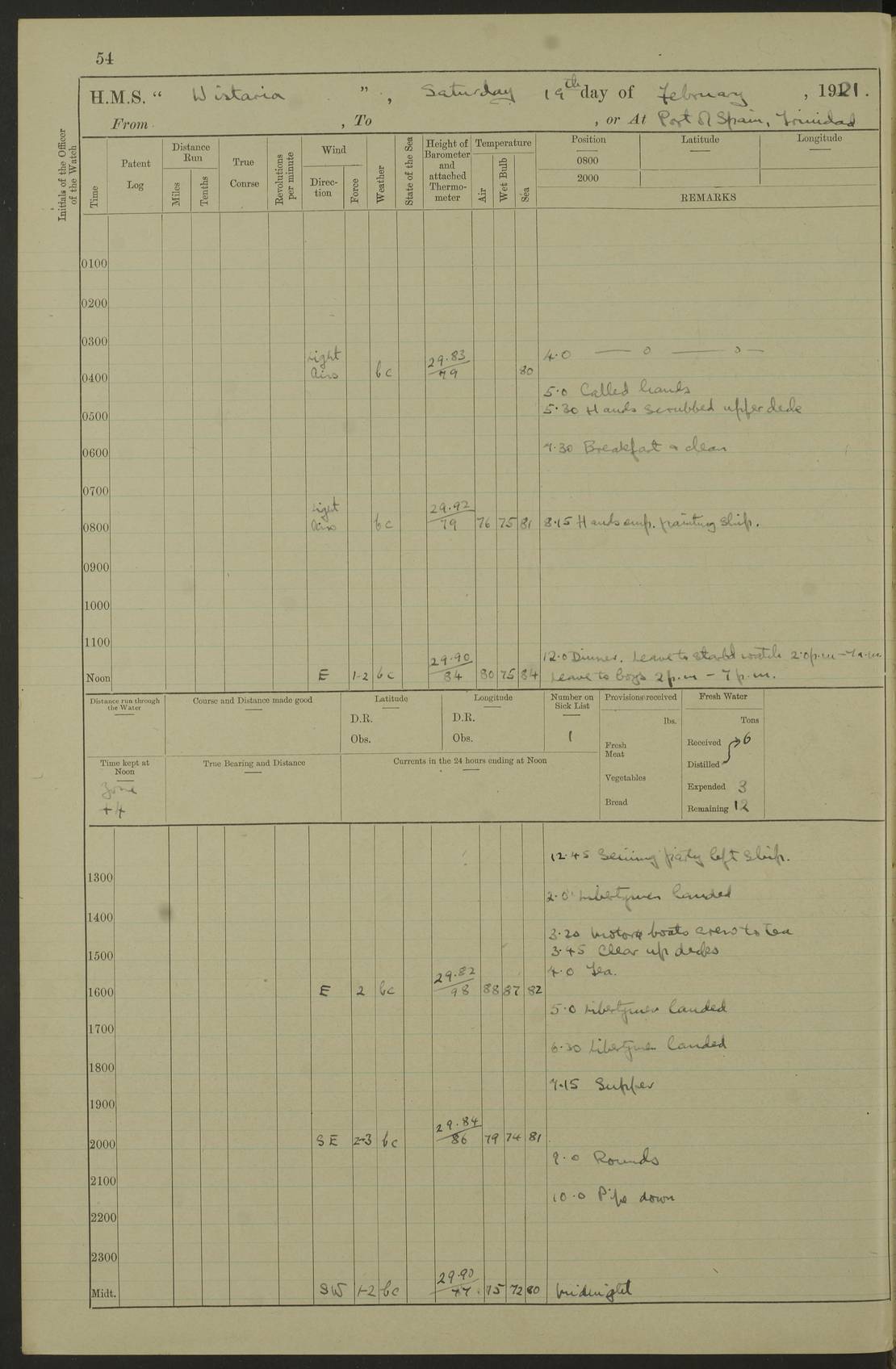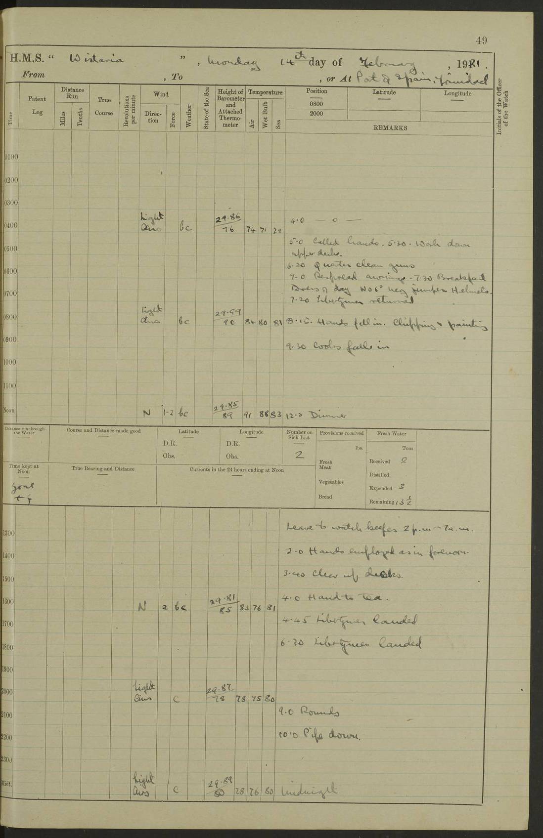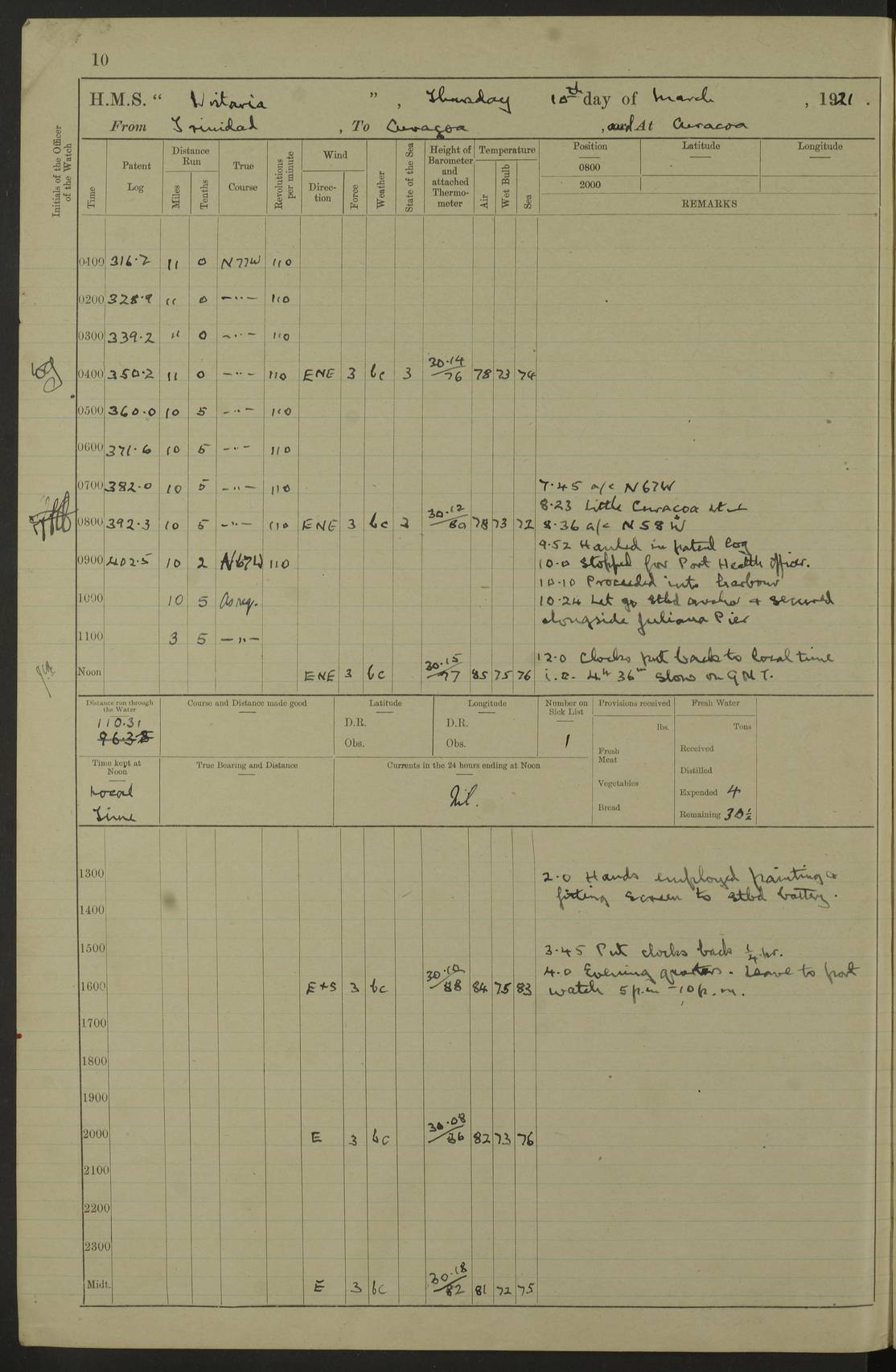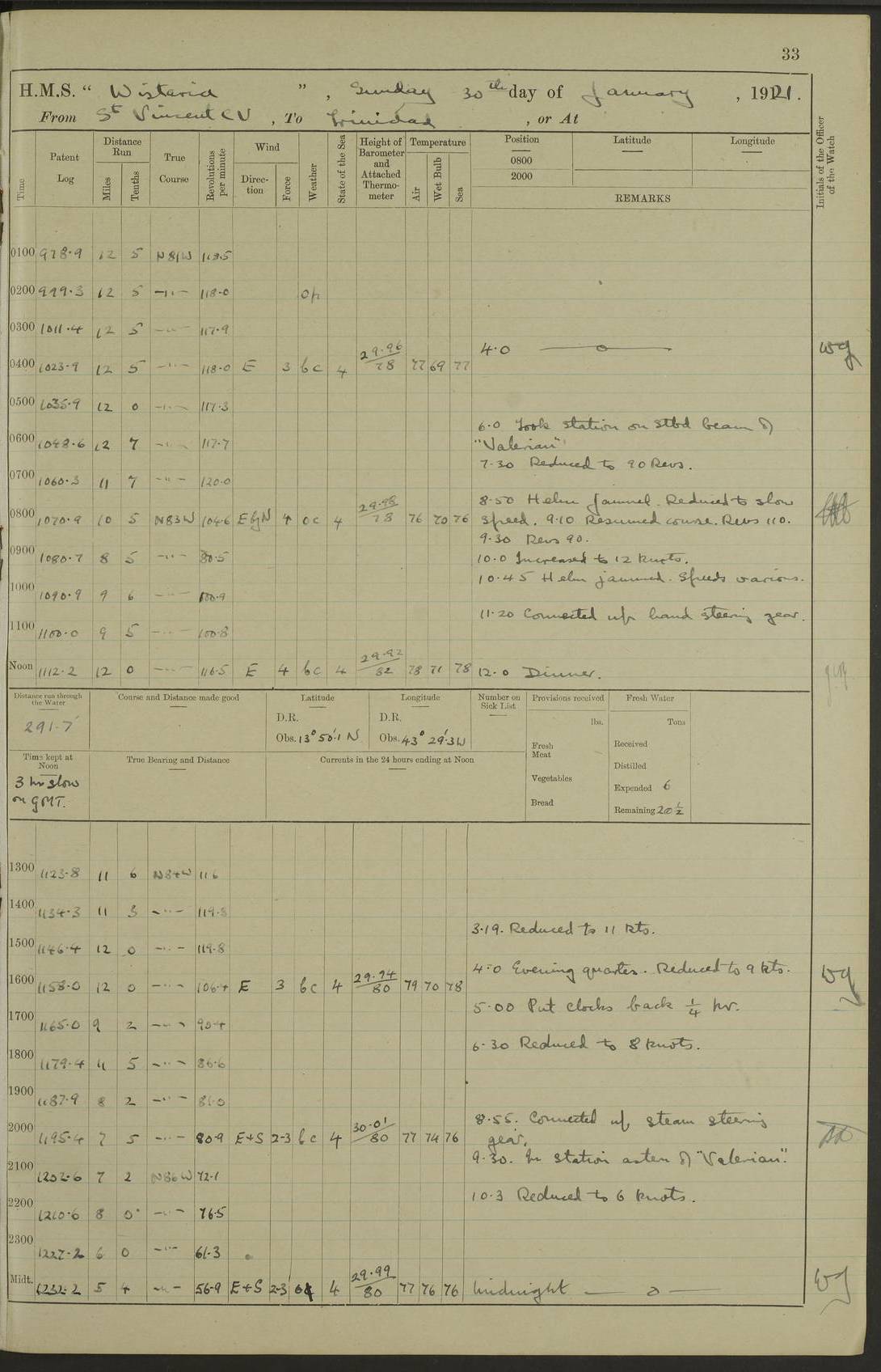 LOGS FOR MARCH 1921 4f73c9fea2fc8ea9030009a4: (https://s3.amazonaws.com:443/oldweather/ADM53-93259/0035_0.jpg) 4f73ca01a2fc8ea9030009ad: (https://s3.amazonaws.com:443/oldweather/ADM53-93260/0003_1.jpg) 1 March 1921 At Gulf of Paria [At San Fernando] Lat 10.38, Long -62.35 5.30am: Hands repairing target & cleaning ship [Repaired target & cleaned ship] [6.10am: Shortened in] [6.30am: Weighed & towed target for “Valerian”. Course SE, 6 knots] 6.53am: Weighed & proceeded. Course SE, 6 knots 7.50am: Stopped. Handed in target [Transferred target] 8.0am: Slipped target 9.15am: Carried out [4”] firing am: Hands painting inboard 11.05am: Came to with Starboard anchor 1½ shackles Anchor bearings: Farralla Rock S4W, Chagrin Hill S82E, Pierre Point N30E 1.15pm: Paid hands [monthly payment] 2.0pm: Hands painting & cleaning [ship] Number on sick list: - [Farralla Rock: perhaps misspelt Farrallon Rock] [Chagrin Hill: perhaps Mon Chagrin Hill] 4f73ca01a2fc8ea9030009ae: (https://s3.amazonaws.com:443/oldweather/ADM53-93260/0004_0.jpg) 2 March 1921 At Brighton Pier Lat 10.38, Long -62.35 8.30am: Weighed & proceeded to Brighton 9.40am: Let go Port anchor 2 shackles 10.30am: Sent provisions to “Valerian” Lost overboard by accident: Magazine Lewis Gun: One in number; Cartr. S.A. .303 belt: 47 in number 1.15pm: Landed liberty men 6.15pm: Liberty men returned. S. P. O. Edwards brought on board dead Number on sick list: 1.D.D. 4f73ca02a2fc8ea9030009af: (https://s3.amazonaws.com:443/oldweather/ADM53-93260/0004_1.jpg) H.M.S “Wistaria” at Trinidad. 3rd March 1921 Return of deaths on board H.M.S. “Wistaria” Date of death. 2nd March 1921. Name & Surname of Deceased. William Edwards. Sex. Male. Age. 27 years, 1 month. Rating. Stoker Petty Officer, Royal Navy. Nationality. English. Last place of Abode. H.M.S. “Wistaria”, lying off Brighton Pier, Trinidad. Cause of Death. Shock following rupture of spleen. 4f73ca02a2fc8ea9030009b0: (https://s3.amazonaws.com:443/oldweather/ADM53-93260/0005_0.jpg) 4f73ca03a2fc8ea9030009b1: (https://s3.amazonaws.com:443/oldweather/ADM53-93260/0005_1.jpg) 3 March 1921 At Port of Spain Lat 10.66, Long -61.55 5.30am: Weighed & proceeded to Port of Spain. Course N19E, 10 knots 8.0am: Came to with Starboard anchor, 1 shackles 9.55am: Discharged S.P.O. Edwards to Colonial Hospital, dead 3.30pm: Funeral Party & mourners landed 4.30pm: Half masted colours 5.30pm: Re-hoisted colours 6.30pm: Funeral parties returned 4f73ca03a2fc8ea9030009b2: (https://s3.amazonaws.com:443/oldweather/ADM53-93260/0006_0.jpg) 4 March 1921 At Port of Spain Lat 10.66, Long -61.55 5.55am: Weighed & proceeded. Course & speeds as required for battle practice 7.15am: Carried out battle practice 8.0am: Took target in tow for “Valerian” battle practice 8.30am: Set course for Port of Spain N25E, 8 knots 9.30am: Hauled in target 10.0am: Anchored & prepared divers to clear wire from rudder 10.30am: Wire cleaned. Weighed & proceeded. Target Capsized 11.45am: Righted target and proceeded 12.15pm: Came to Starboard anchor, 1 shackle 2.45pm: Hands up stanchions & respread awnings 3.30pm: Coal lighter secured alongside 5.40pm: Water boat secured alongside 4f73ca03a2fc8ea9030009b3: (https://s3.amazonaws.com:443/oldweather/ADM53-93260/0006_1.jpg) 5 March 1921 At Port of Spain Lat 10.66, Long -61.55 5.30am: Hands coal ship 7.0am: Received fresh provisions 10.45am: Finished coaling. Wash down upper decks 4.0pm: Evening Quarters. Read warrants 1-2-3-4 Number on sick list: 1 4f73ca04a2fc8ea9030009b4: (https://s3.amazonaws.com:443/oldweather/ADM53-93260/0007_0.jpg) 6 March 1921 At Port of Spain Lat 10.66, Long -61.55 9.45am: Divisions & prayers Number on sick list: 1 4f73ca04a2fc8ea9030009b5: (https://s3.amazonaws.com:443/oldweather/ADM53-93260/0007_1.jpg) 7 March 1921 At Port of Spain Lat 10.66, Long -61.55 6.30am: Hoisted boat 7.24am: Weighed & proceeded. S19W, 14 knots 9.30am: Anchored off Brighton Pier 10.0am: Held Court of Inquiry on death of S.P.O Edwards 1.0pm: Weighed & proceeded to Port of Spain. Course N19E, 14 knots 3.05pm: Anchored Number on sick list: 1 4f73ca04a2fc8ea9030009b6: (https://s3.amazonaws.com:443/oldweather/ADM53-93260/0008_0.jpg) 8 March 1921 At Port of Spain Lat 10.66, Long -61.55 7.50am: Shortened in 8.0am: Weighed & proceeded to Chaguaramas Bay at 12 knots 8.45am: Anchored 9.0am: All available seamen landed to haul up target. Sent provisions to “Valerian” 11.45am: Target party returned. Hoisted boats noon: Weighed & proceeded to Port of Spain at 12 knots 12.30pm: Anchored pm: Hands securing ship for sea 5.05pm: Colonel Glasgow arrived on board for passage to Jamaica 6.0pm: Weighed & proceeded at 11 knots. Course as required to pass through Bocas de Navios 7.0pm: Streamed Patent log 7.10pm: Chacachacare Lt abeam, 6 cables. Course N50W 7.47pm: Penas Point abeam [Boca de Navios: between Huevos and Chacachacare Islands. Also here] [Chacachacare Light: is exhibited from a white concrete tower, 30 feet high, on the northern end of the island] 4f73ca05a2fc8ea9030009b7: (https://s3.amazonaws.com:443/oldweather/ADM53-93260/0008_1.jpg) 9 March 1921 From Port of Spain, Trinidad, to Curaçoa Lat 11.36, Long -64.9 5.55am: Los Frayles Island abeam, 1 mile 6.35am: Altered course N77W. Cabo de la Isla abeam, 2 miles am: Hands scraping & painting inboard. Boats crews working about boats am: Turned 1st and 2nd whalers falls end for end pm: Hands painting, turning whaler falls end for end & scraping motor boat 6.0pm: Sighted Orchilla Isles N26W 9.05pm: Sighted El Rouke Lt N10W [Cabo de la Isla, also known as Cabo Negro] [El Rouke Lt: perhaps misspelt El Roque Light. A light was exhibited from a lighthouse on the northeast hill of El Roque] 4f73ca05a2fc8ea9030009b8: (https://s3.amazonaws.com:443/oldweather/ADM53-93260/0009_0.jpg) 10 March 1921 From Trinidad to Curaçoa and at Curaçoa Lat 10.66, Long -61.55 8.23am: Little Curaçoa Lt abeam 9.25am: Hauled in patent log 10.0am: Stopped for Port Health Off