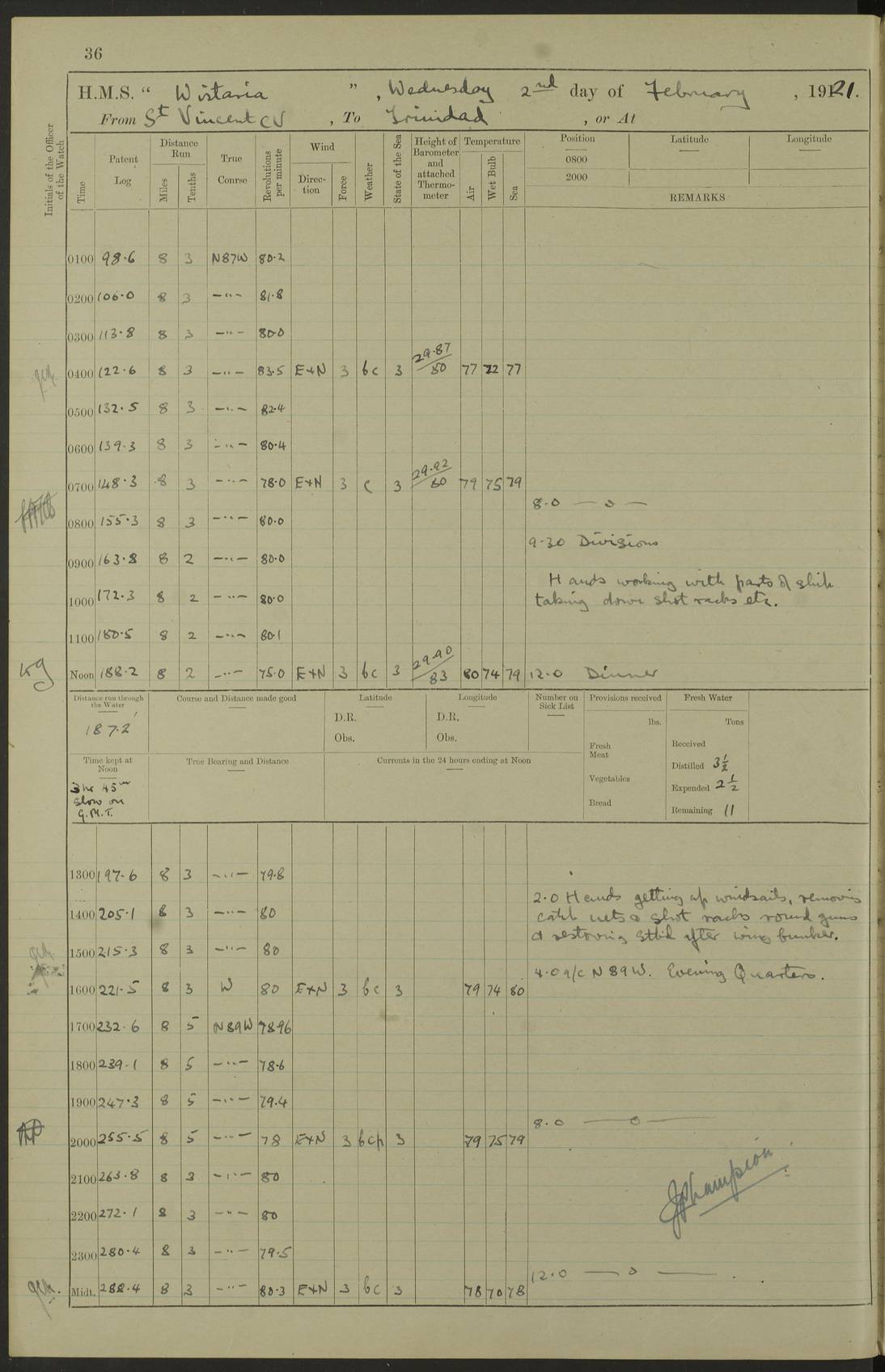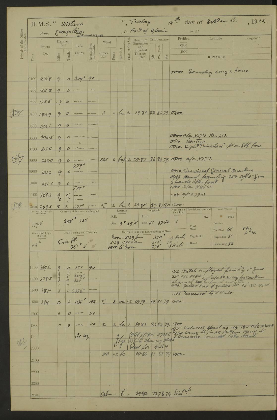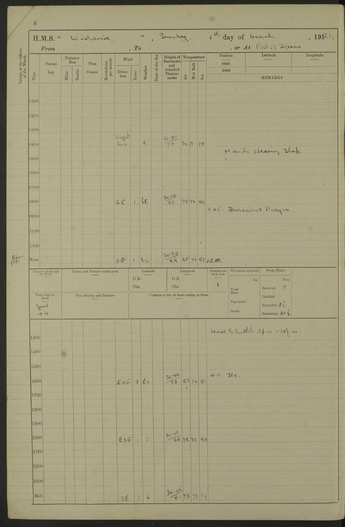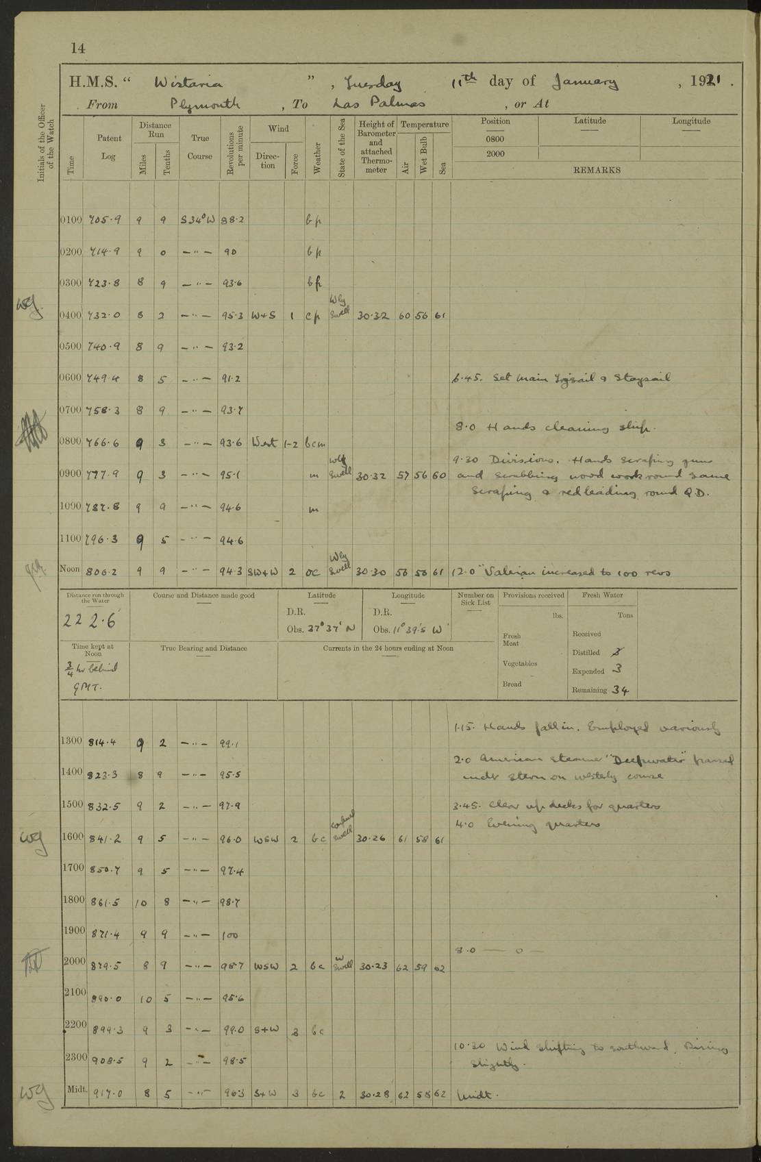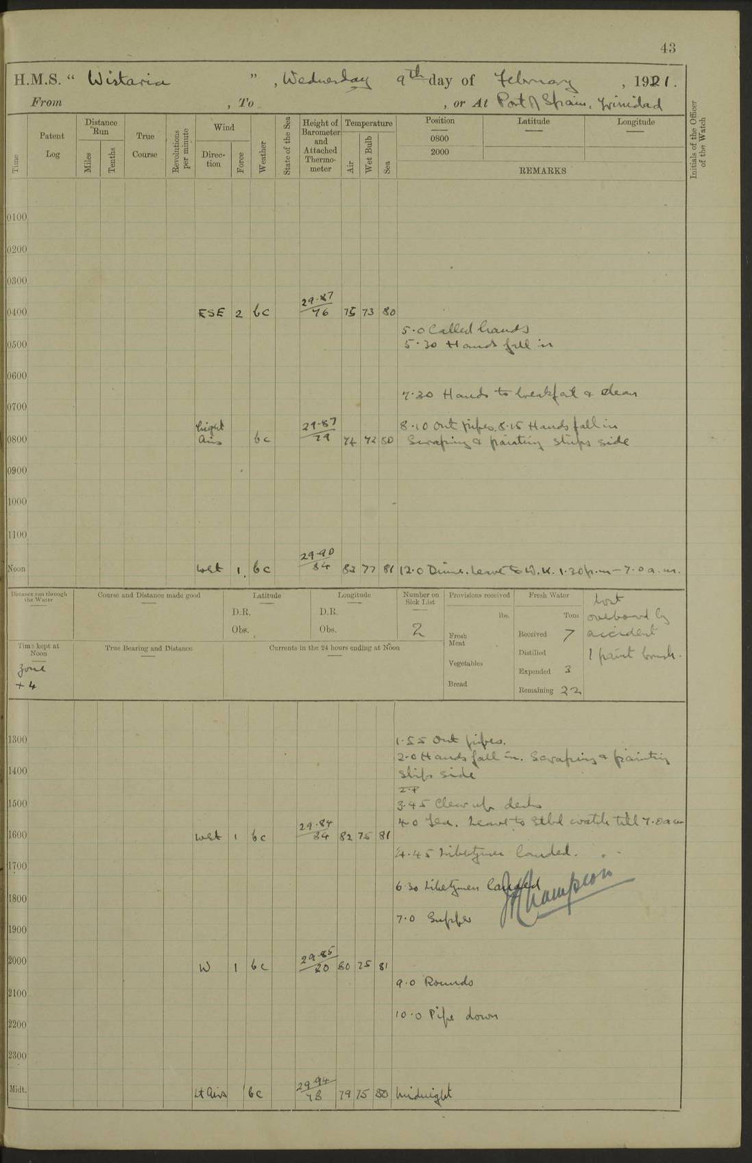 LOGS FOR MARCH 1921 4f73c9fea2fc8ea9030009a4: (https://s3.amazonaws.com:443/oldweather/ADM53-93259/0035_0.jpg) 4f73ca01a2fc8ea9030009ad: (https://s3.amazonaws.com:443/oldweather/ADM53-93260/0003_1.jpg) 1 March 1921 At Gulf of Paria [At San Fernando] Lat 10.38, Long -62.35 5.30am: Hands repairing target & cleaning ship [Repaired target & cleaned ship] [6.10am: Shortened in] [6.30am: Weighed & towed target for “Valerian”. Course SE, 6 knots] 6.53am: Weighed & proceeded. Course SE, 6 knots 7.50am: Stopped. Handed in target [Transferred target] 8.0am: Slipped target 9.15am: Carried out [4”] firing am: Hands painting inboard 11.05am: Came to with Starboard anchor 1½ shackles Anchor bearings: Farralla Rock S4W, Chagrin Hill S82E, Pierre Point N30E 1.15pm: Paid hands [monthly payment] 2.0pm: Hands painting & cleaning [ship] Number on sick list: - [Farralla Rock: perhaps misspelt Farrallon Rock] [Chagrin Hill: perhaps Mon Chagrin Hill] 4f73ca01a2fc8ea9030009ae: (https://s3.amazonaws.com:443/oldweather/ADM53-93260/0004_0.jpg) 2 March 1921 At Brighton Pier Lat 10.38, Long -62.35 8.30am: Weighed & proceeded to Brighton 9.40am: Let go Port anchor 2 shackles 10.30am: Sent provisions to “Valerian” Lost overboard by accident: Magazine Lewis Gun: One in number; Cartr. S.A. .303 belt: 47 in number 1.15pm: Landed liberty men 6.15pm: Liberty men returned. S. P. O. Edwards brought on board dead Number on sick list: 1.D.D. 4f73ca02a2fc8ea9030009af: (https://s3.amazonaws.com:443/oldweather/ADM53-93260/0004_1.jpg) H.M.S “Wistaria” at Trinidad. 3rd March 1921 Return of deaths on board H.M.S. “Wistaria” Date of death. 2nd March 1921. Name & Surname of Deceased. William Edwards. Sex. Male. Age. 27 years, 1 month. Rating. Stoker Petty Officer, Royal Navy. Nationality. English. Last place of Abode. H.M.S. “Wistaria”, lying off Brighton Pier, Trinidad. Cause of Death. Shock following rupture of spleen. 4f73ca02a2fc8ea9030009b0: (https://s3.amazonaws.com:443/oldweather/ADM53-93260/0005_0.jpg) 4f73ca03a2fc8ea9030009b1: (https://s3.amazonaws.com:443/oldweather/ADM53-93260/0005_1.jpg) 3 March 1921 At Port of Spain Lat 10.66, Long -61.55 5.30am: Weighed & proceeded to Port of Spain. Course N19E, 10 knots 8.0am: Came to with Starboard anchor, 1 shackles 9.55am: Discharged S.P.O. Edwards to Colonial Hospital, dead 3.30pm: Funeral Party & mourners landed 4.30pm: Half masted colours 5.30pm: Re-hoisted colours 6.30pm: Funeral parties returned 4f73ca03a2fc8ea9030009b2: (https://s3.amazonaws.com:443/oldweather/ADM53-93260/0006_0.jpg) 4 March 1921 At Port of Spain Lat 10.66, Long -61.55 5.55am: Weighed & proceeded. Course & speeds as required for battle practice 7.15am: Carried out battle practice 8.0am: Took target in tow for “Valerian” battle practice 8.30am: Set course for Port of Spain N25E, 8 knots 9.30am: Hauled in target 10.0am: Anchored & prepared divers to clear wire from rudder 10.30am: Wire cleaned. Weighed & proceeded. Target Capsized 11.45am: Righted target and proceeded 12.15pm: Came to Starboard anchor, 1 shackle 2.45pm: Hands up stanchions & respread awnings 3.30pm: Coal lighter secured alongside 5.40pm: Water boat secured alongside 4f73ca03a2fc8ea9030009b3: (https://s3.amazonaws.com:443/oldweather/ADM53-93260/0006_1.jpg) 5 March 1921 At Port of Spain Lat 10.66, Long -61.55 5.30am: Hands coal ship 7.0am: Received fresh provisions 10.45am: Finished coaling. Wash down upper decks 4.0pm: Evening Quarters. Read warrants 1-2-3-4 Number on sick list: 1 4f73ca04a2fc8ea9030009b4: (https://s3.amazonaws.com:443/oldweather/ADM53-93260/0007_0.jpg) 6 March 1921 At Port of Spain Lat 10.66, Long -61.55 9.45am: Divisions & prayers Number on sick list: 1 4f73ca04a2fc8ea9030009b5: (https://s3.amazonaws.com:443/oldweather/ADM53-93260/0007_1.jpg) 7 March 1921 At Port of Spain Lat 10.66, Long -61.55 6.30am: Hoisted boat 7.24am: Weighed & proceeded. S19W, 14 knots 9.30am: Anchored off Brighton Pier 10.0am: Held Court of Inquiry on death of S.P.O Edwards 1.0pm: Weighed & proceeded to Port of Spain. Course N19E, 14 knots 3.05pm: Anchored Number on sick list: 1 4f73ca04a2fc8ea9030009b6: (https://s3.amazonaws.com:443/oldweather/ADM53-93260/0008_0.jpg) 8 March 1921 At Port of Spain Lat 10.66, Long -61.55 7.50am: Shortened in 8.0am: Weighed & proceeded to Chaguaramas Bay at 12 knots 8.45am: Anchored 9.0am: All available seamen landed to haul up target. Sent provisions to “Valerian” 11.45am: Target party returned. Hoisted boats noon: Weighed & proceeded to Port of Spain at 12 knots 12.30pm: Anchored pm: Hands securing ship for sea 5.05pm: Colonel Glasgow arrived on board for passage to Jamaica 6.0pm: Weighed & proceeded at 11 knots. Course as required to pass through Bocas de Navios 7.0pm: Streamed Patent log 7.10pm: Chacachacare Lt abeam, 6 cables. Course N50W 7.47pm: Penas Point abeam [Boca de Navios: between Huevos and Chacachacare Islands. Also here] [Chacachacare Light: is exhibited from a white concrete tower, 30 feet high, on the northern end of the island] 4f73ca05a2fc8ea9030009b7: (https://s3.amazonaws.com:443/oldweather/ADM53-93260/0008_1.jpg) 9 March 1921 From Port of Spain, Trinidad, to Curaçoa Lat 11.36, Long -64.9 5.55am: Los Frayles Island abeam, 1 mile 6.35am: Altered course N77W. Cabo de la Isla abeam, 2 miles am: Hands scraping & painting inboard. Boats crews working about boats am: Turned 1st and 2nd whalers falls end for end pm: Hands painting, turning whaler falls end for end & scraping motor boat 6.0pm: Sighted Orchilla Isles N26W 9.05pm: Sighted El Rouke Lt N10W [Cabo de la Isla, also known as Cabo Negro] [El Rouke Lt: perhaps misspelt El Roque Light. A light was exhibited from a lighthouse on the northeast hill of El Roque] 4f73ca05a2fc8ea9030009b8: (https://s3.amazonaws.com:443/oldweather/ADM53-93260/0009_0.jpg) 10 March 1921 From Trinidad to Curaçoa and at Curaçoa Lat 10.66, Long -61.55 8.23am: Little Curaçoa Lt abeam 9.25am: Hauled in patent log 10.0am: Stopped for Port Health Off