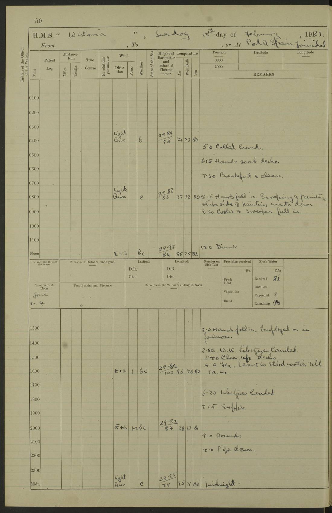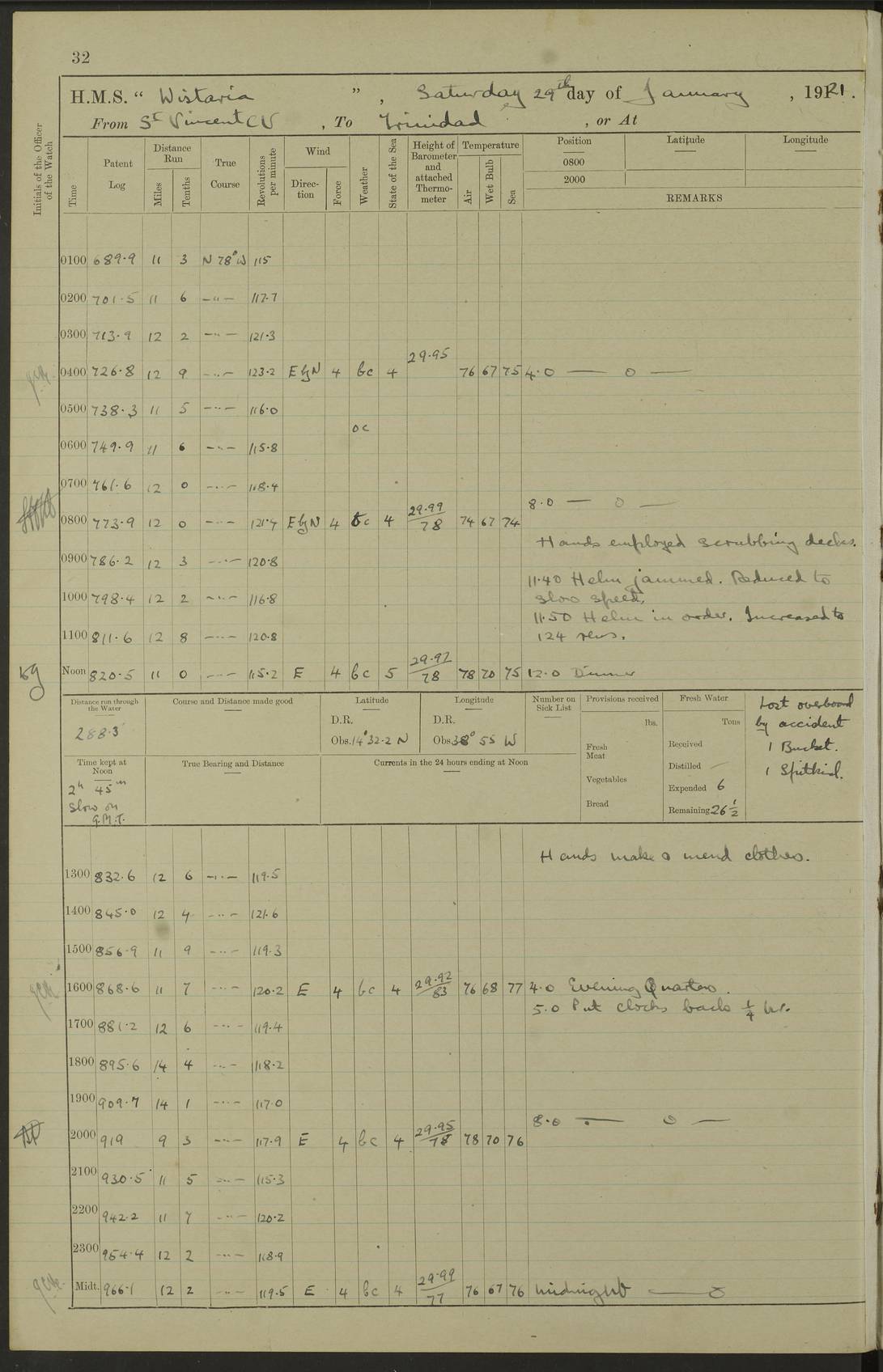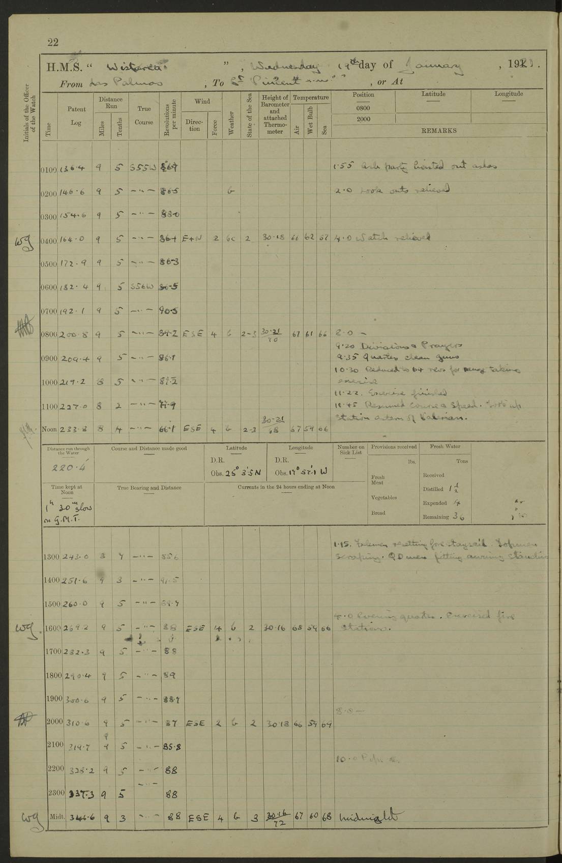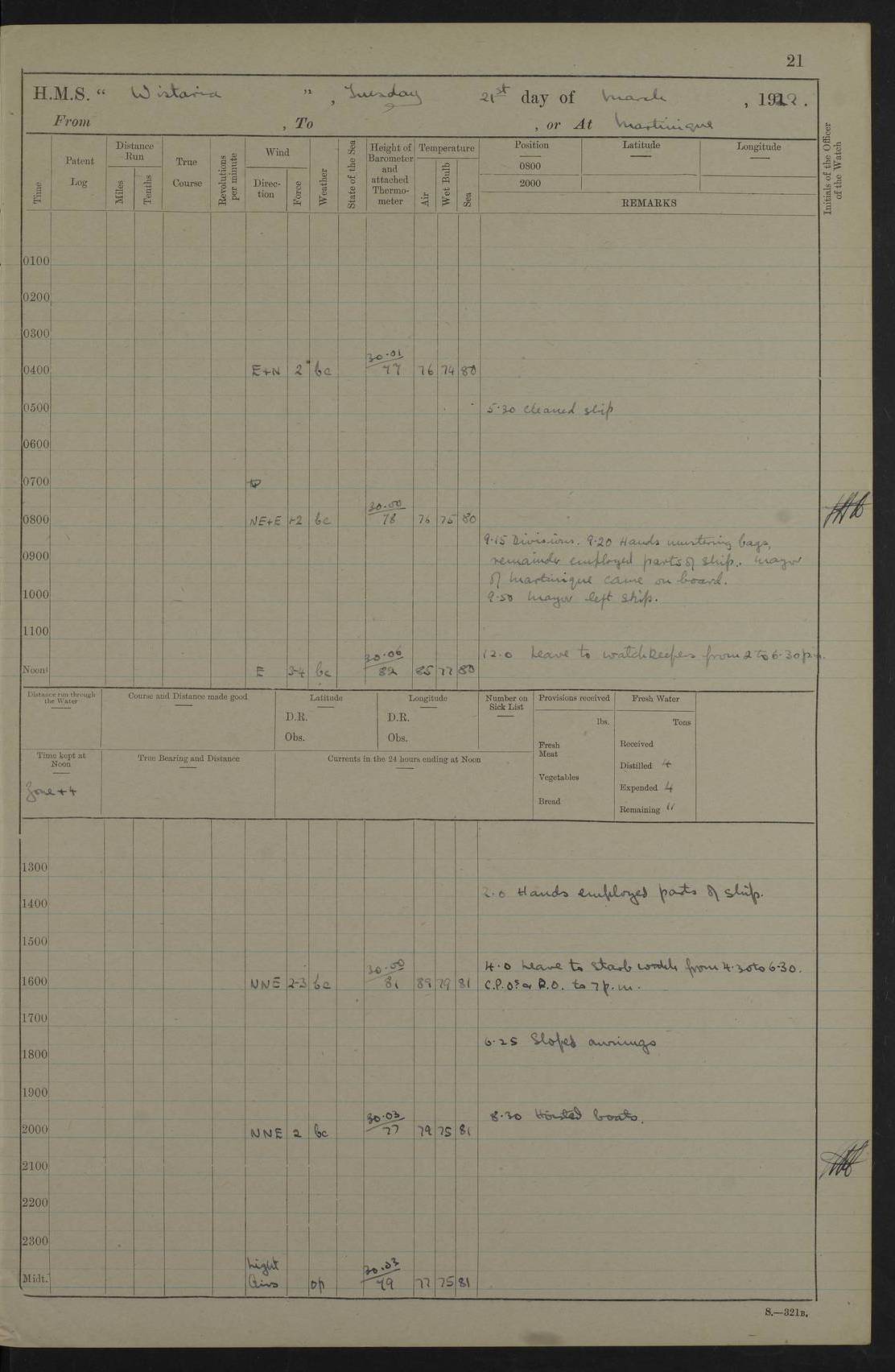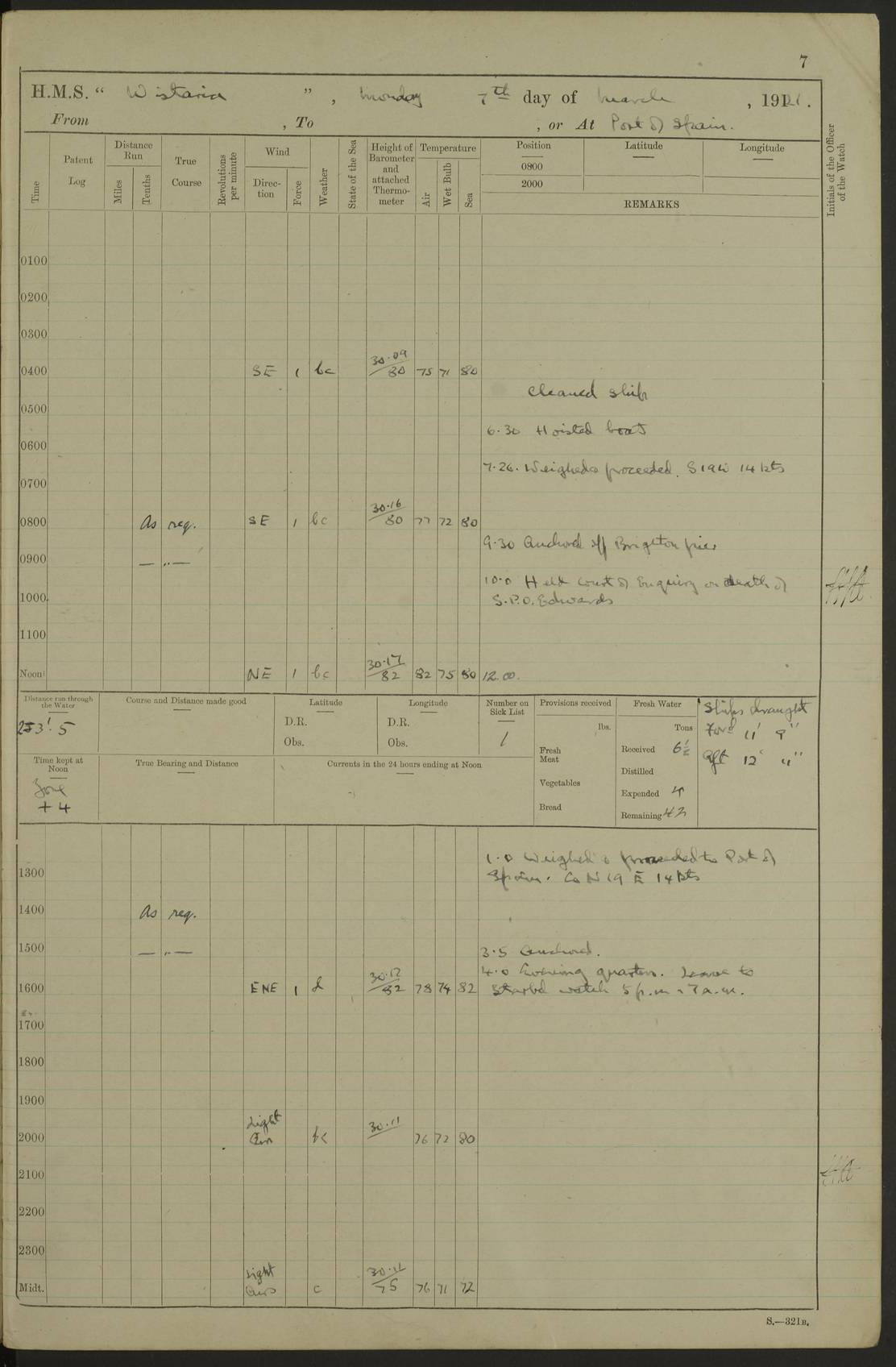LOGS FOR MARCH 1921 4f73c9fea2fc8ea9030009a4: (https://s3.amazonaws.com:443/oldweather/ADM53-93259/0035_0.jpg) 4f73ca01a2fc8ea9030009ad: (https://s3.amazonaws.com:443/oldweather/ADM53-93260/0003_1.jpg) 1 March 1921 At Gulf of Paria [At San Fernando] Lat 10.38, Long -62.35 5.30am: Hands repairing target & cleaning ship [Repaired target & cleaned ship] [6.10am: Shortened in] [6.30am: Weighed & towed target for “Valerian”. Course SE, 6 knots] 6.53am: Weighed & proceeded. Course SE, 6 knots 7.50am: Stopped. Handed in target [Transferred target] 8.0am: Slipped target 9.15am: Carried out [4”] firing am: Hands painting inboard 11.05am: Came to with Starboard anchor 1½ shackles Anchor bearings: Farralla Rock S4W, Chagrin Hill S82E, Pierre Point N30E 1.15pm: Paid hands [monthly payment] 2.0pm: Hands painting & cleaning [ship] Number on sick list: - [Farralla Rock: perhaps misspelt Farrallon Rock] [Chagrin Hill: perhaps Mon Chagrin Hill] 4f73ca01a2fc8ea9030009ae: (https://s3.amazonaws.com:443/oldweather/ADM53-93260/0004_0.jpg) 2 March 1921 At Brighton Pier Lat 10.38, Long -62.35 8.30am: Weighed & proceeded to Brighton 9.40am: Let go Port anchor 2 shackles 10.30am: Sent provisions to “Valerian” Lost overboard by accident: Magazine Lewis Gun: One in number; Cartr. S.A. .303 belt: 47 in number 1.15pm: Landed liberty men 6.15pm: Liberty men returned. S. P. O. Edwards brought on board dead Number on sick list: 1.D.D. 4f73ca02a2fc8ea9030009af: (https://s3.amazonaws.com:443/oldweather/ADM53-93260/0004_1.jpg) H.M.S “Wistaria” at Trinidad. 3rd March 1921 Return of deaths on board H.M.S. “Wistaria” Date of death. 2nd March 1921. Name & Surname of Deceased. William Edwards. Sex. Male. Age. 27 years, 1 month. Rating. Stoker Petty Officer, Royal Navy. Nationality. English. Last place of Abode. H.M.S. “Wistaria”, lying off Brighton Pier, Trinidad. Cause of Death. Shock following rupture of spleen. 4f73ca02a2fc8ea9030009b0: (https://s3.amazonaws.com:443/oldweather/ADM53-93260/0005_0.jpg) 4f73ca03a2fc8ea9030009b1: (https://s3.amazonaws.com:443/oldweather/ADM53-93260/0005_1.jpg) 3 March 1921 At Port of Spain Lat 10.66, Long -61.55 5.30am: Weighed & proceeded to Port of Spain. Course N19E, 10 knots 8.0am: Came to with Starboard anchor, 1 shackles 9.55am: Discharged S.P.O. Edwards to Colonial Hospital, dead 3.30pm: Funeral Party & mourners landed 4.30pm: Half masted colours 5.30pm: Re-hoisted colours 6.30pm: Funeral parties returned 4f73ca03a2fc8ea9030009b2: (https://s3.amazonaws.com:443/oldweather/ADM53-93260/0006_0.jpg) 4 March 1921 At Port of Spain Lat 10.66, Long -61.55 5.55am: Weighed & proceeded. Course & speeds as required for battle practice 7.15am: Carried out battle practice 8.0am: Took target in tow for “Valerian” battle practice 8.30am: Set course for Port of Spain N25E, 8 knots 9.30am: Hauled in target 10.0am: Anchored & prepared divers to clear wire from rudder 10.30am: Wire cleaned. Weighed & proceeded. Target Capsized 11.45am: Righted target and proceeded 12.15pm: Came to Starboard anchor, 1 shackle 2.45pm: Hands up stanchions & respread awnings 3.30pm: Coal lighter secured alongside 5.40pm: Water boat secured alongside 4f73ca03a2fc8ea9030009b3: (https://s3.amazonaws.com:443/oldweather/ADM53-93260/0006_1.jpg) 5 March 1921 At Port of Spain Lat 10.66, Long -61.55 5.30am: Hands coal ship 7.0am: Received fresh provisions 10.45am: Finished coaling. Wash down upper decks 4.0pm: Evening Quarters. Read warrants 1-2-3-4 Number on sick list: 1 4f73ca04a2fc8ea9030009b4: (https://s3.amazonaws.com:443/oldweather/ADM53-93260/0007_0.jpg) 6 March 1921 At Port of Spain Lat 10.66, Long -61.55 9.45am: Divisions & prayers Number on sick list: 1 4f73ca04a2fc8ea9030009b5: (https://s3.amazonaws.com:443/oldweather/ADM53-93260/0007_1.jpg) 7 March 1921 At Port of Spain Lat 10.66, Long -61.55 6.30am: Hoisted boat 7.24am: Weighed & proceeded. S19W, 14 knots 9.30am: Anchored off Brighton Pier 10.0am: Held Court of Inquiry on death of S.P.O Edwards 1.0pm: Weighed & proceeded to Port of Spain. Course N19E, 14 knots 3.05pm: Anchored Number on sick list: 1 4f73ca04a2fc8ea9030009b6: (https://s3.amazonaws.com:443/oldweather/ADM53-93260/0008_0.jpg) 8 March 1921 At Port of Spain Lat 10.66, Long -61.55 7.50am: Shortened in 8.0am: Weighed & proceeded to Chaguaramas Bay at 12 knots 8.45am: Anchored 9.0am: All available seamen landed to haul up target. Sent provisions to “Valerian” 11.45am: Target party returned. Hoisted boats noon: Weighed & proceeded to Port of Spain at 12 knots 12.30pm: Anchored pm: Hands securing ship for sea 5.05pm: Colonel Glasgow arrived on board for passage to Jamaica 6.0pm: Weighed & proceeded at 11 knots. Course as required to pass through Bocas de Navios 7.0pm: Streamed Patent log 7.10pm: Chacachacare Lt abeam, 6 cables. Course N50W 7.47pm: Penas Point abeam [Boca de Navios: between Huevos and Chacachacare Islands. Also here] [Chacachacare Light: is exhibited from a white concrete tower, 30 feet high, on the northern end of the island] 4f73ca05a2fc8ea9030009b7: (https://s3.amazonaws.com:443/oldweather/ADM53-93260/0008_1.jpg) 9 March 1921 From Port of Spain, Trinidad, to Curaçoa Lat 11.36, Long -64.9 5.55am: Los Frayles Island abeam, 1 mile 6.35am: Altered course N77W. Cabo de la Isla abeam, 2 miles am: Hands scraping & painting inboard. Boats crews working about boats am: Turned 1st and 2nd whalers falls end for end pm: Hands painting, turning whaler falls end for end & scraping motor boat 6.0pm: Sighted Orchilla Isles N26W 9.05pm: Sighted El Rouke Lt N10W [Cabo de la Isla, also known as Cabo Negro] [El Rouke Lt: perhaps misspelt El Roque Light. A light was exhibited from a lighthouse on the northeast hill of El Roque] 4f73ca05a2fc8ea9030009b8: (https://s3.amazonaws.com:443/oldweather/ADM53-93260/0009_0.jpg) 10 March 1921 From Trinidad to Curaçoa and at Curaçoa Lat 10.66, Long -61.55 8.23am: Little Curaçoa Lt abeam 9.25am: Hauled in patent log 10.0am: Stopped for Port Health Off