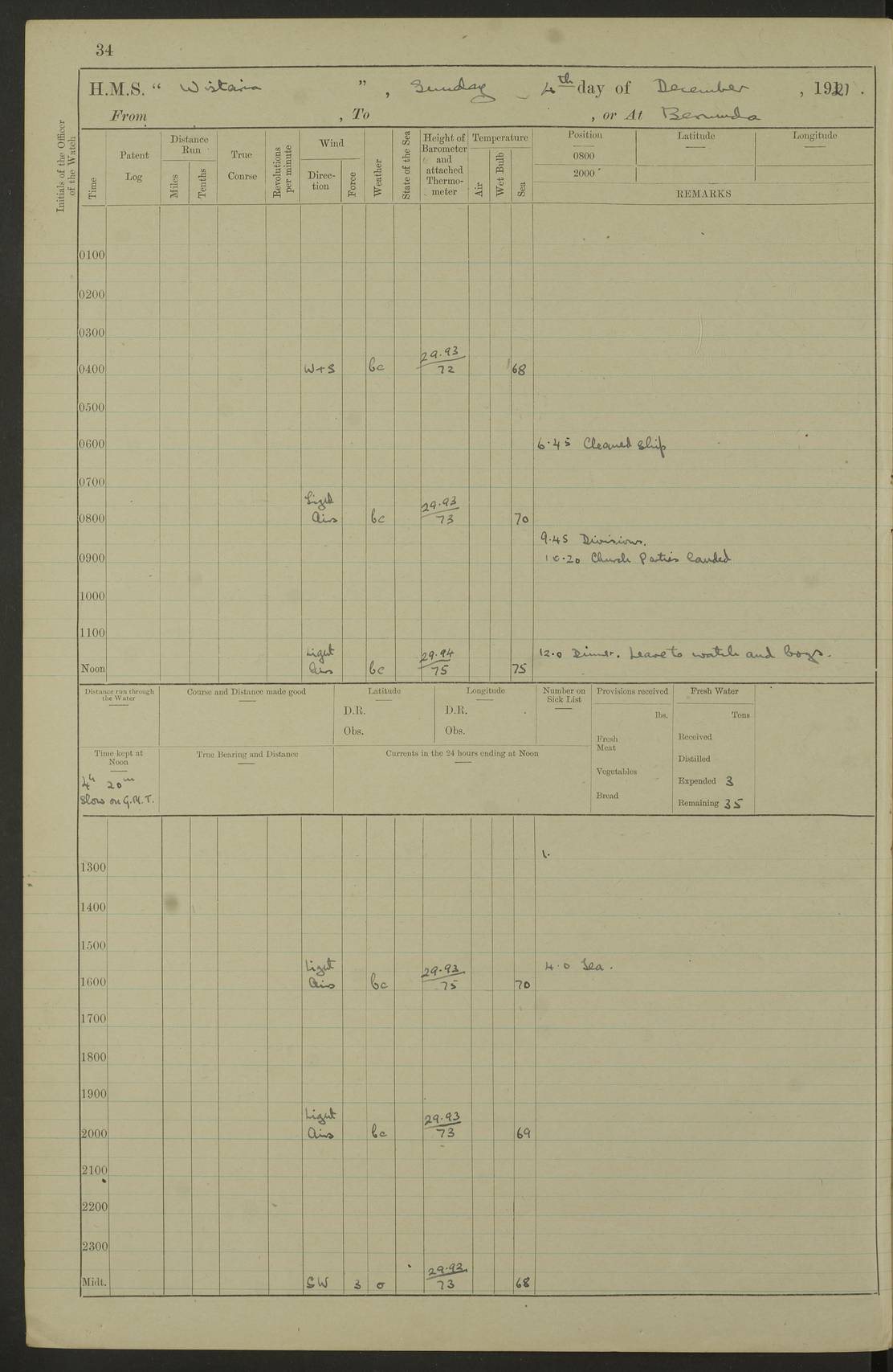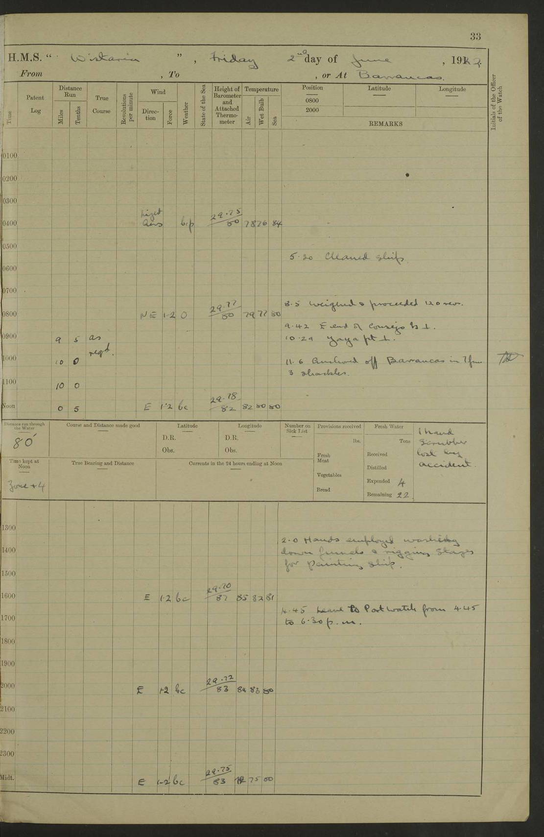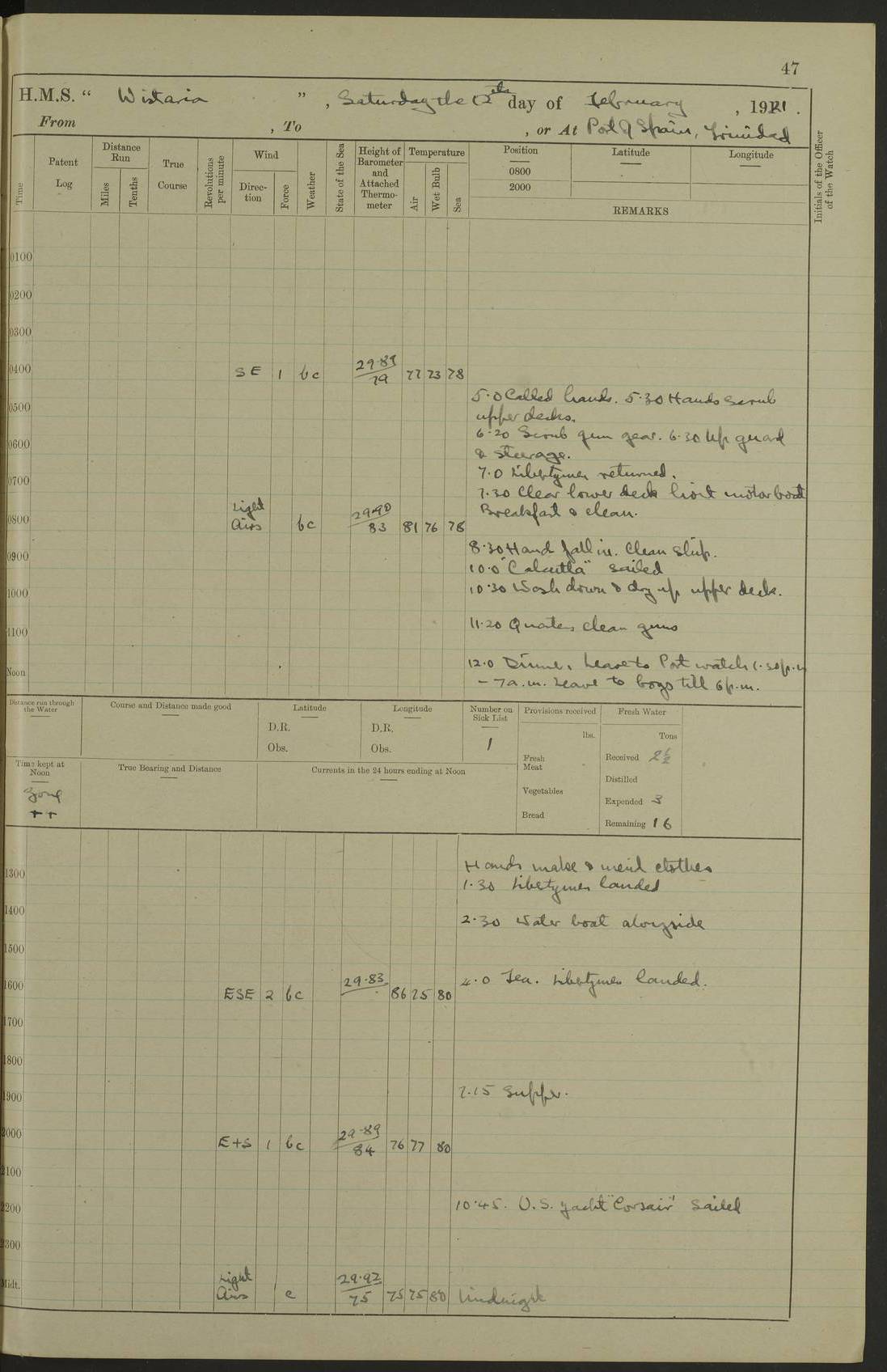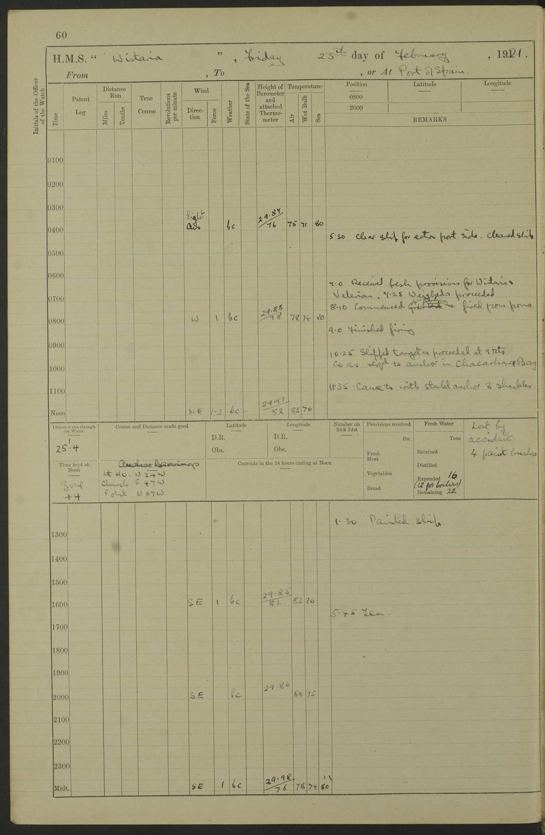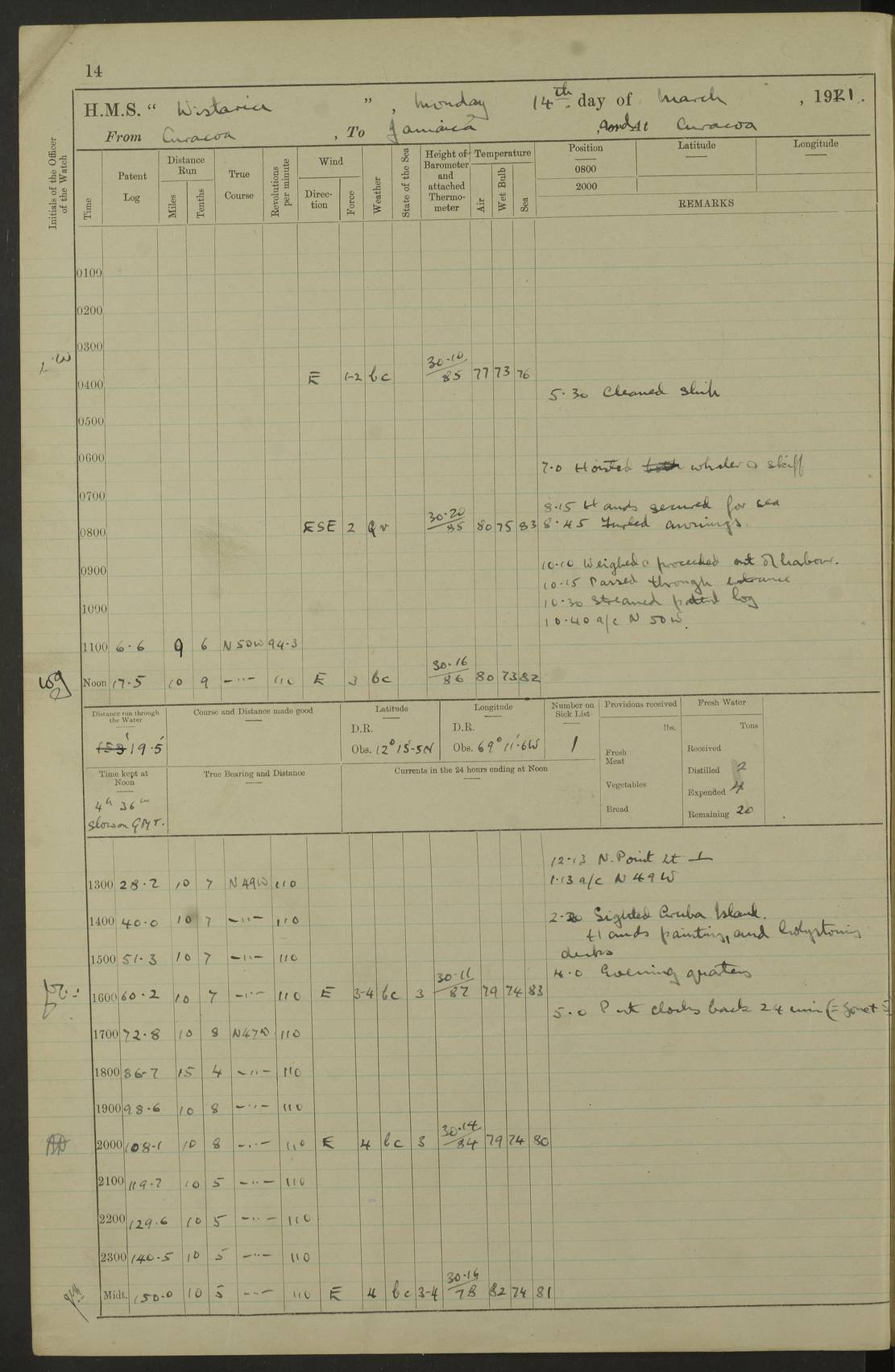 LOGS FOR MARCH 1921 4f73c9fea2fc8ea9030009a4: (https://s3.amazonaws.com:443/oldweather/ADM53-93259/0035_0.jpg) 4f73ca01a2fc8ea9030009ad: (https://s3.amazonaws.com:443/oldweather/ADM53-93260/0003_1.jpg) 1 March 1921 At Gulf of Paria [At San Fernando] Lat 10.38, Long -62.35 5.30am: Hands repairing target & cleaning ship [Repaired target & cleaned ship] [6.10am: Shortened in] [6.30am: Weighed & towed target for “Valerian”. Course SE, 6 knots] 6.53am: Weighed & proceeded. Course SE, 6 knots 7.50am: Stopped. Handed in target [Transferred target] 8.0am: Slipped target 9.15am: Carried out [4”] firing am: Hands painting inboard 11.05am: Came to with Starboard anchor 1½ shackles Anchor bearings: Farralla Rock S4W, Chagrin Hill S82E, Pierre Point N30E 1.15pm: Paid hands [monthly payment] 2.0pm: Hands painting & cleaning [ship] Number on sick list: - [Farralla Rock: perhaps misspelt Farrallon Rock] [Chagrin Hill: perhaps Mon Chagrin Hill] 4f73ca01a2fc8ea9030009ae: (https://s3.amazonaws.com:443/oldweather/ADM53-93260/0004_0.jpg) 2 March 1921 At Brighton Pier Lat 10.38, Long -62.35 8.30am: Weighed & proceeded to Brighton 9.40am: Let go Port anchor 2 shackles 10.30am: Sent provisions to “Valerian” Lost overboard by accident: Magazine Lewis Gun: One in number; Cartr. S.A. .303 belt: 47 in number 1.15pm: Landed liberty men 6.15pm: Liberty men returned. S. P. O. Edwards brought on board dead Number on sick list: 1.D.D. 4f73ca02a2fc8ea9030009af: (https://s3.amazonaws.com:443/oldweather/ADM53-93260/0004_1.jpg) H.M.S “Wistaria” at Trinidad. 3rd March 1921 Return of deaths on board H.M.S. “Wistaria” Date of death. 2nd March 1921. Name & Surname of Deceased. William Edwards. Sex. Male. Age. 27 years, 1 month. Rating. Stoker Petty Officer, Royal Navy. Nationality. English. Last place of Abode. H.M.S. “Wistaria”, lying off Brighton Pier, Trinidad. Cause of Death. Shock following rupture of spleen. 4f73ca02a2fc8ea9030009b0: (https://s3.amazonaws.com:443/oldweather/ADM53-93260/0005_0.jpg) 4f73ca03a2fc8ea9030009b1: (https://s3.amazonaws.com:443/oldweather/ADM53-93260/0005_1.jpg) 3 March 1921 At Port of Spain Lat 10.66, Long -61.55 5.30am: Weighed & proceeded to Port of Spain. Course N19E, 10 knots 8.0am: Came to with Starboard anchor, 1 shackles 9.55am: Discharged S.P.O. Edwards to Colonial Hospital, dead 3.30pm: Funeral Party & mourners landed 4.30pm: Half masted colours 5.30pm: Re-hoisted colours 6.30pm: Funeral parties returned 4f73ca03a2fc8ea9030009b2: (https://s3.amazonaws.com:443/oldweather/ADM53-93260/0006_0.jpg) 4 March 1921 At Port of Spain Lat 10.66, Long -61.55 5.55am: Weighed & proceeded. Course & speeds as required for battle practice 7.15am: Carried out battle practice 8.0am: Took target in tow for “Valerian” battle practice 8.30am: Set course for Port of Spain N25E, 8 knots 9.30am: Hauled in target 10.0am: Anchored & prepared divers to clear wire from rudder 10.30am: Wire cleaned. Weighed & proceeded. Target Capsized 11.45am: Righted target and proceeded 12.15pm: Came to Starboard anchor, 1 shackle 2.45pm: Hands up stanchions & respread awnings 3.30pm: Coal lighter secured alongside 5.40pm: Water boat secured alongside 4f73ca03a2fc8ea9030009b3: (https://s3.amazonaws.com:443/oldweather/ADM53-93260/0006_1.jpg) 5 March 1921 At Port of Spain Lat 10.66, Long -61.55 5.30am: Hands coal ship 7.0am: Received fresh provisions 10.45am: Finished coaling. Wash down upper decks 4.0pm: Evening Quarters. Read warrants 1-2-3-4 Number on sick list: 1 4f73ca04a2fc8ea9030009b4: (https://s3.amazonaws.com:443/oldweather/ADM53-93260/0007_0.jpg) 6 March 1921 At Port of Spain Lat 10.66, Long -61.55 9.45am: Divisions & prayers Number on sick list: 1 4f73ca04a2fc8ea9030009b5: (https://s3.amazonaws.com:443/oldweather/ADM53-93260/0007_1.jpg) 7 March 1921 At Port of Spain Lat 10.66, Long -61.55 6.30am: Hoisted boat 7.24am: Weighed & proceeded. S19W, 14 knots 9.30am: Anchored off Brighton Pier 10.0am: Held Court of Inquiry on death of S.P.O Edwards 1.0pm: Weighed & proceeded to Port of Spain. Course N19E, 14 knots 3.05pm: Anchored Number on sick list: 1 4f73ca04a2fc8ea9030009b6: (https://s3.amazonaws.com:443/oldweather/ADM53-93260/0008_0.jpg) 8 March 1921 At Port of Spain Lat 10.66, Long -61.55 7.50am: Shortened in 8.0am: Weighed & proceeded to Chaguaramas Bay at 12 knots 8.45am: Anchored 9.0am: All available seamen landed to haul up target. Sent provisions to “Valerian” 11.45am: Target party returned. Hoisted boats noon: Weighed & proceeded to Port of Spain at 12 knots 12.30pm: Anchored pm: Hands securing ship for sea 5.05pm: Colonel Glasgow arrived on board for passage to Jamaica 6.0pm: Weighed & proceeded at 11 knots. Course as required to pass through Bocas de Navios 7.0pm: Streamed Patent log 7.10pm: Chacachacare Lt abeam, 6 cables. Course N50W 7.47pm: Penas Point abeam [Boca de Navios: between Huevos and Chacachacare Islands. Also here] [Chacachacare Light: is exhibited from a white concrete tower, 30 feet high, on the northern end of the island] 4f73ca05a2fc8ea9030009b7: (https://s3.amazonaws.com:443/oldweather/ADM53-93260/0008_1.jpg) 9 March 1921 From Port of Spain, Trinidad, to Curaçoa Lat 11.36, Long -64.9 5.55am: Los Frayles Island abeam, 1 mile 6.35am: Altered course N77W. Cabo de la Isla abeam, 2 miles am: Hands scraping & painting inboard. Boats crews working about boats am: Turned 1st and 2nd whalers falls end for end pm: Hands painting, turning whaler falls end for end & scraping motor boat 6.0pm: Sighted Orchilla Isles N26W 9.05pm: Sighted El Rouke Lt N10W [Cabo de la Isla, also known as Cabo Negro] [El Rouke Lt: perhaps misspelt El Roque Light. A light was exhibited from a lighthouse on the northeast hill of El Roque] 4f73ca05a2fc8ea9030009b8: (https://s3.amazonaws.com:443/oldweather/ADM53-93260/0009_0.jpg) 10 March 1921 From Trinidad to Curaçoa and at Curaçoa Lat 10.66, Long -61.55 8.23am: Little Curaçoa Lt abeam 9.25am: Hauled in patent log 10.0am: Stopped for Port Health Off