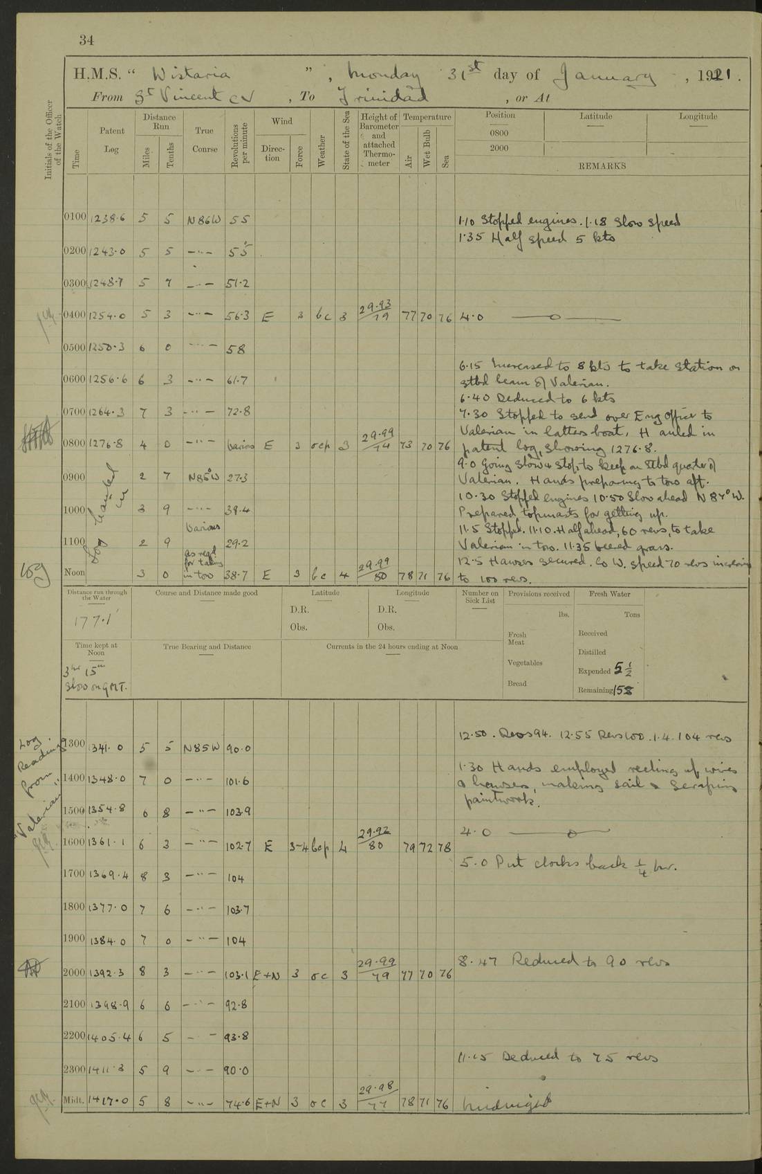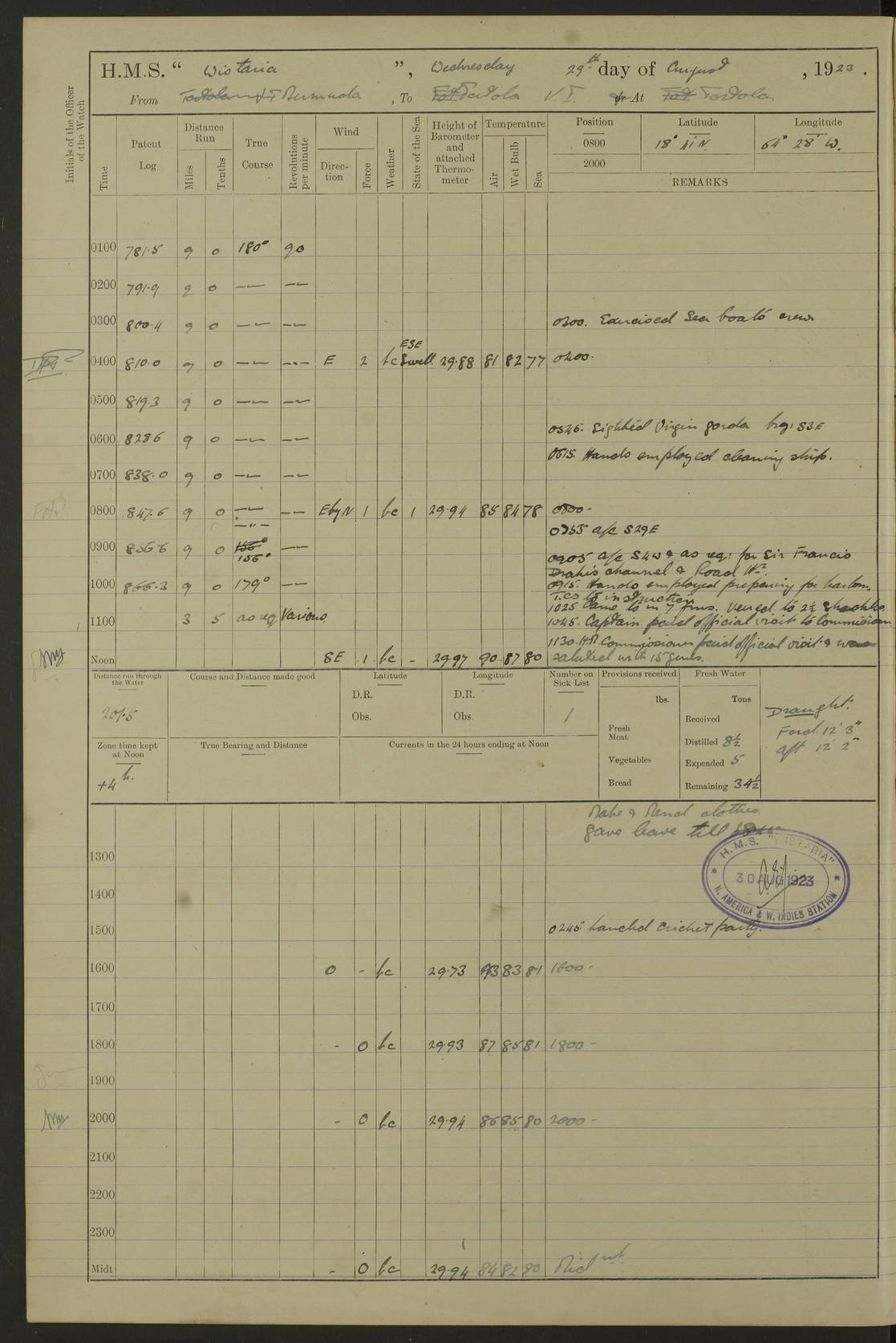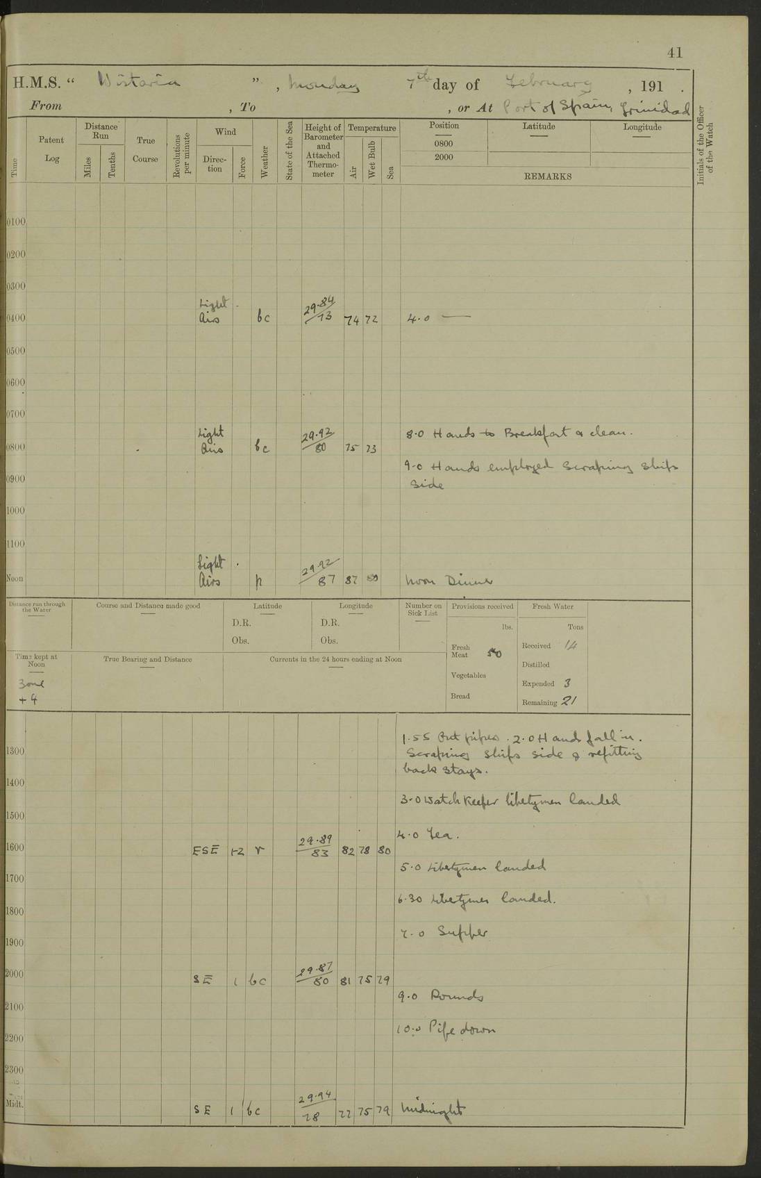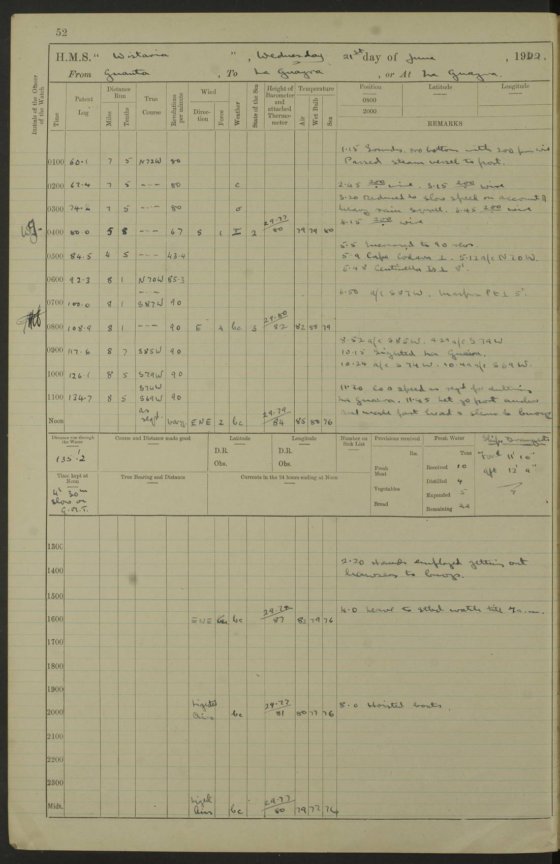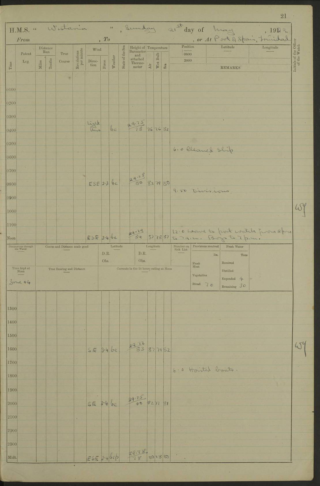 LOGS FOR MARCH 1921 4f73c9fea2fc8ea9030009a4: (https://s3.amazonaws.com:443/oldweather/ADM53-93259/0035_0.jpg) 4f73ca01a2fc8ea9030009ad: (https://s3.amazonaws.com:443/oldweather/ADM53-93260/0003_1.jpg) 1 March 1921 At Gulf of Paria [At San Fernando] Lat 10.38, Long -62.35 5.30am: Hands repairing target & cleaning ship [Repaired target & cleaned ship] [6.10am: Shortened in] [6.30am: Weighed & towed target for “Valerian”. Course SE, 6 knots] 6.53am: Weighed & proceeded. Course SE, 6 knots 7.50am: Stopped. Handed in target [Transferred target] 8.0am: Slipped target 9.15am: Carried out [4”] firing am: Hands painting inboard 11.05am: Came to with Starboard anchor 1½ shackles Anchor bearings: Farralla Rock S4W, Chagrin Hill S82E, Pierre Point N30E 1.15pm: Paid hands [monthly payment] 2.0pm: Hands painting & cleaning [ship] Number on sick list: - [Farralla Rock: perhaps misspelt Farrallon Rock] [Chagrin Hill: perhaps Mon Chagrin Hill] 4f73ca01a2fc8ea9030009ae: (https://s3.amazonaws.com:443/oldweather/ADM53-93260/0004_0.jpg) 2 March 1921 At Brighton Pier Lat 10.38, Long -62.35 8.30am: Weighed & proceeded to Brighton 9.40am: Let go Port anchor 2 shackles 10.30am: Sent provisions to “Valerian” Lost overboard by accident: Magazine Lewis Gun: One in number; Cartr. S.A. .303 belt: 47 in number 1.15pm: Landed liberty men 6.15pm: Liberty men returned. S. P. O. Edwards brought on board dead Number on sick list: 1.D.D. 4f73ca02a2fc8ea9030009af: (https://s3.amazonaws.com:443/oldweather/ADM53-93260/0004_1.jpg) H.M.S “Wistaria” at Trinidad. 3rd March 1921 Return of deaths on board H.M.S. “Wistaria” Date of death. 2nd March 1921. Name & Surname of Deceased. William Edwards. Sex. Male. Age. 27 years, 1 month. Rating. Stoker Petty Officer, Royal Navy. Nationality. English. Last place of Abode. H.M.S. “Wistaria”, lying off Brighton Pier, Trinidad. Cause of Death. Shock following rupture of spleen. 4f73ca02a2fc8ea9030009b0: (https://s3.amazonaws.com:443/oldweather/ADM53-93260/0005_0.jpg) 4f73ca03a2fc8ea9030009b1: (https://s3.amazonaws.com:443/oldweather/ADM53-93260/0005_1.jpg) 3 March 1921 At Port of Spain Lat 10.66, Long -61.55 5.30am: Weighed & proceeded to Port of Spain. Course N19E, 10 knots 8.0am: Came to with Starboard anchor, 1 shackles 9.55am: Discharged S.P.O. Edwards to Colonial Hospital, dead 3.30pm: Funeral Party & mourners landed 4.30pm: Half masted colours 5.30pm: Re-hoisted colours 6.30pm: Funeral parties returned 4f73ca03a2fc8ea9030009b2: (https://s3.amazonaws.com:443/oldweather/ADM53-93260/0006_0.jpg) 4 March 1921 At Port of Spain Lat 10.66, Long -61.55 5.55am: Weighed & proceeded. Course & speeds as required for battle practice 7.15am: Carried out battle practice 8.0am: Took target in tow for “Valerian” battle practice 8.30am: Set course for Port of Spain N25E, 8 knots 9.30am: Hauled in target 10.0am: Anchored & prepared divers to clear wire from rudder 10.30am: Wire cleaned. Weighed & proceeded. Target Capsized 11.45am: Righted target and proceeded 12.15pm: Came to Starboard anchor, 1 shackle 2.45pm: Hands up stanchions & respread awnings 3.30pm: Coal lighter secured alongside 5.40pm: Water boat secured alongside 4f73ca03a2fc8ea9030009b3: (https://s3.amazonaws.com:443/oldweather/ADM53-93260/0006_1.jpg) 5 March 1921 At Port of Spain Lat 10.66, Long -61.55 5.30am: Hands coal ship 7.0am: Received fresh provisions 10.45am: Finished coaling. Wash down upper decks 4.0pm: Evening Quarters. Read warrants 1-2-3-4 Number on sick list: 1 4f73ca04a2fc8ea9030009b4: (https://s3.amazonaws.com:443/oldweather/ADM53-93260/0007_0.jpg) 6 March 1921 At Port of Spain Lat 10.66, Long -61.55 9.45am: Divisions & prayers Number on sick list: 1 4f73ca04a2fc8ea9030009b5: (https://s3.amazonaws.com:443/oldweather/ADM53-93260/0007_1.jpg) 7 March 1921 At Port of Spain Lat 10.66, Long -61.55 6.30am: Hoisted boat 7.24am: Weighed & proceeded. S19W, 14 knots 9.30am: Anchored off Brighton Pier 10.0am: Held Court of Inquiry on death of S.P.O Edwards 1.0pm: Weighed & proceeded to Port of Spain. Course N19E, 14 knots 3.05pm: Anchored Number on sick list: 1 4f73ca04a2fc8ea9030009b6: (https://s3.amazonaws.com:443/oldweather/ADM53-93260/0008_0.jpg) 8 March 1921 At Port of Spain Lat 10.66, Long -61.55 7.50am: Shortened in 8.0am: Weighed & proceeded to Chaguaramas Bay at 12 knots 8.45am: Anchored 9.0am: All available seamen landed to haul up target. Sent provisions to “Valerian” 11.45am: Target party returned. Hoisted boats noon: Weighed & proceeded to Port of Spain at 12 knots 12.30pm: Anchored pm: Hands securing ship for sea 5.05pm: Colonel Glasgow arrived on board for passage to Jamaica 6.0pm: Weighed & proceeded at 11 knots. Course as required to pass through Bocas de Navios 7.0pm: Streamed Patent log 7.10pm: Chacachacare Lt abeam, 6 cables. Course N50W 7.47pm: Penas Point abeam [Boca de Navios: between Huevos and Chacachacare Islands. Also here] [Chacachacare Light: is exhibited from a white concrete tower, 30 feet high, on the northern end of the island] 4f73ca05a2fc8ea9030009b7: (https://s3.amazonaws.com:443/oldweather/ADM53-93260/0008_1.jpg) 9 March 1921 From Port of Spain, Trinidad, to Curaçoa Lat 11.36, Long -64.9 5.55am: Los Frayles Island abeam, 1 mile 6.35am: Altered course N77W. Cabo de la Isla abeam, 2 miles am: Hands scraping & painting inboard. Boats crews working about boats am: Turned 1st and 2nd whalers falls end for end pm: Hands painting, turning whaler falls end for end & scraping motor boat 6.0pm: Sighted Orchilla Isles N26W 9.05pm: Sighted El Rouke Lt N10W [Cabo de la Isla, also known as Cabo Negro] [El Rouke Lt: perhaps misspelt El Roque Light. A light was exhibited from a lighthouse on the northeast hill of El Roque] 4f73ca05a2fc8ea9030009b8: (https://s3.amazonaws.com:443/oldweather/ADM53-93260/0009_0.jpg) 10 March 1921 From Trinidad to Curaçoa and at Curaçoa Lat 10.66, Long -61.55 8.23am: Little Curaçoa Lt abeam 9.25am: Hauled in patent log 10.0am: Stopped for Port Health Off