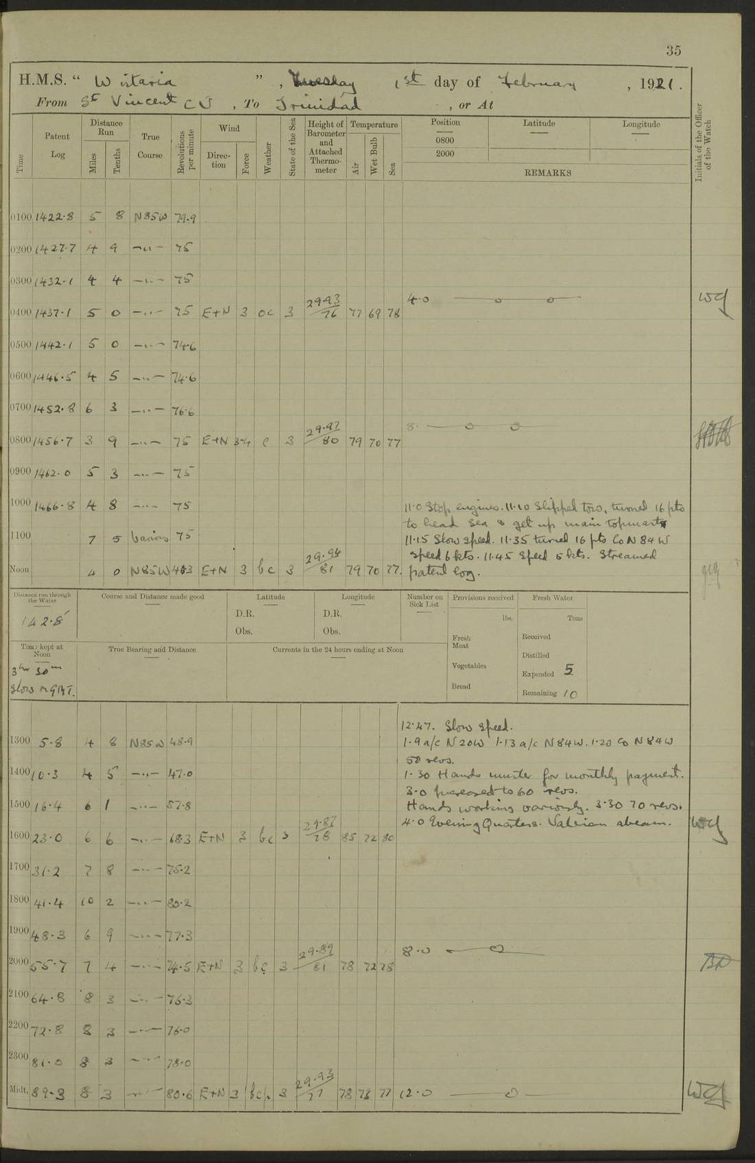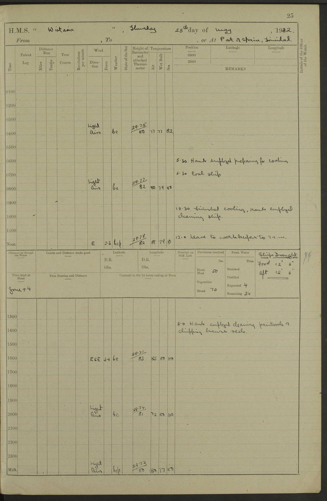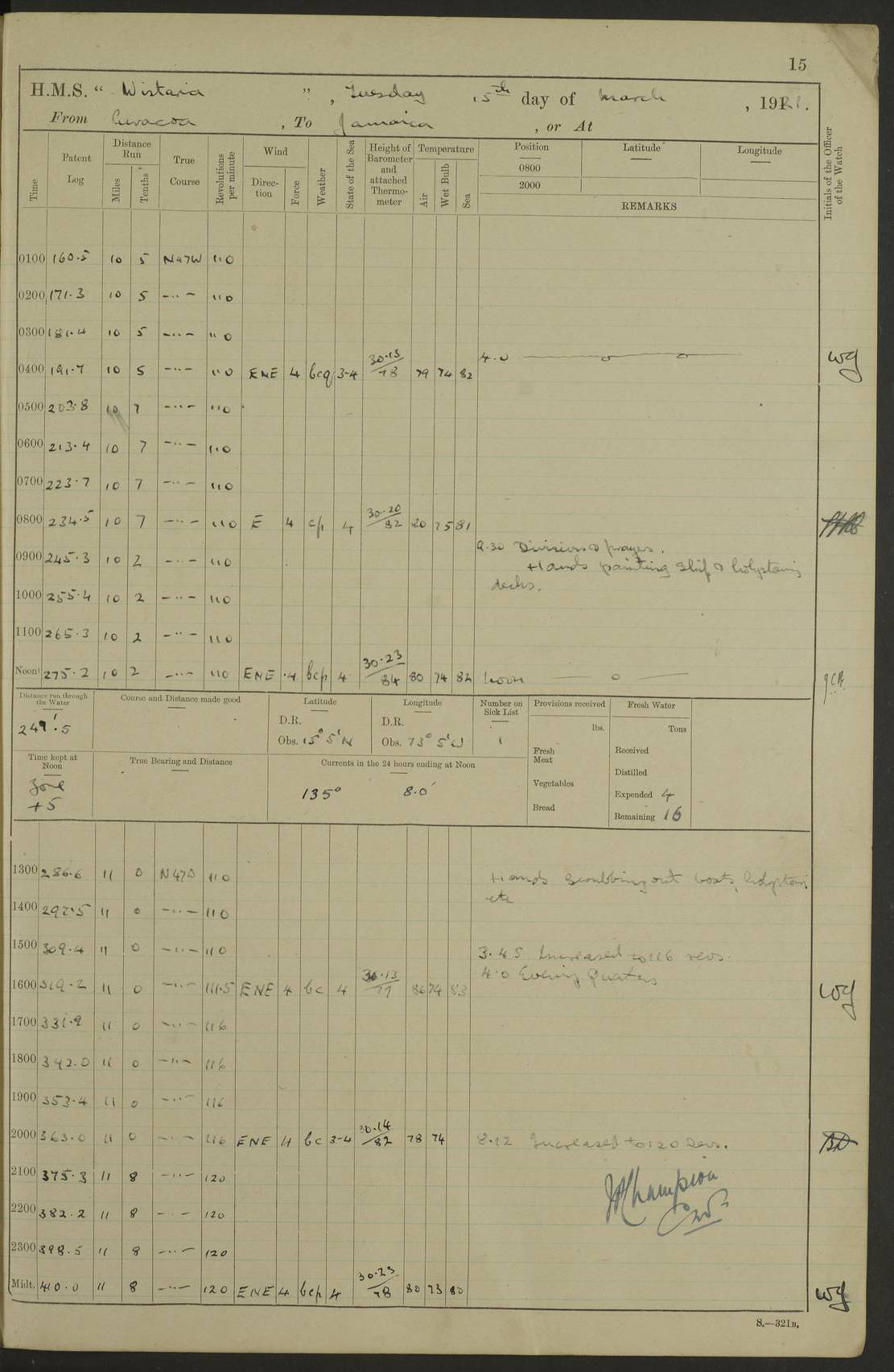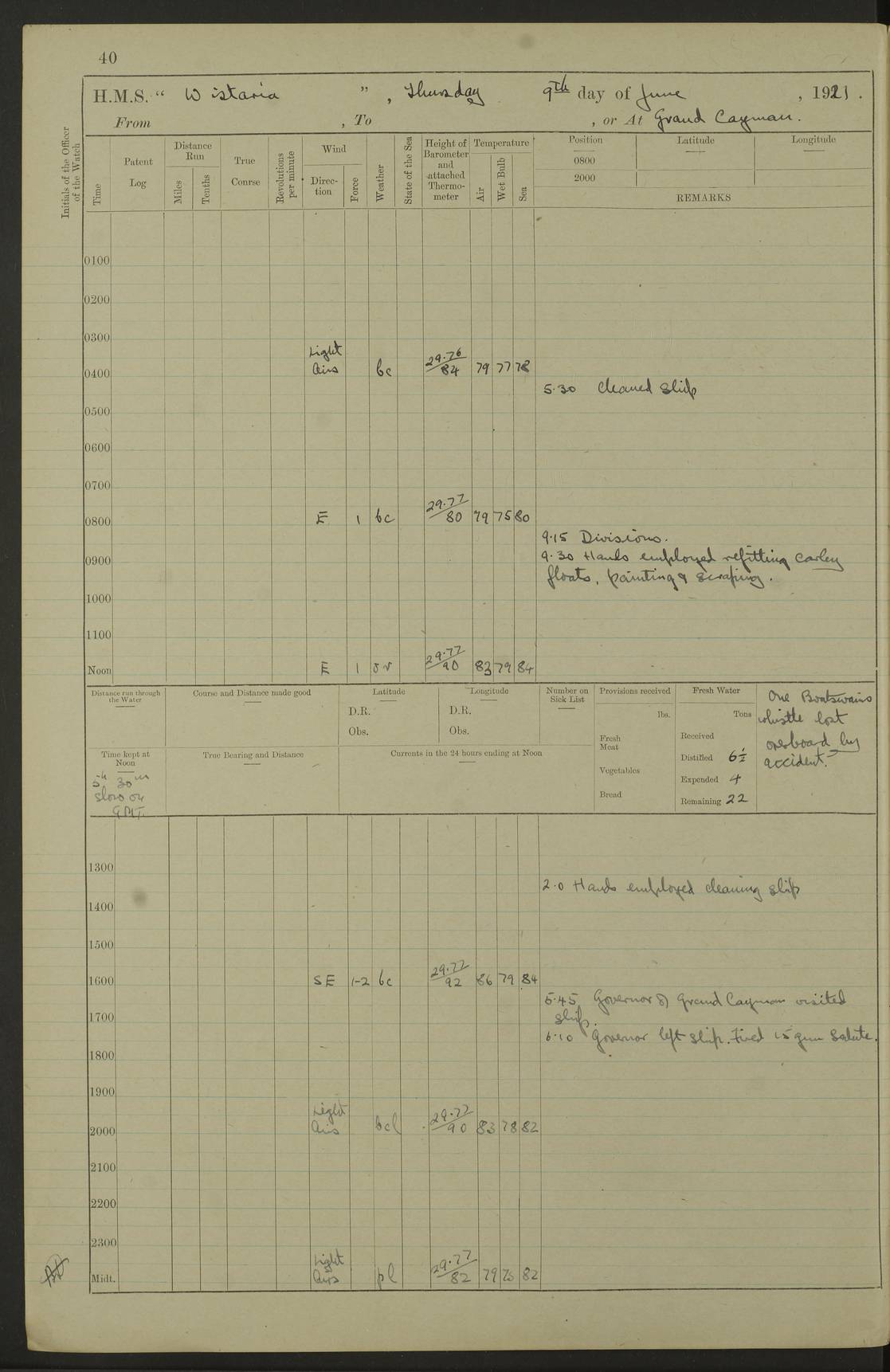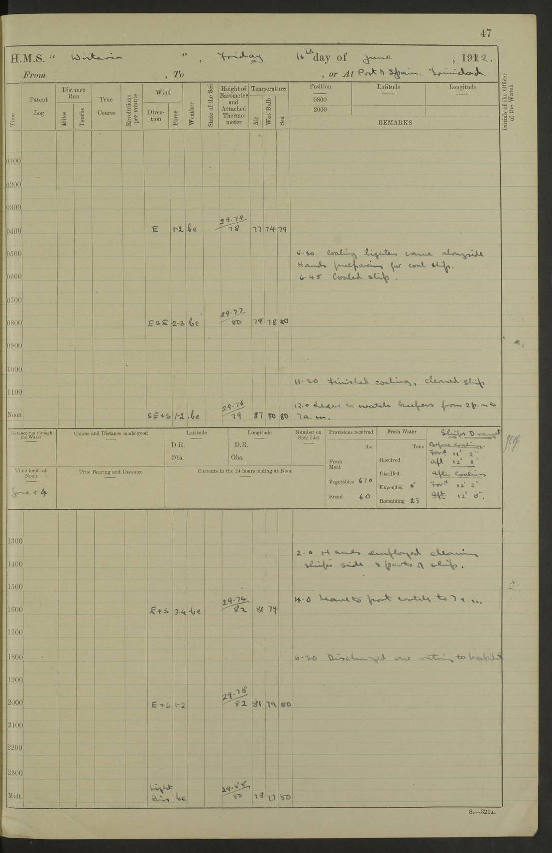 LOGS FOR MARCH 1921 4f73c9fea2fc8ea9030009a4: (https://s3.amazonaws.com:443/oldweather/ADM53-93259/0035_0.jpg) 4f73ca01a2fc8ea9030009ad: (https://s3.amazonaws.com:443/oldweather/ADM53-93260/0003_1.jpg) 1 March 1921 At Gulf of Paria [At San Fernando] Lat 10.38, Long -62.35 5.30am: Hands repairing target & cleaning ship [Repaired target & cleaned ship] [6.10am: Shortened in] [6.30am: Weighed & towed target for “Valerian”. Course SE, 6 knots] 6.53am: Weighed & proceeded. Course SE, 6 knots 7.50am: Stopped. Handed in target [Transferred target] 8.0am: Slipped target 9.15am: Carried out [4”] firing am: Hands painting inboard 11.05am: Came to with Starboard anchor 1½ shackles Anchor bearings: Farralla Rock S4W, Chagrin Hill S82E, Pierre Point N30E 1.15pm: Paid hands [monthly payment] 2.0pm: Hands painting & cleaning [ship] Number on sick list: - [Farralla Rock: perhaps misspelt Farrallon Rock] [Chagrin Hill: perhaps Mon Chagrin Hill] 4f73ca01a2fc8ea9030009ae: (https://s3.amazonaws.com:443/oldweather/ADM53-93260/0004_0.jpg) 2 March 1921 At Brighton Pier Lat 10.38, Long -62.35 8.30am: Weighed & proceeded to Brighton 9.40am: Let go Port anchor 2 shackles 10.30am: Sent provisions to “Valerian” Lost overboard by accident: Magazine Lewis Gun: One in number; Cartr. S.A. .303 belt: 47 in number 1.15pm: Landed liberty men 6.15pm: Liberty men returned. S. P. O. Edwards brought on board dead Number on sick list: 1.D.D. 4f73ca02a2fc8ea9030009af: (https://s3.amazonaws.com:443/oldweather/ADM53-93260/0004_1.jpg) H.M.S “Wistaria” at Trinidad. 3rd March 1921 Return of deaths on board H.M.S. “Wistaria” Date of death. 2nd March 1921. Name & Surname of Deceased. William Edwards. Sex. Male. Age. 27 years, 1 month. Rating. Stoker Petty Officer, Royal Navy. Nationality. English. Last place of Abode. H.M.S. “Wistaria”, lying off Brighton Pier, Trinidad. Cause of Death. Shock following rupture of spleen. 4f73ca02a2fc8ea9030009b0: (https://s3.amazonaws.com:443/oldweather/ADM53-93260/0005_0.jpg) 4f73ca03a2fc8ea9030009b1: (https://s3.amazonaws.com:443/oldweather/ADM53-93260/0005_1.jpg) 3 March 1921 At Port of Spain Lat 10.66, Long -61.55 5.30am: Weighed & proceeded to Port of Spain. Course N19E, 10 knots 8.0am: Came to with Starboard anchor, 1 shackles 9.55am: Discharged S.P.O. Edwards to Colonial Hospital, dead 3.30pm: Funeral Party & mourners landed 4.30pm: Half masted colours 5.30pm: Re-hoisted colours 6.30pm: Funeral parties returned 4f73ca03a2fc8ea9030009b2: (https://s3.amazonaws.com:443/oldweather/ADM53-93260/0006_0.jpg) 4 March 1921 At Port of Spain Lat 10.66, Long -61.55 5.55am: Weighed & proceeded. Course & speeds as required for battle practice 7.15am: Carried out battle practice 8.0am: Took target in tow for “Valerian” battle practice 8.30am: Set course for Port of Spain N25E, 8 knots 9.30am: Hauled in target 10.0am: Anchored & prepared divers to clear wire from rudder 10.30am: Wire cleaned. Weighed & proceeded. Target Capsized 11.45am: Righted target and proceeded 12.15pm: Came to Starboard anchor, 1 shackle 2.45pm: Hands up stanchions & respread awnings 3.30pm: Coal lighter secured alongside 5.40pm: Water boat secured alongside 4f73ca03a2fc8ea9030009b3: (https://s3.amazonaws.com:443/oldweather/ADM53-93260/0006_1.jpg) 5 March 1921 At Port of Spain Lat 10.66, Long -61.55 5.30am: Hands coal ship 7.0am: Received fresh provisions 10.45am: Finished coaling. Wash down upper decks 4.0pm: Evening Quarters. Read warrants 1-2-3-4 Number on sick list: 1 4f73ca04a2fc8ea9030009b4: (https://s3.amazonaws.com:443/oldweather/ADM53-93260/0007_0.jpg) 6 March 1921 At Port of Spain Lat 10.66, Long -61.55 9.45am: Divisions & prayers Number on sick list: 1 4f73ca04a2fc8ea9030009b5: (https://s3.amazonaws.com:443/oldweather/ADM53-93260/0007_1.jpg) 7 March 1921 At Port of Spain Lat 10.66, Long -61.55 6.30am: Hoisted boat 7.24am: Weighed & proceeded. S19W, 14 knots 9.30am: Anchored off Brighton Pier 10.0am: Held Court of Inquiry on death of S.P.O Edwards 1.0pm: Weighed & proceeded to Port of Spain. Course N19E, 14 knots 3.05pm: Anchored Number on sick list: 1 4f73ca04a2fc8ea9030009b6: (https://s3.amazonaws.com:443/oldweather/ADM53-93260/0008_0.jpg) 8 March 1921 At Port of Spain Lat 10.66, Long -61.55 7.50am: Shortened in 8.0am: Weighed & proceeded to Chaguaramas Bay at 12 knots 8.45am: Anchored 9.0am: All available seamen landed to haul up target. Sent provisions to “Valerian” 11.45am: Target party returned. Hoisted boats noon: Weighed & proceeded to Port of Spain at 12 knots 12.30pm: Anchored pm: Hands securing ship for sea 5.05pm: Colonel Glasgow arrived on board for passage to Jamaica 6.0pm: Weighed & proceeded at 11 knots. Course as required to pass through Bocas de Navios 7.0pm: Streamed Patent log 7.10pm: Chacachacare Lt abeam, 6 cables. Course N50W 7.47pm: Penas Point abeam [Boca de Navios: between Huevos and Chacachacare Islands. Also here] [Chacachacare Light: is exhibited from a white concrete tower, 30 feet high, on the northern end of the island] 4f73ca05a2fc8ea9030009b7: (https://s3.amazonaws.com:443/oldweather/ADM53-93260/0008_1.jpg) 9 March 1921 From Port of Spain, Trinidad, to Curaçoa Lat 11.36, Long -64.9 5.55am: Los Frayles Island abeam, 1 mile 6.35am: Altered course N77W. Cabo de la Isla abeam, 2 miles am: Hands scraping & painting inboard. Boats crews working about boats am: Turned 1st and 2nd whalers falls end for end pm: Hands painting, turning whaler falls end for end & scraping motor boat 6.0pm: Sighted Orchilla Isles N26W 9.05pm: Sighted El Rouke Lt N10W [Cabo de la Isla, also known as Cabo Negro] [El Rouke Lt: perhaps misspelt El Roque Light. A light was exhibited from a lighthouse on the northeast hill of El Roque] 4f73ca05a2fc8ea9030009b8: (https://s3.amazonaws.com:443/oldweather/ADM53-93260/0009_0.jpg) 10 March 1921 From Trinidad to Curaçoa and at Curaçoa Lat 10.66, Long -61.55 8.23am: Little Curaçoa Lt abeam 9.25am: Hauled in patent log 10.0am: Stopped for Port Health Off