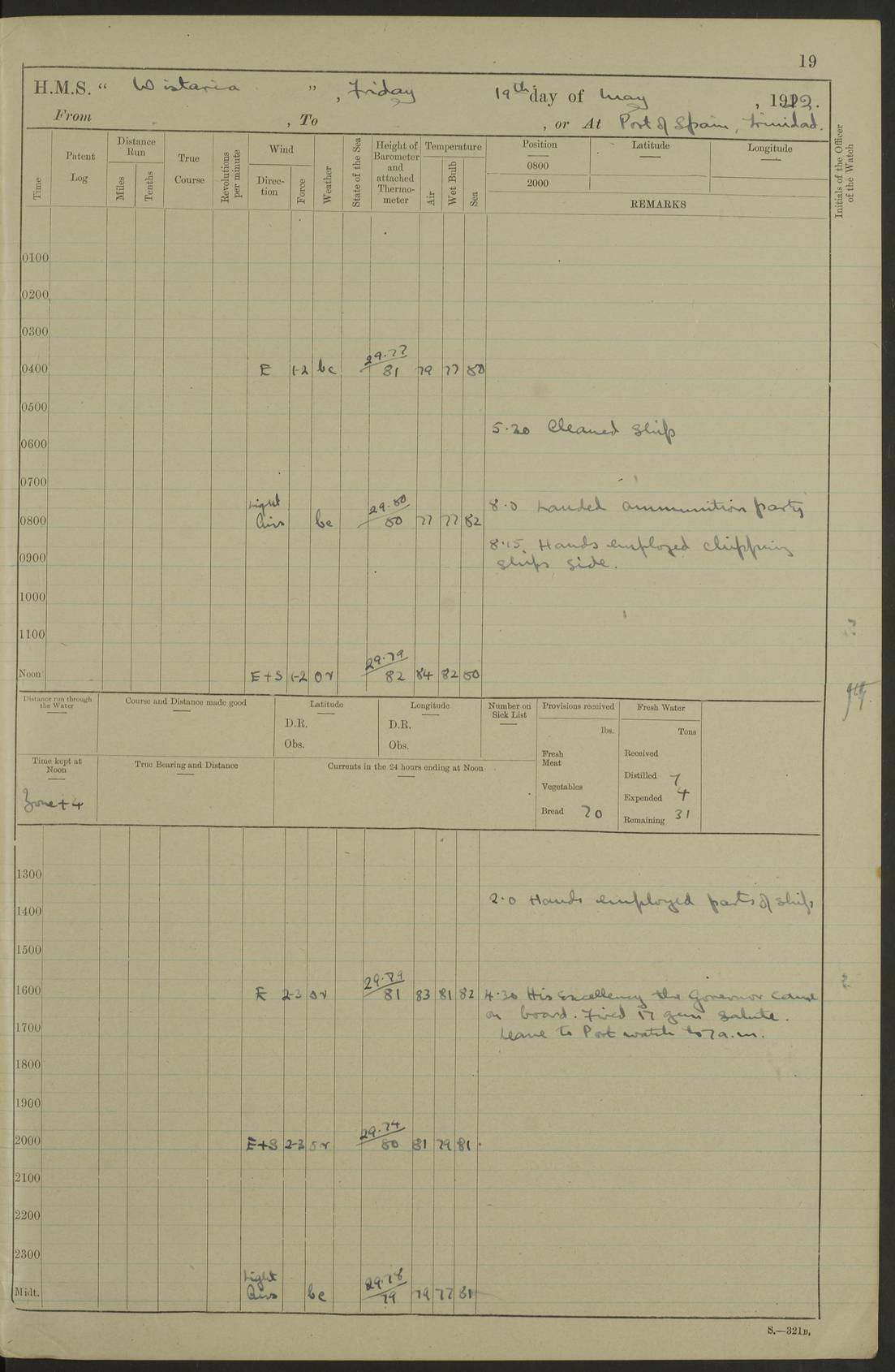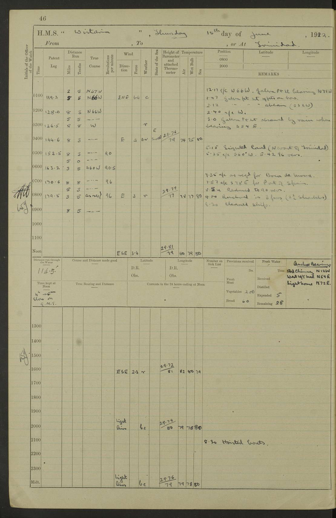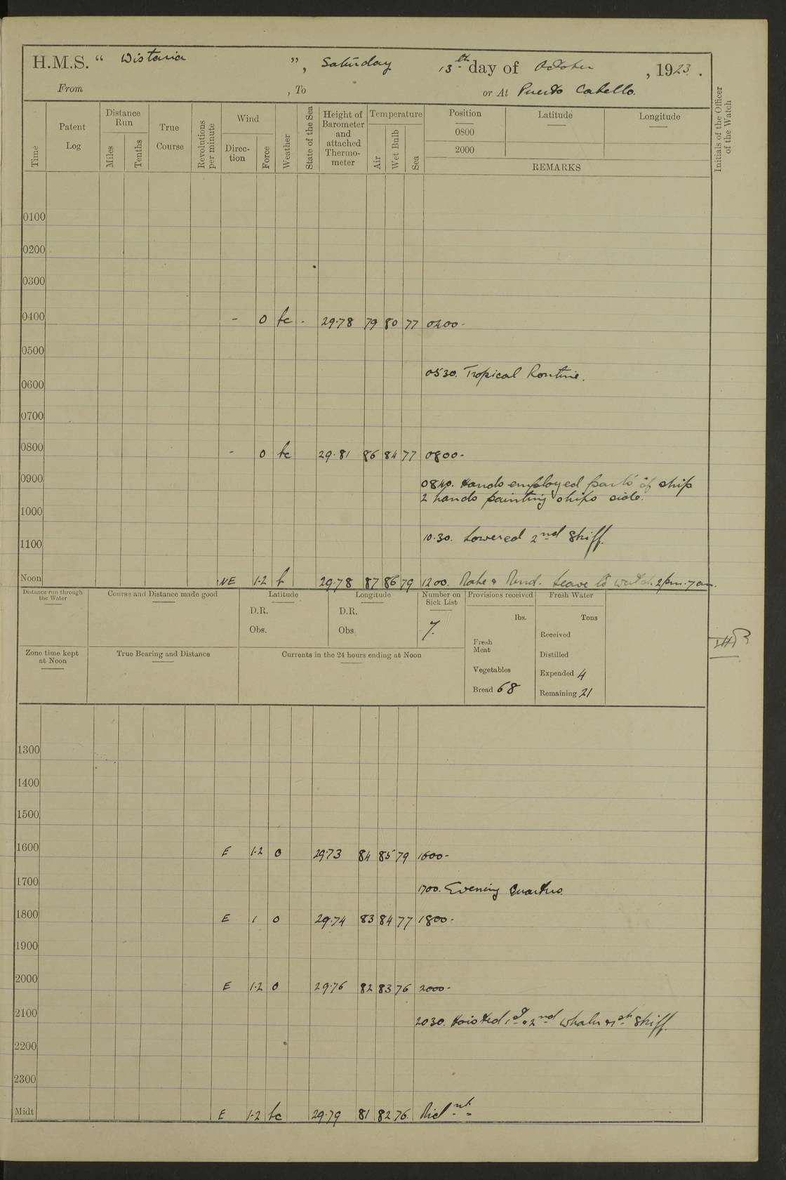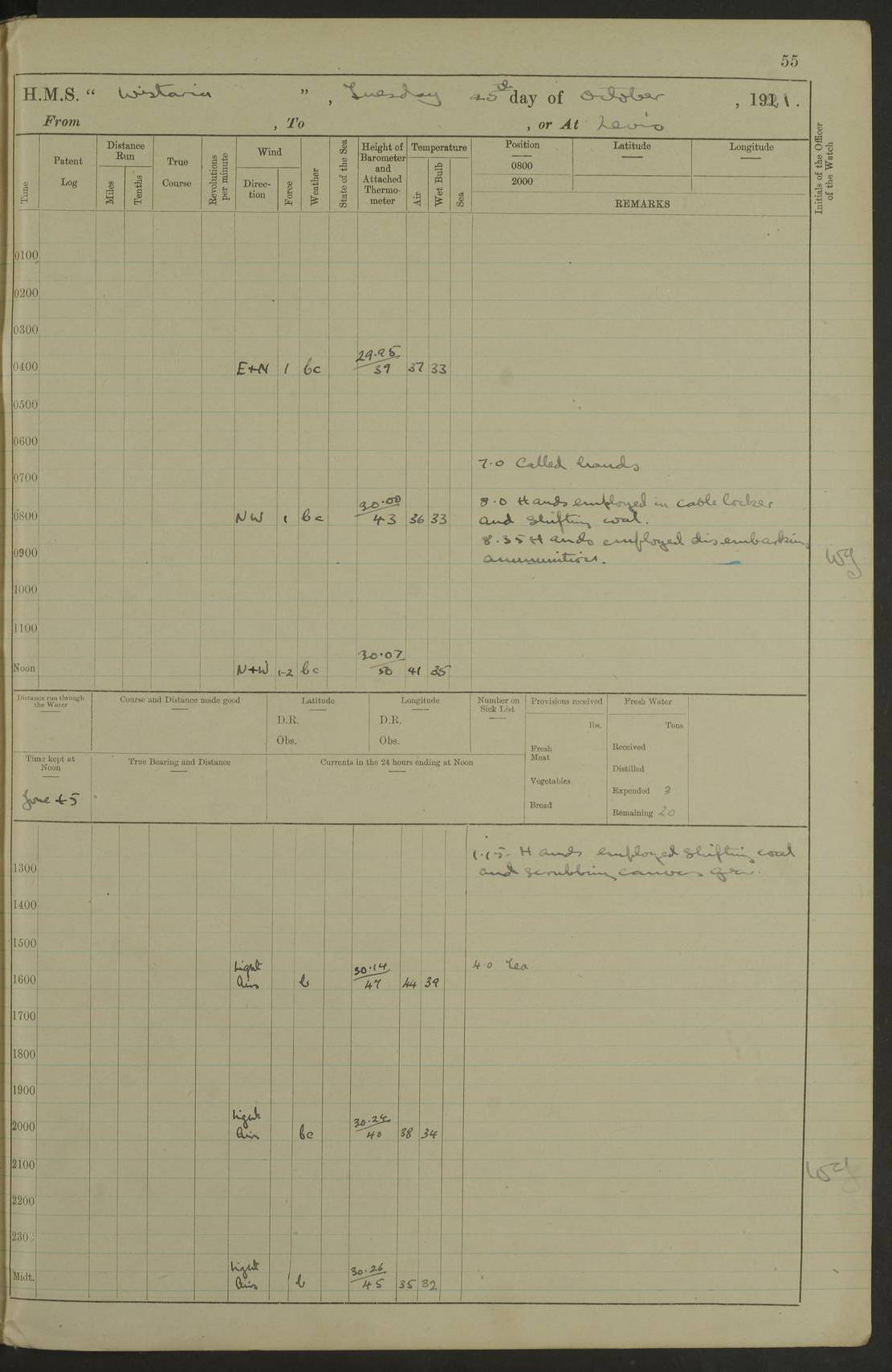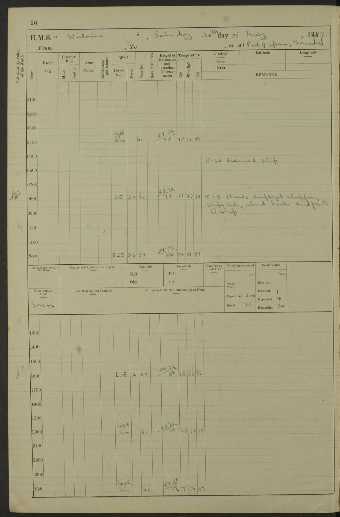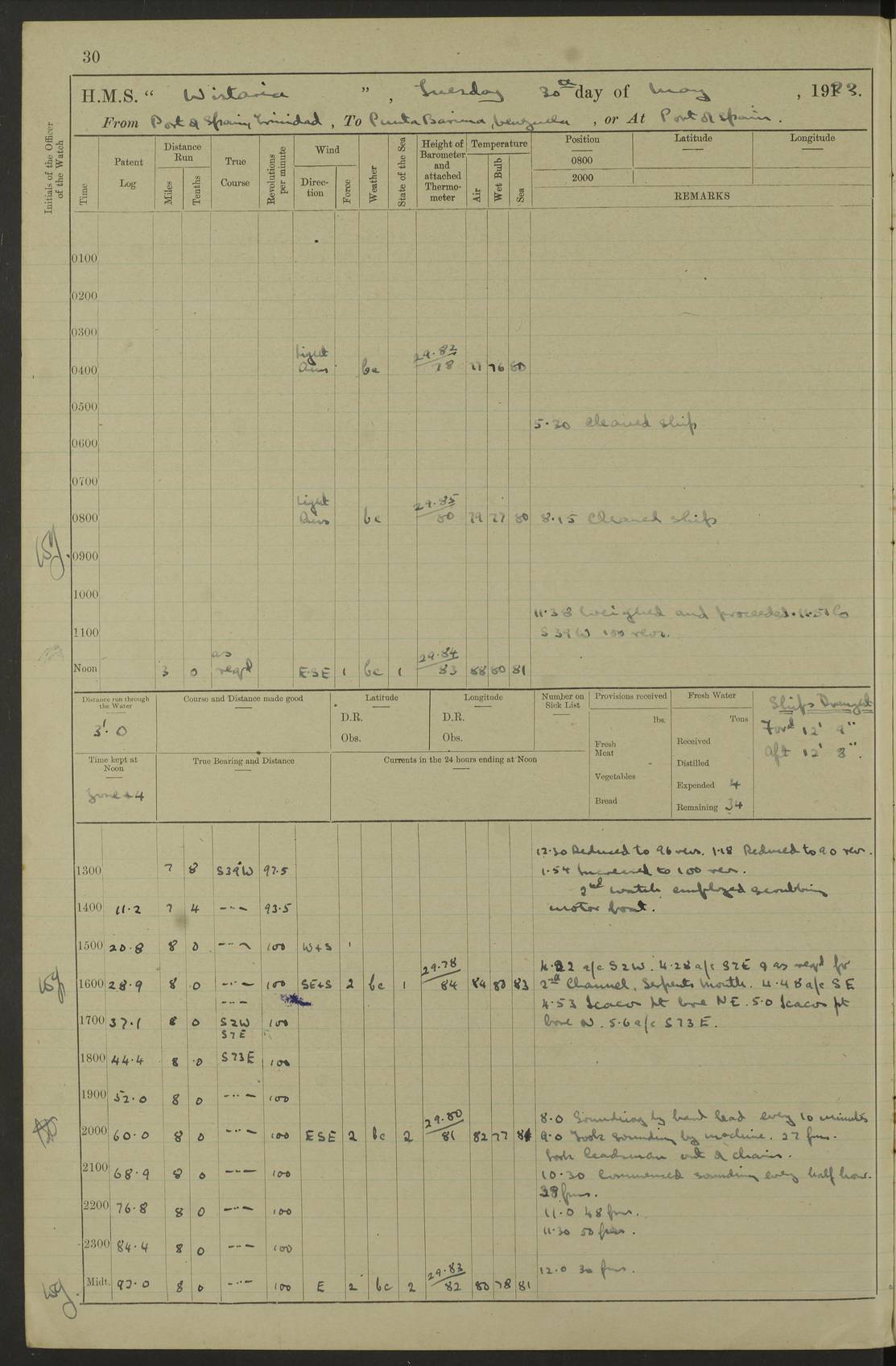 LOGS FOR MARCH 1921 4f73c9fea2fc8ea9030009a4: (https://s3.amazonaws.com:443/oldweather/ADM53-93259/0035_0.jpg) 4f73ca01a2fc8ea9030009ad: (https://s3.amazonaws.com:443/oldweather/ADM53-93260/0003_1.jpg) 1 March 1921 At Gulf of Paria [At San Fernando] Lat 10.38, Long -62.35 5.30am: Hands repairing target & cleaning ship [Repaired target & cleaned ship] [6.10am: Shortened in] [6.30am: Weighed & towed target for “Valerian”. Course SE, 6 knots] 6.53am: Weighed & proceeded. Course SE, 6 knots 7.50am: Stopped. Handed in target [Transferred target] 8.0am: Slipped target 9.15am: Carried out [4”] firing am: Hands painting inboard 11.05am: Came to with Starboard anchor 1½ shackles Anchor bearings: Farralla Rock S4W, Chagrin Hill S82E, Pierre Point N30E 1.15pm: Paid hands [monthly payment] 2.0pm: Hands painting & cleaning [ship] Number on sick list: - [Farralla Rock: perhaps misspelt Farrallon Rock] [Chagrin Hill: perhaps Mon Chagrin Hill] 4f73ca01a2fc8ea9030009ae: (https://s3.amazonaws.com:443/oldweather/ADM53-93260/0004_0.jpg) 2 March 1921 At Brighton Pier Lat 10.38, Long -62.35 8.30am: Weighed & proceeded to Brighton 9.40am: Let go Port anchor 2 shackles 10.30am: Sent provisions to “Valerian” Lost overboard by accident: Magazine Lewis Gun: One in number; Cartr. S.A. .303 belt: 47 in number 1.15pm: Landed liberty men 6.15pm: Liberty men returned. S. P. O. Edwards brought on board dead Number on sick list: 1.D.D. 4f73ca02a2fc8ea9030009af: (https://s3.amazonaws.com:443/oldweather/ADM53-93260/0004_1.jpg) H.M.S “Wistaria” at Trinidad. 3rd March 1921 Return of deaths on board H.M.S. “Wistaria” Date of death. 2nd March 1921. Name & Surname of Deceased. William Edwards. Sex. Male. Age. 27 years, 1 month. Rating. Stoker Petty Officer, Royal Navy. Nationality. English. Last place of Abode. H.M.S. “Wistaria”, lying off Brighton Pier, Trinidad. Cause of Death. Shock following rupture of spleen. 4f73ca02a2fc8ea9030009b0: (https://s3.amazonaws.com:443/oldweather/ADM53-93260/0005_0.jpg) 4f73ca03a2fc8ea9030009b1: (https://s3.amazonaws.com:443/oldweather/ADM53-93260/0005_1.jpg) 3 March 1921 At Port of Spain Lat 10.66, Long -61.55 5.30am: Weighed & proceeded to Port of Spain. Course N19E, 10 knots 8.0am: Came to with Starboard anchor, 1 shackles 9.55am: Discharged S.P.O. Edwards to Colonial Hospital, dead 3.30pm: Funeral Party & mourners landed 4.30pm: Half masted colours 5.30pm: Re-hoisted colours 6.30pm: Funeral parties returned 4f73ca03a2fc8ea9030009b2: (https://s3.amazonaws.com:443/oldweather/ADM53-93260/0006_0.jpg) 4 March 1921 At Port of Spain Lat 10.66, Long -61.55 5.55am: Weighed & proceeded. Course & speeds as required for battle practice 7.15am: Carried out battle practice 8.0am: Took target in tow for “Valerian” battle practice 8.30am: Set course for Port of Spain N25E, 8 knots 9.30am: Hauled in target 10.0am: Anchored & prepared divers to clear wire from rudder 10.30am: Wire cleaned. Weighed & proceeded. Target Capsized 11.45am: Righted target and proceeded 12.15pm: Came to Starboard anchor, 1 shackle 2.45pm: Hands up stanchions & respread awnings 3.30pm: Coal lighter secured alongside 5.40pm: Water boat secured alongside 4f73ca03a2fc8ea9030009b3: (https://s3.amazonaws.com:443/oldweather/ADM53-93260/0006_1.jpg) 5 March 1921 At Port of Spain Lat 10.66, Long -61.55 5.30am: Hands coal ship 7.0am: Received fresh provisions 10.45am: Finished coaling. Wash down upper decks 4.0pm: Evening Quarters. Read warrants 1-2-3-4 Number on sick list: 1 4f73ca04a2fc8ea9030009b4: (https://s3.amazonaws.com:443/oldweather/ADM53-93260/0007_0.jpg) 6 March 1921 At Port of Spain Lat 10.66, Long -61.55 9.45am: Divisions & prayers Number on sick list: 1 4f73ca04a2fc8ea9030009b5: (https://s3.amazonaws.com:443/oldweather/ADM53-93260/0007_1.jpg) 7 March 1921 At Port of Spain Lat 10.66, Long -61.55 6.30am: Hoisted boat 7.24am: Weighed & proceeded. S19W, 14 knots 9.30am: Anchored off Brighton Pier 10.0am: Held Court of Inquiry on death of S.P.O Edwards 1.0pm: Weighed & proceeded to Port of Spain. Course N19E, 14 knots 3.05pm: Anchored Number on sick list: 1 4f73ca04a2fc8ea9030009b6: (https://s3.amazonaws.com:443/oldweather/ADM53-93260/0008_0.jpg) 8 March 1921 At Port of Spain Lat 10.66, Long -61.55 7.50am: Shortened in 8.0am: Weighed & proceeded to Chaguaramas Bay at 12 knots 8.45am: Anchored 9.0am: All available seamen landed to haul up target. Sent provisions to “Valerian” 11.45am: Target party returned. Hoisted boats noon: Weighed & proceeded to Port of Spain at 12 knots 12.30pm: Anchored pm: Hands securing ship for sea 5.05pm: Colonel Glasgow arrived on board for passage to Jamaica 6.0pm: Weighed & proceeded at 11 knots. Course as required to pass through Bocas de Navios 7.0pm: Streamed Patent log 7.10pm: Chacachacare Lt abeam, 6 cables. Course N50W 7.47pm: Penas Point abeam [Boca de Navios: between Huevos and Chacachacare Islands. Also here] [Chacachacare Light: is exhibited from a white concrete tower, 30 feet high, on the northern end of the island] 4f73ca05a2fc8ea9030009b7: (https://s3.amazonaws.com:443/oldweather/ADM53-93260/0008_1.jpg) 9 March 1921 From Port of Spain, Trinidad, to Curaçoa Lat 11.36, Long -64.9 5.55am: Los Frayles Island abeam, 1 mile 6.35am: Altered course N77W. Cabo de la Isla abeam, 2 miles am: Hands scraping & painting inboard. Boats crews working about boats am: Turned 1st and 2nd whalers falls end for end pm: Hands painting, turning whaler falls end for end & scraping motor boat 6.0pm: Sighted Orchilla Isles N26W 9.05pm: Sighted El Rouke Lt N10W [Cabo de la Isla, also known as Cabo Negro] [El Rouke Lt: perhaps misspelt El Roque Light. A light was exhibited from a lighthouse on the northeast hill of El Roque] 4f73ca05a2fc8ea9030009b8: (https://s3.amazonaws.com:443/oldweather/ADM53-93260/0009_0.jpg) 10 March 1921 From Trinidad to Curaçoa and at Curaçoa Lat 10.66, Long -61.55 8.23am: Little Curaçoa Lt abeam 9.25am: Hauled in patent log 10.0am: Stopped for Port Health Off