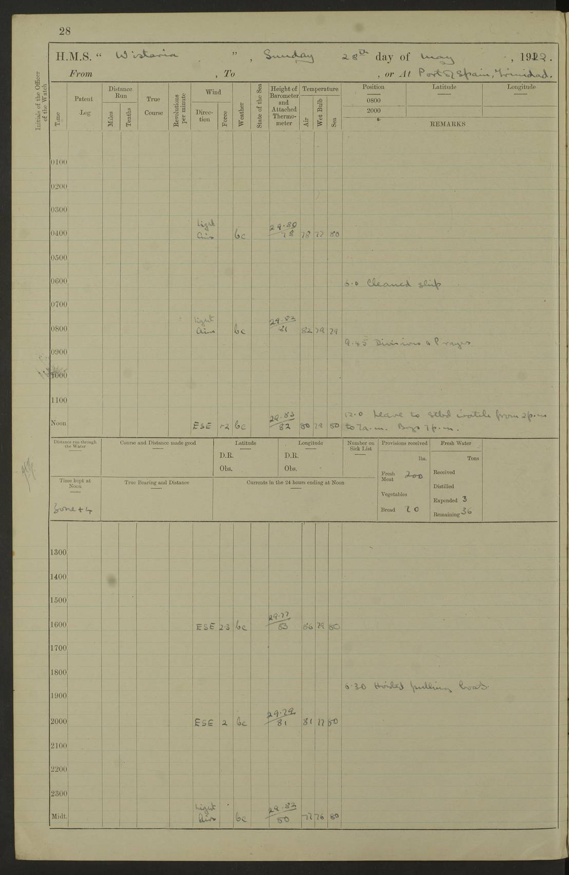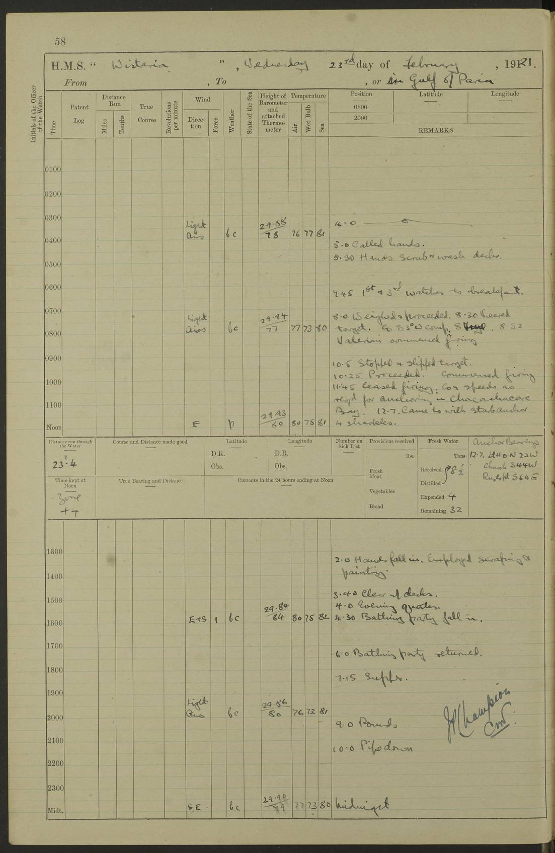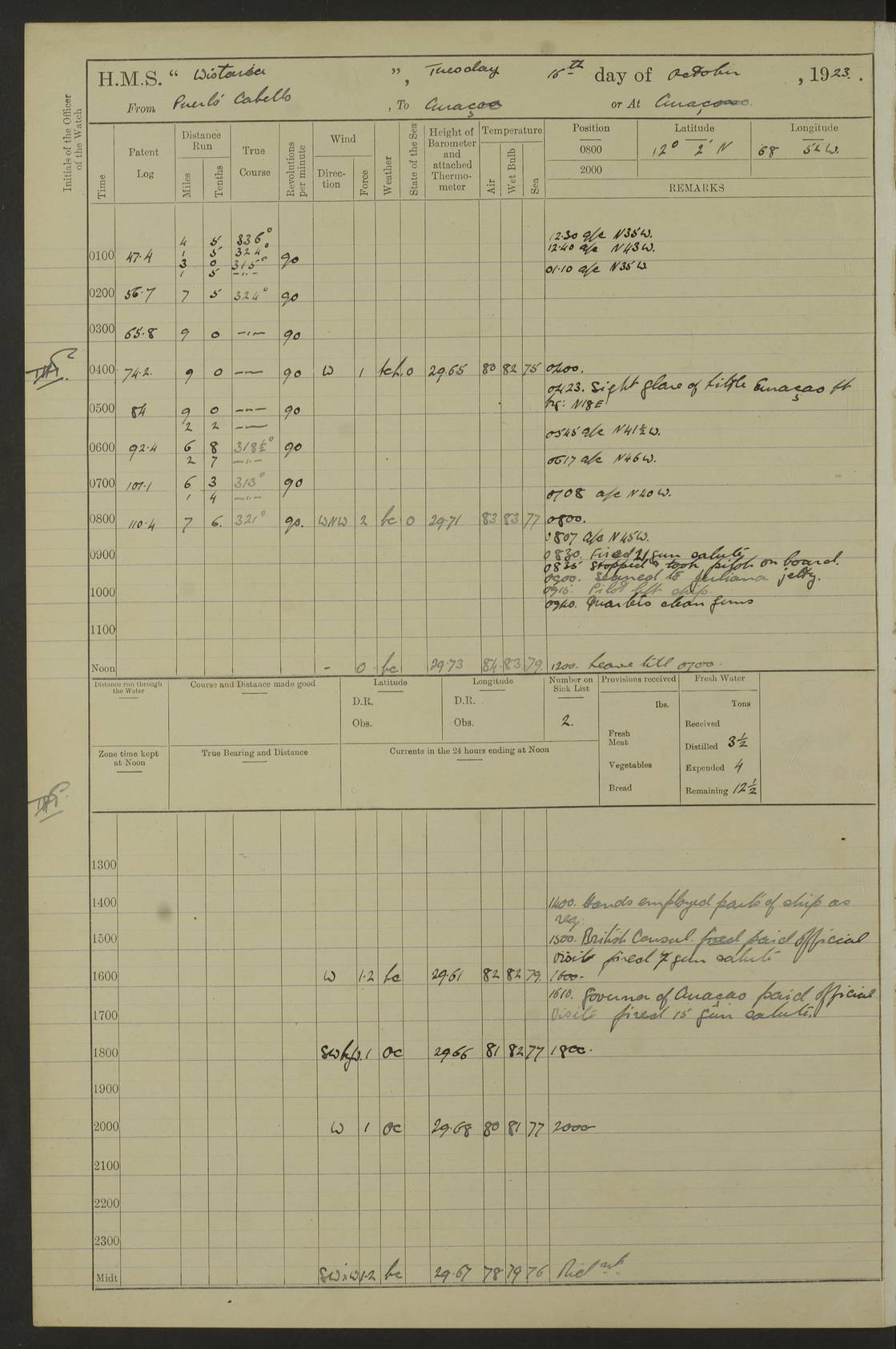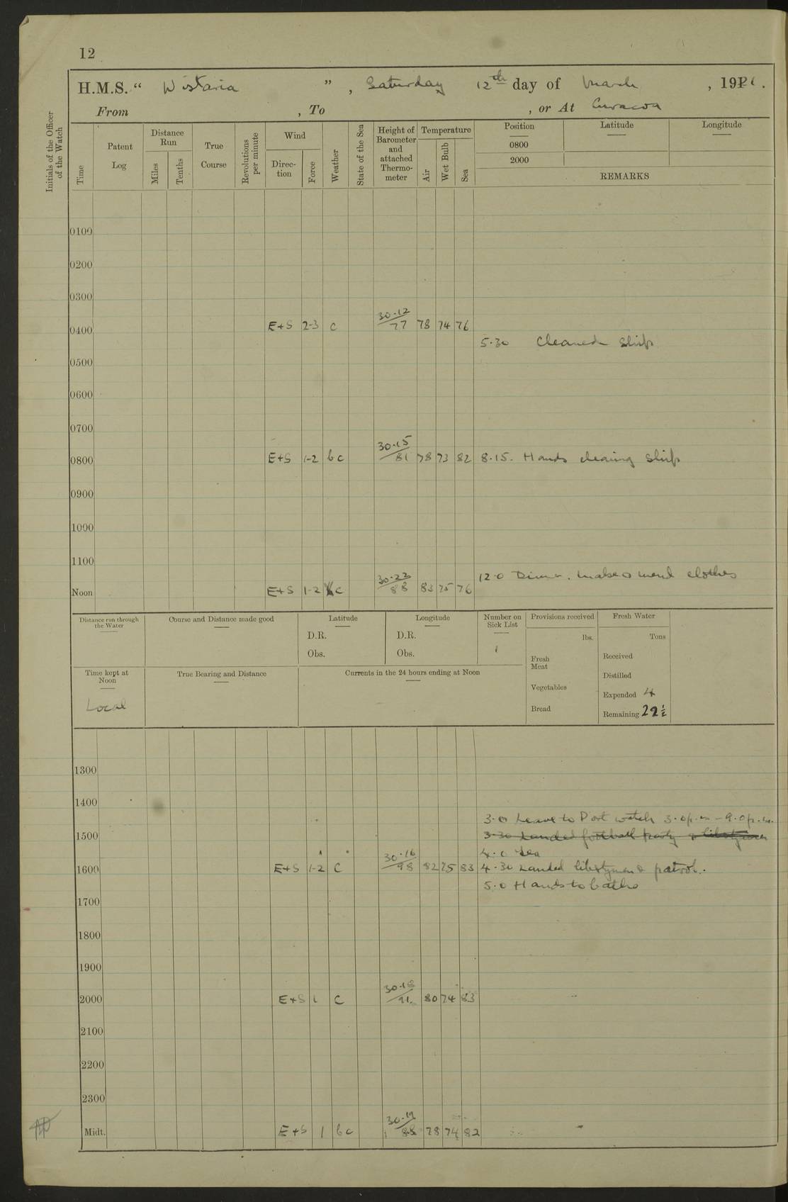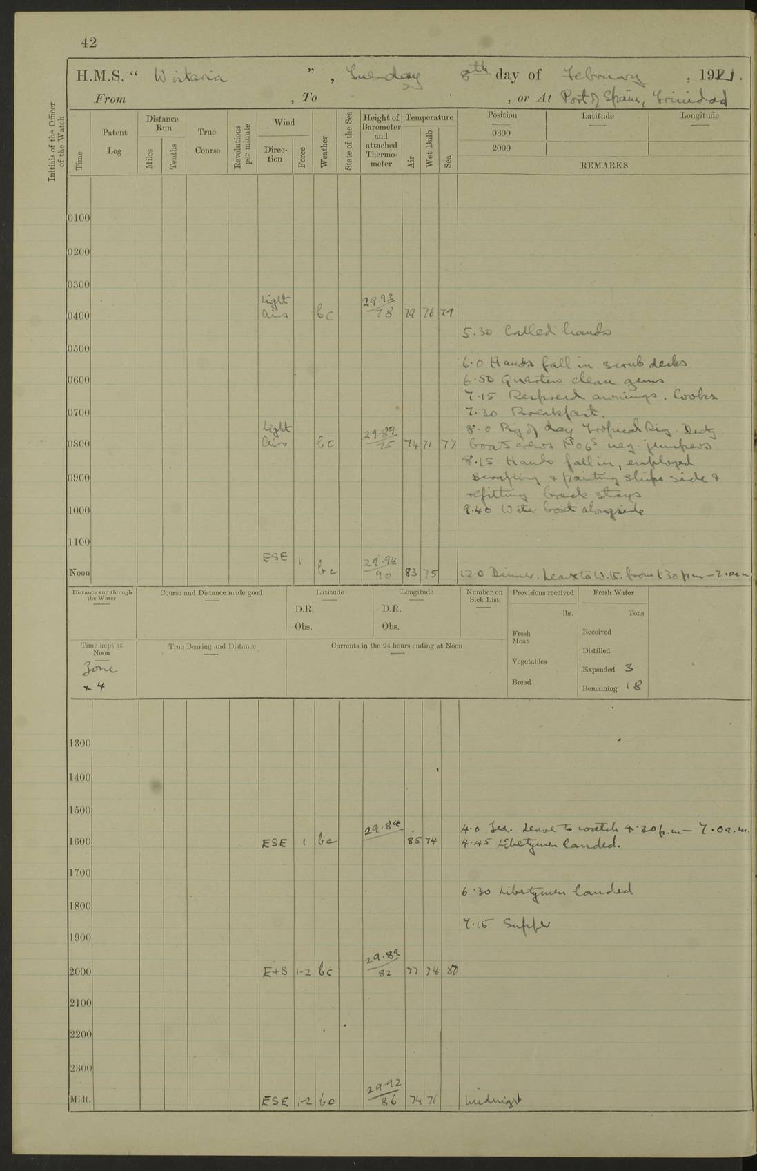 LOGS FOR MARCH 1921 4f73c9fea2fc8ea9030009a4: (https://s3.amazonaws.com:443/oldweather/ADM53-93259/0035_0.jpg) 4f73ca01a2fc8ea9030009ad: (https://s3.amazonaws.com:443/oldweather/ADM53-93260/0003_1.jpg) 1 March 1921 At Gulf of Paria [At San Fernando] Lat 10.38, Long -62.35 5.30am: Hands repairing target & cleaning ship [Repaired target & cleaned ship] [6.10am: Shortened in] [6.30am: Weighed & towed target for “Valerian”. Course SE, 6 knots] 6.53am: Weighed & proceeded. Course SE, 6 knots 7.50am: Stopped. Handed in target [Transferred target] 8.0am: Slipped target 9.15am: Carried out [4”] firing am: Hands painting inboard 11.05am: Came to with Starboard anchor 1½ shackles Anchor bearings: Farralla Rock S4W, Chagrin Hill S82E, Pierre Point N30E 1.15pm: Paid hands [monthly payment] 2.0pm: Hands painting & cleaning [ship] Number on sick list: - [Farralla Rock: perhaps misspelt Farrallon Rock] [Chagrin Hill: perhaps Mon Chagrin Hill] 4f73ca01a2fc8ea9030009ae: (https://s3.amazonaws.com:443/oldweather/ADM53-93260/0004_0.jpg) 2 March 1921 At Brighton Pier Lat 10.38, Long -62.35 8.30am: Weighed & proceeded to Brighton 9.40am: Let go Port anchor 2 shackles 10.30am: Sent provisions to “Valerian” Lost overboard by accident: Magazine Lewis Gun: One in number; Cartr. S.A. .303 belt: 47 in number 1.15pm: Landed liberty men 6.15pm: Liberty men returned. S. P. O. Edwards brought on board dead Number on sick list: 1.D.D. 4f73ca02a2fc8ea9030009af: (https://s3.amazonaws.com:443/oldweather/ADM53-93260/0004_1.jpg) H.M.S “Wistaria” at Trinidad. 3rd March 1921 Return of deaths on board H.M.S. “Wistaria” Date of death. 2nd March 1921. Name & Surname of Deceased. William Edwards. Sex. Male. Age. 27 years, 1 month. Rating. Stoker Petty Officer, Royal Navy. Nationality. English. Last place of Abode. H.M.S. “Wistaria”, lying off Brighton Pier, Trinidad. Cause of Death. Shock following rupture of spleen. 4f73ca02a2fc8ea9030009b0: (https://s3.amazonaws.com:443/oldweather/ADM53-93260/0005_0.jpg) 4f73ca03a2fc8ea9030009b1: (https://s3.amazonaws.com:443/oldweather/ADM53-93260/0005_1.jpg) 3 March 1921 At Port of Spain Lat 10.66, Long -61.55 5.30am: Weighed & proceeded to Port of Spain. Course N19E, 10 knots 8.0am: Came to with Starboard anchor, 1 shackles 9.55am: Discharged S.P.O. Edwards to Colonial Hospital, dead 3.30pm: Funeral Party & mourners landed 4.30pm: Half masted colours 5.30pm: Re-hoisted colours 6.30pm: Funeral parties returned 4f73ca03a2fc8ea9030009b2: (https://s3.amazonaws.com:443/oldweather/ADM53-93260/0006_0.jpg) 4 March 1921 At Port of Spain Lat 10.66, Long -61.55 5.55am: Weighed & proceeded. Course & speeds as required for battle practice 7.15am: Carried out battle practice 8.0am: Took target in tow for “Valerian” battle practice 8.30am: Set course for Port of Spain N25E, 8 knots 9.30am: Hauled in target 10.0am: Anchored & prepared divers to clear wire from rudder 10.30am: Wire cleaned. Weighed & proceeded. Target Capsized 11.45am: Righted target and proceeded 12.15pm: Came to Starboard anchor, 1 shackle 2.45pm: Hands up stanchions & respread awnings 3.30pm: Coal lighter secured alongside 5.40pm: Water boat secured alongside 4f73ca03a2fc8ea9030009b3: (https://s3.amazonaws.com:443/oldweather/ADM53-93260/0006_1.jpg) 5 March 1921 At Port of Spain Lat 10.66, Long -61.55 5.30am: Hands coal ship 7.0am: Received fresh provisions 10.45am: Finished coaling. Wash down upper decks 4.0pm: Evening Quarters. Read warrants 1-2-3-4 Number on sick list: 1 4f73ca04a2fc8ea9030009b4: (https://s3.amazonaws.com:443/oldweather/ADM53-93260/0007_0.jpg) 6 March 1921 At Port of Spain Lat 10.66, Long -61.55 9.45am: Divisions & prayers Number on sick list: 1 4f73ca04a2fc8ea9030009b5: (https://s3.amazonaws.com:443/oldweather/ADM53-93260/0007_1.jpg) 7 March 1921 At Port of Spain Lat 10.66, Long -61.55 6.30am: Hoisted boat 7.24am: Weighed & proceeded. S19W, 14 knots 9.30am: Anchored off Brighton Pier 10.0am: Held Court of Inquiry on death of S.P.O Edwards 1.0pm: Weighed & proceeded to Port of Spain. Course N19E, 14 knots 3.05pm: Anchored Number on sick list: 1 4f73ca04a2fc8ea9030009b6: (https://s3.amazonaws.com:443/oldweather/ADM53-93260/0008_0.jpg) 8 March 1921 At Port of Spain Lat 10.66, Long -61.55 7.50am: Shortened in 8.0am: Weighed & proceeded to Chaguaramas Bay at 12 knots 8.45am: Anchored 9.0am: All available seamen landed to haul up target. Sent provisions to “Valerian” 11.45am: Target party returned. Hoisted boats noon: Weighed & proceeded to Port of Spain at 12 knots 12.30pm: Anchored pm: Hands securing ship for sea 5.05pm: Colonel Glasgow arrived on board for passage to Jamaica 6.0pm: Weighed & proceeded at 11 knots. Course as required to pass through Bocas de Navios 7.0pm: Streamed Patent log 7.10pm: Chacachacare Lt abeam, 6 cables. Course N50W 7.47pm: Penas Point abeam [Boca de Navios: between Huevos and Chacachacare Islands. Also here] [Chacachacare Light: is exhibited from a white concrete tower, 30 feet high, on the northern end of the island] 4f73ca05a2fc8ea9030009b7: (https://s3.amazonaws.com:443/oldweather/ADM53-93260/0008_1.jpg) 9 March 1921 From Port of Spain, Trinidad, to Curaçoa Lat 11.36, Long -64.9 5.55am: Los Frayles Island abeam, 1 mile 6.35am: Altered course N77W. Cabo de la Isla abeam, 2 miles am: Hands scraping & painting inboard. Boats crews working about boats am: Turned 1st and 2nd whalers falls end for end pm: Hands painting, turning whaler falls end for end & scraping motor boat 6.0pm: Sighted Orchilla Isles N26W 9.05pm: Sighted El Rouke Lt N10W [Cabo de la Isla, also known as Cabo Negro] [El Rouke Lt: perhaps misspelt El Roque Light. A light was exhibited from a lighthouse on the northeast hill of El Roque] 4f73ca05a2fc8ea9030009b8: (https://s3.amazonaws.com:443/oldweather/ADM53-93260/0009_0.jpg) 10 March 1921 From Trinidad to Curaçoa and at Curaçoa Lat 10.66, Long -61.55 8.23am: Little Curaçoa Lt abeam 9.25am: Hauled in patent log 10.0am: Stopped for Port Health Off