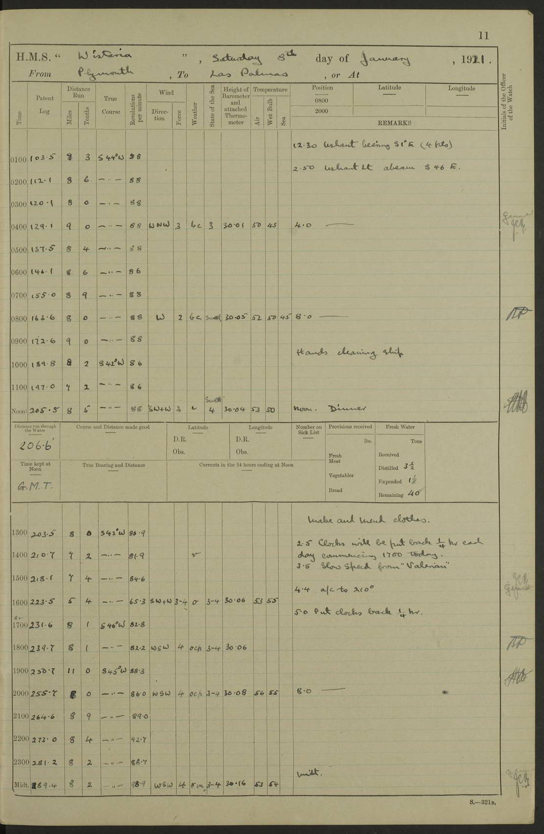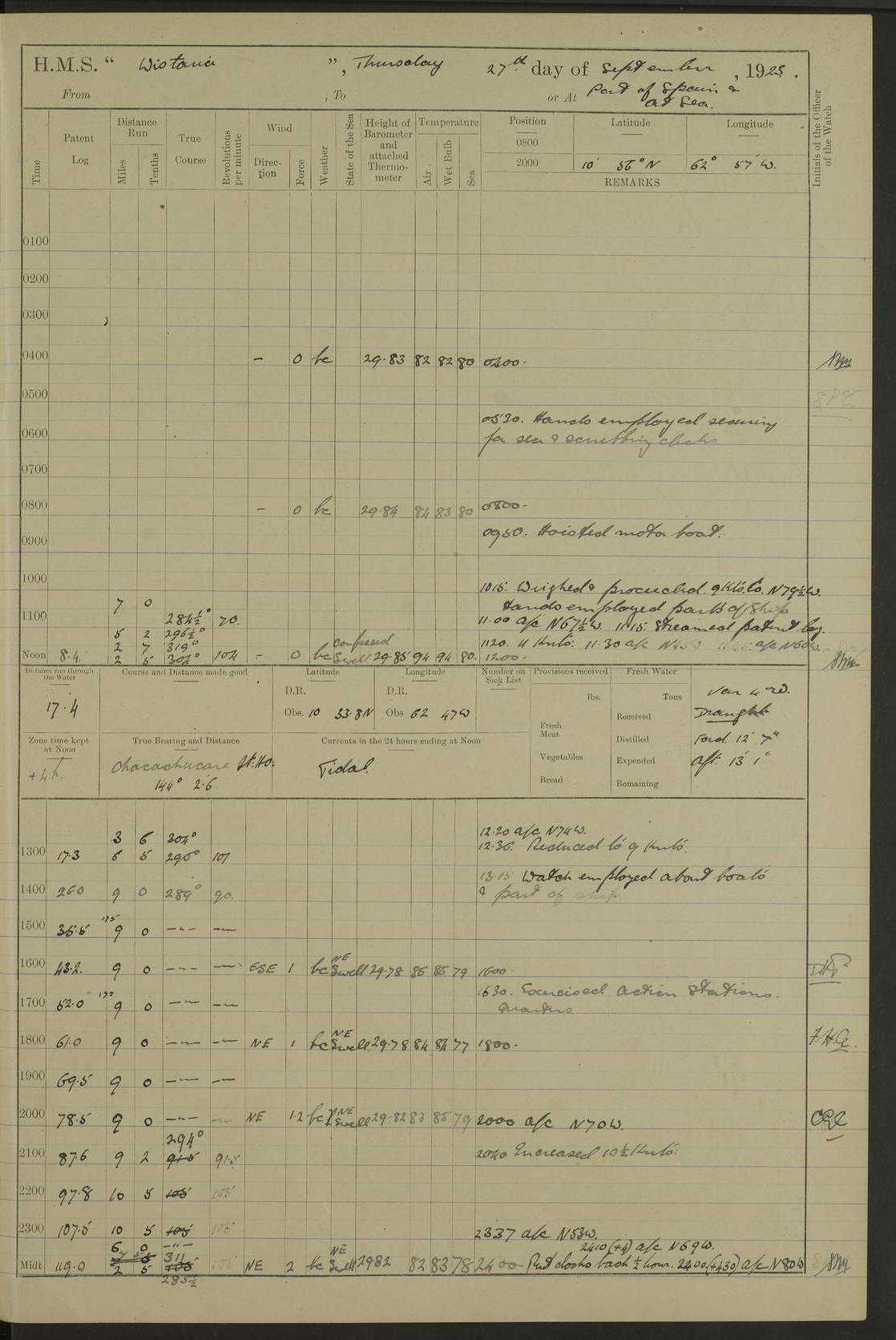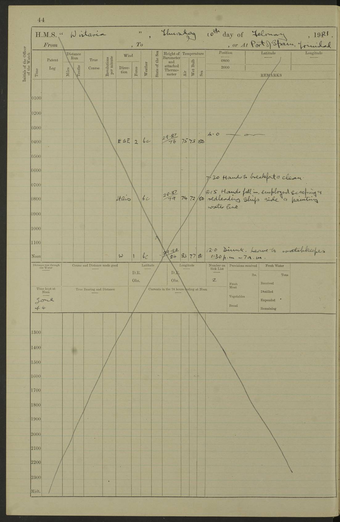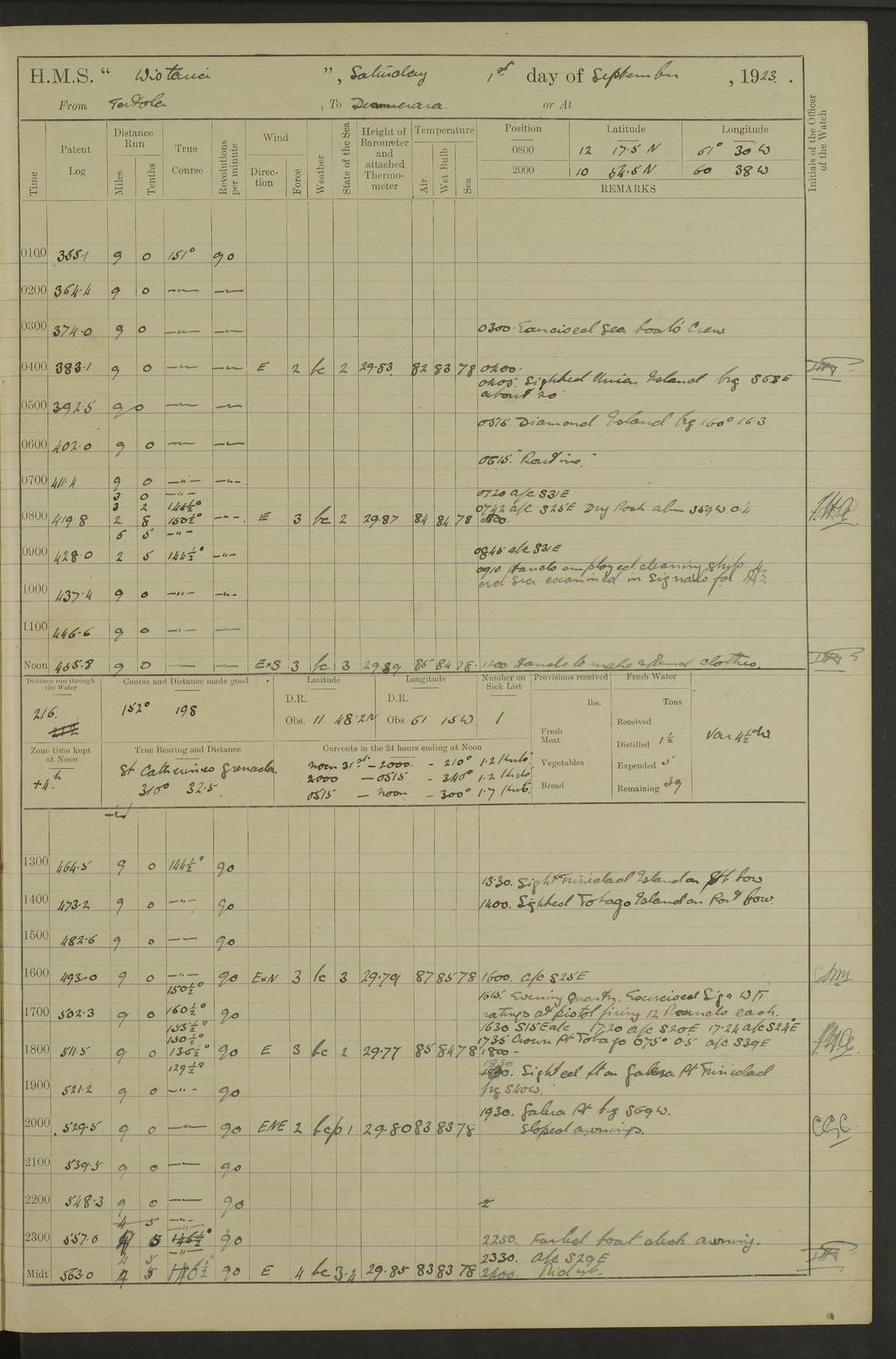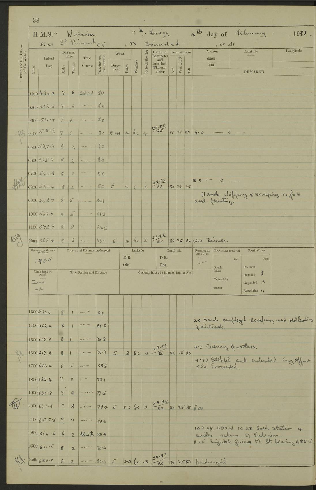 LOGS FOR MARCH 1921 4f73c9fea2fc8ea9030009a4: (https://s3.amazonaws.com:443/oldweather/ADM53-93259/0035_0.jpg) 4f73ca01a2fc8ea9030009ad: (https://s3.amazonaws.com:443/oldweather/ADM53-93260/0003_1.jpg) 1 March 1921 At Gulf of Paria [At San Fernando] Lat 10.38, Long -62.35 5.30am: Hands repairing target & cleaning ship [Repaired target & cleaned ship] [6.10am: Shortened in] [6.30am: Weighed & towed target for “Valerian”. Course SE, 6 knots] 6.53am: Weighed & proceeded. Course SE, 6 knots 7.50am: Stopped. Handed in target [Transferred target] 8.0am: Slipped target 9.15am: Carried out [4”] firing am: Hands painting inboard 11.05am: Came to with Starboard anchor 1½ shackles Anchor bearings: Farralla Rock S4W, Chagrin Hill S82E, Pierre Point N30E 1.15pm: Paid hands [monthly payment] 2.0pm: Hands painting & cleaning [ship] Number on sick list: - [Farralla Rock: perhaps misspelt Farrallon Rock] [Chagrin Hill: perhaps Mon Chagrin Hill] 4f73ca01a2fc8ea9030009ae: (https://s3.amazonaws.com:443/oldweather/ADM53-93260/0004_0.jpg) 2 March 1921 At Brighton Pier Lat 10.38, Long -62.35 8.30am: Weighed & proceeded to Brighton 9.40am: Let go Port anchor 2 shackles 10.30am: Sent provisions to “Valerian” Lost overboard by accident: Magazine Lewis Gun: One in number; Cartr. S.A. .303 belt: 47 in number 1.15pm: Landed liberty men 6.15pm: Liberty men returned. S. P. O. Edwards brought on board dead Number on sick list: 1.D.D. 4f73ca02a2fc8ea9030009af: (https://s3.amazonaws.com:443/oldweather/ADM53-93260/0004_1.jpg) H.M.S “Wistaria” at Trinidad. 3rd March 1921 Return of deaths on board H.M.S. “Wistaria” Date of death. 2nd March 1921. Name & Surname of Deceased. William Edwards. Sex. Male. Age. 27 years, 1 month. Rating. Stoker Petty Officer, Royal Navy. Nationality. English. Last place of Abode. H.M.S. “Wistaria”, lying off Brighton Pier, Trinidad. Cause of Death. Shock following rupture of spleen. 4f73ca02a2fc8ea9030009b0: (https://s3.amazonaws.com:443/oldweather/ADM53-93260/0005_0.jpg) 4f73ca03a2fc8ea9030009b1: (https://s3.amazonaws.com:443/oldweather/ADM53-93260/0005_1.jpg) 3 March 1921 At Port of Spain Lat 10.66, Long -61.55 5.30am: Weighed & proceeded to Port of Spain. Course N19E, 10 knots 8.0am: Came to with Starboard anchor, 1 shackles 9.55am: Discharged S.P.O. Edwards to Colonial Hospital, dead 3.30pm: Funeral Party & mourners landed 4.30pm: Half masted colours 5.30pm: Re-hoisted colours 6.30pm: Funeral parties returned 4f73ca03a2fc8ea9030009b2: (https://s3.amazonaws.com:443/oldweather/ADM53-93260/0006_0.jpg) 4 March 1921 At Port of Spain Lat 10.66, Long -61.55 5.55am: Weighed & proceeded. Course & speeds as required for battle practice 7.15am: Carried out battle practice 8.0am: Took target in tow for “Valerian” battle practice 8.30am: Set course for Port of Spain N25E, 8 knots 9.30am: Hauled in target 10.0am: Anchored & prepared divers to clear wire from rudder 10.30am: Wire cleaned. Weighed & proceeded. Target Capsized 11.45am: Righted target and proceeded 12.15pm: Came to Starboard anchor, 1 shackle 2.45pm: Hands up stanchions & respread awnings 3.30pm: Coal lighter secured alongside 5.40pm: Water boat secured alongside 4f73ca03a2fc8ea9030009b3: (https://s3.amazonaws.com:443/oldweather/ADM53-93260/0006_1.jpg) 5 March 1921 At Port of Spain Lat 10.66, Long -61.55 5.30am: Hands coal ship 7.0am: Received fresh provisions 10.45am: Finished coaling. Wash down upper decks 4.0pm: Evening Quarters. Read warrants 1-2-3-4 Number on sick list: 1 4f73ca04a2fc8ea9030009b4: (https://s3.amazonaws.com:443/oldweather/ADM53-93260/0007_0.jpg) 6 March 1921 At Port of Spain Lat 10.66, Long -61.55 9.45am: Divisions & prayers Number on sick list: 1 4f73ca04a2fc8ea9030009b5: (https://s3.amazonaws.com:443/oldweather/ADM53-93260/0007_1.jpg) 7 March 1921 At Port of Spain Lat 10.66, Long -61.55 6.30am: Hoisted boat 7.24am: Weighed & proceeded. S19W, 14 knots 9.30am: Anchored off Brighton Pier 10.0am: Held Court of Inquiry on death of S.P.O Edwards 1.0pm: Weighed & proceeded to Port of Spain. Course N19E, 14 knots 3.05pm: Anchored Number on sick list: 1 4f73ca04a2fc8ea9030009b6: (https://s3.amazonaws.com:443/oldweather/ADM53-93260/0008_0.jpg) 8 March 1921 At Port of Spain Lat 10.66, Long -61.55 7.50am: Shortened in 8.0am: Weighed & proceeded to Chaguaramas Bay at 12 knots 8.45am: Anchored 9.0am: All available seamen landed to haul up target. Sent provisions to “Valerian” 11.45am: Target party returned. Hoisted boats noon: Weighed & proceeded to Port of Spain at 12 knots 12.30pm: Anchored pm: Hands securing ship for sea 5.05pm: Colonel Glasgow arrived on board for passage to Jamaica 6.0pm: Weighed & proceeded at 11 knots. Course as required to pass through Bocas de Navios 7.0pm: Streamed Patent log 7.10pm: Chacachacare Lt abeam, 6 cables. Course N50W 7.47pm: Penas Point abeam [Boca de Navios: between Huevos and Chacachacare Islands. Also here] [Chacachacare Light: is exhibited from a white concrete tower, 30 feet high, on the northern end of the island] 4f73ca05a2fc8ea9030009b7: (https://s3.amazonaws.com:443/oldweather/ADM53-93260/0008_1.jpg) 9 March 1921 From Port of Spain, Trinidad, to Curaçoa Lat 11.36, Long -64.9 5.55am: Los Frayles Island abeam, 1 mile 6.35am: Altered course N77W. Cabo de la Isla abeam, 2 miles am: Hands scraping & painting inboard. Boats crews working about boats am: Turned 1st and 2nd whalers falls end for end pm: Hands painting, turning whaler falls end for end & scraping motor boat 6.0pm: Sighted Orchilla Isles N26W 9.05pm: Sighted El Rouke Lt N10W [Cabo de la Isla, also known as Cabo Negro] [El Rouke Lt: perhaps misspelt El Roque Light. A light was exhibited from a lighthouse on the northeast hill of El Roque] 4f73ca05a2fc8ea9030009b8: (https://s3.amazonaws.com:443/oldweather/ADM53-93260/0009_0.jpg) 10 March 1921 From Trinidad to Curaçoa and at Curaçoa Lat 10.66, Long -61.55 8.23am: Little Curaçoa Lt abeam 9.25am: Hauled in patent log 10.0am: Stopped for Port Health Off