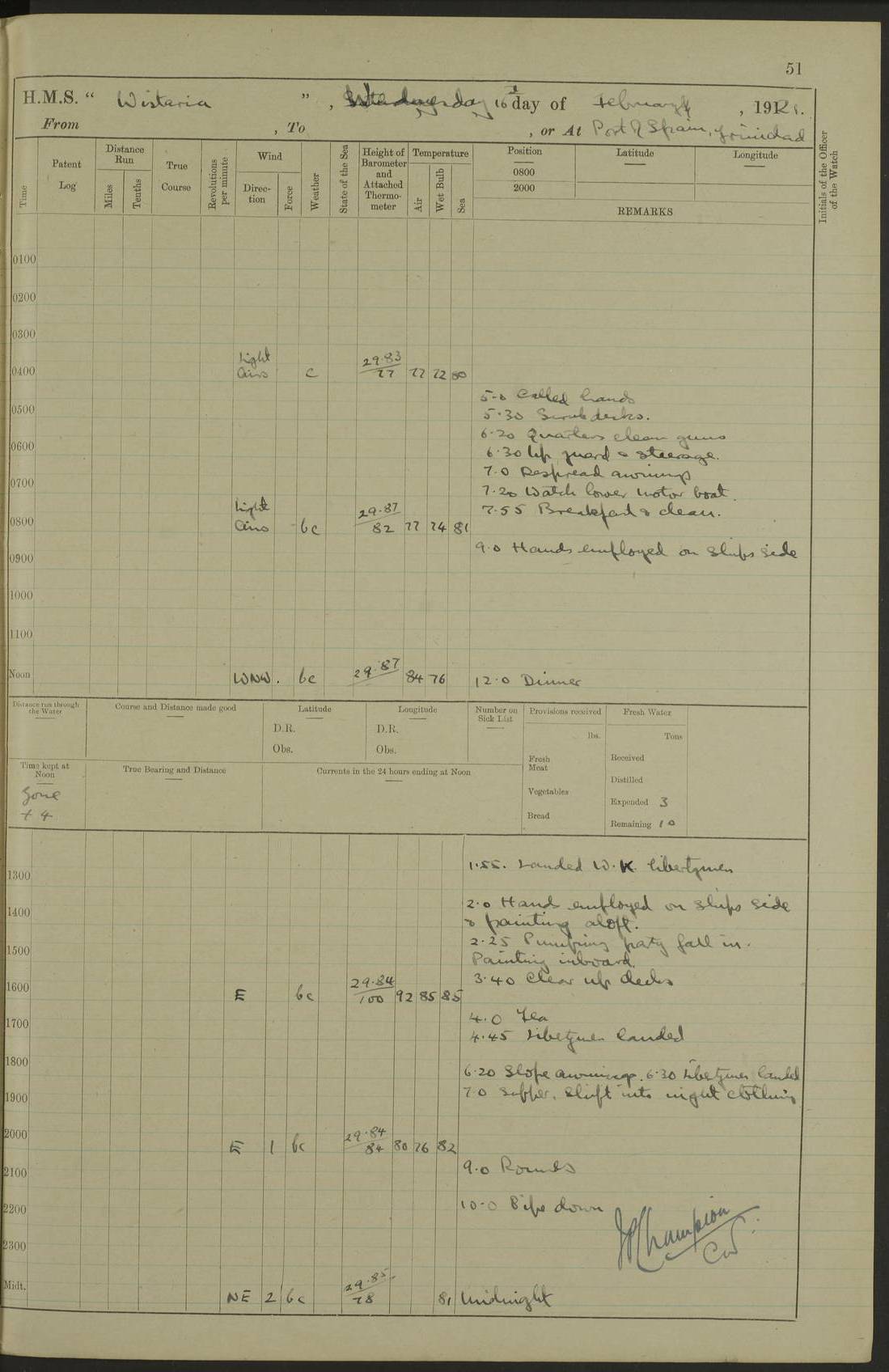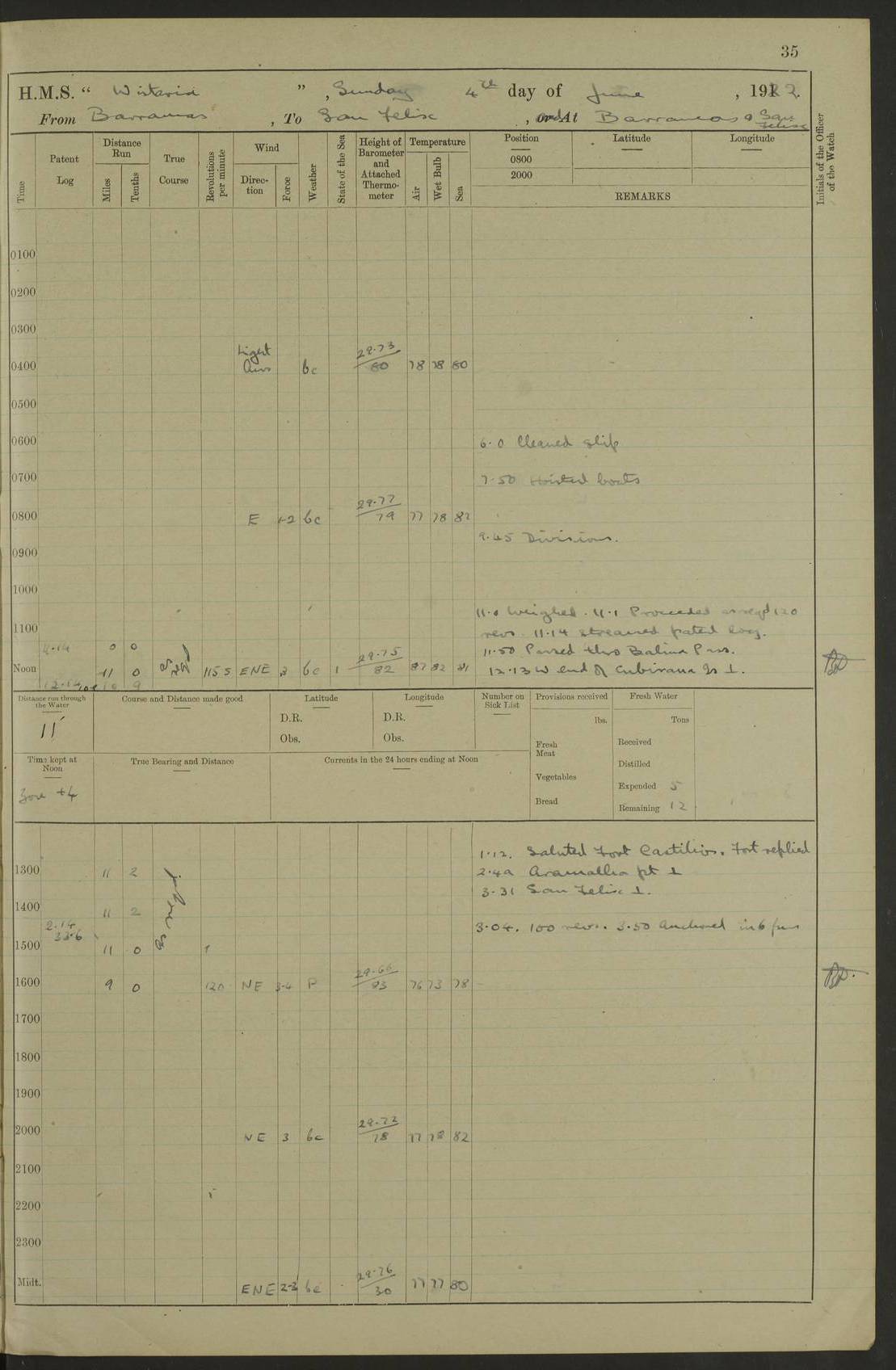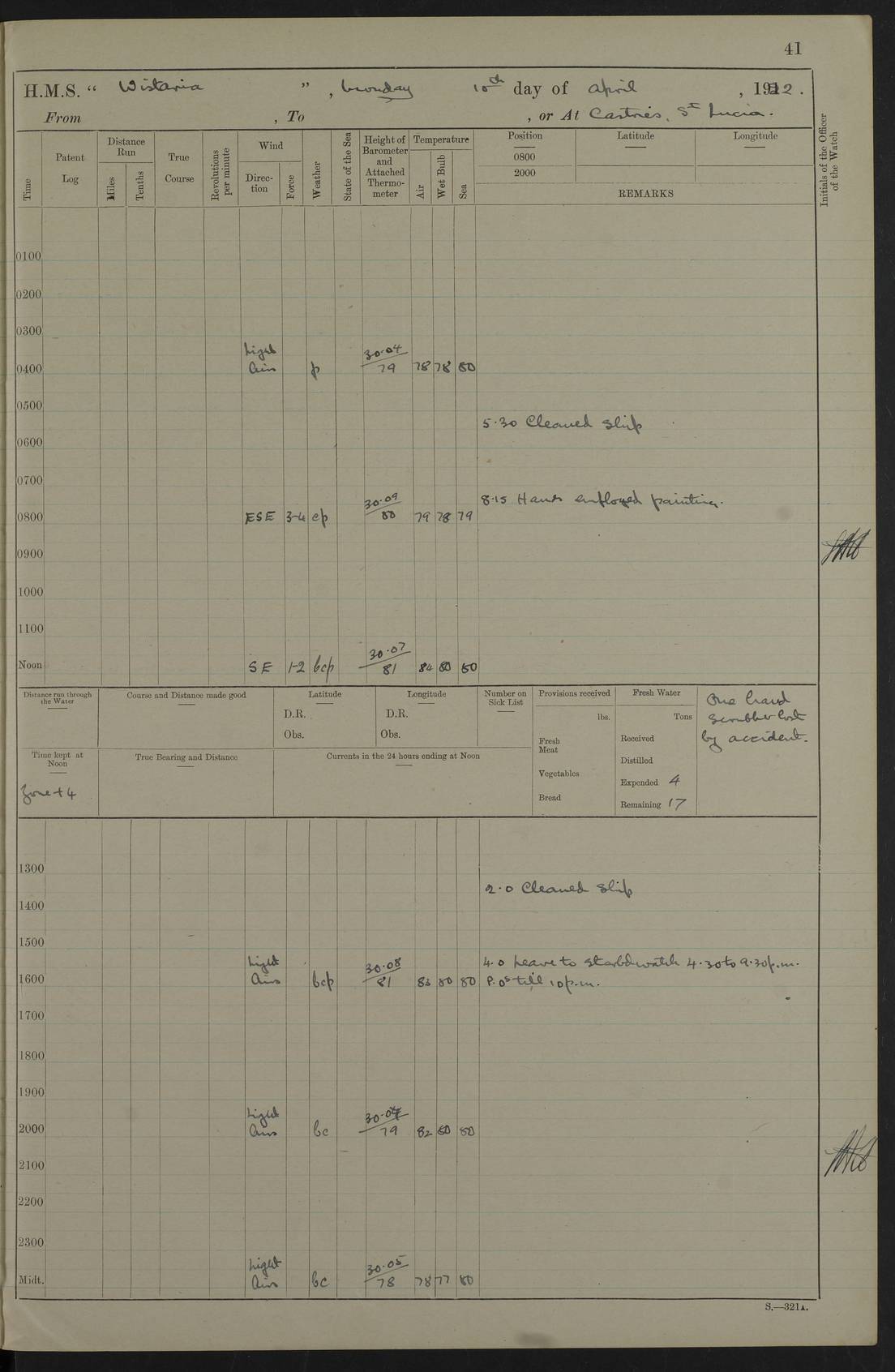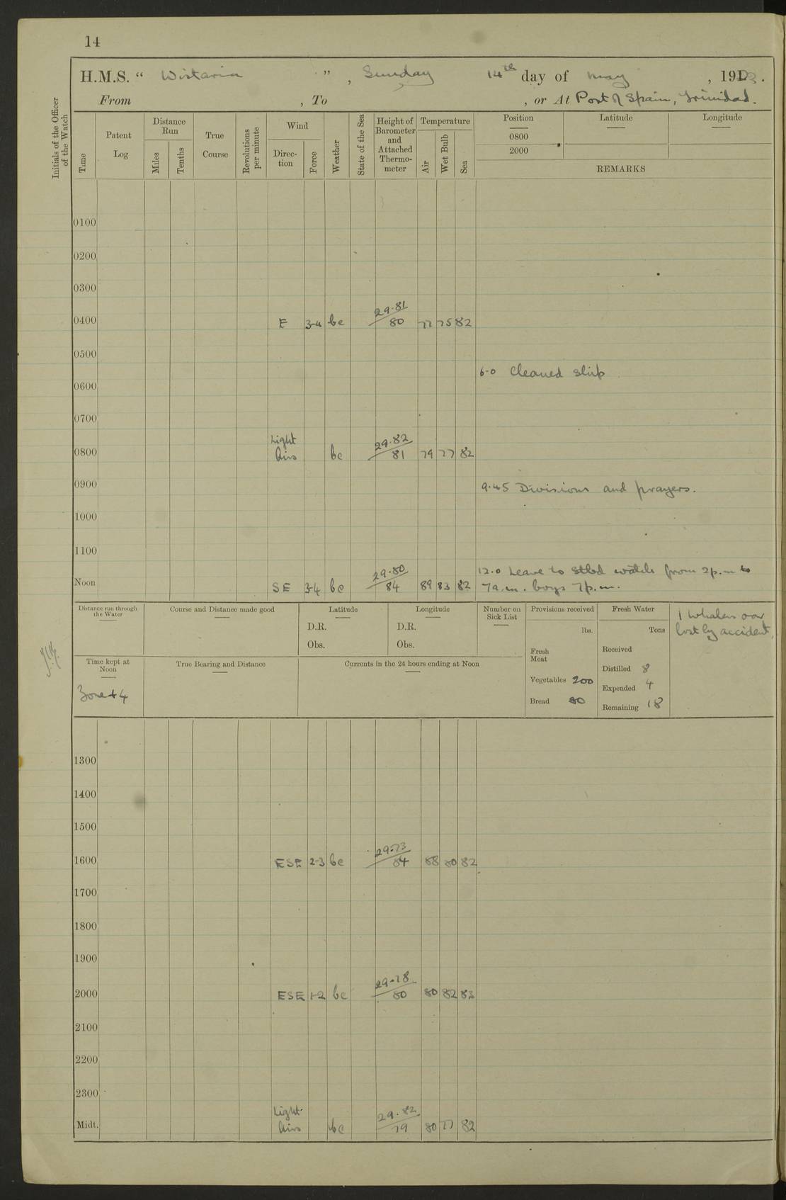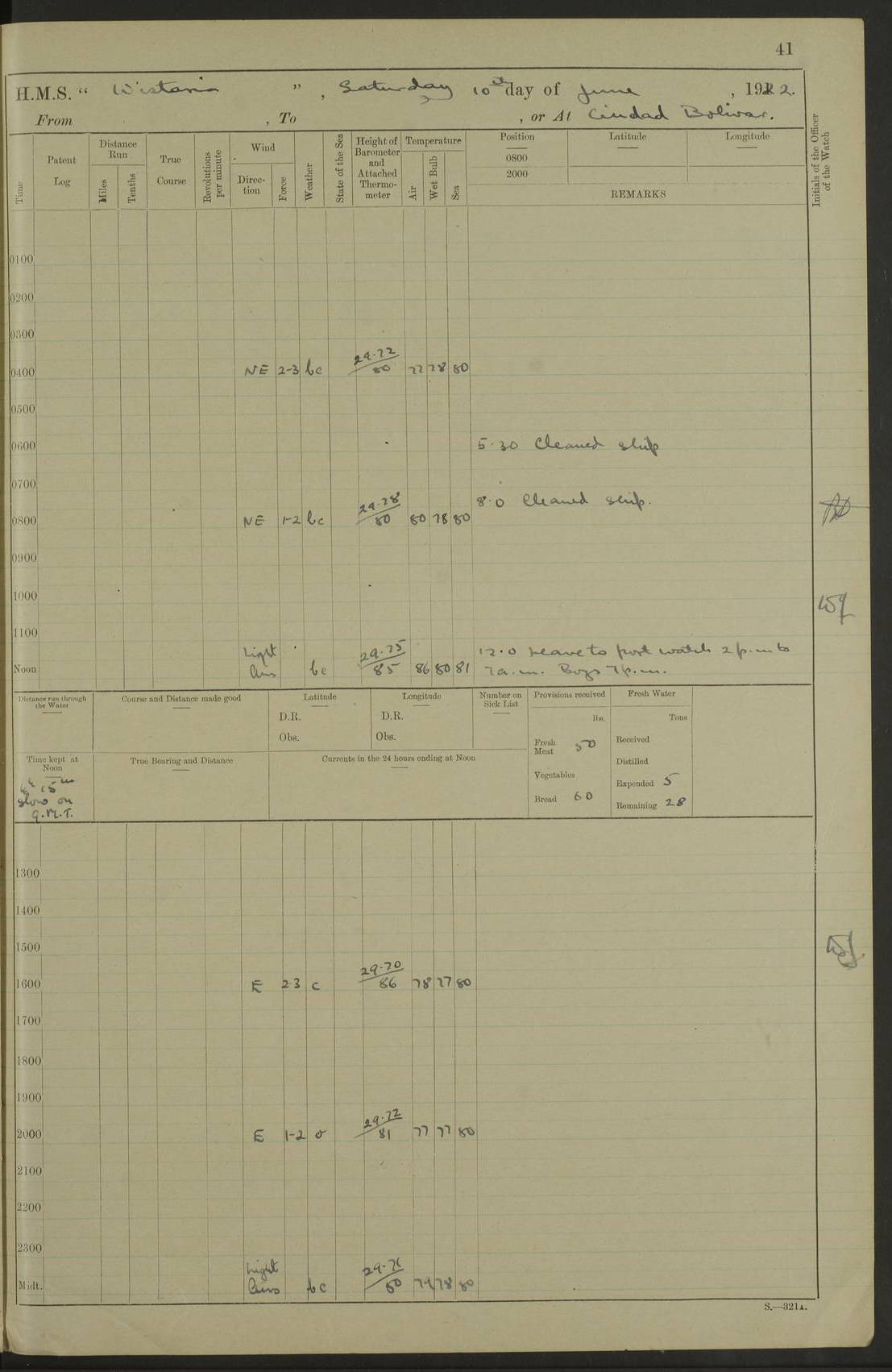 LOGS FOR MARCH 1921 4f73c9fea2fc8ea9030009a4: (https://s3.amazonaws.com:443/oldweather/ADM53-93259/0035_0.jpg) 4f73ca01a2fc8ea9030009ad: (https://s3.amazonaws.com:443/oldweather/ADM53-93260/0003_1.jpg) 1 March 1921 At Gulf of Paria [At San Fernando] Lat 10.38, Long -62.35 5.30am: Hands repairing target & cleaning ship [Repaired target & cleaned ship] [6.10am: Shortened in] [6.30am: Weighed & towed target for “Valerian”. Course SE, 6 knots] 6.53am: Weighed & proceeded. Course SE, 6 knots 7.50am: Stopped. Handed in target [Transferred target] 8.0am: Slipped target 9.15am: Carried out [4”] firing am: Hands painting inboard 11.05am: Came to with Starboard anchor 1½ shackles Anchor bearings: Farralla Rock S4W, Chagrin Hill S82E, Pierre Point N30E 1.15pm: Paid hands [monthly payment] 2.0pm: Hands painting & cleaning [ship] Number on sick list: - [Farralla Rock: perhaps misspelt Farrallon Rock] [Chagrin Hill: perhaps Mon Chagrin Hill] 4f73ca01a2fc8ea9030009ae: (https://s3.amazonaws.com:443/oldweather/ADM53-93260/0004_0.jpg) 2 March 1921 At Brighton Pier Lat 10.38, Long -62.35 8.30am: Weighed & proceeded to Brighton 9.40am: Let go Port anchor 2 shackles 10.30am: Sent provisions to “Valerian” Lost overboard by accident: Magazine Lewis Gun: One in number; Cartr. S.A. .303 belt: 47 in number 1.15pm: Landed liberty men 6.15pm: Liberty men returned. S. P. O. Edwards brought on board dead Number on sick list: 1.D.D. 4f73ca02a2fc8ea9030009af: (https://s3.amazonaws.com:443/oldweather/ADM53-93260/0004_1.jpg) H.M.S “Wistaria” at Trinidad. 3rd March 1921 Return of deaths on board H.M.S. “Wistaria” Date of death. 2nd March 1921. Name & Surname of Deceased. William Edwards. Sex. Male. Age. 27 years, 1 month. Rating. Stoker Petty Officer, Royal Navy. Nationality. English. Last place of Abode. H.M.S. “Wistaria”, lying off Brighton Pier, Trinidad. Cause of Death. Shock following rupture of spleen. 4f73ca02a2fc8ea9030009b0: (https://s3.amazonaws.com:443/oldweather/ADM53-93260/0005_0.jpg) 4f73ca03a2fc8ea9030009b1: (https://s3.amazonaws.com:443/oldweather/ADM53-93260/0005_1.jpg) 3 March 1921 At Port of Spain Lat 10.66, Long -61.55 5.30am: Weighed & proceeded to Port of Spain. Course N19E, 10 knots 8.0am: Came to with Starboard anchor, 1 shackles 9.55am: Discharged S.P.O. Edwards to Colonial Hospital, dead 3.30pm: Funeral Party & mourners landed 4.30pm: Half masted colours 5.30pm: Re-hoisted colours 6.30pm: Funeral parties returned 4f73ca03a2fc8ea9030009b2: (https://s3.amazonaws.com:443/oldweather/ADM53-93260/0006_0.jpg) 4 March 1921 At Port of Spain Lat 10.66, Long -61.55 5.55am: Weighed & proceeded. Course & speeds as required for battle practice 7.15am: Carried out battle practice 8.0am: Took target in tow for “Valerian” battle practice 8.30am: Set course for Port of Spain N25E, 8 knots 9.30am: Hauled in target 10.0am: Anchored & prepared divers to clear wire from rudder 10.30am: Wire cleaned. Weighed & proceeded. Target Capsized 11.45am: Righted target and proceeded 12.15pm: Came to Starboard anchor, 1 shackle 2.45pm: Hands up stanchions & respread awnings 3.30pm: Coal lighter secured alongside 5.40pm: Water boat secured alongside 4f73ca03a2fc8ea9030009b3: (https://s3.amazonaws.com:443/oldweather/ADM53-93260/0006_1.jpg) 5 March 1921 At Port of Spain Lat 10.66, Long -61.55 5.30am: Hands coal ship 7.0am: Received fresh provisions 10.45am: Finished coaling. Wash down upper decks 4.0pm: Evening Quarters. Read warrants 1-2-3-4 Number on sick list: 1 4f73ca04a2fc8ea9030009b4: (https://s3.amazonaws.com:443/oldweather/ADM53-93260/0007_0.jpg) 6 March 1921 At Port of Spain Lat 10.66, Long -61.55 9.45am: Divisions & prayers Number on sick list: 1 4f73ca04a2fc8ea9030009b5: (https://s3.amazonaws.com:443/oldweather/ADM53-93260/0007_1.jpg) 7 March 1921 At Port of Spain Lat 10.66, Long -61.55 6.30am: Hoisted boat 7.24am: Weighed & proceeded. S19W, 14 knots 9.30am: Anchored off Brighton Pier 10.0am: Held Court of Inquiry on death of S.P.O Edwards 1.0pm: Weighed & proceeded to Port of Spain. Course N19E, 14 knots 3.05pm: Anchored Number on sick list: 1 4f73ca04a2fc8ea9030009b6: (https://s3.amazonaws.com:443/oldweather/ADM53-93260/0008_0.jpg) 8 March 1921 At Port of Spain Lat 10.66, Long -61.55 7.50am: Shortened in 8.0am: Weighed & proceeded to Chaguaramas Bay at 12 knots 8.45am: Anchored 9.0am: All available seamen landed to haul up target. Sent provisions to “Valerian” 11.45am: Target party returned. Hoisted boats noon: Weighed & proceeded to Port of Spain at 12 knots 12.30pm: Anchored pm: Hands securing ship for sea 5.05pm: Colonel Glasgow arrived on board for passage to Jamaica 6.0pm: Weighed & proceeded at 11 knots. Course as required to pass through Bocas de Navios 7.0pm: Streamed Patent log 7.10pm: Chacachacare Lt abeam, 6 cables. Course N50W 7.47pm: Penas Point abeam [Boca de Navios: between Huevos and Chacachacare Islands. Also here] [Chacachacare Light: is exhibited from a white concrete tower, 30 feet high, on the northern end of the island] 4f73ca05a2fc8ea9030009b7: (https://s3.amazonaws.com:443/oldweather/ADM53-93260/0008_1.jpg) 9 March 1921 From Port of Spain, Trinidad, to Curaçoa Lat 11.36, Long -64.9 5.55am: Los Frayles Island abeam, 1 mile 6.35am: Altered course N77W. Cabo de la Isla abeam, 2 miles am: Hands scraping & painting inboard. Boats crews working about boats am: Turned 1st and 2nd whalers falls end for end pm: Hands painting, turning whaler falls end for end & scraping motor boat 6.0pm: Sighted Orchilla Isles N26W 9.05pm: Sighted El Rouke Lt N10W [Cabo de la Isla, also known as Cabo Negro] [El Rouke Lt: perhaps misspelt El Roque Light. A light was exhibited from a lighthouse on the northeast hill of El Roque] 4f73ca05a2fc8ea9030009b8: (https://s3.amazonaws.com:443/oldweather/ADM53-93260/0009_0.jpg) 10 March 1921 From Trinidad to Curaçoa and at Curaçoa Lat 10.66, Long -61.55 8.23am: Little Curaçoa Lt abeam 9.25am: Hauled in patent log 10.0am: Stopped for Port Health Off