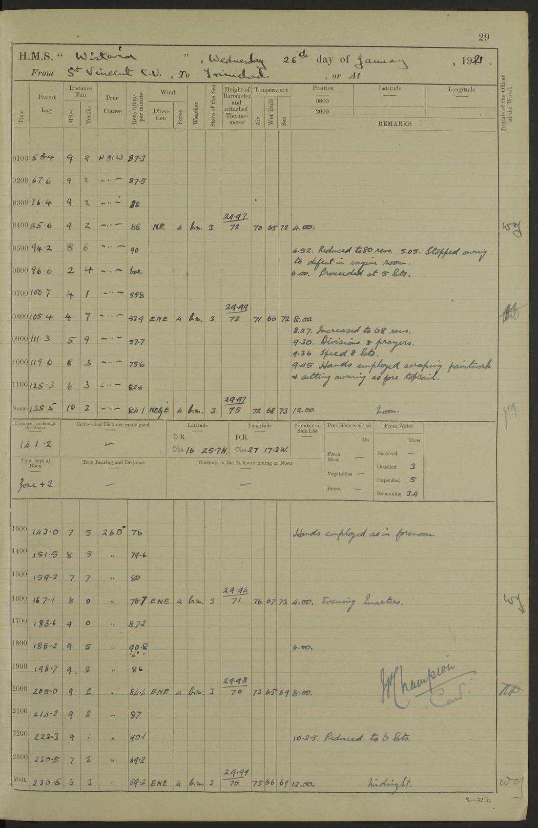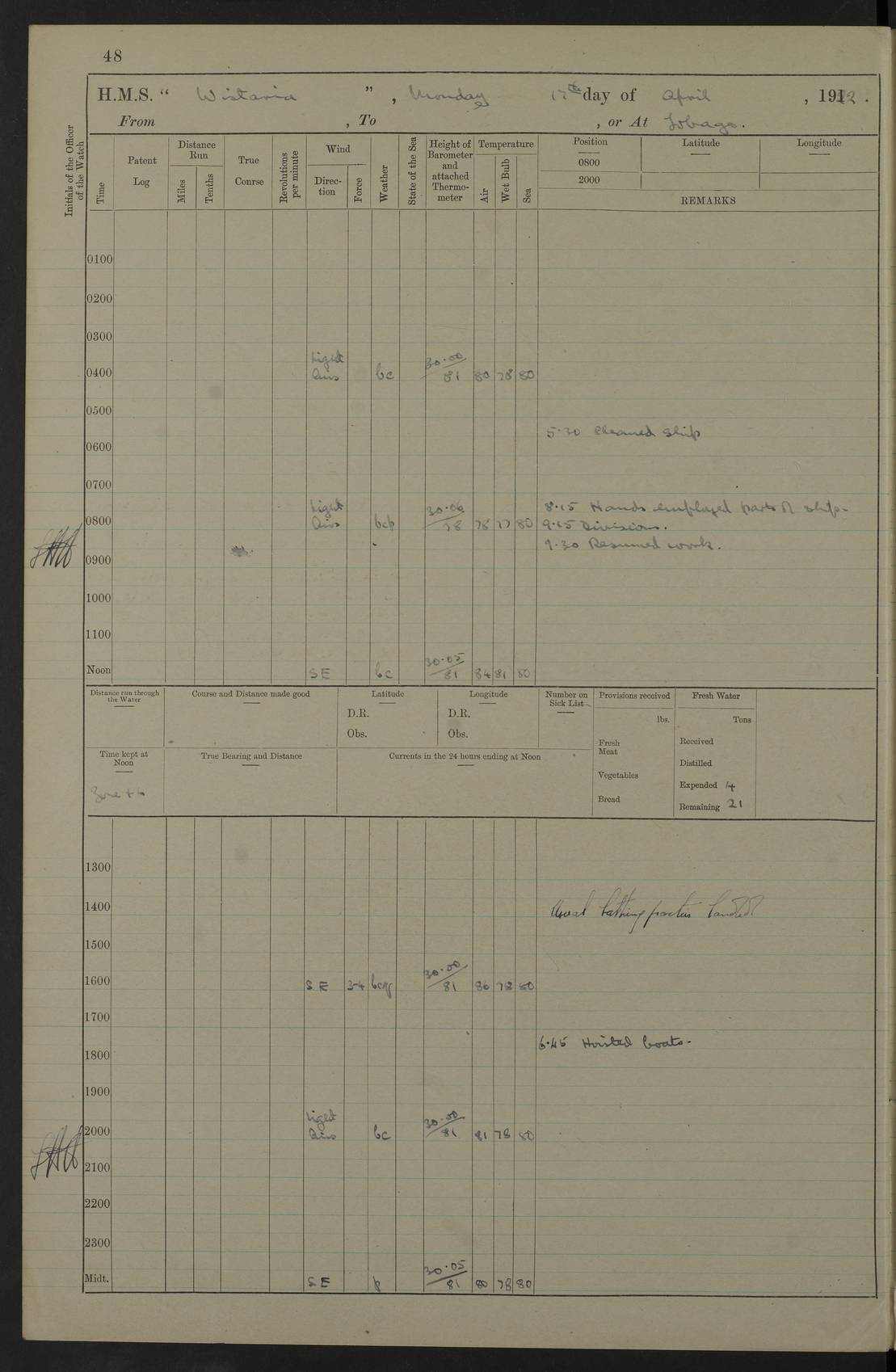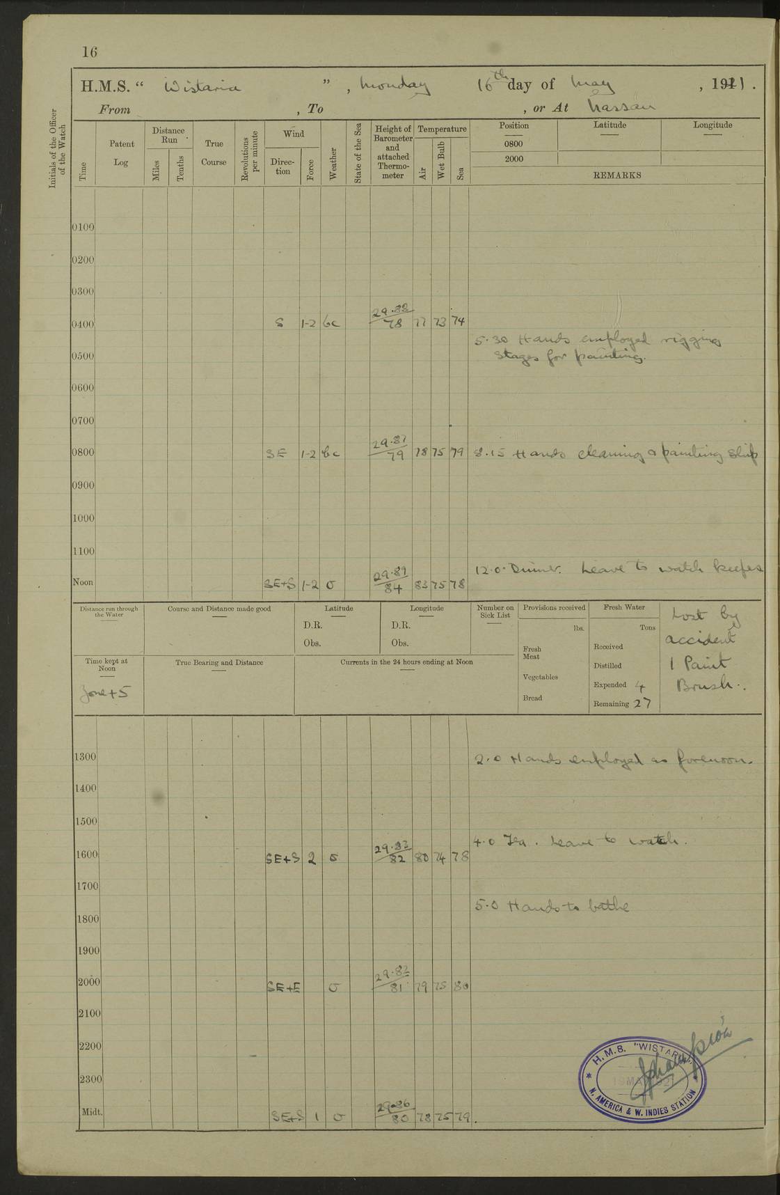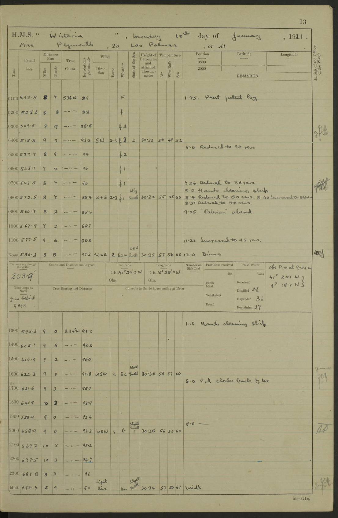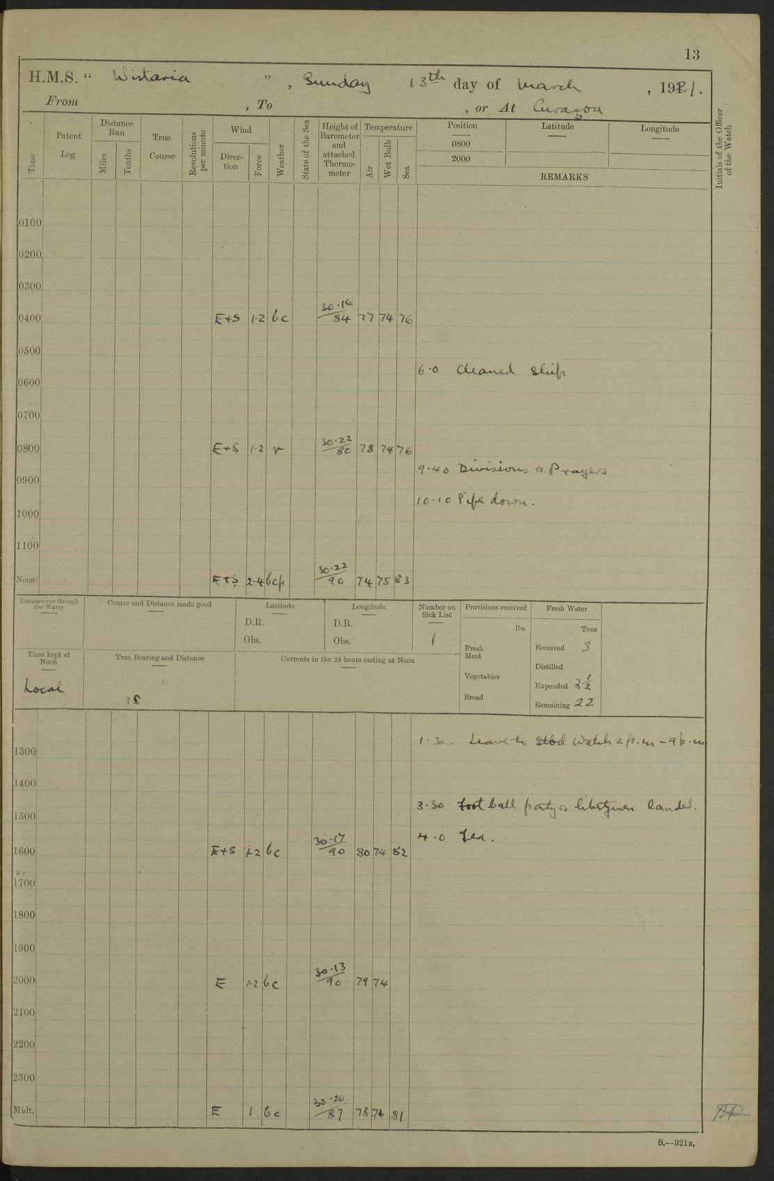 LOGS FOR MARCH 1921 4f73c9fea2fc8ea9030009a4: (https://s3.amazonaws.com:443/oldweather/ADM53-93259/0035_0.jpg) 4f73ca01a2fc8ea9030009ad: (https://s3.amazonaws.com:443/oldweather/ADM53-93260/0003_1.jpg) 1 March 1921 At Gulf of Paria [At San Fernando] Lat 10.38, Long -62.35 5.30am: Hands repairing target & cleaning ship [Repaired target & cleaned ship] [6.10am: Shortened in] [6.30am: Weighed & towed target for “Valerian”. Course SE, 6 knots] 6.53am: Weighed & proceeded. Course SE, 6 knots 7.50am: Stopped. Handed in target [Transferred target] 8.0am: Slipped target 9.15am: Carried out [4”] firing am: Hands painting inboard 11.05am: Came to with Starboard anchor 1½ shackles Anchor bearings: Farralla Rock S4W, Chagrin Hill S82E, Pierre Point N30E 1.15pm: Paid hands [monthly payment] 2.0pm: Hands painting & cleaning [ship] Number on sick list: - [Farralla Rock: perhaps misspelt Farrallon Rock] [Chagrin Hill: perhaps Mon Chagrin Hill] 4f73ca01a2fc8ea9030009ae: (https://s3.amazonaws.com:443/oldweather/ADM53-93260/0004_0.jpg) 2 March 1921 At Brighton Pier Lat 10.38, Long -62.35 8.30am: Weighed & proceeded to Brighton 9.40am: Let go Port anchor 2 shackles 10.30am: Sent provisions to “Valerian” Lost overboard by accident: Magazine Lewis Gun: One in number; Cartr. S.A. .303 belt: 47 in number 1.15pm: Landed liberty men 6.15pm: Liberty men returned. S. P. O. Edwards brought on board dead Number on sick list: 1.D.D. 4f73ca02a2fc8ea9030009af: (https://s3.amazonaws.com:443/oldweather/ADM53-93260/0004_1.jpg) H.M.S “Wistaria” at Trinidad. 3rd March 1921 Return of deaths on board H.M.S. “Wistaria” Date of death. 2nd March 1921. Name & Surname of Deceased. William Edwards. Sex. Male. Age. 27 years, 1 month. Rating. Stoker Petty Officer, Royal Navy. Nationality. English. Last place of Abode. H.M.S. “Wistaria”, lying off Brighton Pier, Trinidad. Cause of Death. Shock following rupture of spleen. 4f73ca02a2fc8ea9030009b0: (https://s3.amazonaws.com:443/oldweather/ADM53-93260/0005_0.jpg) 4f73ca03a2fc8ea9030009b1: (https://s3.amazonaws.com:443/oldweather/ADM53-93260/0005_1.jpg) 3 March 1921 At Port of Spain Lat 10.66, Long -61.55 5.30am: Weighed & proceeded to Port of Spain. Course N19E, 10 knots 8.0am: Came to with Starboard anchor, 1 shackles 9.55am: Discharged S.P.O. Edwards to Colonial Hospital, dead 3.30pm: Funeral Party & mourners landed 4.30pm: Half masted colours 5.30pm: Re-hoisted colours 6.30pm: Funeral parties returned 4f73ca03a2fc8ea9030009b2: (https://s3.amazonaws.com:443/oldweather/ADM53-93260/0006_0.jpg) 4 March 1921 At Port of Spain Lat 10.66, Long -61.55 5.55am: Weighed & proceeded. Course & speeds as required for battle practice 7.15am: Carried out battle practice 8.0am: Took target in tow for “Valerian” battle practice 8.30am: Set course for Port of Spain N25E, 8 knots 9.30am: Hauled in target 10.0am: Anchored & prepared divers to clear wire from rudder 10.30am: Wire cleaned. Weighed & proceeded. Target Capsized 11.45am: Righted target and proceeded 12.15pm: Came to Starboard anchor, 1 shackle 2.45pm: Hands up stanchions & respread awnings 3.30pm: Coal lighter secured alongside 5.40pm: Water boat secured alongside 4f73ca03a2fc8ea9030009b3: (https://s3.amazonaws.com:443/oldweather/ADM53-93260/0006_1.jpg) 5 March 1921 At Port of Spain Lat 10.66, Long -61.55 5.30am: Hands coal ship 7.0am: Received fresh provisions 10.45am: Finished coaling. Wash down upper decks 4.0pm: Evening Quarters. Read warrants 1-2-3-4 Number on sick list: 1 4f73ca04a2fc8ea9030009b4: (https://s3.amazonaws.com:443/oldweather/ADM53-93260/0007_0.jpg) 6 March 1921 At Port of Spain Lat 10.66, Long -61.55 9.45am: Divisions & prayers Number on sick list: 1 4f73ca04a2fc8ea9030009b5: (https://s3.amazonaws.com:443/oldweather/ADM53-93260/0007_1.jpg) 7 March 1921 At Port of Spain Lat 10.66, Long -61.55 6.30am: Hoisted boat 7.24am: Weighed & proceeded. S19W, 14 knots 9.30am: Anchored off Brighton Pier 10.0am: Held Court of Inquiry on death of S.P.O Edwards 1.0pm: Weighed & proceeded to Port of Spain. Course N19E, 14 knots 3.05pm: Anchored Number on sick list: 1 4f73ca04a2fc8ea9030009b6: (https://s3.amazonaws.com:443/oldweather/ADM53-93260/0008_0.jpg) 8 March 1921 At Port of Spain Lat 10.66, Long -61.55 7.50am: Shortened in 8.0am: Weighed & proceeded to Chaguaramas Bay at 12 knots 8.45am: Anchored 9.0am: All available seamen landed to haul up target. Sent provisions to “Valerian” 11.45am: Target party returned. Hoisted boats noon: Weighed & proceeded to Port of Spain at 12 knots 12.30pm: Anchored pm: Hands securing ship for sea 5.05pm: Colonel Glasgow arrived on board for passage to Jamaica 6.0pm: Weighed & proceeded at 11 knots. Course as required to pass through Bocas de Navios 7.0pm: Streamed Patent log 7.10pm: Chacachacare Lt abeam, 6 cables. Course N50W 7.47pm: Penas Point abeam [Boca de Navios: between Huevos and Chacachacare Islands. Also here] [Chacachacare Light: is exhibited from a white concrete tower, 30 feet high, on the northern end of the island] 4f73ca05a2fc8ea9030009b7: (https://s3.amazonaws.com:443/oldweather/ADM53-93260/0008_1.jpg) 9 March 1921 From Port of Spain, Trinidad, to Curaçoa Lat 11.36, Long -64.9 5.55am: Los Frayles Island abeam, 1 mile 6.35am: Altered course N77W. Cabo de la Isla abeam, 2 miles am: Hands scraping & painting inboard. Boats crews working about boats am: Turned 1st and 2nd whalers falls end for end pm: Hands painting, turning whaler falls end for end & scraping motor boat 6.0pm: Sighted Orchilla Isles N26W 9.05pm: Sighted El Rouke Lt N10W [Cabo de la Isla, also known as Cabo Negro] [El Rouke Lt: perhaps misspelt El Roque Light. A light was exhibited from a lighthouse on the northeast hill of El Roque] 4f73ca05a2fc8ea9030009b8: (https://s3.amazonaws.com:443/oldweather/ADM53-93260/0009_0.jpg) 10 March 1921 From Trinidad to Curaçoa and at Curaçoa Lat 10.66, Long -61.55 8.23am: Little Curaçoa Lt abeam 9.25am: Hauled in patent log 10.0am: Stopped for Port Health Off