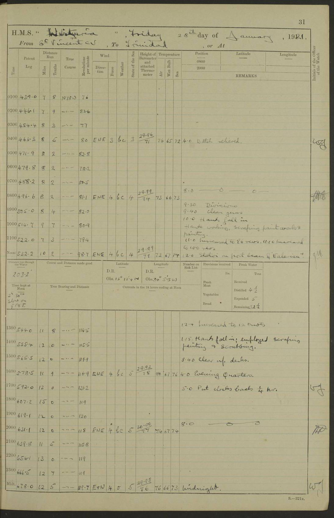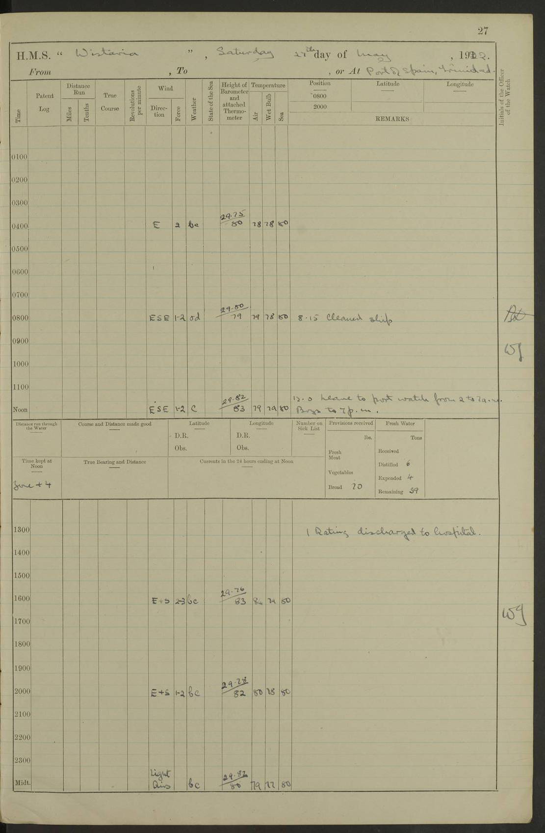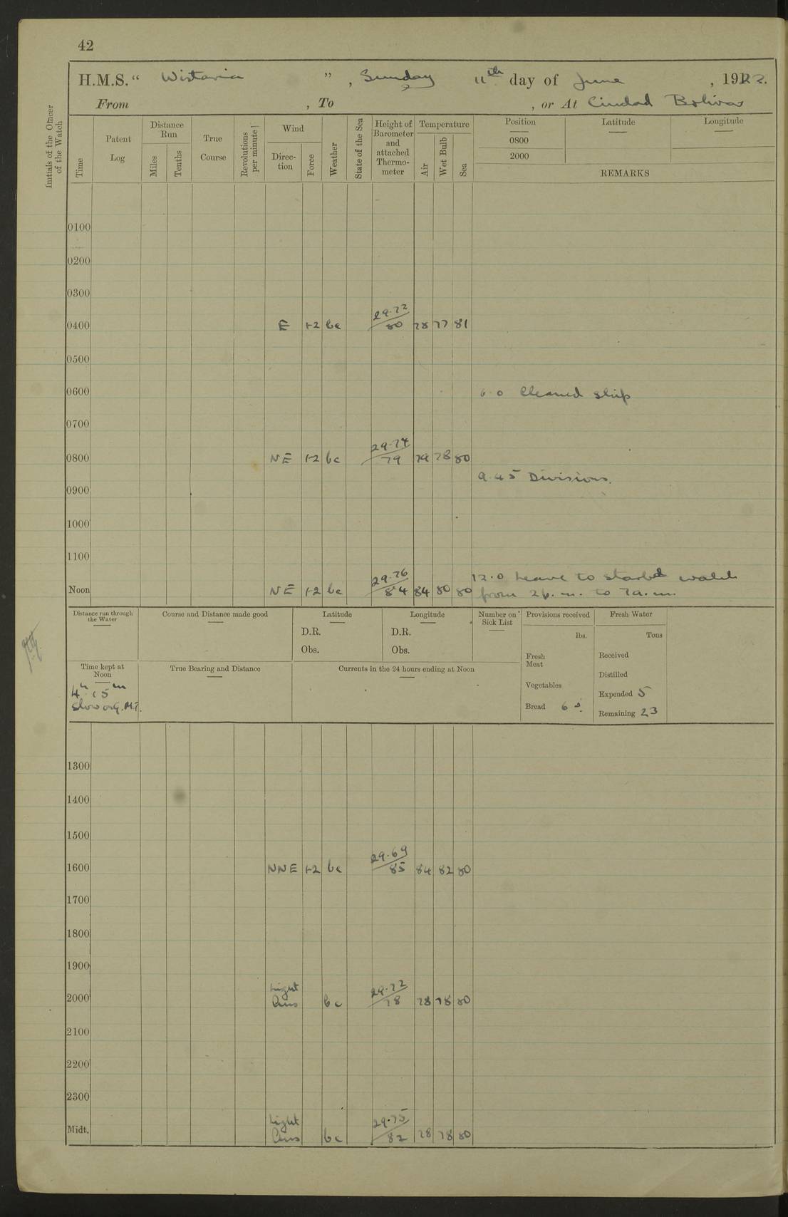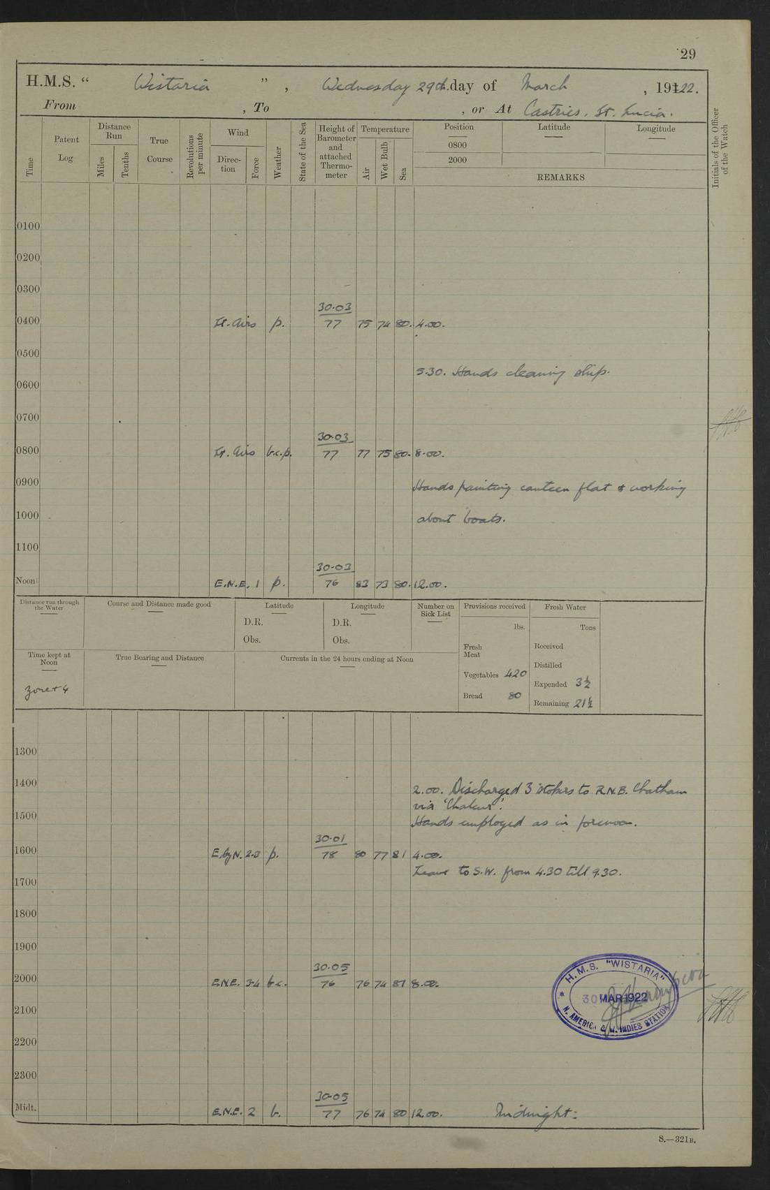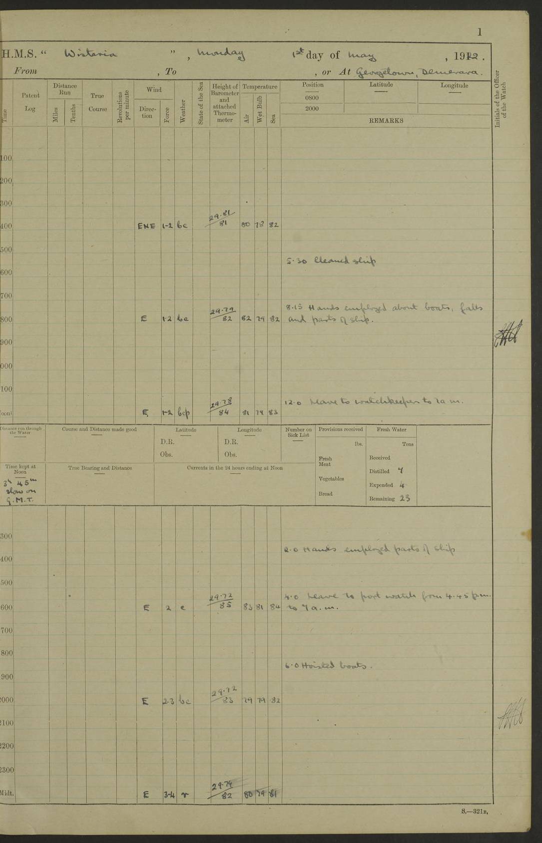 LOGS FOR MARCH 1921 4f73c9fea2fc8ea9030009a4: (https://s3.amazonaws.com:443/oldweather/ADM53-93259/0035_0.jpg) 4f73ca01a2fc8ea9030009ad: (https://s3.amazonaws.com:443/oldweather/ADM53-93260/0003_1.jpg) 1 March 1921 At Gulf of Paria [At San Fernando] Lat 10.38, Long -62.35 5.30am: Hands repairing target & cleaning ship [Repaired target & cleaned ship] [6.10am: Shortened in] [6.30am: Weighed & towed target for “Valerian”. Course SE, 6 knots] 6.53am: Weighed & proceeded. Course SE, 6 knots 7.50am: Stopped. Handed in target [Transferred target] 8.0am: Slipped target 9.15am: Carried out [4”] firing am: Hands painting inboard 11.05am: Came to with Starboard anchor 1½ shackles Anchor bearings: Farralla Rock S4W, Chagrin Hill S82E, Pierre Point N30E 1.15pm: Paid hands [monthly payment] 2.0pm: Hands painting & cleaning [ship] Number on sick list: - [Farralla Rock: perhaps misspelt Farrallon Rock] [Chagrin Hill: perhaps Mon Chagrin Hill] 4f73ca01a2fc8ea9030009ae: (https://s3.amazonaws.com:443/oldweather/ADM53-93260/0004_0.jpg) 2 March 1921 At Brighton Pier Lat 10.38, Long -62.35 8.30am: Weighed & proceeded to Brighton 9.40am: Let go Port anchor 2 shackles 10.30am: Sent provisions to “Valerian” Lost overboard by accident: Magazine Lewis Gun: One in number; Cartr. S.A. .303 belt: 47 in number 1.15pm: Landed liberty men 6.15pm: Liberty men returned. S. P. O. Edwards brought on board dead Number on sick list: 1.D.D. 4f73ca02a2fc8ea9030009af: (https://s3.amazonaws.com:443/oldweather/ADM53-93260/0004_1.jpg) H.M.S “Wistaria” at Trinidad. 3rd March 1921 Return of deaths on board H.M.S. “Wistaria” Date of death. 2nd March 1921. Name & Surname of Deceased. William Edwards. Sex. Male. Age. 27 years, 1 month. Rating. Stoker Petty Officer, Royal Navy. Nationality. English. Last place of Abode. H.M.S. “Wistaria”, lying off Brighton Pier, Trinidad. Cause of Death. Shock following rupture of spleen. 4f73ca02a2fc8ea9030009b0: (https://s3.amazonaws.com:443/oldweather/ADM53-93260/0005_0.jpg) 4f73ca03a2fc8ea9030009b1: (https://s3.amazonaws.com:443/oldweather/ADM53-93260/0005_1.jpg) 3 March 1921 At Port of Spain Lat 10.66, Long -61.55 5.30am: Weighed & proceeded to Port of Spain. Course N19E, 10 knots 8.0am: Came to with Starboard anchor, 1 shackles 9.55am: Discharged S.P.O. Edwards to Colonial Hospital, dead 3.30pm: Funeral Party & mourners landed 4.30pm: Half masted colours 5.30pm: Re-hoisted colours 6.30pm: Funeral parties returned 4f73ca03a2fc8ea9030009b2: (https://s3.amazonaws.com:443/oldweather/ADM53-93260/0006_0.jpg) 4 March 1921 At Port of Spain Lat 10.66, Long -61.55 5.55am: Weighed & proceeded. Course & speeds as required for battle practice 7.15am: Carried out battle practice 8.0am: Took target in tow for “Valerian” battle practice 8.30am: Set course for Port of Spain N25E, 8 knots 9.30am: Hauled in target 10.0am: Anchored & prepared divers to clear wire from rudder 10.30am: Wire cleaned. Weighed & proceeded. Target Capsized 11.45am: Righted target and proceeded 12.15pm: Came to Starboard anchor, 1 shackle 2.45pm: Hands up stanchions & respread awnings 3.30pm: Coal lighter secured alongside 5.40pm: Water boat secured alongside 4f73ca03a2fc8ea9030009b3: (https://s3.amazonaws.com:443/oldweather/ADM53-93260/0006_1.jpg) 5 March 1921 At Port of Spain Lat 10.66, Long -61.55 5.30am: Hands coal ship 7.0am: Received fresh provisions 10.45am: Finished coaling. Wash down upper decks 4.0pm: Evening Quarters. Read warrants 1-2-3-4 Number on sick list: 1 4f73ca04a2fc8ea9030009b4: (https://s3.amazonaws.com:443/oldweather/ADM53-93260/0007_0.jpg) 6 March 1921 At Port of Spain Lat 10.66, Long -61.55 9.45am: Divisions & prayers Number on sick list: 1 4f73ca04a2fc8ea9030009b5: (https://s3.amazonaws.com:443/oldweather/ADM53-93260/0007_1.jpg) 7 March 1921 At Port of Spain Lat 10.66, Long -61.55 6.30am: Hoisted boat 7.24am: Weighed & proceeded. S19W, 14 knots 9.30am: Anchored off Brighton Pier 10.0am: Held Court of Inquiry on death of S.P.O Edwards 1.0pm: Weighed & proceeded to Port of Spain. Course N19E, 14 knots 3.05pm: Anchored Number on sick list: 1 4f73ca04a2fc8ea9030009b6: (https://s3.amazonaws.com:443/oldweather/ADM53-93260/0008_0.jpg) 8 March 1921 At Port of Spain Lat 10.66, Long -61.55 7.50am: Shortened in 8.0am: Weighed & proceeded to Chaguaramas Bay at 12 knots 8.45am: Anchored 9.0am: All available seamen landed to haul up target. Sent provisions to “Valerian” 11.45am: Target party returned. Hoisted boats noon: Weighed & proceeded to Port of Spain at 12 knots 12.30pm: Anchored pm: Hands securing ship for sea 5.05pm: Colonel Glasgow arrived on board for passage to Jamaica 6.0pm: Weighed & proceeded at 11 knots. Course as required to pass through Bocas de Navios 7.0pm: Streamed Patent log 7.10pm: Chacachacare Lt abeam, 6 cables. Course N50W 7.47pm: Penas Point abeam [Boca de Navios: between Huevos and Chacachacare Islands. Also here] [Chacachacare Light: is exhibited from a white concrete tower, 30 feet high, on the northern end of the island] 4f73ca05a2fc8ea9030009b7: (https://s3.amazonaws.com:443/oldweather/ADM53-93260/0008_1.jpg) 9 March 1921 From Port of Spain, Trinidad, to Curaçoa Lat 11.36, Long -64.9 5.55am: Los Frayles Island abeam, 1 mile 6.35am: Altered course N77W. Cabo de la Isla abeam, 2 miles am: Hands scraping & painting inboard. Boats crews working about boats am: Turned 1st and 2nd whalers falls end for end pm: Hands painting, turning whaler falls end for end & scraping motor boat 6.0pm: Sighted Orchilla Isles N26W 9.05pm: Sighted El Rouke Lt N10W [Cabo de la Isla, also known as Cabo Negro] [El Rouke Lt: perhaps misspelt El Roque Light. A light was exhibited from a lighthouse on the northeast hill of El Roque] 4f73ca05a2fc8ea9030009b8: (https://s3.amazonaws.com:443/oldweather/ADM53-93260/0009_0.jpg) 10 March 1921 From Trinidad to Curaçoa and at Curaçoa Lat 10.66, Long -61.55 8.23am: Little Curaçoa Lt abeam 9.25am: Hauled in patent log 10.0am: Stopped for Port Health Off