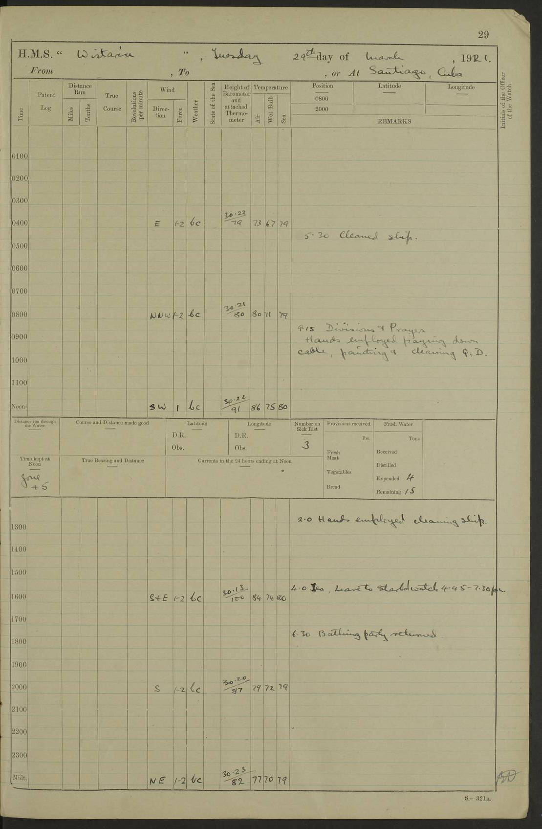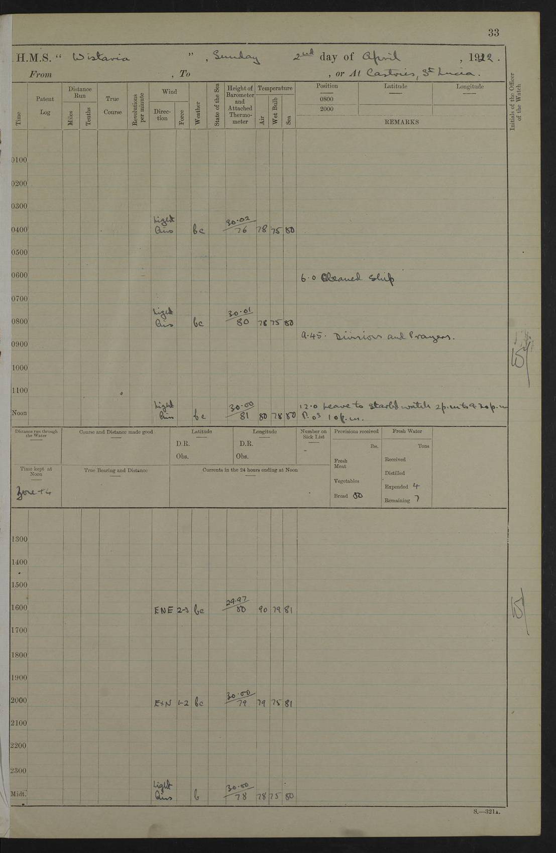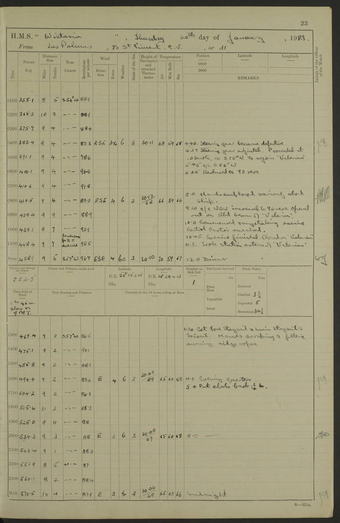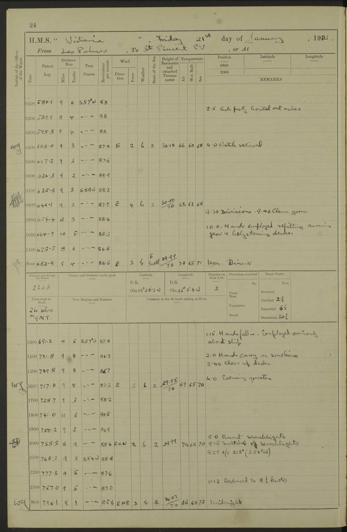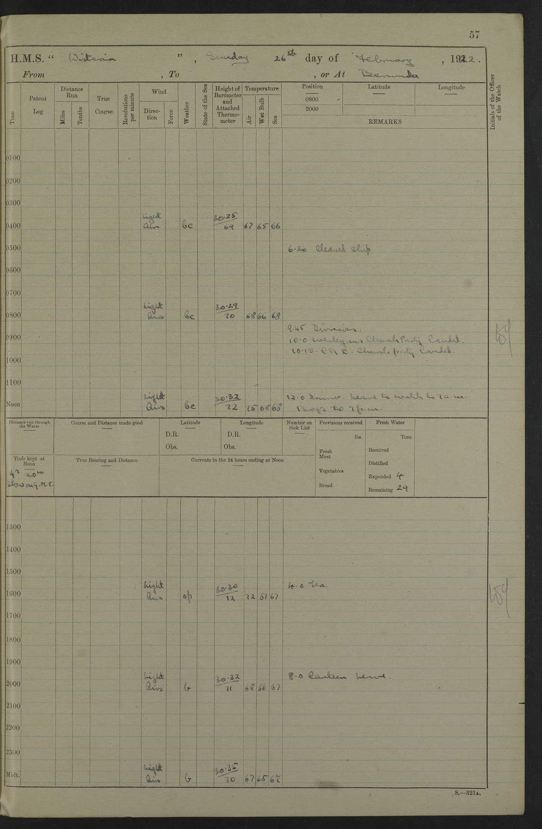 LOGS FOR MARCH 1921 4f73c9fea2fc8ea9030009a4: (https://s3.amazonaws.com:443/oldweather/ADM53-93259/0035_0.jpg) 4f73ca01a2fc8ea9030009ad: (https://s3.amazonaws.com:443/oldweather/ADM53-93260/0003_1.jpg) 1 March 1921 At Gulf of Paria [At San Fernando] Lat 10.38, Long -62.35 5.30am: Hands repairing target & cleaning ship [Repaired target & cleaned ship] [6.10am: Shortened in] [6.30am: Weighed & towed target for “Valerian”. Course SE, 6 knots] 6.53am: Weighed & proceeded. Course SE, 6 knots 7.50am: Stopped. Handed in target [Transferred target] 8.0am: Slipped target 9.15am: Carried out [4”] firing am: Hands painting inboard 11.05am: Came to with Starboard anchor 1½ shackles Anchor bearings: Farralla Rock S4W, Chagrin Hill S82E, Pierre Point N30E 1.15pm: Paid hands [monthly payment] 2.0pm: Hands painting & cleaning [ship] Number on sick list: - [Farralla Rock: perhaps misspelt Farrallon Rock] [Chagrin Hill: perhaps Mon Chagrin Hill] 4f73ca01a2fc8ea9030009ae: (https://s3.amazonaws.com:443/oldweather/ADM53-93260/0004_0.jpg) 2 March 1921 At Brighton Pier Lat 10.38, Long -62.35 8.30am: Weighed & proceeded to Brighton 9.40am: Let go Port anchor 2 shackles 10.30am: Sent provisions to “Valerian” Lost overboard by accident: Magazine Lewis Gun: One in number; Cartr. S.A. .303 belt: 47 in number 1.15pm: Landed liberty men 6.15pm: Liberty men returned. S. P. O. Edwards brought on board dead Number on sick list: 1.D.D. 4f73ca02a2fc8ea9030009af: (https://s3.amazonaws.com:443/oldweather/ADM53-93260/0004_1.jpg) H.M.S “Wistaria” at Trinidad. 3rd March 1921 Return of deaths on board H.M.S. “Wistaria” Date of death. 2nd March 1921. Name & Surname of Deceased. William Edwards. Sex. Male. Age. 27 years, 1 month. Rating. Stoker Petty Officer, Royal Navy. Nationality. English. Last place of Abode. H.M.S. “Wistaria”, lying off Brighton Pier, Trinidad. Cause of Death. Shock following rupture of spleen. 4f73ca02a2fc8ea9030009b0: (https://s3.amazonaws.com:443/oldweather/ADM53-93260/0005_0.jpg) 4f73ca03a2fc8ea9030009b1: (https://s3.amazonaws.com:443/oldweather/ADM53-93260/0005_1.jpg) 3 March 1921 At Port of Spain Lat 10.66, Long -61.55 5.30am: Weighed & proceeded to Port of Spain. Course N19E, 10 knots 8.0am: Came to with Starboard anchor, 1 shackles 9.55am: Discharged S.P.O. Edwards to Colonial Hospital, dead 3.30pm: Funeral Party & mourners landed 4.30pm: Half masted colours 5.30pm: Re-hoisted colours 6.30pm: Funeral parties returned 4f73ca03a2fc8ea9030009b2: (https://s3.amazonaws.com:443/oldweather/ADM53-93260/0006_0.jpg) 4 March 1921 At Port of Spain Lat 10.66, Long -61.55 5.55am: Weighed & proceeded. Course & speeds as required for battle practice 7.15am: Carried out battle practice 8.0am: Took target in tow for “Valerian” battle practice 8.30am: Set course for Port of Spain N25E, 8 knots 9.30am: Hauled in target 10.0am: Anchored & prepared divers to clear wire from rudder 10.30am: Wire cleaned. Weighed & proceeded. Target Capsized 11.45am: Righted target and proceeded 12.15pm: Came to Starboard anchor, 1 shackle 2.45pm: Hands up stanchions & respread awnings 3.30pm: Coal lighter secured alongside 5.40pm: Water boat secured alongside 4f73ca03a2fc8ea9030009b3: (https://s3.amazonaws.com:443/oldweather/ADM53-93260/0006_1.jpg) 5 March 1921 At Port of Spain Lat 10.66, Long -61.55 5.30am: Hands coal ship 7.0am: Received fresh provisions 10.45am: Finished coaling. Wash down upper decks 4.0pm: Evening Quarters. Read warrants 1-2-3-4 Number on sick list: 1 4f73ca04a2fc8ea9030009b4: (https://s3.amazonaws.com:443/oldweather/ADM53-93260/0007_0.jpg) 6 March 1921 At Port of Spain Lat 10.66, Long -61.55 9.45am: Divisions & prayers Number on sick list: 1 4f73ca04a2fc8ea9030009b5: (https://s3.amazonaws.com:443/oldweather/ADM53-93260/0007_1.jpg) 7 March 1921 At Port of Spain Lat 10.66, Long -61.55 6.30am: Hoisted boat 7.24am: Weighed & proceeded. S19W, 14 knots 9.30am: Anchored off Brighton Pier 10.0am: Held Court of Inquiry on death of S.P.O Edwards 1.0pm: Weighed & proceeded to Port of Spain. Course N19E, 14 knots 3.05pm: Anchored Number on sick list: 1 4f73ca04a2fc8ea9030009b6: (https://s3.amazonaws.com:443/oldweather/ADM53-93260/0008_0.jpg) 8 March 1921 At Port of Spain Lat 10.66, Long -61.55 7.50am: Shortened in 8.0am: Weighed & proceeded to Chaguaramas Bay at 12 knots 8.45am: Anchored 9.0am: All available seamen landed to haul up target. Sent provisions to “Valerian” 11.45am: Target party returned. Hoisted boats noon: Weighed & proceeded to Port of Spain at 12 knots 12.30pm: Anchored pm: Hands securing ship for sea 5.05pm: Colonel Glasgow arrived on board for passage to Jamaica 6.0pm: Weighed & proceeded at 11 knots. Course as required to pass through Bocas de Navios 7.0pm: Streamed Patent log 7.10pm: Chacachacare Lt abeam, 6 cables. Course N50W 7.47pm: Penas Point abeam [Boca de Navios: between Huevos and Chacachacare Islands. Also here] [Chacachacare Light: is exhibited from a white concrete tower, 30 feet high, on the northern end of the island] 4f73ca05a2fc8ea9030009b7: (https://s3.amazonaws.com:443/oldweather/ADM53-93260/0008_1.jpg) 9 March 1921 From Port of Spain, Trinidad, to Curaçoa Lat 11.36, Long -64.9 5.55am: Los Frayles Island abeam, 1 mile 6.35am: Altered course N77W. Cabo de la Isla abeam, 2 miles am: Hands scraping & painting inboard. Boats crews working about boats am: Turned 1st and 2nd whalers falls end for end pm: Hands painting, turning whaler falls end for end & scraping motor boat 6.0pm: Sighted Orchilla Isles N26W 9.05pm: Sighted El Rouke Lt N10W [Cabo de la Isla, also known as Cabo Negro] [El Rouke Lt: perhaps misspelt El Roque Light. A light was exhibited from a lighthouse on the northeast hill of El Roque] 4f73ca05a2fc8ea9030009b8: (https://s3.amazonaws.com:443/oldweather/ADM53-93260/0009_0.jpg) 10 March 1921 From Trinidad to Curaçoa and at Curaçoa Lat 10.66, Long -61.55 8.23am: Little Curaçoa Lt abeam 9.25am: Hauled in patent log 10.0am: Stopped for Port Health Off