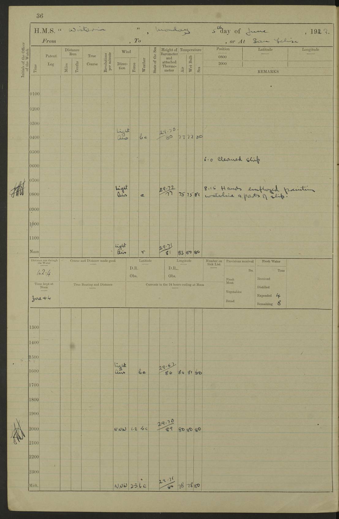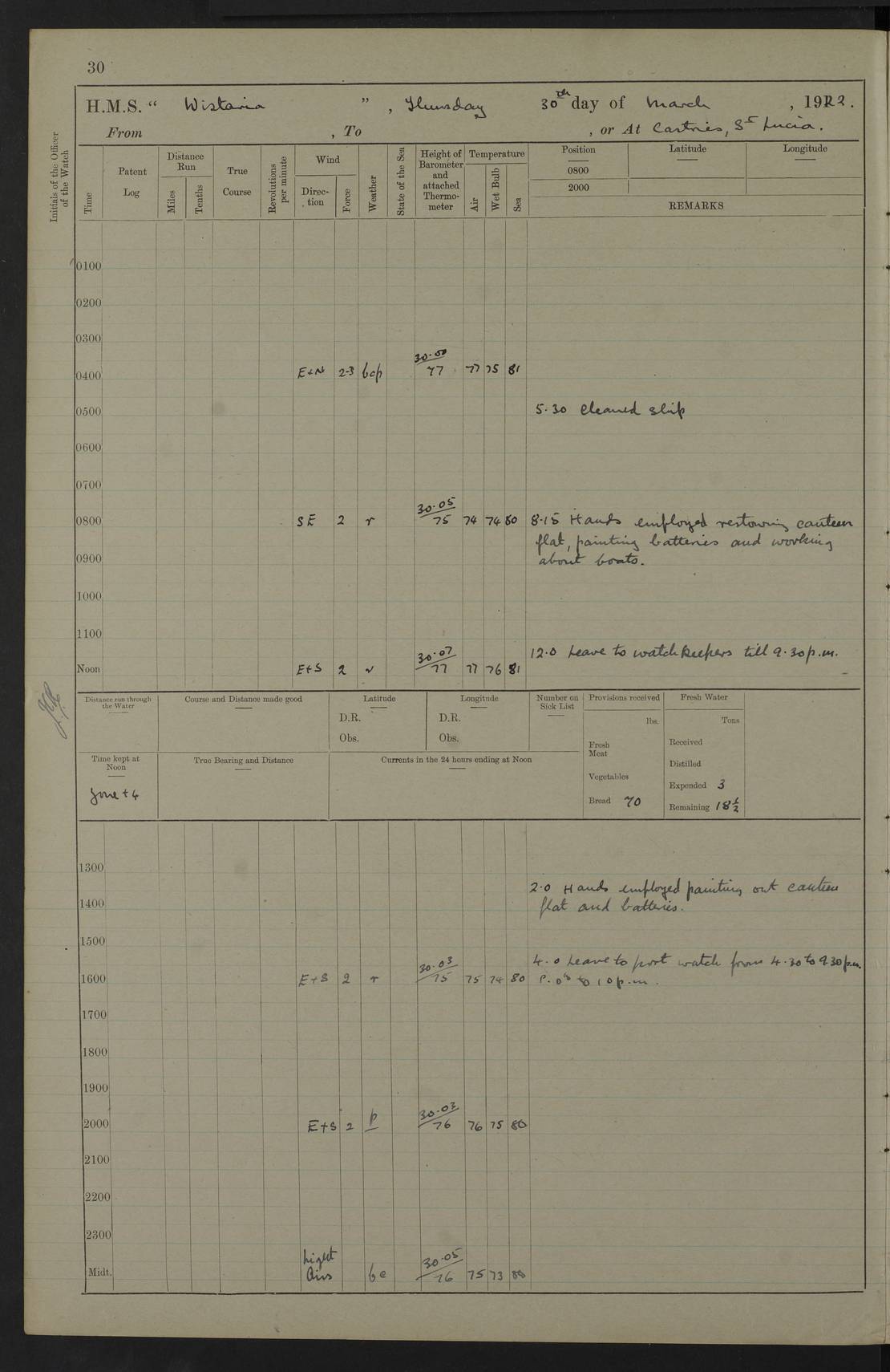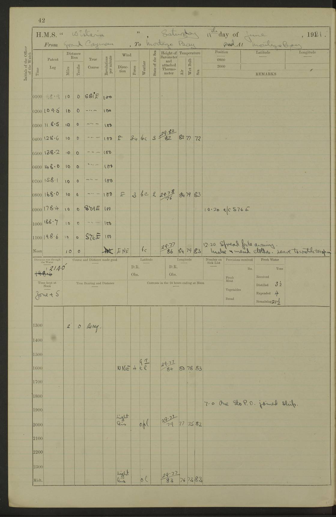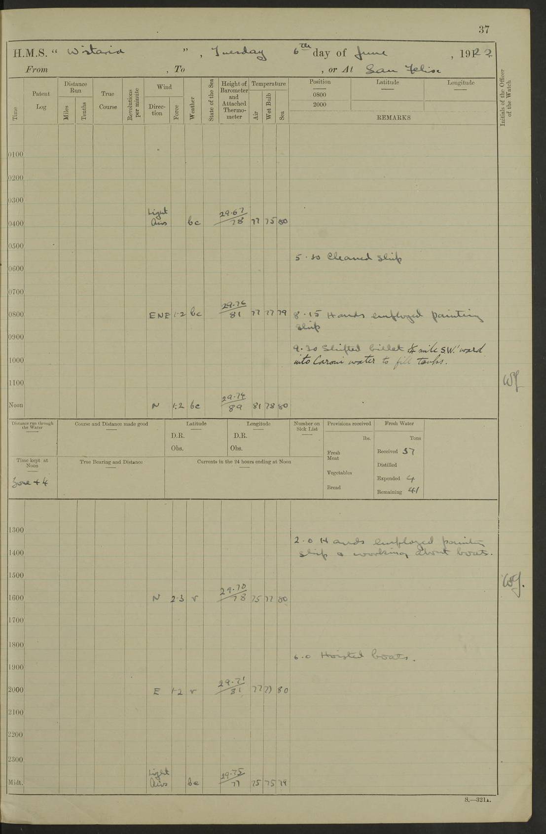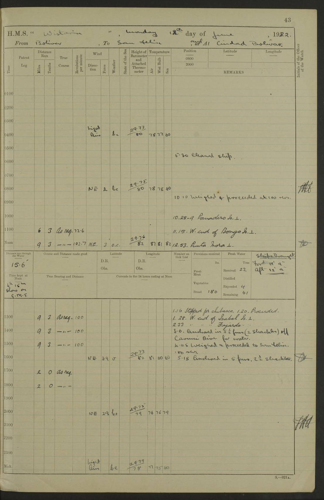 LOGS FOR MARCH 1921 4f73c9fea2fc8ea9030009a4: (https://s3.amazonaws.com:443/oldweather/ADM53-93259/0035_0.jpg) 4f73ca01a2fc8ea9030009ad: (https://s3.amazonaws.com:443/oldweather/ADM53-93260/0003_1.jpg) 1 March 1921 At Gulf of Paria [At San Fernando] Lat 10.38, Long -62.35 5.30am: Hands repairing target & cleaning ship [Repaired target & cleaned ship] [6.10am: Shortened in] [6.30am: Weighed & towed target for “Valerian”. Course SE, 6 knots] 6.53am: Weighed & proceeded. Course SE, 6 knots 7.50am: Stopped. Handed in target [Transferred target] 8.0am: Slipped target 9.15am: Carried out [4”] firing am: Hands painting inboard 11.05am: Came to with Starboard anchor 1½ shackles Anchor bearings: Farralla Rock S4W, Chagrin Hill S82E, Pierre Point N30E 1.15pm: Paid hands [monthly payment] 2.0pm: Hands painting & cleaning [ship] Number on sick list: - [Farralla Rock: perhaps misspelt Farrallon Rock] [Chagrin Hill: perhaps Mon Chagrin Hill] 4f73ca01a2fc8ea9030009ae: (https://s3.amazonaws.com:443/oldweather/ADM53-93260/0004_0.jpg) 2 March 1921 At Brighton Pier Lat 10.38, Long -62.35 8.30am: Weighed & proceeded to Brighton 9.40am: Let go Port anchor 2 shackles 10.30am: Sent provisions to “Valerian” Lost overboard by accident: Magazine Lewis Gun: One in number; Cartr. S.A. .303 belt: 47 in number 1.15pm: Landed liberty men 6.15pm: Liberty men returned. S. P. O. Edwards brought on board dead Number on sick list: 1.D.D. 4f73ca02a2fc8ea9030009af: (https://s3.amazonaws.com:443/oldweather/ADM53-93260/0004_1.jpg) H.M.S “Wistaria” at Trinidad. 3rd March 1921 Return of deaths on board H.M.S. “Wistaria” Date of death. 2nd March 1921. Name & Surname of Deceased. William Edwards. Sex. Male. Age. 27 years, 1 month. Rating. Stoker Petty Officer, Royal Navy. Nationality. English. Last place of Abode. H.M.S. “Wistaria”, lying off Brighton Pier, Trinidad. Cause of Death. Shock following rupture of spleen. 4f73ca02a2fc8ea9030009b0: (https://s3.amazonaws.com:443/oldweather/ADM53-93260/0005_0.jpg) 4f73ca03a2fc8ea9030009b1: (https://s3.amazonaws.com:443/oldweather/ADM53-93260/0005_1.jpg) 3 March 1921 At Port of Spain Lat 10.66, Long -61.55 5.30am: Weighed & proceeded to Port of Spain. Course N19E, 10 knots 8.0am: Came to with Starboard anchor, 1 shackles 9.55am: Discharged S.P.O. Edwards to Colonial Hospital, dead 3.30pm: Funeral Party & mourners landed 4.30pm: Half masted colours 5.30pm: Re-hoisted colours 6.30pm: Funeral parties returned 4f73ca03a2fc8ea9030009b2: (https://s3.amazonaws.com:443/oldweather/ADM53-93260/0006_0.jpg) 4 March 1921 At Port of Spain Lat 10.66, Long -61.55 5.55am: Weighed & proceeded. Course & speeds as required for battle practice 7.15am: Carried out battle practice 8.0am: Took target in tow for “Valerian” battle practice 8.30am: Set course for Port of Spain N25E, 8 knots 9.30am: Hauled in target 10.0am: Anchored & prepared divers to clear wire from rudder 10.30am: Wire cleaned. Weighed & proceeded. Target Capsized 11.45am: Righted target and proceeded 12.15pm: Came to Starboard anchor, 1 shackle 2.45pm: Hands up stanchions & respread awnings 3.30pm: Coal lighter secured alongside 5.40pm: Water boat secured alongside 4f73ca03a2fc8ea9030009b3: (https://s3.amazonaws.com:443/oldweather/ADM53-93260/0006_1.jpg) 5 March 1921 At Port of Spain Lat 10.66, Long -61.55 5.30am: Hands coal ship 7.0am: Received fresh provisions 10.45am: Finished coaling. Wash down upper decks 4.0pm: Evening Quarters. Read warrants 1-2-3-4 Number on sick list: 1 4f73ca04a2fc8ea9030009b4: (https://s3.amazonaws.com:443/oldweather/ADM53-93260/0007_0.jpg) 6 March 1921 At Port of Spain Lat 10.66, Long -61.55 9.45am: Divisions & prayers Number on sick list: 1 4f73ca04a2fc8ea9030009b5: (https://s3.amazonaws.com:443/oldweather/ADM53-93260/0007_1.jpg) 7 March 1921 At Port of Spain Lat 10.66, Long -61.55 6.30am: Hoisted boat 7.24am: Weighed & proceeded. S19W, 14 knots 9.30am: Anchored off Brighton Pier 10.0am: Held Court of Inquiry on death of S.P.O Edwards 1.0pm: Weighed & proceeded to Port of Spain. Course N19E, 14 knots 3.05pm: Anchored Number on sick list: 1 4f73ca04a2fc8ea9030009b6: (https://s3.amazonaws.com:443/oldweather/ADM53-93260/0008_0.jpg) 8 March 1921 At Port of Spain Lat 10.66, Long -61.55 7.50am: Shortened in 8.0am: Weighed & proceeded to Chaguaramas Bay at 12 knots 8.45am: Anchored 9.0am: All available seamen landed to haul up target. Sent provisions to “Valerian” 11.45am: Target party returned. Hoisted boats noon: Weighed & proceeded to Port of Spain at 12 knots 12.30pm: Anchored pm: Hands securing ship for sea 5.05pm: Colonel Glasgow arrived on board for passage to Jamaica 6.0pm: Weighed & proceeded at 11 knots. Course as required to pass through Bocas de Navios 7.0pm: Streamed Patent log 7.10pm: Chacachacare Lt abeam, 6 cables. Course N50W 7.47pm: Penas Point abeam [Boca de Navios: between Huevos and Chacachacare Islands. Also here] [Chacachacare Light: is exhibited from a white concrete tower, 30 feet high, on the northern end of the island] 4f73ca05a2fc8ea9030009b7: (https://s3.amazonaws.com:443/oldweather/ADM53-93260/0008_1.jpg) 9 March 1921 From Port of Spain, Trinidad, to Curaçoa Lat 11.36, Long -64.9 5.55am: Los Frayles Island abeam, 1 mile 6.35am: Altered course N77W. Cabo de la Isla abeam, 2 miles am: Hands scraping & painting inboard. Boats crews working about boats am: Turned 1st and 2nd whalers falls end for end pm: Hands painting, turning whaler falls end for end & scraping motor boat 6.0pm: Sighted Orchilla Isles N26W 9.05pm: Sighted El Rouke Lt N10W [Cabo de la Isla, also known as Cabo Negro] [El Rouke Lt: perhaps misspelt El Roque Light. A light was exhibited from a lighthouse on the northeast hill of El Roque] 4f73ca05a2fc8ea9030009b8: (https://s3.amazonaws.com:443/oldweather/ADM53-93260/0009_0.jpg) 10 March 1921 From Trinidad to Curaçoa and at Curaçoa Lat 10.66, Long -61.55 8.23am: Little Curaçoa Lt abeam 9.25am: Hauled in patent log 10.0am: Stopped for Port Health Off