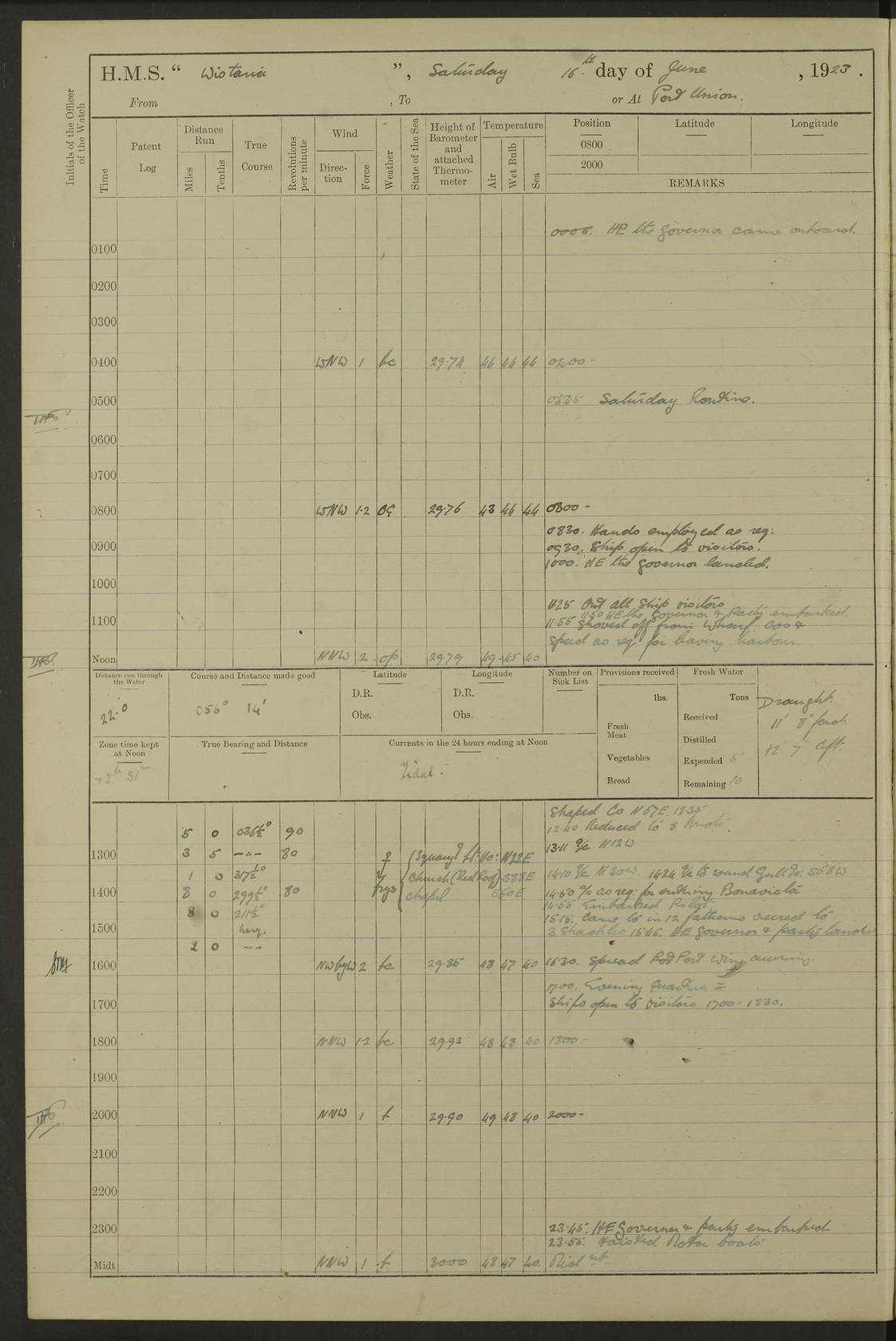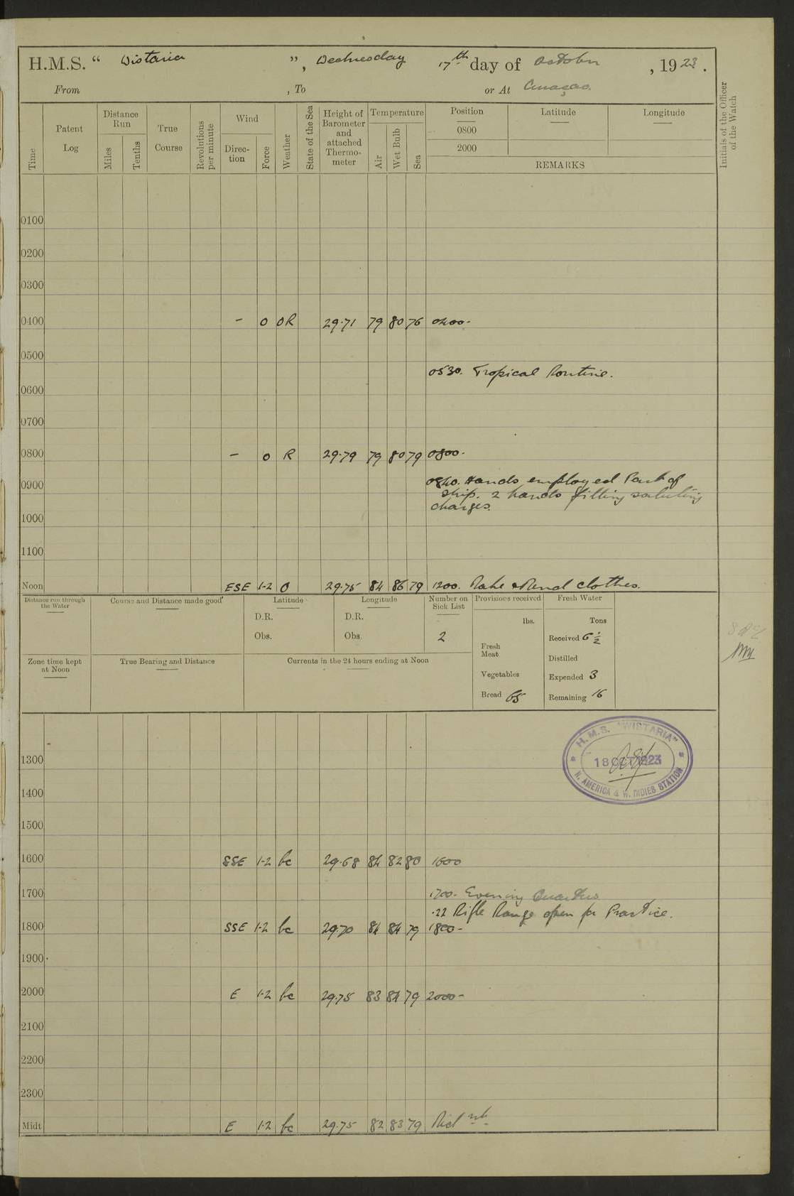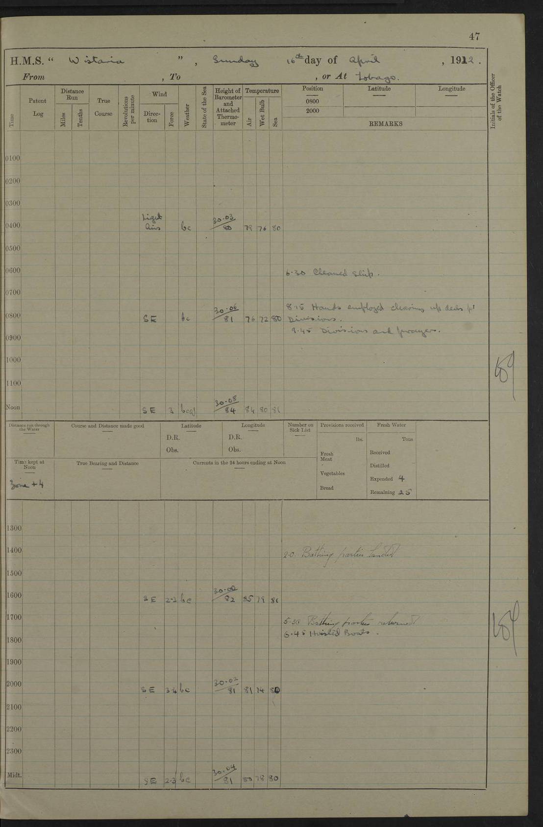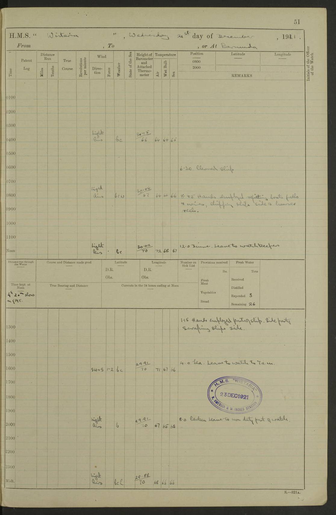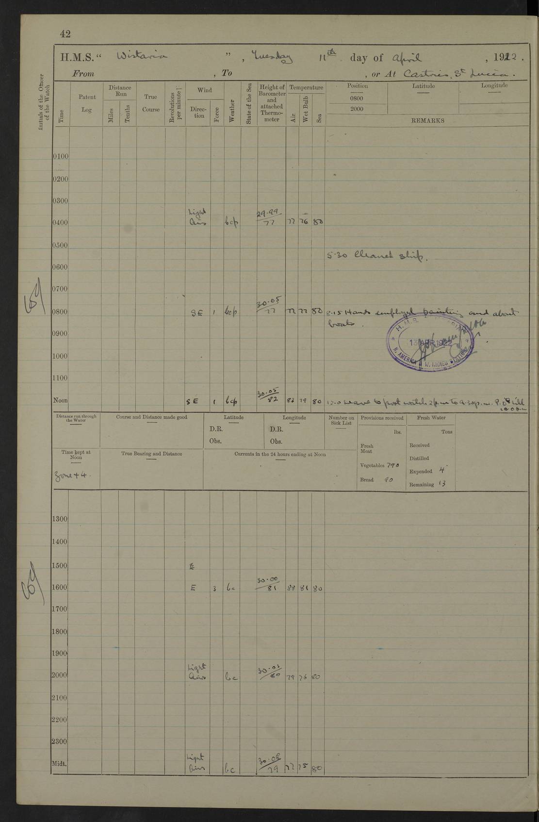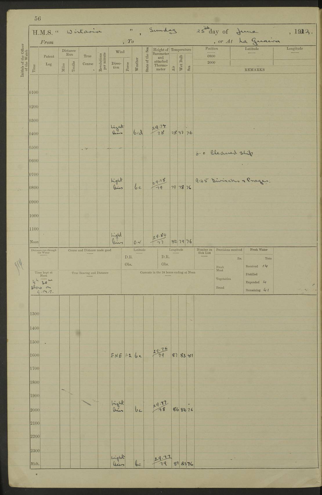 LOGS FOR MARCH 1921 4f73c9fea2fc8ea9030009a4: (https://s3.amazonaws.com:443/oldweather/ADM53-93259/0035_0.jpg) 4f73ca01a2fc8ea9030009ad: (https://s3.amazonaws.com:443/oldweather/ADM53-93260/0003_1.jpg) 1 March 1921 At Gulf of Paria [At San Fernando] Lat 10.38, Long -62.35 5.30am: Hands repairing target & cleaning ship [Repaired target & cleaned ship] [6.10am: Shortened in] [6.30am: Weighed & towed target for “Valerian”. Course SE, 6 knots] 6.53am: Weighed & proceeded. Course SE, 6 knots 7.50am: Stopped. Handed in target [Transferred target] 8.0am: Slipped target 9.15am: Carried out [4”] firing am: Hands painting inboard 11.05am: Came to with Starboard anchor 1½ shackles Anchor bearings: Farralla Rock S4W, Chagrin Hill S82E, Pierre Point N30E 1.15pm: Paid hands [monthly payment] 2.0pm: Hands painting & cleaning [ship] Number on sick list: - [Farralla Rock: perhaps misspelt Farrallon Rock] [Chagrin Hill: perhaps Mon Chagrin Hill] 4f73ca01a2fc8ea9030009ae: (https://s3.amazonaws.com:443/oldweather/ADM53-93260/0004_0.jpg) 2 March 1921 At Brighton Pier Lat 10.38, Long -62.35 8.30am: Weighed & proceeded to Brighton 9.40am: Let go Port anchor 2 shackles 10.30am: Sent provisions to “Valerian” Lost overboard by accident: Magazine Lewis Gun: One in number; Cartr. S.A. .303 belt: 47 in number 1.15pm: Landed liberty men 6.15pm: Liberty men returned. S. P. O. Edwards brought on board dead Number on sick list: 1.D.D. 4f73ca02a2fc8ea9030009af: (https://s3.amazonaws.com:443/oldweather/ADM53-93260/0004_1.jpg) H.M.S “Wistaria” at Trinidad. 3rd March 1921 Return of deaths on board H.M.S. “Wistaria” Date of death. 2nd March 1921. Name & Surname of Deceased. William Edwards. Sex. Male. Age. 27 years, 1 month. Rating. Stoker Petty Officer, Royal Navy. Nationality. English. Last place of Abode. H.M.S. “Wistaria”, lying off Brighton Pier, Trinidad. Cause of Death. Shock following rupture of spleen. 4f73ca02a2fc8ea9030009b0: (https://s3.amazonaws.com:443/oldweather/ADM53-93260/0005_0.jpg) 4f73ca03a2fc8ea9030009b1: (https://s3.amazonaws.com:443/oldweather/ADM53-93260/0005_1.jpg) 3 March 1921 At Port of Spain Lat 10.66, Long -61.55 5.30am: Weighed & proceeded to Port of Spain. Course N19E, 10 knots 8.0am: Came to with Starboard anchor, 1 shackles 9.55am: Discharged S.P.O. Edwards to Colonial Hospital, dead 3.30pm: Funeral Party & mourners landed 4.30pm: Half masted colours 5.30pm: Re-hoisted colours 6.30pm: Funeral parties returned 4f73ca03a2fc8ea9030009b2: (https://s3.amazonaws.com:443/oldweather/ADM53-93260/0006_0.jpg) 4 March 1921 At Port of Spain Lat 10.66, Long -61.55 5.55am: Weighed & proceeded. Course & speeds as required for battle practice 7.15am: Carried out battle practice 8.0am: Took target in tow for “Valerian” battle practice 8.30am: Set course for Port of Spain N25E, 8 knots 9.30am: Hauled in target 10.0am: Anchored & prepared divers to clear wire from rudder 10.30am: Wire cleaned. Weighed & proceeded. Target Capsized 11.45am: Righted target and proceeded 12.15pm: Came to Starboard anchor, 1 shackle 2.45pm: Hands up stanchions & respread awnings 3.30pm: Coal lighter secured alongside 5.40pm: Water boat secured alongside 4f73ca03a2fc8ea9030009b3: (https://s3.amazonaws.com:443/oldweather/ADM53-93260/0006_1.jpg) 5 March 1921 At Port of Spain Lat 10.66, Long -61.55 5.30am: Hands coal ship 7.0am: Received fresh provisions 10.45am: Finished coaling. Wash down upper decks 4.0pm: Evening Quarters. Read warrants 1-2-3-4 Number on sick list: 1 4f73ca04a2fc8ea9030009b4: (https://s3.amazonaws.com:443/oldweather/ADM53-93260/0007_0.jpg) 6 March 1921 At Port of Spain Lat 10.66, Long -61.55 9.45am: Divisions & prayers Number on sick list: 1 4f73ca04a2fc8ea9030009b5: (https://s3.amazonaws.com:443/oldweather/ADM53-93260/0007_1.jpg) 7 March 1921 At Port of Spain Lat 10.66, Long -61.55 6.30am: Hoisted boat 7.24am: Weighed & proceeded. S19W, 14 knots 9.30am: Anchored off Brighton Pier 10.0am: Held Court of Inquiry on death of S.P.O Edwards 1.0pm: Weighed & proceeded to Port of Spain. Course N19E, 14 knots 3.05pm: Anchored Number on sick list: 1 4f73ca04a2fc8ea9030009b6: (https://s3.amazonaws.com:443/oldweather/ADM53-93260/0008_0.jpg) 8 March 1921 At Port of Spain Lat 10.66, Long -61.55 7.50am: Shortened in 8.0am: Weighed & proceeded to Chaguaramas Bay at 12 knots 8.45am: Anchored 9.0am: All available seamen landed to haul up target. Sent provisions to “Valerian” 11.45am: Target party returned. Hoisted boats noon: Weighed & proceeded to Port of Spain at 12 knots 12.30pm: Anchored pm: Hands securing ship for sea 5.05pm: Colonel Glasgow arrived on board for passage to Jamaica 6.0pm: Weighed & proceeded at 11 knots. Course as required to pass through Bocas de Navios 7.0pm: Streamed Patent log 7.10pm: Chacachacare Lt abeam, 6 cables. Course N50W 7.47pm: Penas Point abeam [Boca de Navios: between Huevos and Chacachacare Islands. Also here] [Chacachacare Light: is exhibited from a white concrete tower, 30 feet high, on the northern end of the island] 4f73ca05a2fc8ea9030009b7: (https://s3.amazonaws.com:443/oldweather/ADM53-93260/0008_1.jpg) 9 March 1921 From Port of Spain, Trinidad, to Curaçoa Lat 11.36, Long -64.9 5.55am: Los Frayles Island abeam, 1 mile 6.35am: Altered course N77W. Cabo de la Isla abeam, 2 miles am: Hands scraping & painting inboard. Boats crews working about boats am: Turned 1st and 2nd whalers falls end for end pm: Hands painting, turning whaler falls end for end & scraping motor boat 6.0pm: Sighted Orchilla Isles N26W 9.05pm: Sighted El Rouke Lt N10W [Cabo de la Isla, also known as Cabo Negro] [El Rouke Lt: perhaps misspelt El Roque Light. A light was exhibited from a lighthouse on the northeast hill of El Roque] 4f73ca05a2fc8ea9030009b8: (https://s3.amazonaws.com:443/oldweather/ADM53-93260/0009_0.jpg) 10 March 1921 From Trinidad to Curaçoa and at Curaçoa Lat 10.66, Long -61.55 8.23am: Little Curaçoa Lt abeam 9.25am: Hauled in patent log 10.0am: Stopped for Port Health Off