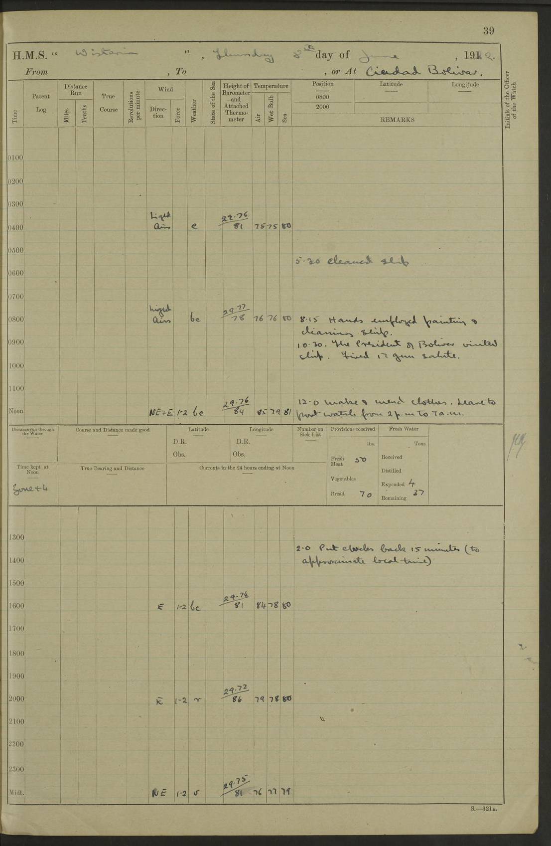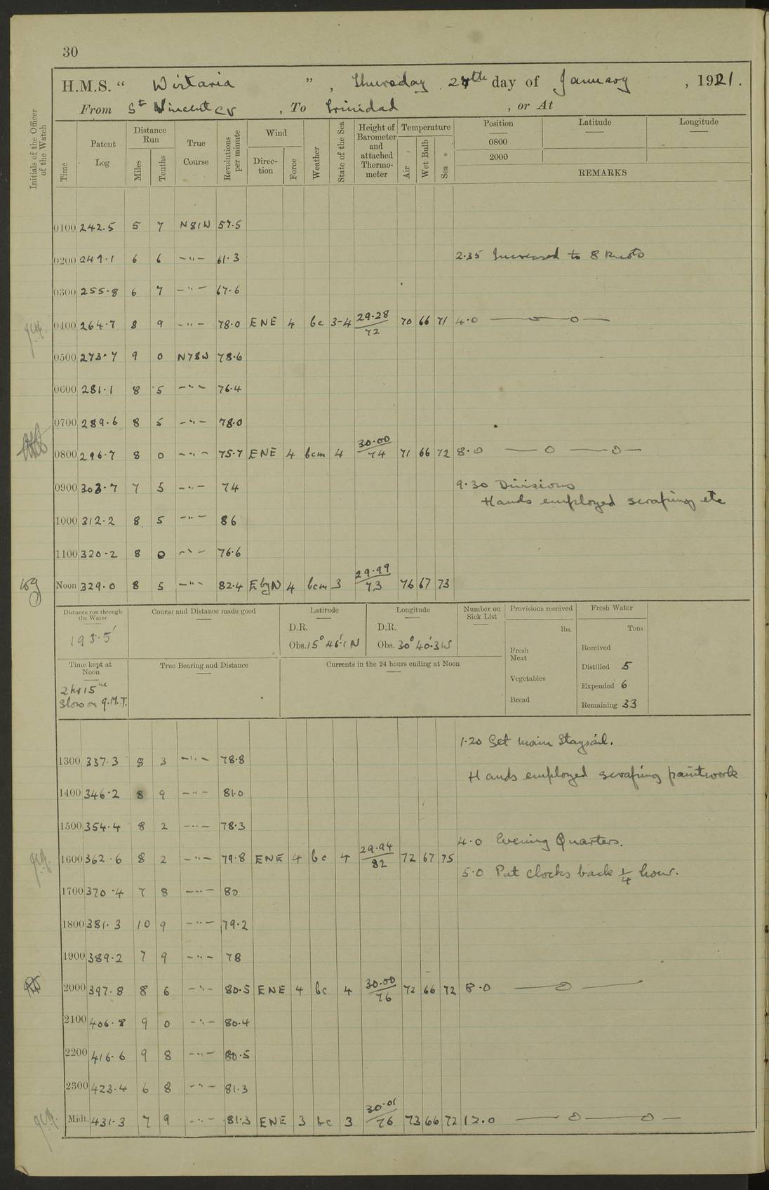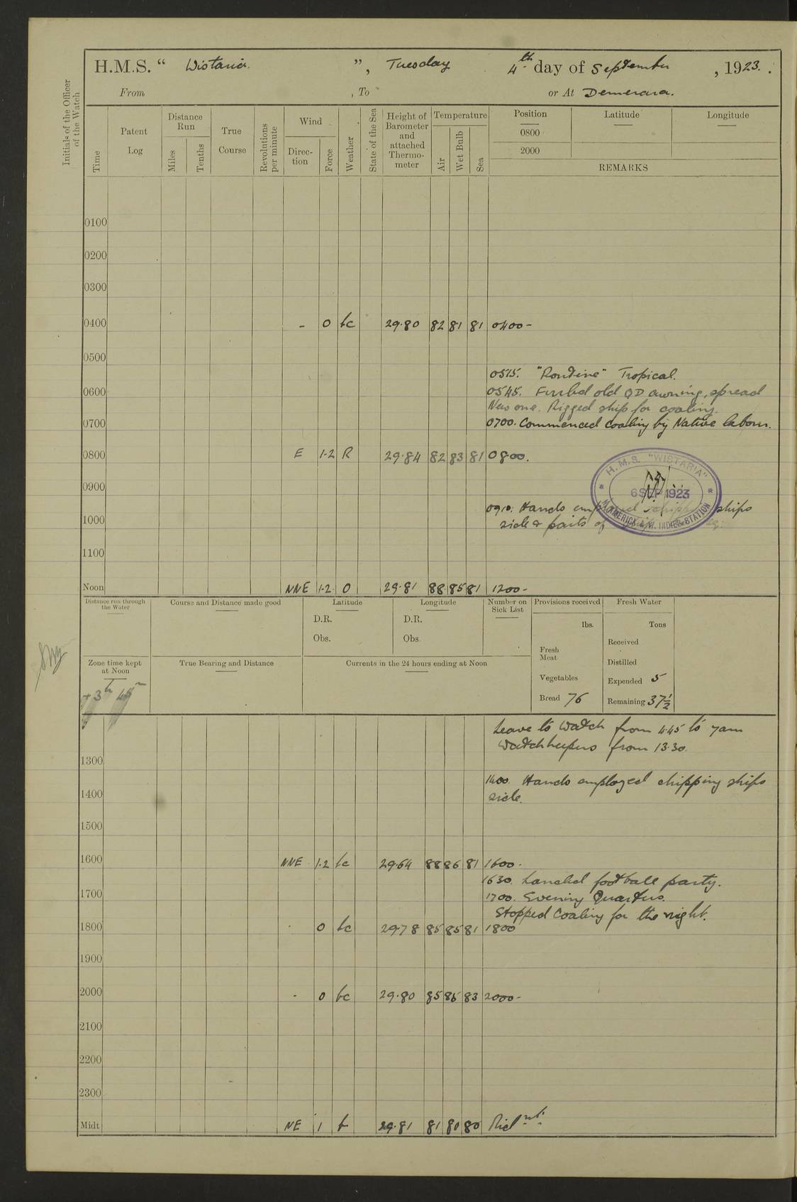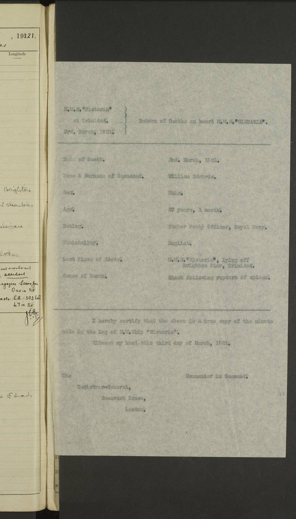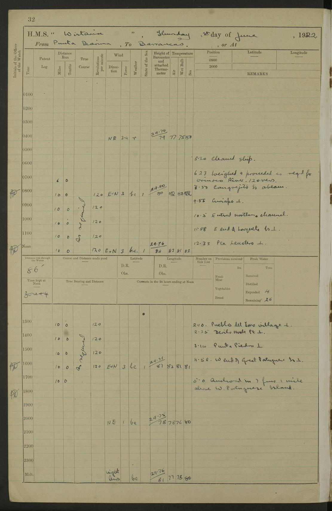 LOGS FOR MARCH 1921 4f73c9fea2fc8ea9030009a4: (https://s3.amazonaws.com:443/oldweather/ADM53-93259/0035_0.jpg) 4f73ca01a2fc8ea9030009ad: (https://s3.amazonaws.com:443/oldweather/ADM53-93260/0003_1.jpg) 1 March 1921 At Gulf of Paria [At San Fernando] Lat 10.38, Long -62.35 5.30am: Hands repairing target & cleaning ship [Repaired target & cleaned ship] [6.10am: Shortened in] [6.30am: Weighed & towed target for “Valerian”. Course SE, 6 knots] 6.53am: Weighed & proceeded. Course SE, 6 knots 7.50am: Stopped. Handed in target [Transferred target] 8.0am: Slipped target 9.15am: Carried out [4”] firing am: Hands painting inboard 11.05am: Came to with Starboard anchor 1½ shackles Anchor bearings: Farralla Rock S4W, Chagrin Hill S82E, Pierre Point N30E 1.15pm: Paid hands [monthly payment] 2.0pm: Hands painting & cleaning [ship] Number on sick list: - [Farralla Rock: perhaps misspelt Farrallon Rock] [Chagrin Hill: perhaps Mon Chagrin Hill] 4f73ca01a2fc8ea9030009ae: (https://s3.amazonaws.com:443/oldweather/ADM53-93260/0004_0.jpg) 2 March 1921 At Brighton Pier Lat 10.38, Long -62.35 8.30am: Weighed & proceeded to Brighton 9.40am: Let go Port anchor 2 shackles 10.30am: Sent provisions to “Valerian” Lost overboard by accident: Magazine Lewis Gun: One in number; Cartr. S.A. .303 belt: 47 in number 1.15pm: Landed liberty men 6.15pm: Liberty men returned. S. P. O. Edwards brought on board dead Number on sick list: 1.D.D. 4f73ca02a2fc8ea9030009af: (https://s3.amazonaws.com:443/oldweather/ADM53-93260/0004_1.jpg) H.M.S “Wistaria” at Trinidad. 3rd March 1921 Return of deaths on board H.M.S. “Wistaria” Date of death. 2nd March 1921. Name & Surname of Deceased. William Edwards. Sex. Male. Age. 27 years, 1 month. Rating. Stoker Petty Officer, Royal Navy. Nationality. English. Last place of Abode. H.M.S. “Wistaria”, lying off Brighton Pier, Trinidad. Cause of Death. Shock following rupture of spleen. 4f73ca02a2fc8ea9030009b0: (https://s3.amazonaws.com:443/oldweather/ADM53-93260/0005_0.jpg) 4f73ca03a2fc8ea9030009b1: (https://s3.amazonaws.com:443/oldweather/ADM53-93260/0005_1.jpg) 3 March 1921 At Port of Spain Lat 10.66, Long -61.55 5.30am: Weighed & proceeded to Port of Spain. Course N19E, 10 knots 8.0am: Came to with Starboard anchor, 1 shackles 9.55am: Discharged S.P.O. Edwards to Colonial Hospital, dead 3.30pm: Funeral Party & mourners landed 4.30pm: Half masted colours 5.30pm: Re-hoisted colours 6.30pm: Funeral parties returned 4f73ca03a2fc8ea9030009b2: (https://s3.amazonaws.com:443/oldweather/ADM53-93260/0006_0.jpg) 4 March 1921 At Port of Spain Lat 10.66, Long -61.55 5.55am: Weighed & proceeded. Course & speeds as required for battle practice 7.15am: Carried out battle practice 8.0am: Took target in tow for “Valerian” battle practice 8.30am: Set course for Port of Spain N25E, 8 knots 9.30am: Hauled in target 10.0am: Anchored & prepared divers to clear wire from rudder 10.30am: Wire cleaned. Weighed & proceeded. Target Capsized 11.45am: Righted target and proceeded 12.15pm: Came to Starboard anchor, 1 shackle 2.45pm: Hands up stanchions & respread awnings 3.30pm: Coal lighter secured alongside 5.40pm: Water boat secured alongside 4f73ca03a2fc8ea9030009b3: (https://s3.amazonaws.com:443/oldweather/ADM53-93260/0006_1.jpg) 5 March 1921 At Port of Spain Lat 10.66, Long -61.55 5.30am: Hands coal ship 7.0am: Received fresh provisions 10.45am: Finished coaling. Wash down upper decks 4.0pm: Evening Quarters. Read warrants 1-2-3-4 Number on sick list: 1 4f73ca04a2fc8ea9030009b4: (https://s3.amazonaws.com:443/oldweather/ADM53-93260/0007_0.jpg) 6 March 1921 At Port of Spain Lat 10.66, Long -61.55 9.45am: Divisions & prayers Number on sick list: 1 4f73ca04a2fc8ea9030009b5: (https://s3.amazonaws.com:443/oldweather/ADM53-93260/0007_1.jpg) 7 March 1921 At Port of Spain Lat 10.66, Long -61.55 6.30am: Hoisted boat 7.24am: Weighed & proceeded. S19W, 14 knots 9.30am: Anchored off Brighton Pier 10.0am: Held Court of Inquiry on death of S.P.O Edwards 1.0pm: Weighed & proceeded to Port of Spain. Course N19E, 14 knots 3.05pm: Anchored Number on sick list: 1 4f73ca04a2fc8ea9030009b6: (https://s3.amazonaws.com:443/oldweather/ADM53-93260/0008_0.jpg) 8 March 1921 At Port of Spain Lat 10.66, Long -61.55 7.50am: Shortened in 8.0am: Weighed & proceeded to Chaguaramas Bay at 12 knots 8.45am: Anchored 9.0am: All available seamen landed to haul up target. Sent provisions to “Valerian” 11.45am: Target party returned. Hoisted boats noon: Weighed & proceeded to Port of Spain at 12 knots 12.30pm: Anchored pm: Hands securing ship for sea 5.05pm: Colonel Glasgow arrived on board for passage to Jamaica 6.0pm: Weighed & proceeded at 11 knots. Course as required to pass through Bocas de Navios 7.0pm: Streamed Patent log 7.10pm: Chacachacare Lt abeam, 6 cables. Course N50W 7.47pm: Penas Point abeam [Boca de Navios: between Huevos and Chacachacare Islands. Also here] [Chacachacare Light: is exhibited from a white concrete tower, 30 feet high, on the northern end of the island] 4f73ca05a2fc8ea9030009b7: (https://s3.amazonaws.com:443/oldweather/ADM53-93260/0008_1.jpg) 9 March 1921 From Port of Spain, Trinidad, to Curaçoa Lat 11.36, Long -64.9 5.55am: Los Frayles Island abeam, 1 mile 6.35am: Altered course N77W. Cabo de la Isla abeam, 2 miles am: Hands scraping & painting inboard. Boats crews working about boats am: Turned 1st and 2nd whalers falls end for end pm: Hands painting, turning whaler falls end for end & scraping motor boat 6.0pm: Sighted Orchilla Isles N26W 9.05pm: Sighted El Rouke Lt N10W [Cabo de la Isla, also known as Cabo Negro] [El Rouke Lt: perhaps misspelt El Roque Light. A light was exhibited from a lighthouse on the northeast hill of El Roque] 4f73ca05a2fc8ea9030009b8: (https://s3.amazonaws.com:443/oldweather/ADM53-93260/0009_0.jpg) 10 March 1921 From Trinidad to Curaçoa and at Curaçoa Lat 10.66, Long -61.55 8.23am: Little Curaçoa Lt abeam 9.25am: Hauled in patent log 10.0am: Stopped for Port Health Off