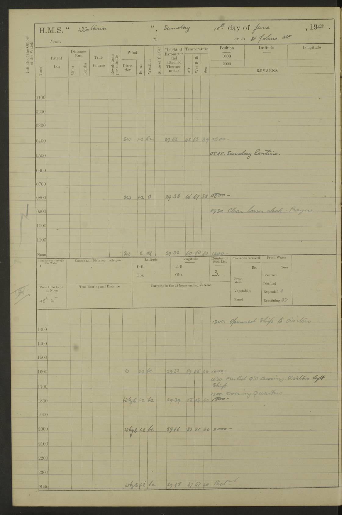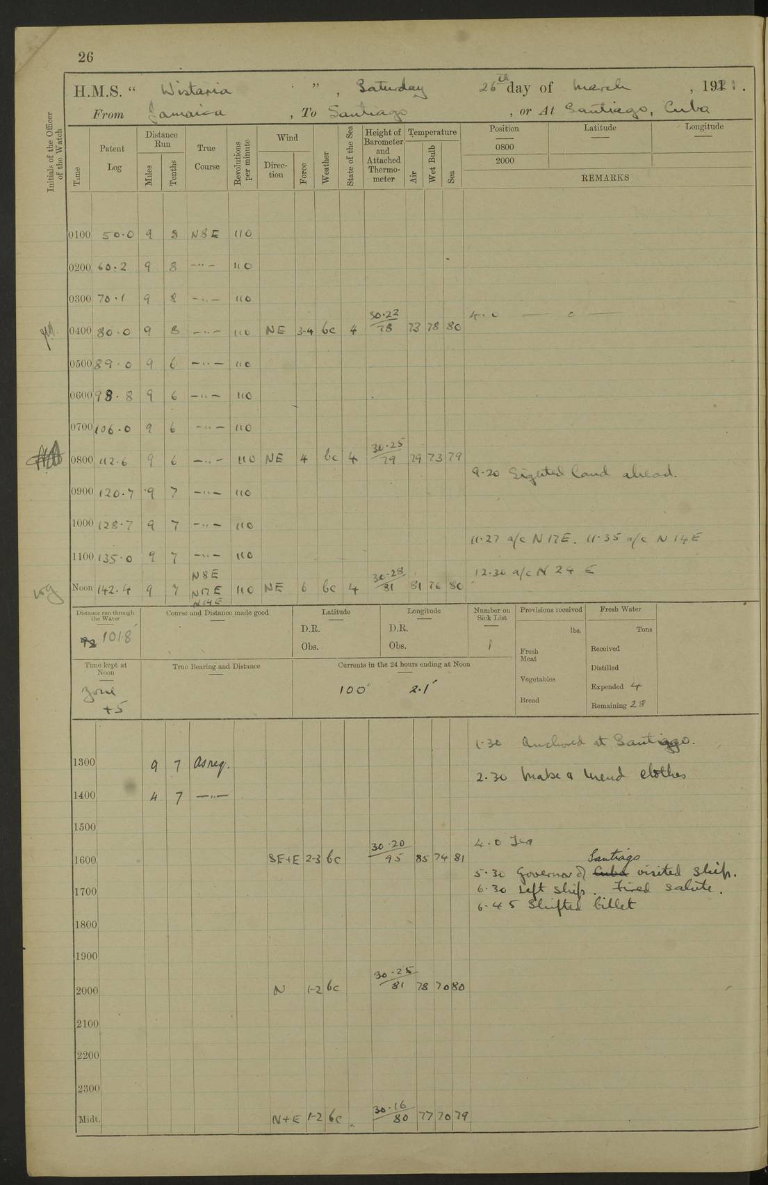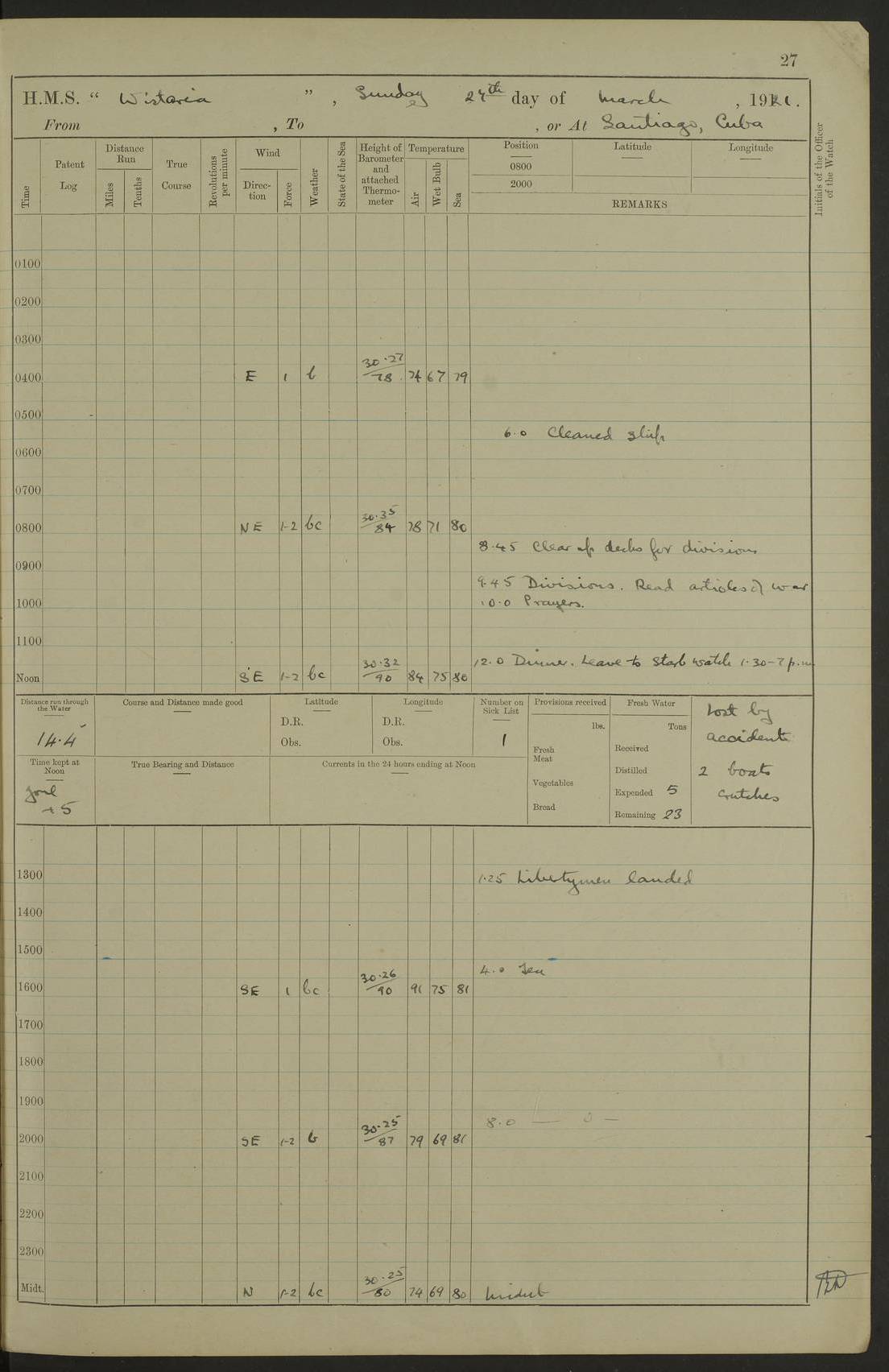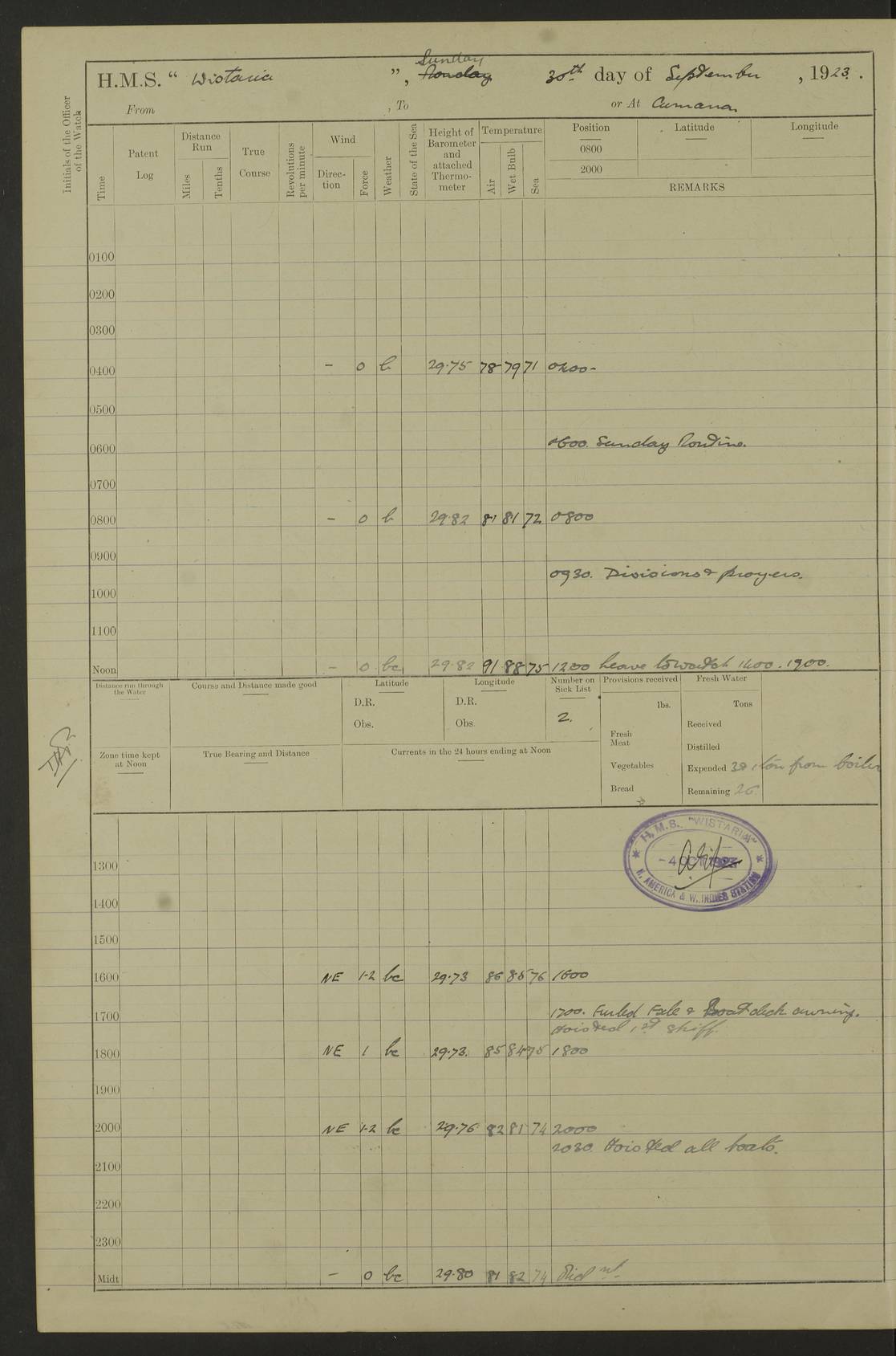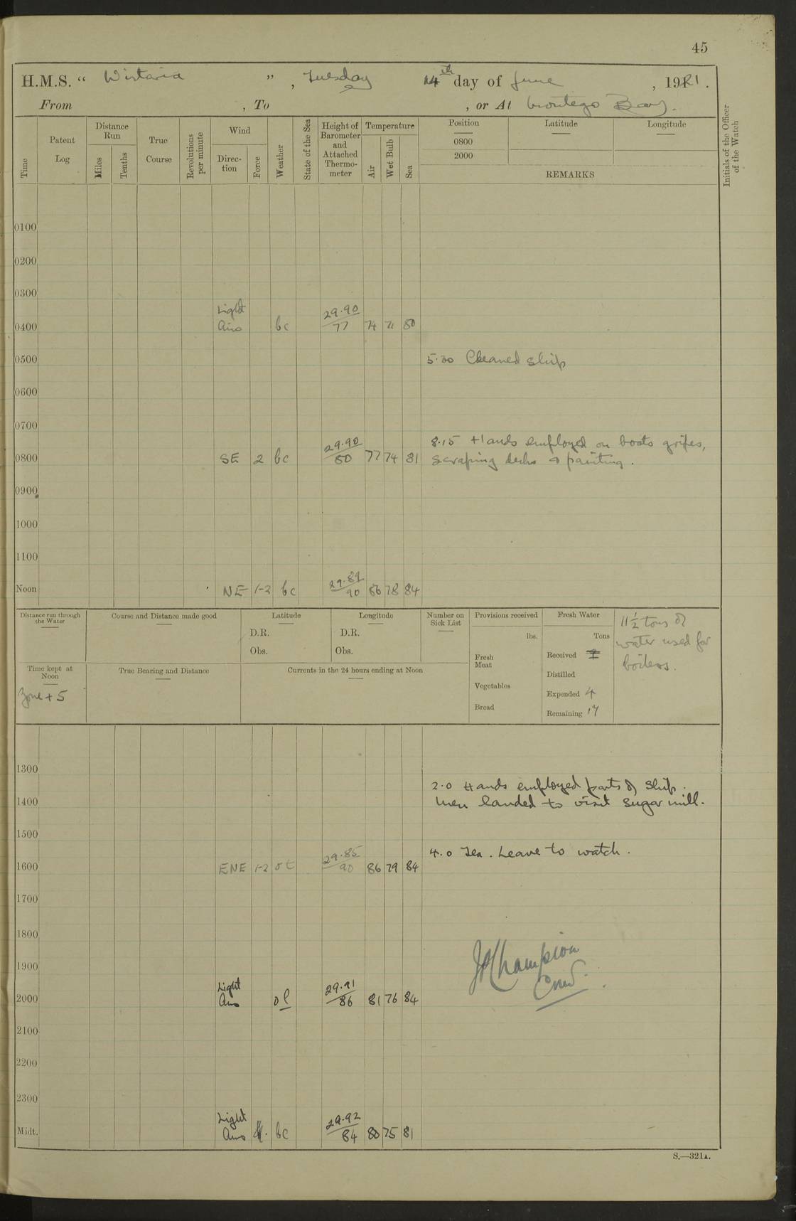 LOGS FOR MARCH 1921 4f73c9fea2fc8ea9030009a4: (https://s3.amazonaws.com:443/oldweather/ADM53-93259/0035_0.jpg) 4f73ca01a2fc8ea9030009ad: (https://s3.amazonaws.com:443/oldweather/ADM53-93260/0003_1.jpg) 1 March 1921 At Gulf of Paria [At San Fernando] Lat 10.38, Long -62.35 5.30am: Hands repairing target & cleaning ship [Repaired target & cleaned ship] [6.10am: Shortened in] [6.30am: Weighed & towed target for “Valerian”. Course SE, 6 knots] 6.53am: Weighed & proceeded. Course SE, 6 knots 7.50am: Stopped. Handed in target [Transferred target] 8.0am: Slipped target 9.15am: Carried out [4”] firing am: Hands painting inboard 11.05am: Came to with Starboard anchor 1½ shackles Anchor bearings: Farralla Rock S4W, Chagrin Hill S82E, Pierre Point N30E 1.15pm: Paid hands [monthly payment] 2.0pm: Hands painting & cleaning [ship] Number on sick list: - [Farralla Rock: perhaps misspelt Farrallon Rock] [Chagrin Hill: perhaps Mon Chagrin Hill] 4f73ca01a2fc8ea9030009ae: (https://s3.amazonaws.com:443/oldweather/ADM53-93260/0004_0.jpg) 2 March 1921 At Brighton Pier Lat 10.38, Long -62.35 8.30am: Weighed & proceeded to Brighton 9.40am: Let go Port anchor 2 shackles 10.30am: Sent provisions to “Valerian” Lost overboard by accident: Magazine Lewis Gun: One in number; Cartr. S.A. .303 belt: 47 in number 1.15pm: Landed liberty men 6.15pm: Liberty men returned. S. P. O. Edwards brought on board dead Number on sick list: 1.D.D. 4f73ca02a2fc8ea9030009af: (https://s3.amazonaws.com:443/oldweather/ADM53-93260/0004_1.jpg) H.M.S “Wistaria” at Trinidad. 3rd March 1921 Return of deaths on board H.M.S. “Wistaria” Date of death. 2nd March 1921. Name & Surname of Deceased. William Edwards. Sex. Male. Age. 27 years, 1 month. Rating. Stoker Petty Officer, Royal Navy. Nationality. English. Last place of Abode. H.M.S. “Wistaria”, lying off Brighton Pier, Trinidad. Cause of Death. Shock following rupture of spleen. 4f73ca02a2fc8ea9030009b0: (https://s3.amazonaws.com:443/oldweather/ADM53-93260/0005_0.jpg) 4f73ca03a2fc8ea9030009b1: (https://s3.amazonaws.com:443/oldweather/ADM53-93260/0005_1.jpg) 3 March 1921 At Port of Spain Lat 10.66, Long -61.55 5.30am: Weighed & proceeded to Port of Spain. Course N19E, 10 knots 8.0am: Came to with Starboard anchor, 1 shackles 9.55am: Discharged S.P.O. Edwards to Colonial Hospital, dead 3.30pm: Funeral Party & mourners landed 4.30pm: Half masted colours 5.30pm: Re-hoisted colours 6.30pm: Funeral parties returned 4f73ca03a2fc8ea9030009b2: (https://s3.amazonaws.com:443/oldweather/ADM53-93260/0006_0.jpg) 4 March 1921 At Port of Spain Lat 10.66, Long -61.55 5.55am: Weighed & proceeded. Course & speeds as required for battle practice 7.15am: Carried out battle practice 8.0am: Took target in tow for “Valerian” battle practice 8.30am: Set course for Port of Spain N25E, 8 knots 9.30am: Hauled in target 10.0am: Anchored & prepared divers to clear wire from rudder 10.30am: Wire cleaned. Weighed & proceeded. Target Capsized 11.45am: Righted target and proceeded 12.15pm: Came to Starboard anchor, 1 shackle 2.45pm: Hands up stanchions & respread awnings 3.30pm: Coal lighter secured alongside 5.40pm: Water boat secured alongside 4f73ca03a2fc8ea9030009b3: (https://s3.amazonaws.com:443/oldweather/ADM53-93260/0006_1.jpg) 5 March 1921 At Port of Spain Lat 10.66, Long -61.55 5.30am: Hands coal ship 7.0am: Received fresh provisions 10.45am: Finished coaling. Wash down upper decks 4.0pm: Evening Quarters. Read warrants 1-2-3-4 Number on sick list: 1 4f73ca04a2fc8ea9030009b4: (https://s3.amazonaws.com:443/oldweather/ADM53-93260/0007_0.jpg) 6 March 1921 At Port of Spain Lat 10.66, Long -61.55 9.45am: Divisions & prayers Number on sick list: 1 4f73ca04a2fc8ea9030009b5: (https://s3.amazonaws.com:443/oldweather/ADM53-93260/0007_1.jpg) 7 March 1921 At Port of Spain Lat 10.66, Long -61.55 6.30am: Hoisted boat 7.24am: Weighed & proceeded. S19W, 14 knots 9.30am: Anchored off Brighton Pier 10.0am: Held Court of Inquiry on death of S.P.O Edwards 1.0pm: Weighed & proceeded to Port of Spain. Course N19E, 14 knots 3.05pm: Anchored Number on sick list: 1 4f73ca04a2fc8ea9030009b6: (https://s3.amazonaws.com:443/oldweather/ADM53-93260/0008_0.jpg) 8 March 1921 At Port of Spain Lat 10.66, Long -61.55 7.50am: Shortened in 8.0am: Weighed & proceeded to Chaguaramas Bay at 12 knots 8.45am: Anchored 9.0am: All available seamen landed to haul up target. Sent provisions to “Valerian” 11.45am: Target party returned. Hoisted boats noon: Weighed & proceeded to Port of Spain at 12 knots 12.30pm: Anchored pm: Hands securing ship for sea 5.05pm: Colonel Glasgow arrived on board for passage to Jamaica 6.0pm: Weighed & proceeded at 11 knots. Course as required to pass through Bocas de Navios 7.0pm: Streamed Patent log 7.10pm: Chacachacare Lt abeam, 6 cables. Course N50W 7.47pm: Penas Point abeam [Boca de Navios: between Huevos and Chacachacare Islands. Also here] [Chacachacare Light: is exhibited from a white concrete tower, 30 feet high, on the northern end of the island] 4f73ca05a2fc8ea9030009b7: (https://s3.amazonaws.com:443/oldweather/ADM53-93260/0008_1.jpg) 9 March 1921 From Port of Spain, Trinidad, to Curaçoa Lat 11.36, Long -64.9 5.55am: Los Frayles Island abeam, 1 mile 6.35am: Altered course N77W. Cabo de la Isla abeam, 2 miles am: Hands scraping & painting inboard. Boats crews working about boats am: Turned 1st and 2nd whalers falls end for end pm: Hands painting, turning whaler falls end for end & scraping motor boat 6.0pm: Sighted Orchilla Isles N26W 9.05pm: Sighted El Rouke Lt N10W [Cabo de la Isla, also known as Cabo Negro] [El Rouke Lt: perhaps misspelt El Roque Light. A light was exhibited from a lighthouse on the northeast hill of El Roque] 4f73ca05a2fc8ea9030009b8: (https://s3.amazonaws.com:443/oldweather/ADM53-93260/0009_0.jpg) 10 March 1921 From Trinidad to Curaçoa and at Curaçoa Lat 10.66, Long -61.55 8.23am: Little Curaçoa Lt abeam 9.25am: Hauled in patent log 10.0am: Stopped for Port Health Off