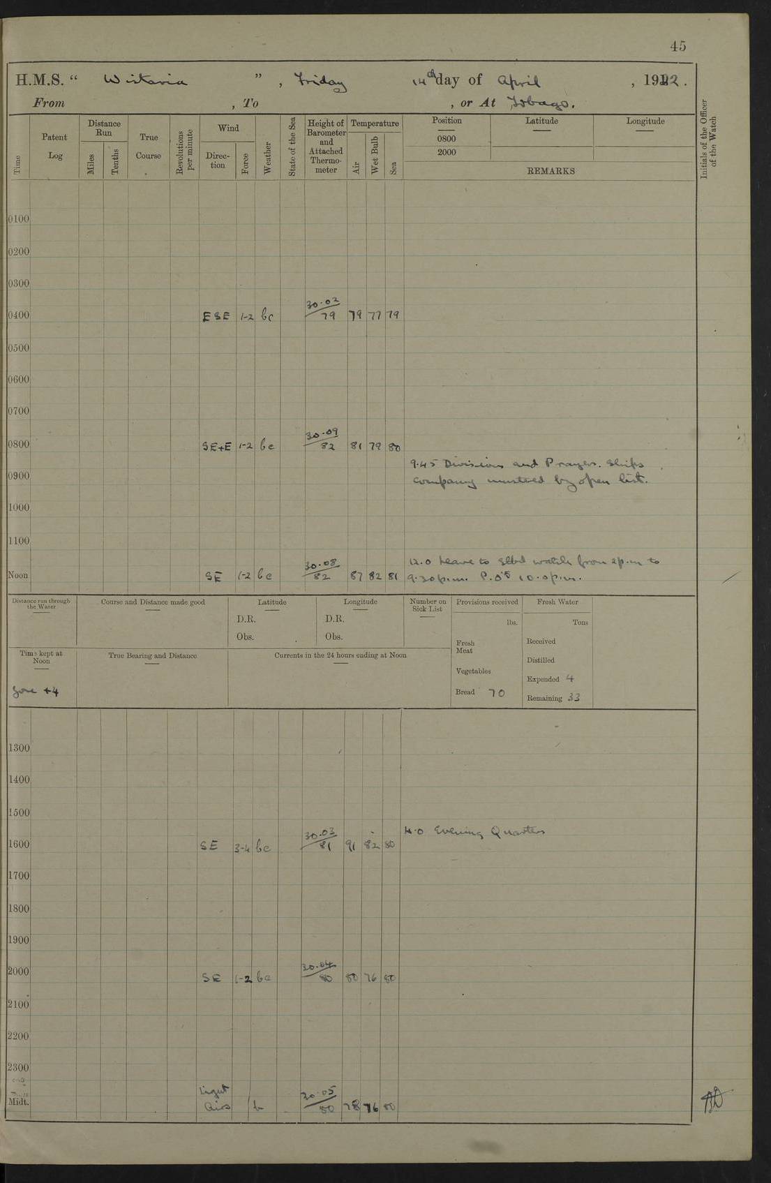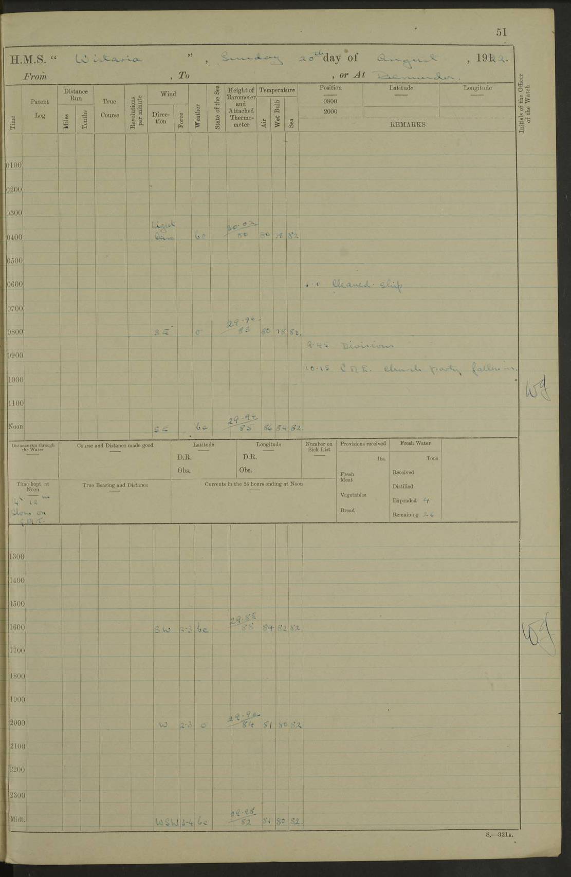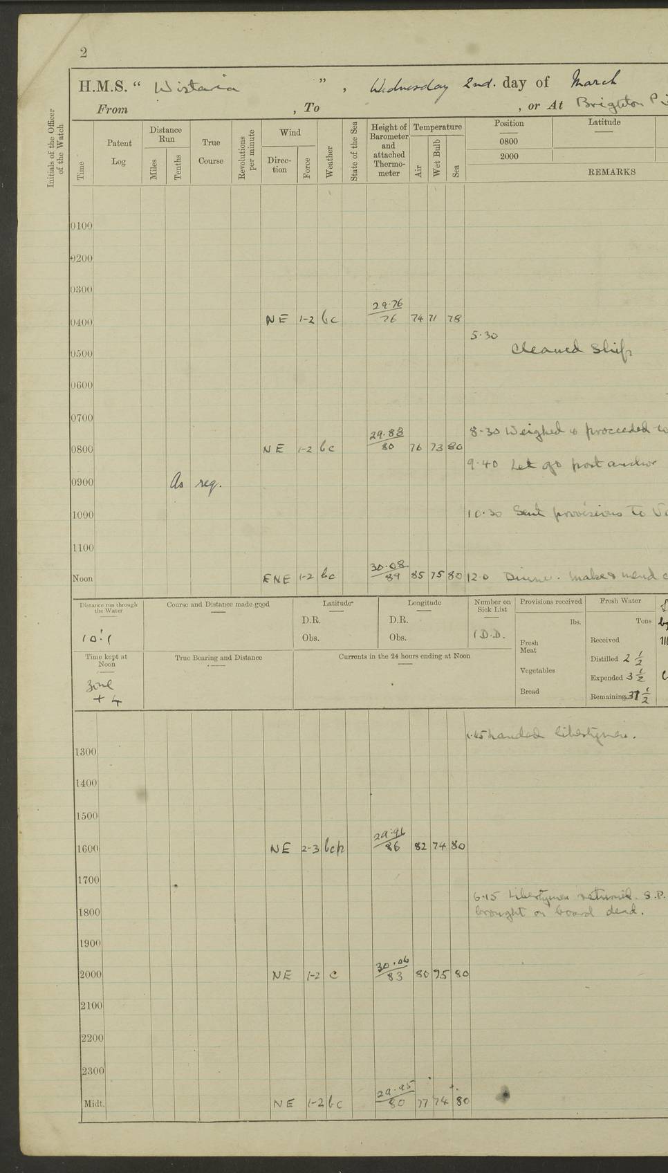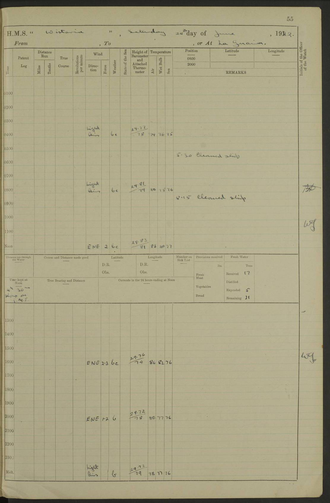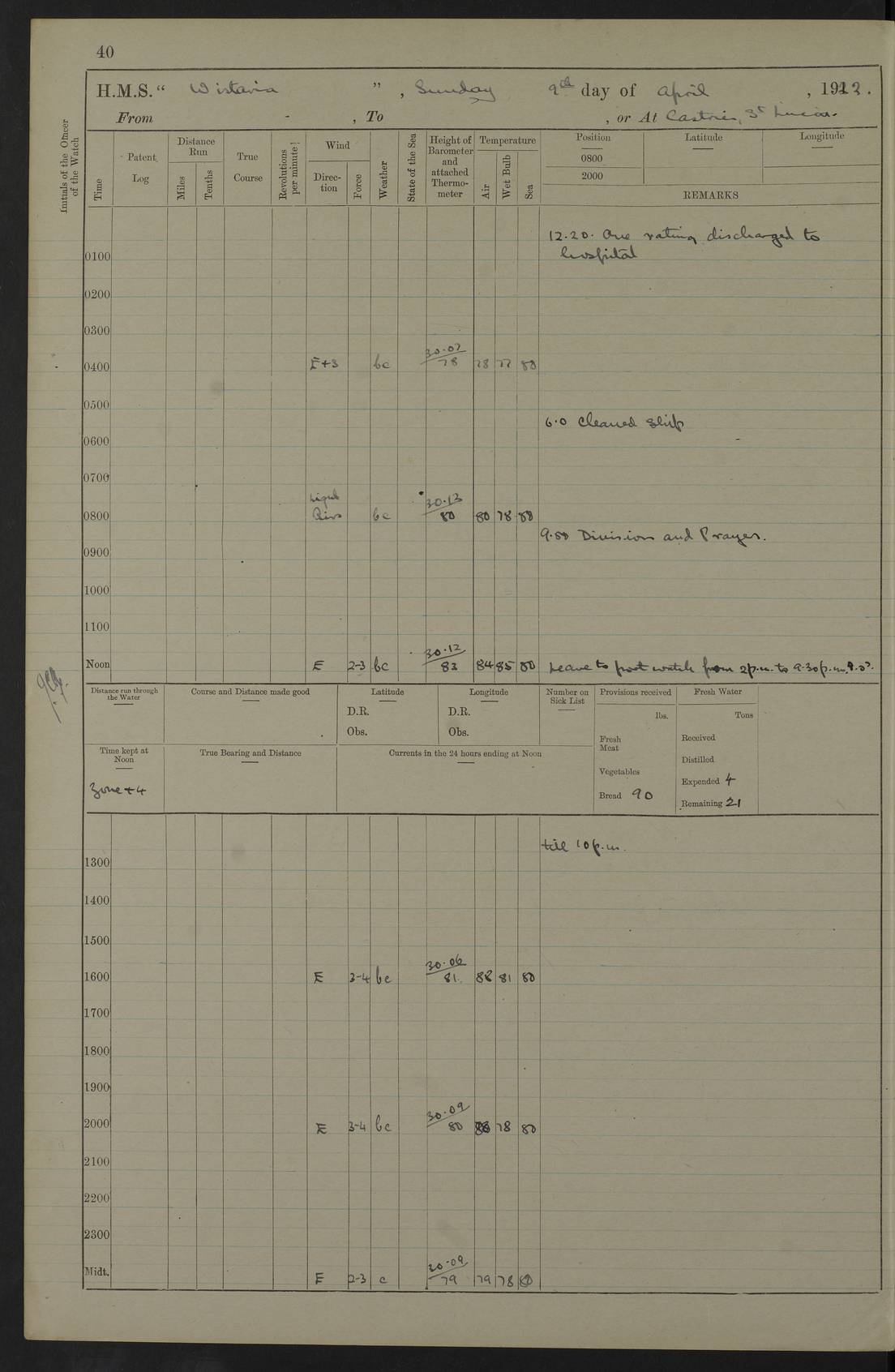 LOGS FOR MARCH 1921 4f73c9fea2fc8ea9030009a4: (https://s3.amazonaws.com:443/oldweather/ADM53-93259/0035_0.jpg) 4f73ca01a2fc8ea9030009ad: (https://s3.amazonaws.com:443/oldweather/ADM53-93260/0003_1.jpg) 1 March 1921 At Gulf of Paria [At San Fernando] Lat 10.38, Long -62.35 5.30am: Hands repairing target & cleaning ship [Repaired target & cleaned ship] [6.10am: Shortened in] [6.30am: Weighed & towed target for “Valerian”. Course SE, 6 knots] 6.53am: Weighed & proceeded. Course SE, 6 knots 7.50am: Stopped. Handed in target [Transferred target] 8.0am: Slipped target 9.15am: Carried out [4”] firing am: Hands painting inboard 11.05am: Came to with Starboard anchor 1½ shackles Anchor bearings: Farralla Rock S4W, Chagrin Hill S82E, Pierre Point N30E 1.15pm: Paid hands [monthly payment] 2.0pm: Hands painting & cleaning [ship] Number on sick list: - [Farralla Rock: perhaps misspelt Farrallon Rock] [Chagrin Hill: perhaps Mon Chagrin Hill] 4f73ca01a2fc8ea9030009ae: (https://s3.amazonaws.com:443/oldweather/ADM53-93260/0004_0.jpg) 2 March 1921 At Brighton Pier Lat 10.38, Long -62.35 8.30am: Weighed & proceeded to Brighton 9.40am: Let go Port anchor 2 shackles 10.30am: Sent provisions to “Valerian” Lost overboard by accident: Magazine Lewis Gun: One in number; Cartr. S.A. .303 belt: 47 in number 1.15pm: Landed liberty men 6.15pm: Liberty men returned. S. P. O. Edwards brought on board dead Number on sick list: 1.D.D. 4f73ca02a2fc8ea9030009af: (https://s3.amazonaws.com:443/oldweather/ADM53-93260/0004_1.jpg) H.M.S “Wistaria” at Trinidad. 3rd March 1921 Return of deaths on board H.M.S. “Wistaria” Date of death. 2nd March 1921. Name & Surname of Deceased. William Edwards. Sex. Male. Age. 27 years, 1 month. Rating. Stoker Petty Officer, Royal Navy. Nationality. English. Last place of Abode. H.M.S. “Wistaria”, lying off Brighton Pier, Trinidad. Cause of Death. Shock following rupture of spleen. 4f73ca02a2fc8ea9030009b0: (https://s3.amazonaws.com:443/oldweather/ADM53-93260/0005_0.jpg) 4f73ca03a2fc8ea9030009b1: (https://s3.amazonaws.com:443/oldweather/ADM53-93260/0005_1.jpg) 3 March 1921 At Port of Spain Lat 10.66, Long -61.55 5.30am: Weighed & proceeded to Port of Spain. Course N19E, 10 knots 8.0am: Came to with Starboard anchor, 1 shackles 9.55am: Discharged S.P.O. Edwards to Colonial Hospital, dead 3.30pm: Funeral Party & mourners landed 4.30pm: Half masted colours 5.30pm: Re-hoisted colours 6.30pm: Funeral parties returned 4f73ca03a2fc8ea9030009b2: (https://s3.amazonaws.com:443/oldweather/ADM53-93260/0006_0.jpg) 4 March 1921 At Port of Spain Lat 10.66, Long -61.55 5.55am: Weighed & proceeded. Course & speeds as required for battle practice 7.15am: Carried out battle practice 8.0am: Took target in tow for “Valerian” battle practice 8.30am: Set course for Port of Spain N25E, 8 knots 9.30am: Hauled in target 10.0am: Anchored & prepared divers to clear wire from rudder 10.30am: Wire cleaned. Weighed & proceeded. Target Capsized 11.45am: Righted target and proceeded 12.15pm: Came to Starboard anchor, 1 shackle 2.45pm: Hands up stanchions & respread awnings 3.30pm: Coal lighter secured alongside 5.40pm: Water boat secured alongside 4f73ca03a2fc8ea9030009b3: (https://s3.amazonaws.com:443/oldweather/ADM53-93260/0006_1.jpg) 5 March 1921 At Port of Spain Lat 10.66, Long -61.55 5.30am: Hands coal ship 7.0am: Received fresh provisions 10.45am: Finished coaling. Wash down upper decks 4.0pm: Evening Quarters. Read warrants 1-2-3-4 Number on sick list: 1 4f73ca04a2fc8ea9030009b4: (https://s3.amazonaws.com:443/oldweather/ADM53-93260/0007_0.jpg) 6 March 1921 At Port of Spain Lat 10.66, Long -61.55 9.45am: Divisions & prayers Number on sick list: 1 4f73ca04a2fc8ea9030009b5: (https://s3.amazonaws.com:443/oldweather/ADM53-93260/0007_1.jpg) 7 March 1921 At Port of Spain Lat 10.66, Long -61.55 6.30am: Hoisted boat 7.24am: Weighed & proceeded. S19W, 14 knots 9.30am: Anchored off Brighton Pier 10.0am: Held Court of Inquiry on death of S.P.O Edwards 1.0pm: Weighed & proceeded to Port of Spain. Course N19E, 14 knots 3.05pm: Anchored Number on sick list: 1 4f73ca04a2fc8ea9030009b6: (https://s3.amazonaws.com:443/oldweather/ADM53-93260/0008_0.jpg) 8 March 1921 At Port of Spain Lat 10.66, Long -61.55 7.50am: Shortened in 8.0am: Weighed & proceeded to Chaguaramas Bay at 12 knots 8.45am: Anchored 9.0am: All available seamen landed to haul up target. Sent provisions to “Valerian” 11.45am: Target party returned. Hoisted boats noon: Weighed & proceeded to Port of Spain at 12 knots 12.30pm: Anchored pm: Hands securing ship for sea 5.05pm: Colonel Glasgow arrived on board for passage to Jamaica 6.0pm: Weighed & proceeded at 11 knots. Course as required to pass through Bocas de Navios 7.0pm: Streamed Patent log 7.10pm: Chacachacare Lt abeam, 6 cables. Course N50W 7.47pm: Penas Point abeam [Boca de Navios: between Huevos and Chacachacare Islands. Also here] [Chacachacare Light: is exhibited from a white concrete tower, 30 feet high, on the northern end of the island] 4f73ca05a2fc8ea9030009b7: (https://s3.amazonaws.com:443/oldweather/ADM53-93260/0008_1.jpg) 9 March 1921 From Port of Spain, Trinidad, to Curaçoa Lat 11.36, Long -64.9 5.55am: Los Frayles Island abeam, 1 mile 6.35am: Altered course N77W. Cabo de la Isla abeam, 2 miles am: Hands scraping & painting inboard. Boats crews working about boats am: Turned 1st and 2nd whalers falls end for end pm: Hands painting, turning whaler falls end for end & scraping motor boat 6.0pm: Sighted Orchilla Isles N26W 9.05pm: Sighted El Rouke Lt N10W [Cabo de la Isla, also known as Cabo Negro] [El Rouke Lt: perhaps misspelt El Roque Light. A light was exhibited from a lighthouse on the northeast hill of El Roque] 4f73ca05a2fc8ea9030009b8: (https://s3.amazonaws.com:443/oldweather/ADM53-93260/0009_0.jpg) 10 March 1921 From Trinidad to Curaçoa and at Curaçoa Lat 10.66, Long -61.55 8.23am: Little Curaçoa Lt abeam 9.25am: Hauled in patent log 10.0am: Stopped for Port Health Off