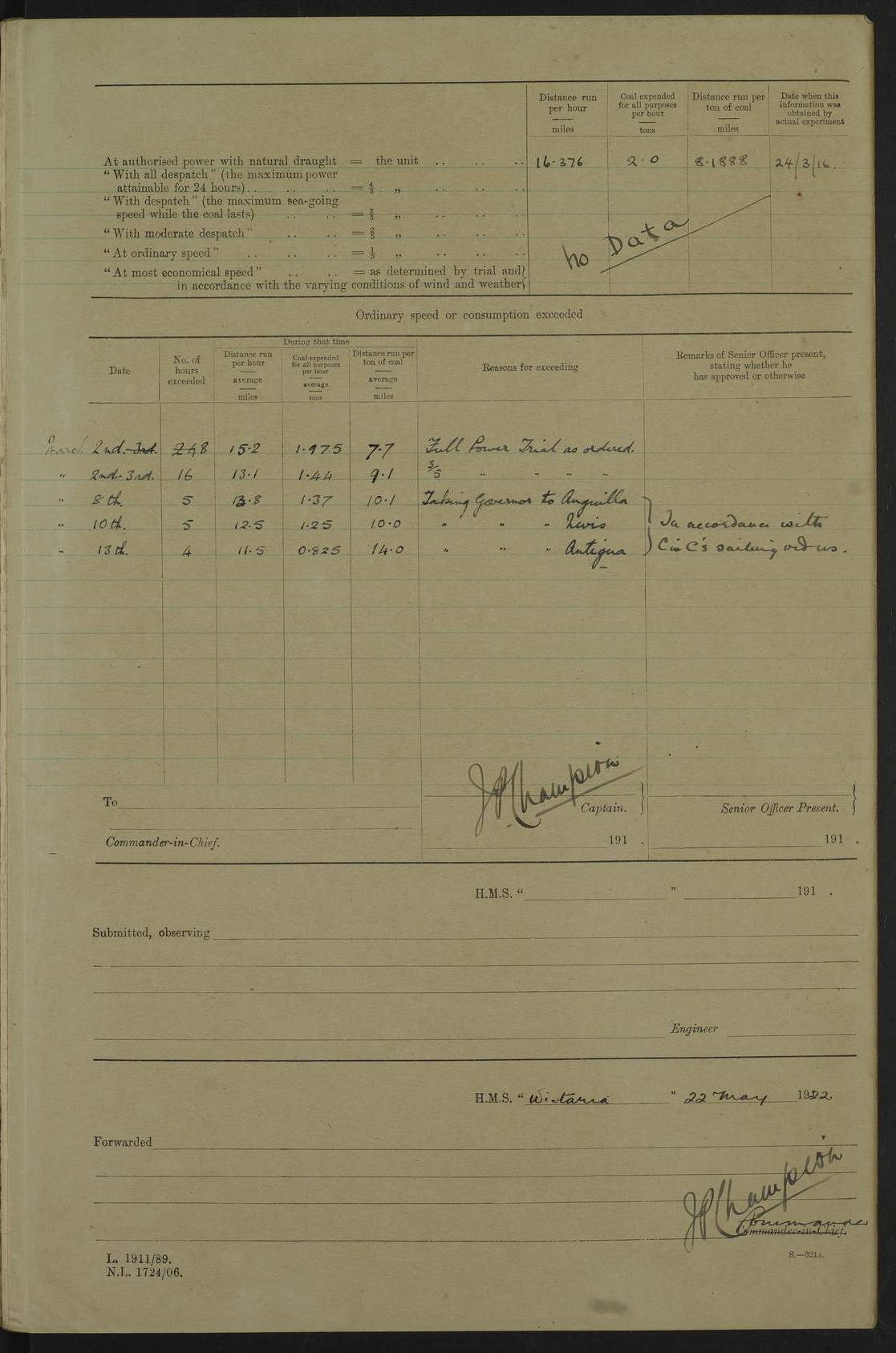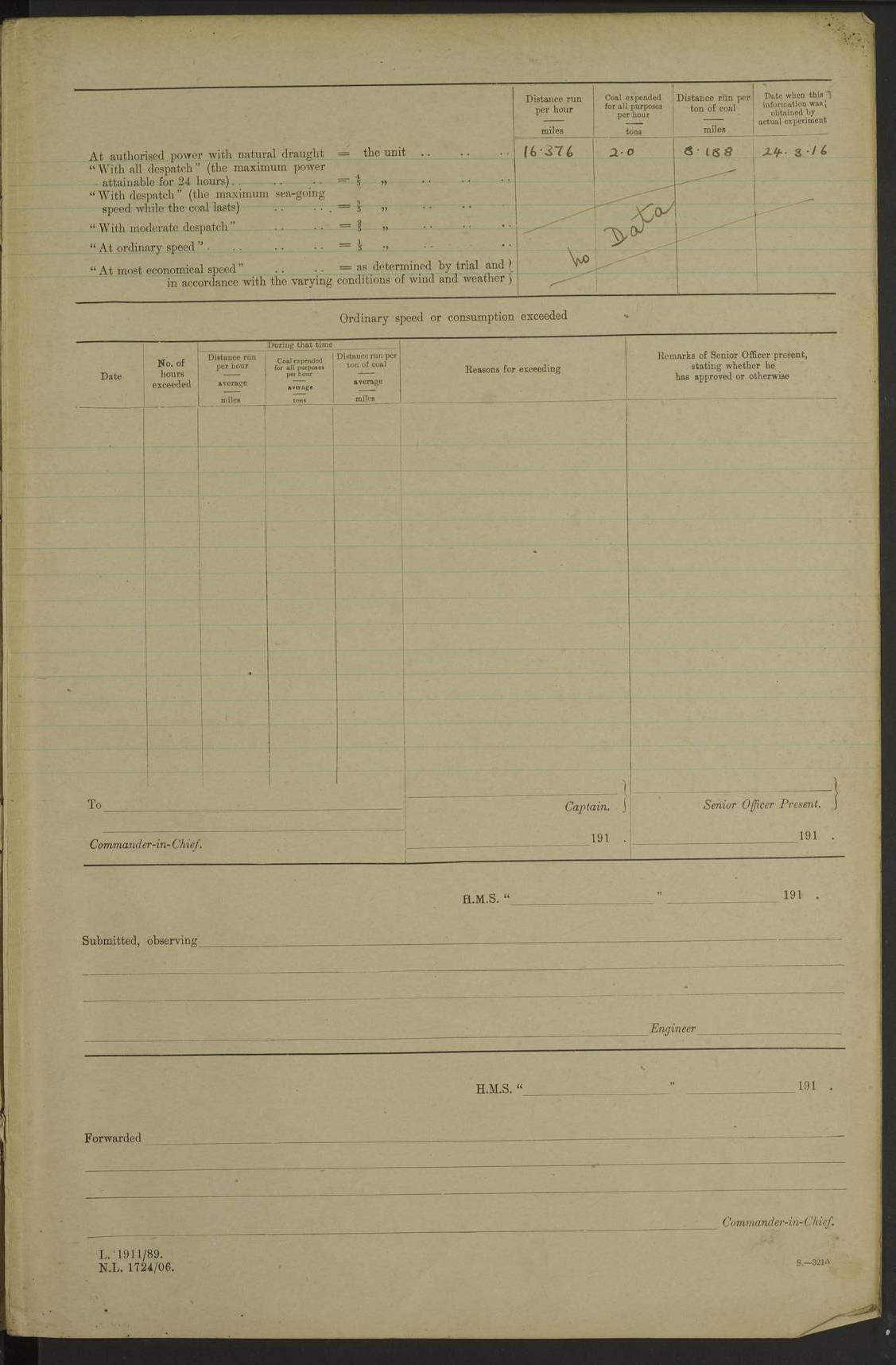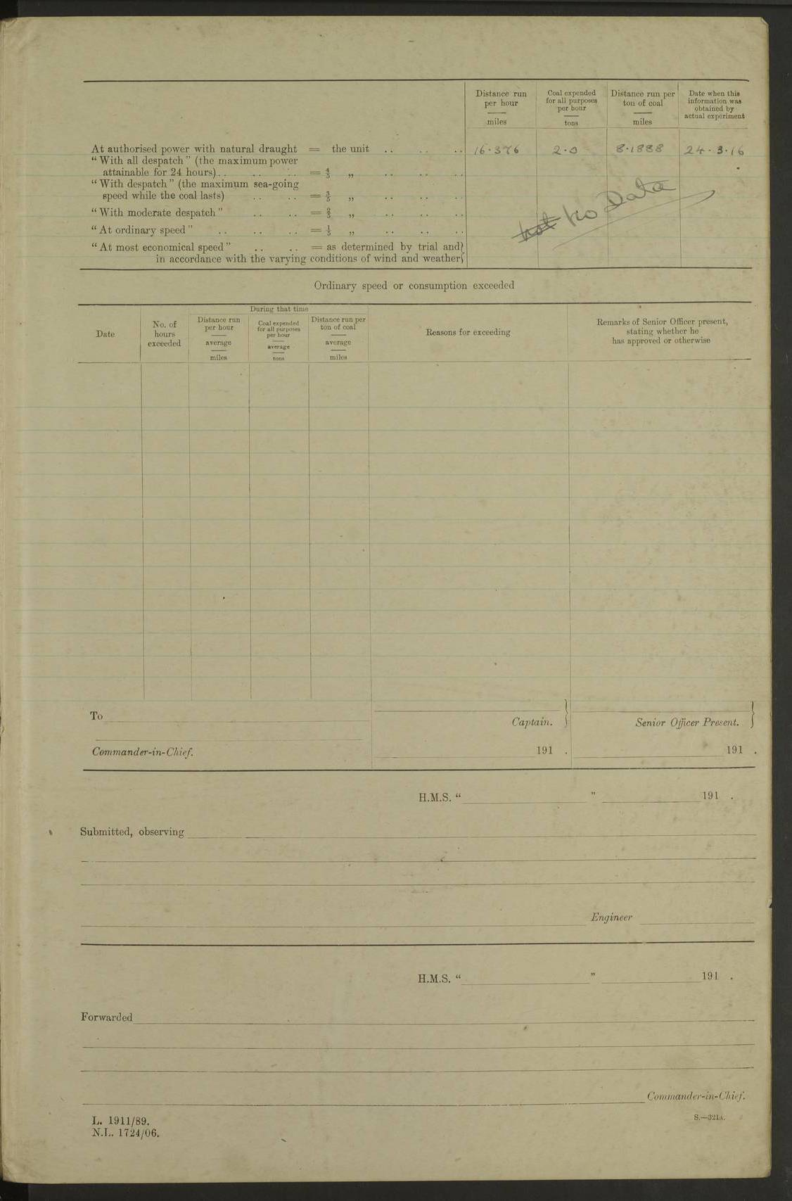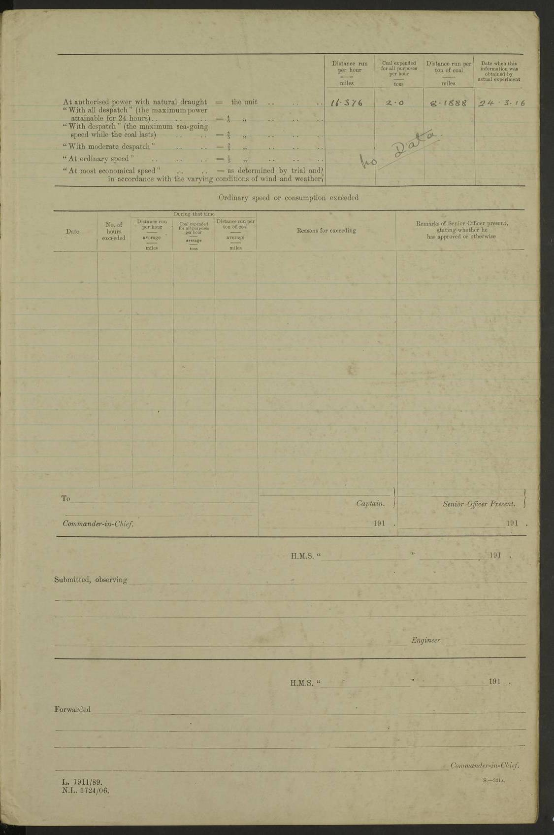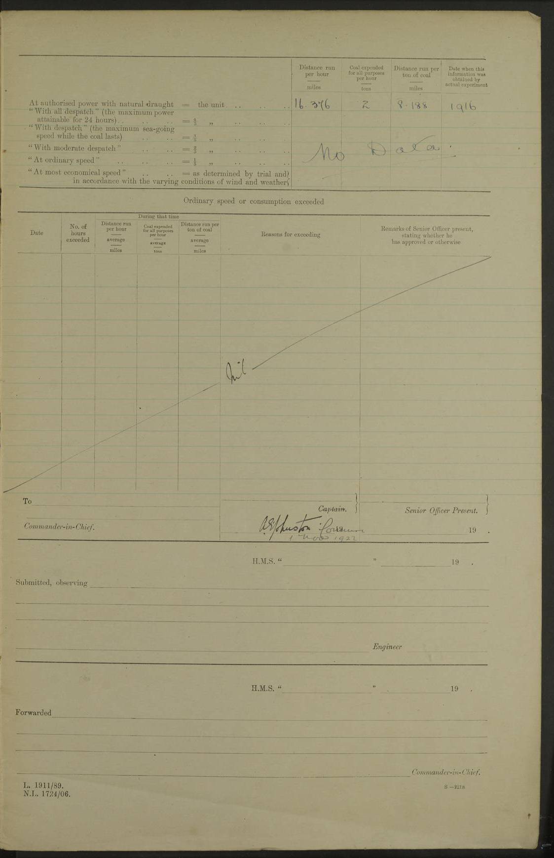 LOG BOOK – JANUARY 1ST TO MARCH 1ST 1922 4f73ca88a2fc8ea903000b16: (https://s3.amazonaws.com:443/oldweather/ADM53-93265/0001_0.jpg) 4f73ca88a2fc8ea903000b17: (https://s3.amazonaws.com:443/oldweather/ADM53-93265/0001_1.jpg) 4f73ca88a2fc8ea903000b18: (https://s3.amazonaws.com:443/oldweather/ADM53-93265/0002_0.jpg) 4f73ca89a2fc8ea903000b19: (https://s3.amazonaws.com:443/oldweather/ADM53-93265/0002_1.jpg) At authorised power with natural draught: - Distance run per hour, miles: 16.376 - Coal expended for all purposes per hour, tons: 2.0 - Distance run per ton of coal, miles: 8.1888 - Date when this information was obtained by actual experiment: 24-3-16 4f73ca89a2fc8ea903000b1a: (https://s3.amazonaws.com:443/oldweather/ADM53-93265/0003_0.jpg)