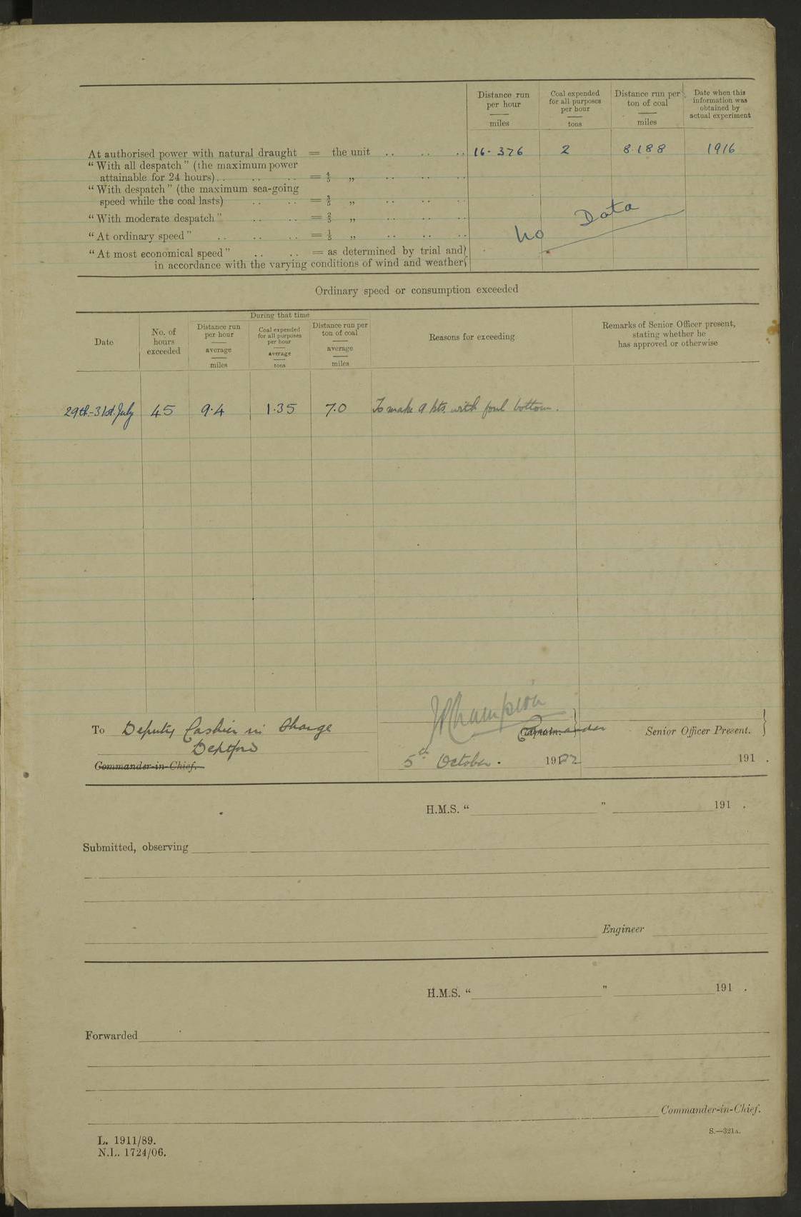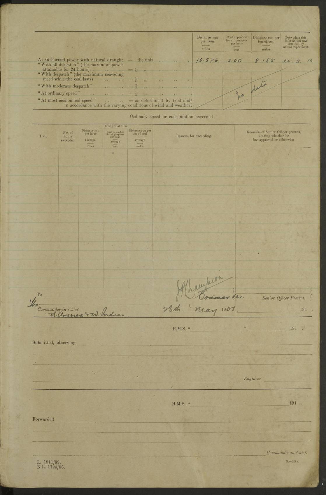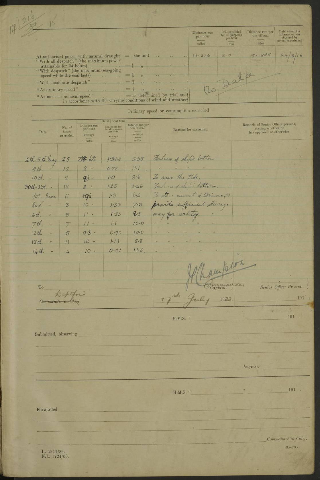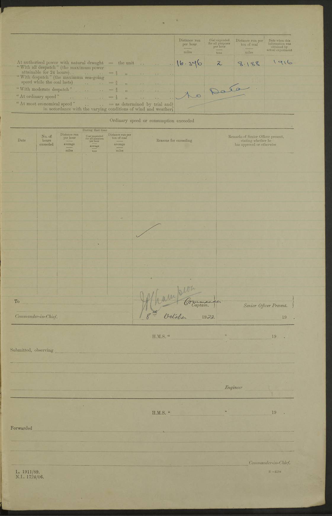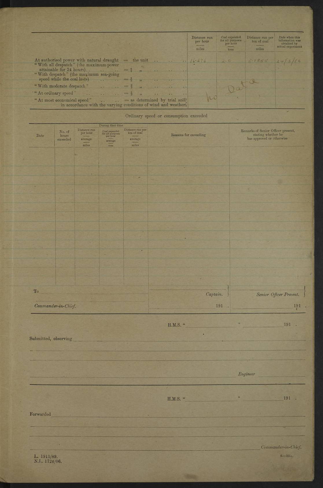 LOG BOOK – JANUARY 1ST TO MARCH 1ST 1922 4f73ca88a2fc8ea903000b16: (https://s3.amazonaws.com:443/oldweather/ADM53-93265/0001_0.jpg) 4f73ca88a2fc8ea903000b17: (https://s3.amazonaws.com:443/oldweather/ADM53-93265/0001_1.jpg) 4f73ca88a2fc8ea903000b18: (https://s3.amazonaws.com:443/oldweather/ADM53-93265/0002_0.jpg) 4f73ca89a2fc8ea903000b19: (https://s3.amazonaws.com:443/oldweather/ADM53-93265/0002_1.jpg) At authorised power with natural draught: - Distance run per hour, miles: 16.376 - Coal expended for all purposes per hour, tons: 2.0 - Distance run per ton of coal, miles: 8.1888 - Date when this information was obtained by actual experiment: 24-3-16 4f73ca89a2fc8ea903000b1a: (https://s3.amazonaws.com:443/oldweather/ADM53-93265/0003_0.jpg)