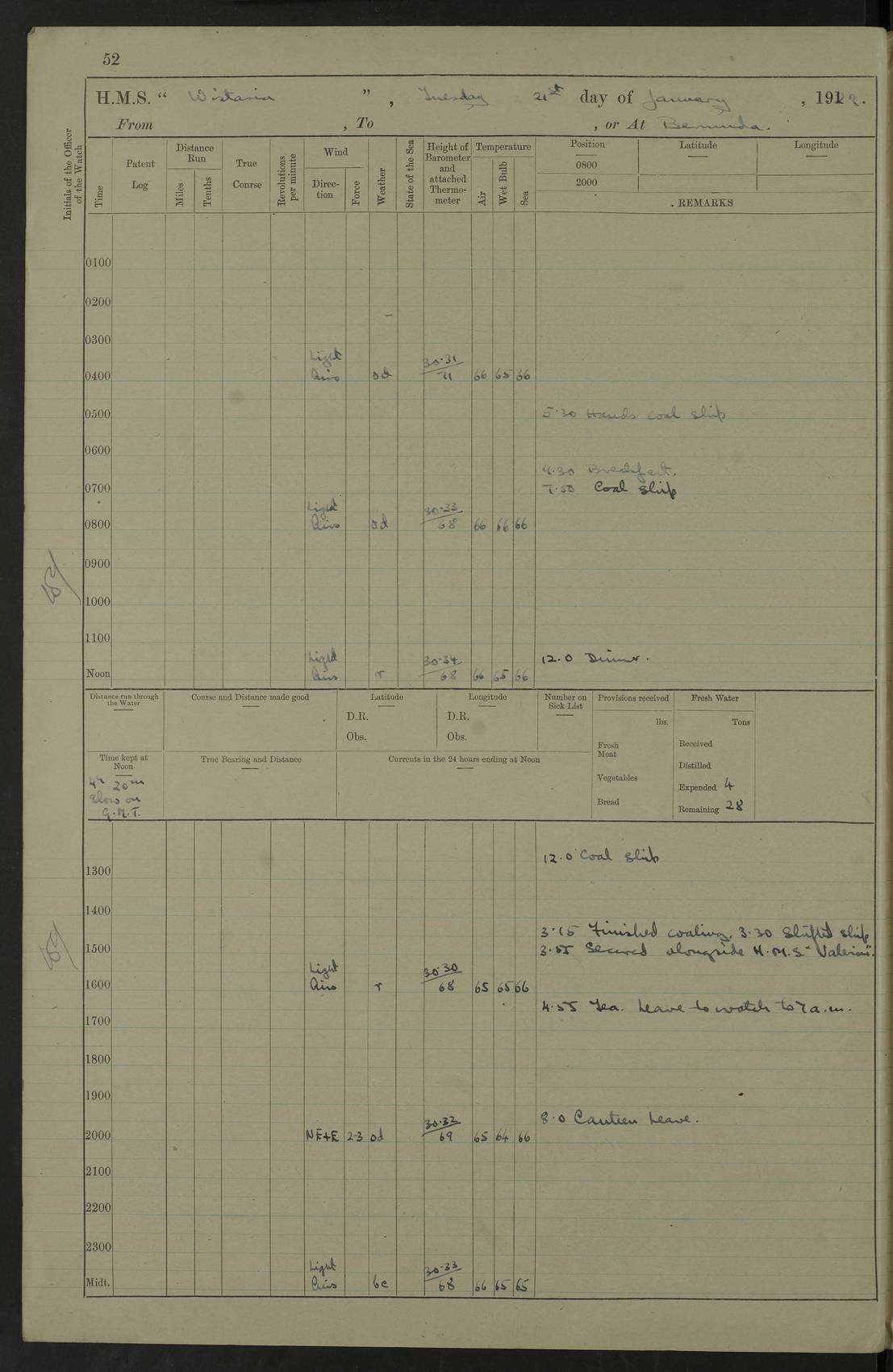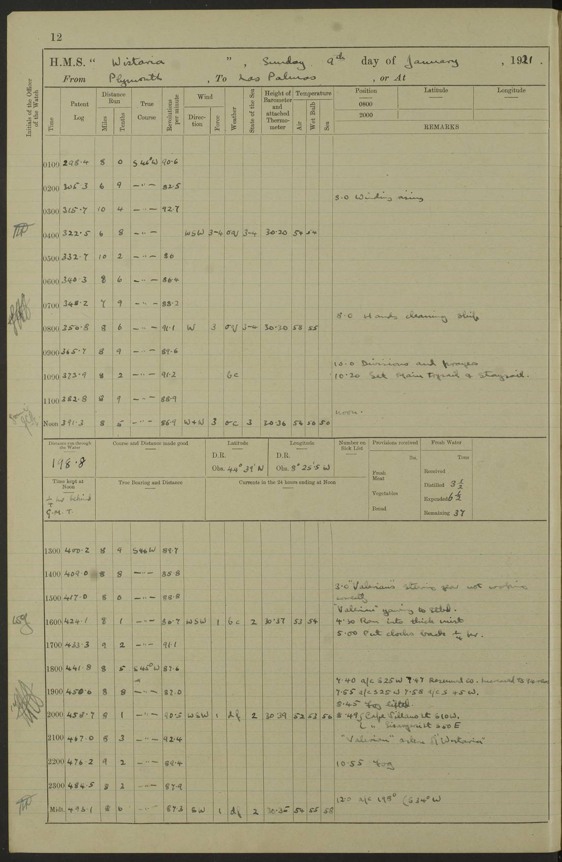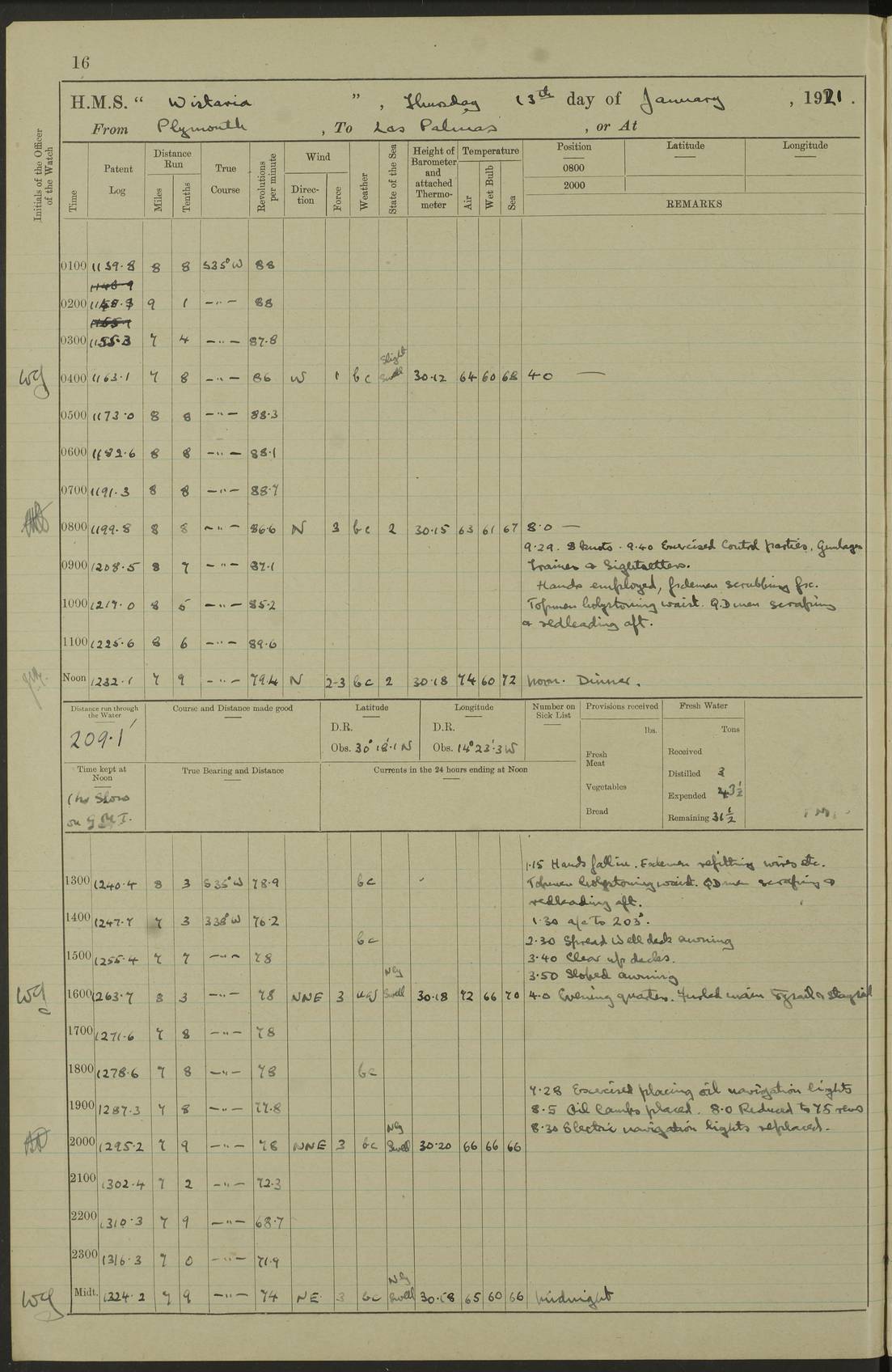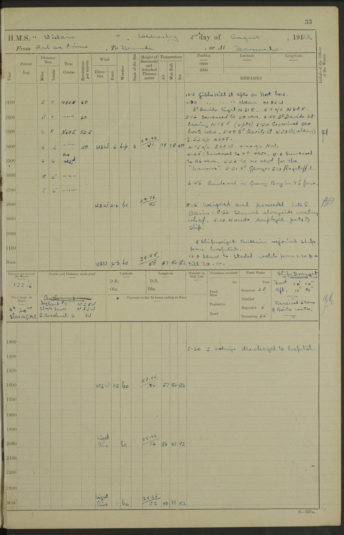LOG BOOK – JANUARY 1ST TO MARCH 1ST 1922 4f73ca88a2fc8ea903000b16: (https://s3.amazonaws.com:443/oldweather/ADM53-93265/0001_0.jpg) 4f73ca88a2fc8ea903000b17: (https://s3.amazonaws.com:443/oldweather/ADM53-93265/0001_1.jpg) 4f73ca88a2fc8ea903000b18: (https://s3.amazonaws.com:443/oldweather/ADM53-93265/0002_0.jpg) 4f73ca89a2fc8ea903000b19: (https://s3.amazonaws.com:443/oldweather/ADM53-93265/0002_1.jpg) At authorised power with natural draught: - Distance run per hour, miles: 16.376 - Coal expended for all purposes per hour, tons: 2.0 - Distance run per ton of coal, miles: 8.1888 - Date when this information was obtained by actual experiment: 24-3-16 4f73ca89a2fc8ea903000b1a: (https://s3.amazonaws.com:443/oldweather/ADM53-93265/0003_0.jpg)