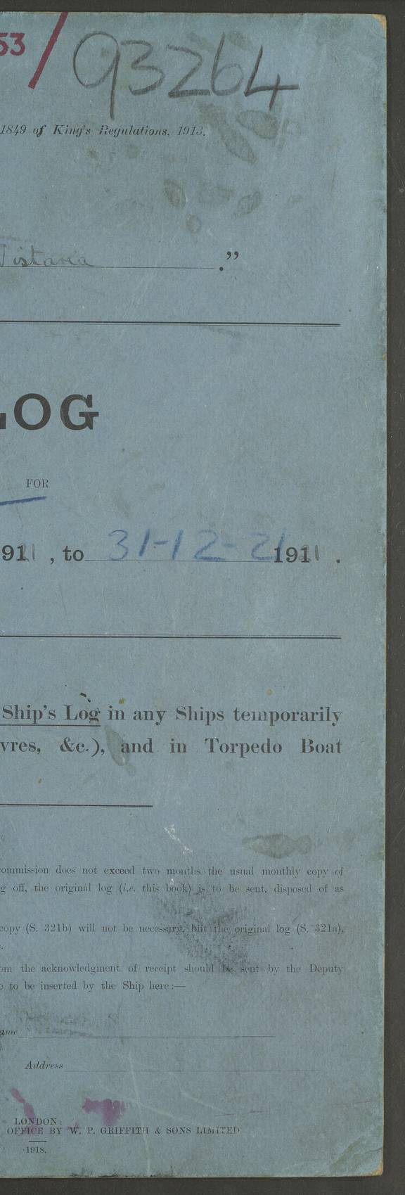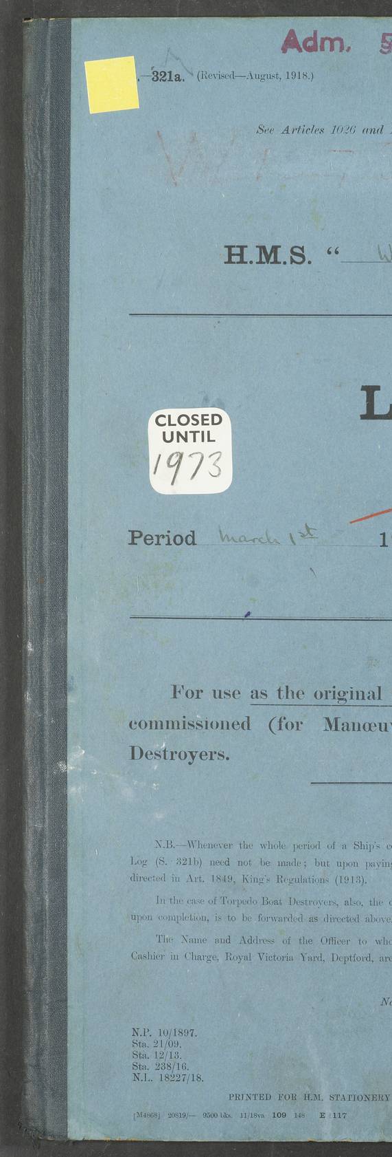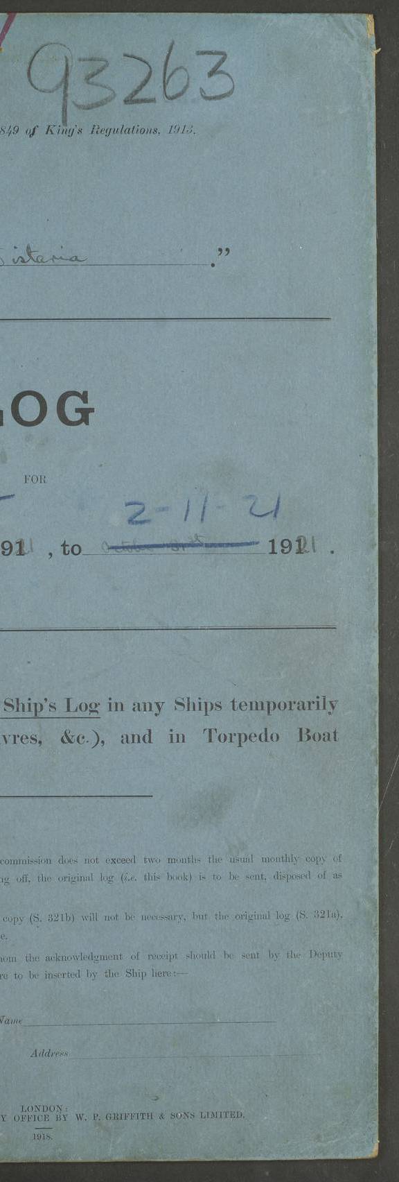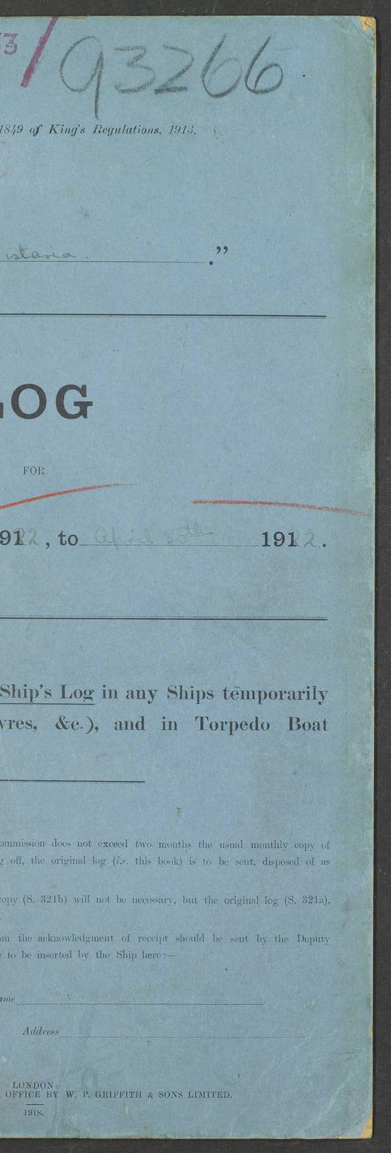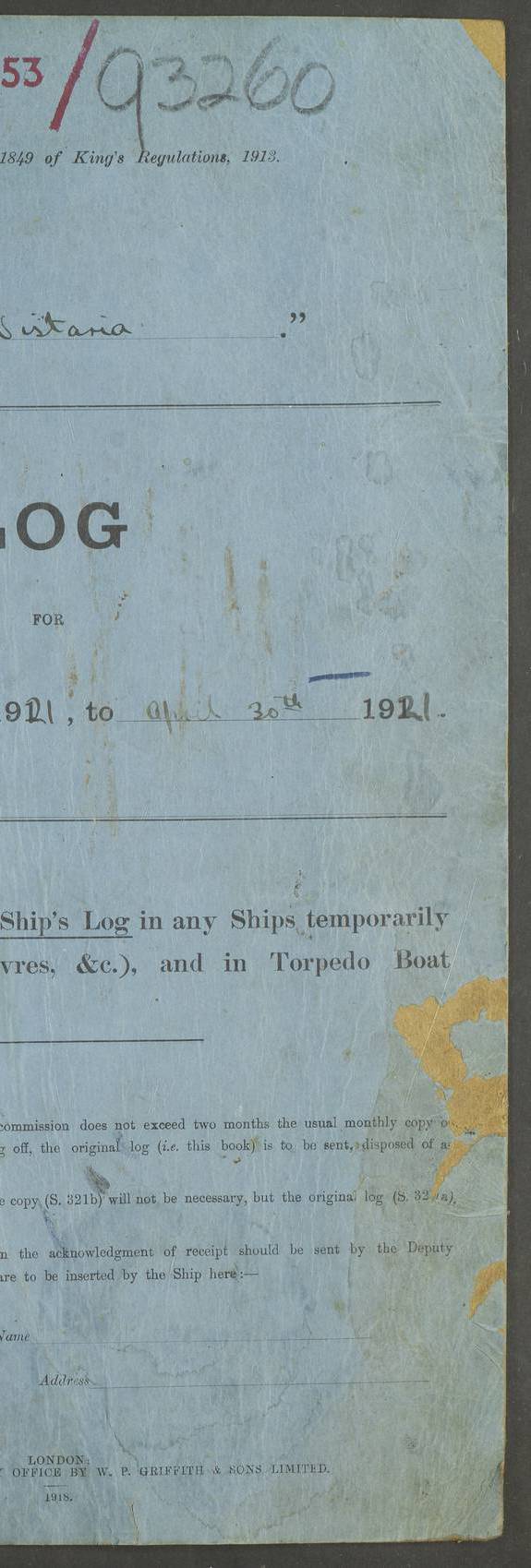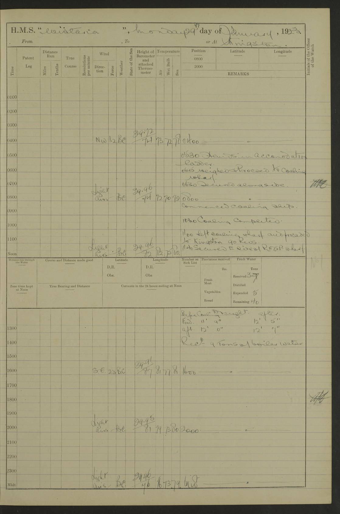 LOG BOOK – JANUARY 1ST TO MARCH 1ST 1922 4f73ca88a2fc8ea903000b16: (https://s3.amazonaws.com:443/oldweather/ADM53-93265/0001_0.jpg) 4f73ca88a2fc8ea903000b17: (https://s3.amazonaws.com:443/oldweather/ADM53-93265/0001_1.jpg) 4f73ca88a2fc8ea903000b18: (https://s3.amazonaws.com:443/oldweather/ADM53-93265/0002_0.jpg) 4f73ca89a2fc8ea903000b19: (https://s3.amazonaws.com:443/oldweather/ADM53-93265/0002_1.jpg) At authorised power with natural draught: - Distance run per hour, miles: 16.376 - Coal expended for all purposes per hour, tons: 2.0 - Distance run per ton of coal, miles: 8.1888 - Date when this information was obtained by actual experiment: 24-3-16 4f73ca89a2fc8ea903000b1a: (https://s3.amazonaws.com:443/oldweather/ADM53-93265/0003_0.jpg)