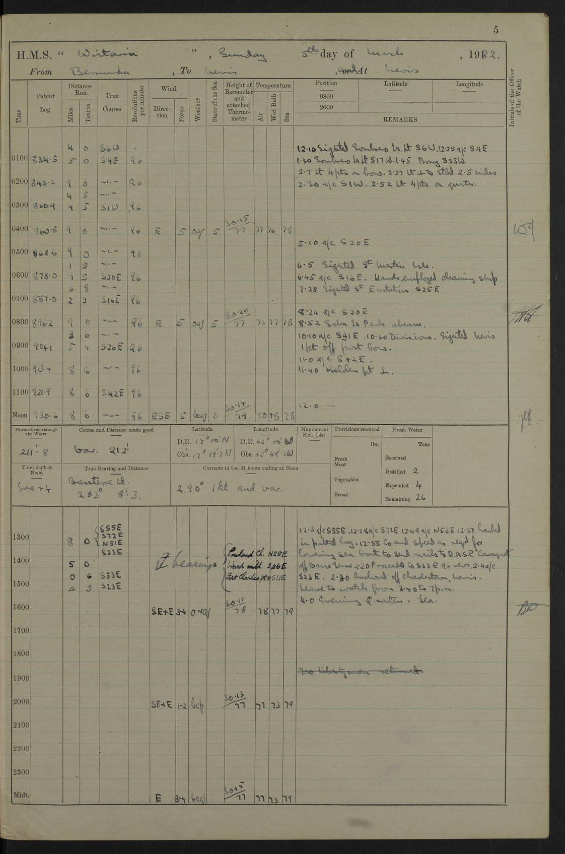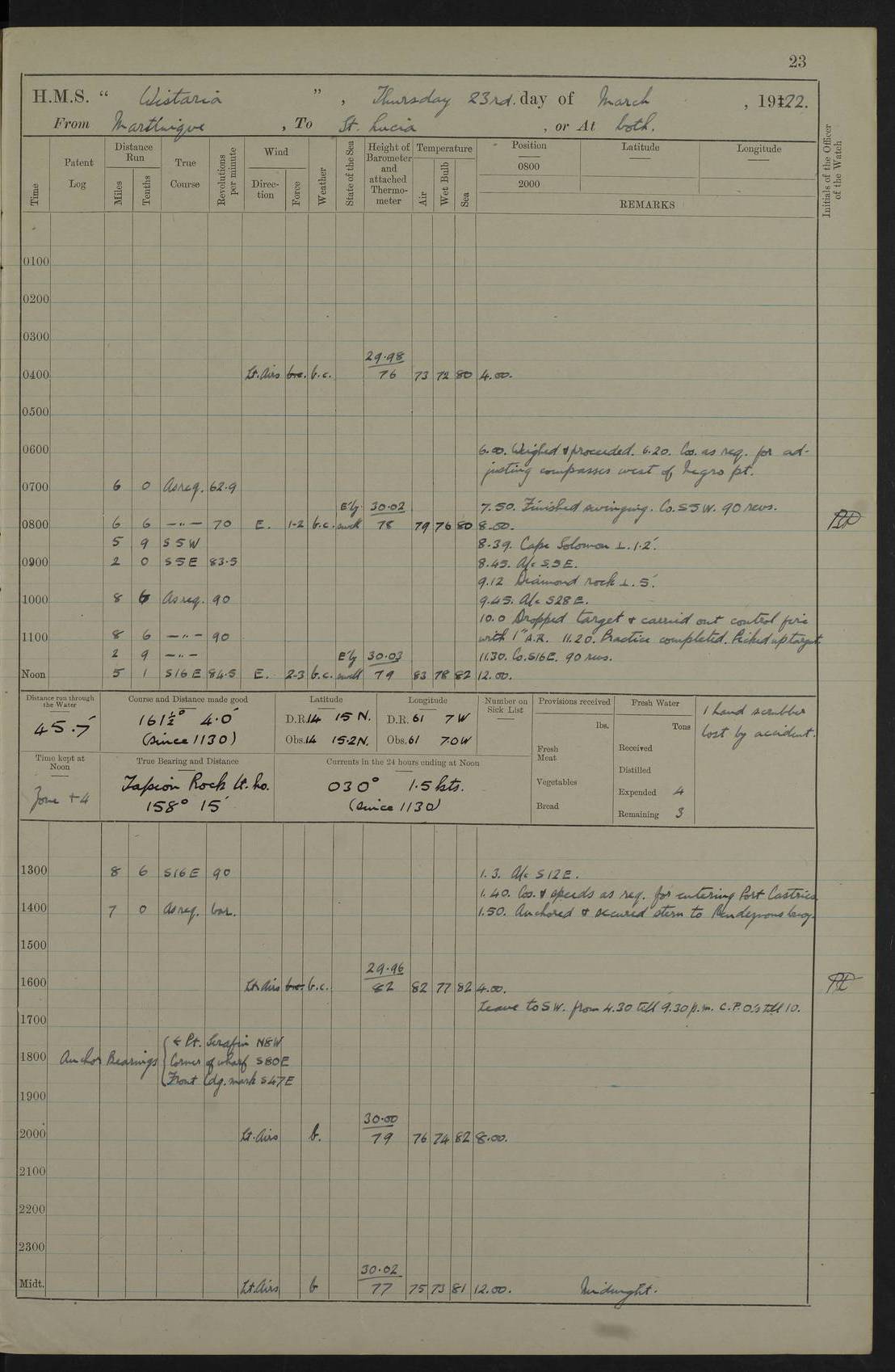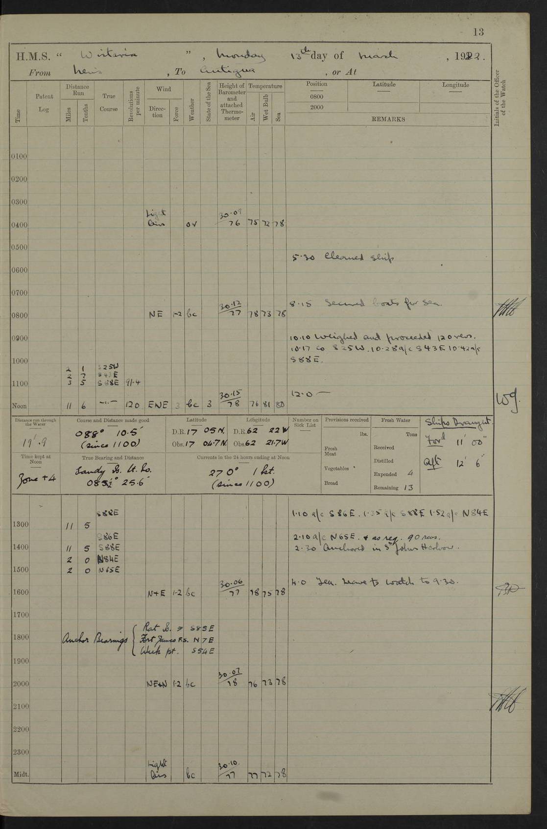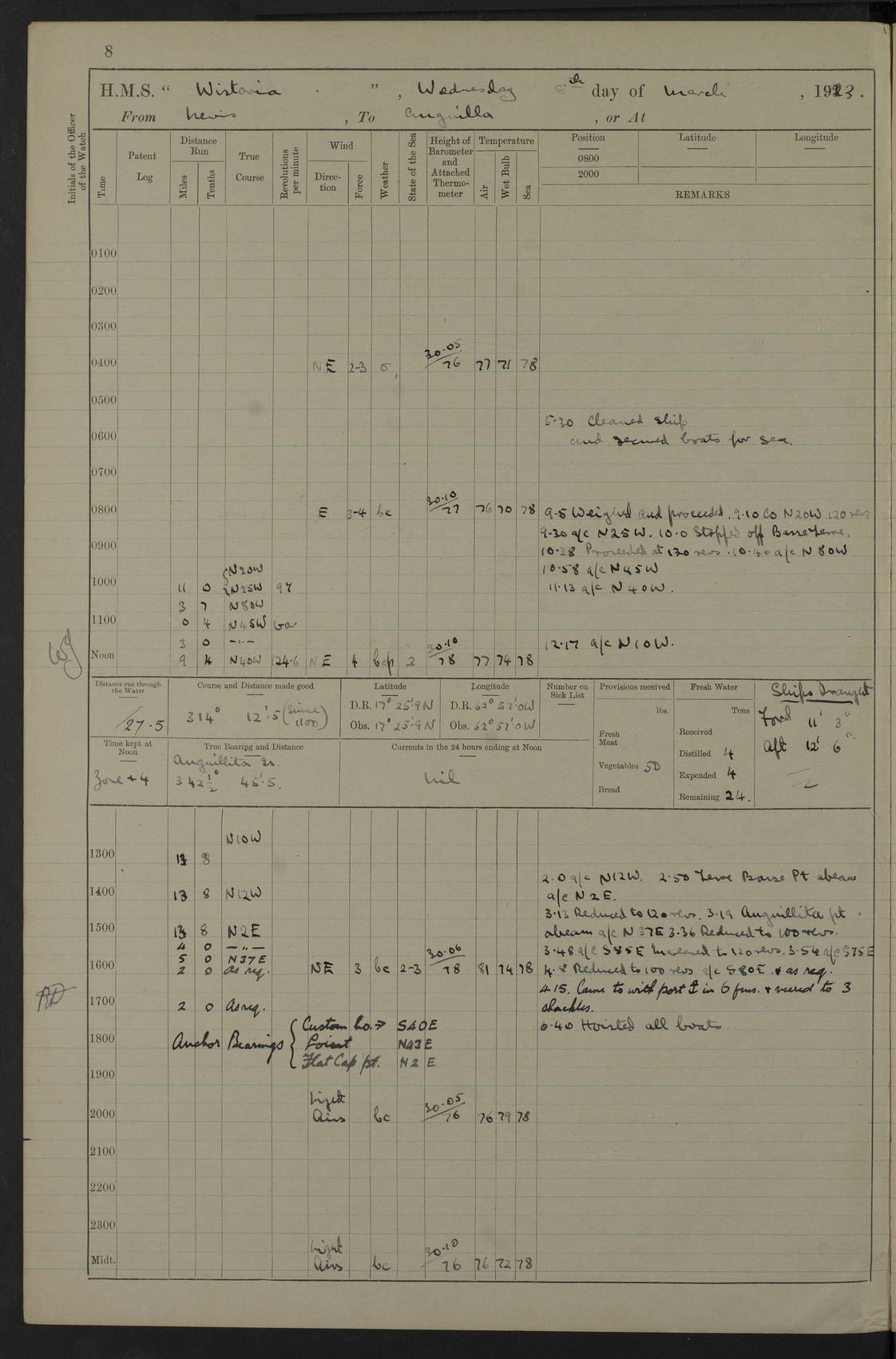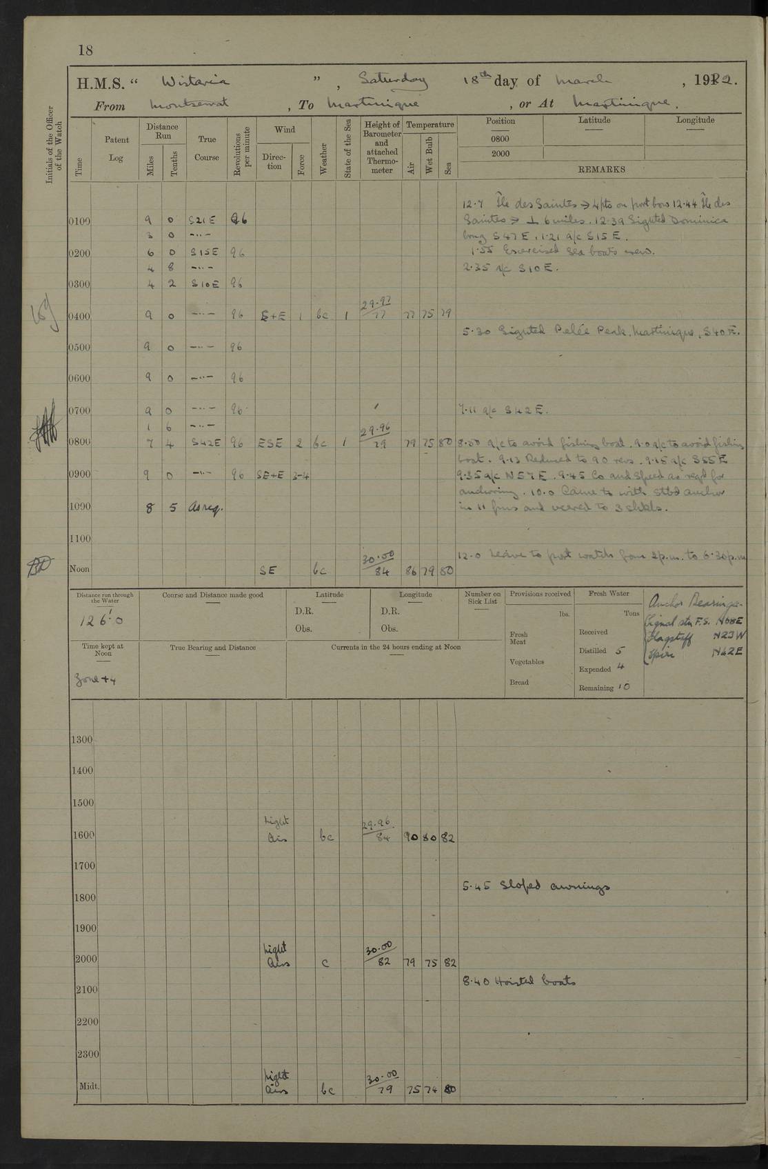 LOGS FOR MARCH 1922 4f73caa0a2fc8ea903000b56: (https://s3.amazonaws.com:443/oldweather/ADM53-93265/0033_0.jpg) 4f73caa4a2fc8ea903000b63: (https://s3.amazonaws.com:443/oldweather/ADM53-93266/0003_1.jpg) 1 March 1922 At Bermuda Lat 32.32, Long -64.8 9.30am: Hands employed preparing [securing] ship for sea 1.30pm: Left fenders 2.30pm: Proceeded as required for ship channel, 110 revs 3.37pm: Fairway Buoy abeam. Course SE 4.0pm: Reduced to 96 revs. Evening Quarters 4.55pm: Exercised sea boats crew 5.09pm: Streamed patent log 4f73caa5a2fc8ea903000b64: (https://s3.amazonaws.com:443/oldweather/ADM53-93266/0004_0.jpg) 2 March 1922 From Bermuda to Nevis Lat 28.91, Long -64.26 3.50am: Commenced working up for full power trial (8 hrs) 4.20am: Full power trial commenced 9.50am: Exercised sounding party am: Hands employed cleaning motor boat and parts of ship 12.25am: Eased to 132 revs. 3/5th power trial 4.0pm: Quarters. Exercised fire stations True Bearing and Distance: of Sombrero Island Lt 176°, 605 miles 4f73caa5a2fc8ea903000b65: (https://s3.amazonaws.com:443/oldweather/ADM53-93266/0004_1.jpg) 3 March 1922 [From Bermuda to Nevis] Lat 24.03, Long -63.78 4.26am: 3/5 power trial completed, reduced to 96 revs 7.0am: Set Fore staysail 9.30am: Divisions and Prayers. Exercised action stations 10.0am: Reset fore staysail 1.0pm: Hands mustered for monthly payment pm: Hands employed painting motor boat and parts of ship True Bearing and Distance: Sombrero 177°, 326 miles 4f73caa6a2fc8ea903000b66: (https://s3.amazonaws.com:443/oldweather/ADM53-93266/0005_0.jpg) 4 March 1922 From Bermuda to Nevis Lat 20.66, Long -63.4 2.0am: Tack of fore Staysail carried away, altered course West, “Slow” speed 2.15am: Resumed course and speed 10.0am: Passed steamer on Port beam 5.0pm: Put clocks on 20 minutes 6.02pm: Altered course S53W to lower fore staysail True Bearing and Distance: Sombrero 182°½, 124 miles 4f73caa6a2fc8ea903000b67: (https://s3.amazonaws.com:443/oldweather/ADM53-93266/0005_1.jpg) 5 March 1922 From Bermuda to Nevis and at Nevis Lat 17.0, Long -62.0 12.10am: Sighted Sombrero Island Lt S6W 1.30am: Sombrero Island Lt S17W 1.45am: Bearing S23W 2.07am: Lt 4 points on bow 2.27am: Light abeam to Starboard, 2.5 miles 2.52am: Light 4 points on quarter 6.05am: Sighted St Martin Isle 7.25am: Sighted St Eustatius S25E 8.52am: Saba Island Peak abeam 10.30am: Divisions. Sighted Nevis 1 point off Port bow 11.40am: Helden Point abeam 12.50pm: Hauled in patent log 12.55pm: Course and speed for lowering sea boat to send mails to RMSP “Caraquet” off Basse Terre 1.20pm: Proceeded. Course S33E, 96 revs 2.30pm: Anchored off Charlestown, Nevis Anchor Bearings: Lowland Church N28E, Ward Mill S46E, Fort Charles Pt S11E True Bearing and Distance: Basseterre Lt 283°, 8.3 miles 4f73caa6a2fc8ea903000b68: (https://s3.amazonaws.com:443/oldweather/ADM53-93266/0006_0.jpg) 6 March 1922 At Nevis Lat 17.14, Long -62.63 10.10am: Hands employed parts of ship and side party 11.30am: Saluting guns crews to drill 2.0pm: Hands employed cleaning ship’s side and parts of ship 8.10pm: Hoisted whaler 4f73caa7a2fc8ea903000b69: (https://s3.amazonaws.com:443/oldweather/ADM53-93266/0006_1.jpg) 7 March 1922 At Nevis Lat 17.14, Long -62.63 5.30am: Hands employed cleaning boats and ship 8.15am: Hands employed on boats and parts of ship 11.40am: Spread Q.D. awning 4f73caa7a2fc8ea903000b6a: (https://s3.amazonaws.com:443/oldweather/ADM53-93266/0007_0.jpg) 8 March 1922 From Nevis to Anguilla Lat 17.41, Long -62.95 5.30am: Cleaned ship and secured boats for sea 9.05am: Weighed and proceeded 10.0am: Stopped off Basse Terre 10.38am: Proceeded at 130 revs 2.50pm: Terre Basse Pt abeam, altered course N2E 3.19pm: Anguillita Pt abeam, altered course N37E 4.15pm: Came to with Port anchor in 6 fms & veered to 3 shackles Anchor Bearings: Custom Ho, right tangent, S40E; Point N43E; Flat Cap Pt N2E 6.40pm: Hoisted all boats True Bearing and Distance: Anguillita Island 342°½, 45.5 miles [Terre Basse Point: is the west extreme of St Martin Island] 4f73caa7a2fc8ea903000b6b: (https://s3.amazonaws.com:443/oldweather/ADM53-93266/0007_1.jpg) 9 March 1922 At Anguilla Lat 18.22, Long -63.07 8.15am: Hands employed cleaning out canteen flat and parts of ship 9.15am: Divisions and Prayers 4f73caa8a2fc8ea903000b6c: (https://s3.amazonaws.com:443/oldweather/ADM53-93266/0008_0.jpg) 10 March 1922 From Anguilla to Nevis Lat 17.6, Long -63.05 8.10am: H.E. the Governor and staff arrived on board 8.29am: Weighed and proceeded for Nevis at 120 revs. Course N83W 9.17am: Anguillita Island abeam. Altered course S5W 1.55pm: Brimstone Hill abeam 1 mile 2.35pm: Course and speed as required for anchoring 2.45pm: Came to with Starboard anchor in 4 fms 4.0pm: Anchored in 5 fms Anchor Bearings: Pier Head S72E, Fort Charles Pt S14E, Lowland Church N27E True Bearing and Distance: Basseterre Pier Lt 133°, 27 miles 4f73caa8a2fc8ea903000b6d: (https://s3.amazonaws.com:443/oldweather/ADM53-93266/0008_1.jpg) 11 March 1922 At Nevis Lat 17.14, Long -62.63 8.0am: Hands employed cleaning ship 4f73caa8a2fc8ea903000b6e: (https://s3.amazonaws.com:443/oldweather/ADM53-93266/0009_0.jpg) 12 March 1922 At Nevis Lat 17.14, Long -62.63 6.30am: Cleaned ship 9.45am: Divisions 3.0pm: Ship opened to visitors 4f73caa9a2fc8ea903000b6f: (https://s3.amazonaws.com:443/oldweather/ADM53-93266/0009_1.jpg) 13 March 1922 From Nevis to Antigua Lat 17.08, Long -62.36 8.15am: Secured boats for sea 10.10am: Weighed and proceeded 120 revs 2.30pm: Anchored in St Johns Harbour Anchor Bearings: Rat Island, right tangent, S85E; Fort James F.S. N7E; Week Pt S54E True Bearing and Distance: Sandy Island Lt Ho 085°½, 25.6 miles 4f73caa9a2fc8ea903000b70: (https://s3.amazonaws.com:443/oldweather/ADM53-93266/0010_0.jpg) 14 March 1922 At Antigua Lat 17.12, Long -61.85 8.15am: Hands employed spreading and fitting after boat deck awning and part of ship 9.25am: Carried on with work 4f73caaaa2fc8ea903000b71: (https://s3.amazonaws.com:443/o