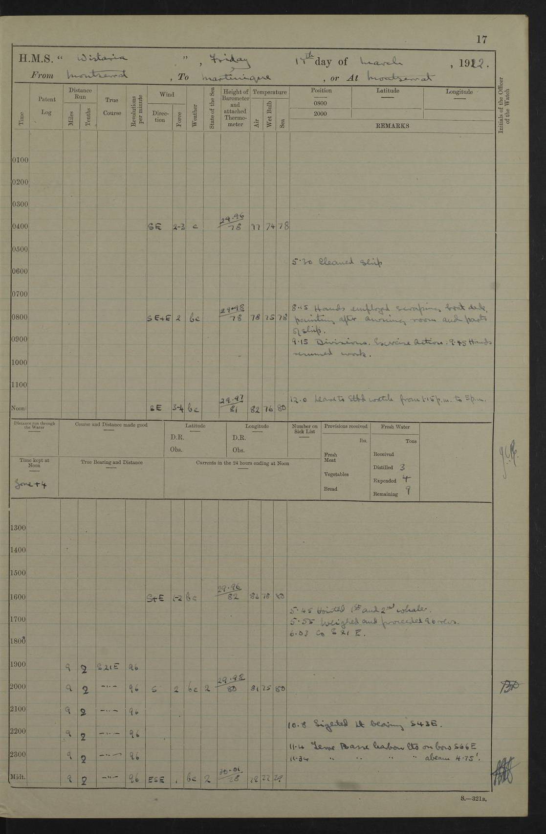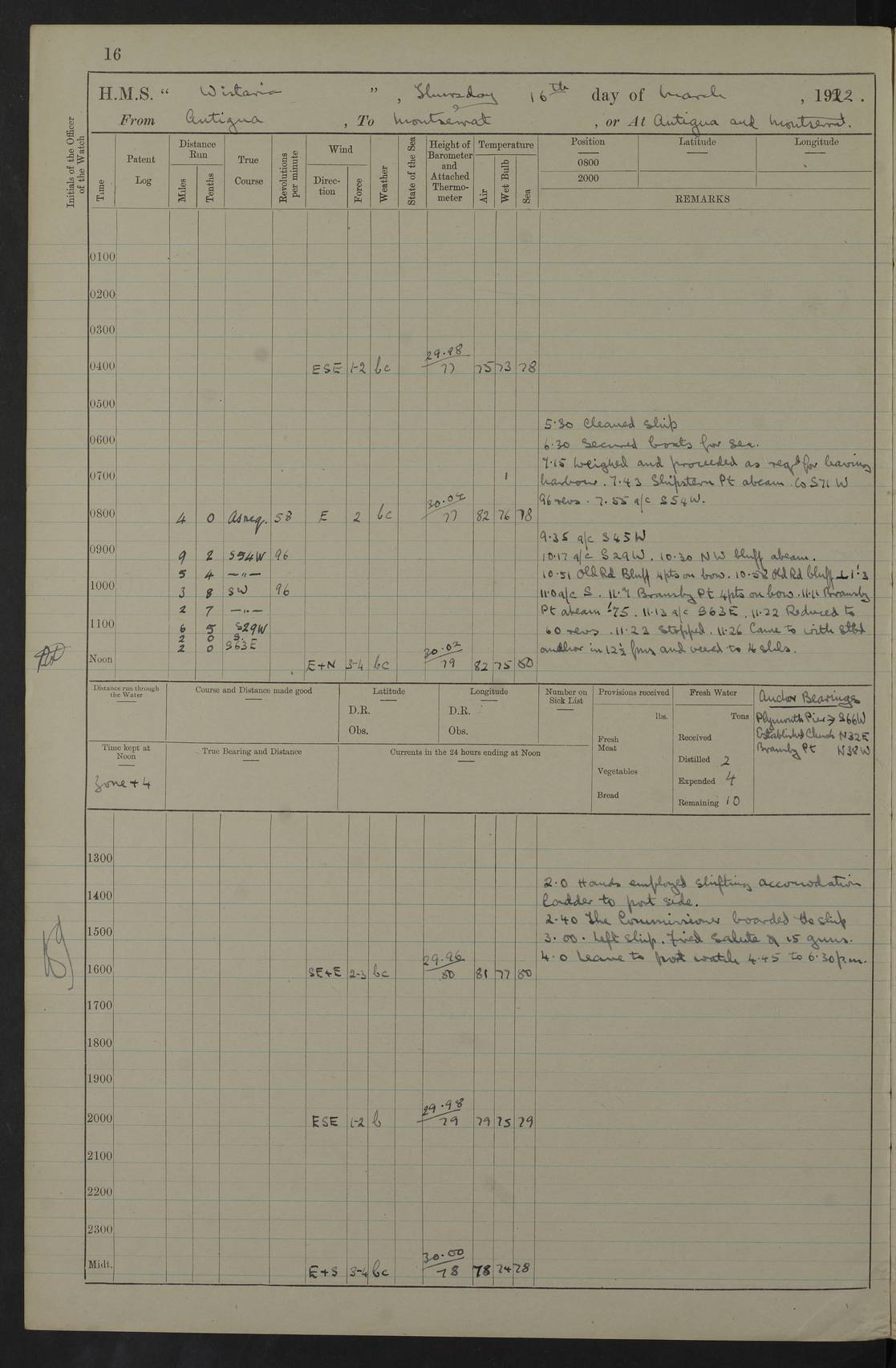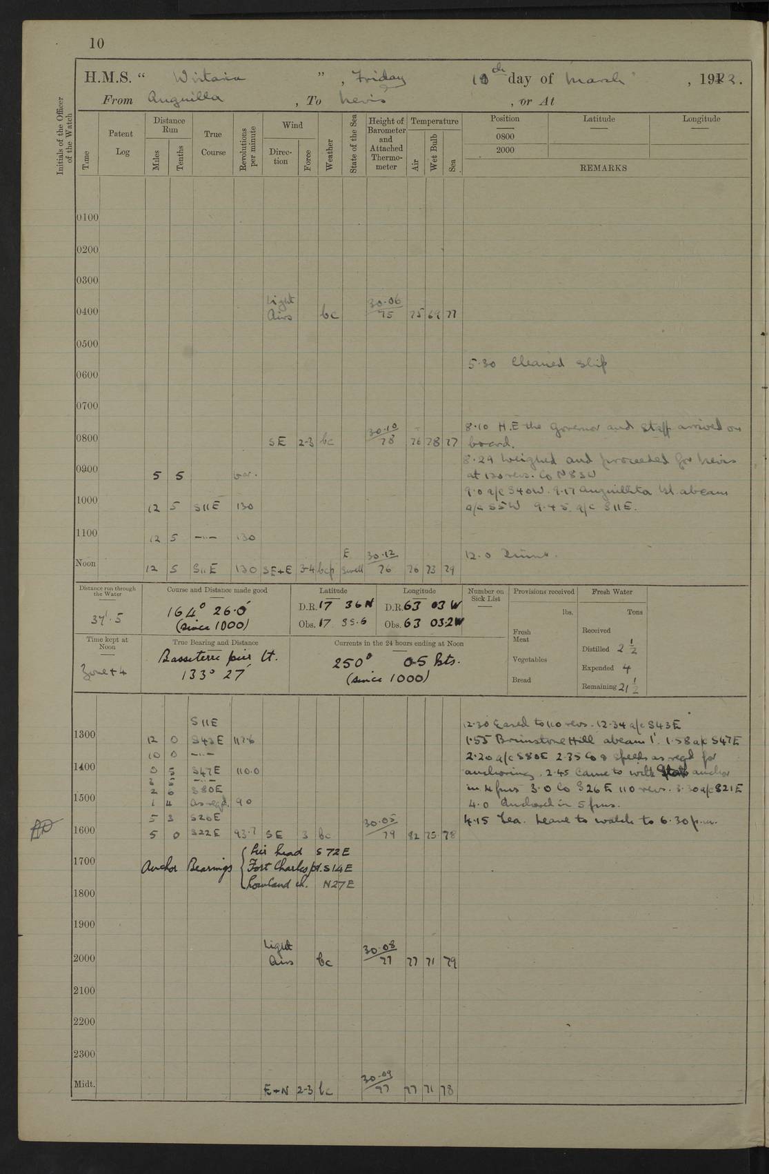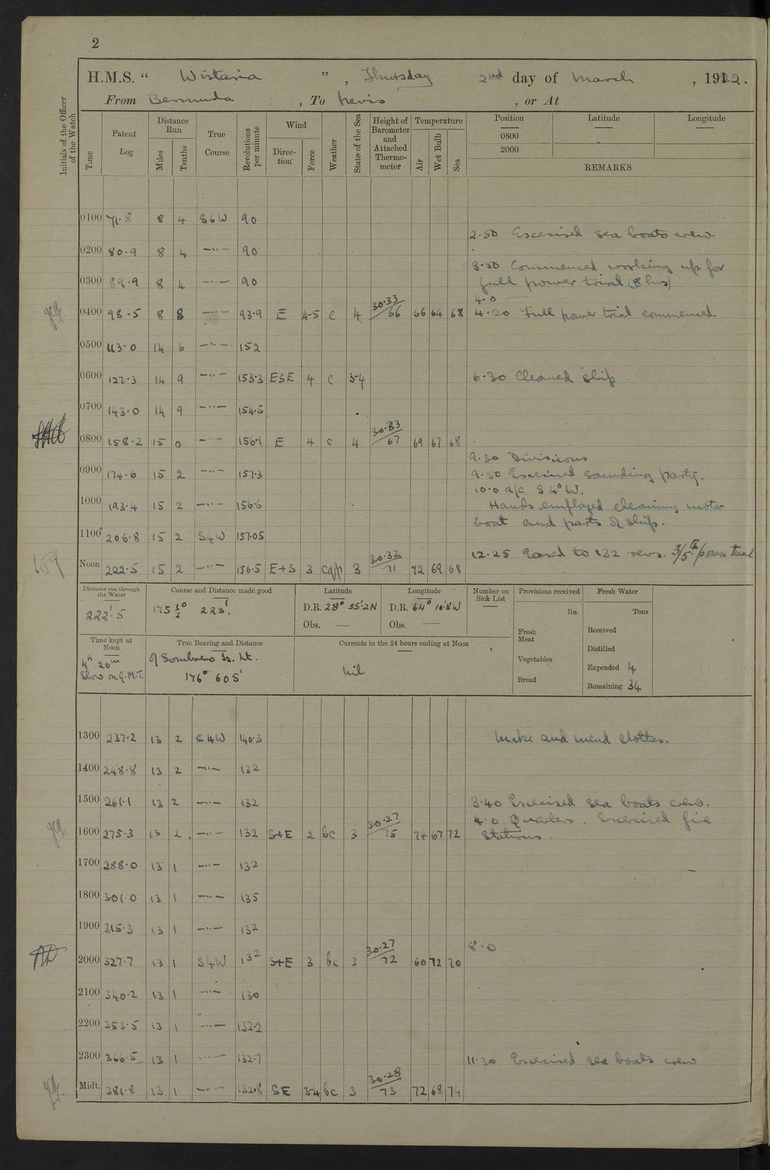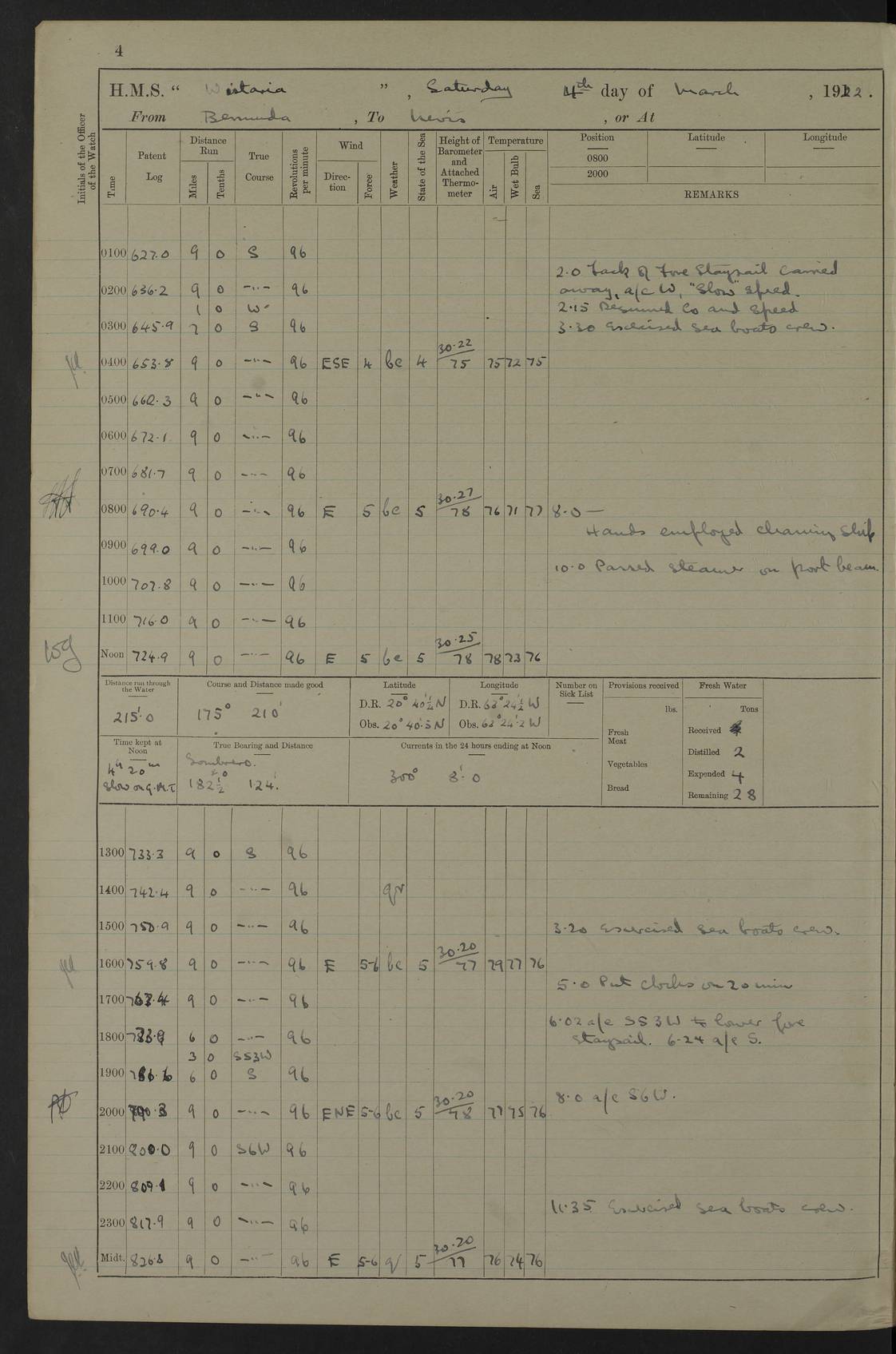 LOGS FOR MARCH 1922 4f73caa0a2fc8ea903000b56: (https://s3.amazonaws.com:443/oldweather/ADM53-93265/0033_0.jpg) 4f73caa4a2fc8ea903000b63: (https://s3.amazonaws.com:443/oldweather/ADM53-93266/0003_1.jpg) 1 March 1922 At Bermuda Lat 32.32, Long -64.8 9.30am: Hands employed preparing [securing] ship for sea 1.30pm: Left fenders 2.30pm: Proceeded as required for ship channel, 110 revs 3.37pm: Fairway Buoy abeam. Course SE 4.0pm: Reduced to 96 revs. Evening Quarters 4.55pm: Exercised sea boats crew 5.09pm: Streamed patent log 4f73caa5a2fc8ea903000b64: (https://s3.amazonaws.com:443/oldweather/ADM53-93266/0004_0.jpg) 2 March 1922 From Bermuda to Nevis Lat 28.91, Long -64.26 3.50am: Commenced working up for full power trial (8 hrs) 4.20am: Full power trial commenced 9.50am: Exercised sounding party am: Hands employed cleaning motor boat and parts of ship 12.25am: Eased to 132 revs. 3/5th power trial 4.0pm: Quarters. Exercised fire stations True Bearing and Distance: of Sombrero Island Lt 176°, 605 miles 4f73caa5a2fc8ea903000b65: (https://s3.amazonaws.com:443/oldweather/ADM53-93266/0004_1.jpg) 3 March 1922 [From Bermuda to Nevis] Lat 24.03, Long -63.78 4.26am: 3/5 power trial completed, reduced to 96 revs 7.0am: Set Fore staysail 9.30am: Divisions and Prayers. Exercised action stations 10.0am: Reset fore staysail 1.0pm: Hands mustered for monthly payment pm: Hands employed painting motor boat and parts of ship True Bearing and Distance: Sombrero 177°, 326 miles 4f73caa6a2fc8ea903000b66: (https://s3.amazonaws.com:443/oldweather/ADM53-93266/0005_0.jpg) 4 March 1922 From Bermuda to Nevis Lat 20.66, Long -63.4 2.0am: Tack of fore Staysail carried away, altered course West, “Slow” speed 2.15am: Resumed course and speed 10.0am: Passed steamer on Port beam 5.0pm: Put clocks on 20 minutes 6.02pm: Altered course S53W to lower fore staysail True Bearing and Distance: Sombrero 182°½, 124 miles 4f73caa6a2fc8ea903000b67: (https://s3.amazonaws.com:443/oldweather/ADM53-93266/0005_1.jpg) 5 March 1922 From Bermuda to Nevis and at Nevis Lat 17.0, Long -62.0 12.10am: Sighted Sombrero Island Lt S6W 1.30am: Sombrero Island Lt S17W 1.45am: Bearing S23W 2.07am: Lt 4 points on bow 2.27am: Light abeam to Starboard, 2.5 miles 2.52am: Light 4 points on quarter 6.05am: Sighted St Martin Isle 7.25am: Sighted St Eustatius S25E 8.52am: Saba Island Peak abeam 10.30am: Divisions. Sighted Nevis 1 point off Port bow 11.40am: Helden Point abeam 12.50pm: Hauled in patent log 12.55pm: Course and speed for lowering sea boat to send mails to RMSP “Caraquet” off Basse Terre 1.20pm: Proceeded. Course S33E, 96 revs 2.30pm: Anchored off Charlestown, Nevis Anchor Bearings: Lowland Church N28E, Ward Mill S46E, Fort Charles Pt S11E True Bearing and Distance: Basseterre Lt 283°, 8.3 miles 4f73caa6a2fc8ea903000b68: (https://s3.amazonaws.com:443/oldweather/ADM53-93266/0006_0.jpg) 6 March 1922 At Nevis Lat 17.14, Long -62.63 10.10am: Hands employed parts of ship and side party 11.30am: Saluting guns crews to drill 2.0pm: Hands employed cleaning ship’s side and parts of ship 8.10pm: Hoisted whaler 4f73caa7a2fc8ea903000b69: (https://s3.amazonaws.com:443/oldweather/ADM53-93266/0006_1.jpg) 7 March 1922 At Nevis Lat 17.14, Long -62.63 5.30am: Hands employed cleaning boats and ship 8.15am: Hands employed on boats and parts of ship 11.40am: Spread Q.D. awning 4f73caa7a2fc8ea903000b6a: (https://s3.amazonaws.com:443/oldweather/ADM53-93266/0007_0.jpg) 8 March 1922 From Nevis to Anguilla Lat 17.41, Long -62.95 5.30am: Cleaned ship and secured boats for sea 9.05am: Weighed and proceeded 10.0am: Stopped off Basse Terre 10.38am: Proceeded at 130 revs 2.50pm: Terre Basse Pt abeam, altered course N2E 3.19pm: Anguillita Pt abeam, altered course N37E 4.15pm: Came to with Port anchor in 6 fms & veered to 3 shackles Anchor Bearings: Custom Ho, right tangent, S40E; Point N43E; Flat Cap Pt N2E 6.40pm: Hoisted all boats True Bearing and Distance: Anguillita Island 342°½, 45.5 miles [Terre Basse Point: is the west extreme of St Martin Island] 4f73caa7a2fc8ea903000b6b: (https://s3.amazonaws.com:443/oldweather/ADM53-93266/0007_1.jpg) 9 March 1922 At Anguilla Lat 18.22, Long -63.07 8.15am: Hands employed cleaning out canteen flat and parts of ship 9.15am: Divisions and Prayers 4f73caa8a2fc8ea903000b6c: (https://s3.amazonaws.com:443/oldweather/ADM53-93266/0008_0.jpg) 10 March 1922 From Anguilla to Nevis Lat 17.6, Long -63.05 8.10am: H.E. the Governor and staff arrived on board 8.29am: Weighed and proceeded for Nevis at 120 revs. Course N83W 9.17am: Anguillita Island abeam. Altered course S5W 1.55pm: Brimstone Hill abeam 1 mile 2.35pm: Course and speed as required for anchoring 2.45pm: Came to with Starboard anchor in 4 fms 4.0pm: Anchored in 5 fms Anchor Bearings: Pier Head S72E, Fort Charles Pt S14E, Lowland Church N27E True Bearing and Distance: Basseterre Pier Lt 133°, 27 miles 4f73caa8a2fc8ea903000b6d: (https://s3.amazonaws.com:443/oldweather/ADM53-93266/0008_1.jpg) 11 March 1922 At Nevis Lat 17.14, Long -62.63 8.0am: Hands employed cleaning ship 4f73caa8a2fc8ea903000b6e: (https://s3.amazonaws.com:443/oldweather/ADM53-93266/0009_0.jpg) 12 March 1922 At Nevis Lat 17.14, Long -62.63 6.30am: Cleaned ship 9.45am: Divisions 3.0pm: Ship opened to visitors 4f73caa9a2fc8ea903000b6f: (https://s3.amazonaws.com:443/oldweather/ADM53-93266/0009_1.jpg) 13 March 1922 From Nevis to Antigua Lat 17.08, Long -62.36 8.15am: Secured boats for sea 10.10am: Weighed and proceeded 120 revs 2.30pm: Anchored in St Johns Harbour Anchor Bearings: Rat Island, right tangent, S85E; Fort James F.S. N7E; Week Pt S54E True Bearing and Distance: Sandy Island Lt Ho 085°½, 25.6 miles 4f73caa9a2fc8ea903000b70: (https://s3.amazonaws.com:443/oldweather/ADM53-93266/0010_0.jpg) 14 March 1922 At Antigua Lat 17.12, Long -61.85 8.15am: Hands employed spreading and fitting after boat deck awning and part of ship 9.25am: Carried on with work 4f73caaaa2fc8ea903000b71: (https://s3.amazonaws.com:443/o