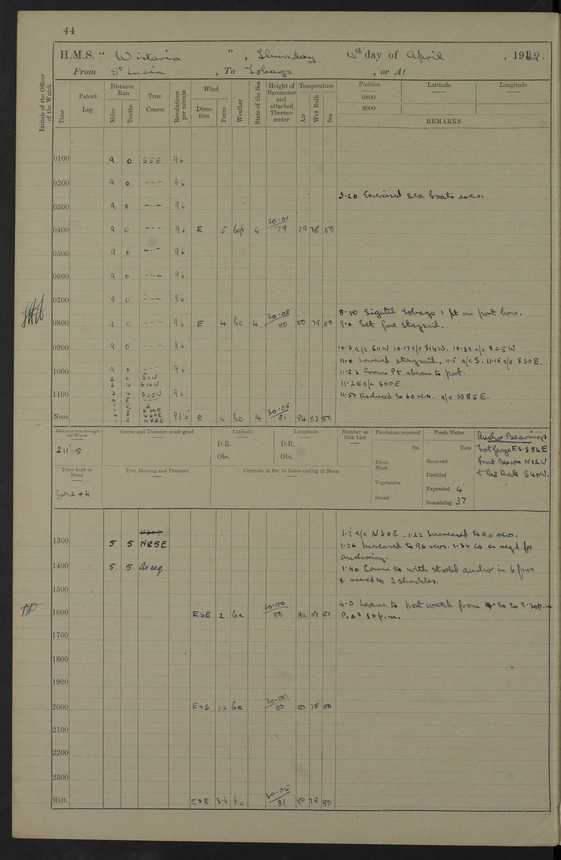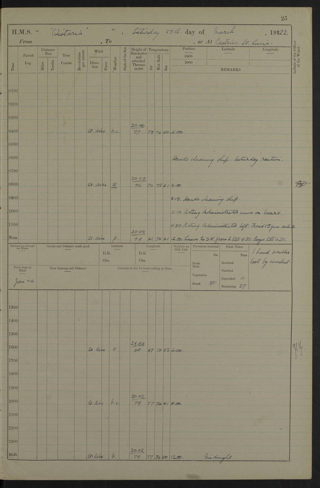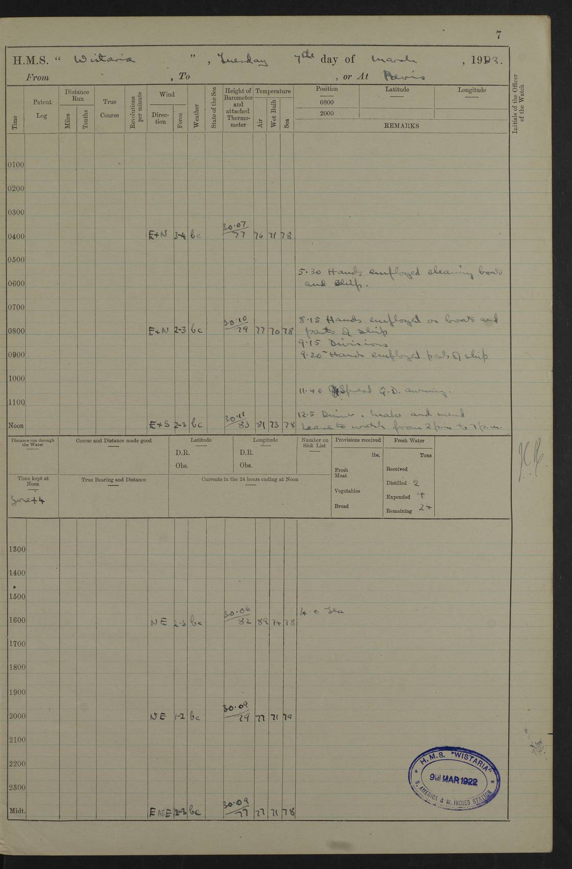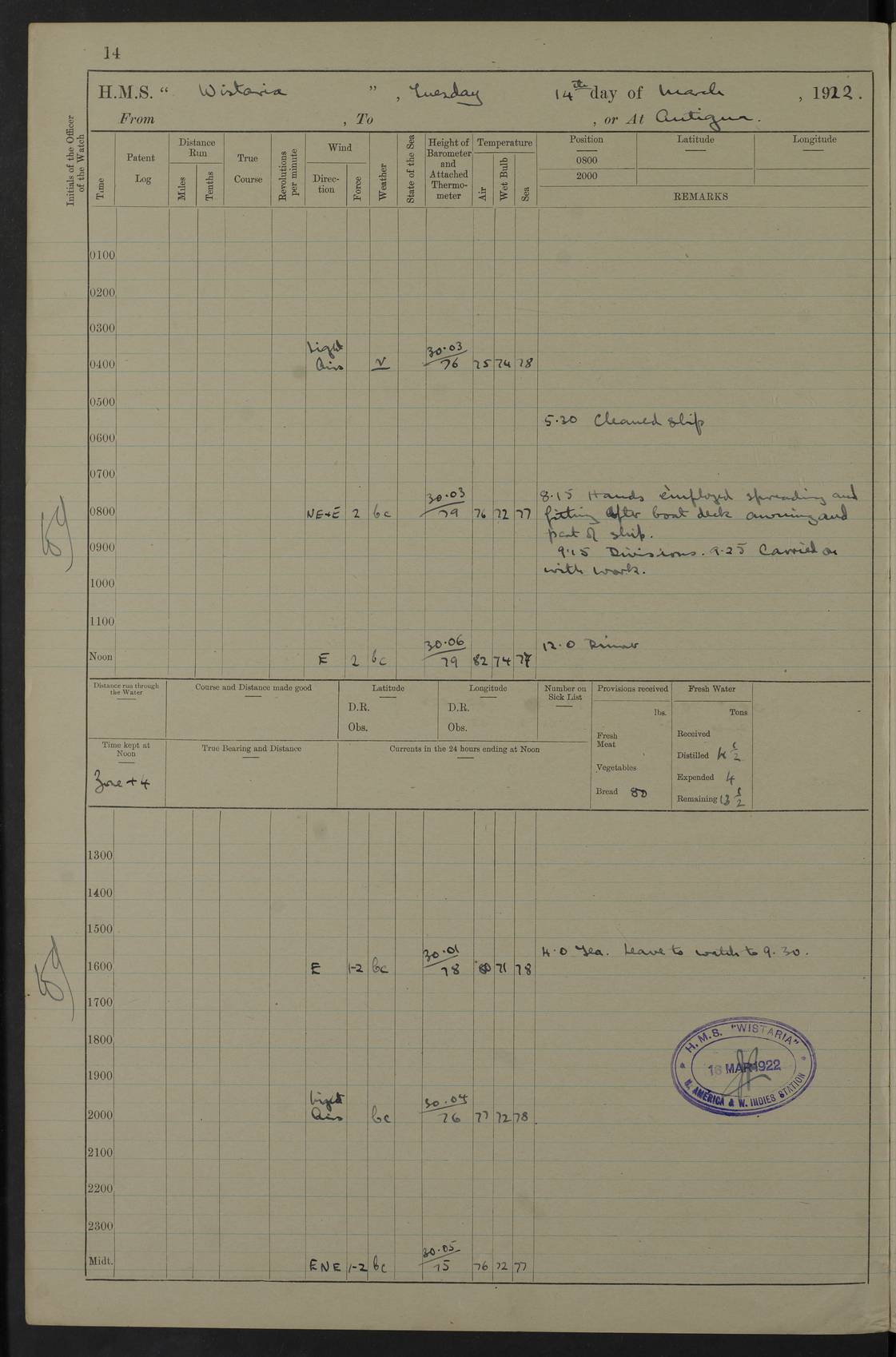 LOGS FOR MARCH 1922 4f73caa0a2fc8ea903000b56: (https://s3.amazonaws.com:443/oldweather/ADM53-93265/0033_0.jpg) 4f73caa4a2fc8ea903000b63: (https://s3.amazonaws.com:443/oldweather/ADM53-93266/0003_1.jpg) 1 March 1922 At Bermuda Lat 32.32, Long -64.8 9.30am: Hands employed preparing [securing] ship for sea 1.30pm: Left fenders 2.30pm: Proceeded as required for ship channel, 110 revs 3.37pm: Fairway Buoy abeam. Course SE 4.0pm: Reduced to 96 revs. Evening Quarters 4.55pm: Exercised sea boats crew 5.09pm: Streamed patent log 4f73caa5a2fc8ea903000b64: (https://s3.amazonaws.com:443/oldweather/ADM53-93266/0004_0.jpg) 2 March 1922 From Bermuda to Nevis Lat 28.91, Long -64.26 3.50am: Commenced working up for full power trial (8 hrs) 4.20am: Full power trial commenced 9.50am: Exercised sounding party am: Hands employed cleaning motor boat and parts of ship 12.25am: Eased to 132 revs. 3/5th power trial 4.0pm: Quarters. Exercised fire stations True Bearing and Distance: of Sombrero Island Lt 176°, 605 miles 4f73caa5a2fc8ea903000b65: (https://s3.amazonaws.com:443/oldweather/ADM53-93266/0004_1.jpg) 3 March 1922 [From Bermuda to Nevis] Lat 24.03, Long -63.78 4.26am: 3/5 power trial completed, reduced to 96 revs 7.0am: Set Fore staysail 9.30am: Divisions and Prayers. Exercised action stations 10.0am: Reset fore staysail 1.0pm: Hands mustered for monthly payment pm: Hands employed painting motor boat and parts of ship True Bearing and Distance: Sombrero 177°, 326 miles 4f73caa6a2fc8ea903000b66: (https://s3.amazonaws.com:443/oldweather/ADM53-93266/0005_0.jpg) 4 March 1922 From Bermuda to Nevis Lat 20.66, Long -63.4 2.0am: Tack of fore Staysail carried away, altered course West, “Slow” speed 2.15am: Resumed course and speed 10.0am: Passed steamer on Port beam 5.0pm: Put clocks on 20 minutes 6.02pm: Altered course S53W to lower fore staysail True Bearing and Distance: Sombrero 182°½, 124 miles 4f73caa6a2fc8ea903000b67: (https://s3.amazonaws.com:443/oldweather/ADM53-93266/0005_1.jpg) 5 March 1922 From Bermuda to Nevis and at Nevis Lat 17.0, Long -62.0 12.10am: Sighted Sombrero Island Lt S6W 1.30am: Sombrero Island Lt S17W 1.45am: Bearing S23W 2.07am: Lt 4 points on bow 2.27am: Light abeam to Starboard, 2.5 miles 2.52am: Light 4 points on quarter 6.05am: Sighted St Martin Isle 7.25am: Sighted St Eustatius S25E 8.52am: Saba Island Peak abeam 10.30am: Divisions. Sighted Nevis 1 point off Port bow 11.40am: Helden Point abeam 12.50pm: Hauled in patent log 12.55pm: Course and speed for lowering sea boat to send mails to RMSP “Caraquet” off Basse Terre 1.20pm: Proceeded. Course S33E, 96 revs 2.30pm: Anchored off Charlestown, Nevis Anchor Bearings: Lowland Church N28E, Ward Mill S46E, Fort Charles Pt S11E True Bearing and Distance: Basseterre Lt 283°, 8.3 miles 4f73caa6a2fc8ea903000b68: (https://s3.amazonaws.com:443/oldweather/ADM53-93266/0006_0.jpg) 6 March 1922 At Nevis Lat 17.14, Long -62.63 10.10am: Hands employed parts of ship and side party 11.30am: Saluting guns crews to drill 2.0pm: Hands employed cleaning ship’s side and parts of ship 8.10pm: Hoisted whaler 4f73caa7a2fc8ea903000b69: (https://s3.amazonaws.com:443/oldweather/ADM53-93266/0006_1.jpg) 7 March 1922 At Nevis Lat 17.14, Long -62.63 5.30am: Hands employed cleaning boats and ship 8.15am: Hands employed on boats and parts of ship 11.40am: Spread Q.D. awning 4f73caa7a2fc8ea903000b6a: (https://s3.amazonaws.com:443/oldweather/ADM53-93266/0007_0.jpg) 8 March 1922 From Nevis to Anguilla Lat 17.41, Long -62.95 5.30am: Cleaned ship and secured boats for sea 9.05am: Weighed and proceeded 10.0am: Stopped off Basse Terre 10.38am: Proceeded at 130 revs 2.50pm: Terre Basse Pt abeam, altered course N2E 3.19pm: Anguillita Pt abeam, altered course N37E 4.15pm: Came to with Port anchor in 6 fms & veered to 3 shackles Anchor Bearings: Custom Ho, right tangent, S40E; Point N43E; Flat Cap Pt N2E 6.40pm: Hoisted all boats True Bearing and Distance: Anguillita Island 342°½, 45.5 miles [Terre Basse Point: is the west extreme of St Martin Island] 4f73caa7a2fc8ea903000b6b: (https://s3.amazonaws.com:443/oldweather/ADM53-93266/0007_1.jpg) 9 March 1922 At Anguilla Lat 18.22, Long -63.07 8.15am: Hands employed cleaning out canteen flat and parts of ship 9.15am: Divisions and Prayers 4f73caa8a2fc8ea903000b6c: (https://s3.amazonaws.com:443/oldweather/ADM53-93266/0008_0.jpg) 10 March 1922 From Anguilla to Nevis Lat 17.6, Long -63.05 8.10am: H.E. the Governor and staff arrived on board 8.29am: Weighed and proceeded for Nevis at 120 revs. Course N83W 9.17am: Anguillita Island abeam. Altered course S5W 1.55pm: Brimstone Hill abeam 1 mile 2.35pm: Course and speed as required for anchoring 2.45pm: Came to with Starboard anchor in 4 fms 4.0pm: Anchored in 5 fms Anchor Bearings: Pier Head S72E, Fort Charles Pt S14E, Lowland Church N27E True Bearing and Distance: Basseterre Pier Lt 133°, 27 miles 4f73caa8a2fc8ea903000b6d: (https://s3.amazonaws.com:443/oldweather/ADM53-93266/0008_1.jpg) 11 March 1922 At Nevis Lat 17.14, Long -62.63 8.0am: Hands employed cleaning ship 4f73caa8a2fc8ea903000b6e: (https://s3.amazonaws.com:443/oldweather/ADM53-93266/0009_0.jpg) 12 March 1922 At Nevis Lat 17.14, Long -62.63 6.30am: Cleaned ship 9.45am: Divisions 3.0pm: Ship opened to visitors 4f73caa9a2fc8ea903000b6f: (https://s3.amazonaws.com:443/oldweather/ADM53-93266/0009_1.jpg) 13 March 1922 From Nevis to Antigua Lat 17.08, Long -62.36 8.15am: Secured boats for sea 10.10am: Weighed and proceeded 120 revs 2.30pm: Anchored in St Johns Harbour Anchor Bearings: Rat Island, right tangent, S85E; Fort James F.S. N7E; Week Pt S54E True Bearing and Distance: Sandy Island Lt Ho 085°½, 25.6 miles 4f73caa9a2fc8ea903000b70: (https://s3.amazonaws.com:443/oldweather/ADM53-93266/0010_0.jpg) 14 March 1922 At Antigua Lat 17.12, Long -61.85 8.15am: Hands employed spreading and fitting after boat deck awning and part of ship 9.25am: Carried on with work 4f73caaaa2fc8ea903000b71: (https://s3.amazonaws.com:443/o