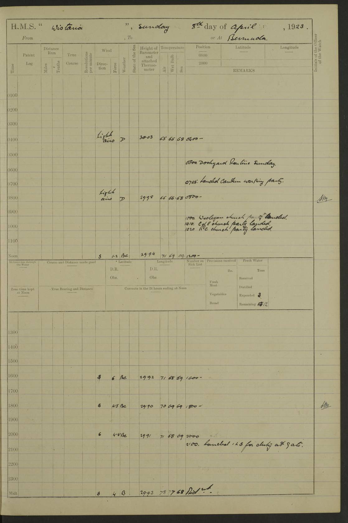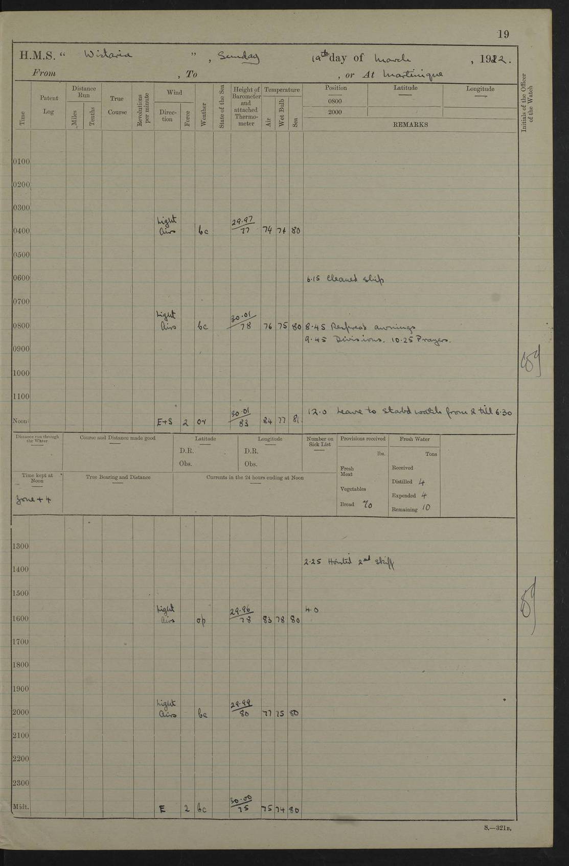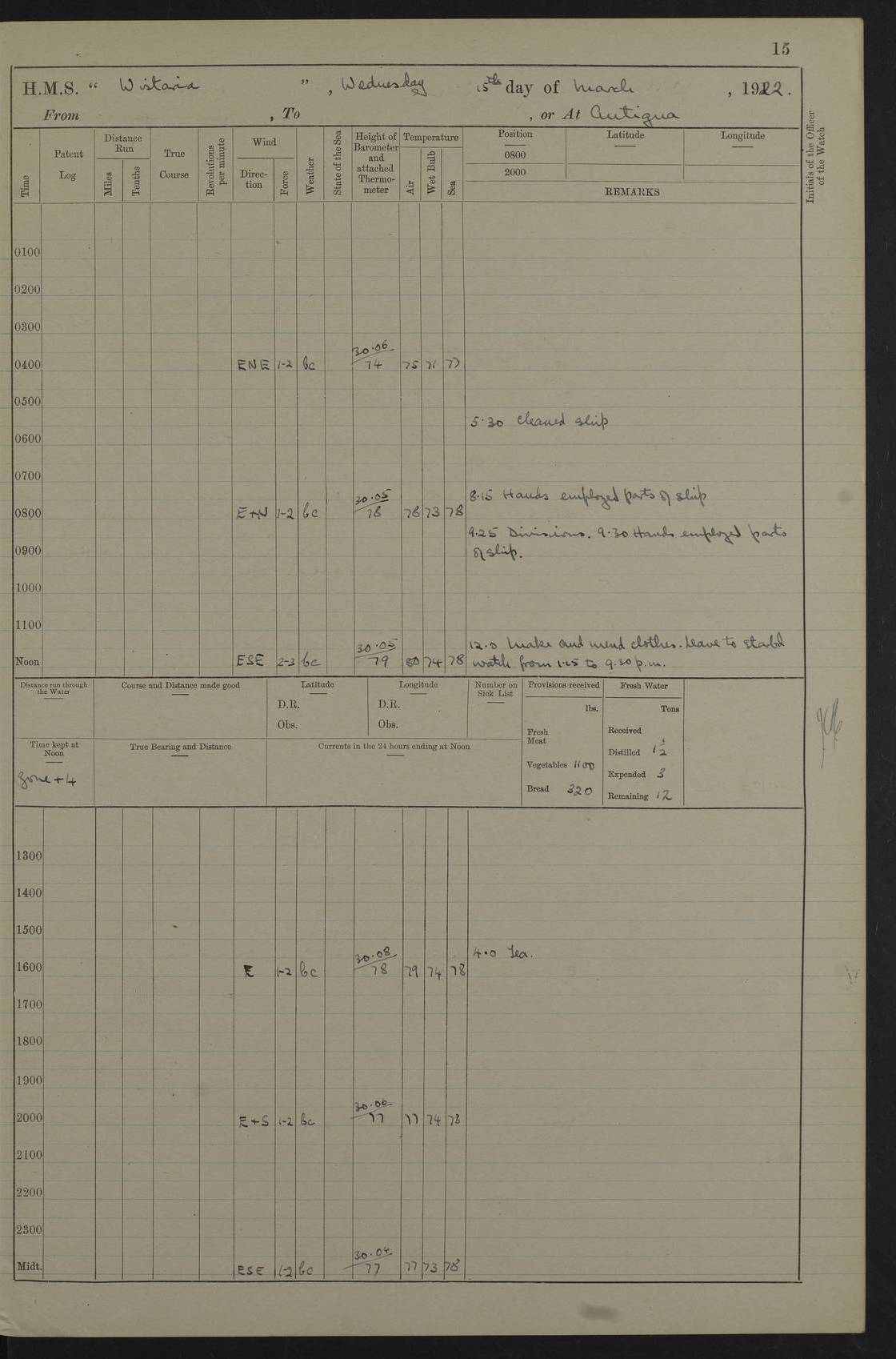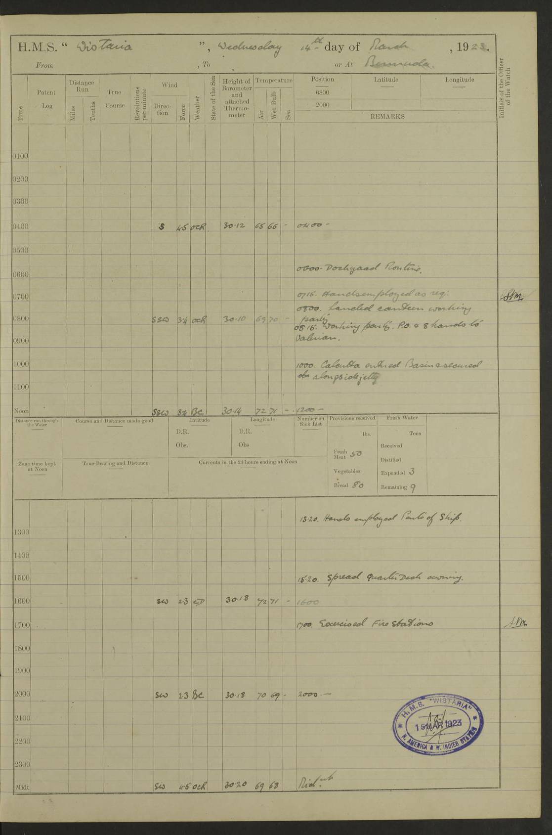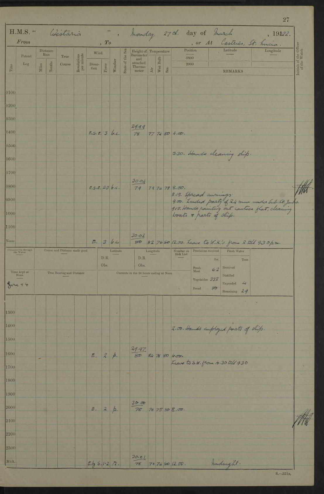LOGS FOR MARCH 1922 4f73caa0a2fc8ea903000b56: (https://s3.amazonaws.com:443/oldweather/ADM53-93265/0033_0.jpg) 4f73caa4a2fc8ea903000b63: (https://s3.amazonaws.com:443/oldweather/ADM53-93266/0003_1.jpg) 1 March 1922 At Bermuda Lat 32.32, Long -64.8 9.30am: Hands employed preparing [securing] ship for sea 1.30pm: Left fenders 2.30pm: Proceeded as required for ship channel, 110 revs 3.37pm: Fairway Buoy abeam. Course SE 4.0pm: Reduced to 96 revs. Evening Quarters 4.55pm: Exercised sea boats crew 5.09pm: Streamed patent log 4f73caa5a2fc8ea903000b64: (https://s3.amazonaws.com:443/oldweather/ADM53-93266/0004_0.jpg) 2 March 1922 From Bermuda to Nevis Lat 28.91, Long -64.26 3.50am: Commenced working up for full power trial (8 hrs) 4.20am: Full power trial commenced 9.50am: Exercised sounding party am: Hands employed cleaning motor boat and parts of ship 12.25am: Eased to 132 revs. 3/5th power trial 4.0pm: Quarters. Exercised fire stations True Bearing and Distance: of Sombrero Island Lt 176°, 605 miles 4f73caa5a2fc8ea903000b65: (https://s3.amazonaws.com:443/oldweather/ADM53-93266/0004_1.jpg) 3 March 1922 [From Bermuda to Nevis] Lat 24.03, Long -63.78 4.26am: 3/5 power trial completed, reduced to 96 revs 7.0am: Set Fore staysail 9.30am: Divisions and Prayers. Exercised action stations 10.0am: Reset fore staysail 1.0pm: Hands mustered for monthly payment pm: Hands employed painting motor boat and parts of ship True Bearing and Distance: Sombrero 177°, 326 miles 4f73caa6a2fc8ea903000b66: (https://s3.amazonaws.com:443/oldweather/ADM53-93266/0005_0.jpg) 4 March 1922 From Bermuda to Nevis Lat 20.66, Long -63.4 2.0am: Tack of fore Staysail carried away, altered course West, “Slow” speed 2.15am: Resumed course and speed 10.0am: Passed steamer on Port beam 5.0pm: Put clocks on 20 minutes 6.02pm: Altered course S53W to lower fore staysail True Bearing and Distance: Sombrero 182°½, 124 miles 4f73caa6a2fc8ea903000b67: (https://s3.amazonaws.com:443/oldweather/ADM53-93266/0005_1.jpg) 5 March 1922 From Bermuda to Nevis and at Nevis Lat 17.0, Long -62.0 12.10am: Sighted Sombrero Island Lt S6W 1.30am: Sombrero Island Lt S17W 1.45am: Bearing S23W 2.07am: Lt 4 points on bow 2.27am: Light abeam to Starboard, 2.5 miles 2.52am: Light 4 points on quarter 6.05am: Sighted St Martin Isle 7.25am: Sighted St Eustatius S25E 8.52am: Saba Island Peak abeam 10.30am: Divisions. Sighted Nevis 1 point off Port bow 11.40am: Helden Point abeam 12.50pm: Hauled in patent log 12.55pm: Course and speed for lowering sea boat to send mails to RMSP “Caraquet” off Basse Terre 1.20pm: Proceeded. Course S33E, 96 revs 2.30pm: Anchored off Charlestown, Nevis Anchor Bearings: Lowland Church N28E, Ward Mill S46E, Fort Charles Pt S11E True Bearing and Distance: Basseterre Lt 283°, 8.3 miles 4f73caa6a2fc8ea903000b68: (https://s3.amazonaws.com:443/oldweather/ADM53-93266/0006_0.jpg) 6 March 1922 At Nevis Lat 17.14, Long -62.63 10.10am: Hands employed parts of ship and side party 11.30am: Saluting guns crews to drill 2.0pm: Hands employed cleaning ship’s side and parts of ship 8.10pm: Hoisted whaler 4f73caa7a2fc8ea903000b69: (https://s3.amazonaws.com:443/oldweather/ADM53-93266/0006_1.jpg) 7 March 1922 At Nevis Lat 17.14, Long -62.63 5.30am: Hands employed cleaning boats and ship 8.15am: Hands employed on boats and parts of ship 11.40am: Spread Q.D. awning 4f73caa7a2fc8ea903000b6a: (https://s3.amazonaws.com:443/oldweather/ADM53-93266/0007_0.jpg) 8 March 1922 From Nevis to Anguilla Lat 17.41, Long -62.95 5.30am: Cleaned ship and secured boats for sea 9.05am: Weighed and proceeded 10.0am: Stopped off Basse Terre 10.38am: Proceeded at 130 revs 2.50pm: Terre Basse Pt abeam, altered course N2E 3.19pm: Anguillita Pt abeam, altered course N37E 4.15pm: Came to with Port anchor in 6 fms & veered to 3 shackles Anchor Bearings: Custom Ho, right tangent, S40E; Point N43E; Flat Cap Pt N2E 6.40pm: Hoisted all boats True Bearing and Distance: Anguillita Island 342°½, 45.5 miles [Terre Basse Point: is the west extreme of St Martin Island] 4f73caa7a2fc8ea903000b6b: (https://s3.amazonaws.com:443/oldweather/ADM53-93266/0007_1.jpg) 9 March 1922 At Anguilla Lat 18.22, Long -63.07 8.15am: Hands employed cleaning out canteen flat and parts of ship 9.15am: Divisions and Prayers 4f73caa8a2fc8ea903000b6c: (https://s3.amazonaws.com:443/oldweather/ADM53-93266/0008_0.jpg) 10 March 1922 From Anguilla to Nevis Lat 17.6, Long -63.05 8.10am: H.E. the Governor and staff arrived on board 8.29am: Weighed and proceeded for Nevis at 120 revs. Course N83W 9.17am: Anguillita Island abeam. Altered course S5W 1.55pm: Brimstone Hill abeam 1 mile 2.35pm: Course and speed as required for anchoring 2.45pm: Came to with Starboard anchor in 4 fms 4.0pm: Anchored in 5 fms Anchor Bearings: Pier Head S72E, Fort Charles Pt S14E, Lowland Church N27E True Bearing and Distance: Basseterre Pier Lt 133°, 27 miles 4f73caa8a2fc8ea903000b6d: (https://s3.amazonaws.com:443/oldweather/ADM53-93266/0008_1.jpg) 11 March 1922 At Nevis Lat 17.14, Long -62.63 8.0am: Hands employed cleaning ship 4f73caa8a2fc8ea903000b6e: (https://s3.amazonaws.com:443/oldweather/ADM53-93266/0009_0.jpg) 12 March 1922 At Nevis Lat 17.14, Long -62.63 6.30am: Cleaned ship 9.45am: Divisions 3.0pm: Ship opened to visitors 4f73caa9a2fc8ea903000b6f: (https://s3.amazonaws.com:443/oldweather/ADM53-93266/0009_1.jpg) 13 March 1922 From Nevis to Antigua Lat 17.08, Long -62.36 8.15am: Secured boats for sea 10.10am: Weighed and proceeded 120 revs 2.30pm: Anchored in St Johns Harbour Anchor Bearings: Rat Island, right tangent, S85E; Fort James F.S. N7E; Week Pt S54E True Bearing and Distance: Sandy Island Lt Ho 085°½, 25.6 miles 4f73caa9a2fc8ea903000b70: (https://s3.amazonaws.com:443/oldweather/ADM53-93266/0010_0.jpg) 14 March 1922 At Antigua Lat 17.12, Long -61.85 8.15am: Hands employed spreading and fitting after boat deck awning and part of ship 9.25am: Carried on with work 4f73caaaa2fc8ea903000b71: (https://s3.amazonaws.com:443/o